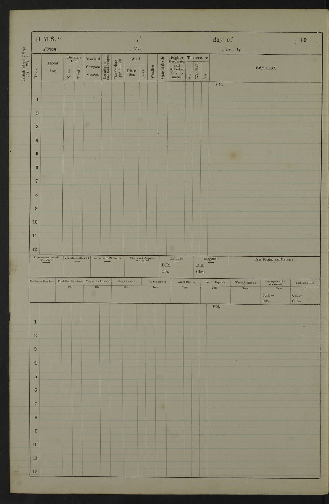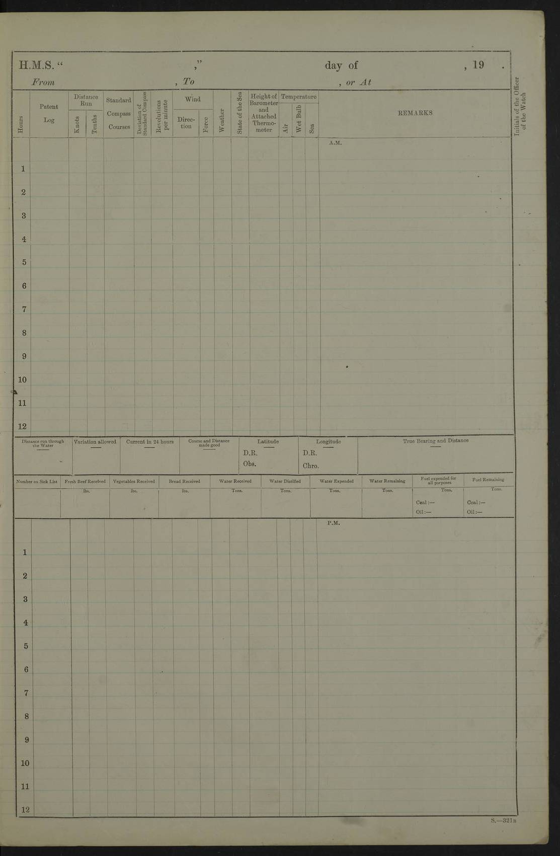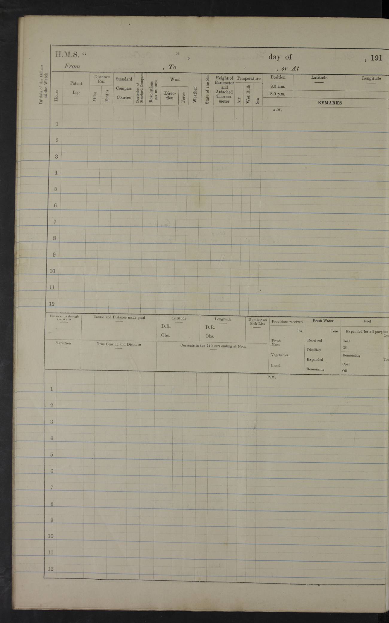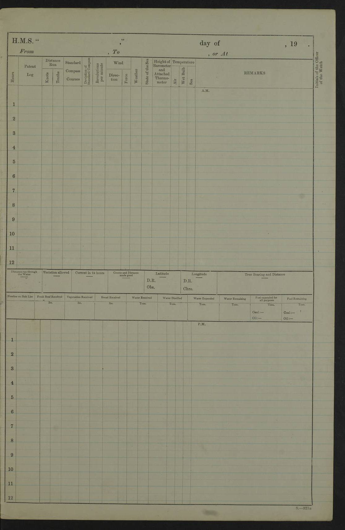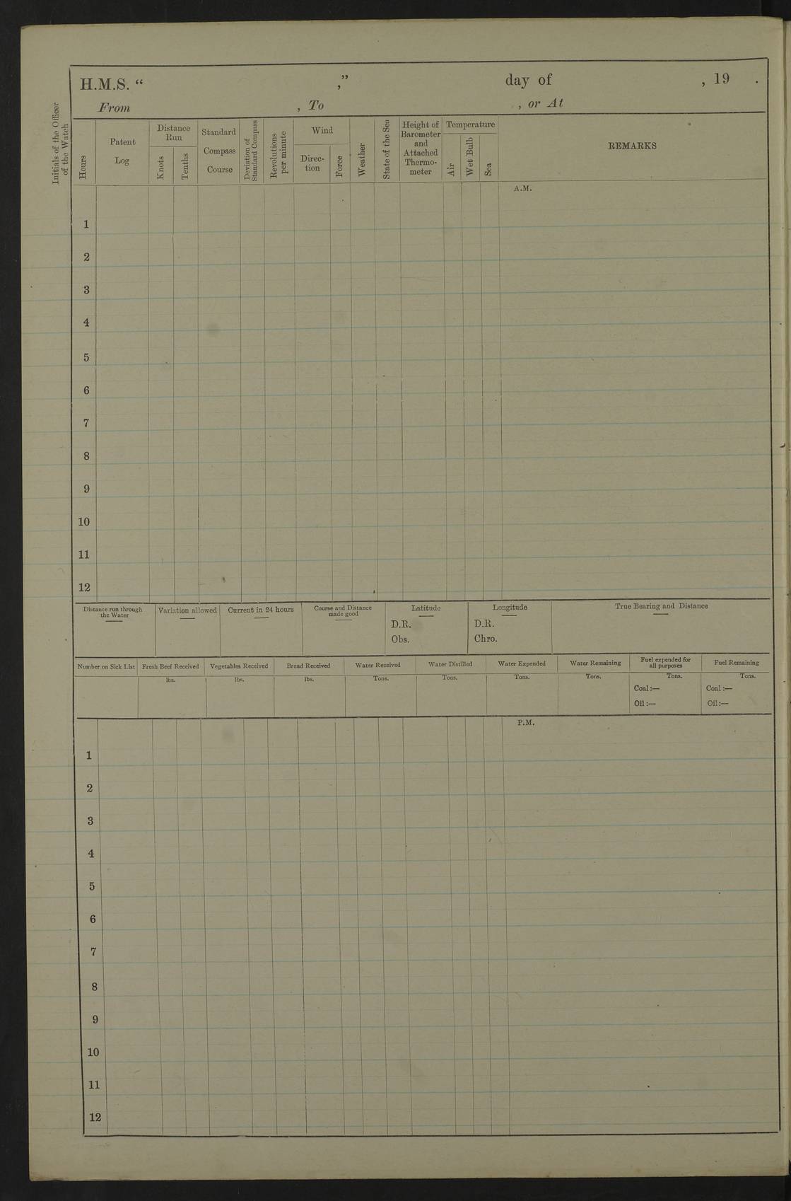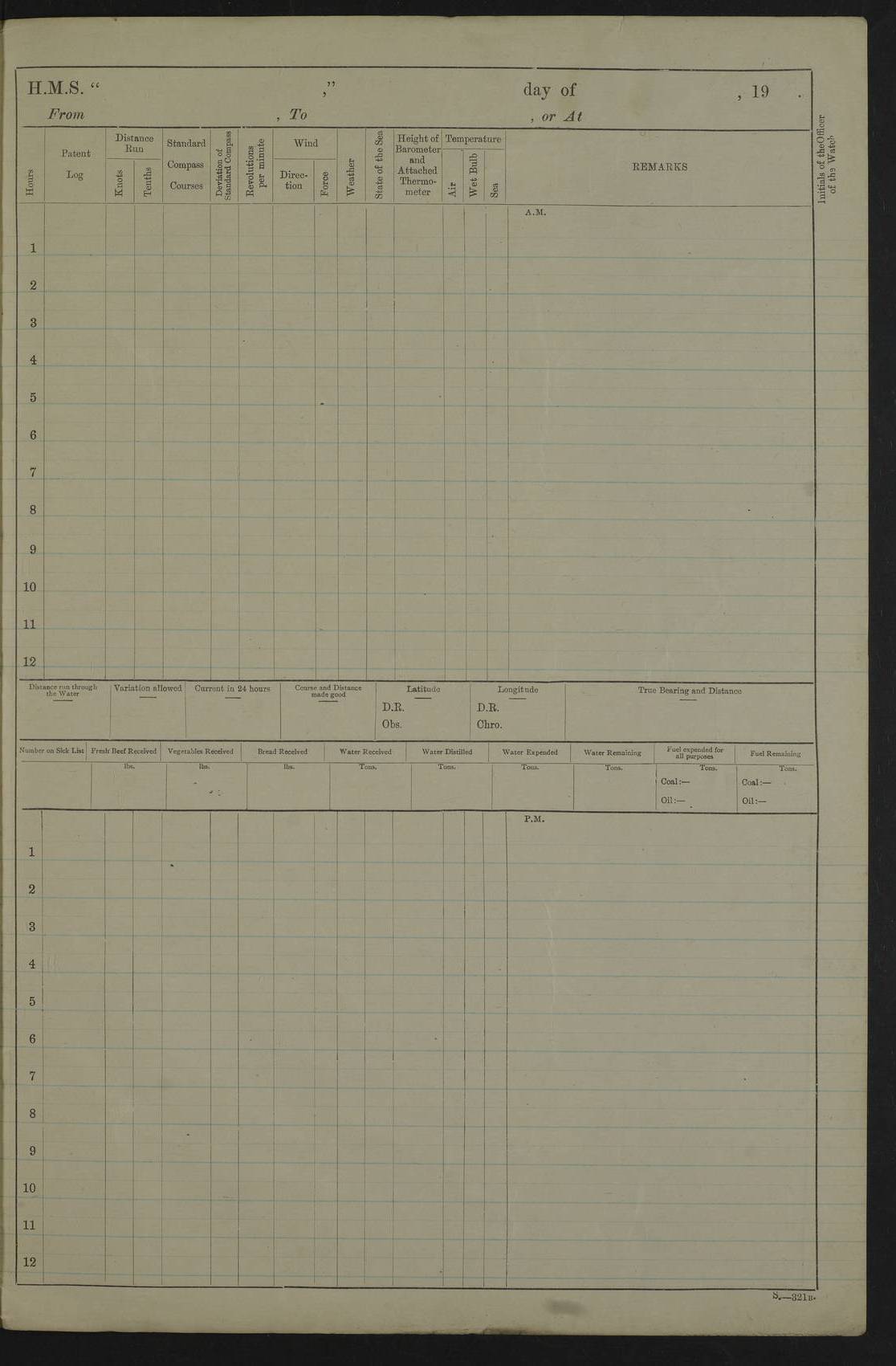 22 June 1915 At sea, Gibraltar to Lemnos Lat 36.1, Long -1.3 4.15am: Sighted land on starboard bow. 10.20am: Stopped port engine for repairs. 11.20am: proceeded with port engine. pm: a/c due to change in deviation. 10.00pm: Cape Tenez Light abeam, 18 miles. 4f73cd61a2fc8ea9030015f6: (https://s3.amazonaws.com:443/oldweather/ADM53-43015/0012_1.jpg) 23 June 1915 At sea, Gibraltar to Lemnos Lat 37.5, Long 4.8 Number on sick list: 4 5.00am: Secured from night defence stations. Placed anti-submarine guns. pm: Life saving appliances served out to men stationed in ? ?at abandon ship. 4f73cd61a2fc8ea9030015f7: (https://s3.amazonaws.com:443/oldweather/ADM53-43015/0013_0.jpg) 24 June 1915 At sea, Gibraltar to Lemnos Lat 37.4, Long 10.8 Position in log clearly bears no resemblance to the location of the ship. Position above is approximate and is based sighting of Zembra Island at 11.55am. 5.00am: Dispersed from night defence stations. Manned anti-submarine guns. am: Sighted two French torpedo boats. am: Torpedo boats passed to ~ No 362, 363. am: Sighted land on starboard beam. 11.55am: Zembra Island abeam, 25 miles. 2.00pm: Sighted Pantellaria S34ºE. 4.45pm: Pantellaria Light House abeam 12 miles. 4f73cd61a2fc8ea9030015f8: (https://s3.amazonaws.com:443/oldweather/ADM53-43015/0013_1.jpg) 25 June 1915 At sea, Gibraltar to Lemnos Lat 35.5, Long 16.7 2.10am: Gozo Light abeam 17 miles. 5.00am: Dispersed from night defence stations. Manned anti-submarine guns. 4f73cd61a2fc8ea9030015f9: (https://s3.amazonaws.com:443/oldweather/ADM53-43015/0014_0.jpg) 26 June 1915 At sea, Gibraltar to Lemnos Lat 35.5, Long 22.6 Number on sick list: 5 5.00am: Dispersed from night defence stations. Manned anti-submarine guns. am: Aired night clothing. am: marines at maxim practice on quarter deck. 2.00pm: Observed land on either bow. 3.00pm: Sighted French patrol destroyer. 4.15pm: Sighted French patrol destroyer. 9.40pm: Milo Peak N63ºW. 10.26pm: Polino Light abeam to port 5.5 miles. 4f73cd62a2fc8ea9030015fa: (https://s3.amazonaws.com:443/oldweather/ADM53-43015/0014_1.jpg) 27 June 1915 At sea and at Lemnos Lat 39.1, Long 24.4 From 0.50 to 3.05am sighting of multiple light houses. 3.50am: a/c to N39ºW and commenced to zig-zag. 5.00am: Dispersed from night defence stations and placed anti-submarine guns and look-outs. am: Lost overboard by accident Hazlewood fender, pat. 311, one in number. 10.30am: Held Divine Service onboard. pm: Met and signalled HMS Minerva on patrol duty. pm: Courses and speeds as requisite while waiting orders to approach Mudros. 3.00pm: Proceeded. 5.16pm: Increased to 90 revs, commenced to zig-zag. Course as requisite for Mudros. 7.00pm: Entered Mudros Bay. 7.47pm: Stopped. Let go port anchor in ‘M3’. 8.30pm: Darkened ship. pm: Manned one 6” and one 12 pdr. 4f73cd62a2fc8ea9030015fb: (https://s3.amazonaws.com:443/oldweather/ADM53-43015/0015_0.jpg) 28 June 1915 Mudros Bay, Lemnos Lat 39.89, Long 25.24 5,00am: HMS Vengeance entered harbour. HMS Vengeance was a pre-dreadnought of the Canopus class, launched in 1899 at Vickers, Barrow, and sold for scrapping in 1921. Details at http://en.wikipedia.org/wiki/HMS_Vengeance_(1899) . am/pm/: hands preparing for coaling and about ship’s work. pm: Collier Wabana secured alongside. 4f73cd62a2fc8ea9030015fc: (https://s3.amazonaws.com:443/oldweather/ADM53-43015/0015_1.jpg) 29 June 1915 Mudros Bay, Lemnos Lat 39.89, Long 25.24 5.15am: Commenced coaling. 2.00pm: Finished coaling. Collier left. 4f73cd62a2fc8ea9030015fd: (https://s3.amazonaws.com:443/oldweather/ADM53-43015/0016_0.jpg) 30 June 1915 Mudros Bay, Lemnos Lat 39.89, Long 25.24 am: Parties away sanding, and with fire engines onshore. am: Boats away disembarking troops. am: French Flagship Patrie sailed. The Patrie was a French pre-dreadnought, launched at La Seyne shipyard in 1903, and stricken in 1921. Details at http://en.wikipedia.org/wiki/French_battleship_Patrie . 6.30pm: Hands to bathe. 4f73cd63a2fc8ea9030015fe: (https://s3.amazonaws.com:443/oldweather/ADM53-43015/0016_1.jpg) 4f73cd63a2fc8ea9030015ff: (https://s3.amazonaws.com:443/oldweather/ADM53-43015/0017_0.jpg) 4f73cd63a2fc8ea903001600: (https://s3.amazonaws.com:443/oldweather/ADM53-43015/0017_1.jpg) 4f73cd63a2fc8ea903001601: (https://s3.amazonaws.com:443/oldweather/ADM53-43015/0018_0.jpg) 4f73cd64a2fc8ea903001602: (https://s3.amazonaws.com:443/oldweather/ADM53-43015/0018_1.jpg) LOGS FOR JULY 1915 From July to October 1915, HMS Glory spent her time at Port Mudros. Certain activities typically took place daily and are not generally noted in the pages below. These activities include: Lighting fires in the picket boat around 4am and drawing the fires in the late evening; Divisions at around 9–9.30am and Evening Quarters at 4pm; Darken ship at around 8.30pm; Daily ‘cleaning ship’, with variations thereof; SBC (for ‘Signal Books Correct’) at the watch changes. 4f73cd64a2fc8ea903001603: (https://s3.amazonaws.com:443/oldweather/ADM53-43016/0000_0.jpg) 4f73cd64a2fc8ea903001604: (https://s3.amazonaws.com:443/oldweather/ADM53-43016/0000_1.jpg) 4f73cd65a2fc8ea903001605: (https://s3.amazonaws.com:443/oldweather/ADM53-43016/0001_0.jpg) 4f73cd65a2fc8ea903001606: (https://s3.amazonaws.com:443/oldweather/ADM53-43016/0001_1.jpg) 1 July 1915 Port Mudros Lat 39.89, Long 25.24 6.30am: Landed working parties preparing boom defence ships. am: Discharged Acting Commander Rayne to Hector. Hector was a kite balloon ship. No further details readily available. 5.00pm: Tug T.10 made fast astern. 7.15pm: HMS Venerable went out. 7.30pm: HMS Chatham went out. HMS Chatham was a ‘Town’ cruiser and lead ship of her class. She was launched in 1911 at Chatham Dockyard and sold in 1926. Details at http://en.wikipedia.org/wiki/HMS_Chatham_(1911) . 4f73cd65a2fc8ea903001607: (https://s3.amazonaws.com:443/oldweather/ADM53-43016/0002_0.jpg) 2 July 1915 Port Mudros Lat 39.89, Long 25.24 5.35am: Landed working parties preparing boom defence ships. am/pm: Boom defence par