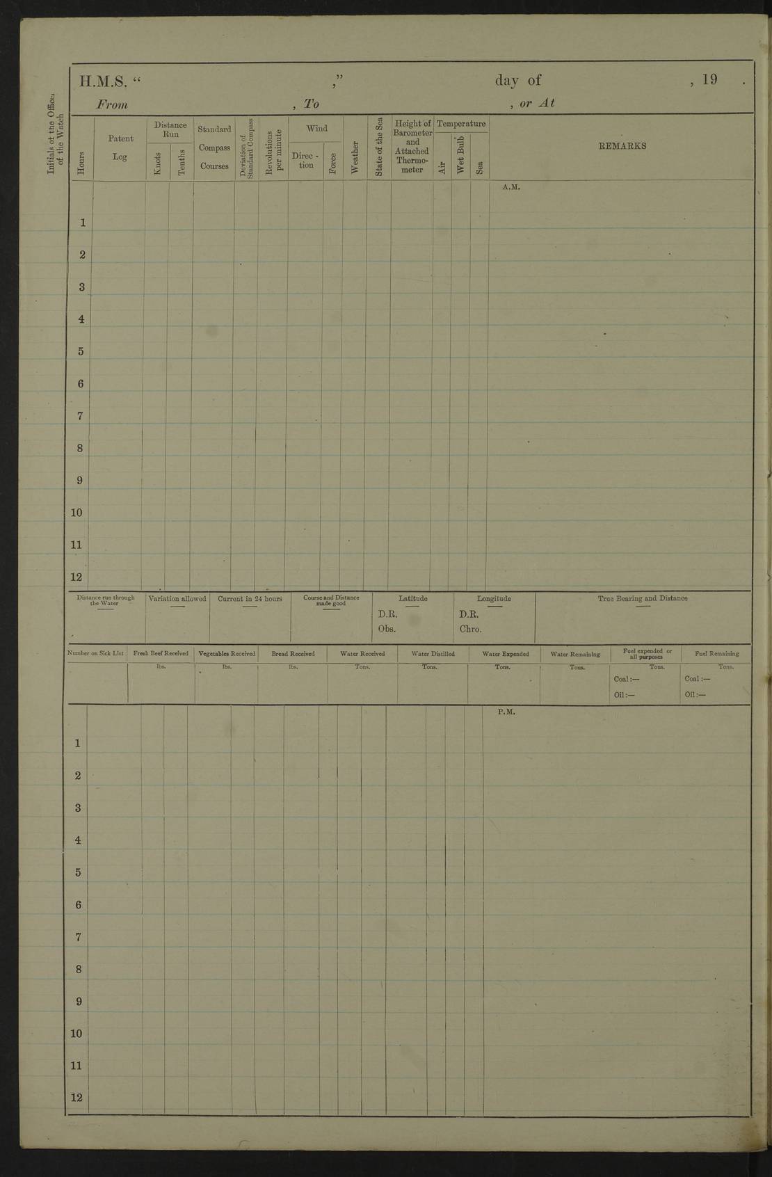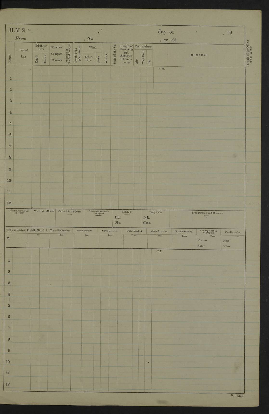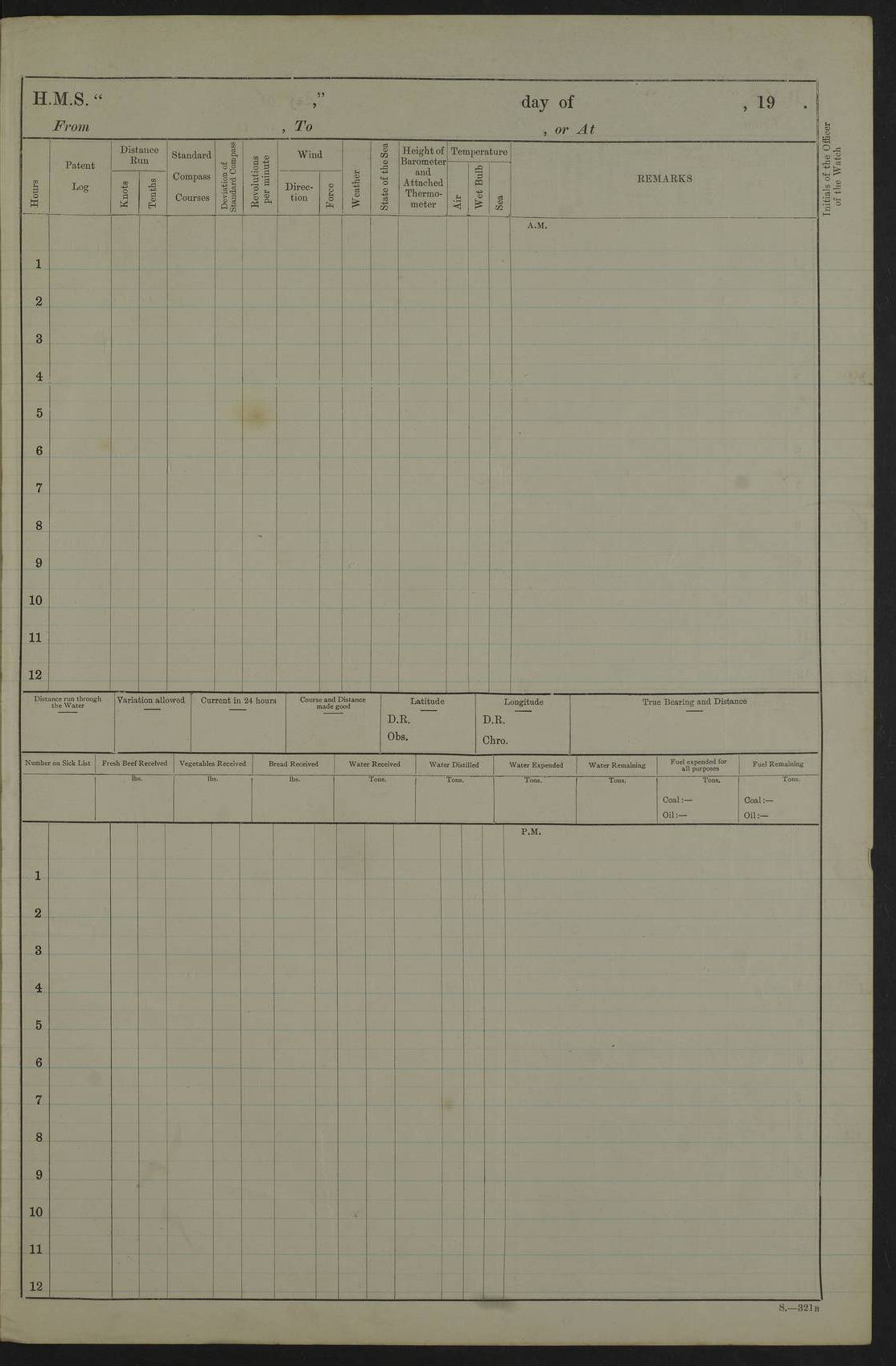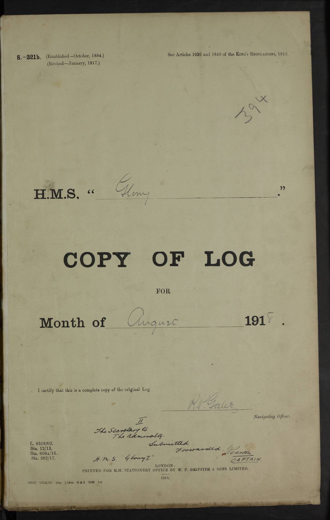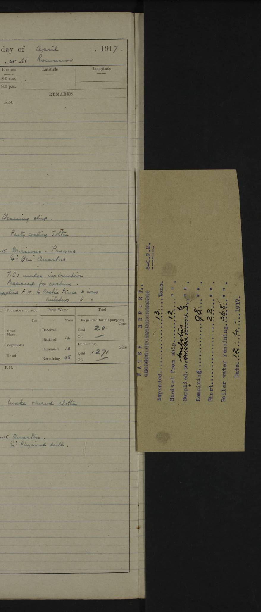 22 June 1915 At sea, Gibraltar to Lemnos Lat 36.1, Long -1.3 4.15am: Sighted land on starboard bow. 10.20am: Stopped port engine for repairs. 11.20am: proceeded with port engine. pm: a/c due to change in deviation. 10.00pm: Cape Tenez Light abeam, 18 miles. 4f73cd61a2fc8ea9030015f6: (https://s3.amazonaws.com:443/oldweather/ADM53-43015/0012_1.jpg) 23 June 1915 At sea, Gibraltar to Lemnos Lat 37.5, Long 4.8 Number on sick list: 4 5.00am: Secured from night defence stations. Placed anti-submarine guns. pm: Life saving appliances served out to men stationed in ? ?at abandon ship. 4f73cd61a2fc8ea9030015f7: (https://s3.amazonaws.com:443/oldweather/ADM53-43015/0013_0.jpg) 24 June 1915 At sea, Gibraltar to Lemnos Lat 37.4, Long 10.8 Position in log clearly bears no resemblance to the location of the ship. Position above is approximate and is based sighting of Zembra Island at 11.55am. 5.00am: Dispersed from night defence stations. Manned anti-submarine guns. am: Sighted two French torpedo boats. am: Torpedo boats passed to ~ No 362, 363. am: Sighted land on starboard beam. 11.55am: Zembra Island abeam, 25 miles. 2.00pm: Sighted Pantellaria S34ºE. 4.45pm: Pantellaria Light House abeam 12 miles. 4f73cd61a2fc8ea9030015f8: (https://s3.amazonaws.com:443/oldweather/ADM53-43015/0013_1.jpg) 25 June 1915 At sea, Gibraltar to Lemnos Lat 35.5, Long 16.7 2.10am: Gozo Light abeam 17 miles. 5.00am: Dispersed from night defence stations. Manned anti-submarine guns. 4f73cd61a2fc8ea9030015f9: (https://s3.amazonaws.com:443/oldweather/ADM53-43015/0014_0.jpg) 26 June 1915 At sea, Gibraltar to Lemnos Lat 35.5, Long 22.6 Number on sick list: 5 5.00am: Dispersed from night defence stations. Manned anti-submarine guns. am: Aired night clothing. am: marines at maxim practice on quarter deck. 2.00pm: Observed land on either bow. 3.00pm: Sighted French patrol destroyer. 4.15pm: Sighted French patrol destroyer. 9.40pm: Milo Peak N63ºW. 10.26pm: Polino Light abeam to port 5.5 miles. 4f73cd62a2fc8ea9030015fa: (https://s3.amazonaws.com:443/oldweather/ADM53-43015/0014_1.jpg) 27 June 1915 At sea and at Lemnos Lat 39.1, Long 24.4 From 0.50 to 3.05am sighting of multiple light houses. 3.50am: a/c to N39ºW and commenced to zig-zag. 5.00am: Dispersed from night defence stations and placed anti-submarine guns and look-outs. am: Lost overboard by accident Hazlewood fender, pat. 311, one in number. 10.30am: Held Divine Service onboard. pm: Met and signalled HMS Minerva on patrol duty. pm: Courses and speeds as requisite while waiting orders to approach Mudros. 3.00pm: Proceeded. 5.16pm: Increased to 90 revs, commenced to zig-zag. Course as requisite for Mudros. 7.00pm: Entered Mudros Bay. 7.47pm: Stopped. Let go port anchor in ‘M3’. 8.30pm: Darkened ship. pm: Manned one 6” and one 12 pdr. 4f73cd62a2fc8ea9030015fb: (https://s3.amazonaws.com:443/oldweather/ADM53-43015/0015_0.jpg) 28 June 1915 Mudros Bay, Lemnos Lat 39.89, Long 25.24 5,00am: HMS Vengeance entered harbour. HMS Vengeance was a pre-dreadnought of the Canopus class, launched in 1899 at Vickers, Barrow, and sold for scrapping in 1921. Details at http://en.wikipedia.org/wiki/HMS_Vengeance_(1899) . am/pm/: hands preparing for coaling and about ship’s work. pm: Collier Wabana secured alongside. 4f73cd62a2fc8ea9030015fc: (https://s3.amazonaws.com:443/oldweather/ADM53-43015/0015_1.jpg) 29 June 1915 Mudros Bay, Lemnos Lat 39.89, Long 25.24 5.15am: Commenced coaling. 2.00pm: Finished coaling. Collier left. 4f73cd62a2fc8ea9030015fd: (https://s3.amazonaws.com:443/oldweather/ADM53-43015/0016_0.jpg) 30 June 1915 Mudros Bay, Lemnos Lat 39.89, Long 25.24 am: Parties away sanding, and with fire engines onshore. am: Boats away disembarking troops. am: French Flagship Patrie sailed. The Patrie was a French pre-dreadnought, launched at La Seyne shipyard in 1903, and stricken in 1921. Details at http://en.wikipedia.org/wiki/French_battleship_Patrie . 6.30pm: Hands to bathe. 4f73cd63a2fc8ea9030015fe: (https://s3.amazonaws.com:443/oldweather/ADM53-43015/0016_1.jpg) 4f73cd63a2fc8ea9030015ff: (https://s3.amazonaws.com:443/oldweather/ADM53-43015/0017_0.jpg) 4f73cd63a2fc8ea903001600: (https://s3.amazonaws.com:443/oldweather/ADM53-43015/0017_1.jpg) 4f73cd63a2fc8ea903001601: (https://s3.amazonaws.com:443/oldweather/ADM53-43015/0018_0.jpg) 4f73cd64a2fc8ea903001602: (https://s3.amazonaws.com:443/oldweather/ADM53-43015/0018_1.jpg) LOGS FOR JULY 1915 From July to October 1915, HMS Glory spent her time at Port Mudros. Certain activities typically took place daily and are not generally noted in the pages below. These activities include: Lighting fires in the picket boat around 4am and drawing the fires in the late evening; Divisions at around 9–9.30am and Evening Quarters at 4pm; Darken ship at around 8.30pm; Daily ‘cleaning ship’, with variations thereof; SBC (for ‘Signal Books Correct’) at the watch changes. 4f73cd64a2fc8ea903001603: (https://s3.amazonaws.com:443/oldweather/ADM53-43016/0000_0.jpg) 4f73cd64a2fc8ea903001604: (https://s3.amazonaws.com:443/oldweather/ADM53-43016/0000_1.jpg) 4f73cd65a2fc8ea903001605: (https://s3.amazonaws.com:443/oldweather/ADM53-43016/0001_0.jpg) 4f73cd65a2fc8ea903001606: (https://s3.amazonaws.com:443/oldweather/ADM53-43016/0001_1.jpg) 1 July 1915 Port Mudros Lat 39.89, Long 25.24 6.30am: Landed working parties preparing boom defence ships. am: Discharged Acting Commander Rayne to Hector. Hector was a kite balloon ship. No further details readily available. 5.00pm: Tug T.10 made fast astern. 7.15pm: HMS Venerable went out. 7.30pm: HMS Chatham went out. HMS Chatham was a ‘Town’ cruiser and lead ship of her class. She was launched in 1911 at Chatham Dockyard and sold in 1926. Details at http://en.wikipedia.org/wiki/HMS_Chatham_(1911) . 4f73cd65a2fc8ea903001607: (https://s3.amazonaws.com:443/oldweather/ADM53-43016/0002_0.jpg) 2 July 1915 Port Mudros Lat 39.89, Long 25.24 5.35am: Landed working parties preparing boom defence ships. am/pm: Boom defence par