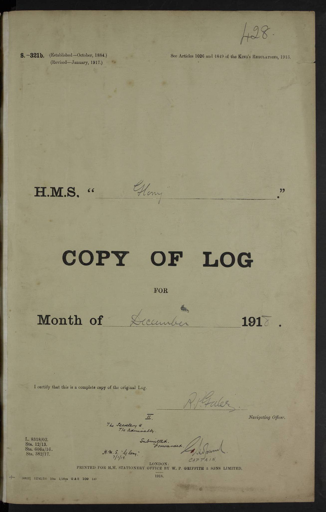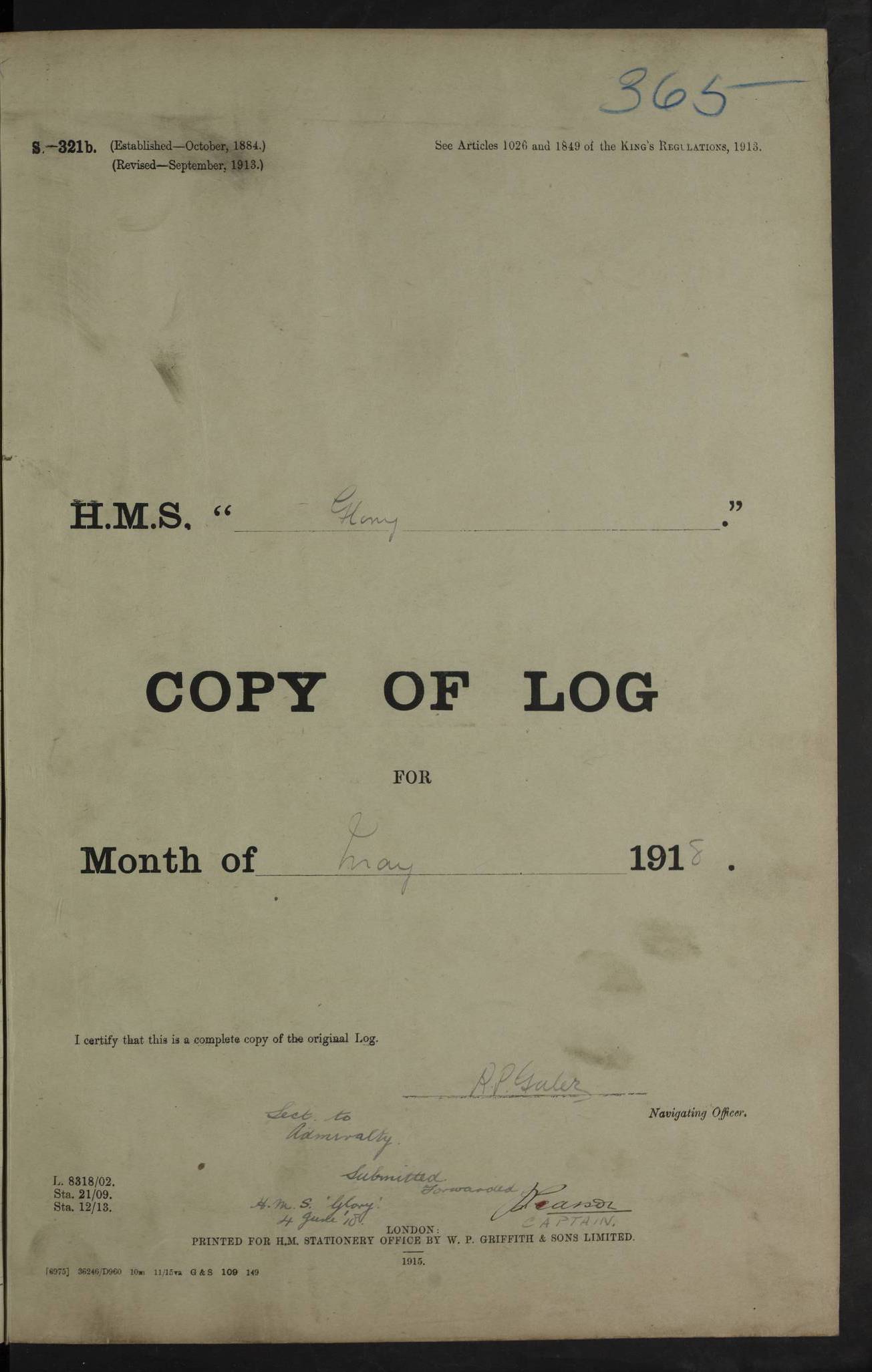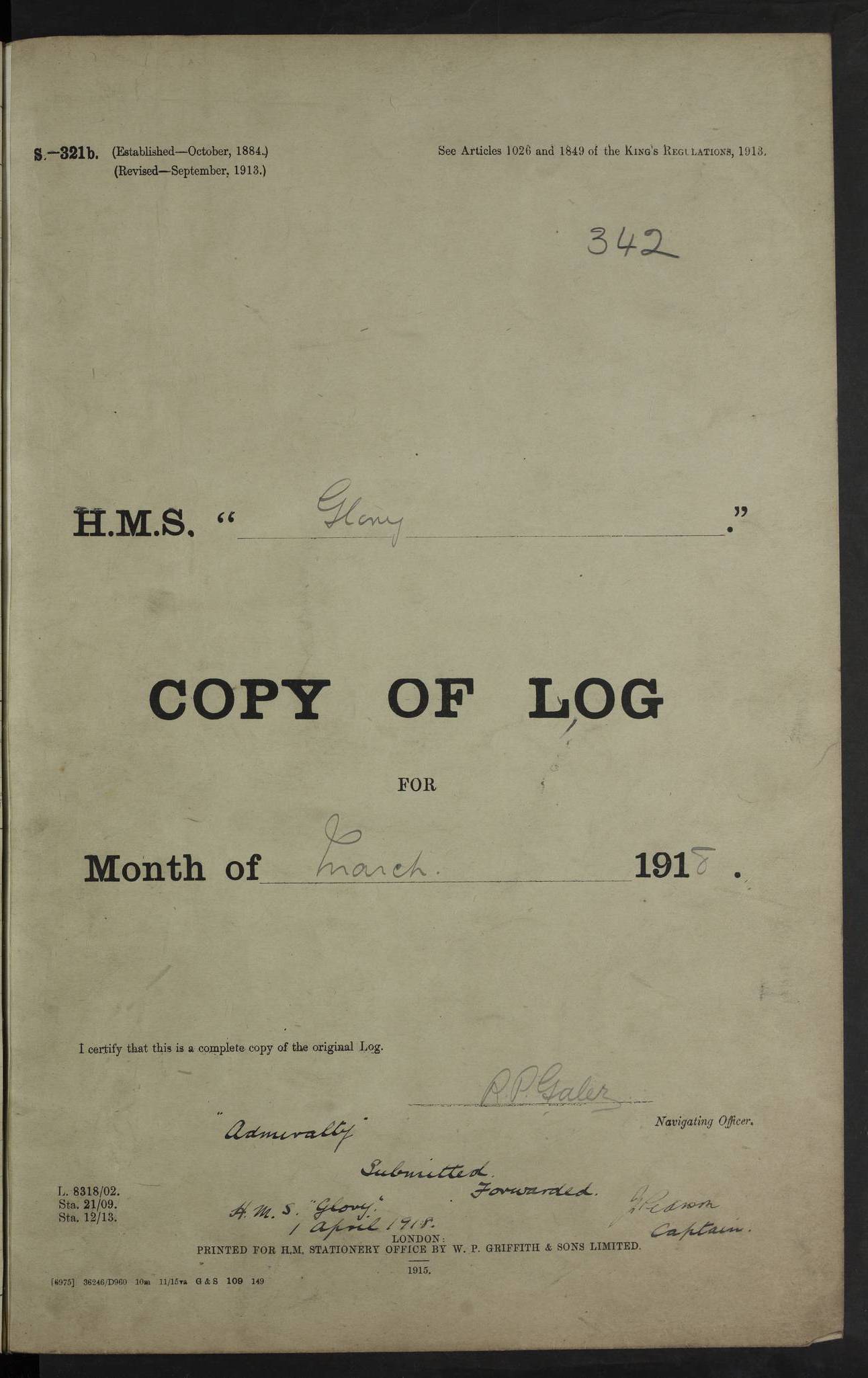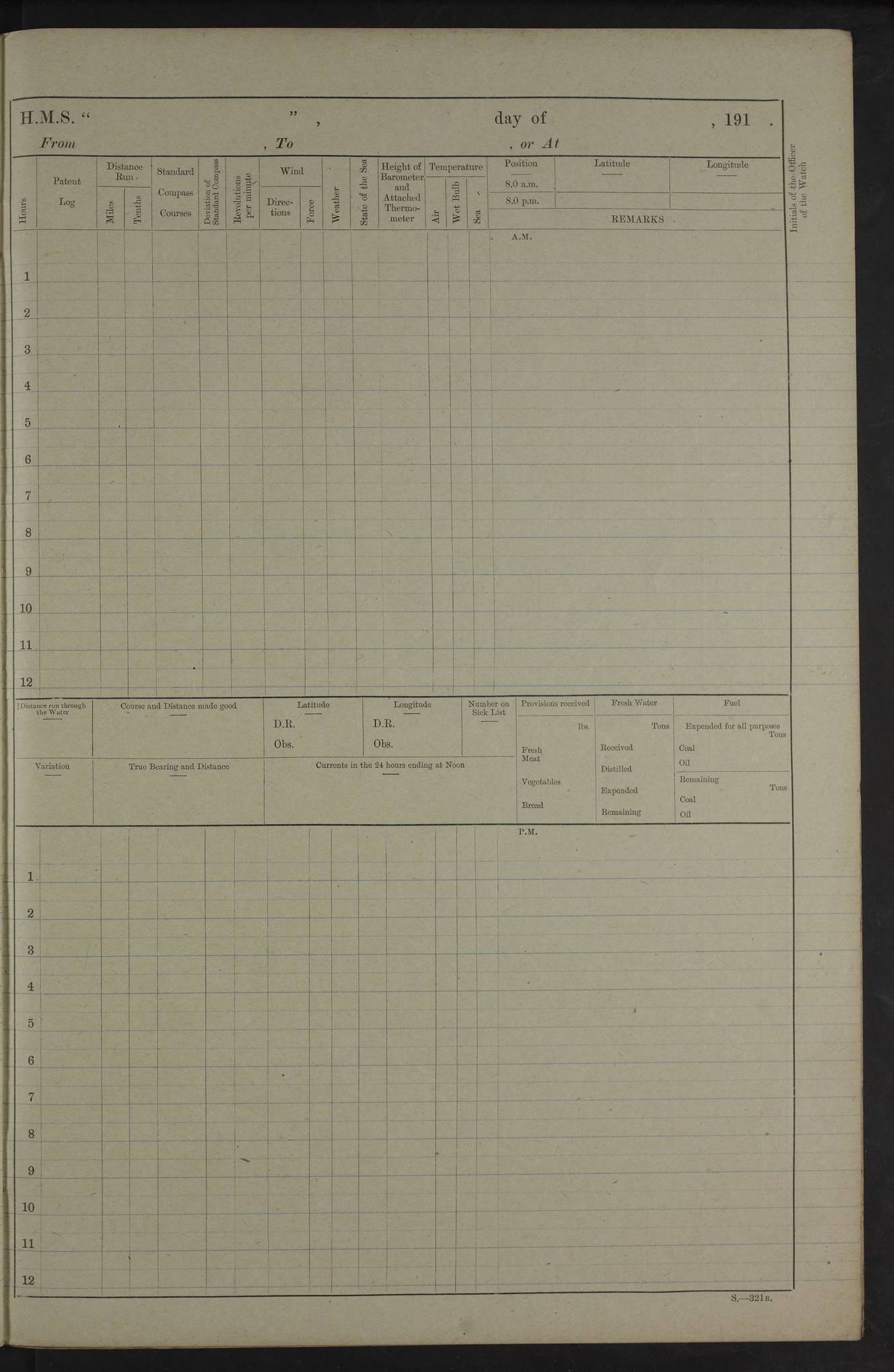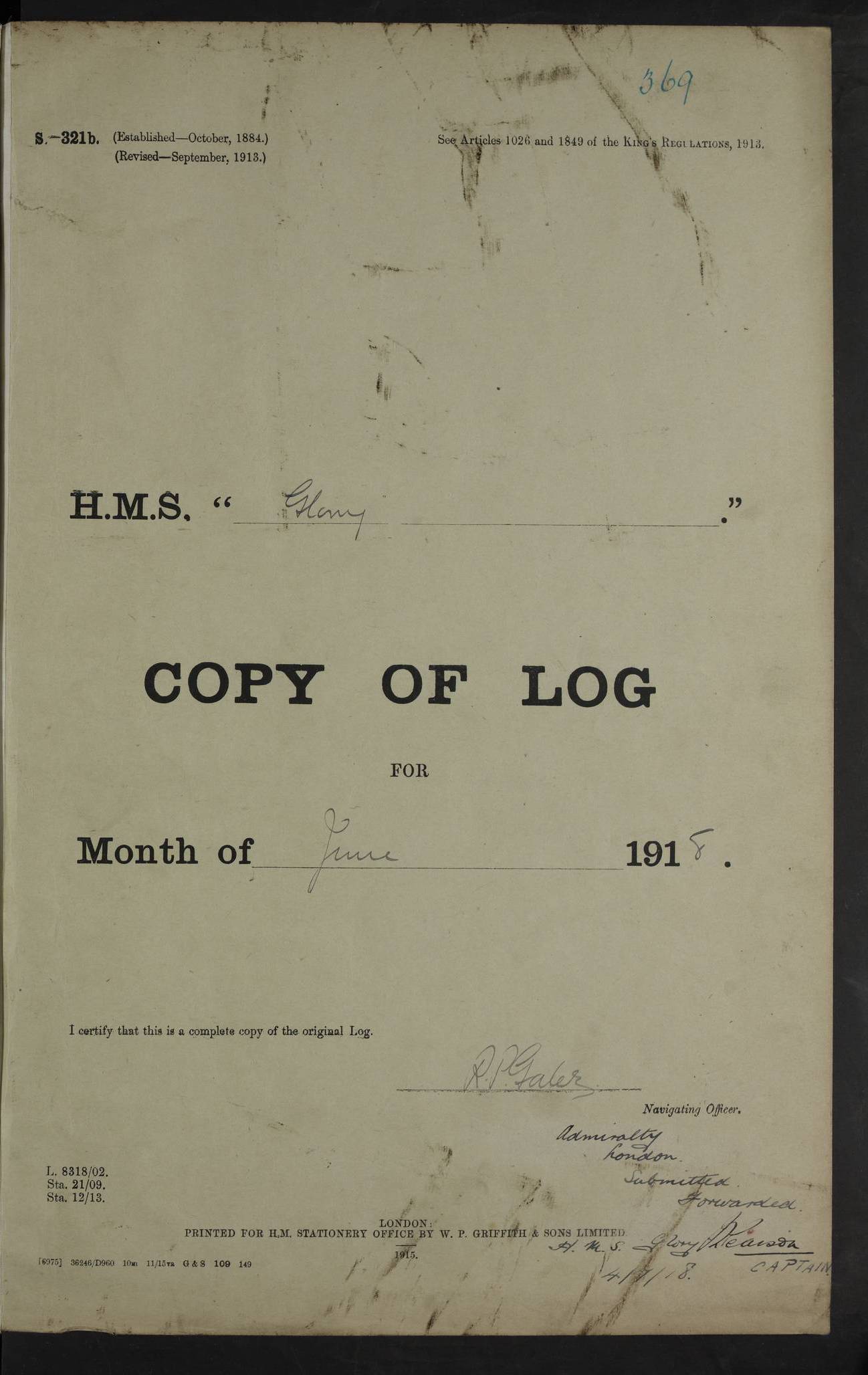22 June 1915 At sea, Gibraltar to Lemnos Lat 36.1, Long -1.3 4.15am: Sighted land on starboard bow. 10.20am: Stopped port engine for repairs. 11.20am: proceeded with port engine. pm: a/c due to change in deviation. 10.00pm: Cape Tenez Light abeam, 18 miles. 4f73cd61a2fc8ea9030015f6: (https://s3.amazonaws.com:443/oldweather/ADM53-43015/0012_1.jpg) 23 June 1915 At sea, Gibraltar to Lemnos Lat 37.5, Long 4.8 Number on sick list: 4 5.00am: Secured from night defence stations. Placed anti-submarine guns. pm: Life saving appliances served out to men stationed in ? ?at abandon ship. 4f73cd61a2fc8ea9030015f7: (https://s3.amazonaws.com:443/oldweather/ADM53-43015/0013_0.jpg) 24 June 1915 At sea, Gibraltar to Lemnos Lat 37.4, Long 10.8 Position in log clearly bears no resemblance to the location of the ship. Position above is approximate and is based sighting of Zembra Island at 11.55am. 5.00am: Dispersed from night defence stations. Manned anti-submarine guns. am: Sighted two French torpedo boats. am: Torpedo boats passed to ~ No 362, 363. am: Sighted land on starboard beam. 11.55am: Zembra Island abeam, 25 miles. 2.00pm: Sighted Pantellaria S34ºE. 4.45pm: Pantellaria Light House abeam 12 miles. 4f73cd61a2fc8ea9030015f8: (https://s3.amazonaws.com:443/oldweather/ADM53-43015/0013_1.jpg) 25 June 1915 At sea, Gibraltar to Lemnos Lat 35.5, Long 16.7 2.10am: Gozo Light abeam 17 miles. 5.00am: Dispersed from night defence stations. Manned anti-submarine guns. 4f73cd61a2fc8ea9030015f9: (https://s3.amazonaws.com:443/oldweather/ADM53-43015/0014_0.jpg) 26 June 1915 At sea, Gibraltar to Lemnos Lat 35.5, Long 22.6 Number on sick list: 5 5.00am: Dispersed from night defence stations. Manned anti-submarine guns. am: Aired night clothing. am: marines at maxim practice on quarter deck. 2.00pm: Observed land on either bow. 3.00pm: Sighted French patrol destroyer. 4.15pm: Sighted French patrol destroyer. 9.40pm: Milo Peak N63ºW. 10.26pm: Polino Light abeam to port 5.5 miles. 4f73cd62a2fc8ea9030015fa: (https://s3.amazonaws.com:443/oldweather/ADM53-43015/0014_1.jpg) 27 June 1915 At sea and at Lemnos Lat 39.1, Long 24.4 From 0.50 to 3.05am sighting of multiple light houses. 3.50am: a/c to N39ºW and commenced to zig-zag. 5.00am: Dispersed from night defence stations and placed anti-submarine guns and look-outs. am: Lost overboard by accident Hazlewood fender, pat. 311, one in number. 10.30am: Held Divine Service onboard. pm: Met and signalled HMS Minerva on patrol duty. pm: Courses and speeds as requisite while waiting orders to approach Mudros. 3.00pm: Proceeded. 5.16pm: Increased to 90 revs, commenced to zig-zag. Course as requisite for Mudros. 7.00pm: Entered Mudros Bay. 7.47pm: Stopped. Let go port anchor in ‘M3’. 8.30pm: Darkened ship. pm: Manned one 6” and one 12 pdr. 4f73cd62a2fc8ea9030015fb: (https://s3.amazonaws.com:443/oldweather/ADM53-43015/0015_0.jpg) 28 June 1915 Mudros Bay, Lemnos Lat 39.89, Long 25.24 5,00am: HMS Vengeance entered harbour. HMS Vengeance was a pre-dreadnought of the Canopus class, launched in 1899 at Vickers, Barrow, and sold for scrapping in 1921. Details at http://en.wikipedia.org/wiki/HMS_Vengeance_(1899) . am/pm/: hands preparing for coaling and about ship’s work. pm: Collier Wabana secured alongside. 4f73cd62a2fc8ea9030015fc: (https://s3.amazonaws.com:443/oldweather/ADM53-43015/0015_1.jpg) 29 June 1915 Mudros Bay, Lemnos Lat 39.89, Long 25.24 5.15am: Commenced coaling. 2.00pm: Finished coaling. Collier left. 4f73cd62a2fc8ea9030015fd: (https://s3.amazonaws.com:443/oldweather/ADM53-43015/0016_0.jpg) 30 June 1915 Mudros Bay, Lemnos Lat 39.89, Long 25.24 am: Parties away sanding, and with fire engines onshore. am: Boats away disembarking troops. am: French Flagship Patrie sailed. The Patrie was a French pre-dreadnought, launched at La Seyne shipyard in 1903, and stricken in 1921. Details at http://en.wikipedia.org/wiki/French_battleship_Patrie . 6.30pm: Hands to bathe. 4f73cd63a2fc8ea9030015fe: (https://s3.amazonaws.com:443/oldweather/ADM53-43015/0016_1.jpg) 4f73cd63a2fc8ea9030015ff: (https://s3.amazonaws.com:443/oldweather/ADM53-43015/0017_0.jpg) 4f73cd63a2fc8ea903001600: (https://s3.amazonaws.com:443/oldweather/ADM53-43015/0017_1.jpg) 4f73cd63a2fc8ea903001601: (https://s3.amazonaws.com:443/oldweather/ADM53-43015/0018_0.jpg) 4f73cd64a2fc8ea903001602: (https://s3.amazonaws.com:443/oldweather/ADM53-43015/0018_1.jpg) LOGS FOR JULY 1915 From July to October 1915, HMS Glory spent her time at Port Mudros. Certain activities typically took place daily and are not generally noted in the pages below. These activities include: Lighting fires in the picket boat around 4am and drawing the fires in the late evening; Divisions at around 9–9.30am and Evening Quarters at 4pm; Darken ship at around 8.30pm; Daily ‘cleaning ship’, with variations thereof; SBC (for ‘Signal Books Correct’) at the watch changes. 4f73cd64a2fc8ea903001603: (https://s3.amazonaws.com:443/oldweather/ADM53-43016/0000_0.jpg) 4f73cd64a2fc8ea903001604: (https://s3.amazonaws.com:443/oldweather/ADM53-43016/0000_1.jpg) 4f73cd65a2fc8ea903001605: (https://s3.amazonaws.com:443/oldweather/ADM53-43016/0001_0.jpg) 4f73cd65a2fc8ea903001606: (https://s3.amazonaws.com:443/oldweather/ADM53-43016/0001_1.jpg) 1 July 1915 Port Mudros Lat 39.89, Long 25.24 6.30am: Landed working parties preparing boom defence ships. am: Discharged Acting Commander Rayne to Hector. Hector was a kite balloon ship. No further details readily available. 5.00pm: Tug T.10 made fast astern. 7.15pm: HMS Venerable went out. 7.30pm: HMS Chatham went out. HMS Chatham was a ‘Town’ cruiser and lead ship of her class. She was launched in 1911 at Chatham Dockyard and sold in 1926. Details at http://en.wikipedia.org/wiki/HMS_Chatham_(1911) . 4f73cd65a2fc8ea903001607: (https://s3.amazonaws.com:443/oldweather/ADM53-43016/0002_0.jpg) 2 July 1915 Port Mudros Lat 39.89, Long 25.24 5.35am: Landed working parties preparing boom defence ships. am/pm: Boom defence par
