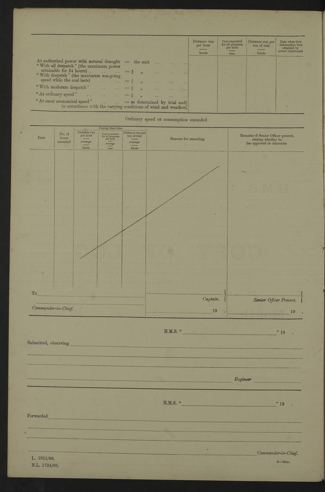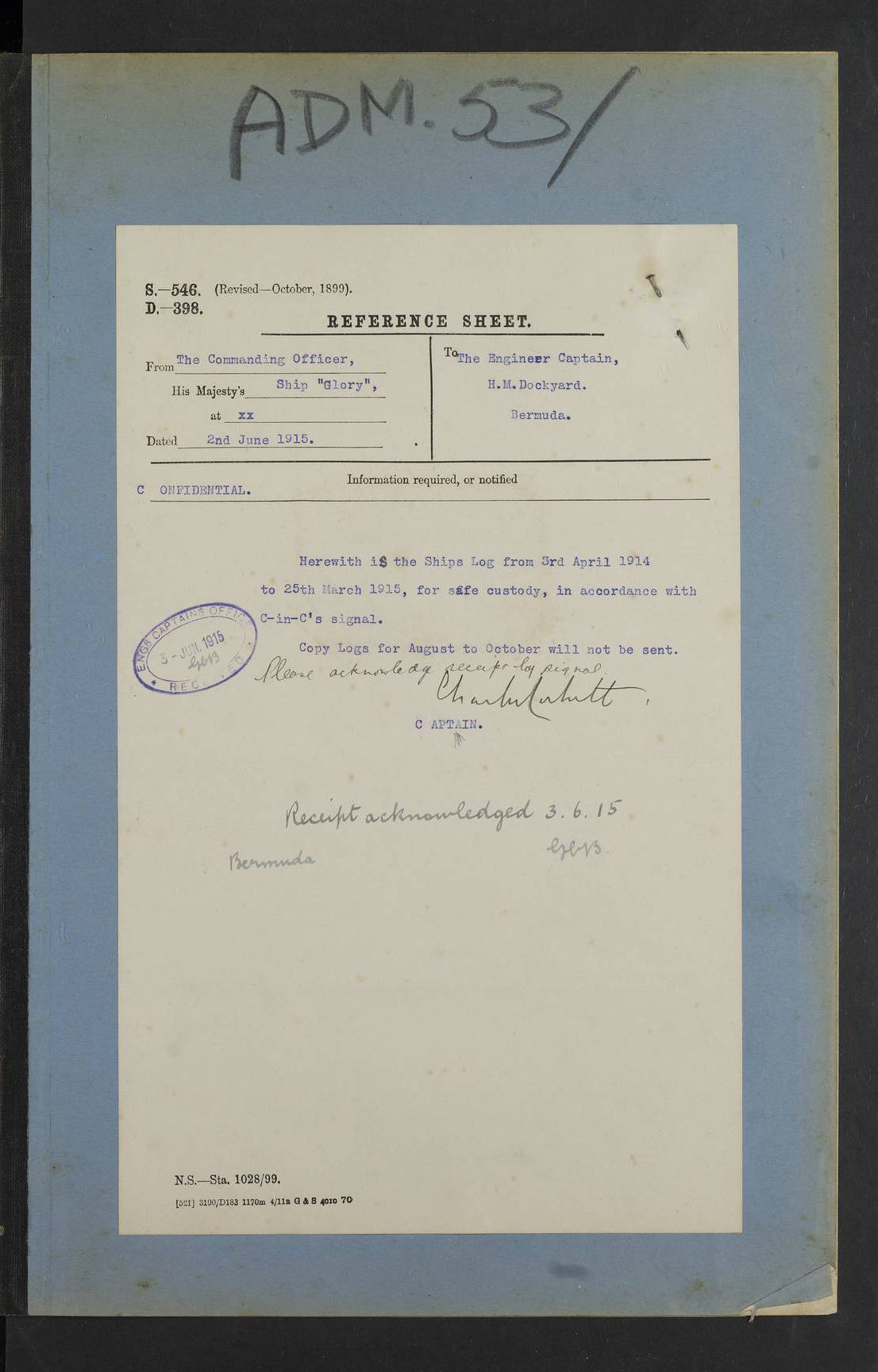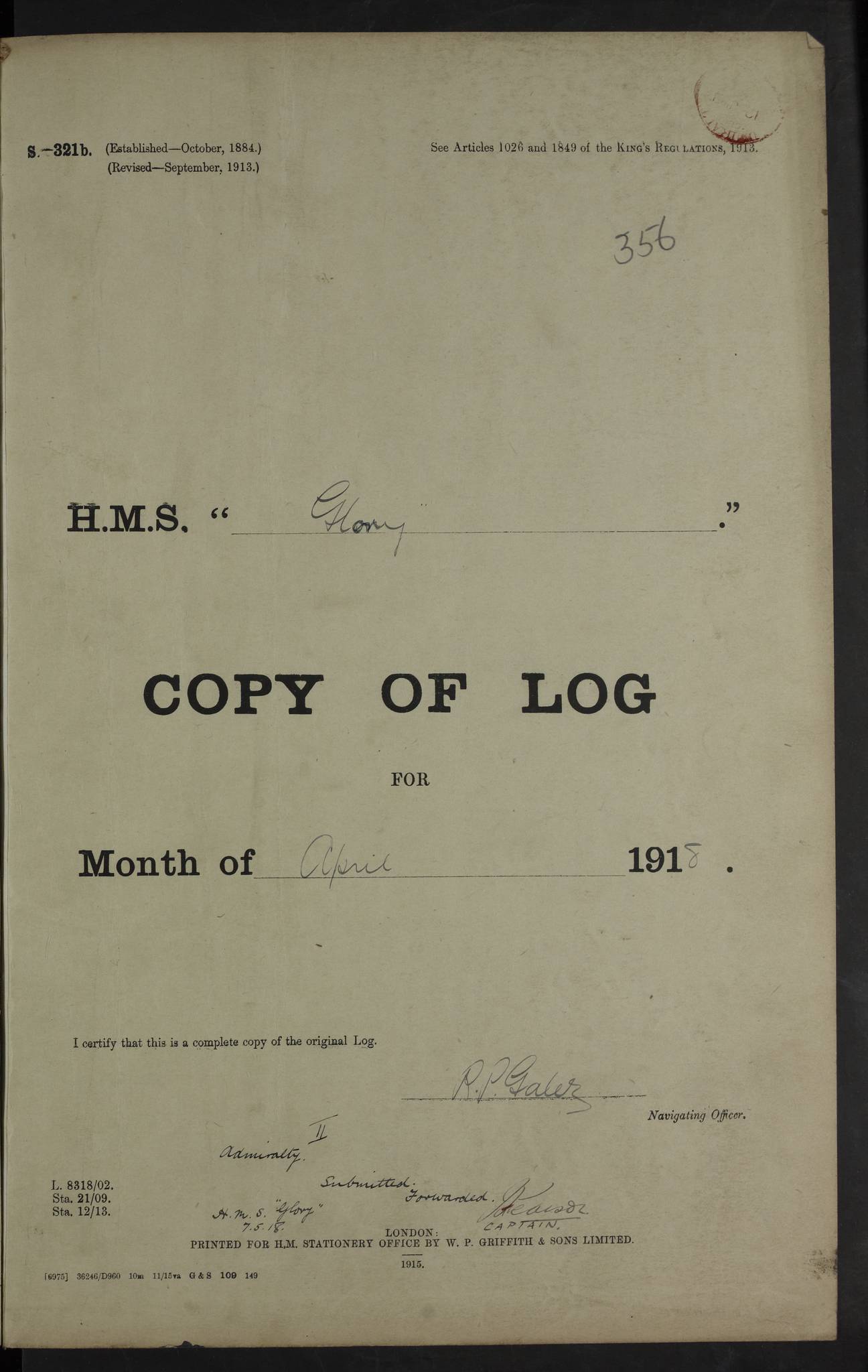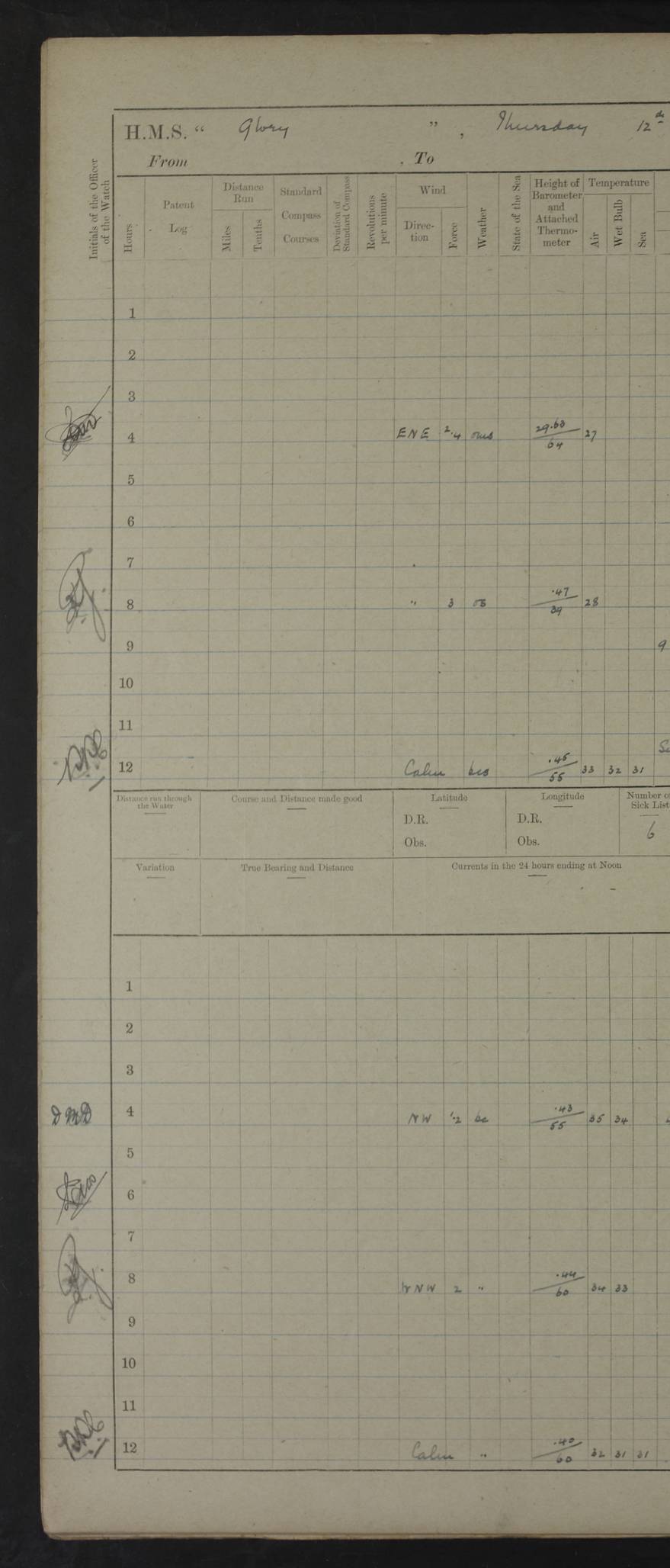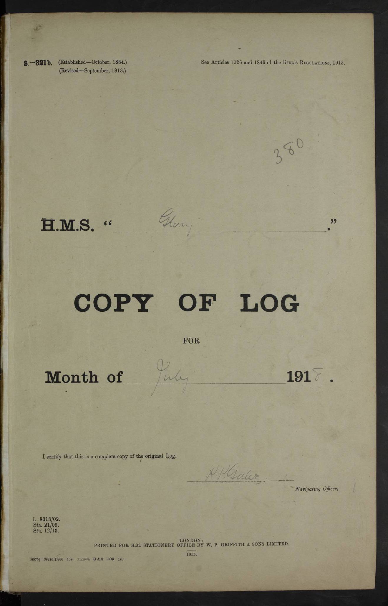22 June 1915 At sea, Gibraltar to Lemnos Lat 36.1, Long -1.3 4.15am: Sighted land on starboard bow. 10.20am: Stopped port engine for repairs. 11.20am: proceeded with port engine. pm: a/c due to change in deviation. 10.00pm: Cape Tenez Light abeam, 18 miles. 4f73cd61a2fc8ea9030015f6: (https://s3.amazonaws.com:443/oldweather/ADM53-43015/0012_1.jpg) 23 June 1915 At sea, Gibraltar to Lemnos Lat 37.5, Long 4.8 Number on sick list: 4 5.00am: Secured from night defence stations. Placed anti-submarine guns. pm: Life saving appliances served out to men stationed in ? ?at abandon ship. 4f73cd61a2fc8ea9030015f7: (https://s3.amazonaws.com:443/oldweather/ADM53-43015/0013_0.jpg) 24 June 1915 At sea, Gibraltar to Lemnos Lat 37.4, Long 10.8 Position in log clearly bears no resemblance to the location of the ship. Position above is approximate and is based sighting of Zembra Island at 11.55am. 5.00am: Dispersed from night defence stations. Manned anti-submarine guns. am: Sighted two French torpedo boats. am: Torpedo boats passed to ~ No 362, 363. am: Sighted land on starboard beam. 11.55am: Zembra Island abeam, 25 miles. 2.00pm: Sighted Pantellaria S34ºE. 4.45pm: Pantellaria Light House abeam 12 miles. 4f73cd61a2fc8ea9030015f8: (https://s3.amazonaws.com:443/oldweather/ADM53-43015/0013_1.jpg) 25 June 1915 At sea, Gibraltar to Lemnos Lat 35.5, Long 16.7 2.10am: Gozo Light abeam 17 miles. 5.00am: Dispersed from night defence stations. Manned anti-submarine guns. 4f73cd61a2fc8ea9030015f9: (https://s3.amazonaws.com:443/oldweather/ADM53-43015/0014_0.jpg) 26 June 1915 At sea, Gibraltar to Lemnos Lat 35.5, Long 22.6 Number on sick list: 5 5.00am: Dispersed from night defence stations. Manned anti-submarine guns. am: Aired night clothing. am: marines at maxim practice on quarter deck. 2.00pm: Observed land on either bow. 3.00pm: Sighted French patrol destroyer. 4.15pm: Sighted French patrol destroyer. 9.40pm: Milo Peak N63ºW. 10.26pm: Polino Light abeam to port 5.5 miles. 4f73cd62a2fc8ea9030015fa: (https://s3.amazonaws.com:443/oldweather/ADM53-43015/0014_1.jpg) 27 June 1915 At sea and at Lemnos Lat 39.1, Long 24.4 From 0.50 to 3.05am sighting of multiple light houses. 3.50am: a/c to N39ºW and commenced to zig-zag. 5.00am: Dispersed from night defence stations and placed anti-submarine guns and look-outs. am: Lost overboard by accident Hazlewood fender, pat. 311, one in number. 10.30am: Held Divine Service onboard. pm: Met and signalled HMS Minerva on patrol duty. pm: Courses and speeds as requisite while waiting orders to approach Mudros. 3.00pm: Proceeded. 5.16pm: Increased to 90 revs, commenced to zig-zag. Course as requisite for Mudros. 7.00pm: Entered Mudros Bay. 7.47pm: Stopped. Let go port anchor in ‘M3’. 8.30pm: Darkened ship. pm: Manned one 6” and one 12 pdr. 4f73cd62a2fc8ea9030015fb: (https://s3.amazonaws.com:443/oldweather/ADM53-43015/0015_0.jpg) 28 June 1915 Mudros Bay, Lemnos Lat 39.89, Long 25.24 5,00am: HMS Vengeance entered harbour. HMS Vengeance was a pre-dreadnought of the Canopus class, launched in 1899 at Vickers, Barrow, and sold for scrapping in 1921. Details at http://en.wikipedia.org/wiki/HMS_Vengeance_(1899) . am/pm/: hands preparing for coaling and about ship’s work. pm: Collier Wabana secured alongside. 4f73cd62a2fc8ea9030015fc: (https://s3.amazonaws.com:443/oldweather/ADM53-43015/0015_1.jpg) 29 June 1915 Mudros Bay, Lemnos Lat 39.89, Long 25.24 5.15am: Commenced coaling. 2.00pm: Finished coaling. Collier left. 4f73cd62a2fc8ea9030015fd: (https://s3.amazonaws.com:443/oldweather/ADM53-43015/0016_0.jpg) 30 June 1915 Mudros Bay, Lemnos Lat 39.89, Long 25.24 am: Parties away sanding, and with fire engines onshore. am: Boats away disembarking troops. am: French Flagship Patrie sailed. The Patrie was a French pre-dreadnought, launched at La Seyne shipyard in 1903, and stricken in 1921. Details at http://en.wikipedia.org/wiki/French_battleship_Patrie . 6.30pm: Hands to bathe. 4f73cd63a2fc8ea9030015fe: (https://s3.amazonaws.com:443/oldweather/ADM53-43015/0016_1.jpg) 4f73cd63a2fc8ea9030015ff: (https://s3.amazonaws.com:443/oldweather/ADM53-43015/0017_0.jpg) 4f73cd63a2fc8ea903001600: (https://s3.amazonaws.com:443/oldweather/ADM53-43015/0017_1.jpg) 4f73cd63a2fc8ea903001601: (https://s3.amazonaws.com:443/oldweather/ADM53-43015/0018_0.jpg) 4f73cd64a2fc8ea903001602: (https://s3.amazonaws.com:443/oldweather/ADM53-43015/0018_1.jpg) LOGS FOR JULY 1915 From July to October 1915, HMS Glory spent her time at Port Mudros. Certain activities typically took place daily and are not generally noted in the pages below. These activities include: Lighting fires in the picket boat around 4am and drawing the fires in the late evening; Divisions at around 9–9.30am and Evening Quarters at 4pm; Darken ship at around 8.30pm; Daily ‘cleaning ship’, with variations thereof; SBC (for ‘Signal Books Correct’) at the watch changes. 4f73cd64a2fc8ea903001603: (https://s3.amazonaws.com:443/oldweather/ADM53-43016/0000_0.jpg) 4f73cd64a2fc8ea903001604: (https://s3.amazonaws.com:443/oldweather/ADM53-43016/0000_1.jpg) 4f73cd65a2fc8ea903001605: (https://s3.amazonaws.com:443/oldweather/ADM53-43016/0001_0.jpg) 4f73cd65a2fc8ea903001606: (https://s3.amazonaws.com:443/oldweather/ADM53-43016/0001_1.jpg) 1 July 1915 Port Mudros Lat 39.89, Long 25.24 6.30am: Landed working parties preparing boom defence ships. am: Discharged Acting Commander Rayne to Hector. Hector was a kite balloon ship. No further details readily available. 5.00pm: Tug T.10 made fast astern. 7.15pm: HMS Venerable went out. 7.30pm: HMS Chatham went out. HMS Chatham was a ‘Town’ cruiser and lead ship of her class. She was launched in 1911 at Chatham Dockyard and sold in 1926. Details at http://en.wikipedia.org/wiki/HMS_Chatham_(1911) . 4f73cd65a2fc8ea903001607: (https://s3.amazonaws.com:443/oldweather/ADM53-43016/0002_0.jpg) 2 July 1915 Port Mudros Lat 39.89, Long 25.24 5.35am: Landed working parties preparing boom defence ships. am/pm: Boom defence par