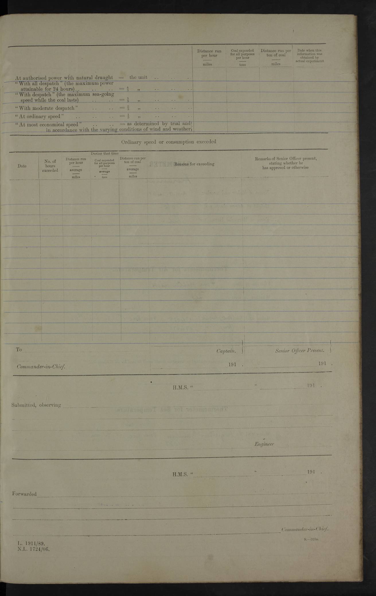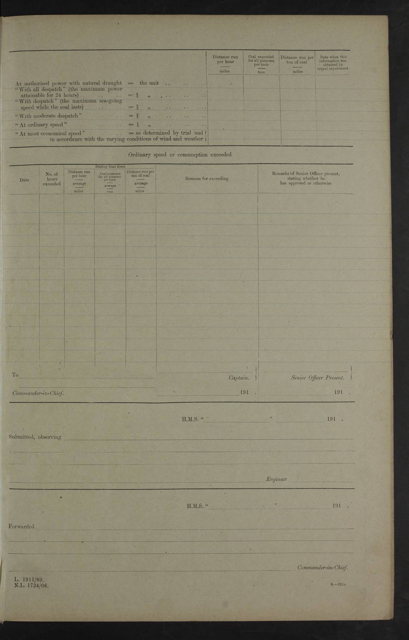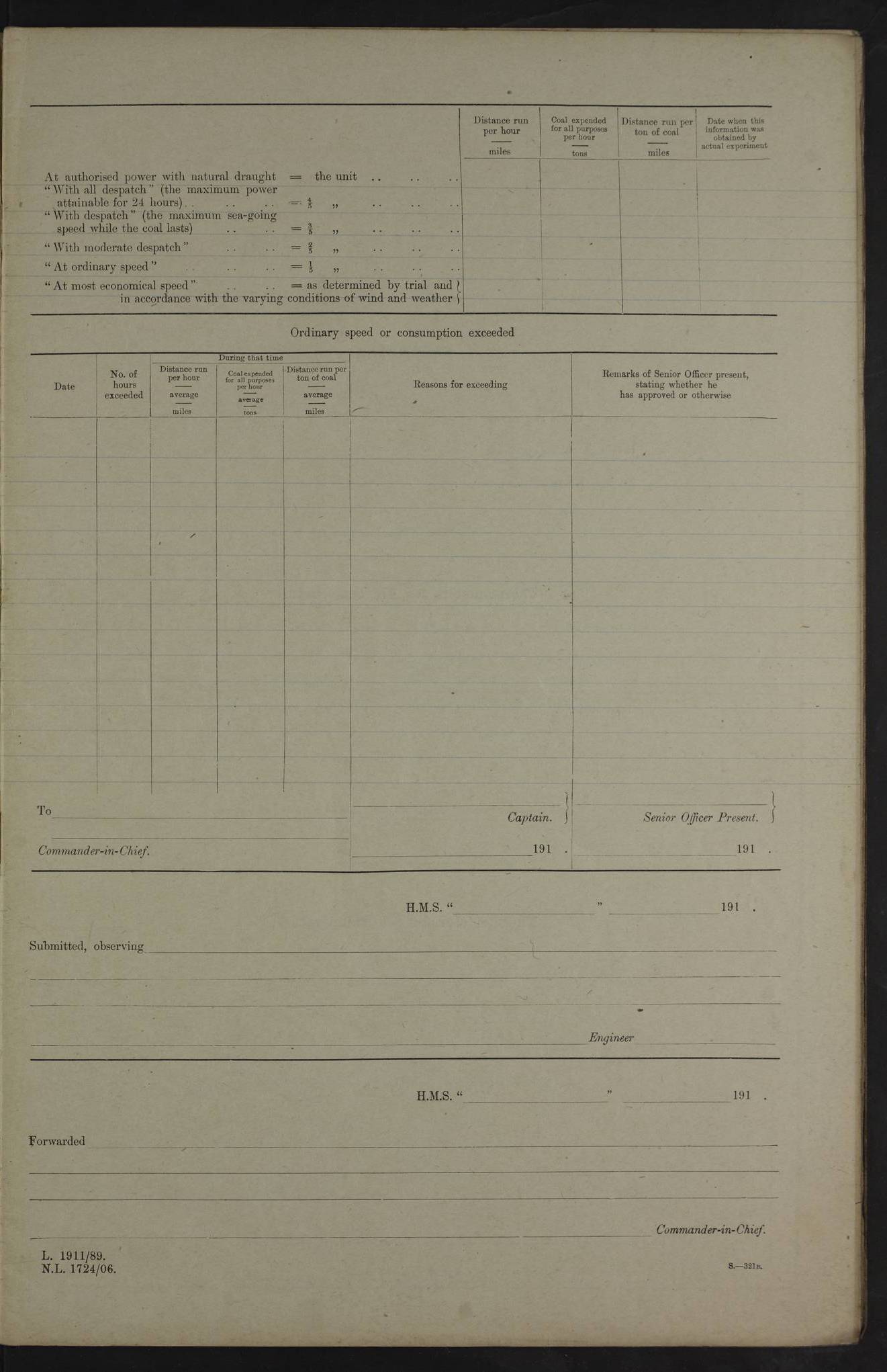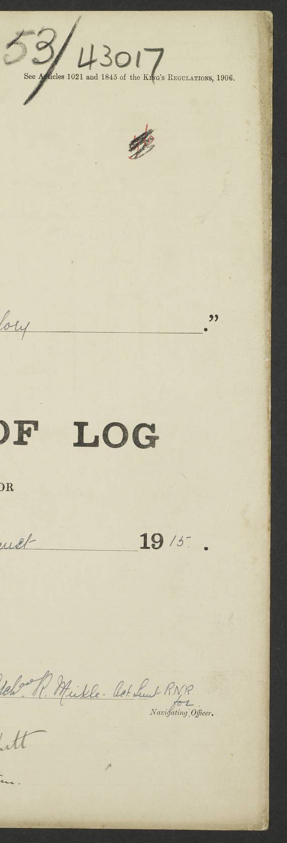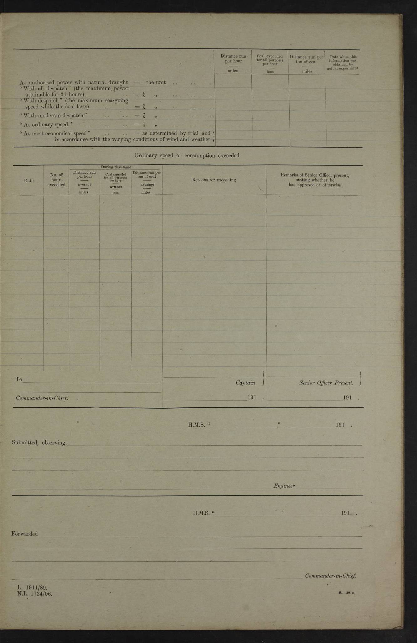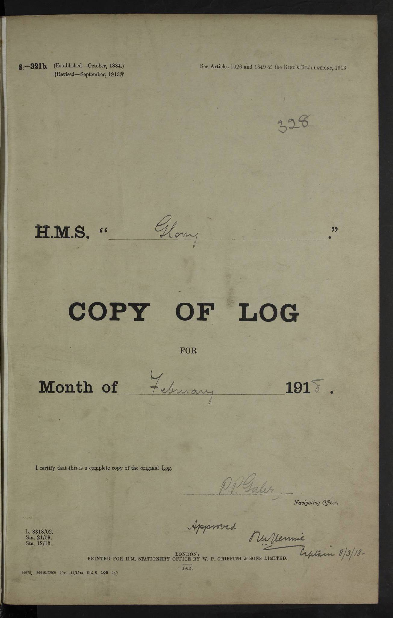 22 June 1915 At sea, Gibraltar to Lemnos Lat 36.1, Long -1.3 4.15am: Sighted land on starboard bow. 10.20am: Stopped port engine for repairs. 11.20am: proceeded with port engine. pm: a/c due to change in deviation. 10.00pm: Cape Tenez Light abeam, 18 miles. 4f73cd61a2fc8ea9030015f6: (https://s3.amazonaws.com:443/oldweather/ADM53-43015/0012_1.jpg) 23 June 1915 At sea, Gibraltar to Lemnos Lat 37.5, Long 4.8 Number on sick list: 4 5.00am: Secured from night defence stations. Placed anti-submarine guns. pm: Life saving appliances served out to men stationed in ? ?at abandon ship. 4f73cd61a2fc8ea9030015f7: (https://s3.amazonaws.com:443/oldweather/ADM53-43015/0013_0.jpg) 24 June 1915 At sea, Gibraltar to Lemnos Lat 37.4, Long 10.8 Position in log clearly bears no resemblance to the location of the ship. Position above is approximate and is based sighting of Zembra Island at 11.55am. 5.00am: Dispersed from night defence stations. Manned anti-submarine guns. am: Sighted two French torpedo boats. am: Torpedo boats passed to ~ No 362, 363. am: Sighted land on starboard beam. 11.55am: Zembra Island abeam, 25 miles. 2.00pm: Sighted Pantellaria S34ºE. 4.45pm: Pantellaria Light House abeam 12 miles. 4f73cd61a2fc8ea9030015f8: (https://s3.amazonaws.com:443/oldweather/ADM53-43015/0013_1.jpg) 25 June 1915 At sea, Gibraltar to Lemnos Lat 35.5, Long 16.7 2.10am: Gozo Light abeam 17 miles. 5.00am: Dispersed from night defence stations. Manned anti-submarine guns. 4f73cd61a2fc8ea9030015f9: (https://s3.amazonaws.com:443/oldweather/ADM53-43015/0014_0.jpg) 26 June 1915 At sea, Gibraltar to Lemnos Lat 35.5, Long 22.6 Number on sick list: 5 5.00am: Dispersed from night defence stations. Manned anti-submarine guns. am: Aired night clothing. am: marines at maxim practice on quarter deck. 2.00pm: Observed land on either bow. 3.00pm: Sighted French patrol destroyer. 4.15pm: Sighted French patrol destroyer. 9.40pm: Milo Peak N63ºW. 10.26pm: Polino Light abeam to port 5.5 miles. 4f73cd62a2fc8ea9030015fa: (https://s3.amazonaws.com:443/oldweather/ADM53-43015/0014_1.jpg) 27 June 1915 At sea and at Lemnos Lat 39.1, Long 24.4 From 0.50 to 3.05am sighting of multiple light houses. 3.50am: a/c to N39ºW and commenced to zig-zag. 5.00am: Dispersed from night defence stations and placed anti-submarine guns and look-outs. am: Lost overboard by accident Hazlewood fender, pat. 311, one in number. 10.30am: Held Divine Service onboard. pm: Met and signalled HMS Minerva on patrol duty. pm: Courses and speeds as requisite while waiting orders to approach Mudros. 3.00pm: Proceeded. 5.16pm: Increased to 90 revs, commenced to zig-zag. Course as requisite for Mudros. 7.00pm: Entered Mudros Bay. 7.47pm: Stopped. Let go port anchor in ‘M3’. 8.30pm: Darkened ship. pm: Manned one 6” and one 12 pdr. 4f73cd62a2fc8ea9030015fb: (https://s3.amazonaws.com:443/oldweather/ADM53-43015/0015_0.jpg) 28 June 1915 Mudros Bay, Lemnos Lat 39.89, Long 25.24 5,00am: HMS Vengeance entered harbour. HMS Vengeance was a pre-dreadnought of the Canopus class, launched in 1899 at Vickers, Barrow, and sold for scrapping in 1921. Details at http://en.wikipedia.org/wiki/HMS_Vengeance_(1899) . am/pm/: hands preparing for coaling and about ship’s work. pm: Collier Wabana secured alongside. 4f73cd62a2fc8ea9030015fc: (https://s3.amazonaws.com:443/oldweather/ADM53-43015/0015_1.jpg) 29 June 1915 Mudros Bay, Lemnos Lat 39.89, Long 25.24 5.15am: Commenced coaling. 2.00pm: Finished coaling. Collier left. 4f73cd62a2fc8ea9030015fd: (https://s3.amazonaws.com:443/oldweather/ADM53-43015/0016_0.jpg) 30 June 1915 Mudros Bay, Lemnos Lat 39.89, Long 25.24 am: Parties away sanding, and with fire engines onshore. am: Boats away disembarking troops. am: French Flagship Patrie sailed. The Patrie was a French pre-dreadnought, launched at La Seyne shipyard in 1903, and stricken in 1921. Details at http://en.wikipedia.org/wiki/French_battleship_Patrie . 6.30pm: Hands to bathe. 4f73cd63a2fc8ea9030015fe: (https://s3.amazonaws.com:443/oldweather/ADM53-43015/0016_1.jpg) 4f73cd63a2fc8ea9030015ff: (https://s3.amazonaws.com:443/oldweather/ADM53-43015/0017_0.jpg) 4f73cd63a2fc8ea903001600: (https://s3.amazonaws.com:443/oldweather/ADM53-43015/0017_1.jpg) 4f73cd63a2fc8ea903001601: (https://s3.amazonaws.com:443/oldweather/ADM53-43015/0018_0.jpg) 4f73cd64a2fc8ea903001602: (https://s3.amazonaws.com:443/oldweather/ADM53-43015/0018_1.jpg) LOGS FOR JULY 1915 From July to October 1915, HMS Glory spent her time at Port Mudros. Certain activities typically took place daily and are not generally noted in the pages below. These activities include: Lighting fires in the picket boat around 4am and drawing the fires in the late evening; Divisions at around 9–9.30am and Evening Quarters at 4pm; Darken ship at around 8.30pm; Daily ‘cleaning ship’, with variations thereof; SBC (for ‘Signal Books Correct’) at the watch changes. 4f73cd64a2fc8ea903001603: (https://s3.amazonaws.com:443/oldweather/ADM53-43016/0000_0.jpg) 4f73cd64a2fc8ea903001604: (https://s3.amazonaws.com:443/oldweather/ADM53-43016/0000_1.jpg) 4f73cd65a2fc8ea903001605: (https://s3.amazonaws.com:443/oldweather/ADM53-43016/0001_0.jpg) 4f73cd65a2fc8ea903001606: (https://s3.amazonaws.com:443/oldweather/ADM53-43016/0001_1.jpg) 1 July 1915 Port Mudros Lat 39.89, Long 25.24 6.30am: Landed working parties preparing boom defence ships. am: Discharged Acting Commander Rayne to Hector. Hector was a kite balloon ship. No further details readily available. 5.00pm: Tug T.10 made fast astern. 7.15pm: HMS Venerable went out. 7.30pm: HMS Chatham went out. HMS Chatham was a ‘Town’ cruiser and lead ship of her class. She was launched in 1911 at Chatham Dockyard and sold in 1926. Details at http://en.wikipedia.org/wiki/HMS_Chatham_(1911) . 4f73cd65a2fc8ea903001607: (https://s3.amazonaws.com:443/oldweather/ADM53-43016/0002_0.jpg) 2 July 1915 Port Mudros Lat 39.89, Long 25.24 5.35am: Landed working parties preparing boom defence ships. am/pm: Boom defence par