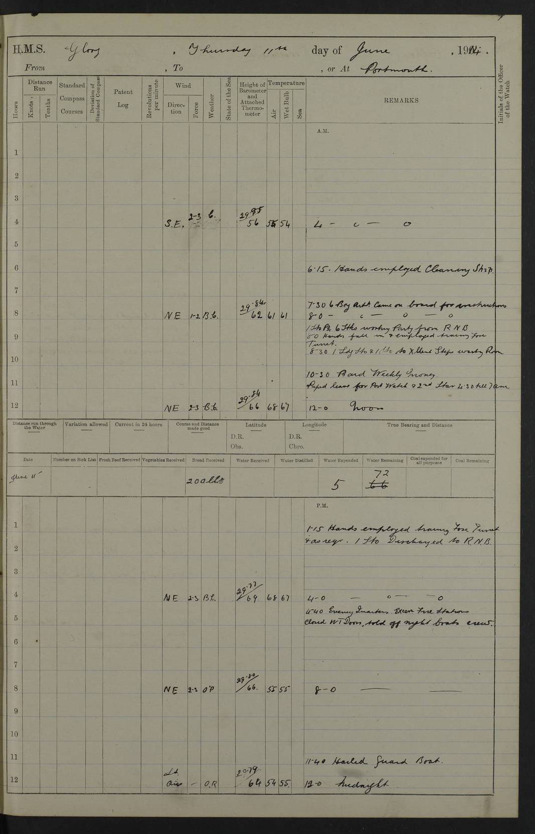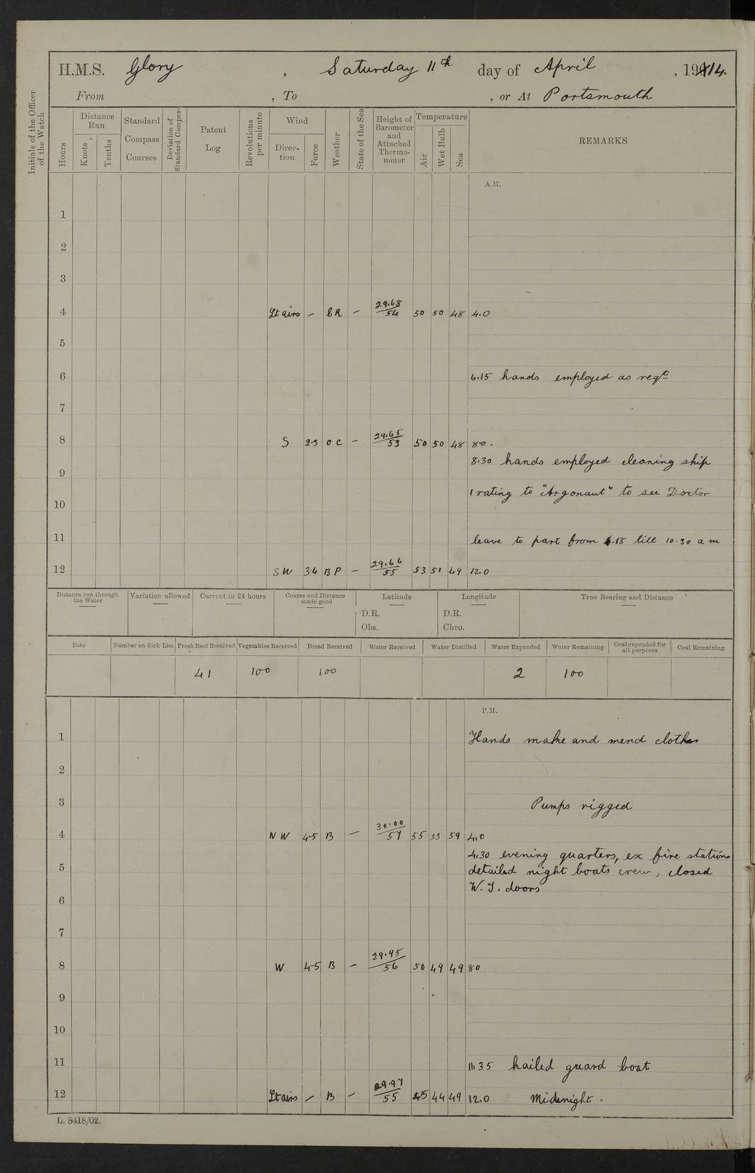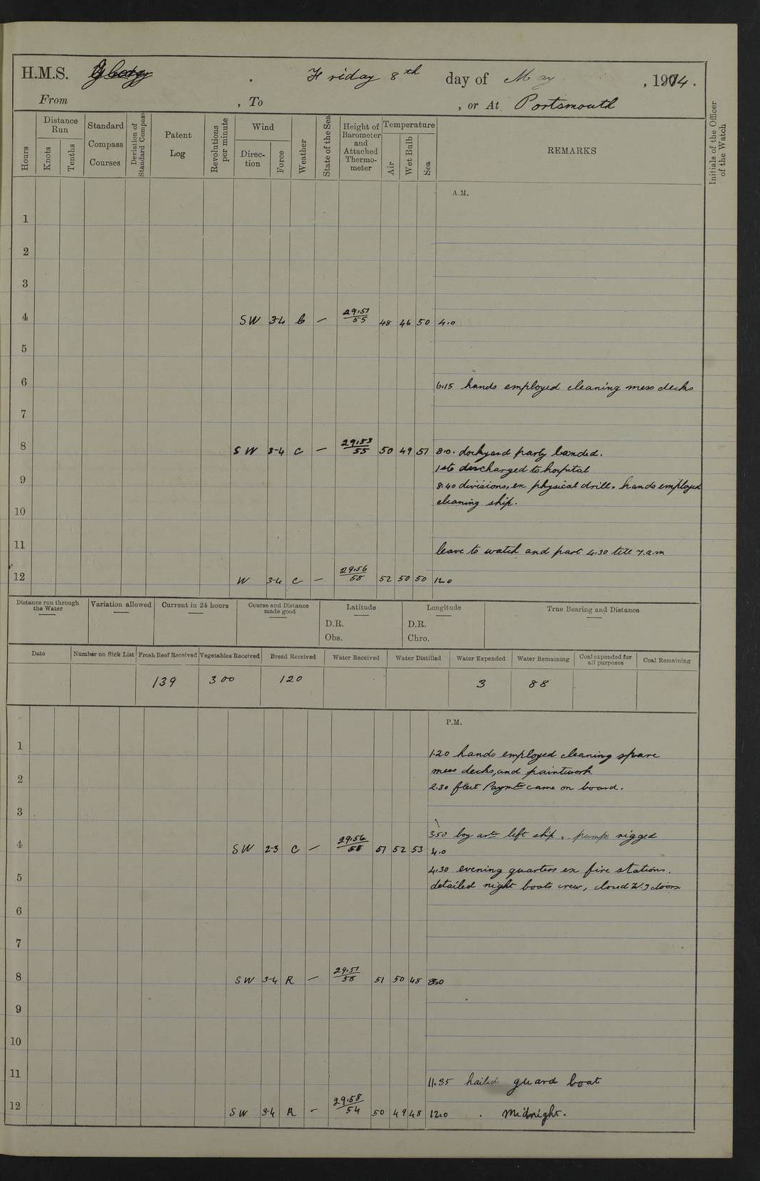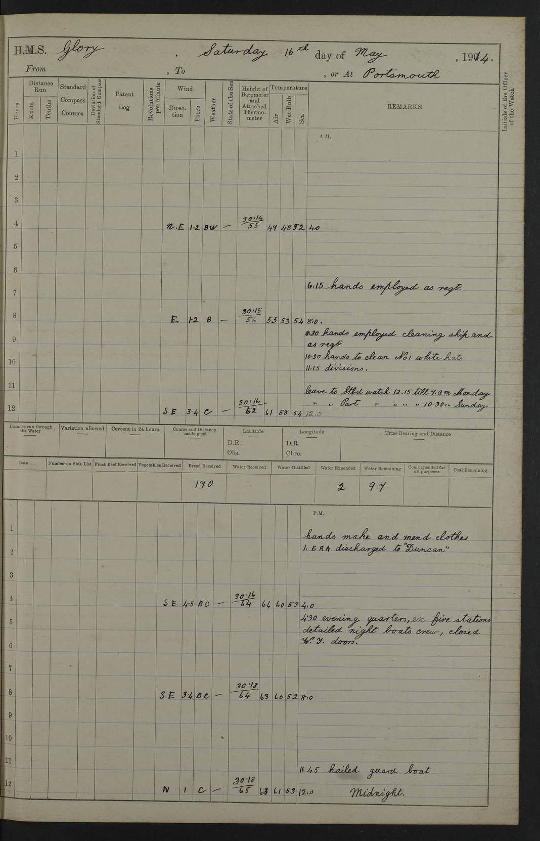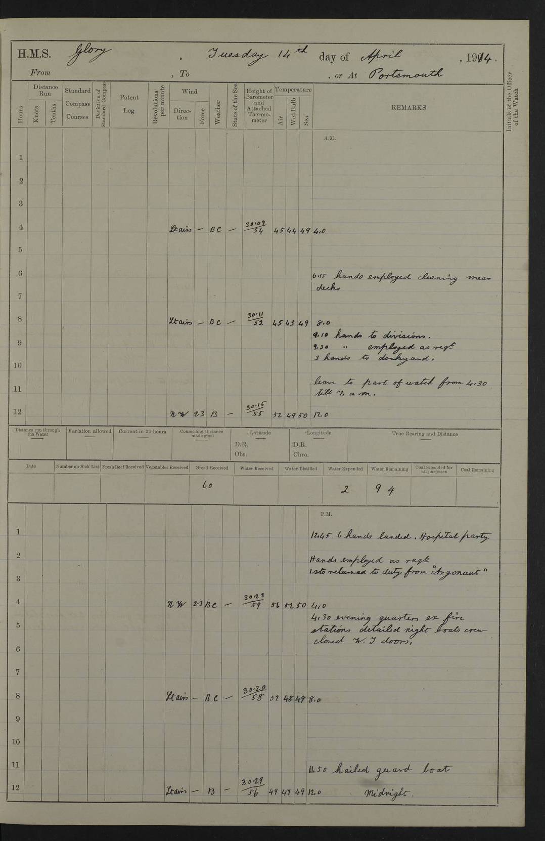 (Maps prepared using Journey Plotter, developed by Maikel. The Plots can only be approximate. They are made by joining-up positions on successive days, and sometimes positions are not given. There will therefore be occasions when the ship appears to have travelled overland) LOGS FOR APRIL 1914 April 1914 was spent in Portsmouth harbour. The daily routine usually included: hands cleaning ship, scrubbing decks or as requisite; morning Divisions; leave to part watch until the next day; rigged pumps; Evening quarters, exercising fire stations, detailing night boat’s crew and closing watertight doors. 4f73cce3a2fc8ea9030013fb: (https://s3.amazonaws.com:443/oldweather/ADM53-43011/0001_0.jpg) 4f73cce4a2fc8ea9030013fc: (https://s3.amazonaws.com:443/oldweather/ADM53-43011/0001_1.jpg) 4f73cce4a2fc8ea9030013fd: (https://s3.amazonaws.com:443/oldweather/ADM53-43011/0002_0.jpg) 4f73cce4a2fc8ea9030013fe: (https://s3.amazonaws.com:443/oldweather/ADM53-43011/0002_1.jpg) 4f73cce4a2fc8ea9030013ff: (https://s3.amazonaws.com:443/oldweather/ADM53-43011/0003_0.jpg) 4f73cce5a2fc8ea903001400: (https://s3.amazonaws.com:443/oldweather/ADM53-43011/0003_1.jpg) 4f73cce5a2fc8ea903001401: (https://s3.amazonaws.com:443/oldweather/ADM53-43011/0004_0.jpg) 4f73cce5a2fc8ea903001402: (https://s3.amazonaws.com:443/oldweather/ADM53-43011/0004_1.jpg) 4f73cce5a2fc8ea903001403: (https://s3.amazonaws.com:443/oldweather/ADM53-43011/0005_0.jpg) 3 April 1914 Portsmouth Lat 50.81, Long -1.11 8.00am: 1 Stoker to Argonaut to pass Doctor. HMS Argonaut was a protected cruiser of the Diadem class. She was launched in 1898 at Fairfield, Govan, and was sold in 1920. Details at http://en.wikipedia.org/wiki/HMS_Argonaut_(1898) . 8.30am: 12 boy Artificers came on board. 9.10am: 3 RFR men came on board for mobilization stations. pm: Pumps rigged. pm: 12 boy artificers left ship. 4f73cce6a2fc8ea903001404: (https://s3.amazonaws.com:443/oldweather/ADM53-43011/0005_1.jpg) 4 April 1914 Portsmouth Lat 50.81, Long -1.11 0.35am: Hailed guard boat. 8.00am: Discharged 1 stoker to Argonaut for Haslar. The Royal Hospital Haslar at Gosport, Hampshire, was one of several hospitals serving the Portsmouth area. Details at: http://en.wikipedia.org/wiki/Royal_Hospital_Haslar . 2.00pm: 2 stokers and 1 ship’s Steward joined ship from RNB. ‘RNB’ is Royal Naval Barracks. pm: Pumps rigged. 6.00pm: 1 stoker and 1 AB joined ship from Hospital. 11.30pm: Hailed guard boat 4f73cce6a2fc8ea903001405: (https://s3.amazonaws.com:443/oldweather/ADM53-43011/0006_0.jpg) 5 April 1914 Portsmouth Lat 50.81, Long -1.11 11.15pm: Hailed guard boat. 4f73cce6a2fc8ea903001406: (https://s3.amazonaws.com:443/oldweather/ADM53-43011/0006_1.jpg) 6 April 1914 Portsmouth Lat 50.81, Long -1.11 9.30am: Coding class to Argonaut. am: Dockyard party landed. am: 4 ratings joined ship from Monarch. HMS Monarch was an Orion class dreadnought, launched at Portsmouth Dockyard in 1910 and sunk as a target off Scilly in 1925. Details at http://en.wikipedia.org/wiki/HMS_Monarch_(1911) . 2.00pm: 1 SPO joined ship from RNB. 11.40pm: Hailed guard boat. 4f73cce6a2fc8ea903001407: (https://s3.amazonaws.com:443/oldweather/ADM53-43011/0007_0.jpg) 7 April 1914 Portsmouth Lat 50.81, Long -1.11 am: 4 ratings discharged to Monarch. 8.00am: 8 ratings to Argonaut to see Doctor. am: 2 hands to Dockyard to draw stores. am: 1 ERA joined ship from Good Hope. HMS Good Hope was an armoured cruiser of the Drake class, launched at Fairfield in 1901 and sunk at the Battle of Coronel on 1 November 1914. Details at http://en.wikipedia.org/wiki/HMS_Good_Hope_(1901) . 11.15pm: Hailed guard boat. 4f73cce7a2fc8ea903001408: (https://s3.amazonaws.com:443/oldweather/ADM53-43011/0007_1.jpg) 8 April 1914 Portsmouth Lat 50.81, Long -1.11 am: Hands employed getting out ammunition for heat tests. 11.35pm: Hailed guard boat. 4f73cce7a2fc8ea903001409: (https://s3.amazonaws.com:443/oldweather/ADM53-43011/0008_0.jpg) 9 April 1914 Portsmouth Lat 50.81, Long -1.11 8.00am: 2 hands to Argonaut to see Doctor. 11.00am: Paid weekly money. 11.25pm: Hailed guard boat. 4f73cce7a2fc8ea90300140a: (https://s3.amazonaws.com:443/oldweather/ADM53-43011/0008_1.jpg) 10 April 1914 Portsmouth Lat 50.81, Long -1.11 9.50am: Sent church party to Vernon. HMS Vernon is a naval shore establishment at Portsmouth. Details at : http://en.wikipedia.org/wiki/HMS_Vernon_(shore_establishment) . 11.45pm: Hailed guard boat. 4f73cce7a2fc8ea90300140b: (https://s3.amazonaws.com:443/oldweather/ADM53-43011/0009_0.jpg) 11 April 1914 Portsmouth Lat 50.81, Long -1.11 am: 1 rating to Argonaut to see Doctor. 11.35pm: Hailed guard boat. 4f73cce7a2fc8ea90300140c: (https://s3.amazonaws.com:443/oldweather/ADM53-43011/0009_1.jpg) 12 April 1914 Portsmouth Lat 50.81, Long -1.11 9.50am: Sent church party to Vernon. 12 midnight: Hailed guard boat. 4f73cce8a2fc8ea90300140d: (https://s3.amazonaws.com:443/oldweather/ADM53-43011/0010_0.jpg) 13 April 1914 Portsmouth Lat 50.81, Long -1.11 am: 1 AB to Argonaut to see Doctor (detained sick). 11.50pm: Hailed guard boat. 4f73cce8a2fc8ea90300140e: (https://s3.amazonaws.com:443/oldweather/ADM53-43011/0010_1.jpg) 14 April 1914 Portsmouth Lat 50.81, Long -1.11 am: 3 hands to dockyard. 12.45pm: 6 hands landed. Hospital party. pm: 1 stoker returned to duty from Argonaut. 11.50pm: Hailed guard boat. 4f73cce8a2fc8ea90300140f: (https://s3.amazonaws.com:443/oldweather/ADM53-43011/0011_0.jpg) 15 April 1914 Portsmouth Lat 50.81, Long -1.11 am: Discharged 1 ERA to RNB for basin trials of Isis. HMS Isis was a 2nd class (protected) cruiser of the Eclipse class. She was launched in 1896 at London & Glasgow and was sold in 1920. Details at http://en.wikipedia.org/wiki/HMS_Isis_(1896) . am: Liberty men returned from leave. 11.40pm: Hailed guard boat. 4f73cce8a2fc8ea903001410: (https://s3.amazonaws.com:443/oldweather/ADM53-43011/0011_1.jpg) 16 April 1914 Portsmouth Lat 50.81, Long -1.11 am: 1 leading stoker, 1 stoker to RNB. 10.45am: Paid weekly money. 4f73cce9a2fc8ea90300