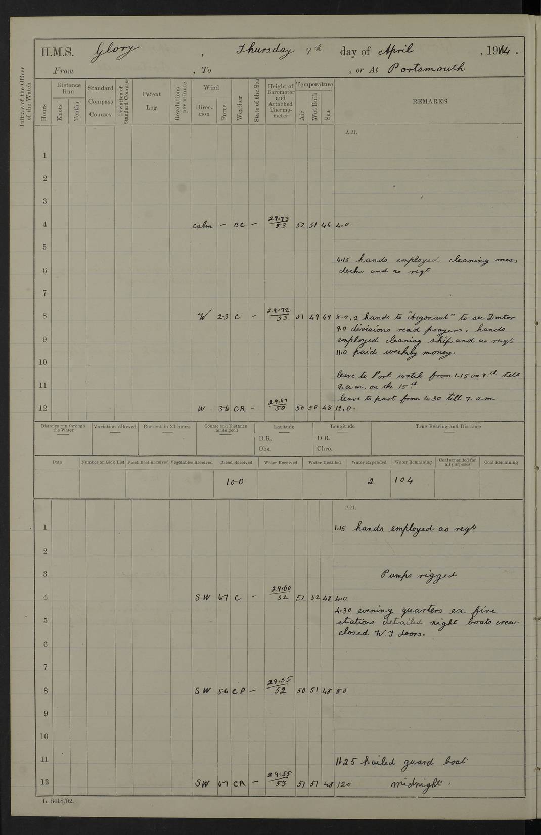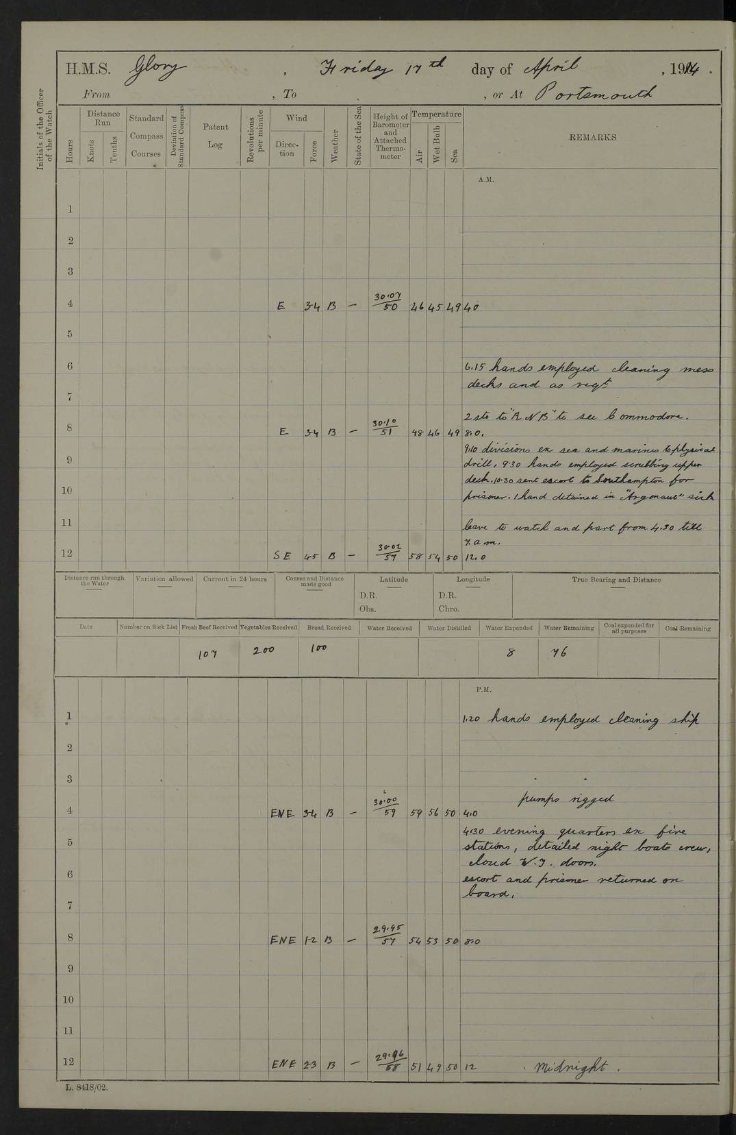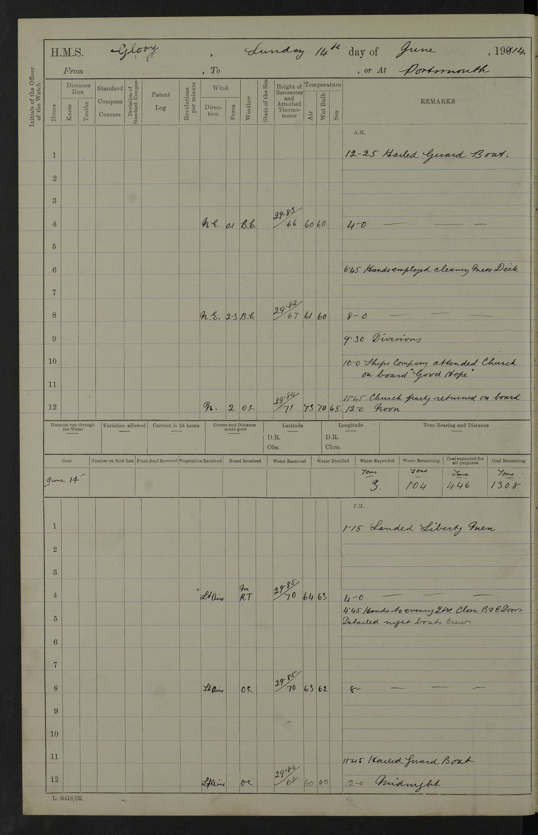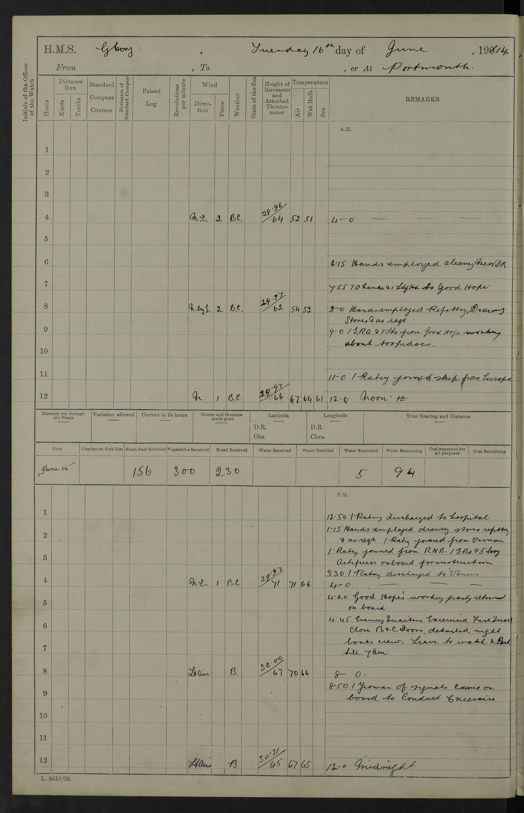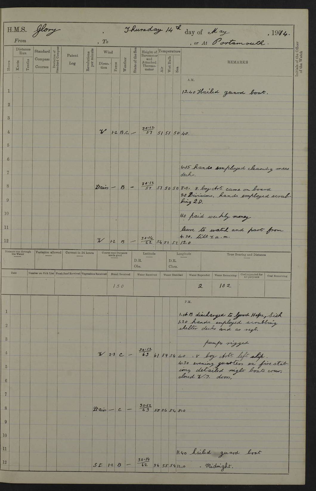 (Maps prepared using Journey Plotter, developed by Maikel. The Plots can only be approximate. They are made by joining-up positions on successive days, and sometimes positions are not given. There will therefore be occasions when the ship appears to have travelled overland) LOGS FOR APRIL 1914 April 1914 was spent in Portsmouth harbour. The daily routine usually included: hands cleaning ship, scrubbing decks or as requisite; morning Divisions; leave to part watch until the next day; rigged pumps; Evening quarters, exercising fire stations, detailing night boat’s crew and closing watertight doors. 4f73cce3a2fc8ea9030013fb: (https://s3.amazonaws.com:443/oldweather/ADM53-43011/0001_0.jpg) 4f73cce4a2fc8ea9030013fc: (https://s3.amazonaws.com:443/oldweather/ADM53-43011/0001_1.jpg) 4f73cce4a2fc8ea9030013fd: (https://s3.amazonaws.com:443/oldweather/ADM53-43011/0002_0.jpg) 4f73cce4a2fc8ea9030013fe: (https://s3.amazonaws.com:443/oldweather/ADM53-43011/0002_1.jpg) 4f73cce4a2fc8ea9030013ff: (https://s3.amazonaws.com:443/oldweather/ADM53-43011/0003_0.jpg) 4f73cce5a2fc8ea903001400: (https://s3.amazonaws.com:443/oldweather/ADM53-43011/0003_1.jpg) 4f73cce5a2fc8ea903001401: (https://s3.amazonaws.com:443/oldweather/ADM53-43011/0004_0.jpg) 4f73cce5a2fc8ea903001402: (https://s3.amazonaws.com:443/oldweather/ADM53-43011/0004_1.jpg) 4f73cce5a2fc8ea903001403: (https://s3.amazonaws.com:443/oldweather/ADM53-43011/0005_0.jpg) 3 April 1914 Portsmouth Lat 50.81, Long -1.11 8.00am: 1 Stoker to Argonaut to pass Doctor. HMS Argonaut was a protected cruiser of the Diadem class. She was launched in 1898 at Fairfield, Govan, and was sold in 1920. Details at http://en.wikipedia.org/wiki/HMS_Argonaut_(1898) . 8.30am: 12 boy Artificers came on board. 9.10am: 3 RFR men came on board for mobilization stations. pm: Pumps rigged. pm: 12 boy artificers left ship. 4f73cce6a2fc8ea903001404: (https://s3.amazonaws.com:443/oldweather/ADM53-43011/0005_1.jpg) 4 April 1914 Portsmouth Lat 50.81, Long -1.11 0.35am: Hailed guard boat. 8.00am: Discharged 1 stoker to Argonaut for Haslar. The Royal Hospital Haslar at Gosport, Hampshire, was one of several hospitals serving the Portsmouth area. Details at: http://en.wikipedia.org/wiki/Royal_Hospital_Haslar . 2.00pm: 2 stokers and 1 ship’s Steward joined ship from RNB. ‘RNB’ is Royal Naval Barracks. pm: Pumps rigged. 6.00pm: 1 stoker and 1 AB joined ship from Hospital. 11.30pm: Hailed guard boat 4f73cce6a2fc8ea903001405: (https://s3.amazonaws.com:443/oldweather/ADM53-43011/0006_0.jpg) 5 April 1914 Portsmouth Lat 50.81, Long -1.11 11.15pm: Hailed guard boat. 4f73cce6a2fc8ea903001406: (https://s3.amazonaws.com:443/oldweather/ADM53-43011/0006_1.jpg) 6 April 1914 Portsmouth Lat 50.81, Long -1.11 9.30am: Coding class to Argonaut. am: Dockyard party landed. am: 4 ratings joined ship from Monarch. HMS Monarch was an Orion class dreadnought, launched at Portsmouth Dockyard in 1910 and sunk as a target off Scilly in 1925. Details at http://en.wikipedia.org/wiki/HMS_Monarch_(1911) . 2.00pm: 1 SPO joined ship from RNB. 11.40pm: Hailed guard boat. 4f73cce6a2fc8ea903001407: (https://s3.amazonaws.com:443/oldweather/ADM53-43011/0007_0.jpg) 7 April 1914 Portsmouth Lat 50.81, Long -1.11 am: 4 ratings discharged to Monarch. 8.00am: 8 ratings to Argonaut to see Doctor. am: 2 hands to Dockyard to draw stores. am: 1 ERA joined ship from Good Hope. HMS Good Hope was an armoured cruiser of the Drake class, launched at Fairfield in 1901 and sunk at the Battle of Coronel on 1 November 1914. Details at http://en.wikipedia.org/wiki/HMS_Good_Hope_(1901) . 11.15pm: Hailed guard boat. 4f73cce7a2fc8ea903001408: (https://s3.amazonaws.com:443/oldweather/ADM53-43011/0007_1.jpg) 8 April 1914 Portsmouth Lat 50.81, Long -1.11 am: Hands employed getting out ammunition for heat tests. 11.35pm: Hailed guard boat. 4f73cce7a2fc8ea903001409: (https://s3.amazonaws.com:443/oldweather/ADM53-43011/0008_0.jpg) 9 April 1914 Portsmouth Lat 50.81, Long -1.11 8.00am: 2 hands to Argonaut to see Doctor. 11.00am: Paid weekly money. 11.25pm: Hailed guard boat. 4f73cce7a2fc8ea90300140a: (https://s3.amazonaws.com:443/oldweather/ADM53-43011/0008_1.jpg) 10 April 1914 Portsmouth Lat 50.81, Long -1.11 9.50am: Sent church party to Vernon. HMS Vernon is a naval shore establishment at Portsmouth. Details at : http://en.wikipedia.org/wiki/HMS_Vernon_(shore_establishment) . 11.45pm: Hailed guard boat. 4f73cce7a2fc8ea90300140b: (https://s3.amazonaws.com:443/oldweather/ADM53-43011/0009_0.jpg) 11 April 1914 Portsmouth Lat 50.81, Long -1.11 am: 1 rating to Argonaut to see Doctor. 11.35pm: Hailed guard boat. 4f73cce7a2fc8ea90300140c: (https://s3.amazonaws.com:443/oldweather/ADM53-43011/0009_1.jpg) 12 April 1914 Portsmouth Lat 50.81, Long -1.11 9.50am: Sent church party to Vernon. 12 midnight: Hailed guard boat. 4f73cce8a2fc8ea90300140d: (https://s3.amazonaws.com:443/oldweather/ADM53-43011/0010_0.jpg) 13 April 1914 Portsmouth Lat 50.81, Long -1.11 am: 1 AB to Argonaut to see Doctor (detained sick). 11.50pm: Hailed guard boat. 4f73cce8a2fc8ea90300140e: (https://s3.amazonaws.com:443/oldweather/ADM53-43011/0010_1.jpg) 14 April 1914 Portsmouth Lat 50.81, Long -1.11 am: 3 hands to dockyard. 12.45pm: 6 hands landed. Hospital party. pm: 1 stoker returned to duty from Argonaut. 11.50pm: Hailed guard boat. 4f73cce8a2fc8ea90300140f: (https://s3.amazonaws.com:443/oldweather/ADM53-43011/0011_0.jpg) 15 April 1914 Portsmouth Lat 50.81, Long -1.11 am: Discharged 1 ERA to RNB for basin trials of Isis. HMS Isis was a 2nd class (protected) cruiser of the Eclipse class. She was launched in 1896 at London & Glasgow and was sold in 1920. Details at http://en.wikipedia.org/wiki/HMS_Isis_(1896) . am: Liberty men returned from leave. 11.40pm: Hailed guard boat. 4f73cce8a2fc8ea903001410: (https://s3.amazonaws.com:443/oldweather/ADM53-43011/0011_1.jpg) 16 April 1914 Portsmouth Lat 50.81, Long -1.11 am: 1 leading stoker, 1 stoker to RNB. 10.45am: Paid weekly money. 4f73cce9a2fc8ea90300