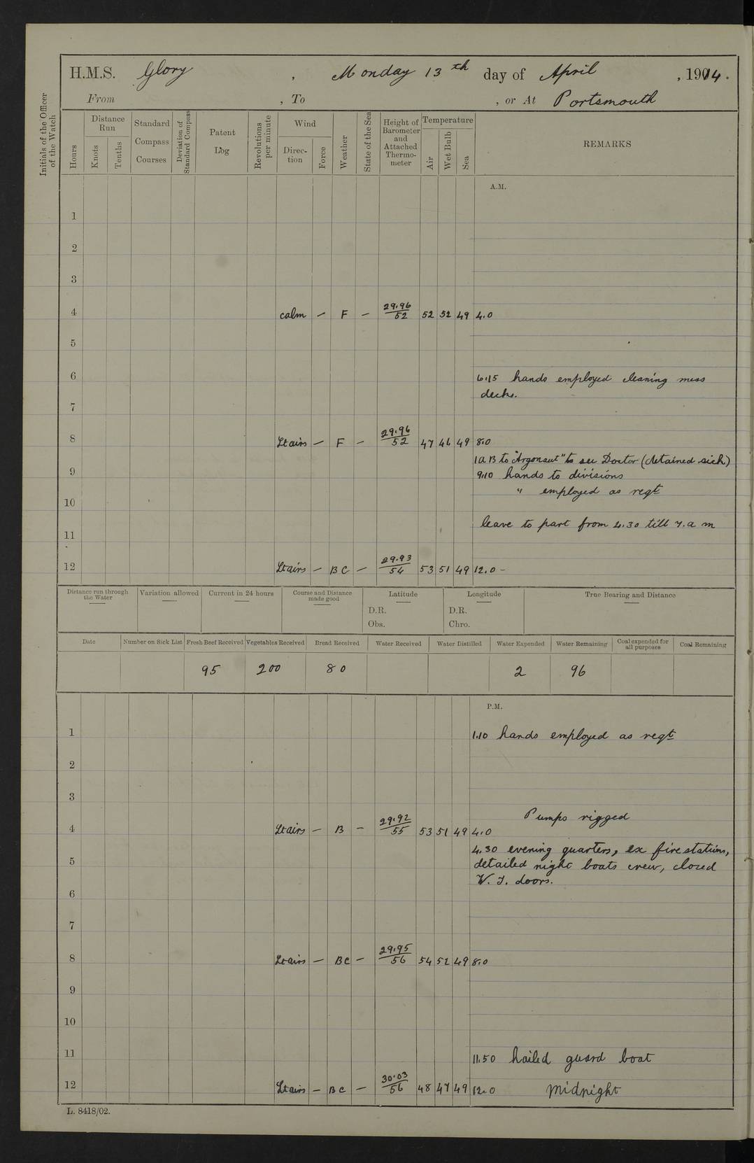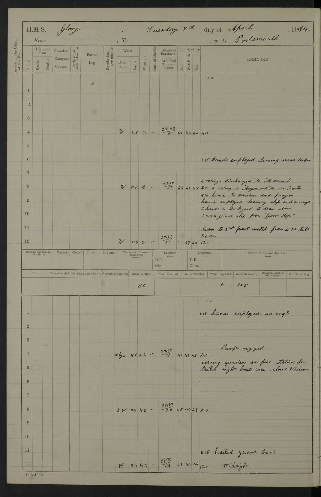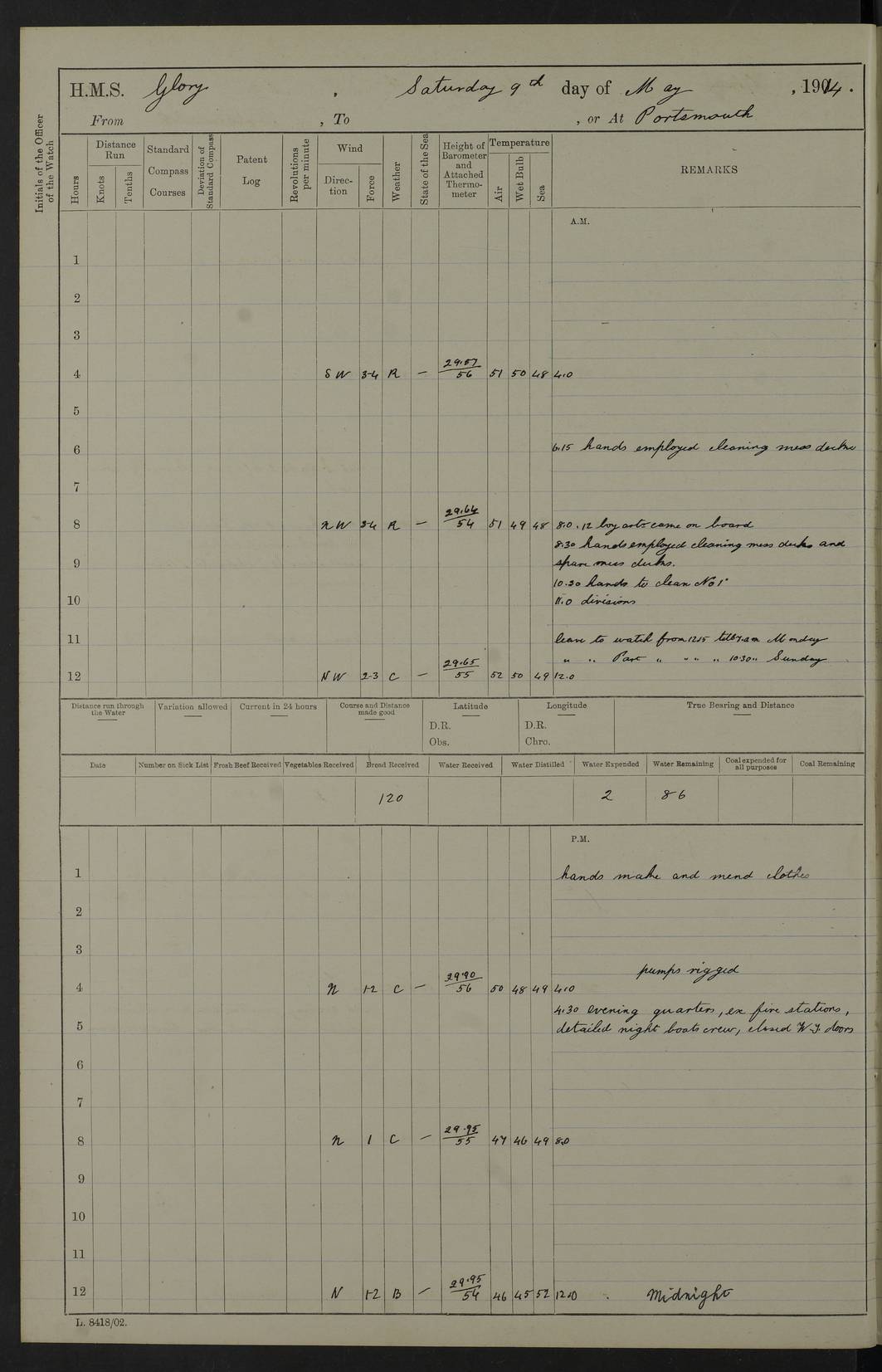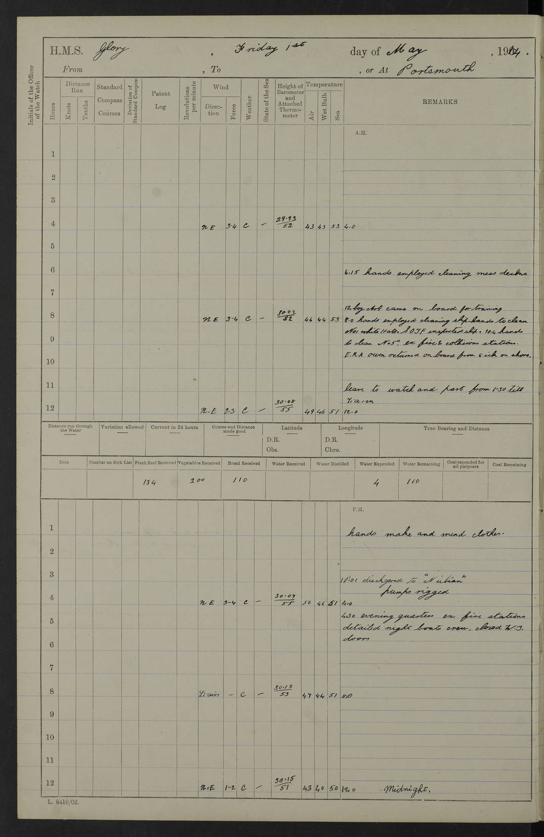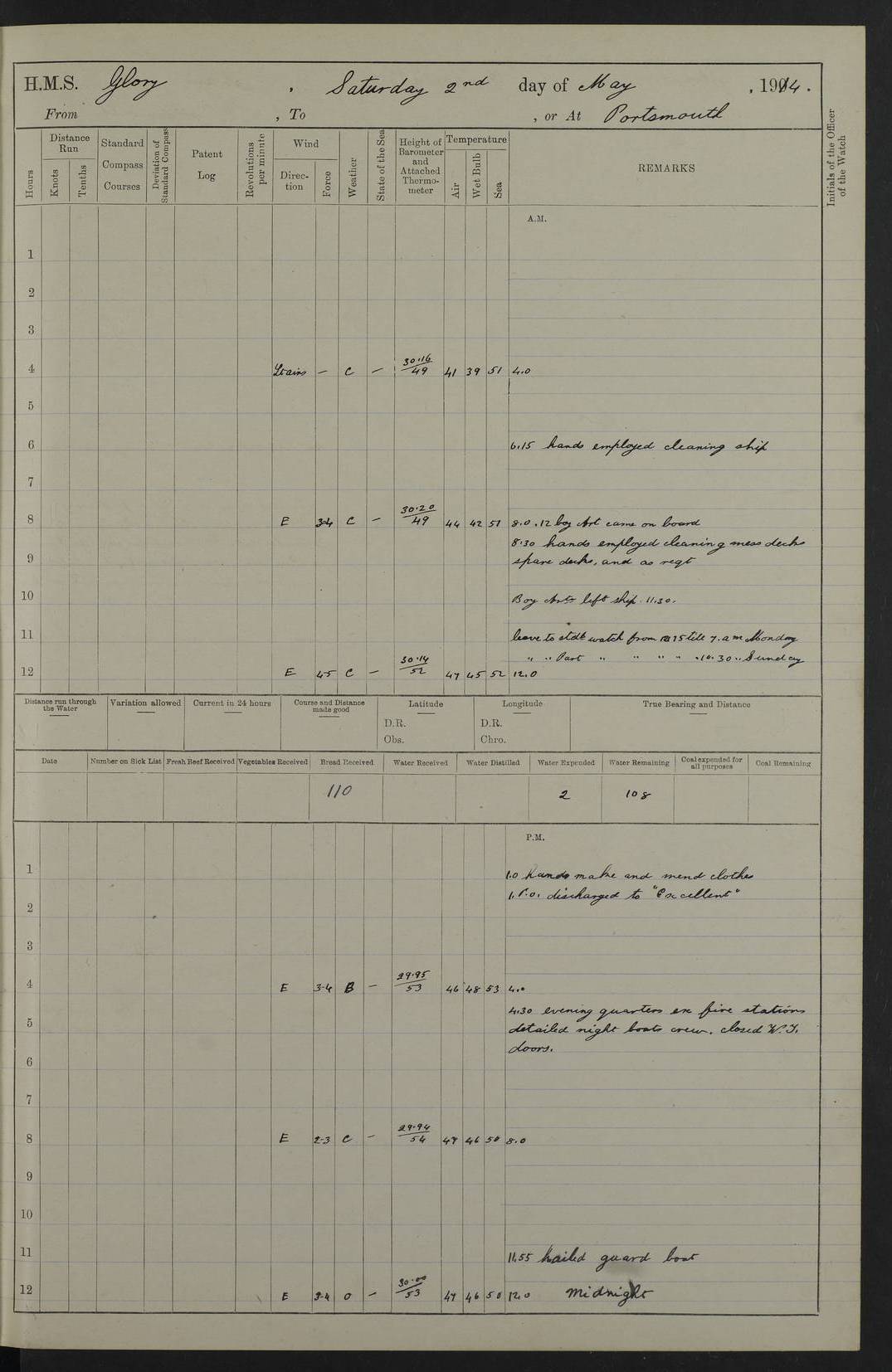 (Maps prepared using Journey Plotter, developed by Maikel. The Plots can only be approximate. They are made by joining-up positions on successive days, and sometimes positions are not given. There will therefore be occasions when the ship appears to have travelled overland) LOGS FOR APRIL 1914 April 1914 was spent in Portsmouth harbour. The daily routine usually included: hands cleaning ship, scrubbing decks or as requisite; morning Divisions; leave to part watch until the next day; rigged pumps; Evening quarters, exercising fire stations, detailing night boat’s crew and closing watertight doors. 4f73cce3a2fc8ea9030013fb: (https://s3.amazonaws.com:443/oldweather/ADM53-43011/0001_0.jpg) 4f73cce4a2fc8ea9030013fc: (https://s3.amazonaws.com:443/oldweather/ADM53-43011/0001_1.jpg) 4f73cce4a2fc8ea9030013fd: (https://s3.amazonaws.com:443/oldweather/ADM53-43011/0002_0.jpg) 4f73cce4a2fc8ea9030013fe: (https://s3.amazonaws.com:443/oldweather/ADM53-43011/0002_1.jpg) 4f73cce4a2fc8ea9030013ff: (https://s3.amazonaws.com:443/oldweather/ADM53-43011/0003_0.jpg) 4f73cce5a2fc8ea903001400: (https://s3.amazonaws.com:443/oldweather/ADM53-43011/0003_1.jpg) 4f73cce5a2fc8ea903001401: (https://s3.amazonaws.com:443/oldweather/ADM53-43011/0004_0.jpg) 4f73cce5a2fc8ea903001402: (https://s3.amazonaws.com:443/oldweather/ADM53-43011/0004_1.jpg) 4f73cce5a2fc8ea903001403: (https://s3.amazonaws.com:443/oldweather/ADM53-43011/0005_0.jpg) 3 April 1914 Portsmouth Lat 50.81, Long -1.11 8.00am: 1 Stoker to Argonaut to pass Doctor. HMS Argonaut was a protected cruiser of the Diadem class. She was launched in 1898 at Fairfield, Govan, and was sold in 1920. Details at http://en.wikipedia.org/wiki/HMS_Argonaut_(1898) . 8.30am: 12 boy Artificers came on board. 9.10am: 3 RFR men came on board for mobilization stations. pm: Pumps rigged. pm: 12 boy artificers left ship. 4f73cce6a2fc8ea903001404: (https://s3.amazonaws.com:443/oldweather/ADM53-43011/0005_1.jpg) 4 April 1914 Portsmouth Lat 50.81, Long -1.11 0.35am: Hailed guard boat. 8.00am: Discharged 1 stoker to Argonaut for Haslar. The Royal Hospital Haslar at Gosport, Hampshire, was one of several hospitals serving the Portsmouth area. Details at: http://en.wikipedia.org/wiki/Royal_Hospital_Haslar . 2.00pm: 2 stokers and 1 ship’s Steward joined ship from RNB. ‘RNB’ is Royal Naval Barracks. pm: Pumps rigged. 6.00pm: 1 stoker and 1 AB joined ship from Hospital. 11.30pm: Hailed guard boat 4f73cce6a2fc8ea903001405: (https://s3.amazonaws.com:443/oldweather/ADM53-43011/0006_0.jpg) 5 April 1914 Portsmouth Lat 50.81, Long -1.11 11.15pm: Hailed guard boat. 4f73cce6a2fc8ea903001406: (https://s3.amazonaws.com:443/oldweather/ADM53-43011/0006_1.jpg) 6 April 1914 Portsmouth Lat 50.81, Long -1.11 9.30am: Coding class to Argonaut. am: Dockyard party landed. am: 4 ratings joined ship from Monarch. HMS Monarch was an Orion class dreadnought, launched at Portsmouth Dockyard in 1910 and sunk as a target off Scilly in 1925. Details at http://en.wikipedia.org/wiki/HMS_Monarch_(1911) . 2.00pm: 1 SPO joined ship from RNB. 11.40pm: Hailed guard boat. 4f73cce6a2fc8ea903001407: (https://s3.amazonaws.com:443/oldweather/ADM53-43011/0007_0.jpg) 7 April 1914 Portsmouth Lat 50.81, Long -1.11 am: 4 ratings discharged to Monarch. 8.00am: 8 ratings to Argonaut to see Doctor. am: 2 hands to Dockyard to draw stores. am: 1 ERA joined ship from Good Hope. HMS Good Hope was an armoured cruiser of the Drake class, launched at Fairfield in 1901 and sunk at the Battle of Coronel on 1 November 1914. Details at http://en.wikipedia.org/wiki/HMS_Good_Hope_(1901) . 11.15pm: Hailed guard boat. 4f73cce7a2fc8ea903001408: (https://s3.amazonaws.com:443/oldweather/ADM53-43011/0007_1.jpg) 8 April 1914 Portsmouth Lat 50.81, Long -1.11 am: Hands employed getting out ammunition for heat tests. 11.35pm: Hailed guard boat. 4f73cce7a2fc8ea903001409: (https://s3.amazonaws.com:443/oldweather/ADM53-43011/0008_0.jpg) 9 April 1914 Portsmouth Lat 50.81, Long -1.11 8.00am: 2 hands to Argonaut to see Doctor. 11.00am: Paid weekly money. 11.25pm: Hailed guard boat. 4f73cce7a2fc8ea90300140a: (https://s3.amazonaws.com:443/oldweather/ADM53-43011/0008_1.jpg) 10 April 1914 Portsmouth Lat 50.81, Long -1.11 9.50am: Sent church party to Vernon. HMS Vernon is a naval shore establishment at Portsmouth. Details at : http://en.wikipedia.org/wiki/HMS_Vernon_(shore_establishment) . 11.45pm: Hailed guard boat. 4f73cce7a2fc8ea90300140b: (https://s3.amazonaws.com:443/oldweather/ADM53-43011/0009_0.jpg) 11 April 1914 Portsmouth Lat 50.81, Long -1.11 am: 1 rating to Argonaut to see Doctor. 11.35pm: Hailed guard boat. 4f73cce7a2fc8ea90300140c: (https://s3.amazonaws.com:443/oldweather/ADM53-43011/0009_1.jpg) 12 April 1914 Portsmouth Lat 50.81, Long -1.11 9.50am: Sent church party to Vernon. 12 midnight: Hailed guard boat. 4f73cce8a2fc8ea90300140d: (https://s3.amazonaws.com:443/oldweather/ADM53-43011/0010_0.jpg) 13 April 1914 Portsmouth Lat 50.81, Long -1.11 am: 1 AB to Argonaut to see Doctor (detained sick). 11.50pm: Hailed guard boat. 4f73cce8a2fc8ea90300140e: (https://s3.amazonaws.com:443/oldweather/ADM53-43011/0010_1.jpg) 14 April 1914 Portsmouth Lat 50.81, Long -1.11 am: 3 hands to dockyard. 12.45pm: 6 hands landed. Hospital party. pm: 1 stoker returned to duty from Argonaut. 11.50pm: Hailed guard boat. 4f73cce8a2fc8ea90300140f: (https://s3.amazonaws.com:443/oldweather/ADM53-43011/0011_0.jpg) 15 April 1914 Portsmouth Lat 50.81, Long -1.11 am: Discharged 1 ERA to RNB for basin trials of Isis. HMS Isis was a 2nd class (protected) cruiser of the Eclipse class. She was launched in 1896 at London & Glasgow and was sold in 1920. Details at http://en.wikipedia.org/wiki/HMS_Isis_(1896) . am: Liberty men returned from leave. 11.40pm: Hailed guard boat. 4f73cce8a2fc8ea903001410: (https://s3.amazonaws.com:443/oldweather/ADM53-43011/0011_1.jpg) 16 April 1914 Portsmouth Lat 50.81, Long -1.11 am: 1 leading stoker, 1 stoker to RNB. 10.45am: Paid weekly money. 4f73cce9a2fc8ea90300