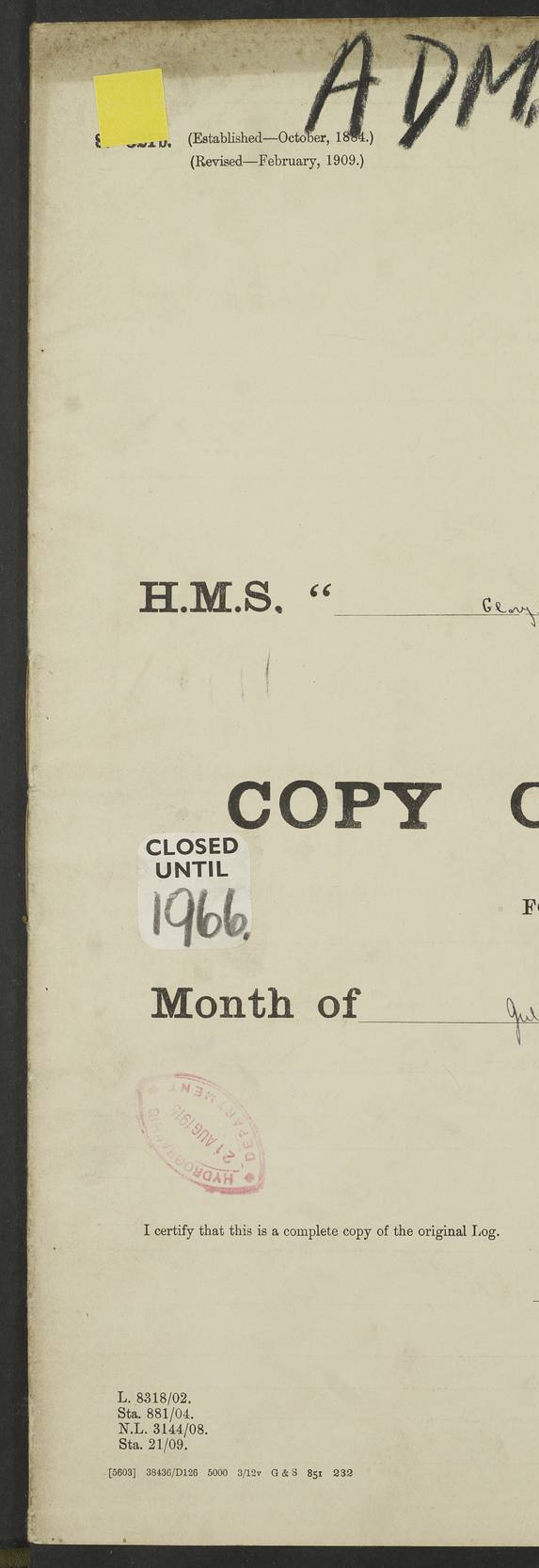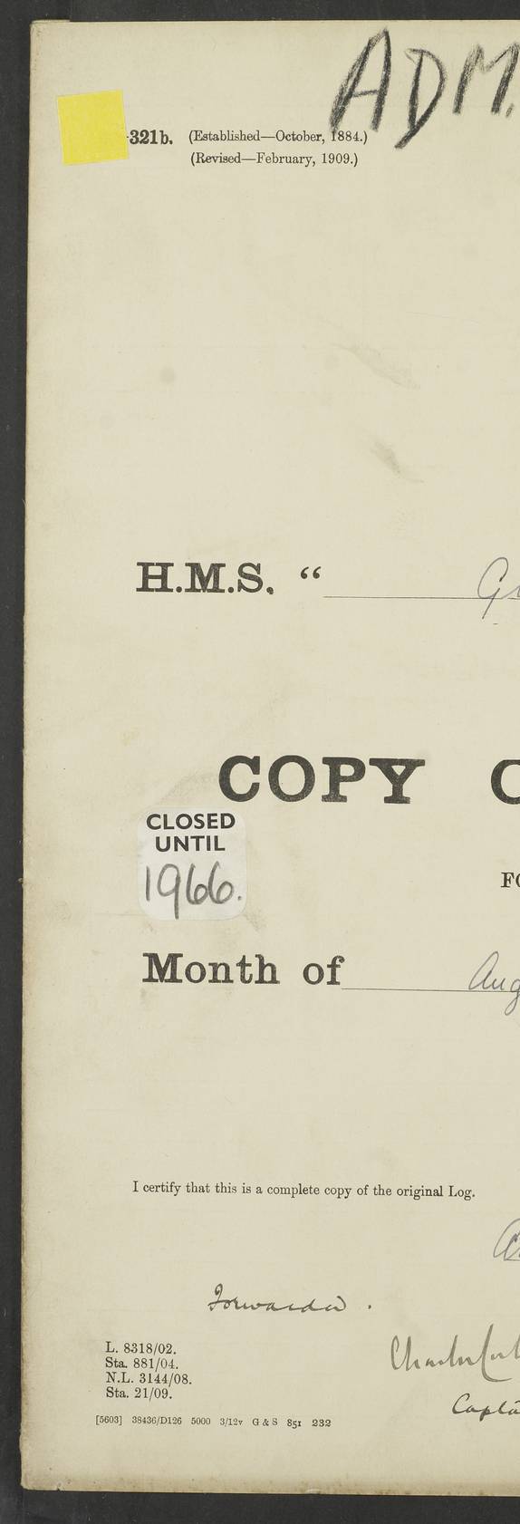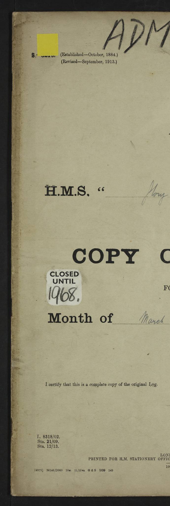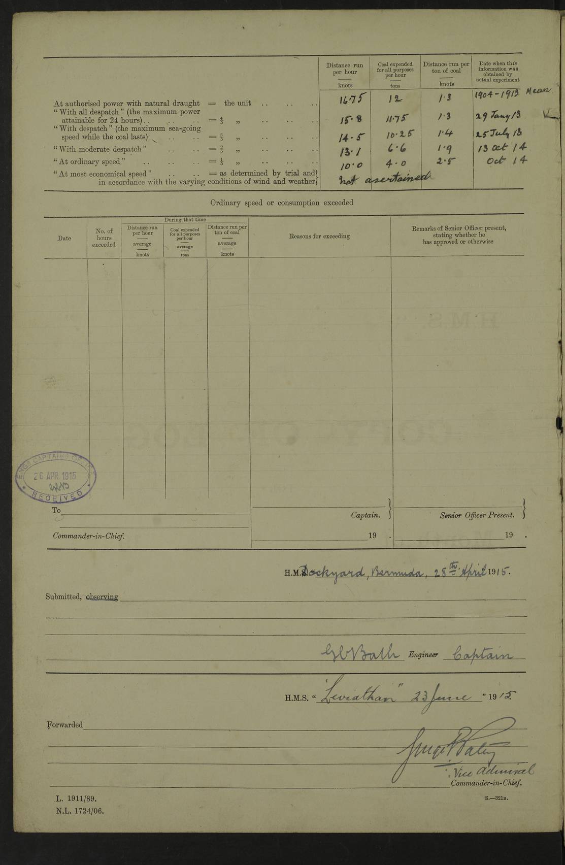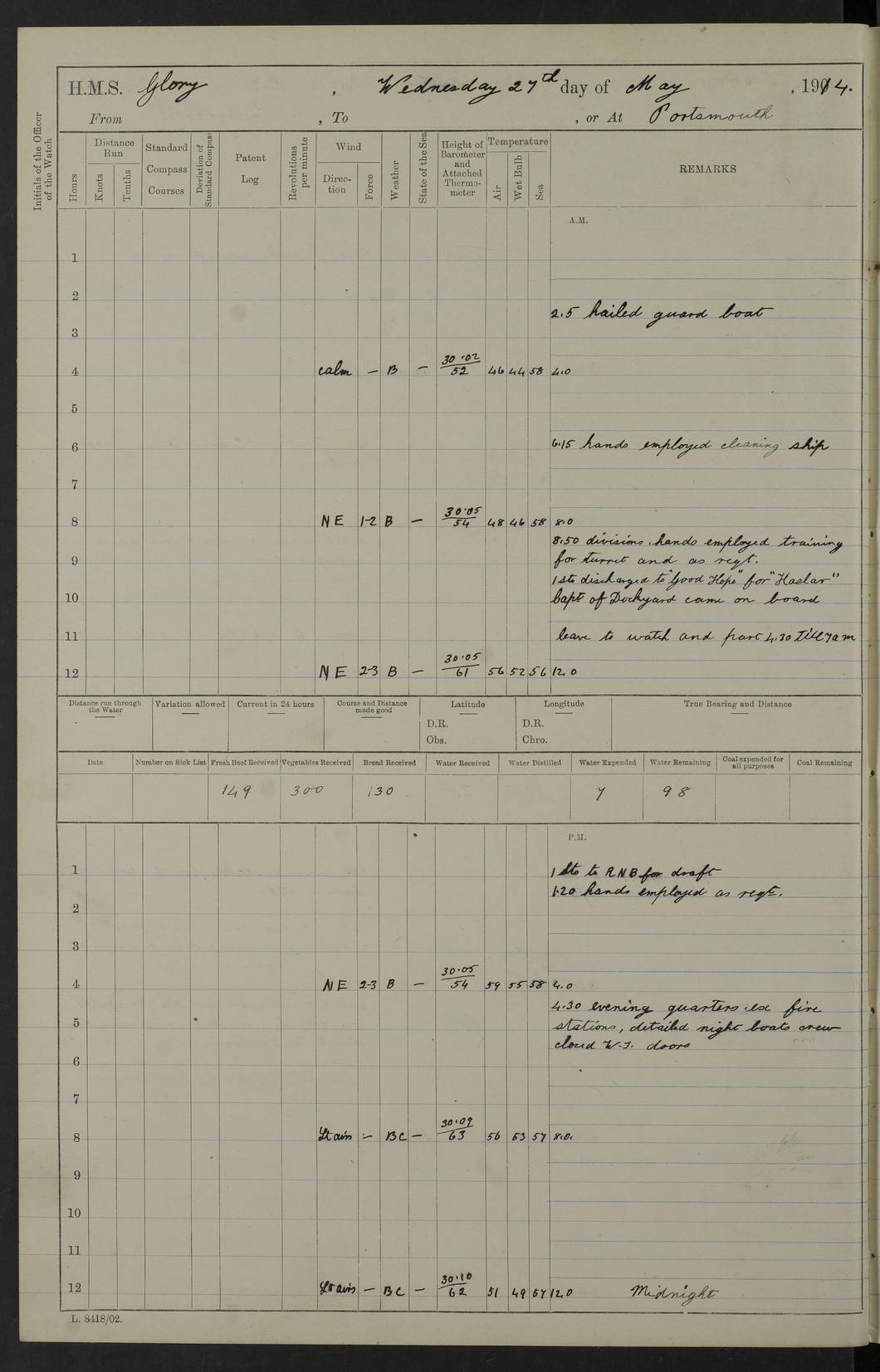 (Maps prepared using Journey Plotter, developed by Maikel. The Plots can only be approximate. They are made by joining-up positions on successive days, and sometimes positions are not given. There will therefore be occasions when the ship appears to have travelled overland) LOGS FOR APRIL 1914 April 1914 was spent in Portsmouth harbour. The daily routine usually included: hands cleaning ship, scrubbing decks or as requisite; morning Divisions; leave to part watch until the next day; rigged pumps; Evening quarters, exercising fire stations, detailing night boat’s crew and closing watertight doors. 4f73cce3a2fc8ea9030013fb: (https://s3.amazonaws.com:443/oldweather/ADM53-43011/0001_0.jpg) 4f73cce4a2fc8ea9030013fc: (https://s3.amazonaws.com:443/oldweather/ADM53-43011/0001_1.jpg) 4f73cce4a2fc8ea9030013fd: (https://s3.amazonaws.com:443/oldweather/ADM53-43011/0002_0.jpg) 4f73cce4a2fc8ea9030013fe: (https://s3.amazonaws.com:443/oldweather/ADM53-43011/0002_1.jpg) 4f73cce4a2fc8ea9030013ff: (https://s3.amazonaws.com:443/oldweather/ADM53-43011/0003_0.jpg) 4f73cce5a2fc8ea903001400: (https://s3.amazonaws.com:443/oldweather/ADM53-43011/0003_1.jpg) 4f73cce5a2fc8ea903001401: (https://s3.amazonaws.com:443/oldweather/ADM53-43011/0004_0.jpg) 4f73cce5a2fc8ea903001402: (https://s3.amazonaws.com:443/oldweather/ADM53-43011/0004_1.jpg) 4f73cce5a2fc8ea903001403: (https://s3.amazonaws.com:443/oldweather/ADM53-43011/0005_0.jpg) 3 April 1914 Portsmouth Lat 50.81, Long -1.11 8.00am: 1 Stoker to Argonaut to pass Doctor. HMS Argonaut was a protected cruiser of the Diadem class. She was launched in 1898 at Fairfield, Govan, and was sold in 1920. Details at http://en.wikipedia.org/wiki/HMS_Argonaut_(1898) . 8.30am: 12 boy Artificers came on board. 9.10am: 3 RFR men came on board for mobilization stations. pm: Pumps rigged. pm: 12 boy artificers left ship. 4f73cce6a2fc8ea903001404: (https://s3.amazonaws.com:443/oldweather/ADM53-43011/0005_1.jpg) 4 April 1914 Portsmouth Lat 50.81, Long -1.11 0.35am: Hailed guard boat. 8.00am: Discharged 1 stoker to Argonaut for Haslar. The Royal Hospital Haslar at Gosport, Hampshire, was one of several hospitals serving the Portsmouth area. Details at: http://en.wikipedia.org/wiki/Royal_Hospital_Haslar . 2.00pm: 2 stokers and 1 ship’s Steward joined ship from RNB. ‘RNB’ is Royal Naval Barracks. pm: Pumps rigged. 6.00pm: 1 stoker and 1 AB joined ship from Hospital. 11.30pm: Hailed guard boat 4f73cce6a2fc8ea903001405: (https://s3.amazonaws.com:443/oldweather/ADM53-43011/0006_0.jpg) 5 April 1914 Portsmouth Lat 50.81, Long -1.11 11.15pm: Hailed guard boat. 4f73cce6a2fc8ea903001406: (https://s3.amazonaws.com:443/oldweather/ADM53-43011/0006_1.jpg) 6 April 1914 Portsmouth Lat 50.81, Long -1.11 9.30am: Coding class to Argonaut. am: Dockyard party landed. am: 4 ratings joined ship from Monarch. HMS Monarch was an Orion class dreadnought, launched at Portsmouth Dockyard in 1910 and sunk as a target off Scilly in 1925. Details at http://en.wikipedia.org/wiki/HMS_Monarch_(1911) . 2.00pm: 1 SPO joined ship from RNB. 11.40pm: Hailed guard boat. 4f73cce6a2fc8ea903001407: (https://s3.amazonaws.com:443/oldweather/ADM53-43011/0007_0.jpg) 7 April 1914 Portsmouth Lat 50.81, Long -1.11 am: 4 ratings discharged to Monarch. 8.00am: 8 ratings to Argonaut to see Doctor. am: 2 hands to Dockyard to draw stores. am: 1 ERA joined ship from Good Hope. HMS Good Hope was an armoured cruiser of the Drake class, launched at Fairfield in 1901 and sunk at the Battle of Coronel on 1 November 1914. Details at http://en.wikipedia.org/wiki/HMS_Good_Hope_(1901) . 11.15pm: Hailed guard boat. 4f73cce7a2fc8ea903001408: (https://s3.amazonaws.com:443/oldweather/ADM53-43011/0007_1.jpg) 8 April 1914 Portsmouth Lat 50.81, Long -1.11 am: Hands employed getting out ammunition for heat tests. 11.35pm: Hailed guard boat. 4f73cce7a2fc8ea903001409: (https://s3.amazonaws.com:443/oldweather/ADM53-43011/0008_0.jpg) 9 April 1914 Portsmouth Lat 50.81, Long -1.11 8.00am: 2 hands to Argonaut to see Doctor. 11.00am: Paid weekly money. 11.25pm: Hailed guard boat. 4f73cce7a2fc8ea90300140a: (https://s3.amazonaws.com:443/oldweather/ADM53-43011/0008_1.jpg) 10 April 1914 Portsmouth Lat 50.81, Long -1.11 9.50am: Sent church party to Vernon. HMS Vernon is a naval shore establishment at Portsmouth. Details at : http://en.wikipedia.org/wiki/HMS_Vernon_(shore_establishment) . 11.45pm: Hailed guard boat. 4f73cce7a2fc8ea90300140b: (https://s3.amazonaws.com:443/oldweather/ADM53-43011/0009_0.jpg) 11 April 1914 Portsmouth Lat 50.81, Long -1.11 am: 1 rating to Argonaut to see Doctor. 11.35pm: Hailed guard boat. 4f73cce7a2fc8ea90300140c: (https://s3.amazonaws.com:443/oldweather/ADM53-43011/0009_1.jpg) 12 April 1914 Portsmouth Lat 50.81, Long -1.11 9.50am: Sent church party to Vernon. 12 midnight: Hailed guard boat. 4f73cce8a2fc8ea90300140d: (https://s3.amazonaws.com:443/oldweather/ADM53-43011/0010_0.jpg) 13 April 1914 Portsmouth Lat 50.81, Long -1.11 am: 1 AB to Argonaut to see Doctor (detained sick). 11.50pm: Hailed guard boat. 4f73cce8a2fc8ea90300140e: (https://s3.amazonaws.com:443/oldweather/ADM53-43011/0010_1.jpg) 14 April 1914 Portsmouth Lat 50.81, Long -1.11 am: 3 hands to dockyard. 12.45pm: 6 hands landed. Hospital party. pm: 1 stoker returned to duty from Argonaut. 11.50pm: Hailed guard boat. 4f73cce8a2fc8ea90300140f: (https://s3.amazonaws.com:443/oldweather/ADM53-43011/0011_0.jpg) 15 April 1914 Portsmouth Lat 50.81, Long -1.11 am: Discharged 1 ERA to RNB for basin trials of Isis. HMS Isis was a 2nd class (protected) cruiser of the Eclipse class. She was launched in 1896 at London & Glasgow and was sold in 1920. Details at http://en.wikipedia.org/wiki/HMS_Isis_(1896) . am: Liberty men returned from leave. 11.40pm: Hailed guard boat. 4f73cce8a2fc8ea903001410: (https://s3.amazonaws.com:443/oldweather/ADM53-43011/0011_1.jpg) 16 April 1914 Portsmouth Lat 50.81, Long -1.11 am: 1 leading stoker, 1 stoker to RNB. 10.45am: Paid weekly money. 4f73cce9a2fc8ea90300