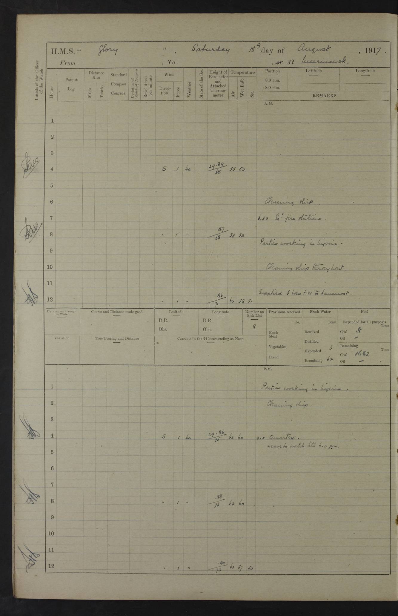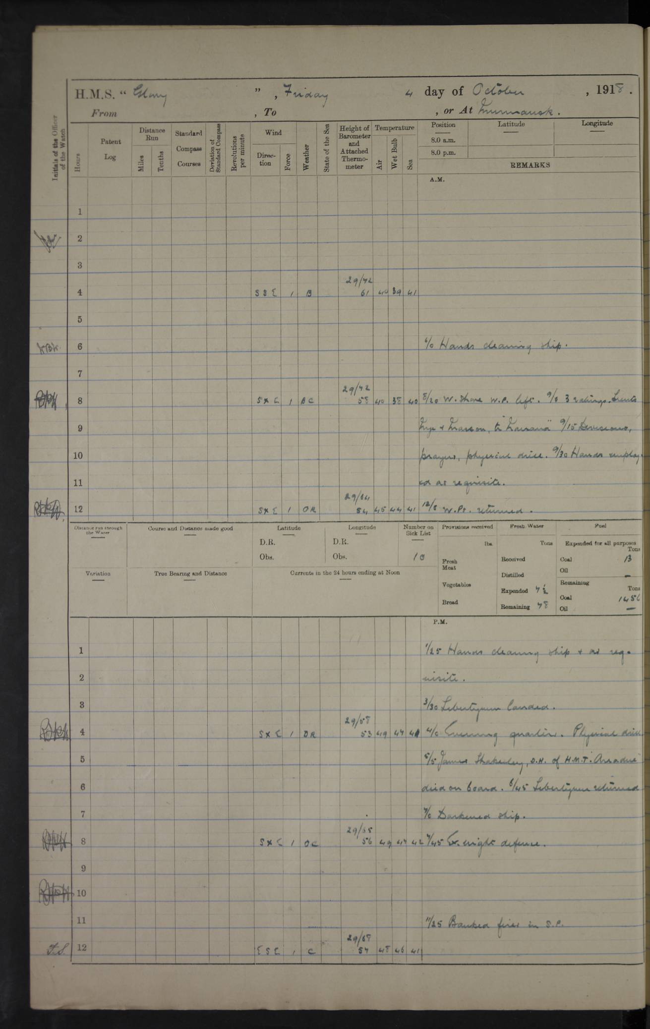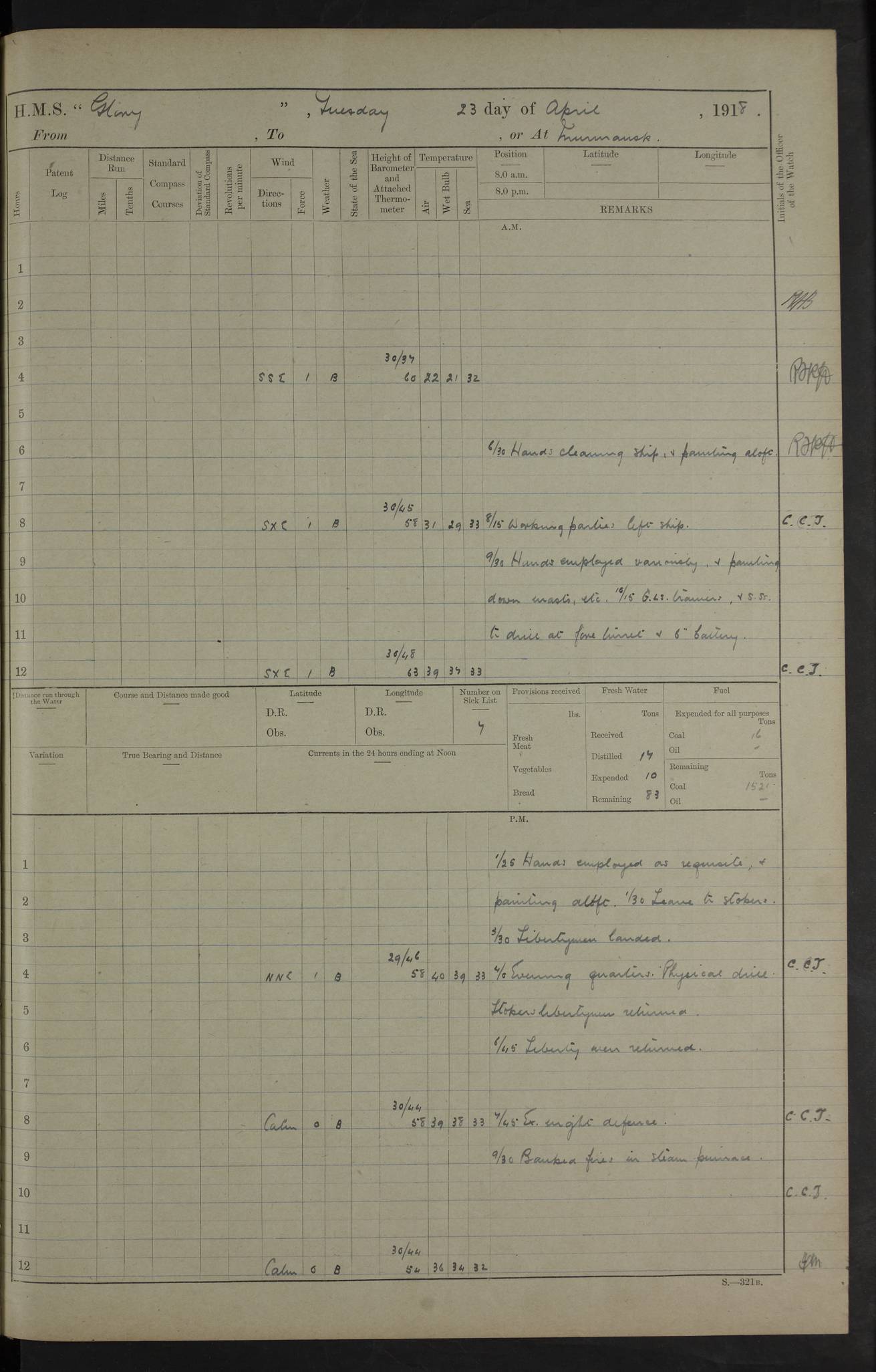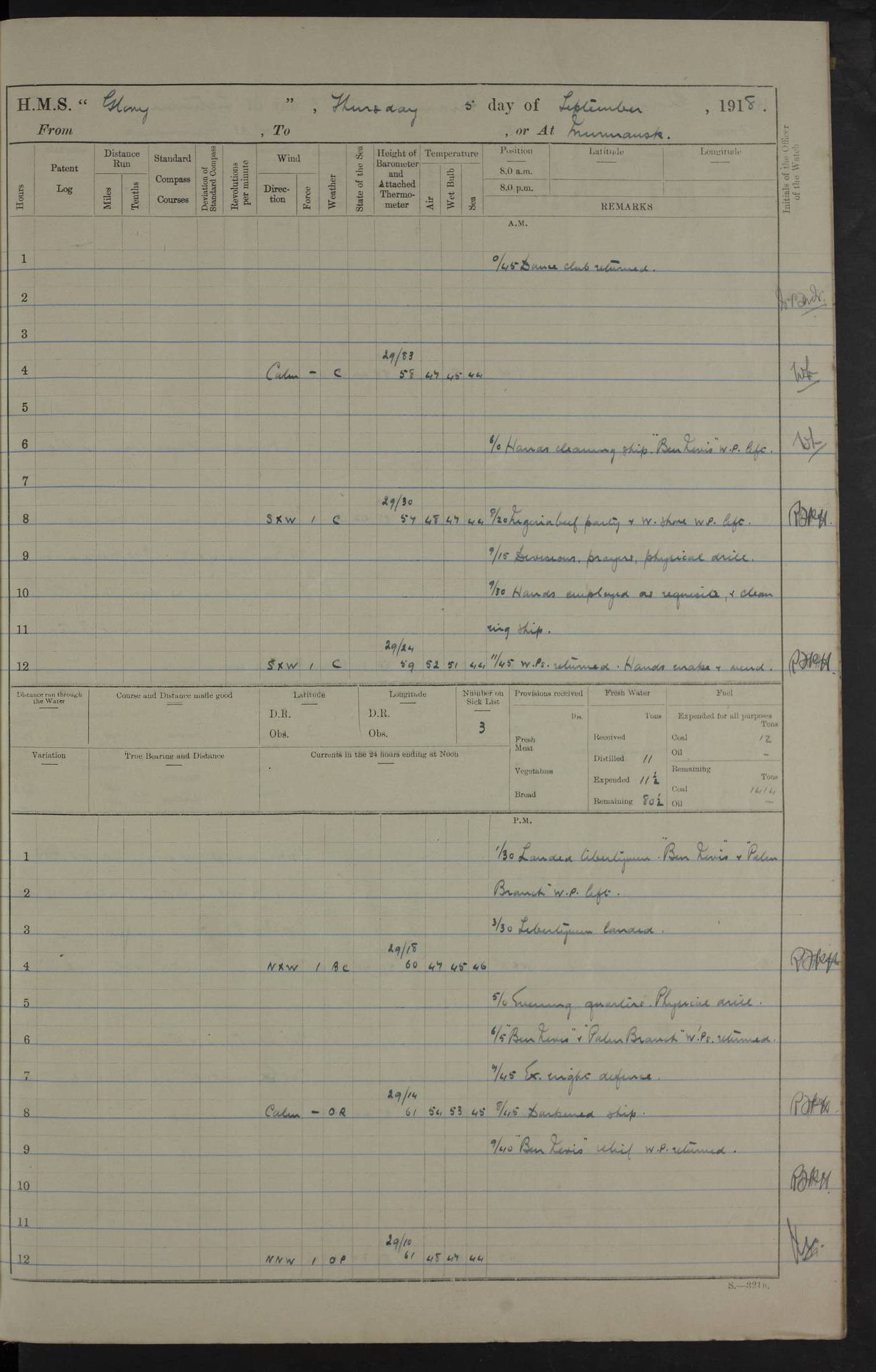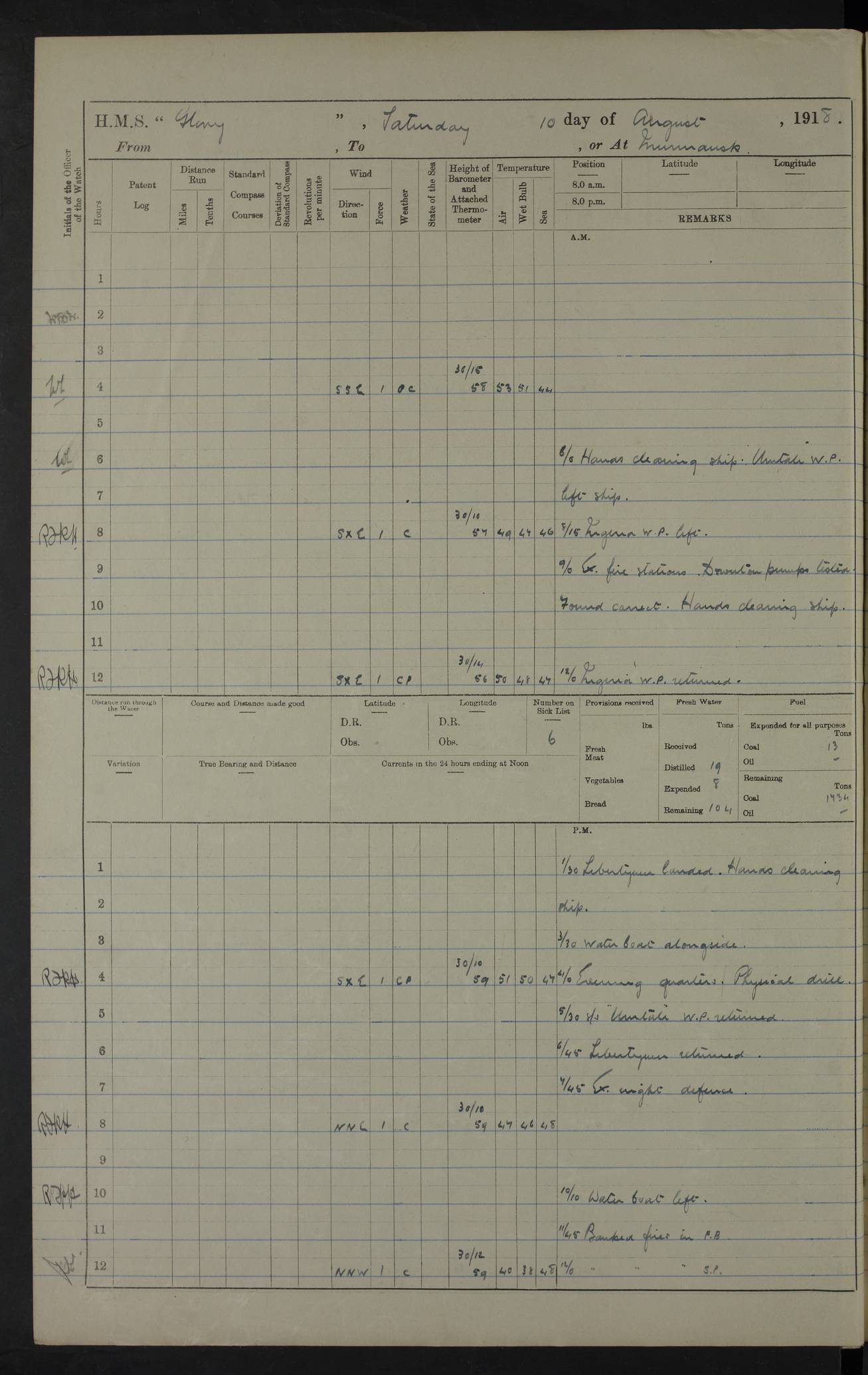 Captain’s inspection. 11.00pm: PO telegraphist joined ship from Goroslava. 4ef4f793e53e0a0c91002ca4: (https://s3.amazonaws.com:443/oldweather/ADM53-43039/ADM 53-43039-175_0.jpg) 26 August 1918 Murmansk Lat 69.03, Long 33.05 6.00am: Hands working main derrick. Out picket boat. In steam pinnace. 6.30am: Sub. Lieutenant Thompson joined T.17. 8.20am: Store and engineers working parties left. 10.15am: Gunner (T) and AB joined from T.17. 11.00am: 1 marine to Goroslava. 1.30pm: Engineers and store working parties left. 2.00pm: Discharged 2 warrant officers to Alexander. 5.00pm: Discharged Commander Monro to Alexander. Store party returned. 4ef4f794e53e0a0c91002ca5: (https://s3.amazonaws.com:443/oldweather/ADM53-43039/ADM 53-43039-175_1.jpg) 27 August 1918 Murmansk Lat 69.03, Long 33.05 Number on sick list: 6 6.00am: Store party left ship. 8.10am: Carpenters and ER (engine room?) working parties left ship. 11.00am: Hoisted 1st, 2nd, and 3rd cutters. 12 noon: Store party returned. 1.30pm: Store party landed and engineers working party. Hands employed as requisite and hoisting in stores. 3.30pm: Libertymen landed and store party. 4.10pm: Umtali working party left. 4.15pm: Carpenters working party returned. 7.15pm: Umtali working party returned. 4ef4f794e53e0a0c91002ca6: (https://s3.amazonaws.com:443/oldweather/ADM53-43039/ADM 53-43039-176_0.jpg) 28 August 1918 Murmansk Lat 69.03, Long 33.05 Number on sick list: 4 8.15am: Beef party to Nigeria, carpenters and engineers working parties. 11.45am: Beef party returned. 1.45pm: Working party to western shore with Commander Campbell. 6.20pm: Western shore working party returned. 6.45pm: Engineers and carpenters working parties returned, and libertymen. 4ef4f794e53e0a0c91002ca7: (https://s3.amazonaws.com:443/oldweather/ADM53-43039/ADM 53-43039-176_1.jpg) 29 August 1918 Murmansk Lat 69.03, Long 33.05 Number on sick list: 4 8.15am: Carpenters and engineers working parties left. 8.30am: Western shore working party left. 1.20pm: Western shore working party left. 4.00pm: Western shore working party returned. pm: Port watch clearing Anchor Star. 4ef4f794e53e0a0c91002ca8: (https://s3.amazonaws.com:443/oldweather/ADM53-43039/ADM 53-43039-177_0.jpg) 30 August 1918 Murmansk Lat 69.03, Long 33.05 Number on sick list: 4 8.30am: Western shore working party left and beef party. 11.00am: Beef party returned. 12 noon: Western shore working party returned. 1.30pm: Western shore working party left, and store party for Heathside. 6.40pm: Libertymen, engineers and carpenters working parties returned. 4ef4f794e53e0a0c91002ca9: (https://s3.amazonaws.com:443/oldweather/ADM53-43039/ADM 53-43039-177_1.jpg) 31 August 1918 Murmansk Lat 69.03, Long 33.05 Number on sick list: 3 8.30am: Landed engineers, carpenters and western shore working parties. 9.15am: Landed carpenters working party. 12 noon: Western shore working party returned. 3.40pm: Carpenters working party returned. 4.45pm: Western shore working party returned. 6.45pm: Engineers working party and libertymen returned. LOGS FOR SEPTEMBER 1918 4ef4f794e53e0a0c91002caa: (https://s3.amazonaws.com:443/oldweather/ADM53-43039/ADM 53-43039-178_0.jpg) 4ef4f794e53e0a0c91002cab: (https://s3.amazonaws.com:443/oldweather/ADM53-43039/ADM 53-43039-178_1.jpg) 4ef4f794e53e0a0c91002cac: (https://s3.amazonaws.com:443/oldweather/ADM53-43039/ADM 53-43039-179_0.jpg) 4ef4f794e53e0a0c91002cad: (https://s3.amazonaws.com:443/oldweather/ADM53-43039/ADM 53-43039-179_1.jpg) No log available for 1 September 1918. 4ef4f794e53e0a0c91002cae: (https://s3.amazonaws.com:443/oldweather/ADM53-43039/ADM 53-43039-180_0.jpg) 2 September 1918 Murmansk Lat 69.03, Long 33.05 Number on sick list: 5 8.00am: Alexandrovsk, western shore and beef working parties left. 10.45am: Beef party returned. 11.10am: Water boat alongside. 12.45pm: Paid monthly money. Survivors of Ariadne Christine left ship. ‘Ariadne Christine’, of 3550 tons gross, was built in 1910 at Thompson & Sons, Sunderland, and was mined off the Ribachi Peninsula at the entrance to the White Sea on 2 September, 1918. Details at http://www.uboat.net/wwi/ships_hit/7678.html . 4.30pm: Western shore working party returned. 6.20pm: Alexandrovsk working party returned. 7.00pm: Libertymen and engineers working party returned. 8.00pm: Received from Junco 231 bags mail. Junco was a hired trawler of 191 tons gross, built in 1917 (Admiralty No. 1657; Port No. H.587). 4ef4f794e53e0a0c91002caf: (https://s3.amazonaws.com:443/oldweather/ADM53-43039/ADM 53-43039-180_1.jpg) 3 September 1918 Murmansk Lat 69.03, Long 33.05 Number on sick list: 4 8.15am: Pier working party, engineers and carpenters working parties left. 10.50am: Admiral and staff transferred to Salvator. 11.50am: Working parties returned. 1.30pm: Nigeria and pier working parties left. 3.15pm: Tay & Tyne secured alongside. 4.20pm: Western shore working party returned. 7.45pm: Received 19 bags mail, ex T.13. 4ef4f794e53e0a0c91002cb0: (https://s3.amazonaws.com:443/oldweather/ADM53-43039/ADM 53-43039-181_0.jpg) 4 September 1918 Murmansk Lat 69.03, Long 33.05 Number on sick list: 3 8.20am: Engineers working party and western shore working party left. 12 noon: Western shore working party returned. 1.30pm: Working part left for stores. 4.00pm: Working parties returned. 5.50pm: Working party left ship for wharf. 6.00pm: Leave to 12.00 for dance club. 8.25pm: Working parties returned. 4ef4f794e53e0a0c91002cb1: (https://s3.amazonaws.com:443/oldweather/ADM53-43039/ADM 53-43039-181_1.jpg) 5 September 1918 Murmansk Lat 69.03, Long 33.05 Number on sick list: 3 0.45am: Dance club returned. 6.00am: Ben Nevis working party left. ‘Ben Nevis’ was a store carrier of 3895 grt, built in 1905. Sourced from F.J. Dittmar & J.J. Colledge (1972) – British warships 1914–1919, Ian Allan. 8.20am: Nigeria beef party and western shore working party left. 11.45am: Working parties returned. 1.30pm: Ben Nevis and Palm Branch working parties left. 6.05pm: Ben Nevis and Palm Branch wo