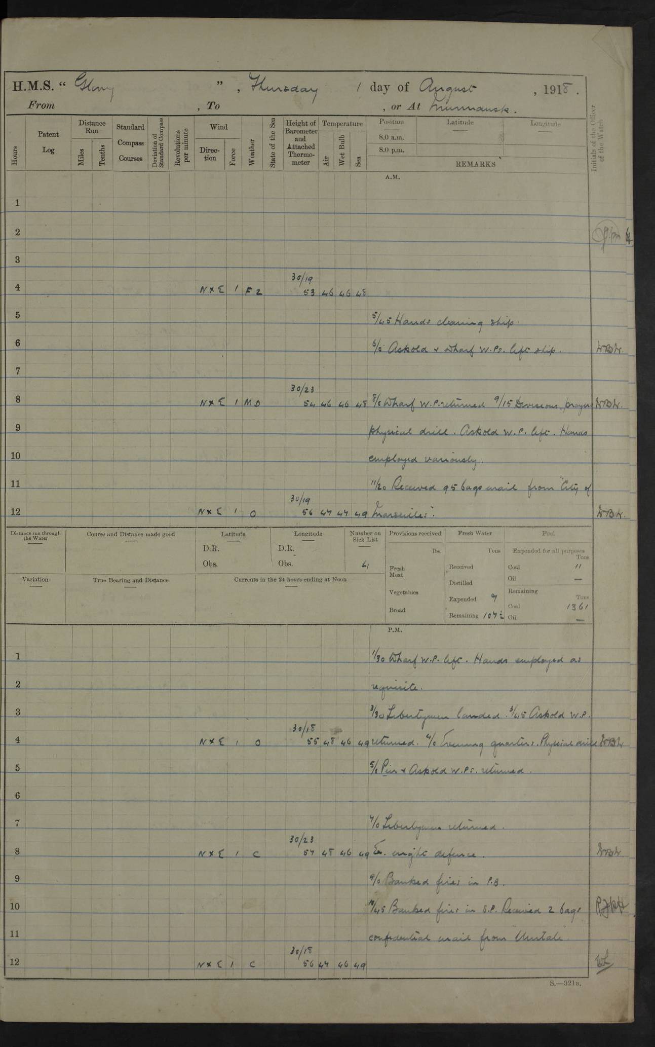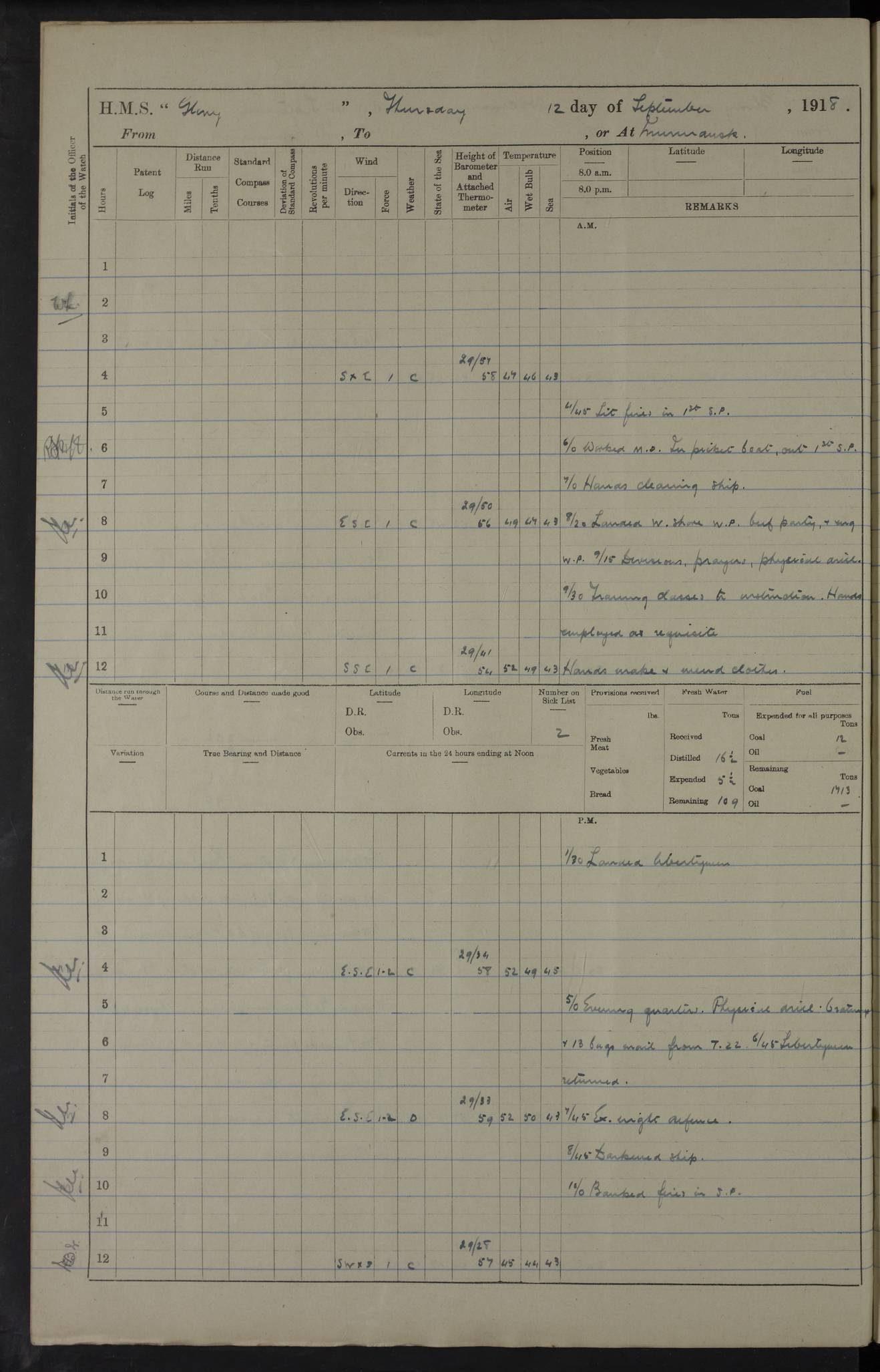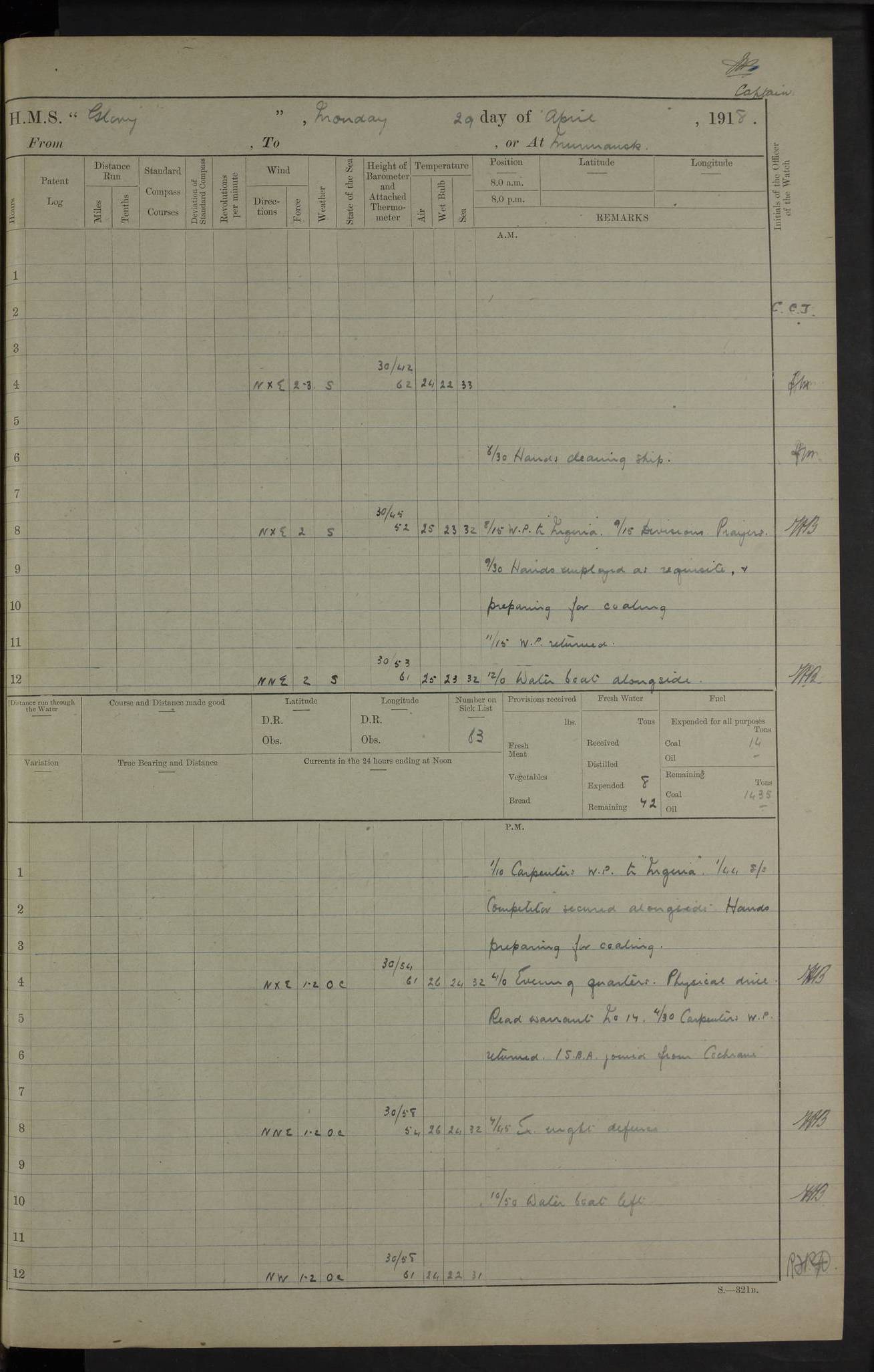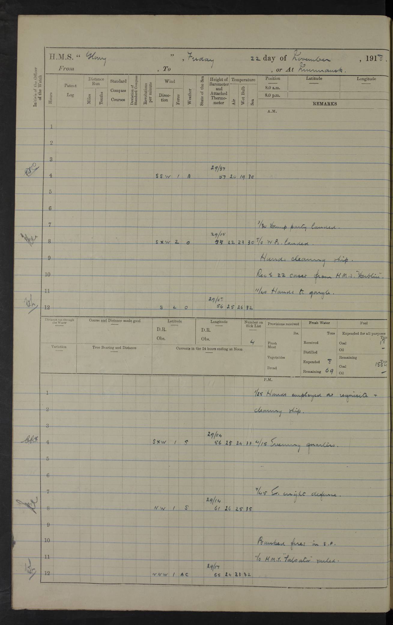 Captain’s inspection. 11.00pm: PO telegraphist joined ship from Goroslava. 4ef4f793e53e0a0c91002ca4: (https://s3.amazonaws.com:443/oldweather/ADM53-43039/ADM 53-43039-175_0.jpg) 26 August 1918 Murmansk Lat 69.03, Long 33.05 6.00am: Hands working main derrick. Out picket boat. In steam pinnace. 6.30am: Sub. Lieutenant Thompson joined T.17. 8.20am: Store and engineers working parties left. 10.15am: Gunner (T) and AB joined from T.17. 11.00am: 1 marine to Goroslava. 1.30pm: Engineers and store working parties left. 2.00pm: Discharged 2 warrant officers to Alexander. 5.00pm: Discharged Commander Monro to Alexander. Store party returned. 4ef4f794e53e0a0c91002ca5: (https://s3.amazonaws.com:443/oldweather/ADM53-43039/ADM 53-43039-175_1.jpg) 27 August 1918 Murmansk Lat 69.03, Long 33.05 Number on sick list: 6 6.00am: Store party left ship. 8.10am: Carpenters and ER (engine room?) working parties left ship. 11.00am: Hoisted 1st, 2nd, and 3rd cutters. 12 noon: Store party returned. 1.30pm: Store party landed and engineers working party. Hands employed as requisite and hoisting in stores. 3.30pm: Libertymen landed and store party. 4.10pm: Umtali working party left. 4.15pm: Carpenters working party returned. 7.15pm: Umtali working party returned. 4ef4f794e53e0a0c91002ca6: (https://s3.amazonaws.com:443/oldweather/ADM53-43039/ADM 53-43039-176_0.jpg) 28 August 1918 Murmansk Lat 69.03, Long 33.05 Number on sick list: 4 8.15am: Beef party to Nigeria, carpenters and engineers working parties. 11.45am: Beef party returned. 1.45pm: Working party to western shore with Commander Campbell. 6.20pm: Western shore working party returned. 6.45pm: Engineers and carpenters working parties returned, and libertymen. 4ef4f794e53e0a0c91002ca7: (https://s3.amazonaws.com:443/oldweather/ADM53-43039/ADM 53-43039-176_1.jpg) 29 August 1918 Murmansk Lat 69.03, Long 33.05 Number on sick list: 4 8.15am: Carpenters and engineers working parties left. 8.30am: Western shore working party left. 1.20pm: Western shore working party left. 4.00pm: Western shore working party returned. pm: Port watch clearing Anchor Star. 4ef4f794e53e0a0c91002ca8: (https://s3.amazonaws.com:443/oldweather/ADM53-43039/ADM 53-43039-177_0.jpg) 30 August 1918 Murmansk Lat 69.03, Long 33.05 Number on sick list: 4 8.30am: Western shore working party left and beef party. 11.00am: Beef party returned. 12 noon: Western shore working party returned. 1.30pm: Western shore working party left, and store party for Heathside. 6.40pm: Libertymen, engineers and carpenters working parties returned. 4ef4f794e53e0a0c91002ca9: (https://s3.amazonaws.com:443/oldweather/ADM53-43039/ADM 53-43039-177_1.jpg) 31 August 1918 Murmansk Lat 69.03, Long 33.05 Number on sick list: 3 8.30am: Landed engineers, carpenters and western shore working parties. 9.15am: Landed carpenters working party. 12 noon: Western shore working party returned. 3.40pm: Carpenters working party returned. 4.45pm: Western shore working party returned. 6.45pm: Engineers working party and libertymen returned. LOGS FOR SEPTEMBER 1918 4ef4f794e53e0a0c91002caa: (https://s3.amazonaws.com:443/oldweather/ADM53-43039/ADM 53-43039-178_0.jpg) 4ef4f794e53e0a0c91002cab: (https://s3.amazonaws.com:443/oldweather/ADM53-43039/ADM 53-43039-178_1.jpg) 4ef4f794e53e0a0c91002cac: (https://s3.amazonaws.com:443/oldweather/ADM53-43039/ADM 53-43039-179_0.jpg) 4ef4f794e53e0a0c91002cad: (https://s3.amazonaws.com:443/oldweather/ADM53-43039/ADM 53-43039-179_1.jpg) No log available for 1 September 1918. 4ef4f794e53e0a0c91002cae: (https://s3.amazonaws.com:443/oldweather/ADM53-43039/ADM 53-43039-180_0.jpg) 2 September 1918 Murmansk Lat 69.03, Long 33.05 Number on sick list: 5 8.00am: Alexandrovsk, western shore and beef working parties left. 10.45am: Beef party returned. 11.10am: Water boat alongside. 12.45pm: Paid monthly money. Survivors of Ariadne Christine left ship. ‘Ariadne Christine’, of 3550 tons gross, was built in 1910 at Thompson & Sons, Sunderland, and was mined off the Ribachi Peninsula at the entrance to the White Sea on 2 September, 1918. Details at http://www.uboat.net/wwi/ships_hit/7678.html . 4.30pm: Western shore working party returned. 6.20pm: Alexandrovsk working party returned. 7.00pm: Libertymen and engineers working party returned. 8.00pm: Received from Junco 231 bags mail. Junco was a hired trawler of 191 tons gross, built in 1917 (Admiralty No. 1657; Port No. H.587). 4ef4f794e53e0a0c91002caf: (https://s3.amazonaws.com:443/oldweather/ADM53-43039/ADM 53-43039-180_1.jpg) 3 September 1918 Murmansk Lat 69.03, Long 33.05 Number on sick list: 4 8.15am: Pier working party, engineers and carpenters working parties left. 10.50am: Admiral and staff transferred to Salvator. 11.50am: Working parties returned. 1.30pm: Nigeria and pier working parties left. 3.15pm: Tay & Tyne secured alongside. 4.20pm: Western shore working party returned. 7.45pm: Received 19 bags mail, ex T.13. 4ef4f794e53e0a0c91002cb0: (https://s3.amazonaws.com:443/oldweather/ADM53-43039/ADM 53-43039-181_0.jpg) 4 September 1918 Murmansk Lat 69.03, Long 33.05 Number on sick list: 3 8.20am: Engineers working party and western shore working party left. 12 noon: Western shore working party returned. 1.30pm: Working part left for stores. 4.00pm: Working parties returned. 5.50pm: Working party left ship for wharf. 6.00pm: Leave to 12.00 for dance club. 8.25pm: Working parties returned. 4ef4f794e53e0a0c91002cb1: (https://s3.amazonaws.com:443/oldweather/ADM53-43039/ADM 53-43039-181_1.jpg) 5 September 1918 Murmansk Lat 69.03, Long 33.05 Number on sick list: 3 0.45am: Dance club returned. 6.00am: Ben Nevis working party left. ‘Ben Nevis’ was a store carrier of 3895 grt, built in 1905. Sourced from F.J. Dittmar & J.J. Colledge (1972) – British warships 1914–1919, Ian Allan. 8.20am: Nigeria beef party and western shore working party left. 11.45am: Working parties returned. 1.30pm: Ben Nevis and Palm Branch working parties left. 6.05pm: Ben Nevis and Palm Branch wo