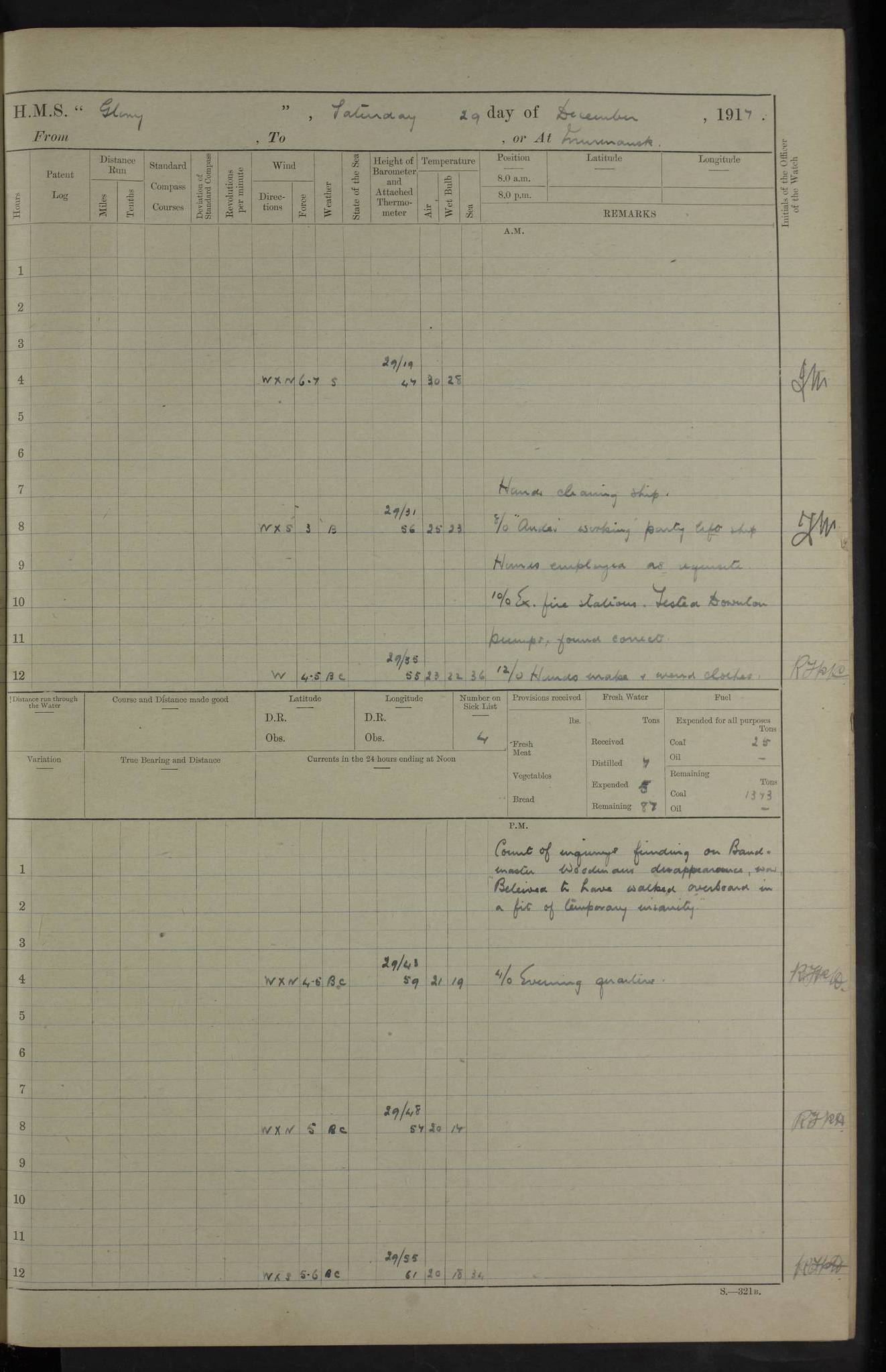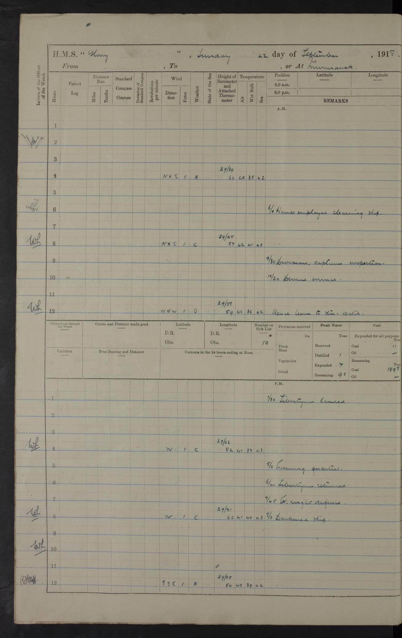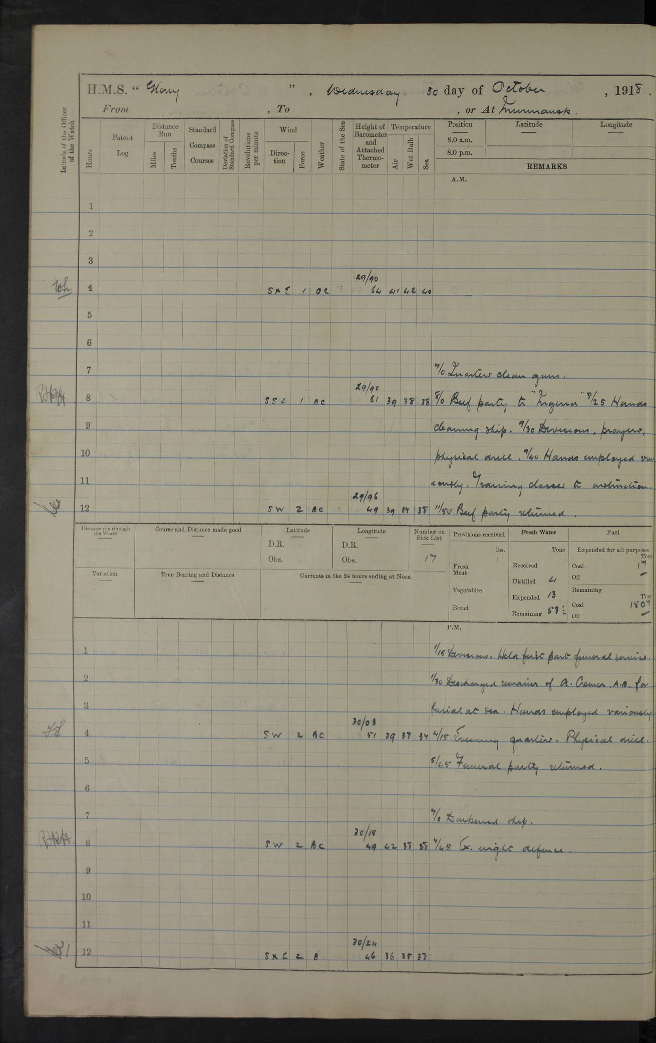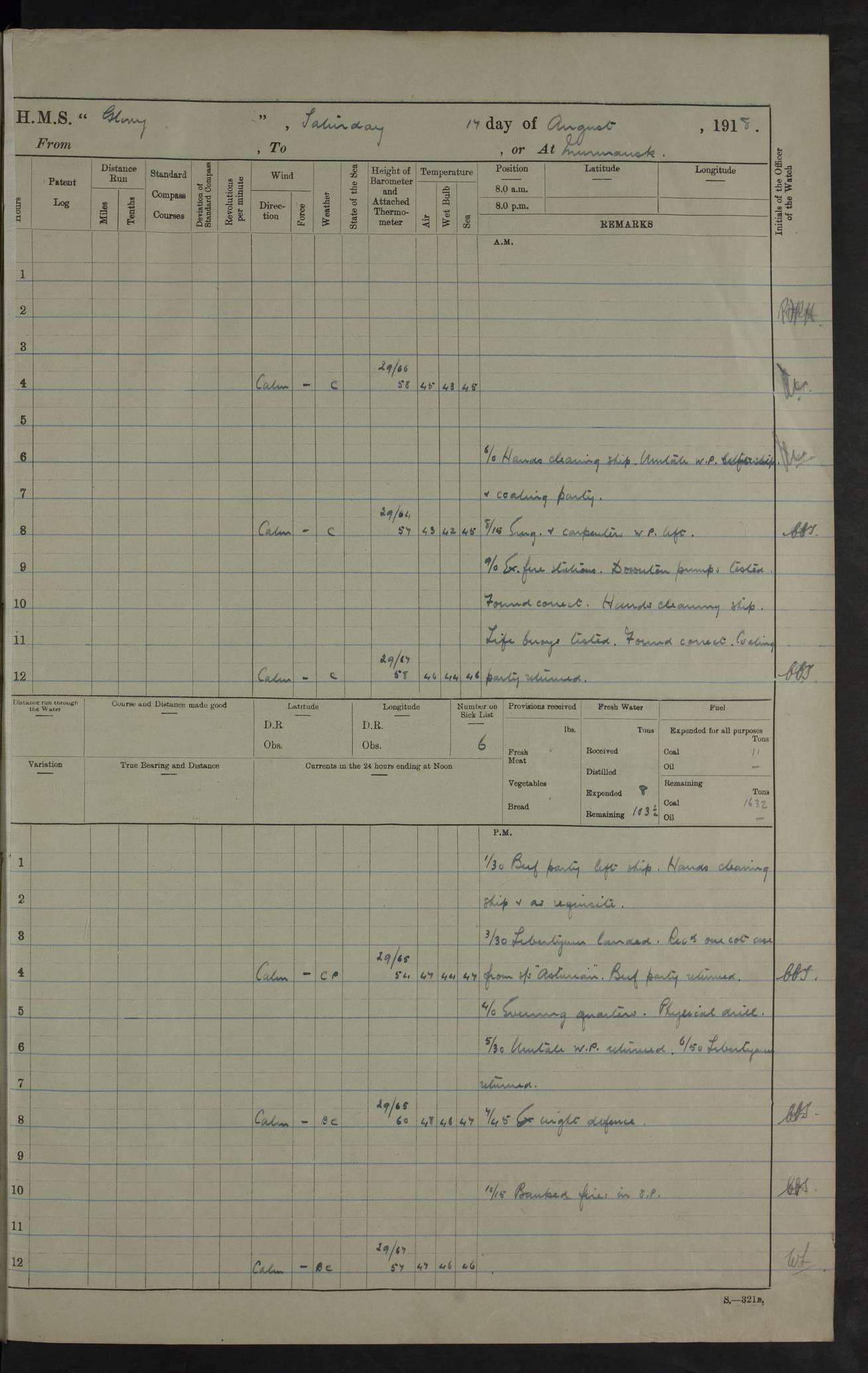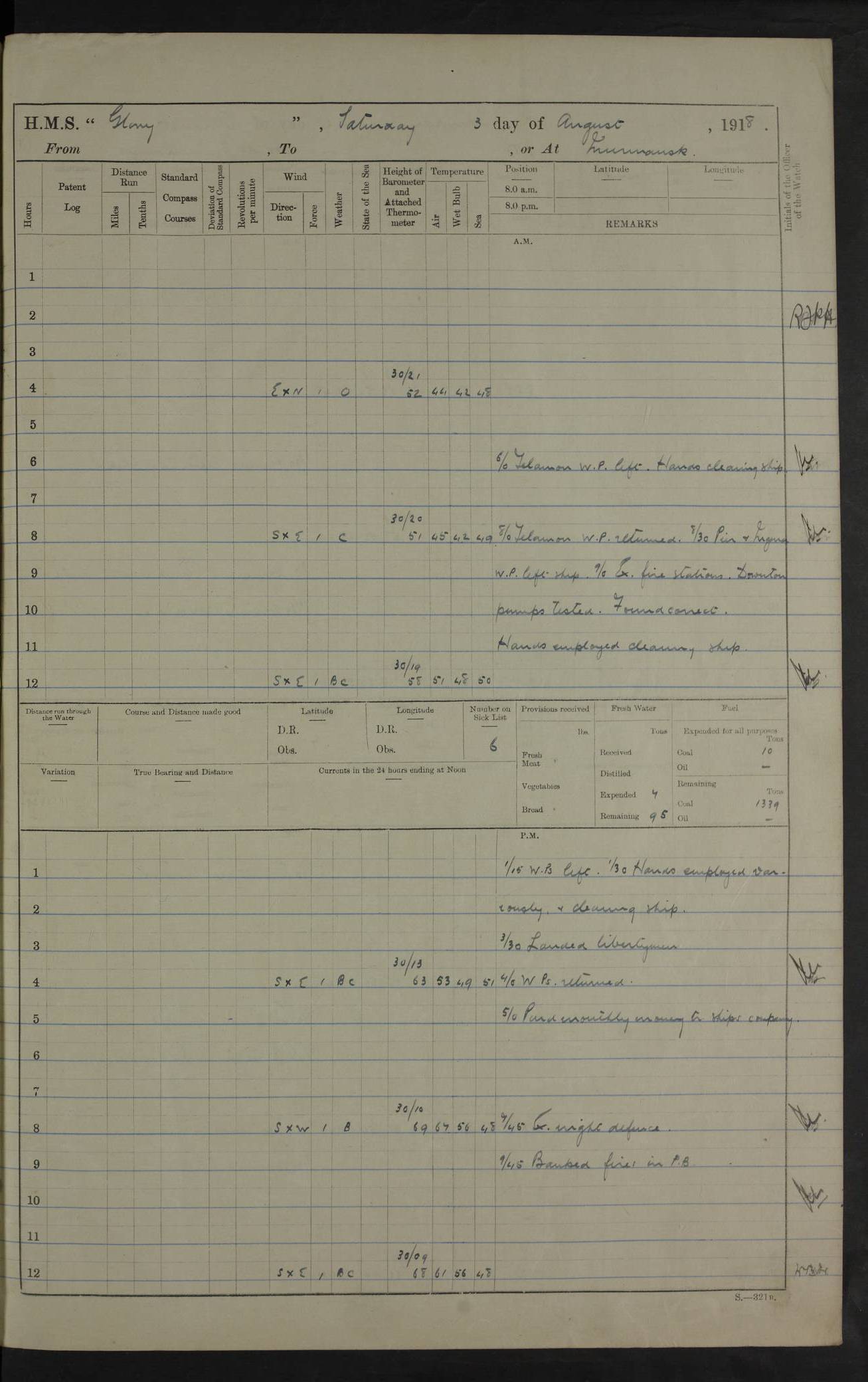 Captain’s inspection. 11.00pm: PO telegraphist joined ship from Goroslava. 4ef4f793e53e0a0c91002ca4: (https://s3.amazonaws.com:443/oldweather/ADM53-43039/ADM 53-43039-175_0.jpg) 26 August 1918 Murmansk Lat 69.03, Long 33.05 6.00am: Hands working main derrick. Out picket boat. In steam pinnace. 6.30am: Sub. Lieutenant Thompson joined T.17. 8.20am: Store and engineers working parties left. 10.15am: Gunner (T) and AB joined from T.17. 11.00am: 1 marine to Goroslava. 1.30pm: Engineers and store working parties left. 2.00pm: Discharged 2 warrant officers to Alexander. 5.00pm: Discharged Commander Monro to Alexander. Store party returned. 4ef4f794e53e0a0c91002ca5: (https://s3.amazonaws.com:443/oldweather/ADM53-43039/ADM 53-43039-175_1.jpg) 27 August 1918 Murmansk Lat 69.03, Long 33.05 Number on sick list: 6 6.00am: Store party left ship. 8.10am: Carpenters and ER (engine room?) working parties left ship. 11.00am: Hoisted 1st, 2nd, and 3rd cutters. 12 noon: Store party returned. 1.30pm: Store party landed and engineers working party. Hands employed as requisite and hoisting in stores. 3.30pm: Libertymen landed and store party. 4.10pm: Umtali working party left. 4.15pm: Carpenters working party returned. 7.15pm: Umtali working party returned. 4ef4f794e53e0a0c91002ca6: (https://s3.amazonaws.com:443/oldweather/ADM53-43039/ADM 53-43039-176_0.jpg) 28 August 1918 Murmansk Lat 69.03, Long 33.05 Number on sick list: 4 8.15am: Beef party to Nigeria, carpenters and engineers working parties. 11.45am: Beef party returned. 1.45pm: Working party to western shore with Commander Campbell. 6.20pm: Western shore working party returned. 6.45pm: Engineers and carpenters working parties returned, and libertymen. 4ef4f794e53e0a0c91002ca7: (https://s3.amazonaws.com:443/oldweather/ADM53-43039/ADM 53-43039-176_1.jpg) 29 August 1918 Murmansk Lat 69.03, Long 33.05 Number on sick list: 4 8.15am: Carpenters and engineers working parties left. 8.30am: Western shore working party left. 1.20pm: Western shore working party left. 4.00pm: Western shore working party returned. pm: Port watch clearing Anchor Star. 4ef4f794e53e0a0c91002ca8: (https://s3.amazonaws.com:443/oldweather/ADM53-43039/ADM 53-43039-177_0.jpg) 30 August 1918 Murmansk Lat 69.03, Long 33.05 Number on sick list: 4 8.30am: Western shore working party left and beef party. 11.00am: Beef party returned. 12 noon: Western shore working party returned. 1.30pm: Western shore working party left, and store party for Heathside. 6.40pm: Libertymen, engineers and carpenters working parties returned. 4ef4f794e53e0a0c91002ca9: (https://s3.amazonaws.com:443/oldweather/ADM53-43039/ADM 53-43039-177_1.jpg) 31 August 1918 Murmansk Lat 69.03, Long 33.05 Number on sick list: 3 8.30am: Landed engineers, carpenters and western shore working parties. 9.15am: Landed carpenters working party. 12 noon: Western shore working party returned. 3.40pm: Carpenters working party returned. 4.45pm: Western shore working party returned. 6.45pm: Engineers working party and libertymen returned. LOGS FOR SEPTEMBER 1918 4ef4f794e53e0a0c91002caa: (https://s3.amazonaws.com:443/oldweather/ADM53-43039/ADM 53-43039-178_0.jpg) 4ef4f794e53e0a0c91002cab: (https://s3.amazonaws.com:443/oldweather/ADM53-43039/ADM 53-43039-178_1.jpg) 4ef4f794e53e0a0c91002cac: (https://s3.amazonaws.com:443/oldweather/ADM53-43039/ADM 53-43039-179_0.jpg) 4ef4f794e53e0a0c91002cad: (https://s3.amazonaws.com:443/oldweather/ADM53-43039/ADM 53-43039-179_1.jpg) No log available for 1 September 1918. 4ef4f794e53e0a0c91002cae: (https://s3.amazonaws.com:443/oldweather/ADM53-43039/ADM 53-43039-180_0.jpg) 2 September 1918 Murmansk Lat 69.03, Long 33.05 Number on sick list: 5 8.00am: Alexandrovsk, western shore and beef working parties left. 10.45am: Beef party returned. 11.10am: Water boat alongside. 12.45pm: Paid monthly money. Survivors of Ariadne Christine left ship. ‘Ariadne Christine’, of 3550 tons gross, was built in 1910 at Thompson & Sons, Sunderland, and was mined off the Ribachi Peninsula at the entrance to the White Sea on 2 September, 1918. Details at http://www.uboat.net/wwi/ships_hit/7678.html . 4.30pm: Western shore working party returned. 6.20pm: Alexandrovsk working party returned. 7.00pm: Libertymen and engineers working party returned. 8.00pm: Received from Junco 231 bags mail. Junco was a hired trawler of 191 tons gross, built in 1917 (Admiralty No. 1657; Port No. H.587). 4ef4f794e53e0a0c91002caf: (https://s3.amazonaws.com:443/oldweather/ADM53-43039/ADM 53-43039-180_1.jpg) 3 September 1918 Murmansk Lat 69.03, Long 33.05 Number on sick list: 4 8.15am: Pier working party, engineers and carpenters working parties left. 10.50am: Admiral and staff transferred to Salvator. 11.50am: Working parties returned. 1.30pm: Nigeria and pier working parties left. 3.15pm: Tay & Tyne secured alongside. 4.20pm: Western shore working party returned. 7.45pm: Received 19 bags mail, ex T.13. 4ef4f794e53e0a0c91002cb0: (https://s3.amazonaws.com:443/oldweather/ADM53-43039/ADM 53-43039-181_0.jpg) 4 September 1918 Murmansk Lat 69.03, Long 33.05 Number on sick list: 3 8.20am: Engineers working party and western shore working party left. 12 noon: Western shore working party returned. 1.30pm: Working part left for stores. 4.00pm: Working parties returned. 5.50pm: Working party left ship for wharf. 6.00pm: Leave to 12.00 for dance club. 8.25pm: Working parties returned. 4ef4f794e53e0a0c91002cb1: (https://s3.amazonaws.com:443/oldweather/ADM53-43039/ADM 53-43039-181_1.jpg) 5 September 1918 Murmansk Lat 69.03, Long 33.05 Number on sick list: 3 0.45am: Dance club returned. 6.00am: Ben Nevis working party left. ‘Ben Nevis’ was a store carrier of 3895 grt, built in 1905. Sourced from F.J. Dittmar & J.J. Colledge (1972) – British warships 1914–1919, Ian Allan. 8.20am: Nigeria beef party and western shore working party left. 11.45am: Working parties returned. 1.30pm: Ben Nevis and Palm Branch working parties left. 6.05pm: Ben Nevis and Palm Branch wo