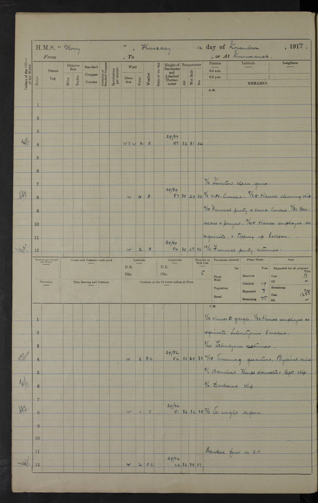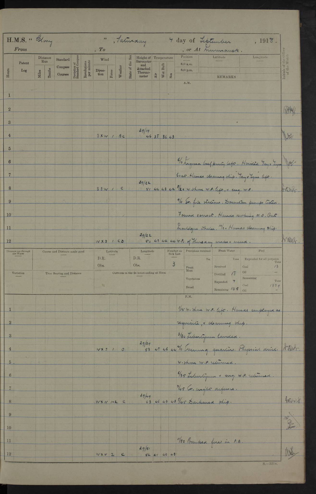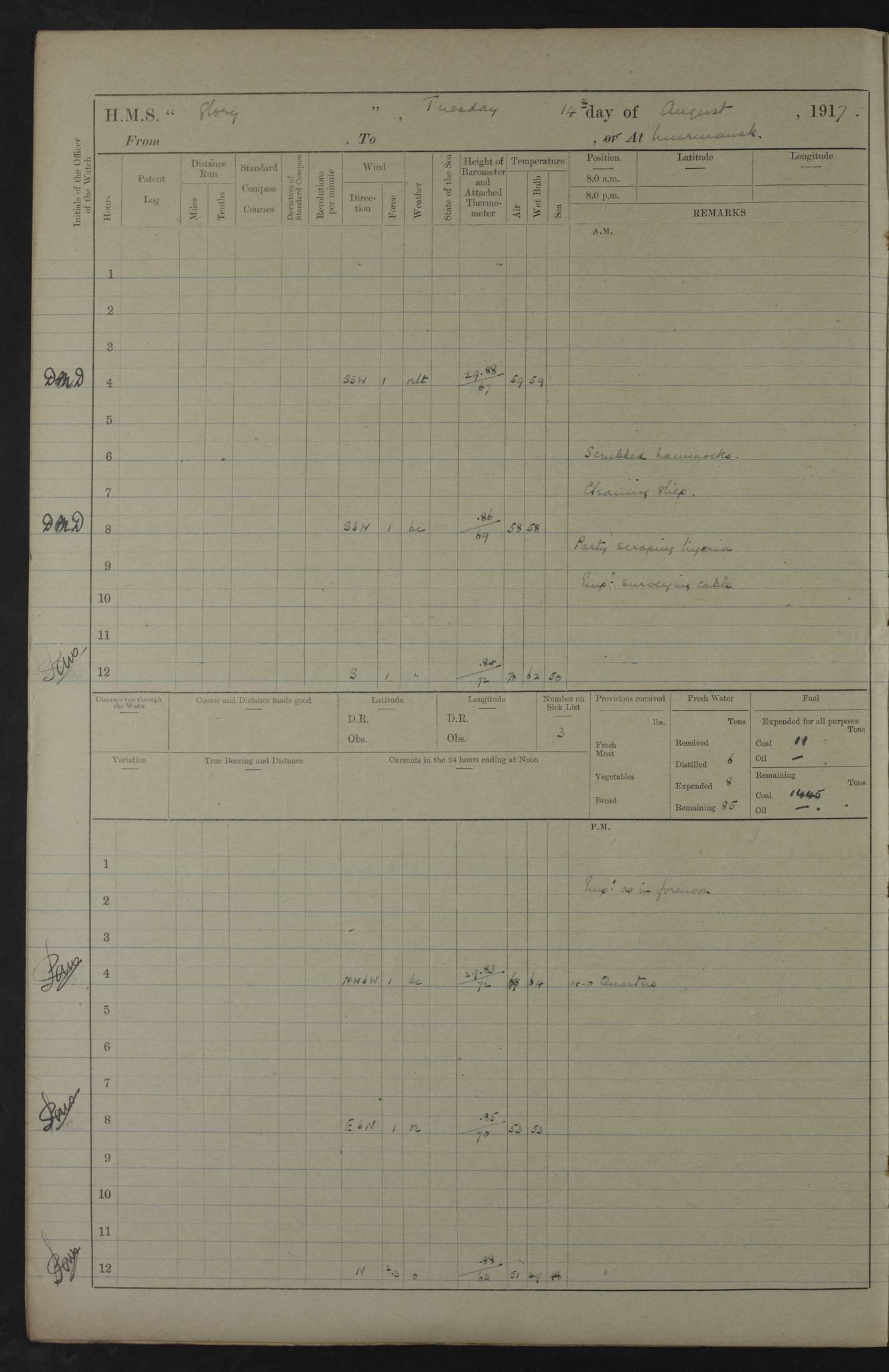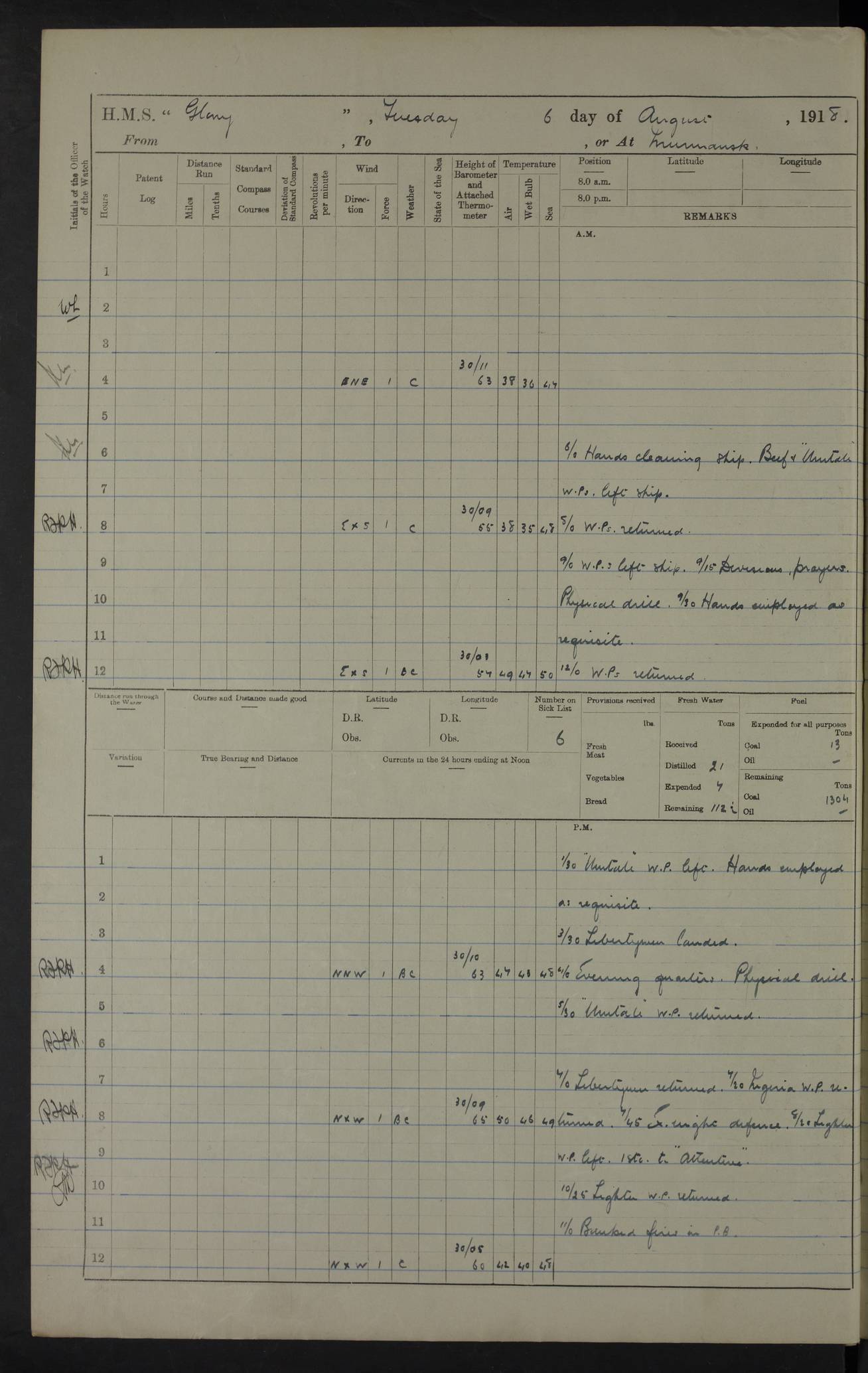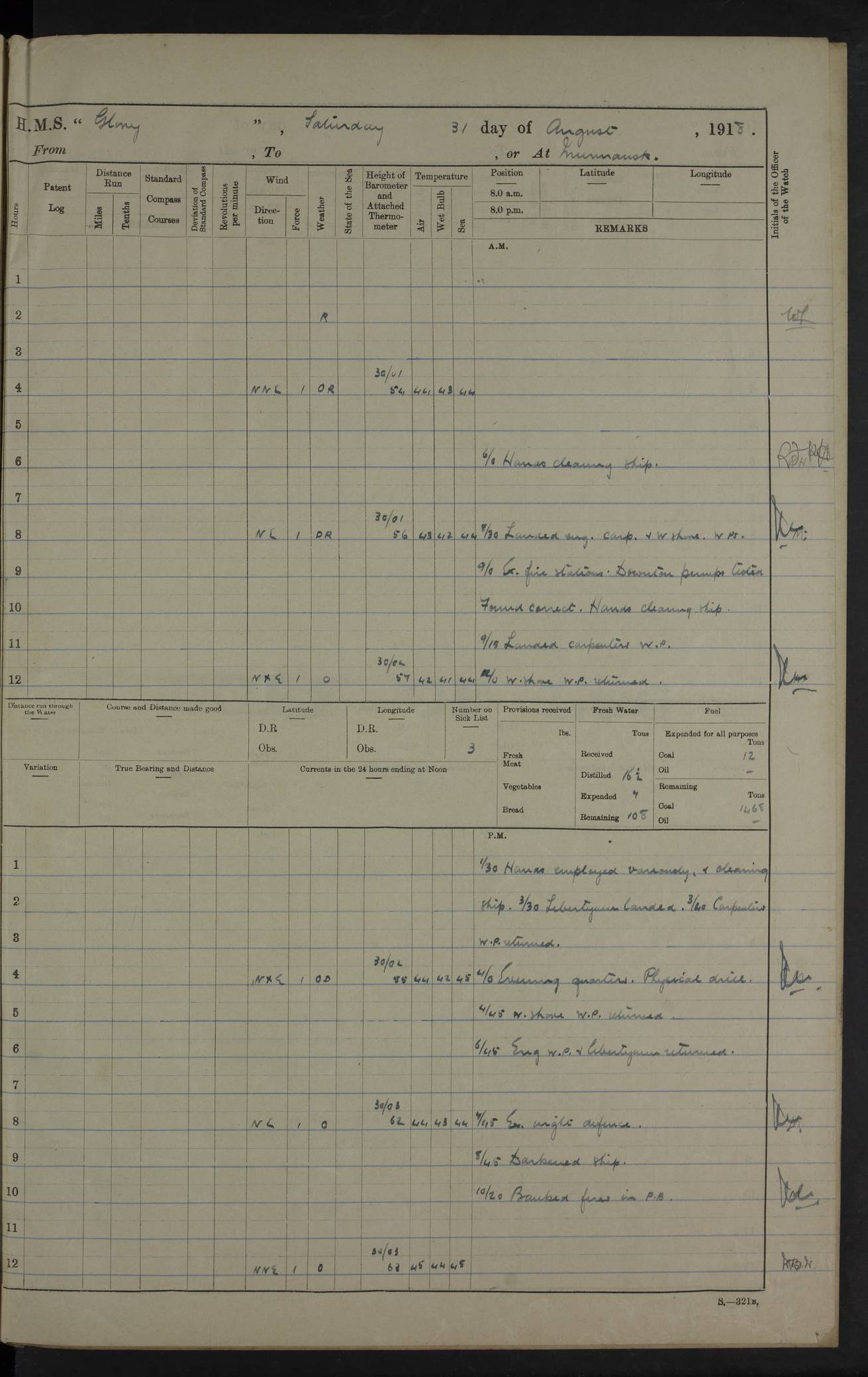 Captain’s inspection. 11.00pm: PO telegraphist joined ship from Goroslava. 4ef4f793e53e0a0c91002ca4: (https://s3.amazonaws.com:443/oldweather/ADM53-43039/ADM 53-43039-175_0.jpg) 26 August 1918 Murmansk Lat 69.03, Long 33.05 6.00am: Hands working main derrick. Out picket boat. In steam pinnace. 6.30am: Sub. Lieutenant Thompson joined T.17. 8.20am: Store and engineers working parties left. 10.15am: Gunner (T) and AB joined from T.17. 11.00am: 1 marine to Goroslava. 1.30pm: Engineers and store working parties left. 2.00pm: Discharged 2 warrant officers to Alexander. 5.00pm: Discharged Commander Monro to Alexander. Store party returned. 4ef4f794e53e0a0c91002ca5: (https://s3.amazonaws.com:443/oldweather/ADM53-43039/ADM 53-43039-175_1.jpg) 27 August 1918 Murmansk Lat 69.03, Long 33.05 Number on sick list: 6 6.00am: Store party left ship. 8.10am: Carpenters and ER (engine room?) working parties left ship. 11.00am: Hoisted 1st, 2nd, and 3rd cutters. 12 noon: Store party returned. 1.30pm: Store party landed and engineers working party. Hands employed as requisite and hoisting in stores. 3.30pm: Libertymen landed and store party. 4.10pm: Umtali working party left. 4.15pm: Carpenters working party returned. 7.15pm: Umtali working party returned. 4ef4f794e53e0a0c91002ca6: (https://s3.amazonaws.com:443/oldweather/ADM53-43039/ADM 53-43039-176_0.jpg) 28 August 1918 Murmansk Lat 69.03, Long 33.05 Number on sick list: 4 8.15am: Beef party to Nigeria, carpenters and engineers working parties. 11.45am: Beef party returned. 1.45pm: Working party to western shore with Commander Campbell. 6.20pm: Western shore working party returned. 6.45pm: Engineers and carpenters working parties returned, and libertymen. 4ef4f794e53e0a0c91002ca7: (https://s3.amazonaws.com:443/oldweather/ADM53-43039/ADM 53-43039-176_1.jpg) 29 August 1918 Murmansk Lat 69.03, Long 33.05 Number on sick list: 4 8.15am: Carpenters and engineers working parties left. 8.30am: Western shore working party left. 1.20pm: Western shore working party left. 4.00pm: Western shore working party returned. pm: Port watch clearing Anchor Star. 4ef4f794e53e0a0c91002ca8: (https://s3.amazonaws.com:443/oldweather/ADM53-43039/ADM 53-43039-177_0.jpg) 30 August 1918 Murmansk Lat 69.03, Long 33.05 Number on sick list: 4 8.30am: Western shore working party left and beef party. 11.00am: Beef party returned. 12 noon: Western shore working party returned. 1.30pm: Western shore working party left, and store party for Heathside. 6.40pm: Libertymen, engineers and carpenters working parties returned. 4ef4f794e53e0a0c91002ca9: (https://s3.amazonaws.com:443/oldweather/ADM53-43039/ADM 53-43039-177_1.jpg) 31 August 1918 Murmansk Lat 69.03, Long 33.05 Number on sick list: 3 8.30am: Landed engineers, carpenters and western shore working parties. 9.15am: Landed carpenters working party. 12 noon: Western shore working party returned. 3.40pm: Carpenters working party returned. 4.45pm: Western shore working party returned. 6.45pm: Engineers working party and libertymen returned. LOGS FOR SEPTEMBER 1918 4ef4f794e53e0a0c91002caa: (https://s3.amazonaws.com:443/oldweather/ADM53-43039/ADM 53-43039-178_0.jpg) 4ef4f794e53e0a0c91002cab: (https://s3.amazonaws.com:443/oldweather/ADM53-43039/ADM 53-43039-178_1.jpg) 4ef4f794e53e0a0c91002cac: (https://s3.amazonaws.com:443/oldweather/ADM53-43039/ADM 53-43039-179_0.jpg) 4ef4f794e53e0a0c91002cad: (https://s3.amazonaws.com:443/oldweather/ADM53-43039/ADM 53-43039-179_1.jpg) No log available for 1 September 1918. 4ef4f794e53e0a0c91002cae: (https://s3.amazonaws.com:443/oldweather/ADM53-43039/ADM 53-43039-180_0.jpg) 2 September 1918 Murmansk Lat 69.03, Long 33.05 Number on sick list: 5 8.00am: Alexandrovsk, western shore and beef working parties left. 10.45am: Beef party returned. 11.10am: Water boat alongside. 12.45pm: Paid monthly money. Survivors of Ariadne Christine left ship. ‘Ariadne Christine’, of 3550 tons gross, was built in 1910 at Thompson & Sons, Sunderland, and was mined off the Ribachi Peninsula at the entrance to the White Sea on 2 September, 1918. Details at http://www.uboat.net/wwi/ships_hit/7678.html . 4.30pm: Western shore working party returned. 6.20pm: Alexandrovsk working party returned. 7.00pm: Libertymen and engineers working party returned. 8.00pm: Received from Junco 231 bags mail. Junco was a hired trawler of 191 tons gross, built in 1917 (Admiralty No. 1657; Port No. H.587). 4ef4f794e53e0a0c91002caf: (https://s3.amazonaws.com:443/oldweather/ADM53-43039/ADM 53-43039-180_1.jpg) 3 September 1918 Murmansk Lat 69.03, Long 33.05 Number on sick list: 4 8.15am: Pier working party, engineers and carpenters working parties left. 10.50am: Admiral and staff transferred to Salvator. 11.50am: Working parties returned. 1.30pm: Nigeria and pier working parties left. 3.15pm: Tay & Tyne secured alongside. 4.20pm: Western shore working party returned. 7.45pm: Received 19 bags mail, ex T.13. 4ef4f794e53e0a0c91002cb0: (https://s3.amazonaws.com:443/oldweather/ADM53-43039/ADM 53-43039-181_0.jpg) 4 September 1918 Murmansk Lat 69.03, Long 33.05 Number on sick list: 3 8.20am: Engineers working party and western shore working party left. 12 noon: Western shore working party returned. 1.30pm: Working part left for stores. 4.00pm: Working parties returned. 5.50pm: Working party left ship for wharf. 6.00pm: Leave to 12.00 for dance club. 8.25pm: Working parties returned. 4ef4f794e53e0a0c91002cb1: (https://s3.amazonaws.com:443/oldweather/ADM53-43039/ADM 53-43039-181_1.jpg) 5 September 1918 Murmansk Lat 69.03, Long 33.05 Number on sick list: 3 0.45am: Dance club returned. 6.00am: Ben Nevis working party left. ‘Ben Nevis’ was a store carrier of 3895 grt, built in 1905. Sourced from F.J. Dittmar & J.J. Colledge (1972) – British warships 1914–1919, Ian Allan. 8.20am: Nigeria beef party and western shore working party left. 11.45am: Working parties returned. 1.30pm: Ben Nevis and Palm Branch working parties left. 6.05pm: Ben Nevis and Palm Branch wo