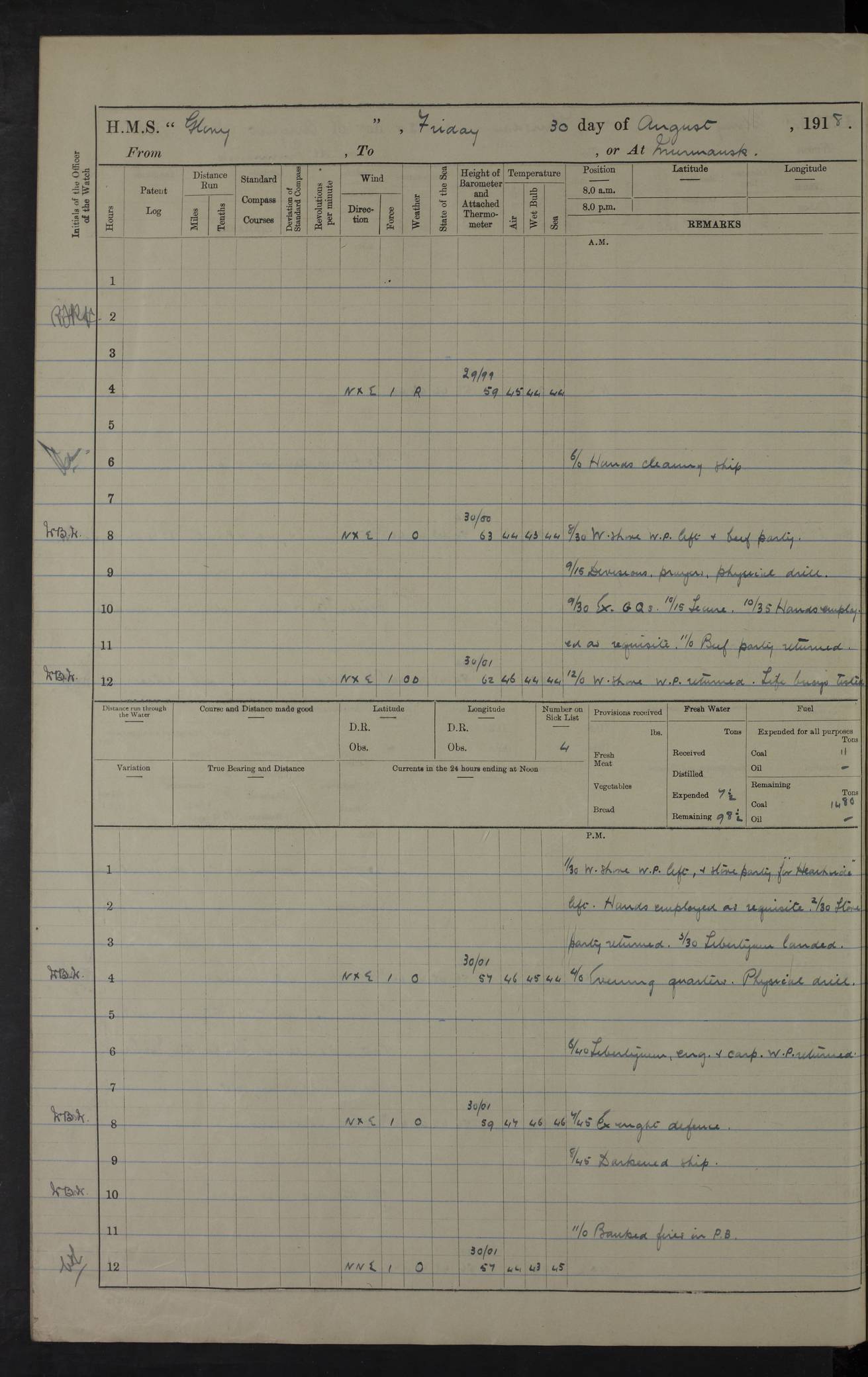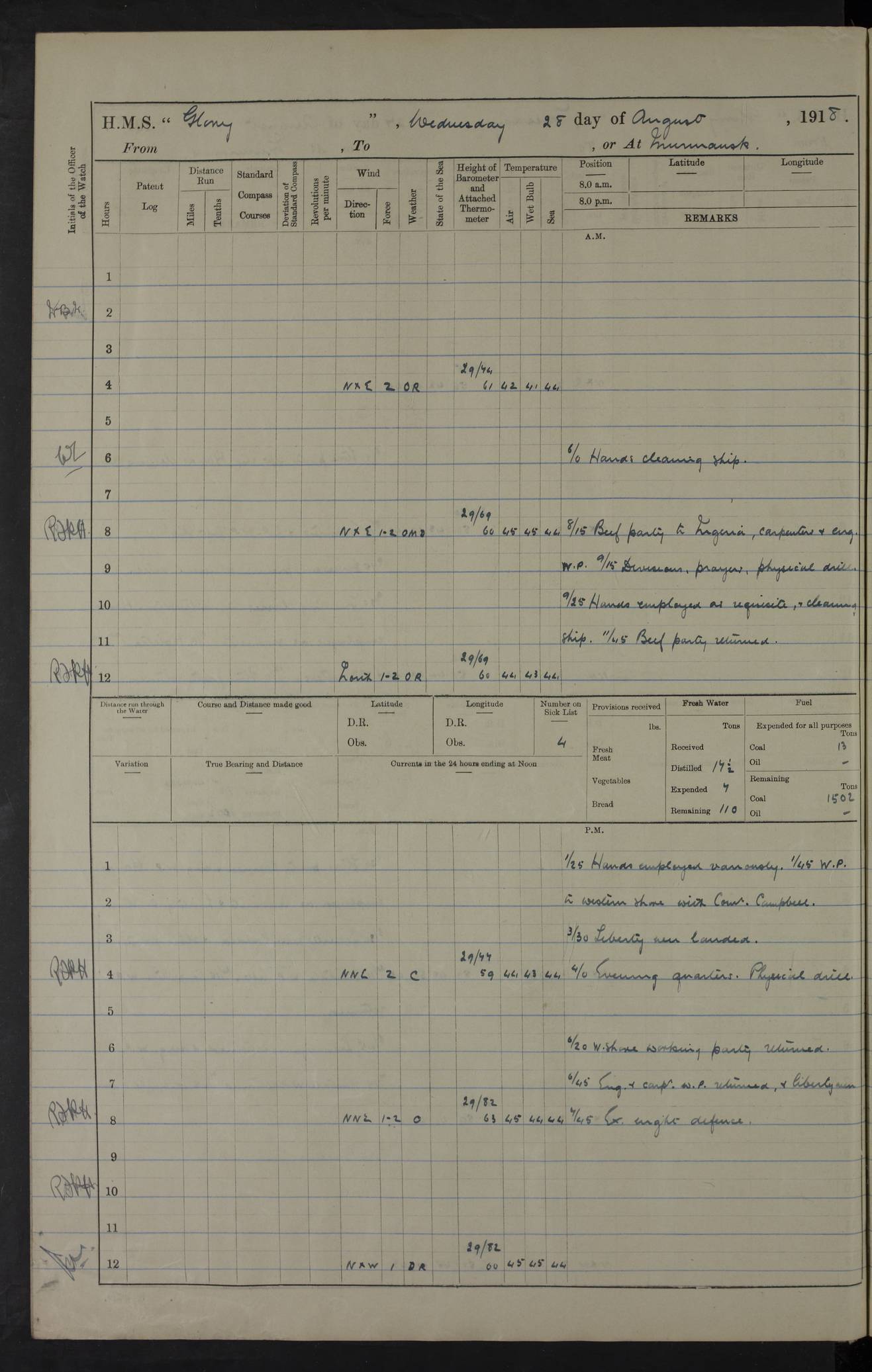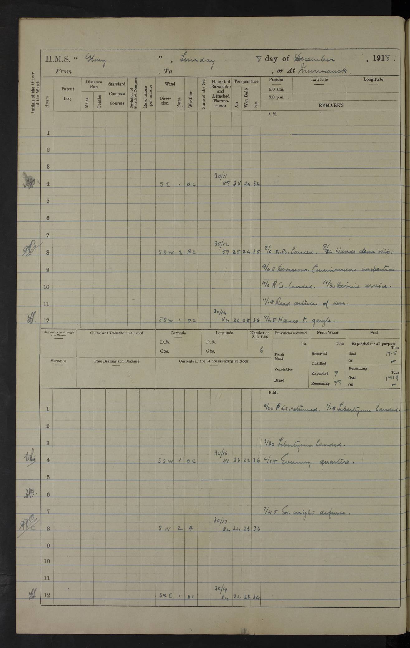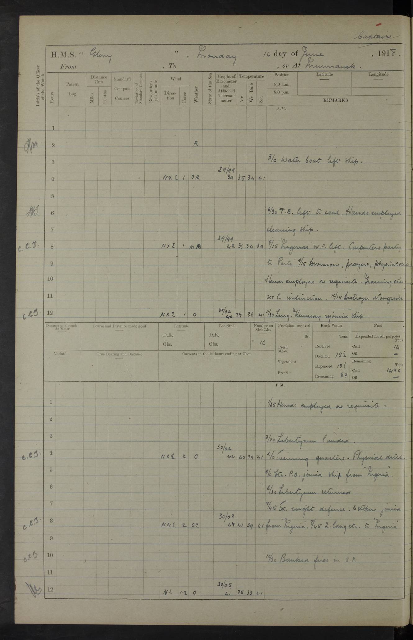 Captain’s inspection. 11.00pm: PO telegraphist joined ship from Goroslava. 4ef4f793e53e0a0c91002ca4: (https://s3.amazonaws.com:443/oldweather/ADM53-43039/ADM 53-43039-175_0.jpg) 26 August 1918 Murmansk Lat 69.03, Long 33.05 6.00am: Hands working main derrick. Out picket boat. In steam pinnace. 6.30am: Sub. Lieutenant Thompson joined T.17. 8.20am: Store and engineers working parties left. 10.15am: Gunner (T) and AB joined from T.17. 11.00am: 1 marine to Goroslava. 1.30pm: Engineers and store working parties left. 2.00pm: Discharged 2 warrant officers to Alexander. 5.00pm: Discharged Commander Monro to Alexander. Store party returned. 4ef4f794e53e0a0c91002ca5: (https://s3.amazonaws.com:443/oldweather/ADM53-43039/ADM 53-43039-175_1.jpg) 27 August 1918 Murmansk Lat 69.03, Long 33.05 Number on sick list: 6 6.00am: Store party left ship. 8.10am: Carpenters and ER (engine room?) working parties left ship. 11.00am: Hoisted 1st, 2nd, and 3rd cutters. 12 noon: Store party returned. 1.30pm: Store party landed and engineers working party. Hands employed as requisite and hoisting in stores. 3.30pm: Libertymen landed and store party. 4.10pm: Umtali working party left. 4.15pm: Carpenters working party returned. 7.15pm: Umtali working party returned. 4ef4f794e53e0a0c91002ca6: (https://s3.amazonaws.com:443/oldweather/ADM53-43039/ADM 53-43039-176_0.jpg) 28 August 1918 Murmansk Lat 69.03, Long 33.05 Number on sick list: 4 8.15am: Beef party to Nigeria, carpenters and engineers working parties. 11.45am: Beef party returned. 1.45pm: Working party to western shore with Commander Campbell. 6.20pm: Western shore working party returned. 6.45pm: Engineers and carpenters working parties returned, and libertymen. 4ef4f794e53e0a0c91002ca7: (https://s3.amazonaws.com:443/oldweather/ADM53-43039/ADM 53-43039-176_1.jpg) 29 August 1918 Murmansk Lat 69.03, Long 33.05 Number on sick list: 4 8.15am: Carpenters and engineers working parties left. 8.30am: Western shore working party left. 1.20pm: Western shore working party left. 4.00pm: Western shore working party returned. pm: Port watch clearing Anchor Star. 4ef4f794e53e0a0c91002ca8: (https://s3.amazonaws.com:443/oldweather/ADM53-43039/ADM 53-43039-177_0.jpg) 30 August 1918 Murmansk Lat 69.03, Long 33.05 Number on sick list: 4 8.30am: Western shore working party left and beef party. 11.00am: Beef party returned. 12 noon: Western shore working party returned. 1.30pm: Western shore working party left, and store party for Heathside. 6.40pm: Libertymen, engineers and carpenters working parties returned. 4ef4f794e53e0a0c91002ca9: (https://s3.amazonaws.com:443/oldweather/ADM53-43039/ADM 53-43039-177_1.jpg) 31 August 1918 Murmansk Lat 69.03, Long 33.05 Number on sick list: 3 8.30am: Landed engineers, carpenters and western shore working parties. 9.15am: Landed carpenters working party. 12 noon: Western shore working party returned. 3.40pm: Carpenters working party returned. 4.45pm: Western shore working party returned. 6.45pm: Engineers working party and libertymen returned. LOGS FOR SEPTEMBER 1918 4ef4f794e53e0a0c91002caa: (https://s3.amazonaws.com:443/oldweather/ADM53-43039/ADM 53-43039-178_0.jpg) 4ef4f794e53e0a0c91002cab: (https://s3.amazonaws.com:443/oldweather/ADM53-43039/ADM 53-43039-178_1.jpg) 4ef4f794e53e0a0c91002cac: (https://s3.amazonaws.com:443/oldweather/ADM53-43039/ADM 53-43039-179_0.jpg) 4ef4f794e53e0a0c91002cad: (https://s3.amazonaws.com:443/oldweather/ADM53-43039/ADM 53-43039-179_1.jpg) No log available for 1 September 1918. 4ef4f794e53e0a0c91002cae: (https://s3.amazonaws.com:443/oldweather/ADM53-43039/ADM 53-43039-180_0.jpg) 2 September 1918 Murmansk Lat 69.03, Long 33.05 Number on sick list: 5 8.00am: Alexandrovsk, western shore and beef working parties left. 10.45am: Beef party returned. 11.10am: Water boat alongside. 12.45pm: Paid monthly money. Survivors of Ariadne Christine left ship. ‘Ariadne Christine’, of 3550 tons gross, was built in 1910 at Thompson & Sons, Sunderland, and was mined off the Ribachi Peninsula at the entrance to the White Sea on 2 September, 1918. Details at http://www.uboat.net/wwi/ships_hit/7678.html . 4.30pm: Western shore working party returned. 6.20pm: Alexandrovsk working party returned. 7.00pm: Libertymen and engineers working party returned. 8.00pm: Received from Junco 231 bags mail. Junco was a hired trawler of 191 tons gross, built in 1917 (Admiralty No. 1657; Port No. H.587). 4ef4f794e53e0a0c91002caf: (https://s3.amazonaws.com:443/oldweather/ADM53-43039/ADM 53-43039-180_1.jpg) 3 September 1918 Murmansk Lat 69.03, Long 33.05 Number on sick list: 4 8.15am: Pier working party, engineers and carpenters working parties left. 10.50am: Admiral and staff transferred to Salvator. 11.50am: Working parties returned. 1.30pm: Nigeria and pier working parties left. 3.15pm: Tay & Tyne secured alongside. 4.20pm: Western shore working party returned. 7.45pm: Received 19 bags mail, ex T.13. 4ef4f794e53e0a0c91002cb0: (https://s3.amazonaws.com:443/oldweather/ADM53-43039/ADM 53-43039-181_0.jpg) 4 September 1918 Murmansk Lat 69.03, Long 33.05 Number on sick list: 3 8.20am: Engineers working party and western shore working party left. 12 noon: Western shore working party returned. 1.30pm: Working part left for stores. 4.00pm: Working parties returned. 5.50pm: Working party left ship for wharf. 6.00pm: Leave to 12.00 for dance club. 8.25pm: Working parties returned. 4ef4f794e53e0a0c91002cb1: (https://s3.amazonaws.com:443/oldweather/ADM53-43039/ADM 53-43039-181_1.jpg) 5 September 1918 Murmansk Lat 69.03, Long 33.05 Number on sick list: 3 0.45am: Dance club returned. 6.00am: Ben Nevis working party left. ‘Ben Nevis’ was a store carrier of 3895 grt, built in 1905. Sourced from F.J. Dittmar & J.J. Colledge (1972) – British warships 1914–1919, Ian Allan. 8.20am: Nigeria beef party and western shore working party left. 11.45am: Working parties returned. 1.30pm: Ben Nevis and Palm Branch working parties left. 6.05pm: Ben Nevis and Palm Branch wo