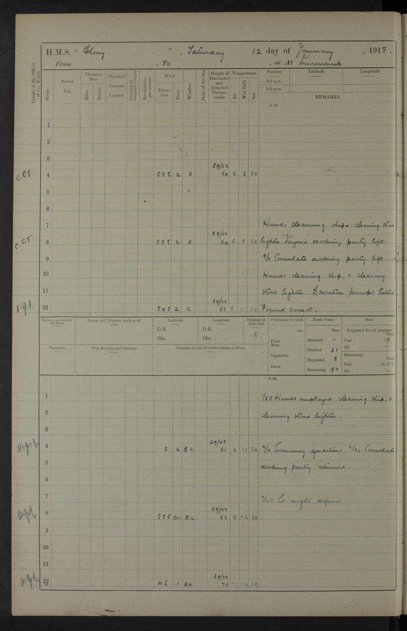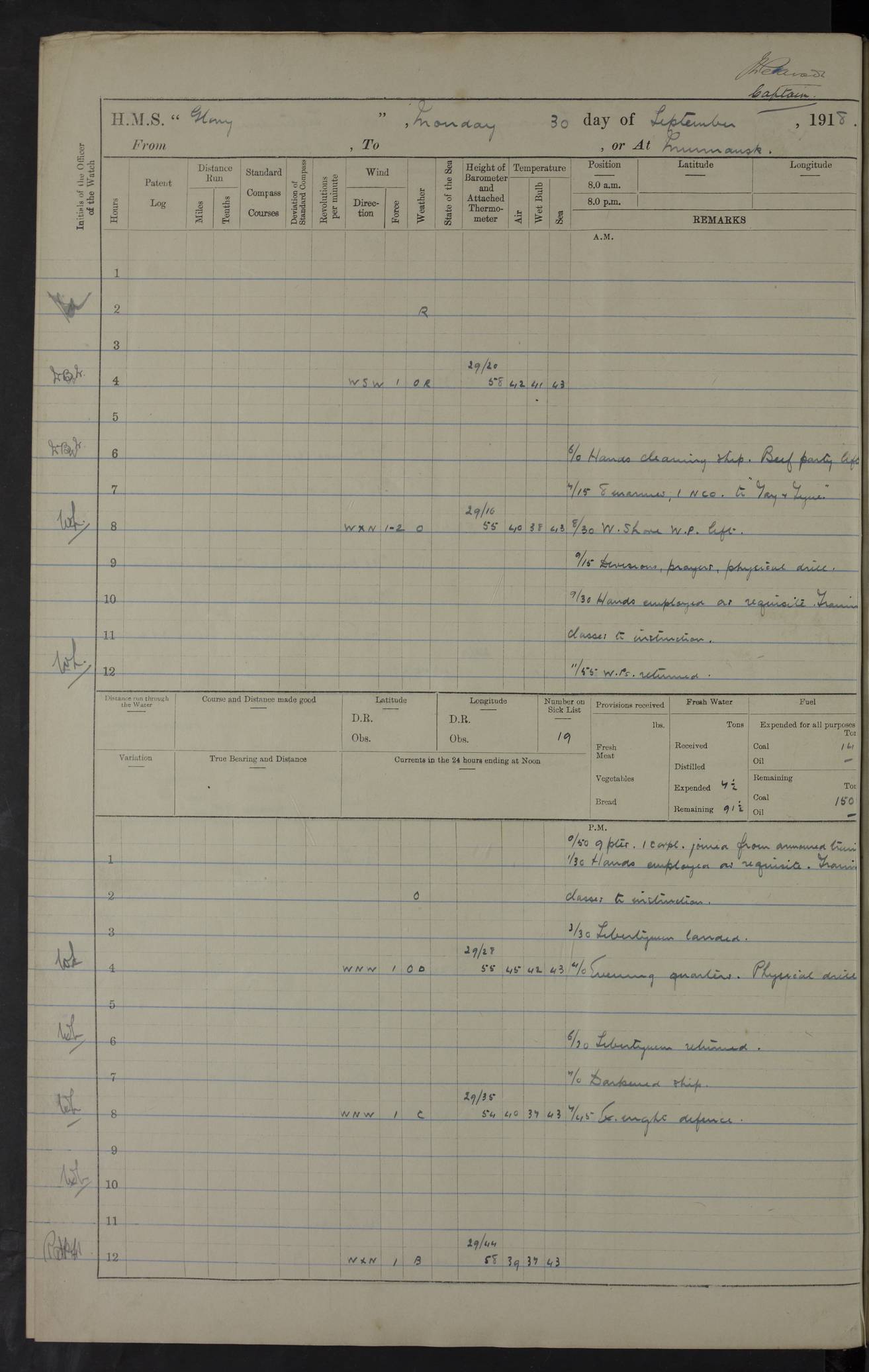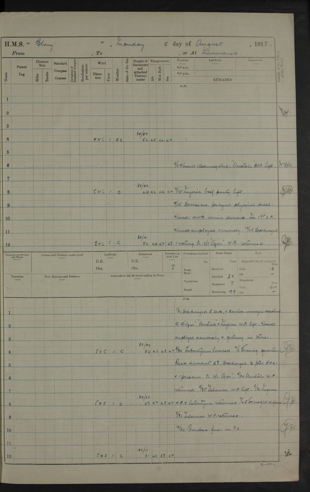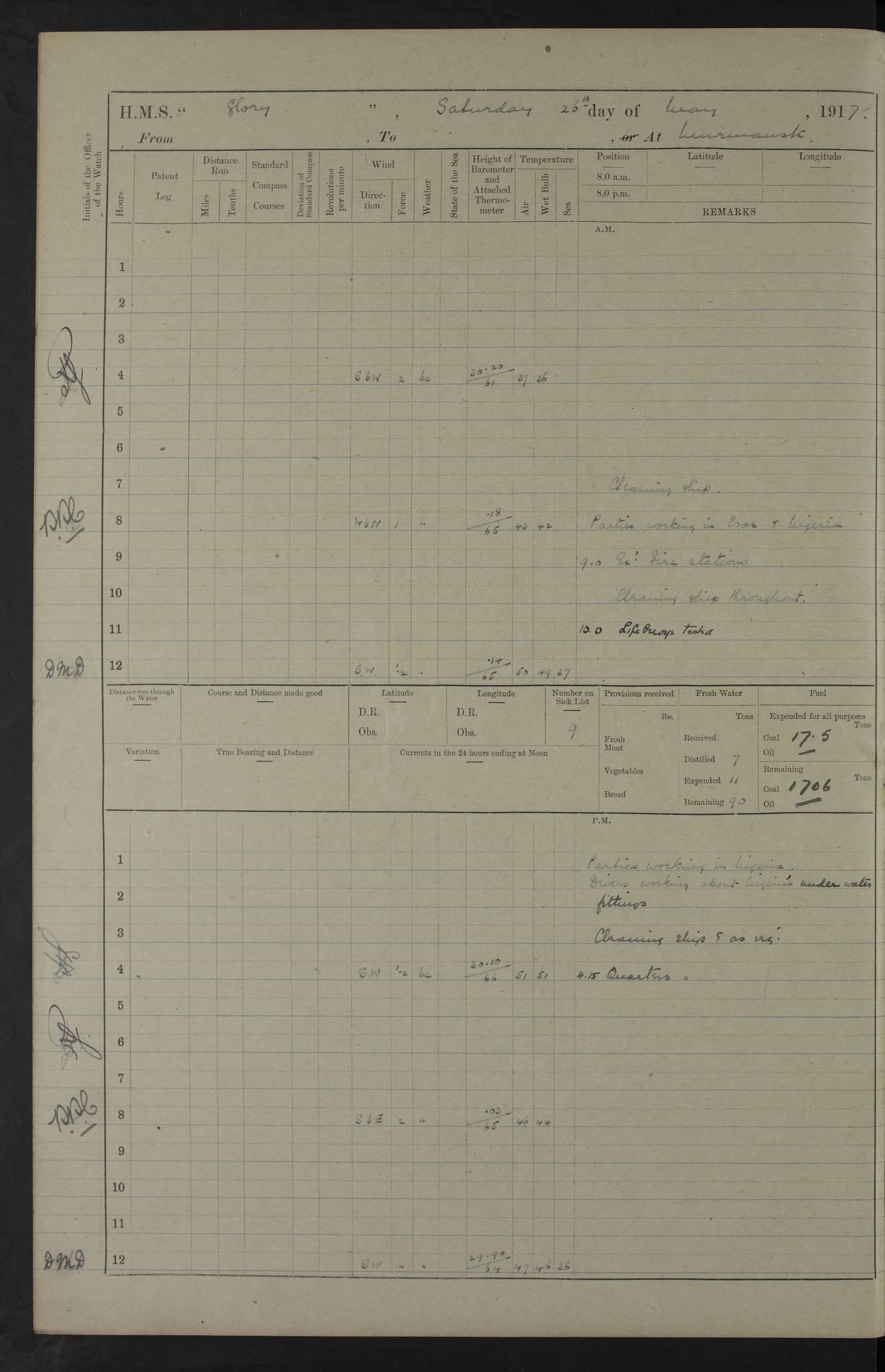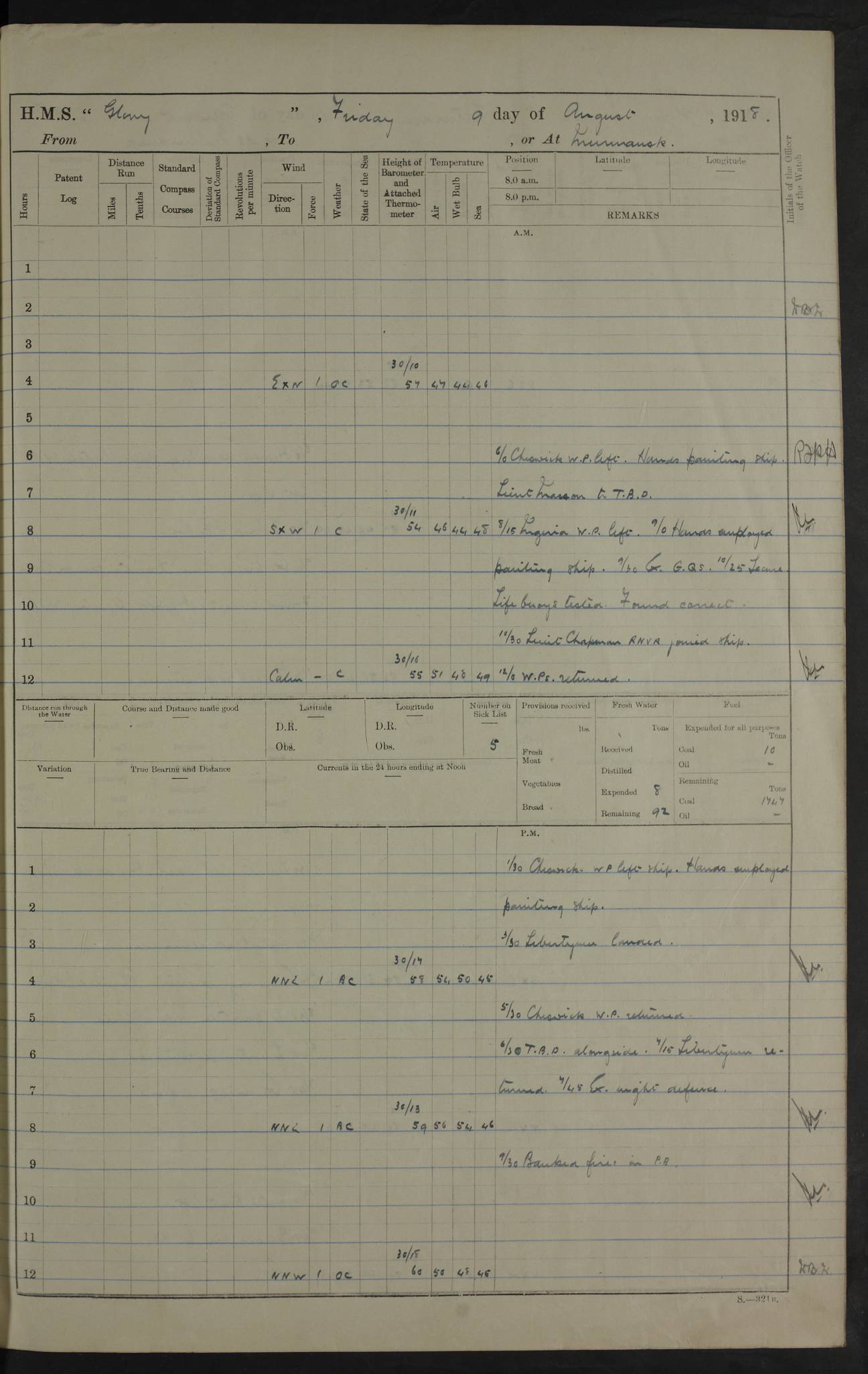 Captain’s inspection. 11.00pm: PO telegraphist joined ship from Goroslava. 4ef4f793e53e0a0c91002ca4: (https://s3.amazonaws.com:443/oldweather/ADM53-43039/ADM 53-43039-175_0.jpg) 26 August 1918 Murmansk Lat 69.03, Long 33.05 6.00am: Hands working main derrick. Out picket boat. In steam pinnace. 6.30am: Sub. Lieutenant Thompson joined T.17. 8.20am: Store and engineers working parties left. 10.15am: Gunner (T) and AB joined from T.17. 11.00am: 1 marine to Goroslava. 1.30pm: Engineers and store working parties left. 2.00pm: Discharged 2 warrant officers to Alexander. 5.00pm: Discharged Commander Monro to Alexander. Store party returned. 4ef4f794e53e0a0c91002ca5: (https://s3.amazonaws.com:443/oldweather/ADM53-43039/ADM 53-43039-175_1.jpg) 27 August 1918 Murmansk Lat 69.03, Long 33.05 Number on sick list: 6 6.00am: Store party left ship. 8.10am: Carpenters and ER (engine room?) working parties left ship. 11.00am: Hoisted 1st, 2nd, and 3rd cutters. 12 noon: Store party returned. 1.30pm: Store party landed and engineers working party. Hands employed as requisite and hoisting in stores. 3.30pm: Libertymen landed and store party. 4.10pm: Umtali working party left. 4.15pm: Carpenters working party returned. 7.15pm: Umtali working party returned. 4ef4f794e53e0a0c91002ca6: (https://s3.amazonaws.com:443/oldweather/ADM53-43039/ADM 53-43039-176_0.jpg) 28 August 1918 Murmansk Lat 69.03, Long 33.05 Number on sick list: 4 8.15am: Beef party to Nigeria, carpenters and engineers working parties. 11.45am: Beef party returned. 1.45pm: Working party to western shore with Commander Campbell. 6.20pm: Western shore working party returned. 6.45pm: Engineers and carpenters working parties returned, and libertymen. 4ef4f794e53e0a0c91002ca7: (https://s3.amazonaws.com:443/oldweather/ADM53-43039/ADM 53-43039-176_1.jpg) 29 August 1918 Murmansk Lat 69.03, Long 33.05 Number on sick list: 4 8.15am: Carpenters and engineers working parties left. 8.30am: Western shore working party left. 1.20pm: Western shore working party left. 4.00pm: Western shore working party returned. pm: Port watch clearing Anchor Star. 4ef4f794e53e0a0c91002ca8: (https://s3.amazonaws.com:443/oldweather/ADM53-43039/ADM 53-43039-177_0.jpg) 30 August 1918 Murmansk Lat 69.03, Long 33.05 Number on sick list: 4 8.30am: Western shore working party left and beef party. 11.00am: Beef party returned. 12 noon: Western shore working party returned. 1.30pm: Western shore working party left, and store party for Heathside. 6.40pm: Libertymen, engineers and carpenters working parties returned. 4ef4f794e53e0a0c91002ca9: (https://s3.amazonaws.com:443/oldweather/ADM53-43039/ADM 53-43039-177_1.jpg) 31 August 1918 Murmansk Lat 69.03, Long 33.05 Number on sick list: 3 8.30am: Landed engineers, carpenters and western shore working parties. 9.15am: Landed carpenters working party. 12 noon: Western shore working party returned. 3.40pm: Carpenters working party returned. 4.45pm: Western shore working party returned. 6.45pm: Engineers working party and libertymen returned. LOGS FOR SEPTEMBER 1918 4ef4f794e53e0a0c91002caa: (https://s3.amazonaws.com:443/oldweather/ADM53-43039/ADM 53-43039-178_0.jpg) 4ef4f794e53e0a0c91002cab: (https://s3.amazonaws.com:443/oldweather/ADM53-43039/ADM 53-43039-178_1.jpg) 4ef4f794e53e0a0c91002cac: (https://s3.amazonaws.com:443/oldweather/ADM53-43039/ADM 53-43039-179_0.jpg) 4ef4f794e53e0a0c91002cad: (https://s3.amazonaws.com:443/oldweather/ADM53-43039/ADM 53-43039-179_1.jpg) No log available for 1 September 1918. 4ef4f794e53e0a0c91002cae: (https://s3.amazonaws.com:443/oldweather/ADM53-43039/ADM 53-43039-180_0.jpg) 2 September 1918 Murmansk Lat 69.03, Long 33.05 Number on sick list: 5 8.00am: Alexandrovsk, western shore and beef working parties left. 10.45am: Beef party returned. 11.10am: Water boat alongside. 12.45pm: Paid monthly money. Survivors of Ariadne Christine left ship. ‘Ariadne Christine’, of 3550 tons gross, was built in 1910 at Thompson & Sons, Sunderland, and was mined off the Ribachi Peninsula at the entrance to the White Sea on 2 September, 1918. Details at http://www.uboat.net/wwi/ships_hit/7678.html . 4.30pm: Western shore working party returned. 6.20pm: Alexandrovsk working party returned. 7.00pm: Libertymen and engineers working party returned. 8.00pm: Received from Junco 231 bags mail. Junco was a hired trawler of 191 tons gross, built in 1917 (Admiralty No. 1657; Port No. H.587). 4ef4f794e53e0a0c91002caf: (https://s3.amazonaws.com:443/oldweather/ADM53-43039/ADM 53-43039-180_1.jpg) 3 September 1918 Murmansk Lat 69.03, Long 33.05 Number on sick list: 4 8.15am: Pier working party, engineers and carpenters working parties left. 10.50am: Admiral and staff transferred to Salvator. 11.50am: Working parties returned. 1.30pm: Nigeria and pier working parties left. 3.15pm: Tay & Tyne secured alongside. 4.20pm: Western shore working party returned. 7.45pm: Received 19 bags mail, ex T.13. 4ef4f794e53e0a0c91002cb0: (https://s3.amazonaws.com:443/oldweather/ADM53-43039/ADM 53-43039-181_0.jpg) 4 September 1918 Murmansk Lat 69.03, Long 33.05 Number on sick list: 3 8.20am: Engineers working party and western shore working party left. 12 noon: Western shore working party returned. 1.30pm: Working part left for stores. 4.00pm: Working parties returned. 5.50pm: Working party left ship for wharf. 6.00pm: Leave to 12.00 for dance club. 8.25pm: Working parties returned. 4ef4f794e53e0a0c91002cb1: (https://s3.amazonaws.com:443/oldweather/ADM53-43039/ADM 53-43039-181_1.jpg) 5 September 1918 Murmansk Lat 69.03, Long 33.05 Number on sick list: 3 0.45am: Dance club returned. 6.00am: Ben Nevis working party left. ‘Ben Nevis’ was a store carrier of 3895 grt, built in 1905. Sourced from F.J. Dittmar & J.J. Colledge (1972) – British warships 1914–1919, Ian Allan. 8.20am: Nigeria beef party and western shore working party left. 11.45am: Working parties returned. 1.30pm: Ben Nevis and Palm Branch working parties left. 6.05pm: Ben Nevis and Palm Branch wo