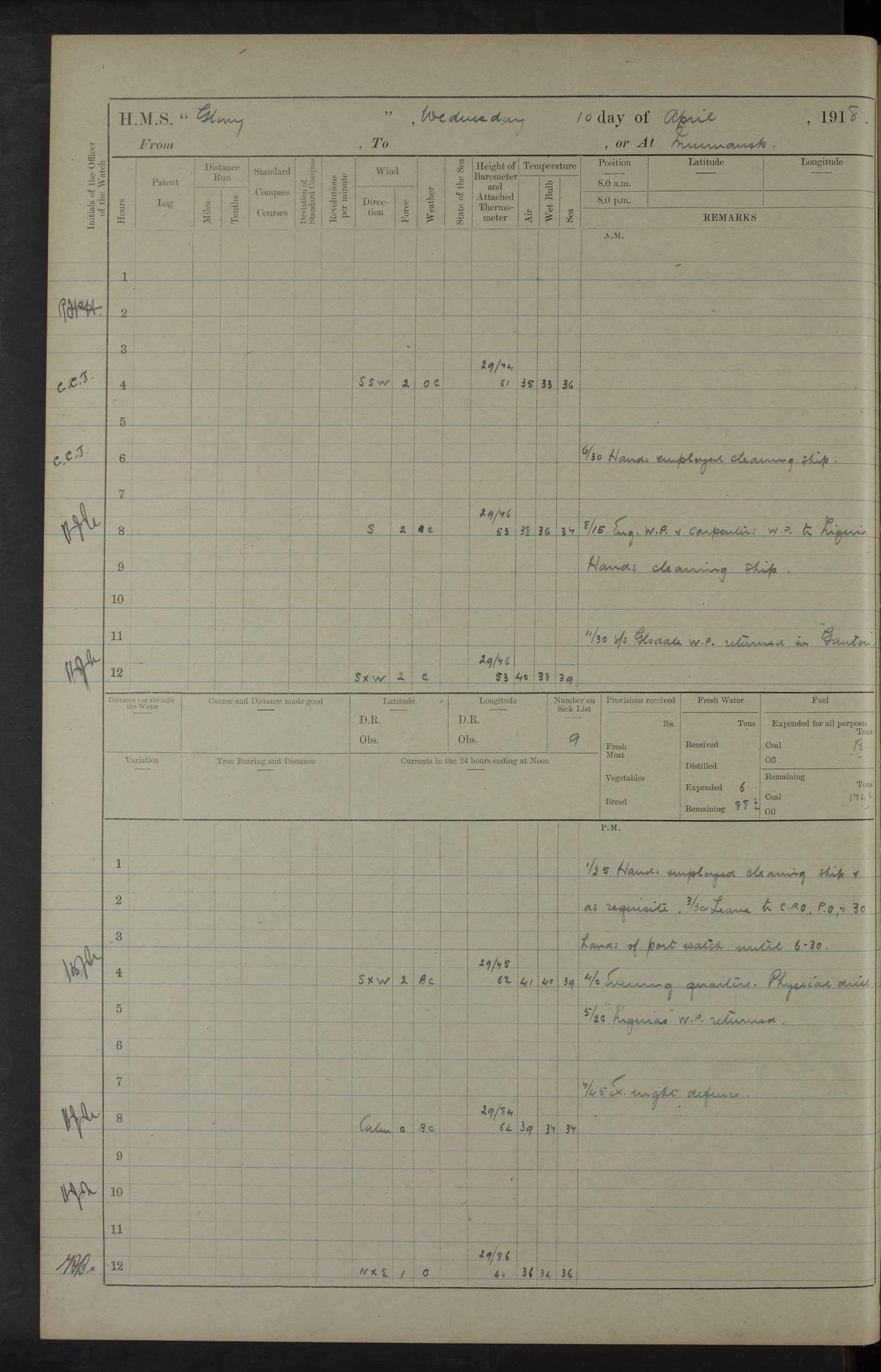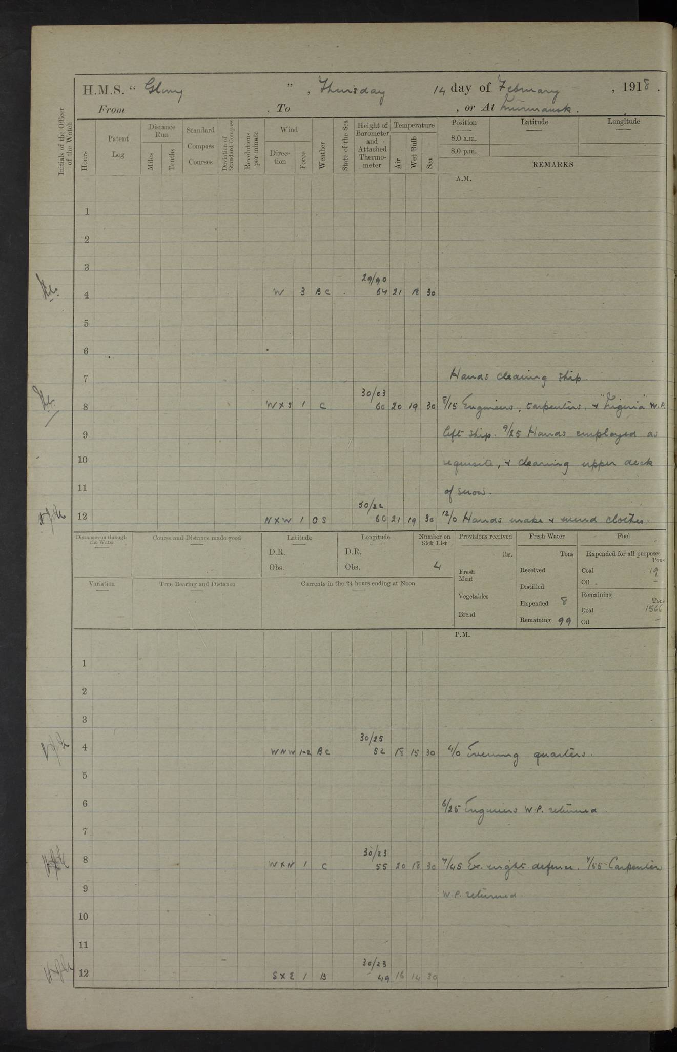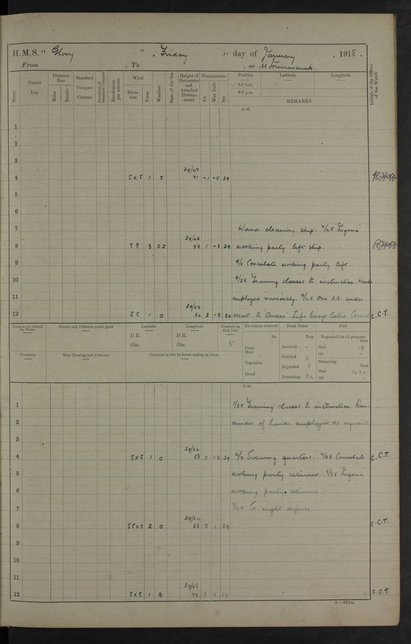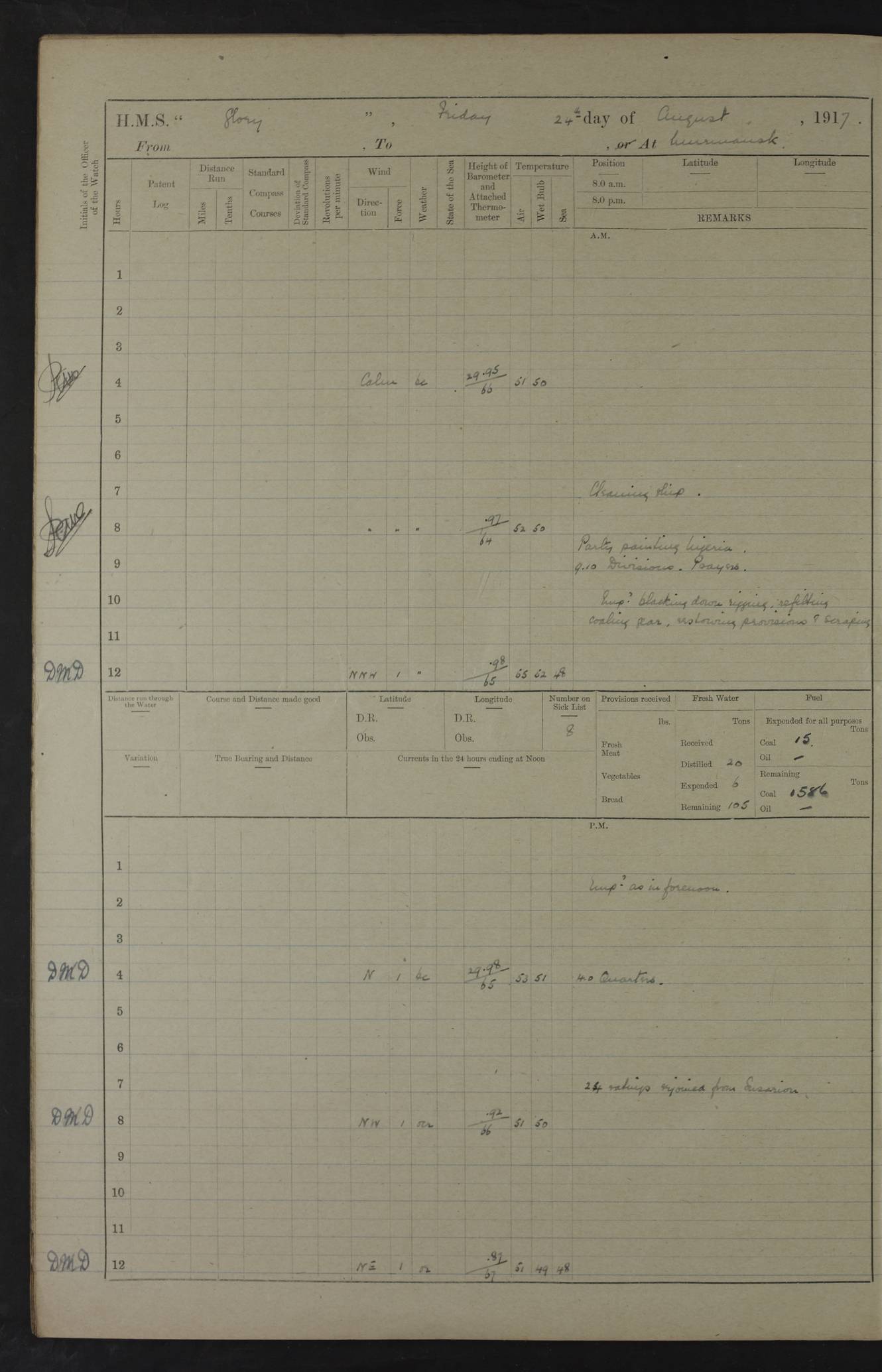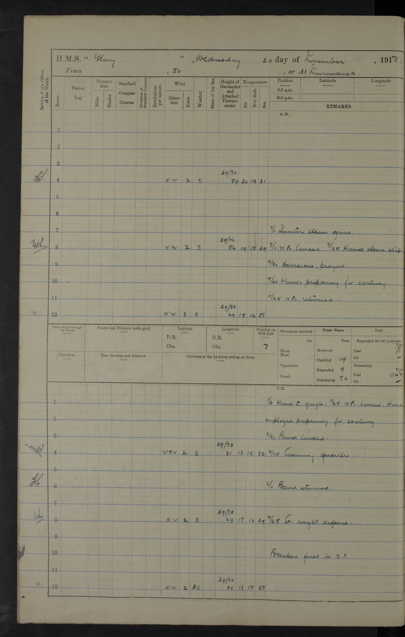 Captain’s inspection. 11.00pm: PO telegraphist joined ship from Goroslava. 4ef4f793e53e0a0c91002ca4: (https://s3.amazonaws.com:443/oldweather/ADM53-43039/ADM 53-43039-175_0.jpg) 26 August 1918 Murmansk Lat 69.03, Long 33.05 6.00am: Hands working main derrick. Out picket boat. In steam pinnace. 6.30am: Sub. Lieutenant Thompson joined T.17. 8.20am: Store and engineers working parties left. 10.15am: Gunner (T) and AB joined from T.17. 11.00am: 1 marine to Goroslava. 1.30pm: Engineers and store working parties left. 2.00pm: Discharged 2 warrant officers to Alexander. 5.00pm: Discharged Commander Monro to Alexander. Store party returned. 4ef4f794e53e0a0c91002ca5: (https://s3.amazonaws.com:443/oldweather/ADM53-43039/ADM 53-43039-175_1.jpg) 27 August 1918 Murmansk Lat 69.03, Long 33.05 Number on sick list: 6 6.00am: Store party left ship. 8.10am: Carpenters and ER (engine room?) working parties left ship. 11.00am: Hoisted 1st, 2nd, and 3rd cutters. 12 noon: Store party returned. 1.30pm: Store party landed and engineers working party. Hands employed as requisite and hoisting in stores. 3.30pm: Libertymen landed and store party. 4.10pm: Umtali working party left. 4.15pm: Carpenters working party returned. 7.15pm: Umtali working party returned. 4ef4f794e53e0a0c91002ca6: (https://s3.amazonaws.com:443/oldweather/ADM53-43039/ADM 53-43039-176_0.jpg) 28 August 1918 Murmansk Lat 69.03, Long 33.05 Number on sick list: 4 8.15am: Beef party to Nigeria, carpenters and engineers working parties. 11.45am: Beef party returned. 1.45pm: Working party to western shore with Commander Campbell. 6.20pm: Western shore working party returned. 6.45pm: Engineers and carpenters working parties returned, and libertymen. 4ef4f794e53e0a0c91002ca7: (https://s3.amazonaws.com:443/oldweather/ADM53-43039/ADM 53-43039-176_1.jpg) 29 August 1918 Murmansk Lat 69.03, Long 33.05 Number on sick list: 4 8.15am: Carpenters and engineers working parties left. 8.30am: Western shore working party left. 1.20pm: Western shore working party left. 4.00pm: Western shore working party returned. pm: Port watch clearing Anchor Star. 4ef4f794e53e0a0c91002ca8: (https://s3.amazonaws.com:443/oldweather/ADM53-43039/ADM 53-43039-177_0.jpg) 30 August 1918 Murmansk Lat 69.03, Long 33.05 Number on sick list: 4 8.30am: Western shore working party left and beef party. 11.00am: Beef party returned. 12 noon: Western shore working party returned. 1.30pm: Western shore working party left, and store party for Heathside. 6.40pm: Libertymen, engineers and carpenters working parties returned. 4ef4f794e53e0a0c91002ca9: (https://s3.amazonaws.com:443/oldweather/ADM53-43039/ADM 53-43039-177_1.jpg) 31 August 1918 Murmansk Lat 69.03, Long 33.05 Number on sick list: 3 8.30am: Landed engineers, carpenters and western shore working parties. 9.15am: Landed carpenters working party. 12 noon: Western shore working party returned. 3.40pm: Carpenters working party returned. 4.45pm: Western shore working party returned. 6.45pm: Engineers working party and libertymen returned. LOGS FOR SEPTEMBER 1918 4ef4f794e53e0a0c91002caa: (https://s3.amazonaws.com:443/oldweather/ADM53-43039/ADM 53-43039-178_0.jpg) 4ef4f794e53e0a0c91002cab: (https://s3.amazonaws.com:443/oldweather/ADM53-43039/ADM 53-43039-178_1.jpg) 4ef4f794e53e0a0c91002cac: (https://s3.amazonaws.com:443/oldweather/ADM53-43039/ADM 53-43039-179_0.jpg) 4ef4f794e53e0a0c91002cad: (https://s3.amazonaws.com:443/oldweather/ADM53-43039/ADM 53-43039-179_1.jpg) No log available for 1 September 1918. 4ef4f794e53e0a0c91002cae: (https://s3.amazonaws.com:443/oldweather/ADM53-43039/ADM 53-43039-180_0.jpg) 2 September 1918 Murmansk Lat 69.03, Long 33.05 Number on sick list: 5 8.00am: Alexandrovsk, western shore and beef working parties left. 10.45am: Beef party returned. 11.10am: Water boat alongside. 12.45pm: Paid monthly money. Survivors of Ariadne Christine left ship. ‘Ariadne Christine’, of 3550 tons gross, was built in 1910 at Thompson & Sons, Sunderland, and was mined off the Ribachi Peninsula at the entrance to the White Sea on 2 September, 1918. Details at http://www.uboat.net/wwi/ships_hit/7678.html . 4.30pm: Western shore working party returned. 6.20pm: Alexandrovsk working party returned. 7.00pm: Libertymen and engineers working party returned. 8.00pm: Received from Junco 231 bags mail. Junco was a hired trawler of 191 tons gross, built in 1917 (Admiralty No. 1657; Port No. H.587). 4ef4f794e53e0a0c91002caf: (https://s3.amazonaws.com:443/oldweather/ADM53-43039/ADM 53-43039-180_1.jpg) 3 September 1918 Murmansk Lat 69.03, Long 33.05 Number on sick list: 4 8.15am: Pier working party, engineers and carpenters working parties left. 10.50am: Admiral and staff transferred to Salvator. 11.50am: Working parties returned. 1.30pm: Nigeria and pier working parties left. 3.15pm: Tay & Tyne secured alongside. 4.20pm: Western shore working party returned. 7.45pm: Received 19 bags mail, ex T.13. 4ef4f794e53e0a0c91002cb0: (https://s3.amazonaws.com:443/oldweather/ADM53-43039/ADM 53-43039-181_0.jpg) 4 September 1918 Murmansk Lat 69.03, Long 33.05 Number on sick list: 3 8.20am: Engineers working party and western shore working party left. 12 noon: Western shore working party returned. 1.30pm: Working part left for stores. 4.00pm: Working parties returned. 5.50pm: Working party left ship for wharf. 6.00pm: Leave to 12.00 for dance club. 8.25pm: Working parties returned. 4ef4f794e53e0a0c91002cb1: (https://s3.amazonaws.com:443/oldweather/ADM53-43039/ADM 53-43039-181_1.jpg) 5 September 1918 Murmansk Lat 69.03, Long 33.05 Number on sick list: 3 0.45am: Dance club returned. 6.00am: Ben Nevis working party left. ‘Ben Nevis’ was a store carrier of 3895 grt, built in 1905. Sourced from F.J. Dittmar & J.J. Colledge (1972) – British warships 1914–1919, Ian Allan. 8.20am: Nigeria beef party and western shore working party left. 11.45am: Working parties returned. 1.30pm: Ben Nevis and Palm Branch working parties left. 6.05pm: Ben Nevis and Palm Branch wo