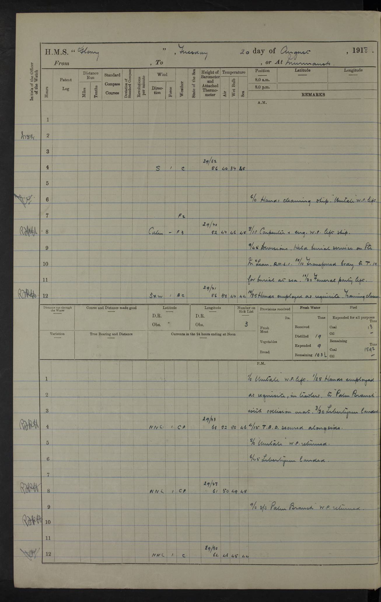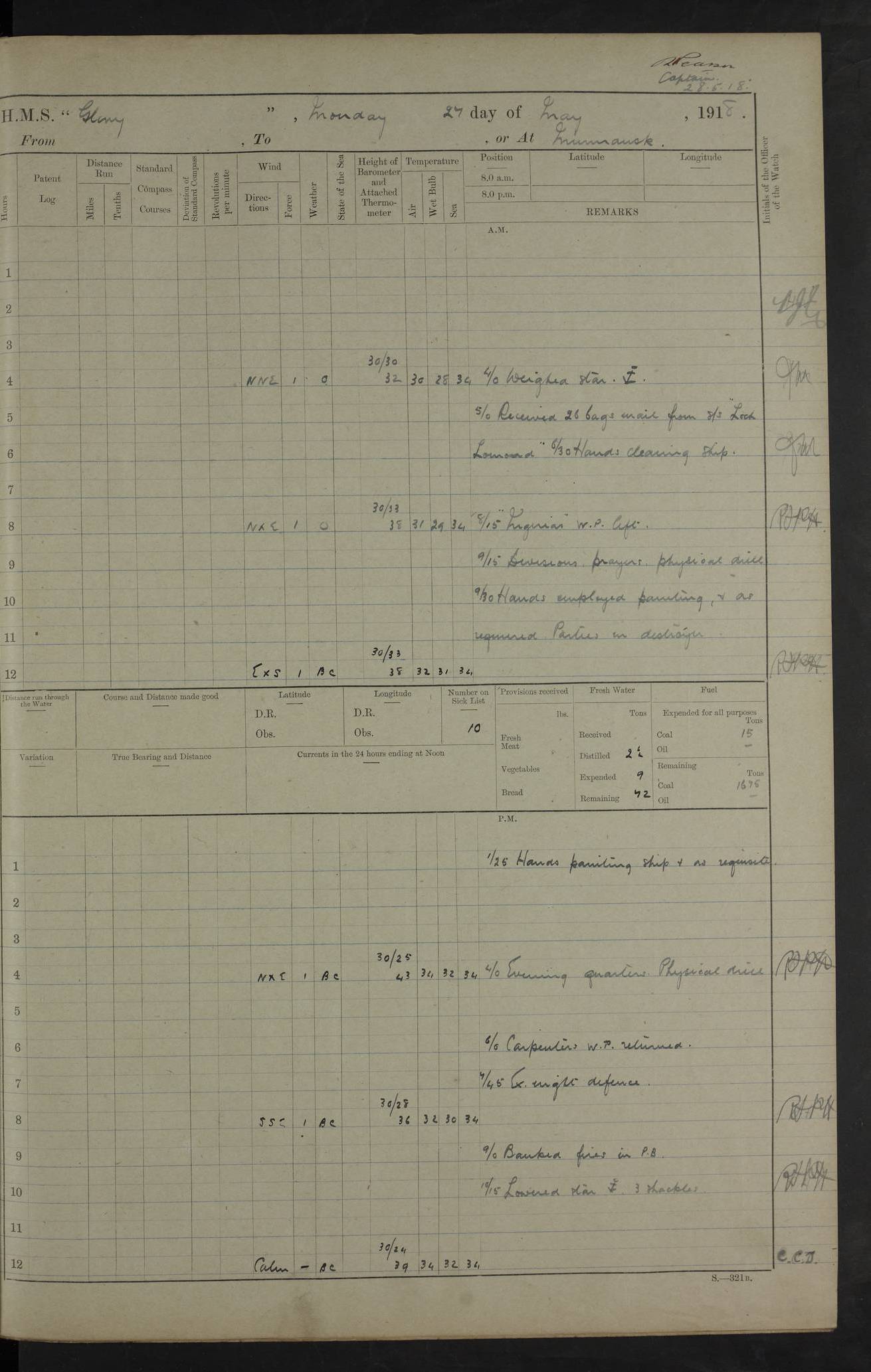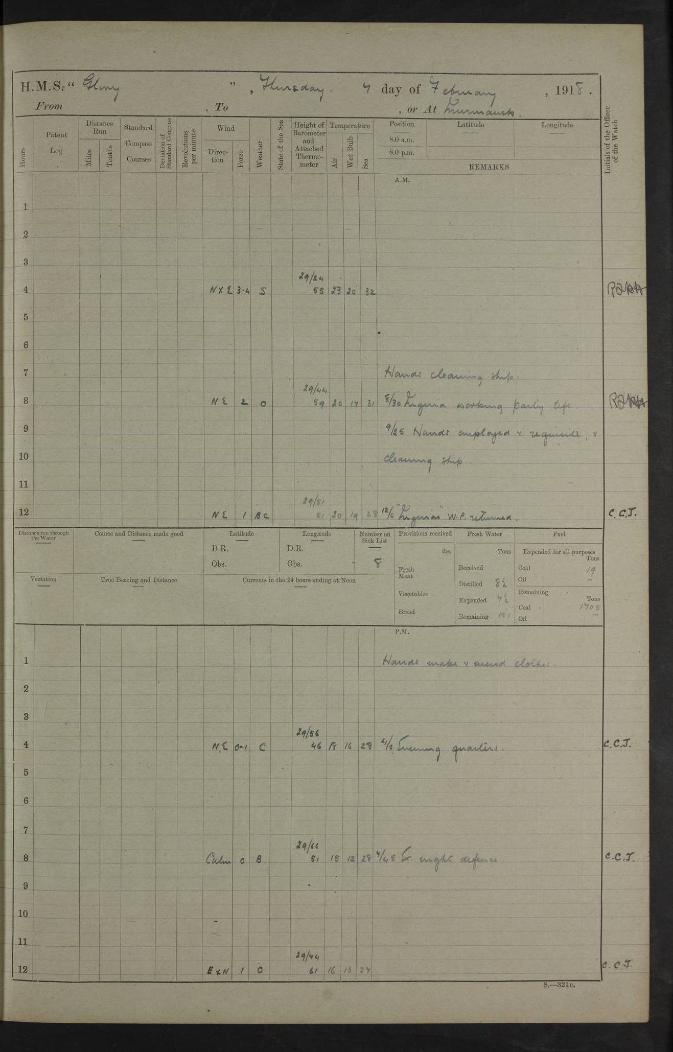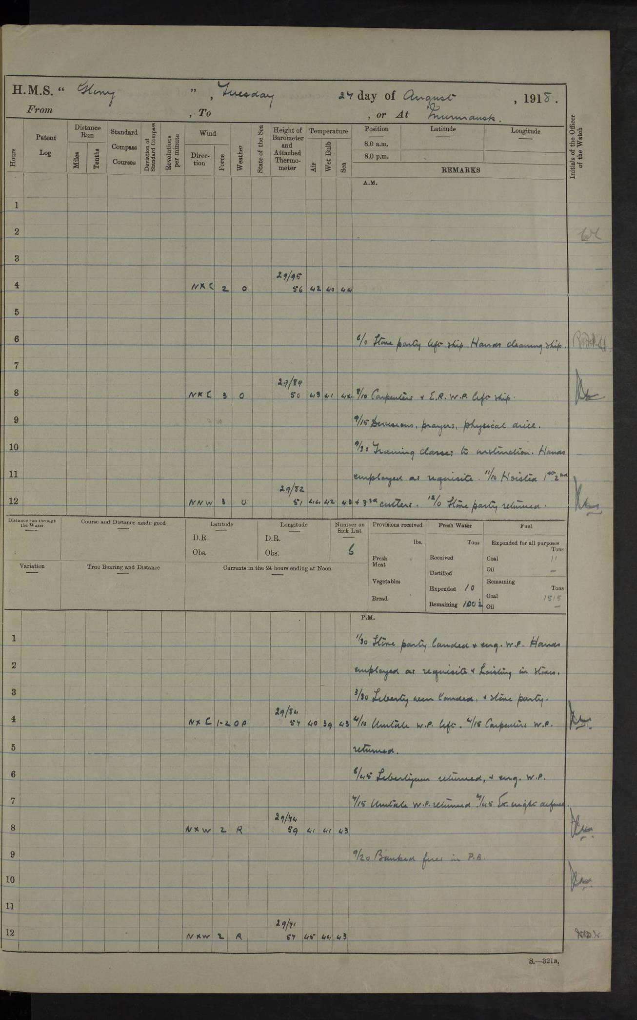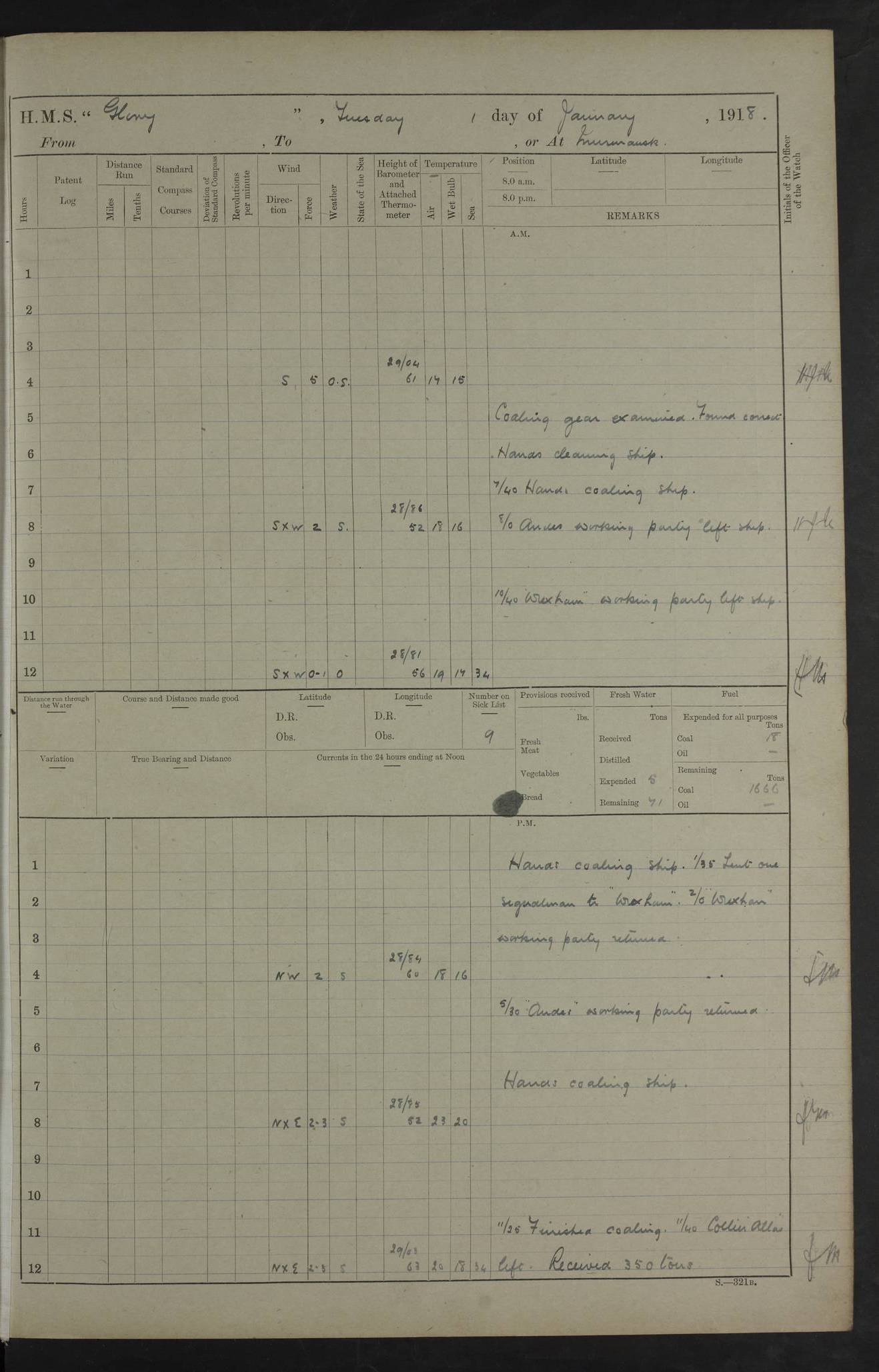 Captain’s inspection. 11.00pm: PO telegraphist joined ship from Goroslava. 4ef4f793e53e0a0c91002ca4: (https://s3.amazonaws.com:443/oldweather/ADM53-43039/ADM 53-43039-175_0.jpg) 26 August 1918 Murmansk Lat 69.03, Long 33.05 6.00am: Hands working main derrick. Out picket boat. In steam pinnace. 6.30am: Sub. Lieutenant Thompson joined T.17. 8.20am: Store and engineers working parties left. 10.15am: Gunner (T) and AB joined from T.17. 11.00am: 1 marine to Goroslava. 1.30pm: Engineers and store working parties left. 2.00pm: Discharged 2 warrant officers to Alexander. 5.00pm: Discharged Commander Monro to Alexander. Store party returned. 4ef4f794e53e0a0c91002ca5: (https://s3.amazonaws.com:443/oldweather/ADM53-43039/ADM 53-43039-175_1.jpg) 27 August 1918 Murmansk Lat 69.03, Long 33.05 Number on sick list: 6 6.00am: Store party left ship. 8.10am: Carpenters and ER (engine room?) working parties left ship. 11.00am: Hoisted 1st, 2nd, and 3rd cutters. 12 noon: Store party returned. 1.30pm: Store party landed and engineers working party. Hands employed as requisite and hoisting in stores. 3.30pm: Libertymen landed and store party. 4.10pm: Umtali working party left. 4.15pm: Carpenters working party returned. 7.15pm: Umtali working party returned. 4ef4f794e53e0a0c91002ca6: (https://s3.amazonaws.com:443/oldweather/ADM53-43039/ADM 53-43039-176_0.jpg) 28 August 1918 Murmansk Lat 69.03, Long 33.05 Number on sick list: 4 8.15am: Beef party to Nigeria, carpenters and engineers working parties. 11.45am: Beef party returned. 1.45pm: Working party to western shore with Commander Campbell. 6.20pm: Western shore working party returned. 6.45pm: Engineers and carpenters working parties returned, and libertymen. 4ef4f794e53e0a0c91002ca7: (https://s3.amazonaws.com:443/oldweather/ADM53-43039/ADM 53-43039-176_1.jpg) 29 August 1918 Murmansk Lat 69.03, Long 33.05 Number on sick list: 4 8.15am: Carpenters and engineers working parties left. 8.30am: Western shore working party left. 1.20pm: Western shore working party left. 4.00pm: Western shore working party returned. pm: Port watch clearing Anchor Star. 4ef4f794e53e0a0c91002ca8: (https://s3.amazonaws.com:443/oldweather/ADM53-43039/ADM 53-43039-177_0.jpg) 30 August 1918 Murmansk Lat 69.03, Long 33.05 Number on sick list: 4 8.30am: Western shore working party left and beef party. 11.00am: Beef party returned. 12 noon: Western shore working party returned. 1.30pm: Western shore working party left, and store party for Heathside. 6.40pm: Libertymen, engineers and carpenters working parties returned. 4ef4f794e53e0a0c91002ca9: (https://s3.amazonaws.com:443/oldweather/ADM53-43039/ADM 53-43039-177_1.jpg) 31 August 1918 Murmansk Lat 69.03, Long 33.05 Number on sick list: 3 8.30am: Landed engineers, carpenters and western shore working parties. 9.15am: Landed carpenters working party. 12 noon: Western shore working party returned. 3.40pm: Carpenters working party returned. 4.45pm: Western shore working party returned. 6.45pm: Engineers working party and libertymen returned. LOGS FOR SEPTEMBER 1918 4ef4f794e53e0a0c91002caa: (https://s3.amazonaws.com:443/oldweather/ADM53-43039/ADM 53-43039-178_0.jpg) 4ef4f794e53e0a0c91002cab: (https://s3.amazonaws.com:443/oldweather/ADM53-43039/ADM 53-43039-178_1.jpg) 4ef4f794e53e0a0c91002cac: (https://s3.amazonaws.com:443/oldweather/ADM53-43039/ADM 53-43039-179_0.jpg) 4ef4f794e53e0a0c91002cad: (https://s3.amazonaws.com:443/oldweather/ADM53-43039/ADM 53-43039-179_1.jpg) No log available for 1 September 1918. 4ef4f794e53e0a0c91002cae: (https://s3.amazonaws.com:443/oldweather/ADM53-43039/ADM 53-43039-180_0.jpg) 2 September 1918 Murmansk Lat 69.03, Long 33.05 Number on sick list: 5 8.00am: Alexandrovsk, western shore and beef working parties left. 10.45am: Beef party returned. 11.10am: Water boat alongside. 12.45pm: Paid monthly money. Survivors of Ariadne Christine left ship. ‘Ariadne Christine’, of 3550 tons gross, was built in 1910 at Thompson & Sons, Sunderland, and was mined off the Ribachi Peninsula at the entrance to the White Sea on 2 September, 1918. Details at http://www.uboat.net/wwi/ships_hit/7678.html . 4.30pm: Western shore working party returned. 6.20pm: Alexandrovsk working party returned. 7.00pm: Libertymen and engineers working party returned. 8.00pm: Received from Junco 231 bags mail. Junco was a hired trawler of 191 tons gross, built in 1917 (Admiralty No. 1657; Port No. H.587). 4ef4f794e53e0a0c91002caf: (https://s3.amazonaws.com:443/oldweather/ADM53-43039/ADM 53-43039-180_1.jpg) 3 September 1918 Murmansk Lat 69.03, Long 33.05 Number on sick list: 4 8.15am: Pier working party, engineers and carpenters working parties left. 10.50am: Admiral and staff transferred to Salvator. 11.50am: Working parties returned. 1.30pm: Nigeria and pier working parties left. 3.15pm: Tay & Tyne secured alongside. 4.20pm: Western shore working party returned. 7.45pm: Received 19 bags mail, ex T.13. 4ef4f794e53e0a0c91002cb0: (https://s3.amazonaws.com:443/oldweather/ADM53-43039/ADM 53-43039-181_0.jpg) 4 September 1918 Murmansk Lat 69.03, Long 33.05 Number on sick list: 3 8.20am: Engineers working party and western shore working party left. 12 noon: Western shore working party returned. 1.30pm: Working part left for stores. 4.00pm: Working parties returned. 5.50pm: Working party left ship for wharf. 6.00pm: Leave to 12.00 for dance club. 8.25pm: Working parties returned. 4ef4f794e53e0a0c91002cb1: (https://s3.amazonaws.com:443/oldweather/ADM53-43039/ADM 53-43039-181_1.jpg) 5 September 1918 Murmansk Lat 69.03, Long 33.05 Number on sick list: 3 0.45am: Dance club returned. 6.00am: Ben Nevis working party left. ‘Ben Nevis’ was a store carrier of 3895 grt, built in 1905. Sourced from F.J. Dittmar & J.J. Colledge (1972) – British warships 1914–1919, Ian Allan. 8.20am: Nigeria beef party and western shore working party left. 11.45am: Working parties returned. 1.30pm: Ben Nevis and Palm Branch working parties left. 6.05pm: Ben Nevis and Palm Branch wo