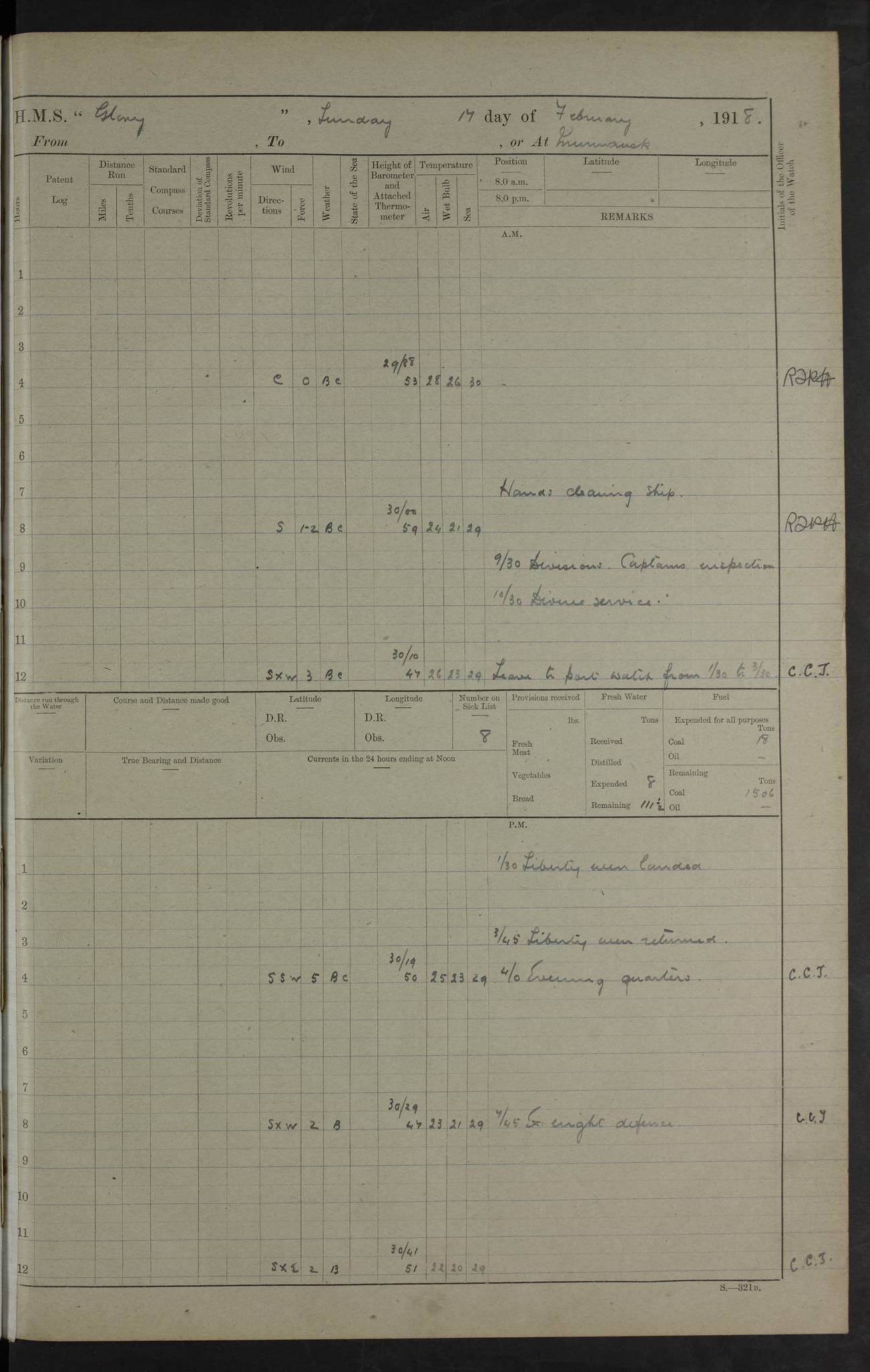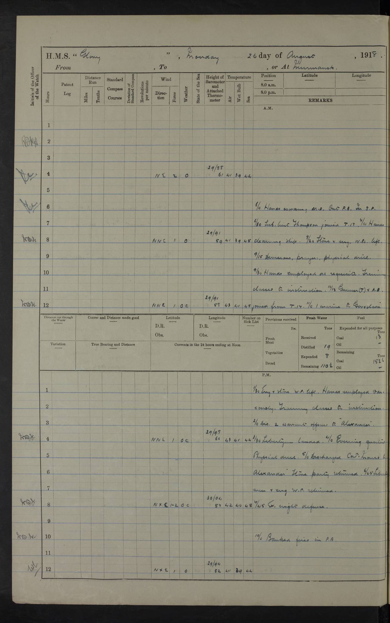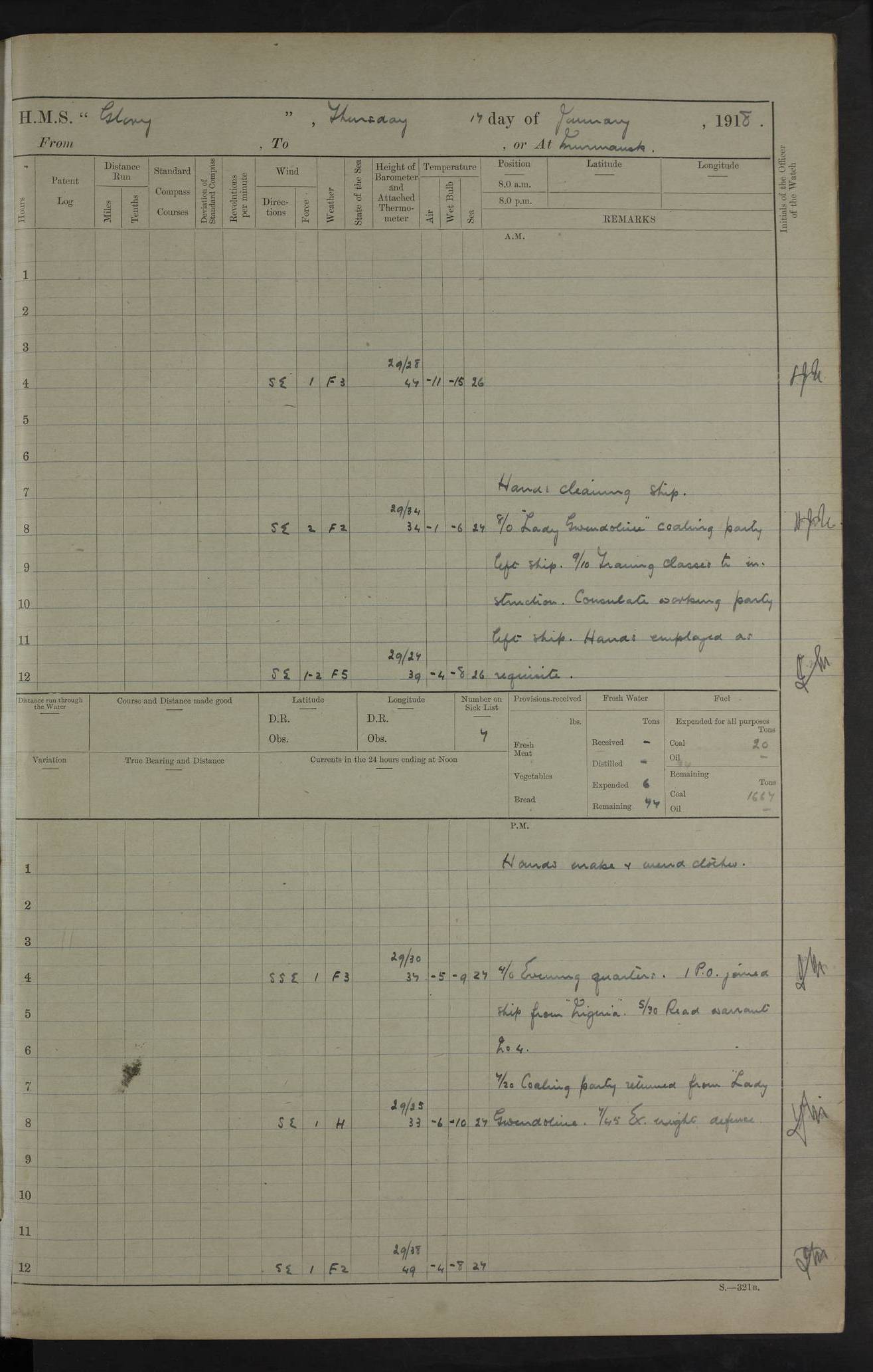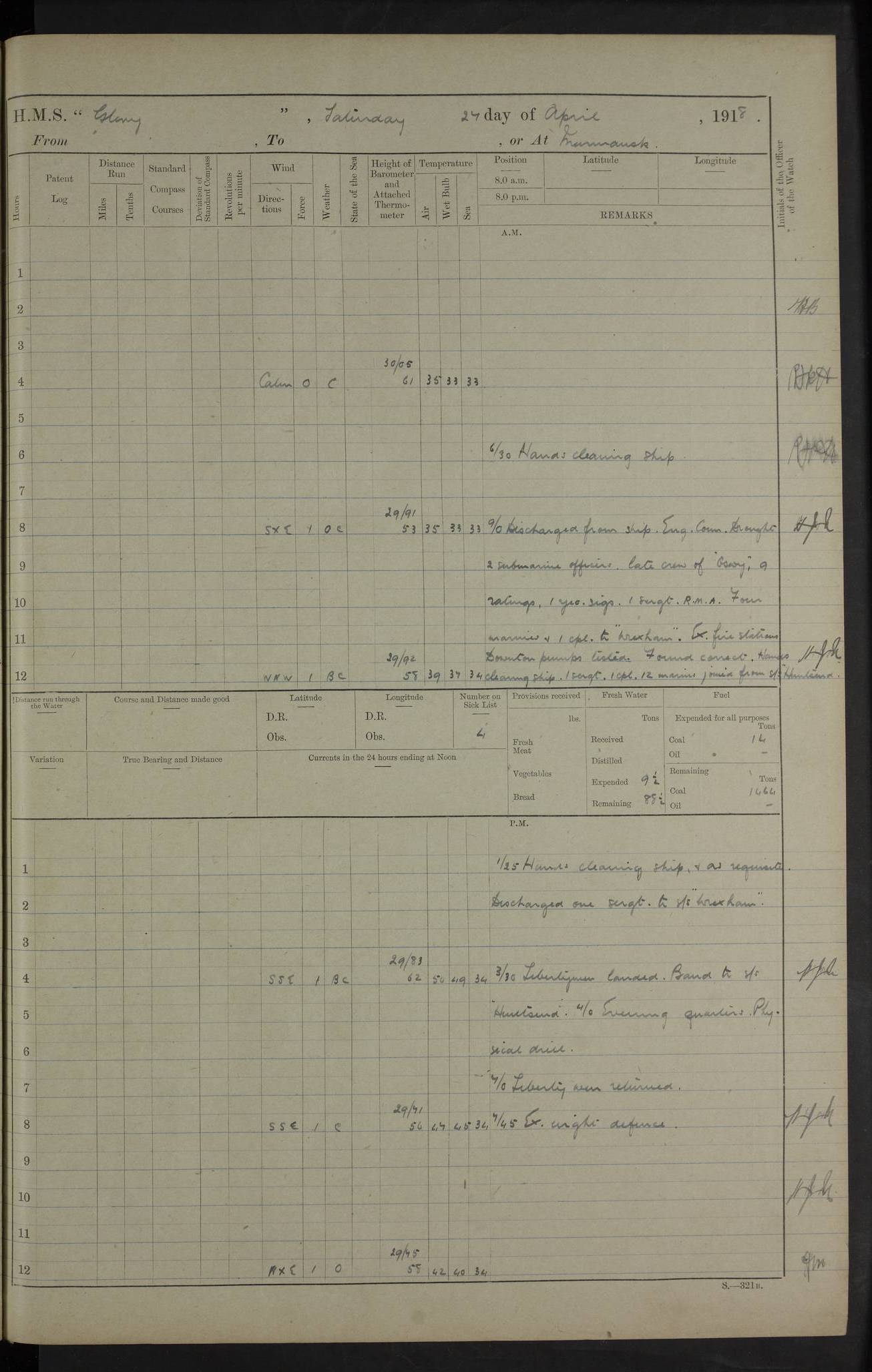 Captain’s inspection. 11.00pm: PO telegraphist joined ship from Goroslava. 4ef4f793e53e0a0c91002ca4: (https://s3.amazonaws.com:443/oldweather/ADM53-43039/ADM 53-43039-175_0.jpg) 26 August 1918 Murmansk Lat 69.03, Long 33.05 6.00am: Hands working main derrick. Out picket boat. In steam pinnace. 6.30am: Sub. Lieutenant Thompson joined T.17. 8.20am: Store and engineers working parties left. 10.15am: Gunner (T) and AB joined from T.17. 11.00am: 1 marine to Goroslava. 1.30pm: Engineers and store working parties left. 2.00pm: Discharged 2 warrant officers to Alexander. 5.00pm: Discharged Commander Monro to Alexander. Store party returned. 4ef4f794e53e0a0c91002ca5: (https://s3.amazonaws.com:443/oldweather/ADM53-43039/ADM 53-43039-175_1.jpg) 27 August 1918 Murmansk Lat 69.03, Long 33.05 Number on sick list: 6 6.00am: Store party left ship. 8.10am: Carpenters and ER (engine room?) working parties left ship. 11.00am: Hoisted 1st, 2nd, and 3rd cutters. 12 noon: Store party returned. 1.30pm: Store party landed and engineers working party. Hands employed as requisite and hoisting in stores. 3.30pm: Libertymen landed and store party. 4.10pm: Umtali working party left. 4.15pm: Carpenters working party returned. 7.15pm: Umtali working party returned. 4ef4f794e53e0a0c91002ca6: (https://s3.amazonaws.com:443/oldweather/ADM53-43039/ADM 53-43039-176_0.jpg) 28 August 1918 Murmansk Lat 69.03, Long 33.05 Number on sick list: 4 8.15am: Beef party to Nigeria, carpenters and engineers working parties. 11.45am: Beef party returned. 1.45pm: Working party to western shore with Commander Campbell. 6.20pm: Western shore working party returned. 6.45pm: Engineers and carpenters working parties returned, and libertymen. 4ef4f794e53e0a0c91002ca7: (https://s3.amazonaws.com:443/oldweather/ADM53-43039/ADM 53-43039-176_1.jpg) 29 August 1918 Murmansk Lat 69.03, Long 33.05 Number on sick list: 4 8.15am: Carpenters and engineers working parties left. 8.30am: Western shore working party left. 1.20pm: Western shore working party left. 4.00pm: Western shore working party returned. pm: Port watch clearing Anchor Star. 4ef4f794e53e0a0c91002ca8: (https://s3.amazonaws.com:443/oldweather/ADM53-43039/ADM 53-43039-177_0.jpg) 30 August 1918 Murmansk Lat 69.03, Long 33.05 Number on sick list: 4 8.30am: Western shore working party left and beef party. 11.00am: Beef party returned. 12 noon: Western shore working party returned. 1.30pm: Western shore working party left, and store party for Heathside. 6.40pm: Libertymen, engineers and carpenters working parties returned. 4ef4f794e53e0a0c91002ca9: (https://s3.amazonaws.com:443/oldweather/ADM53-43039/ADM 53-43039-177_1.jpg) 31 August 1918 Murmansk Lat 69.03, Long 33.05 Number on sick list: 3 8.30am: Landed engineers, carpenters and western shore working parties. 9.15am: Landed carpenters working party. 12 noon: Western shore working party returned. 3.40pm: Carpenters working party returned. 4.45pm: Western shore working party returned. 6.45pm: Engineers working party and libertymen returned. LOGS FOR SEPTEMBER 1918 4ef4f794e53e0a0c91002caa: (https://s3.amazonaws.com:443/oldweather/ADM53-43039/ADM 53-43039-178_0.jpg) 4ef4f794e53e0a0c91002cab: (https://s3.amazonaws.com:443/oldweather/ADM53-43039/ADM 53-43039-178_1.jpg) 4ef4f794e53e0a0c91002cac: (https://s3.amazonaws.com:443/oldweather/ADM53-43039/ADM 53-43039-179_0.jpg) 4ef4f794e53e0a0c91002cad: (https://s3.amazonaws.com:443/oldweather/ADM53-43039/ADM 53-43039-179_1.jpg) No log available for 1 September 1918. 4ef4f794e53e0a0c91002cae: (https://s3.amazonaws.com:443/oldweather/ADM53-43039/ADM 53-43039-180_0.jpg) 2 September 1918 Murmansk Lat 69.03, Long 33.05 Number on sick list: 5 8.00am: Alexandrovsk, western shore and beef working parties left. 10.45am: Beef party returned. 11.10am: Water boat alongside. 12.45pm: Paid monthly money. Survivors of Ariadne Christine left ship. ‘Ariadne Christine’, of 3550 tons gross, was built in 1910 at Thompson & Sons, Sunderland, and was mined off the Ribachi Peninsula at the entrance to the White Sea on 2 September, 1918. Details at http://www.uboat.net/wwi/ships_hit/7678.html . 4.30pm: Western shore working party returned. 6.20pm: Alexandrovsk working party returned. 7.00pm: Libertymen and engineers working party returned. 8.00pm: Received from Junco 231 bags mail. Junco was a hired trawler of 191 tons gross, built in 1917 (Admiralty No. 1657; Port No. H.587). 4ef4f794e53e0a0c91002caf: (https://s3.amazonaws.com:443/oldweather/ADM53-43039/ADM 53-43039-180_1.jpg) 3 September 1918 Murmansk Lat 69.03, Long 33.05 Number on sick list: 4 8.15am: Pier working party, engineers and carpenters working parties left. 10.50am: Admiral and staff transferred to Salvator. 11.50am: Working parties returned. 1.30pm: Nigeria and pier working parties left. 3.15pm: Tay & Tyne secured alongside. 4.20pm: Western shore working party returned. 7.45pm: Received 19 bags mail, ex T.13. 4ef4f794e53e0a0c91002cb0: (https://s3.amazonaws.com:443/oldweather/ADM53-43039/ADM 53-43039-181_0.jpg) 4 September 1918 Murmansk Lat 69.03, Long 33.05 Number on sick list: 3 8.20am: Engineers working party and western shore working party left. 12 noon: Western shore working party returned. 1.30pm: Working part left for stores. 4.00pm: Working parties returned. 5.50pm: Working party left ship for wharf. 6.00pm: Leave to 12.00 for dance club. 8.25pm: Working parties returned. 4ef4f794e53e0a0c91002cb1: (https://s3.amazonaws.com:443/oldweather/ADM53-43039/ADM 53-43039-181_1.jpg) 5 September 1918 Murmansk Lat 69.03, Long 33.05 Number on sick list: 3 0.45am: Dance club returned. 6.00am: Ben Nevis working party left. ‘Ben Nevis’ was a store carrier of 3895 grt, built in 1905. Sourced from F.J. Dittmar & J.J. Colledge (1972) – British warships 1914–1919, Ian Allan. 8.20am: Nigeria beef party and western shore working party left. 11.45am: Working parties returned. 1.30pm: Ben Nevis and Palm Branch working parties left. 6.05pm: Ben Nevis and Palm Branch wo