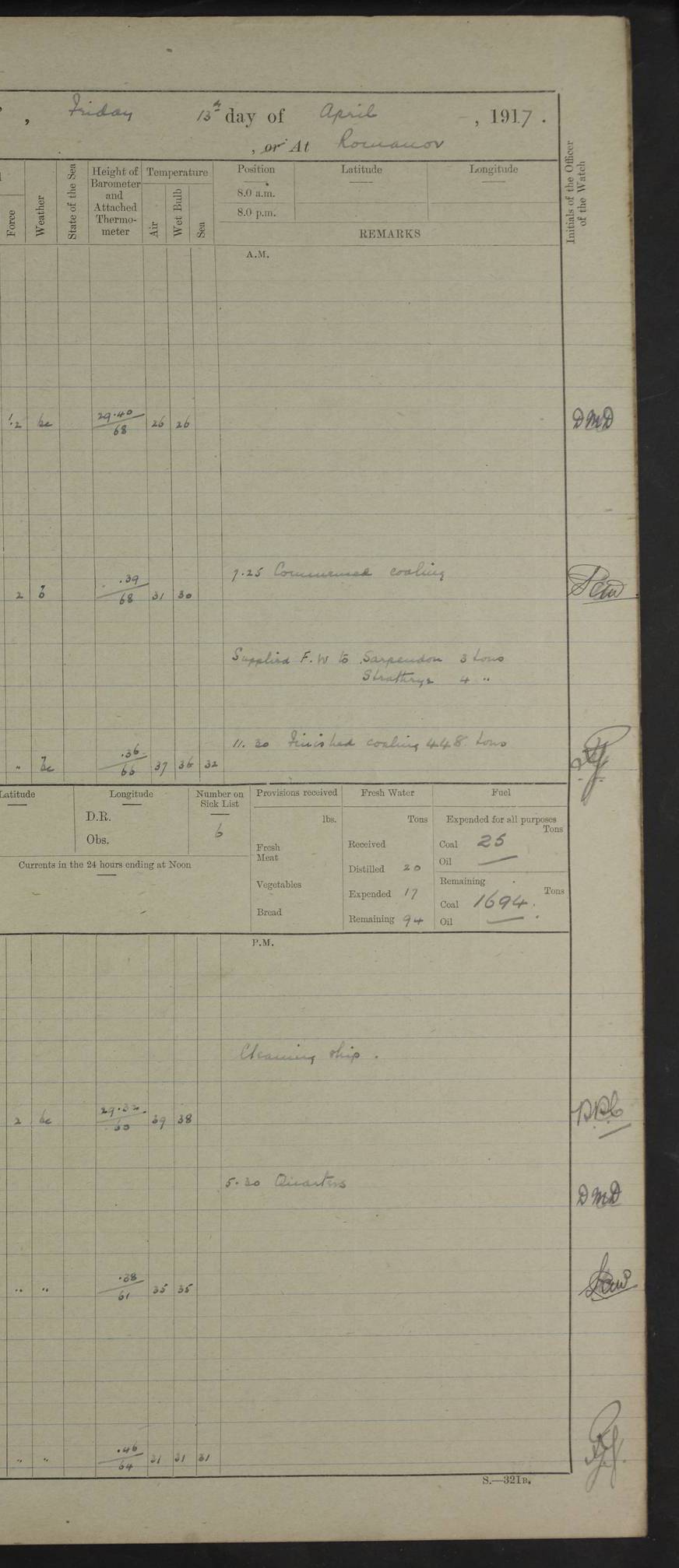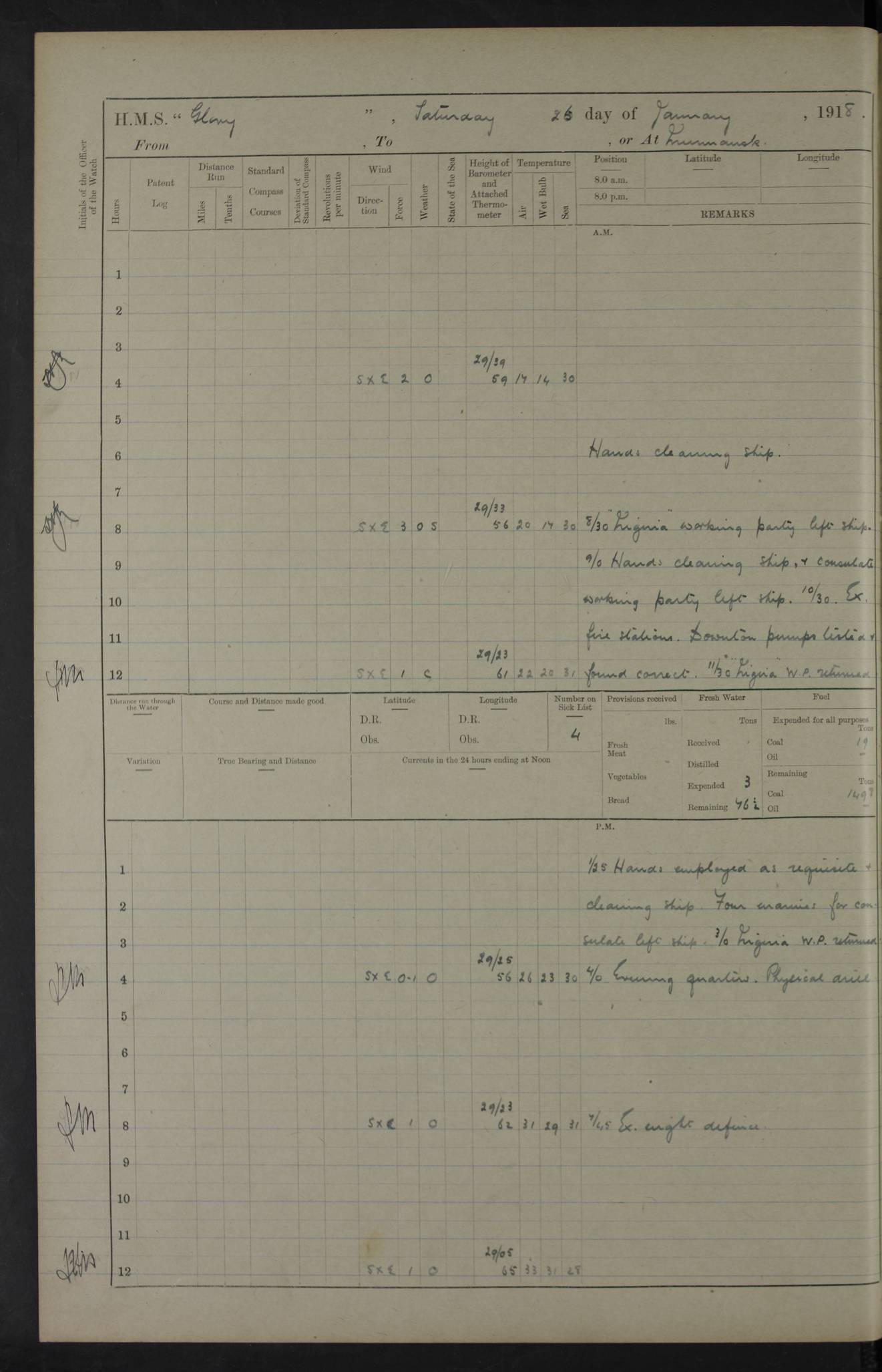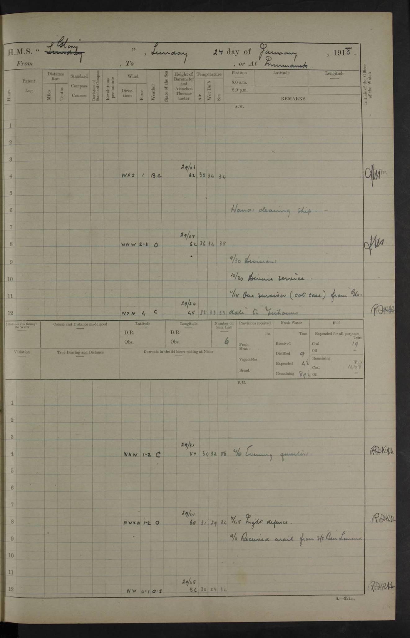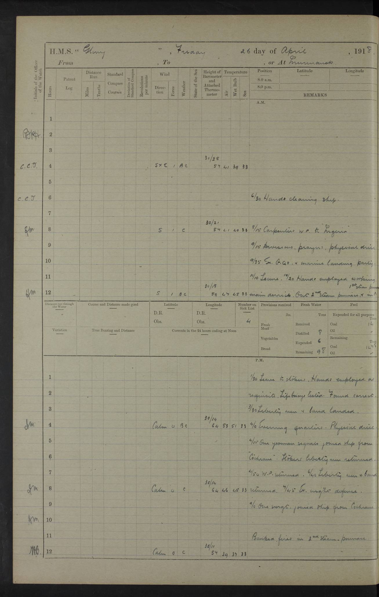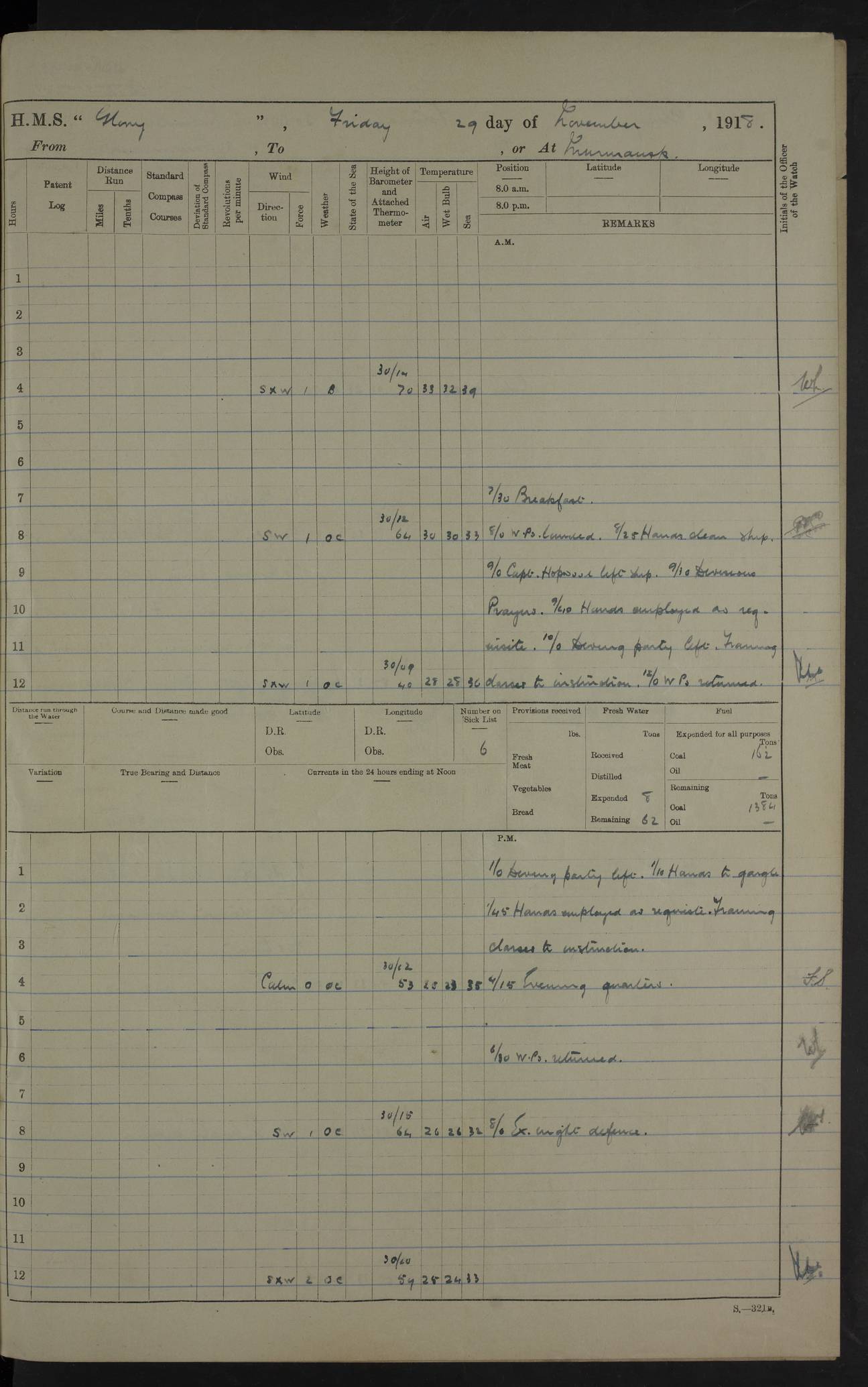 Captain’s inspection. 11.00pm: PO telegraphist joined ship from Goroslava. 4ef4f793e53e0a0c91002ca4: (https://s3.amazonaws.com:443/oldweather/ADM53-43039/ADM 53-43039-175_0.jpg) 26 August 1918 Murmansk Lat 69.03, Long 33.05 6.00am: Hands working main derrick. Out picket boat. In steam pinnace. 6.30am: Sub. Lieutenant Thompson joined T.17. 8.20am: Store and engineers working parties left. 10.15am: Gunner (T) and AB joined from T.17. 11.00am: 1 marine to Goroslava. 1.30pm: Engineers and store working parties left. 2.00pm: Discharged 2 warrant officers to Alexander. 5.00pm: Discharged Commander Monro to Alexander. Store party returned. 4ef4f794e53e0a0c91002ca5: (https://s3.amazonaws.com:443/oldweather/ADM53-43039/ADM 53-43039-175_1.jpg) 27 August 1918 Murmansk Lat 69.03, Long 33.05 Number on sick list: 6 6.00am: Store party left ship. 8.10am: Carpenters and ER (engine room?) working parties left ship. 11.00am: Hoisted 1st, 2nd, and 3rd cutters. 12 noon: Store party returned. 1.30pm: Store party landed and engineers working party. Hands employed as requisite and hoisting in stores. 3.30pm: Libertymen landed and store party. 4.10pm: Umtali working party left. 4.15pm: Carpenters working party returned. 7.15pm: Umtali working party returned. 4ef4f794e53e0a0c91002ca6: (https://s3.amazonaws.com:443/oldweather/ADM53-43039/ADM 53-43039-176_0.jpg) 28 August 1918 Murmansk Lat 69.03, Long 33.05 Number on sick list: 4 8.15am: Beef party to Nigeria, carpenters and engineers working parties. 11.45am: Beef party returned. 1.45pm: Working party to western shore with Commander Campbell. 6.20pm: Western shore working party returned. 6.45pm: Engineers and carpenters working parties returned, and libertymen. 4ef4f794e53e0a0c91002ca7: (https://s3.amazonaws.com:443/oldweather/ADM53-43039/ADM 53-43039-176_1.jpg) 29 August 1918 Murmansk Lat 69.03, Long 33.05 Number on sick list: 4 8.15am: Carpenters and engineers working parties left. 8.30am: Western shore working party left. 1.20pm: Western shore working party left. 4.00pm: Western shore working party returned. pm: Port watch clearing Anchor Star. 4ef4f794e53e0a0c91002ca8: (https://s3.amazonaws.com:443/oldweather/ADM53-43039/ADM 53-43039-177_0.jpg) 30 August 1918 Murmansk Lat 69.03, Long 33.05 Number on sick list: 4 8.30am: Western shore working party left and beef party. 11.00am: Beef party returned. 12 noon: Western shore working party returned. 1.30pm: Western shore working party left, and store party for Heathside. 6.40pm: Libertymen, engineers and carpenters working parties returned. 4ef4f794e53e0a0c91002ca9: (https://s3.amazonaws.com:443/oldweather/ADM53-43039/ADM 53-43039-177_1.jpg) 31 August 1918 Murmansk Lat 69.03, Long 33.05 Number on sick list: 3 8.30am: Landed engineers, carpenters and western shore working parties. 9.15am: Landed carpenters working party. 12 noon: Western shore working party returned. 3.40pm: Carpenters working party returned. 4.45pm: Western shore working party returned. 6.45pm: Engineers working party and libertymen returned. LOGS FOR SEPTEMBER 1918 4ef4f794e53e0a0c91002caa: (https://s3.amazonaws.com:443/oldweather/ADM53-43039/ADM 53-43039-178_0.jpg) 4ef4f794e53e0a0c91002cab: (https://s3.amazonaws.com:443/oldweather/ADM53-43039/ADM 53-43039-178_1.jpg) 4ef4f794e53e0a0c91002cac: (https://s3.amazonaws.com:443/oldweather/ADM53-43039/ADM 53-43039-179_0.jpg) 4ef4f794e53e0a0c91002cad: (https://s3.amazonaws.com:443/oldweather/ADM53-43039/ADM 53-43039-179_1.jpg) No log available for 1 September 1918. 4ef4f794e53e0a0c91002cae: (https://s3.amazonaws.com:443/oldweather/ADM53-43039/ADM 53-43039-180_0.jpg) 2 September 1918 Murmansk Lat 69.03, Long 33.05 Number on sick list: 5 8.00am: Alexandrovsk, western shore and beef working parties left. 10.45am: Beef party returned. 11.10am: Water boat alongside. 12.45pm: Paid monthly money. Survivors of Ariadne Christine left ship. ‘Ariadne Christine’, of 3550 tons gross, was built in 1910 at Thompson & Sons, Sunderland, and was mined off the Ribachi Peninsula at the entrance to the White Sea on 2 September, 1918. Details at http://www.uboat.net/wwi/ships_hit/7678.html . 4.30pm: Western shore working party returned. 6.20pm: Alexandrovsk working party returned. 7.00pm: Libertymen and engineers working party returned. 8.00pm: Received from Junco 231 bags mail. Junco was a hired trawler of 191 tons gross, built in 1917 (Admiralty No. 1657; Port No. H.587). 4ef4f794e53e0a0c91002caf: (https://s3.amazonaws.com:443/oldweather/ADM53-43039/ADM 53-43039-180_1.jpg) 3 September 1918 Murmansk Lat 69.03, Long 33.05 Number on sick list: 4 8.15am: Pier working party, engineers and carpenters working parties left. 10.50am: Admiral and staff transferred to Salvator. 11.50am: Working parties returned. 1.30pm: Nigeria and pier working parties left. 3.15pm: Tay & Tyne secured alongside. 4.20pm: Western shore working party returned. 7.45pm: Received 19 bags mail, ex T.13. 4ef4f794e53e0a0c91002cb0: (https://s3.amazonaws.com:443/oldweather/ADM53-43039/ADM 53-43039-181_0.jpg) 4 September 1918 Murmansk Lat 69.03, Long 33.05 Number on sick list: 3 8.20am: Engineers working party and western shore working party left. 12 noon: Western shore working party returned. 1.30pm: Working part left for stores. 4.00pm: Working parties returned. 5.50pm: Working party left ship for wharf. 6.00pm: Leave to 12.00 for dance club. 8.25pm: Working parties returned. 4ef4f794e53e0a0c91002cb1: (https://s3.amazonaws.com:443/oldweather/ADM53-43039/ADM 53-43039-181_1.jpg) 5 September 1918 Murmansk Lat 69.03, Long 33.05 Number on sick list: 3 0.45am: Dance club returned. 6.00am: Ben Nevis working party left. ‘Ben Nevis’ was a store carrier of 3895 grt, built in 1905. Sourced from F.J. Dittmar & J.J. Colledge (1972) – British warships 1914–1919, Ian Allan. 8.20am: Nigeria beef party and western shore working party left. 11.45am: Working parties returned. 1.30pm: Ben Nevis and Palm Branch working parties left. 6.05pm: Ben Nevis and Palm Branch wo