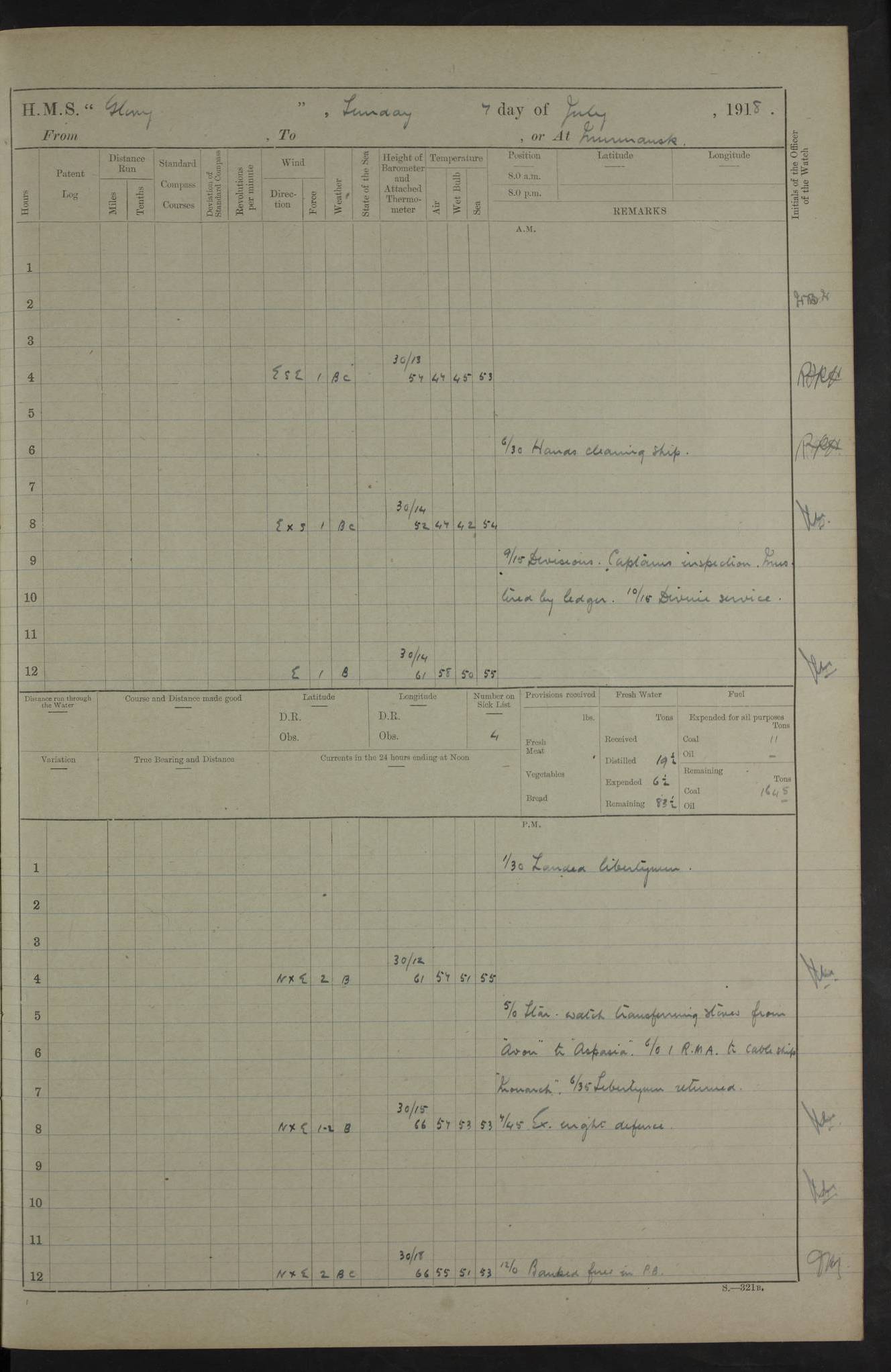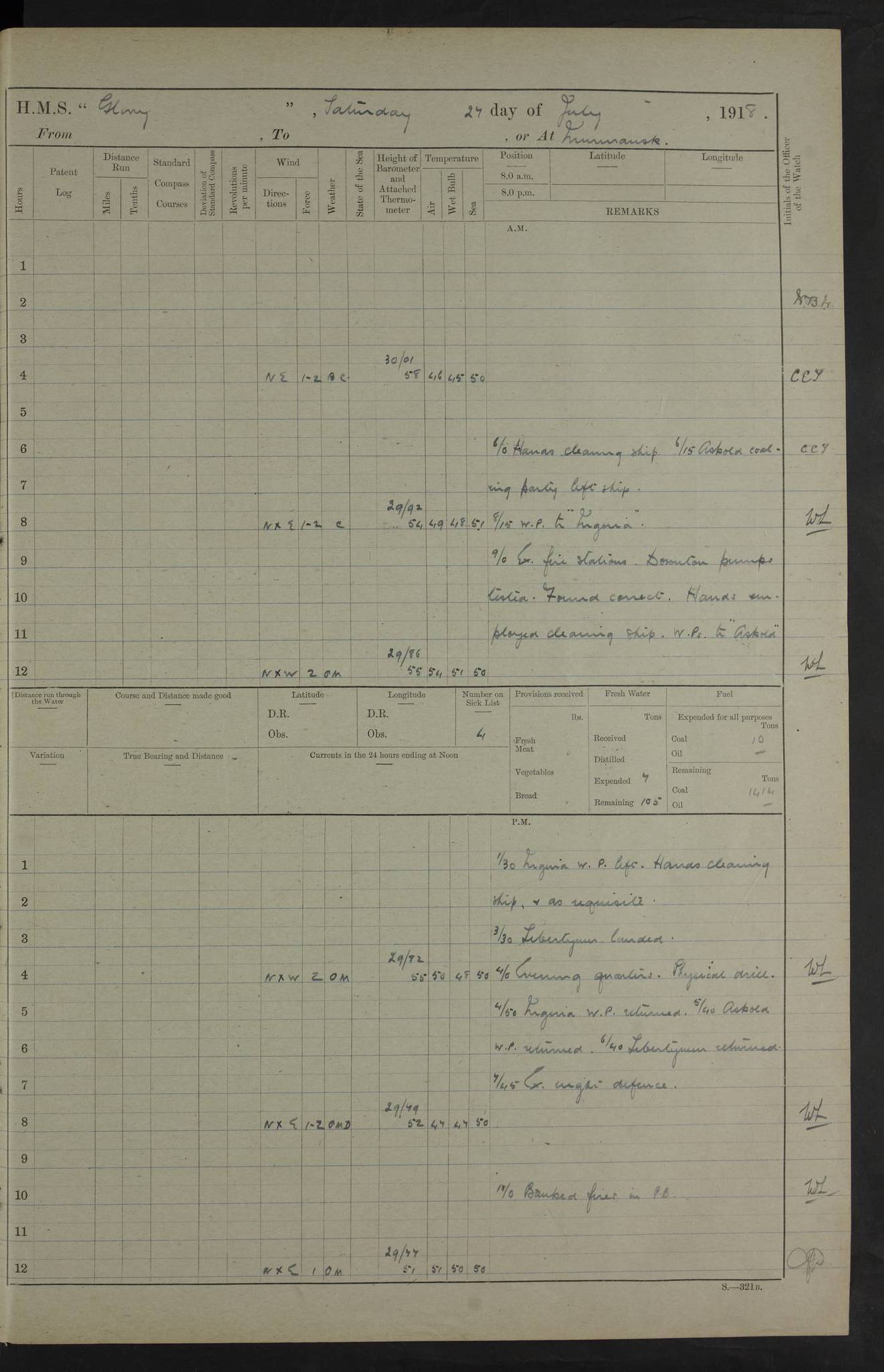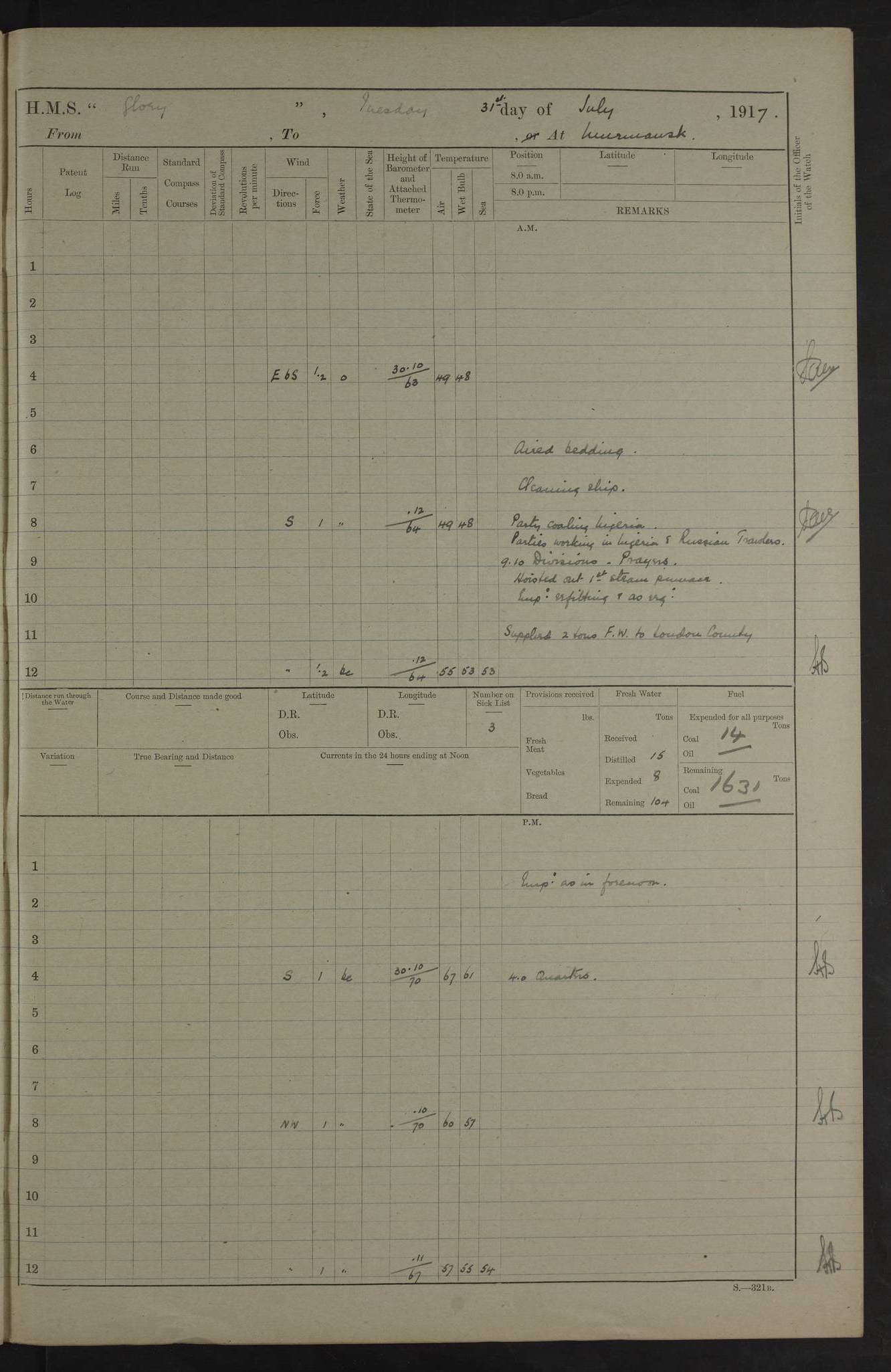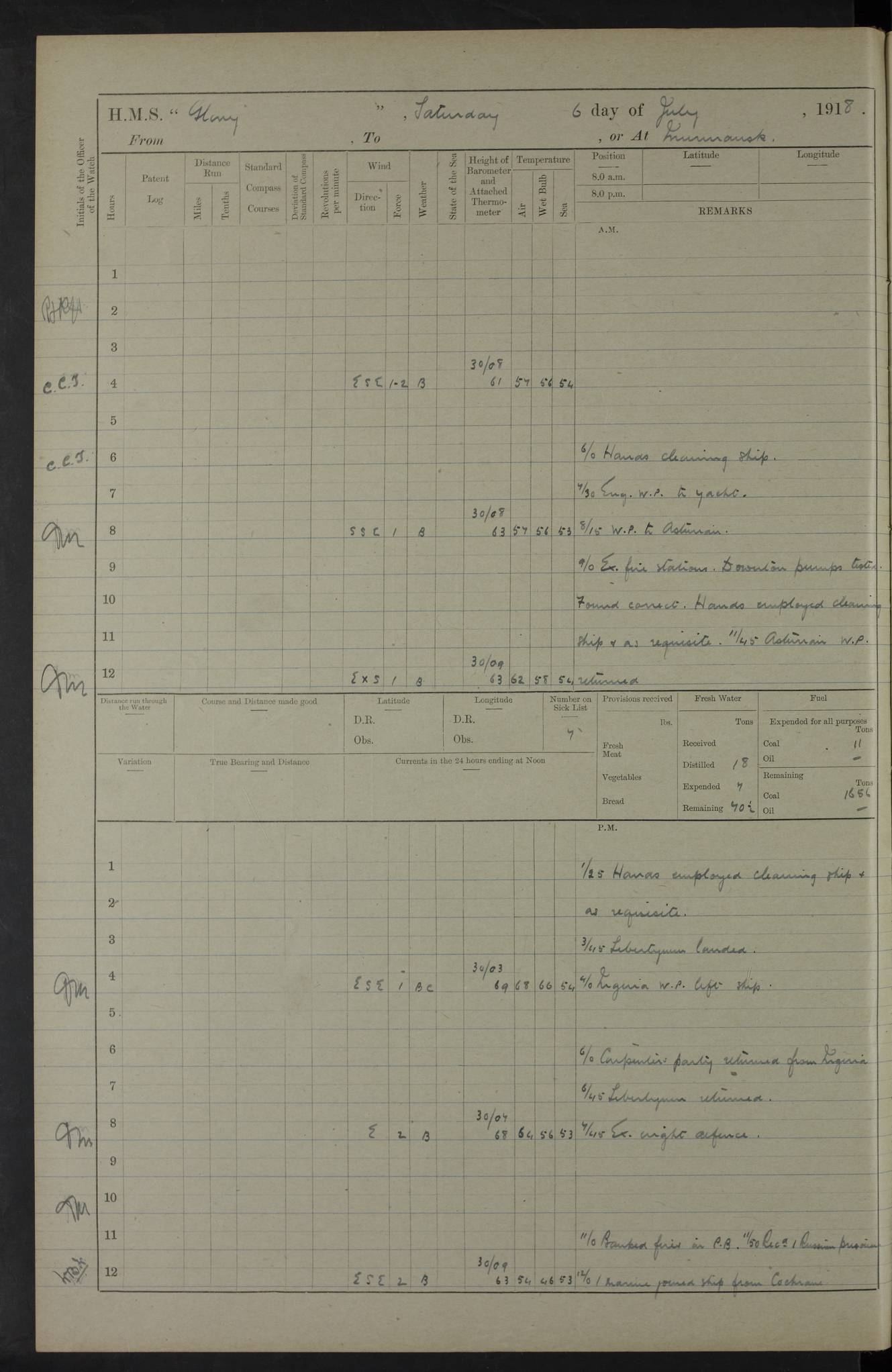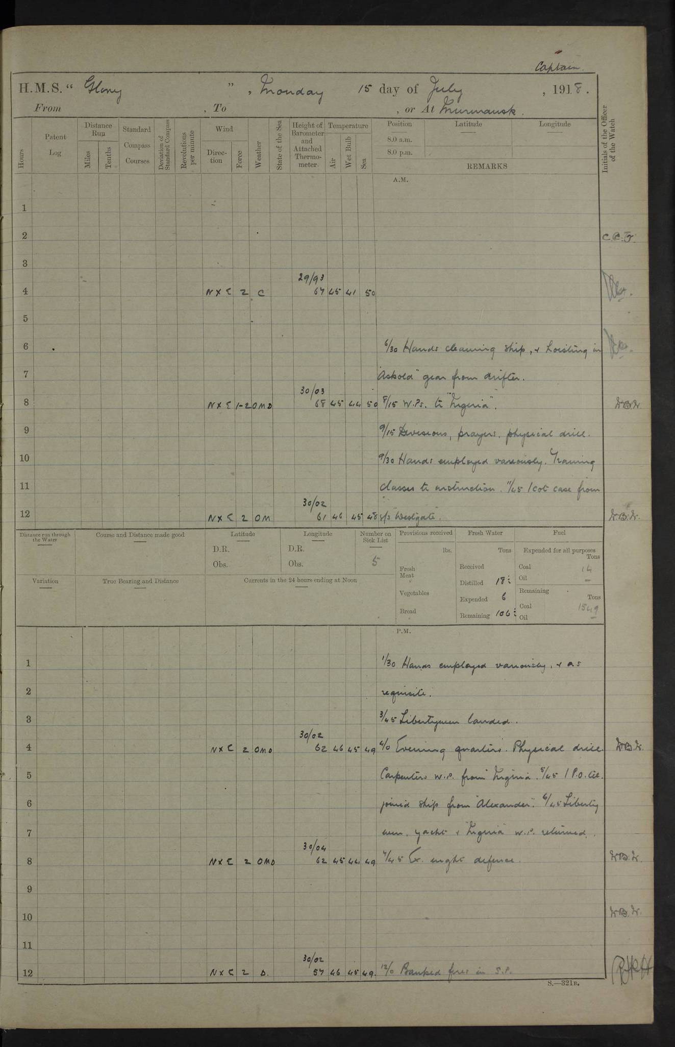 working party left. 4ef4f792e53e0a0c91002c77: (https://s3.amazonaws.com:443/oldweather/ADM53-43039/ADM 53-43039-152_1.jpg) 15 July 1918 Murmansk Lat 69.03, Long 33.05 Number on sick list: 5 6.30am: Hands cleaning ship and hoisting in Askold gear from drifter. 8.15am: Working parties to Nigeria. 11.45am: 1 cot case from SS Westgate. 4.00pm: Carpenters working party from Nigeria. 5.45pm: 1 PO telegraphist joined ship from Alexander. 6.45pm: Libertymen, yacht and Nigeria working parties returned. 4ef4f792e53e0a0c91002c78: (https://s3.amazonaws.com:443/oldweather/ADM53-43039/ADM 53-43039-153_0.jpg) 16 July 1918 Murmansk Lat 69.03, Long 33.05 Number on sick list: 5 1.00am: TBD cast off. 6.00am: Diving party rigging gear. 7.30pm: Engineers working party to yacht. 8.15am: Working parties to Nigeria and diving party. 11.30am: Engineers working party returned from yacht. 2.10pm: Diving party returned. 4.00pm: Read warrant No. 22. 4ef4f792e53e0a0c91002c79: (https://s3.amazonaws.com:443/oldweather/ADM53-43039/ADM 53-43039-153_1.jpg) 17 July 1918 Murmansk Lat 69.03, Long 33.05 Number on sick list: 6 7.30am: Engineers working party left ship. 8.15am: Working parties left ship. One chief armourer joined. 9.40am: Telamous working party left ship. 11.10am: Nigeria working party returned. 1.00pm: Diving party left ship. 1.30pm: Hands employed variously and hoisting in ammunition. 2.50pm: Received 24 bags mail from Chiswick. SS Chiswick was a cargo vessel of 3246 grt, built in 1904 at Henderson & Co., Meadowside, Glasgow. On 2 January, 1919, she ran aground and was wrecked on the northwest point of Kildin Island, a Russian island in the Barents Sea. Details at http://www.wrecksite.eu/wreck.aspx?136644 . 3.10pm: Admiral Kemp and staff rejoined ship. 6.30pm: Yacht working party and libertymen returned. 8.35pm: Diving party returned. 4ef4f792e53e0a0c91002c7a: (https://s3.amazonaws.com:443/oldweather/ADM53-43039/ADM 53-43039-154_0.jpg) 18 July 1918 Murmansk Lat 69.03, Long 33.05 Number on sick list: 7 7.30am: Engineers working party to Alvinia. SS Chiswick alongside. 9.15am: Hands employed getting in stores from Chiswick and as requisite. 10.00am: Ten marines and one yeoman signals from Salvator. 11.00am: Landed Lewis gun section. 1.30pm: hands employed variously and getting in stores and ammunition. 3.40pm: SS Chiswick left. 4.35pm: One cell offender discharged to Ralco. Ralco was a hired trawler of 228 grt, built in 1912 (Admiralty No. 672; Port No. GY.663). Sourced from F.J. Dittmar & J.J. Colledge (1972) – British warships 1914–1919, Ian Allan. 5.30pm: All working parties returned. 6.00pm: Armed guard (18 privates, 2 sergeants) and engineers working party to Askold under Lieutenant Morris RMLI and Engineer Lieutenant Johnson RN. 7.30pm: Port watch landed transporting shell. 7.45pm: 68 marines and Lieutenant Leftwich RMLI rejoined ship. 10.00pm: Port watch returned. 4ef4f792e53e0a0c91002c7b: (https://s3.amazonaws.com:443/oldweather/ADM53-43039/ADM 53-43039-154_1.jpg) 19 July 1918 Murmansk Lat 69.03, Long 33.05 Number on sick list: 8 7.30am: Engineers working party to Alvinia. 8.15am: Nigeria working party left ship. 1.30pm: Shell party left ship. 4.00pm: Read warrants 23 & 24. 5.50pm: Nigeria working party returned. 4.45pm: Staff Paymaster Jenkinson left ship. 4ef4f792e53e0a0c91002c7c: (https://s3.amazonaws.com:443/oldweather/ADM53-43039/ADM 53-43039-155_0.jpg) 20 July 1918 Murmansk Lat 69.03, Long 33.05 Number on sick list: 9 7.30am: Engineers working party to Alvinia. 8.20am: Nigeria’s working party left ship. 11.00am: Working party to Tchesma. 12.20pm: Tchesma working party returned. 1.30pm: Working party to Tchesma. 5.40pm: Tchesma working party returned. 7.00pm: Water boat alongside. 4ef4f792e53e0a0c91002c7d: (https://s3.amazonaws.com:443/oldweather/ADM53-43039/ADM 53-43039-155_1.jpg) 21 July 1918 Murmansk Lat 69.03, Long 33.05 Number on sick list: 9 7.30am: Carpenters working party to Nigeria. 9.30am: Captain’s inspection. 10.15am: Divine Service. 11.45am: Carpenters working party returned. 1.30pm: Working party to Kassala. Water boat left. Kassala was a store carrier of 3825 grt, built in 1897. Sourced from F.J. Dittmar & J.J. Colledge (1972) – British warships 1914–1919, Ian Allan. 3.00pm: Landed ship’s tug of war team. 5.20pm: Working party returned. 8.00pm: 2 marines and stokers to Askold. 9.00pm: 1 marine to Salvator. 4ef4f792e53e0a0c91002c7e: (https://s3.amazonaws.com:443/oldweather/ADM53-43039/ADM 53-43039-156_0.jpg) 22 July 1918 Murmansk Lat 69.03, Long 33.05 Number on sick list: 11 7.30am: Engineers working party to yacht. 8.15am: Nigeria’s working party left. 11.50am: Admiral and staff left for Salvator. 1.30pm: Working party to shore. 5.15pm: Store party returned. 6.30pm: Working parties returned. Landed boxing party. 4ef4f792e53e0a0c91002c7f: (https://s3.amazonaws.com:443/oldweather/ADM53-43039/ADM 53-43039-156_1.jpg) 23 July 1918 Murmansk Lat 69.03, Long 33.05 Number on sick list: 10 7.30am: Engineers working party to Alvinia. 8.15am: Working parties to Nigeria and Kassala. 11.50am: Kassala working party returned. 1.30pm: Landed store party. 5.30pm: Working parties returned. 4ef4f792e53e0a0c91002c80: (https://s3.amazonaws.com:443/oldweather/ADM53-43039/ADM 53-43039-157_0.jpg) 24 July 1918 Murmansk Lat 69.03, Long 33.05 Number on sick list: 11 7.30am: Engineers working party to yacht. 8.15am: Kassala and Nigeria working parties left. 11.55am: Working parties returned. 1.30pm: Hands work main derrick. Out picket boat. 4.00pm: Read warrants 25 and 26. Admiral and staff rejoined ship. 4ef4f792e53e0a0c91002c81: (https://s3.amazonaws.com:443/oldweather/ADM53-43039/ADM 53-43039-157_1.jpg) 25 July 1918 Murmansk Lat 69.03, Long 33.05 Number on sick list: 3 4.00am: TBD left. 6.15am: Askold coaling party left ship. 8.20am: Nigeria and Kassala working parties left. 12 noon: Nigeria and Kassala working parties returned. 1.30pm: Working parties to Askold. 5.00pm: Discharged 2 seamen, 1