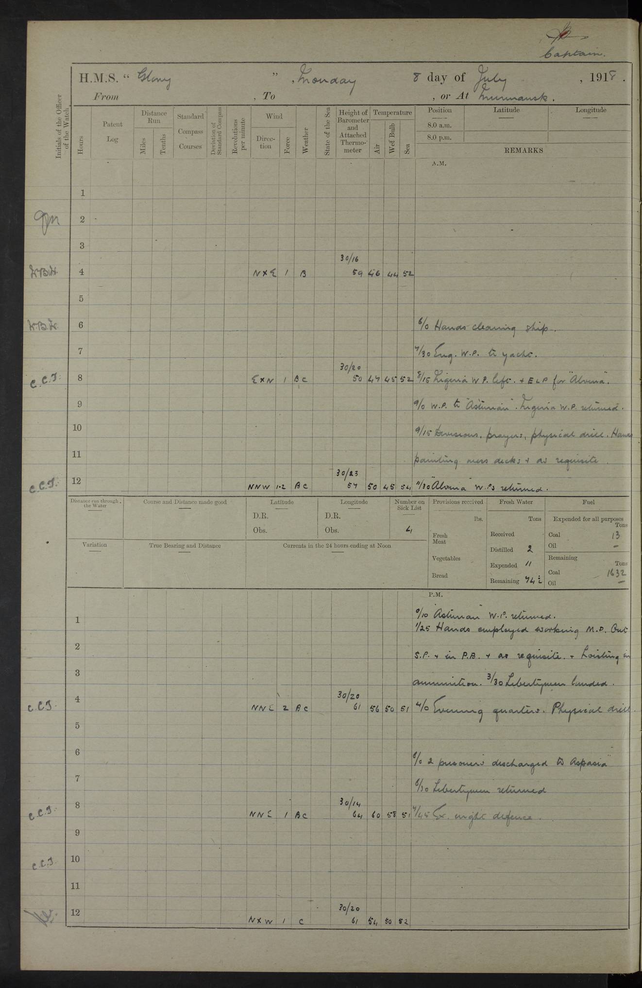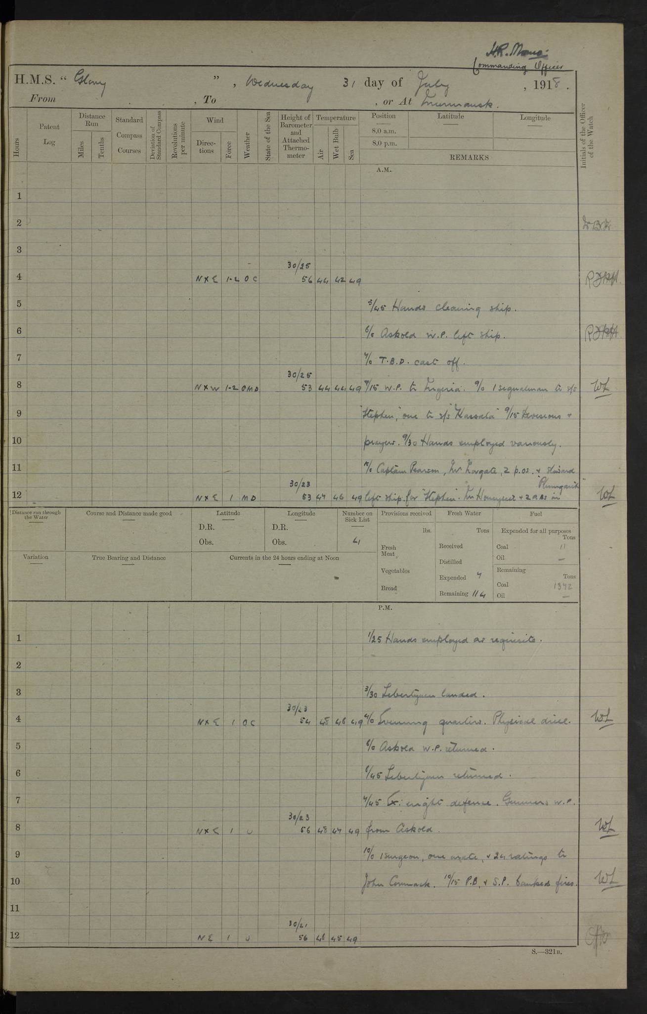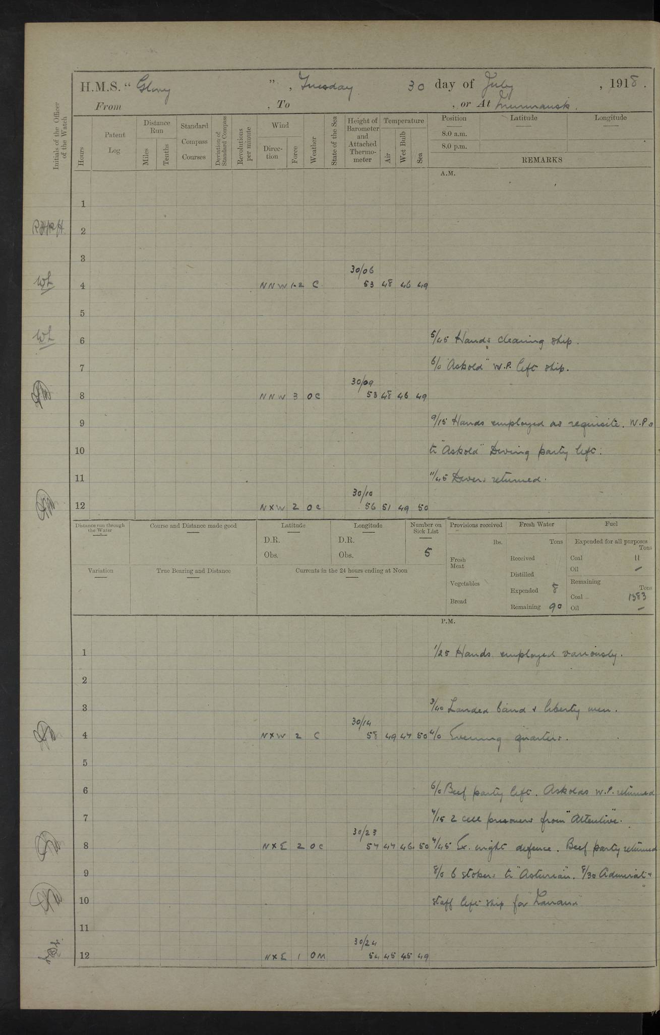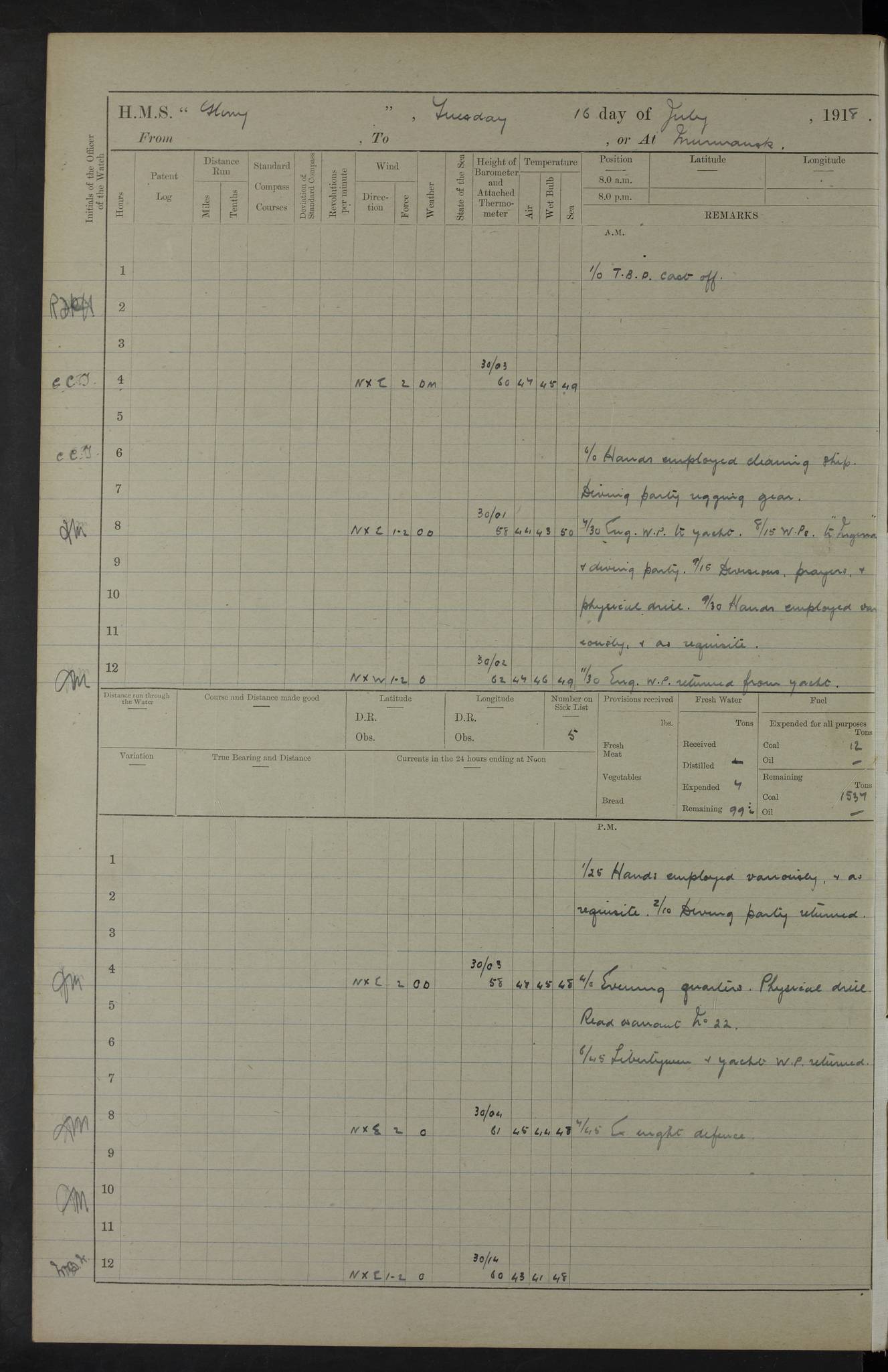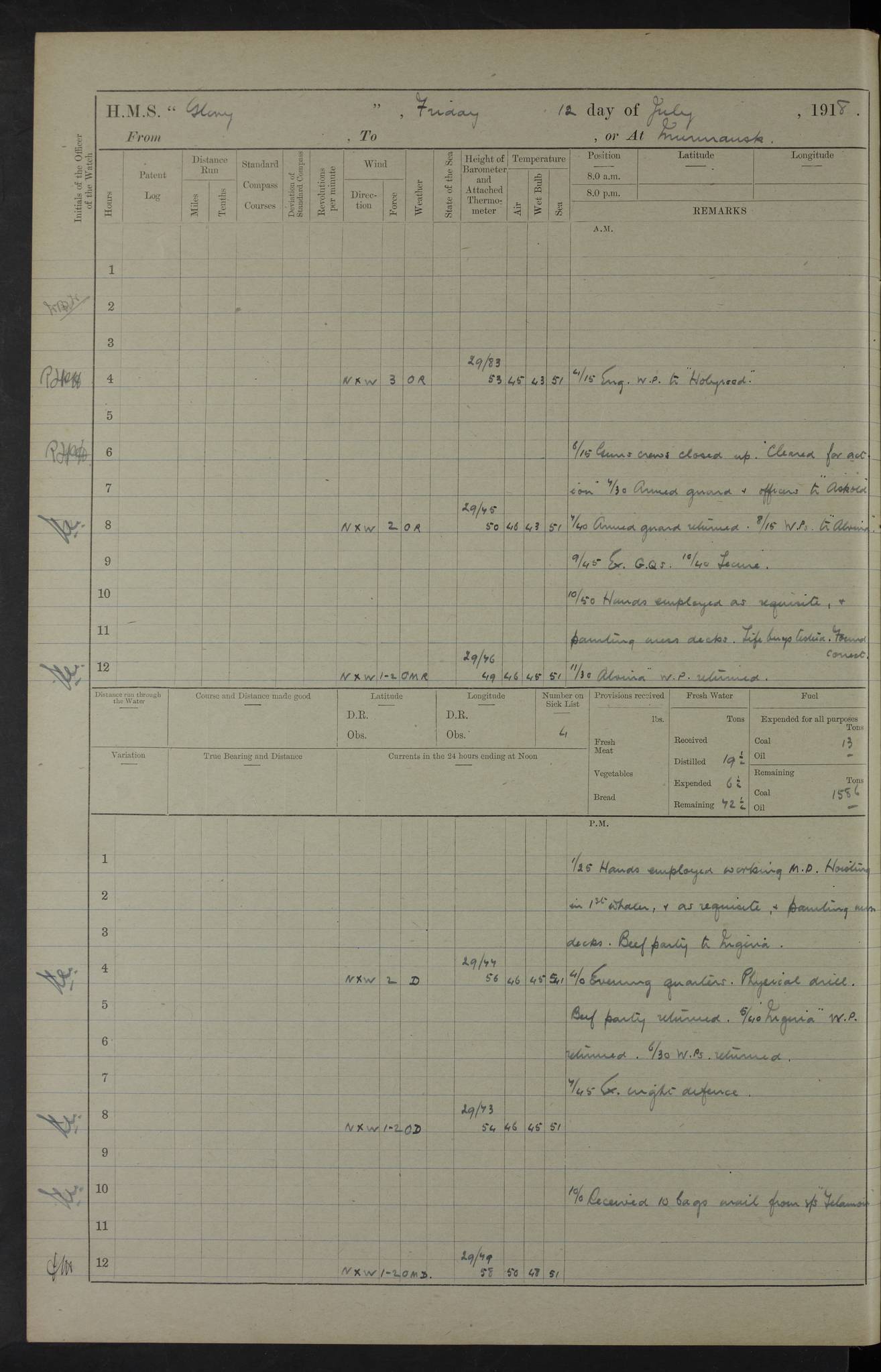 working party left. 4ef4f792e53e0a0c91002c77: (https://s3.amazonaws.com:443/oldweather/ADM53-43039/ADM 53-43039-152_1.jpg) 15 July 1918 Murmansk Lat 69.03, Long 33.05 Number on sick list: 5 6.30am: Hands cleaning ship and hoisting in Askold gear from drifter. 8.15am: Working parties to Nigeria. 11.45am: 1 cot case from SS Westgate. 4.00pm: Carpenters working party from Nigeria. 5.45pm: 1 PO telegraphist joined ship from Alexander. 6.45pm: Libertymen, yacht and Nigeria working parties returned. 4ef4f792e53e0a0c91002c78: (https://s3.amazonaws.com:443/oldweather/ADM53-43039/ADM 53-43039-153_0.jpg) 16 July 1918 Murmansk Lat 69.03, Long 33.05 Number on sick list: 5 1.00am: TBD cast off. 6.00am: Diving party rigging gear. 7.30pm: Engineers working party to yacht. 8.15am: Working parties to Nigeria and diving party. 11.30am: Engineers working party returned from yacht. 2.10pm: Diving party returned. 4.00pm: Read warrant No. 22. 4ef4f792e53e0a0c91002c79: (https://s3.amazonaws.com:443/oldweather/ADM53-43039/ADM 53-43039-153_1.jpg) 17 July 1918 Murmansk Lat 69.03, Long 33.05 Number on sick list: 6 7.30am: Engineers working party left ship. 8.15am: Working parties left ship. One chief armourer joined. 9.40am: Telamous working party left ship. 11.10am: Nigeria working party returned. 1.00pm: Diving party left ship. 1.30pm: Hands employed variously and hoisting in ammunition. 2.50pm: Received 24 bags mail from Chiswick. SS Chiswick was a cargo vessel of 3246 grt, built in 1904 at Henderson & Co., Meadowside, Glasgow. On 2 January, 1919, she ran aground and was wrecked on the northwest point of Kildin Island, a Russian island in the Barents Sea. Details at http://www.wrecksite.eu/wreck.aspx?136644 . 3.10pm: Admiral Kemp and staff rejoined ship. 6.30pm: Yacht working party and libertymen returned. 8.35pm: Diving party returned. 4ef4f792e53e0a0c91002c7a: (https://s3.amazonaws.com:443/oldweather/ADM53-43039/ADM 53-43039-154_0.jpg) 18 July 1918 Murmansk Lat 69.03, Long 33.05 Number on sick list: 7 7.30am: Engineers working party to Alvinia. SS Chiswick alongside. 9.15am: Hands employed getting in stores from Chiswick and as requisite. 10.00am: Ten marines and one yeoman signals from Salvator. 11.00am: Landed Lewis gun section. 1.30pm: hands employed variously and getting in stores and ammunition. 3.40pm: SS Chiswick left. 4.35pm: One cell offender discharged to Ralco. Ralco was a hired trawler of 228 grt, built in 1912 (Admiralty No. 672; Port No. GY.663). Sourced from F.J. Dittmar & J.J. Colledge (1972) – British warships 1914–1919, Ian Allan. 5.30pm: All working parties returned. 6.00pm: Armed guard (18 privates, 2 sergeants) and engineers working party to Askold under Lieutenant Morris RMLI and Engineer Lieutenant Johnson RN. 7.30pm: Port watch landed transporting shell. 7.45pm: 68 marines and Lieutenant Leftwich RMLI rejoined ship. 10.00pm: Port watch returned. 4ef4f792e53e0a0c91002c7b: (https://s3.amazonaws.com:443/oldweather/ADM53-43039/ADM 53-43039-154_1.jpg) 19 July 1918 Murmansk Lat 69.03, Long 33.05 Number on sick list: 8 7.30am: Engineers working party to Alvinia. 8.15am: Nigeria working party left ship. 1.30pm: Shell party left ship. 4.00pm: Read warrants 23 & 24. 5.50pm: Nigeria working party returned. 4.45pm: Staff Paymaster Jenkinson left ship. 4ef4f792e53e0a0c91002c7c: (https://s3.amazonaws.com:443/oldweather/ADM53-43039/ADM 53-43039-155_0.jpg) 20 July 1918 Murmansk Lat 69.03, Long 33.05 Number on sick list: 9 7.30am: Engineers working party to Alvinia. 8.20am: Nigeria’s working party left ship. 11.00am: Working party to Tchesma. 12.20pm: Tchesma working party returned. 1.30pm: Working party to Tchesma. 5.40pm: Tchesma working party returned. 7.00pm: Water boat alongside. 4ef4f792e53e0a0c91002c7d: (https://s3.amazonaws.com:443/oldweather/ADM53-43039/ADM 53-43039-155_1.jpg) 21 July 1918 Murmansk Lat 69.03, Long 33.05 Number on sick list: 9 7.30am: Carpenters working party to Nigeria. 9.30am: Captain’s inspection. 10.15am: Divine Service. 11.45am: Carpenters working party returned. 1.30pm: Working party to Kassala. Water boat left. Kassala was a store carrier of 3825 grt, built in 1897. Sourced from F.J. Dittmar & J.J. Colledge (1972) – British warships 1914–1919, Ian Allan. 3.00pm: Landed ship’s tug of war team. 5.20pm: Working party returned. 8.00pm: 2 marines and stokers to Askold. 9.00pm: 1 marine to Salvator. 4ef4f792e53e0a0c91002c7e: (https://s3.amazonaws.com:443/oldweather/ADM53-43039/ADM 53-43039-156_0.jpg) 22 July 1918 Murmansk Lat 69.03, Long 33.05 Number on sick list: 11 7.30am: Engineers working party to yacht. 8.15am: Nigeria’s working party left. 11.50am: Admiral and staff left for Salvator. 1.30pm: Working party to shore. 5.15pm: Store party returned. 6.30pm: Working parties returned. Landed boxing party. 4ef4f792e53e0a0c91002c7f: (https://s3.amazonaws.com:443/oldweather/ADM53-43039/ADM 53-43039-156_1.jpg) 23 July 1918 Murmansk Lat 69.03, Long 33.05 Number on sick list: 10 7.30am: Engineers working party to Alvinia. 8.15am: Working parties to Nigeria and Kassala. 11.50am: Kassala working party returned. 1.30pm: Landed store party. 5.30pm: Working parties returned. 4ef4f792e53e0a0c91002c80: (https://s3.amazonaws.com:443/oldweather/ADM53-43039/ADM 53-43039-157_0.jpg) 24 July 1918 Murmansk Lat 69.03, Long 33.05 Number on sick list: 11 7.30am: Engineers working party to yacht. 8.15am: Kassala and Nigeria working parties left. 11.55am: Working parties returned. 1.30pm: Hands work main derrick. Out picket boat. 4.00pm: Read warrants 25 and 26. Admiral and staff rejoined ship. 4ef4f792e53e0a0c91002c81: (https://s3.amazonaws.com:443/oldweather/ADM53-43039/ADM 53-43039-157_1.jpg) 25 July 1918 Murmansk Lat 69.03, Long 33.05 Number on sick list: 3 4.00am: TBD left. 6.15am: Askold coaling party left ship. 8.20am: Nigeria and Kassala working parties left. 12 noon: Nigeria and Kassala working parties returned. 1.30pm: Working parties to Askold. 5.00pm: Discharged 2 seamen, 1