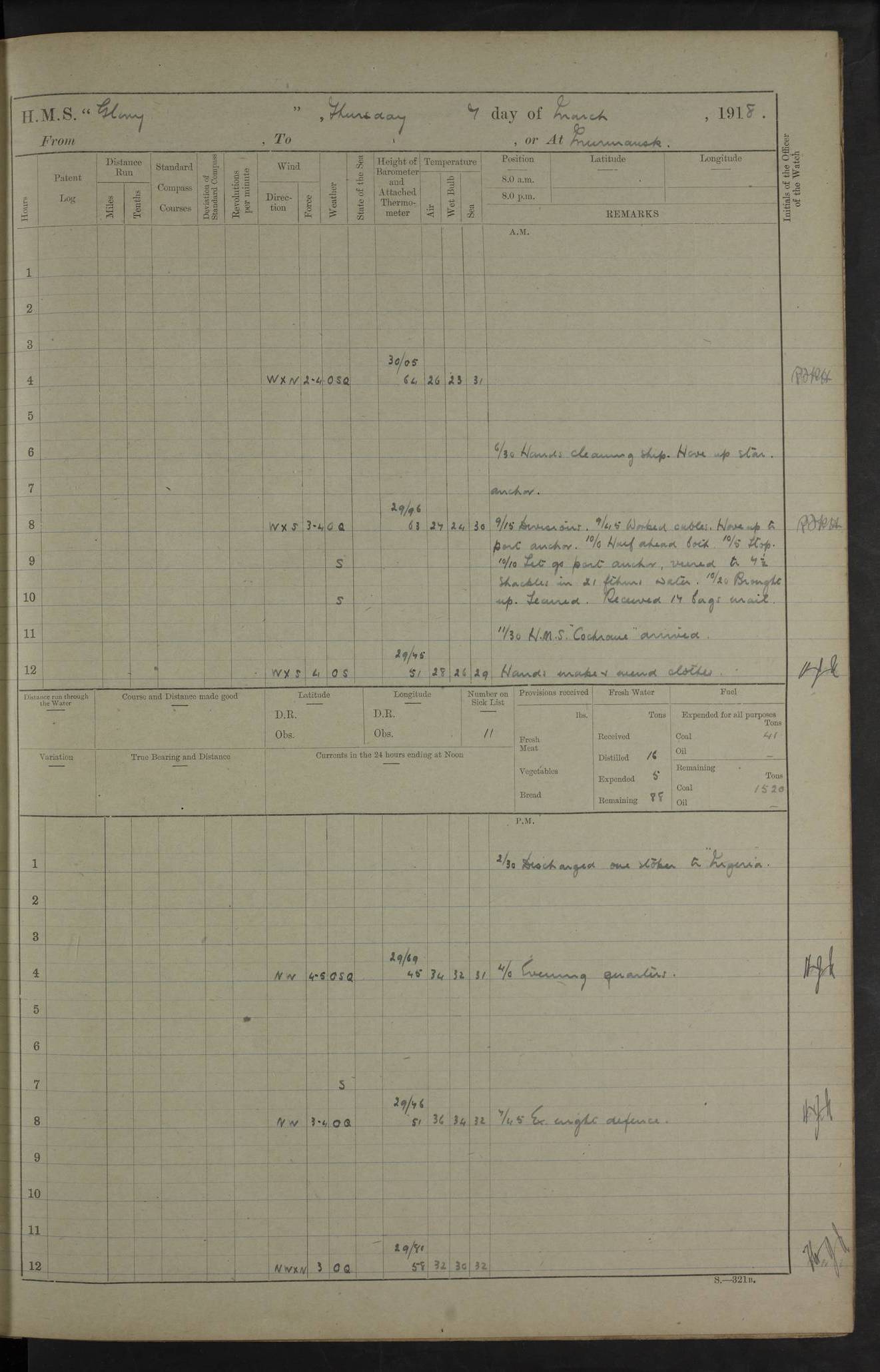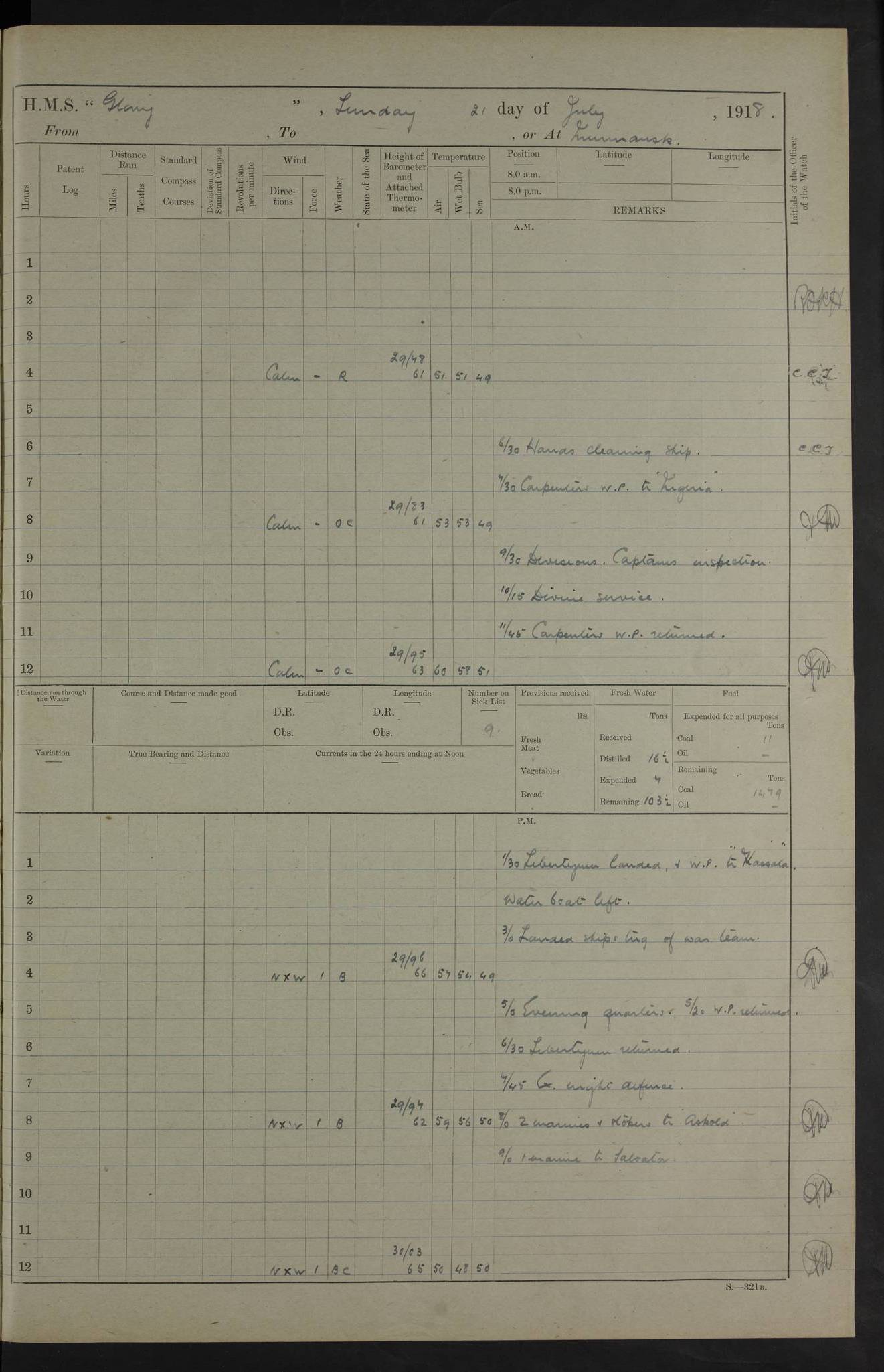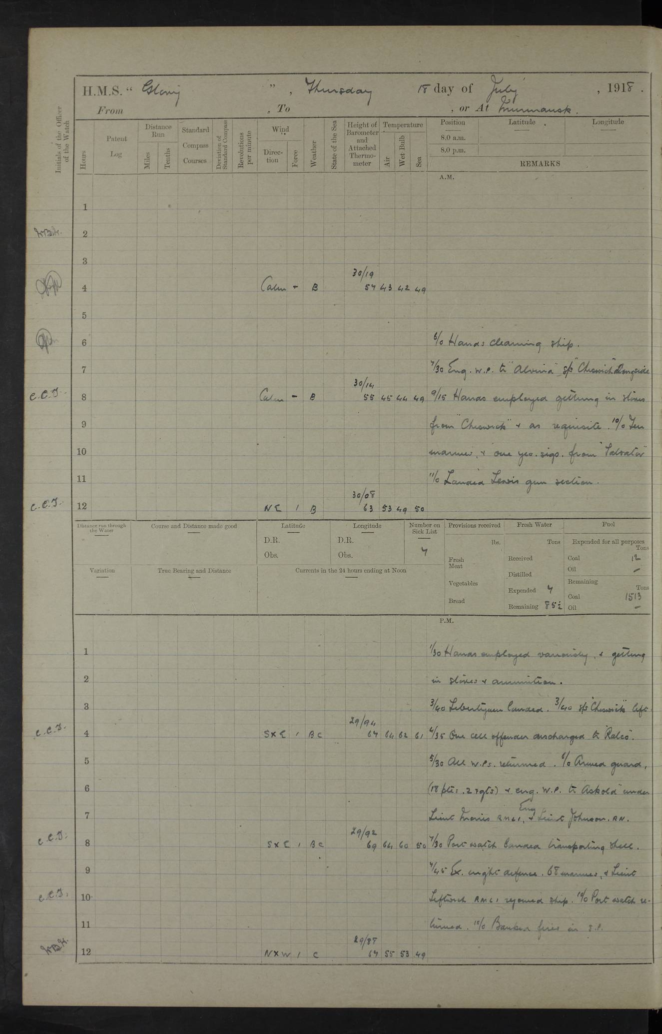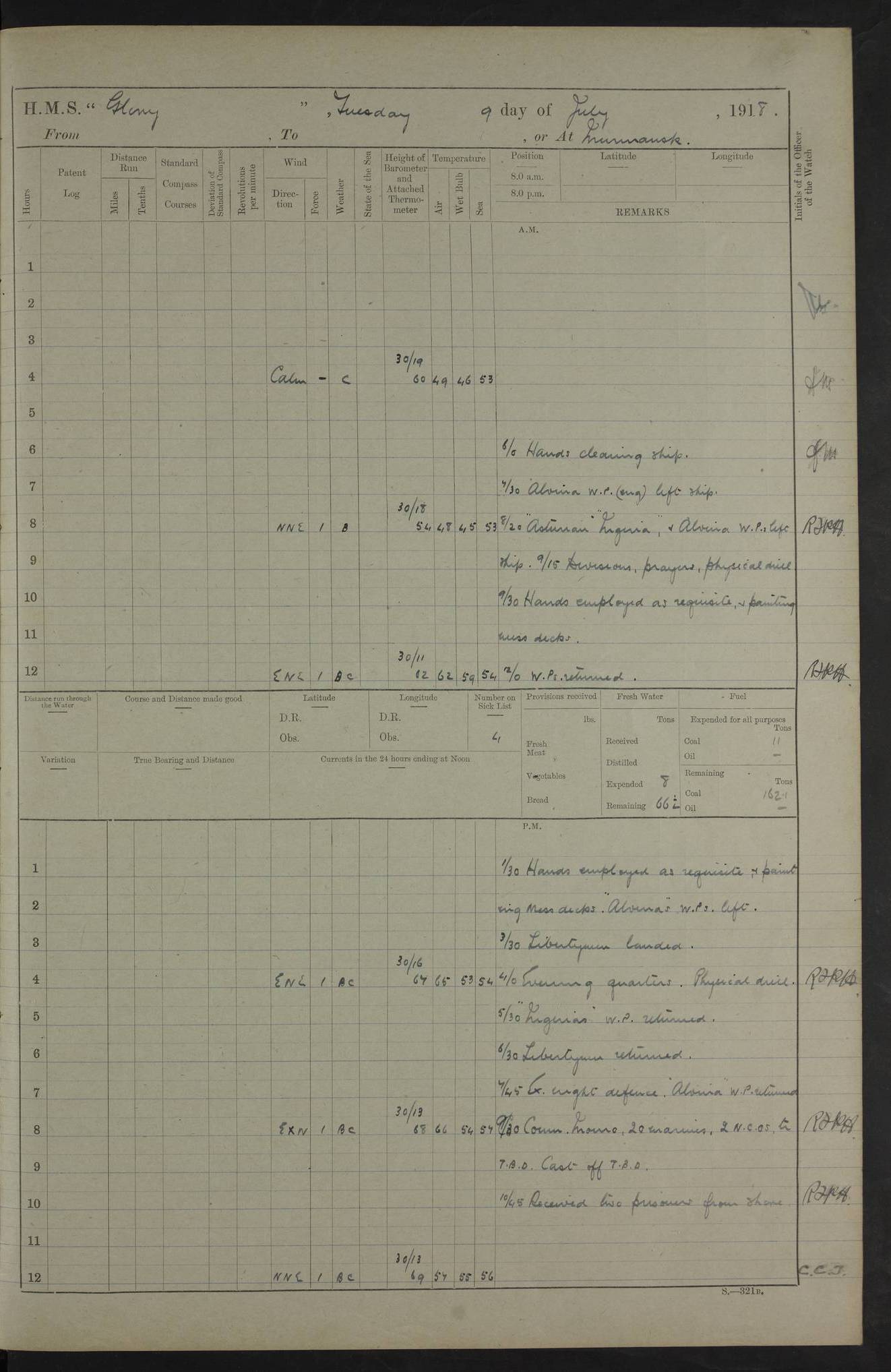 working party left. 4ef4f792e53e0a0c91002c77: (https://s3.amazonaws.com:443/oldweather/ADM53-43039/ADM 53-43039-152_1.jpg) 15 July 1918 Murmansk Lat 69.03, Long 33.05 Number on sick list: 5 6.30am: Hands cleaning ship and hoisting in Askold gear from drifter. 8.15am: Working parties to Nigeria. 11.45am: 1 cot case from SS Westgate. 4.00pm: Carpenters working party from Nigeria. 5.45pm: 1 PO telegraphist joined ship from Alexander. 6.45pm: Libertymen, yacht and Nigeria working parties returned. 4ef4f792e53e0a0c91002c78: (https://s3.amazonaws.com:443/oldweather/ADM53-43039/ADM 53-43039-153_0.jpg) 16 July 1918 Murmansk Lat 69.03, Long 33.05 Number on sick list: 5 1.00am: TBD cast off. 6.00am: Diving party rigging gear. 7.30pm: Engineers working party to yacht. 8.15am: Working parties to Nigeria and diving party. 11.30am: Engineers working party returned from yacht. 2.10pm: Diving party returned. 4.00pm: Read warrant No. 22. 4ef4f792e53e0a0c91002c79: (https://s3.amazonaws.com:443/oldweather/ADM53-43039/ADM 53-43039-153_1.jpg) 17 July 1918 Murmansk Lat 69.03, Long 33.05 Number on sick list: 6 7.30am: Engineers working party left ship. 8.15am: Working parties left ship. One chief armourer joined. 9.40am: Telamous working party left ship. 11.10am: Nigeria working party returned. 1.00pm: Diving party left ship. 1.30pm: Hands employed variously and hoisting in ammunition. 2.50pm: Received 24 bags mail from Chiswick. SS Chiswick was a cargo vessel of 3246 grt, built in 1904 at Henderson & Co., Meadowside, Glasgow. On 2 January, 1919, she ran aground and was wrecked on the northwest point of Kildin Island, a Russian island in the Barents Sea. Details at http://www.wrecksite.eu/wreck.aspx?136644 . 3.10pm: Admiral Kemp and staff rejoined ship. 6.30pm: Yacht working party and libertymen returned. 8.35pm: Diving party returned. 4ef4f792e53e0a0c91002c7a: (https://s3.amazonaws.com:443/oldweather/ADM53-43039/ADM 53-43039-154_0.jpg) 18 July 1918 Murmansk Lat 69.03, Long 33.05 Number on sick list: 7 7.30am: Engineers working party to Alvinia. SS Chiswick alongside. 9.15am: Hands employed getting in stores from Chiswick and as requisite. 10.00am: Ten marines and one yeoman signals from Salvator. 11.00am: Landed Lewis gun section. 1.30pm: hands employed variously and getting in stores and ammunition. 3.40pm: SS Chiswick left. 4.35pm: One cell offender discharged to Ralco. Ralco was a hired trawler of 228 grt, built in 1912 (Admiralty No. 672; Port No. GY.663). Sourced from F.J. Dittmar & J.J. Colledge (1972) – British warships 1914–1919, Ian Allan. 5.30pm: All working parties returned. 6.00pm: Armed guard (18 privates, 2 sergeants) and engineers working party to Askold under Lieutenant Morris RMLI and Engineer Lieutenant Johnson RN. 7.30pm: Port watch landed transporting shell. 7.45pm: 68 marines and Lieutenant Leftwich RMLI rejoined ship. 10.00pm: Port watch returned. 4ef4f792e53e0a0c91002c7b: (https://s3.amazonaws.com:443/oldweather/ADM53-43039/ADM 53-43039-154_1.jpg) 19 July 1918 Murmansk Lat 69.03, Long 33.05 Number on sick list: 8 7.30am: Engineers working party to Alvinia. 8.15am: Nigeria working party left ship. 1.30pm: Shell party left ship. 4.00pm: Read warrants 23 & 24. 5.50pm: Nigeria working party returned. 4.45pm: Staff Paymaster Jenkinson left ship. 4ef4f792e53e0a0c91002c7c: (https://s3.amazonaws.com:443/oldweather/ADM53-43039/ADM 53-43039-155_0.jpg) 20 July 1918 Murmansk Lat 69.03, Long 33.05 Number on sick list: 9 7.30am: Engineers working party to Alvinia. 8.20am: Nigeria’s working party left ship. 11.00am: Working party to Tchesma. 12.20pm: Tchesma working party returned. 1.30pm: Working party to Tchesma. 5.40pm: Tchesma working party returned. 7.00pm: Water boat alongside. 4ef4f792e53e0a0c91002c7d: (https://s3.amazonaws.com:443/oldweather/ADM53-43039/ADM 53-43039-155_1.jpg) 21 July 1918 Murmansk Lat 69.03, Long 33.05 Number on sick list: 9 7.30am: Carpenters working party to Nigeria. 9.30am: Captain’s inspection. 10.15am: Divine Service. 11.45am: Carpenters working party returned. 1.30pm: Working party to Kassala. Water boat left. Kassala was a store carrier of 3825 grt, built in 1897. Sourced from F.J. Dittmar & J.J. Colledge (1972) – British warships 1914–1919, Ian Allan. 3.00pm: Landed ship’s tug of war team. 5.20pm: Working party returned. 8.00pm: 2 marines and stokers to Askold. 9.00pm: 1 marine to Salvator. 4ef4f792e53e0a0c91002c7e: (https://s3.amazonaws.com:443/oldweather/ADM53-43039/ADM 53-43039-156_0.jpg) 22 July 1918 Murmansk Lat 69.03, Long 33.05 Number on sick list: 11 7.30am: Engineers working party to yacht. 8.15am: Nigeria’s working party left. 11.50am: Admiral and staff left for Salvator. 1.30pm: Working party to shore. 5.15pm: Store party returned. 6.30pm: Working parties returned. Landed boxing party. 4ef4f792e53e0a0c91002c7f: (https://s3.amazonaws.com:443/oldweather/ADM53-43039/ADM 53-43039-156_1.jpg) 23 July 1918 Murmansk Lat 69.03, Long 33.05 Number on sick list: 10 7.30am: Engineers working party to Alvinia. 8.15am: Working parties to Nigeria and Kassala. 11.50am: Kassala working party returned. 1.30pm: Landed store party. 5.30pm: Working parties returned. 4ef4f792e53e0a0c91002c80: (https://s3.amazonaws.com:443/oldweather/ADM53-43039/ADM 53-43039-157_0.jpg) 24 July 1918 Murmansk Lat 69.03, Long 33.05 Number on sick list: 11 7.30am: Engineers working party to yacht. 8.15am: Kassala and Nigeria working parties left. 11.55am: Working parties returned. 1.30pm: Hands work main derrick. Out picket boat. 4.00pm: Read warrants 25 and 26. Admiral and staff rejoined ship. 4ef4f792e53e0a0c91002c81: (https://s3.amazonaws.com:443/oldweather/ADM53-43039/ADM 53-43039-157_1.jpg) 25 July 1918 Murmansk Lat 69.03, Long 33.05 Number on sick list: 3 4.00am: TBD left. 6.15am: Askold coaling party left ship. 8.20am: Nigeria and Kassala working parties left. 12 noon: Nigeria and Kassala working parties returned. 1.30pm: Working parties to Askold. 5.00pm: Discharged 2 seamen, 1
