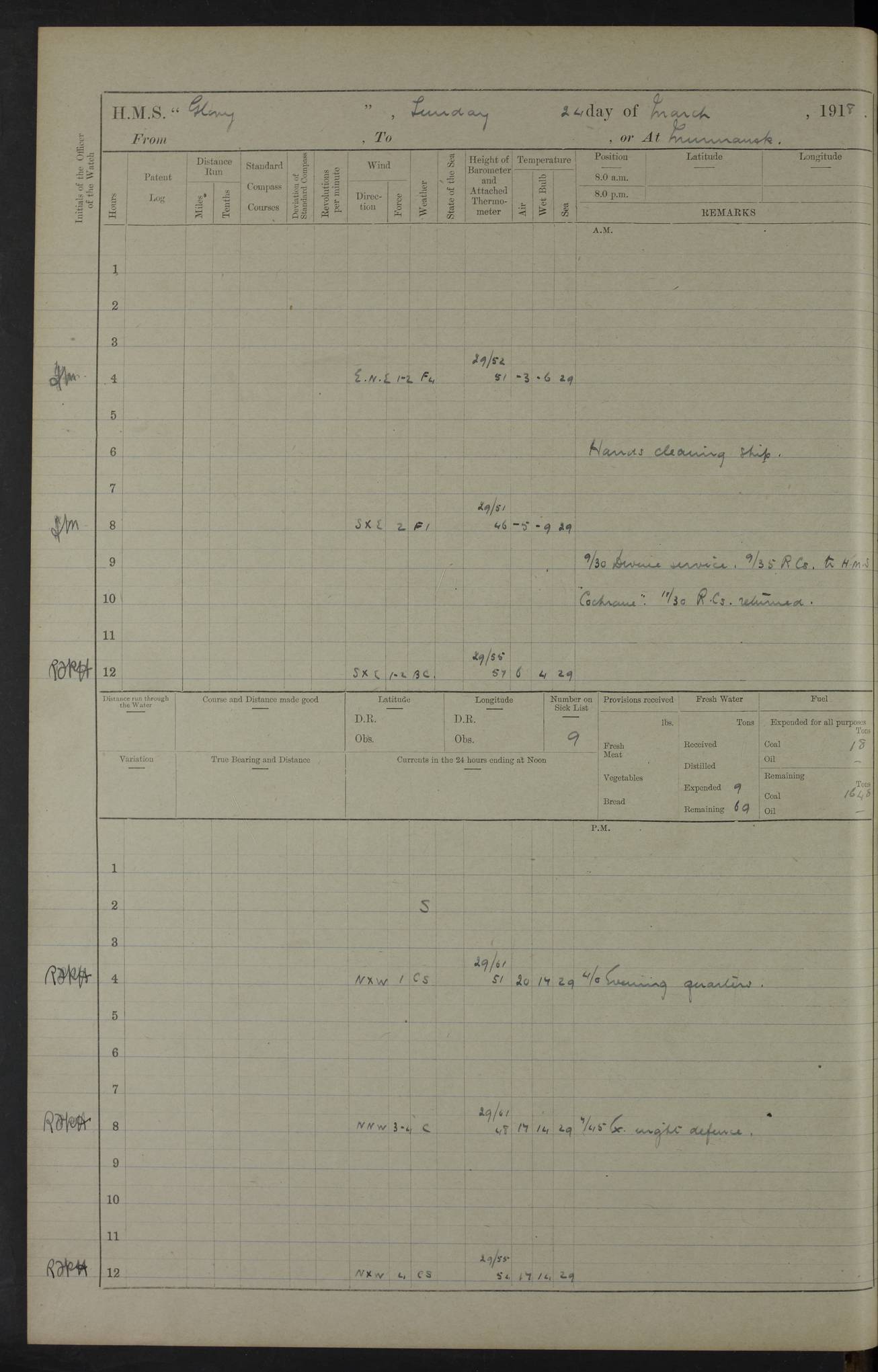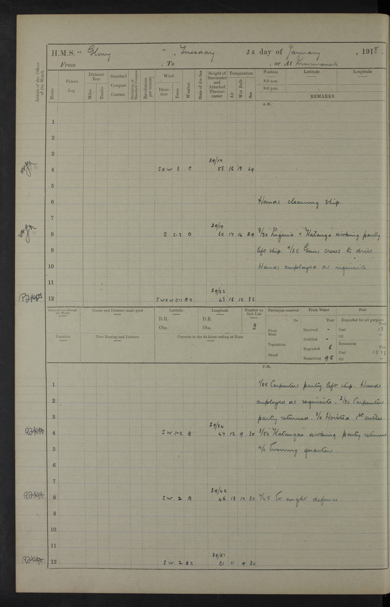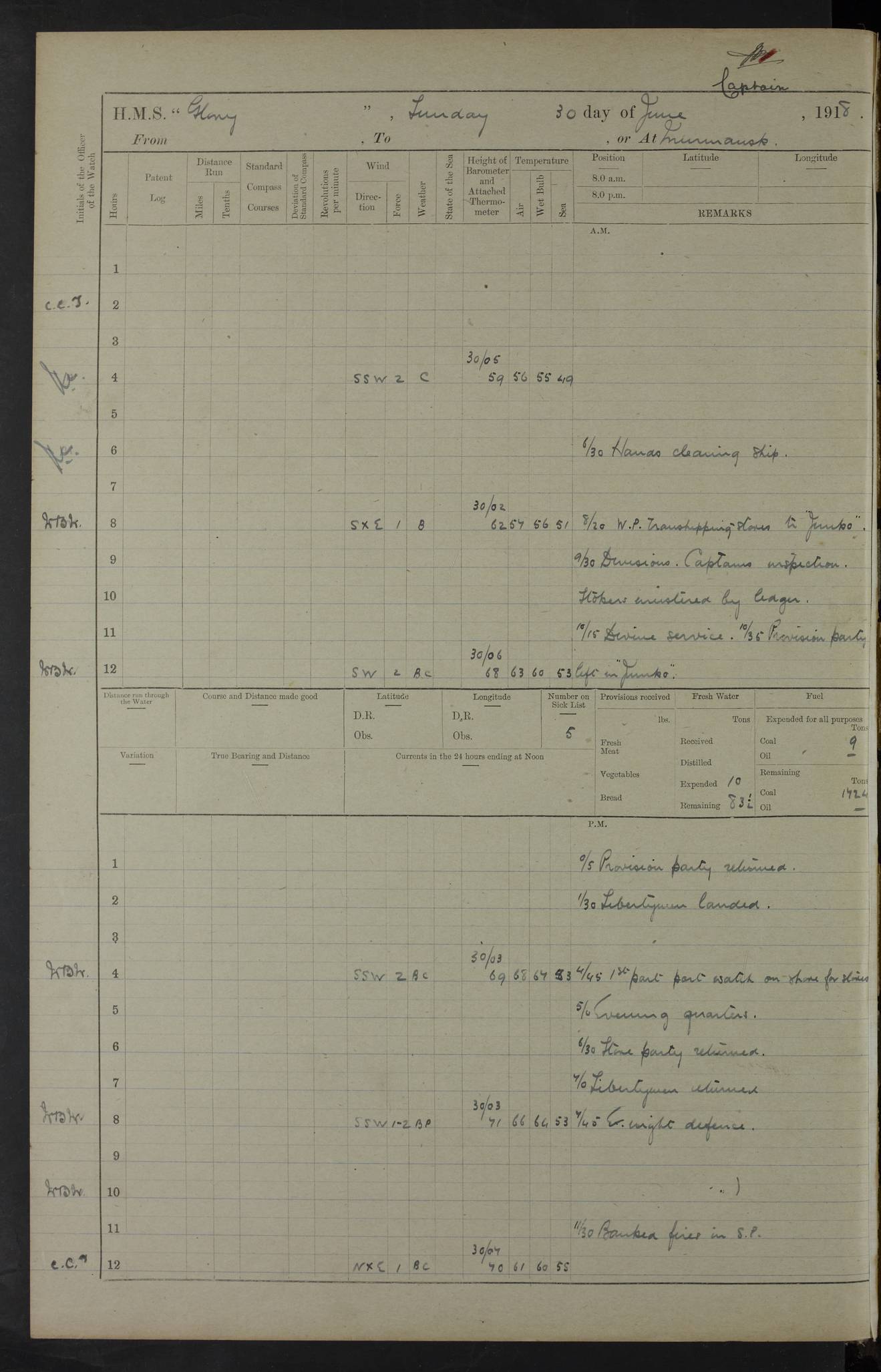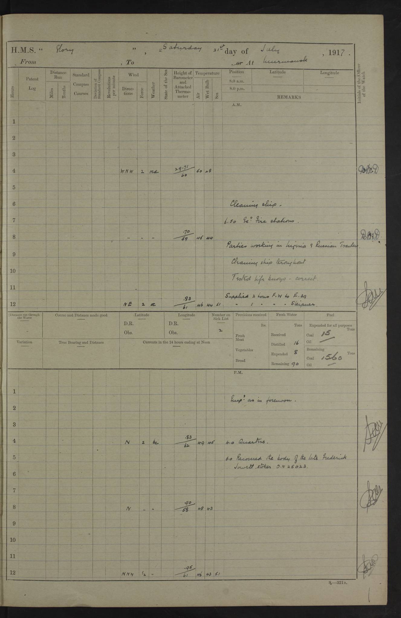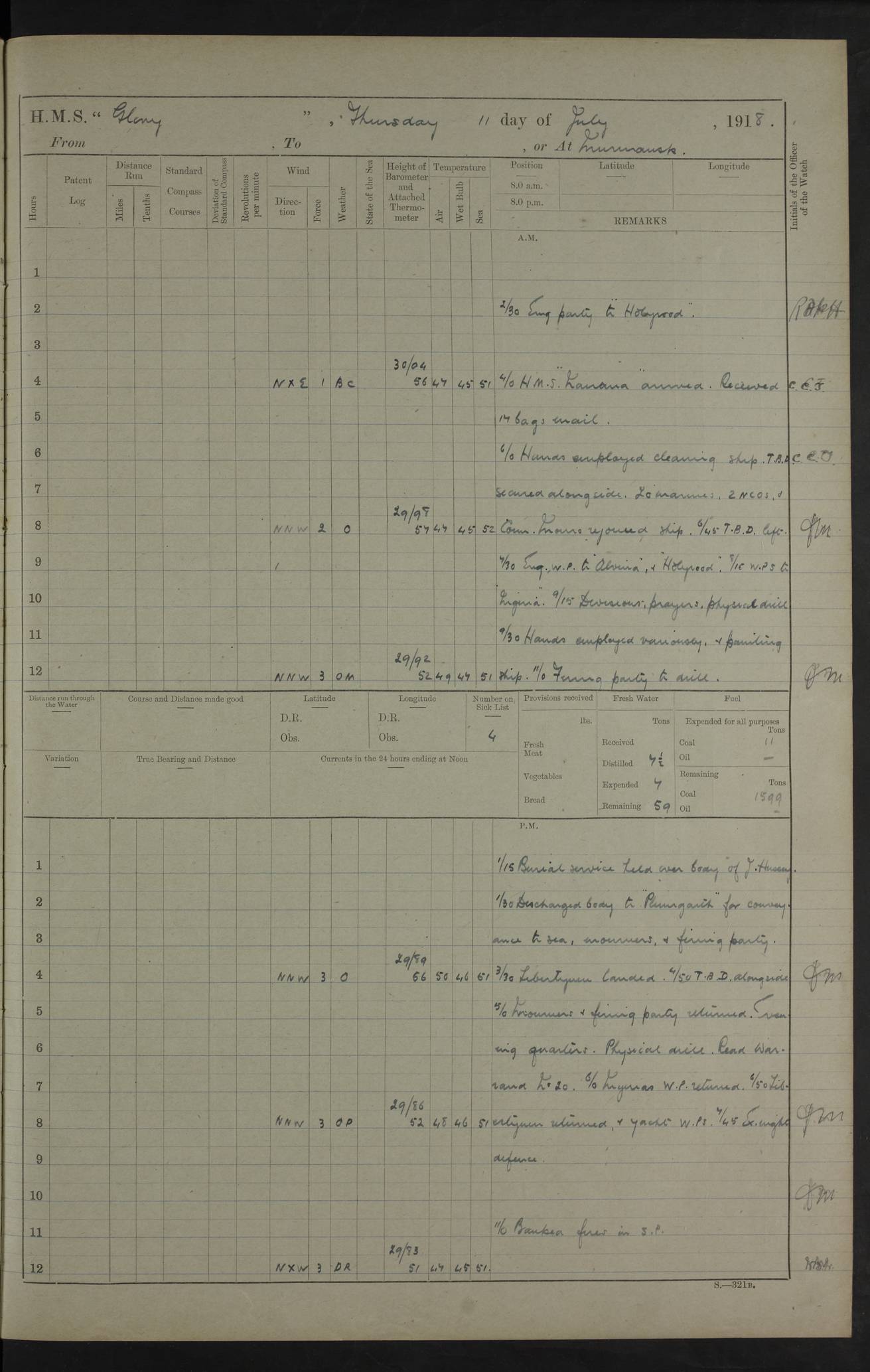 working party left. 4ef4f792e53e0a0c91002c77: (https://s3.amazonaws.com:443/oldweather/ADM53-43039/ADM 53-43039-152_1.jpg) 15 July 1918 Murmansk Lat 69.03, Long 33.05 Number on sick list: 5 6.30am: Hands cleaning ship and hoisting in Askold gear from drifter. 8.15am: Working parties to Nigeria. 11.45am: 1 cot case from SS Westgate. 4.00pm: Carpenters working party from Nigeria. 5.45pm: 1 PO telegraphist joined ship from Alexander. 6.45pm: Libertymen, yacht and Nigeria working parties returned. 4ef4f792e53e0a0c91002c78: (https://s3.amazonaws.com:443/oldweather/ADM53-43039/ADM 53-43039-153_0.jpg) 16 July 1918 Murmansk Lat 69.03, Long 33.05 Number on sick list: 5 1.00am: TBD cast off. 6.00am: Diving party rigging gear. 7.30pm: Engineers working party to yacht. 8.15am: Working parties to Nigeria and diving party. 11.30am: Engineers working party returned from yacht. 2.10pm: Diving party returned. 4.00pm: Read warrant No. 22. 4ef4f792e53e0a0c91002c79: (https://s3.amazonaws.com:443/oldweather/ADM53-43039/ADM 53-43039-153_1.jpg) 17 July 1918 Murmansk Lat 69.03, Long 33.05 Number on sick list: 6 7.30am: Engineers working party left ship. 8.15am: Working parties left ship. One chief armourer joined. 9.40am: Telamous working party left ship. 11.10am: Nigeria working party returned. 1.00pm: Diving party left ship. 1.30pm: Hands employed variously and hoisting in ammunition. 2.50pm: Received 24 bags mail from Chiswick. SS Chiswick was a cargo vessel of 3246 grt, built in 1904 at Henderson & Co., Meadowside, Glasgow. On 2 January, 1919, she ran aground and was wrecked on the northwest point of Kildin Island, a Russian island in the Barents Sea. Details at http://www.wrecksite.eu/wreck.aspx?136644 . 3.10pm: Admiral Kemp and staff rejoined ship. 6.30pm: Yacht working party and libertymen returned. 8.35pm: Diving party returned. 4ef4f792e53e0a0c91002c7a: (https://s3.amazonaws.com:443/oldweather/ADM53-43039/ADM 53-43039-154_0.jpg) 18 July 1918 Murmansk Lat 69.03, Long 33.05 Number on sick list: 7 7.30am: Engineers working party to Alvinia. SS Chiswick alongside. 9.15am: Hands employed getting in stores from Chiswick and as requisite. 10.00am: Ten marines and one yeoman signals from Salvator. 11.00am: Landed Lewis gun section. 1.30pm: hands employed variously and getting in stores and ammunition. 3.40pm: SS Chiswick left. 4.35pm: One cell offender discharged to Ralco. Ralco was a hired trawler of 228 grt, built in 1912 (Admiralty No. 672; Port No. GY.663). Sourced from F.J. Dittmar & J.J. Colledge (1972) – British warships 1914–1919, Ian Allan. 5.30pm: All working parties returned. 6.00pm: Armed guard (18 privates, 2 sergeants) and engineers working party to Askold under Lieutenant Morris RMLI and Engineer Lieutenant Johnson RN. 7.30pm: Port watch landed transporting shell. 7.45pm: 68 marines and Lieutenant Leftwich RMLI rejoined ship. 10.00pm: Port watch returned. 4ef4f792e53e0a0c91002c7b: (https://s3.amazonaws.com:443/oldweather/ADM53-43039/ADM 53-43039-154_1.jpg) 19 July 1918 Murmansk Lat 69.03, Long 33.05 Number on sick list: 8 7.30am: Engineers working party to Alvinia. 8.15am: Nigeria working party left ship. 1.30pm: Shell party left ship. 4.00pm: Read warrants 23 & 24. 5.50pm: Nigeria working party returned. 4.45pm: Staff Paymaster Jenkinson left ship. 4ef4f792e53e0a0c91002c7c: (https://s3.amazonaws.com:443/oldweather/ADM53-43039/ADM 53-43039-155_0.jpg) 20 July 1918 Murmansk Lat 69.03, Long 33.05 Number on sick list: 9 7.30am: Engineers working party to Alvinia. 8.20am: Nigeria’s working party left ship. 11.00am: Working party to Tchesma. 12.20pm: Tchesma working party returned. 1.30pm: Working party to Tchesma. 5.40pm: Tchesma working party returned. 7.00pm: Water boat alongside. 4ef4f792e53e0a0c91002c7d: (https://s3.amazonaws.com:443/oldweather/ADM53-43039/ADM 53-43039-155_1.jpg) 21 July 1918 Murmansk Lat 69.03, Long 33.05 Number on sick list: 9 7.30am: Carpenters working party to Nigeria. 9.30am: Captain’s inspection. 10.15am: Divine Service. 11.45am: Carpenters working party returned. 1.30pm: Working party to Kassala. Water boat left. Kassala was a store carrier of 3825 grt, built in 1897. Sourced from F.J. Dittmar & J.J. Colledge (1972) – British warships 1914–1919, Ian Allan. 3.00pm: Landed ship’s tug of war team. 5.20pm: Working party returned. 8.00pm: 2 marines and stokers to Askold. 9.00pm: 1 marine to Salvator. 4ef4f792e53e0a0c91002c7e: (https://s3.amazonaws.com:443/oldweather/ADM53-43039/ADM 53-43039-156_0.jpg) 22 July 1918 Murmansk Lat 69.03, Long 33.05 Number on sick list: 11 7.30am: Engineers working party to yacht. 8.15am: Nigeria’s working party left. 11.50am: Admiral and staff left for Salvator. 1.30pm: Working party to shore. 5.15pm: Store party returned. 6.30pm: Working parties returned. Landed boxing party. 4ef4f792e53e0a0c91002c7f: (https://s3.amazonaws.com:443/oldweather/ADM53-43039/ADM 53-43039-156_1.jpg) 23 July 1918 Murmansk Lat 69.03, Long 33.05 Number on sick list: 10 7.30am: Engineers working party to Alvinia. 8.15am: Working parties to Nigeria and Kassala. 11.50am: Kassala working party returned. 1.30pm: Landed store party. 5.30pm: Working parties returned. 4ef4f792e53e0a0c91002c80: (https://s3.amazonaws.com:443/oldweather/ADM53-43039/ADM 53-43039-157_0.jpg) 24 July 1918 Murmansk Lat 69.03, Long 33.05 Number on sick list: 11 7.30am: Engineers working party to yacht. 8.15am: Kassala and Nigeria working parties left. 11.55am: Working parties returned. 1.30pm: Hands work main derrick. Out picket boat. 4.00pm: Read warrants 25 and 26. Admiral and staff rejoined ship. 4ef4f792e53e0a0c91002c81: (https://s3.amazonaws.com:443/oldweather/ADM53-43039/ADM 53-43039-157_1.jpg) 25 July 1918 Murmansk Lat 69.03, Long 33.05 Number on sick list: 3 4.00am: TBD left. 6.15am: Askold coaling party left ship. 8.20am: Nigeria and Kassala working parties left. 12 noon: Nigeria and Kassala working parties returned. 1.30pm: Working parties to Askold. 5.00pm: Discharged 2 seamen, 1