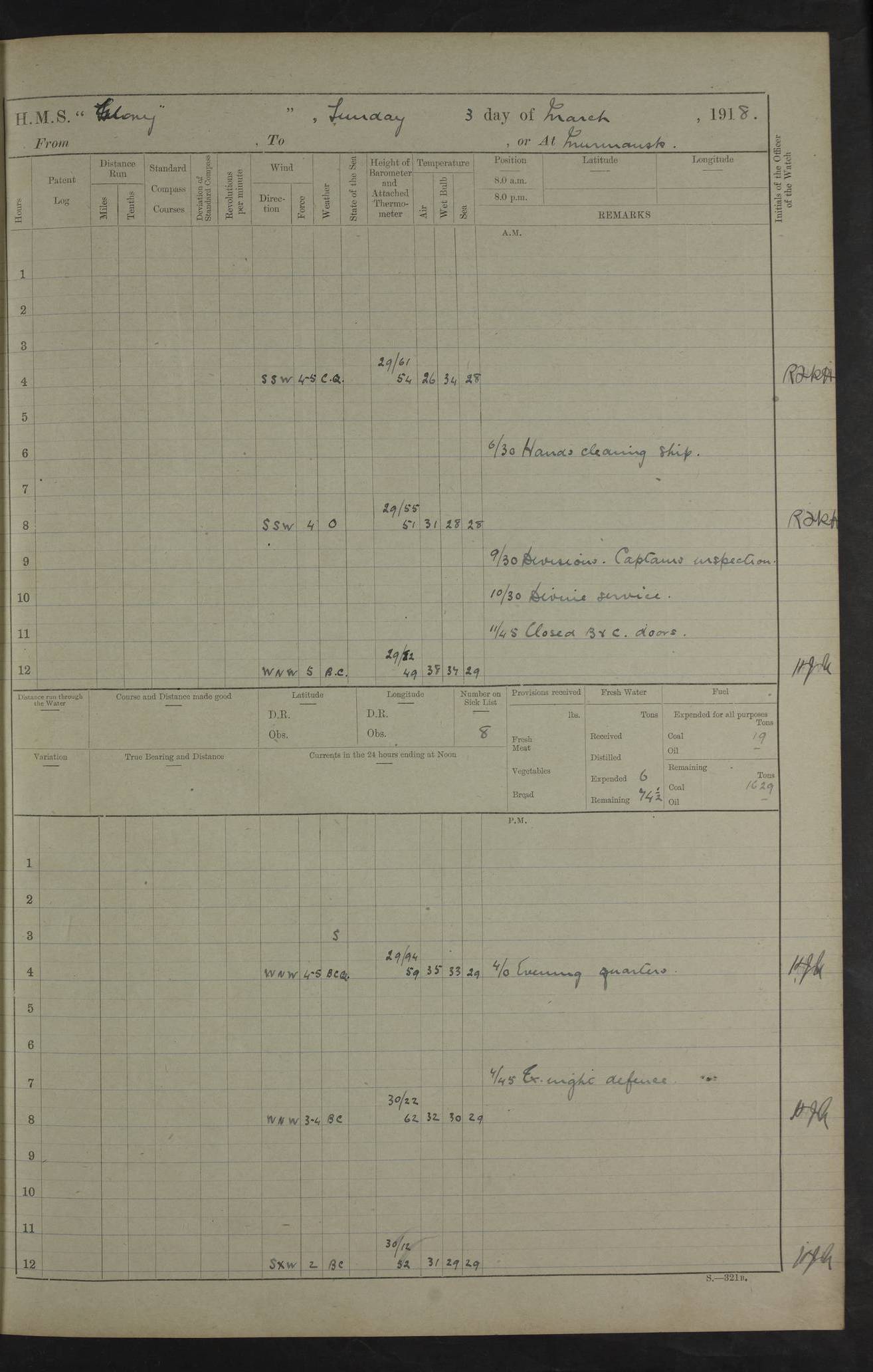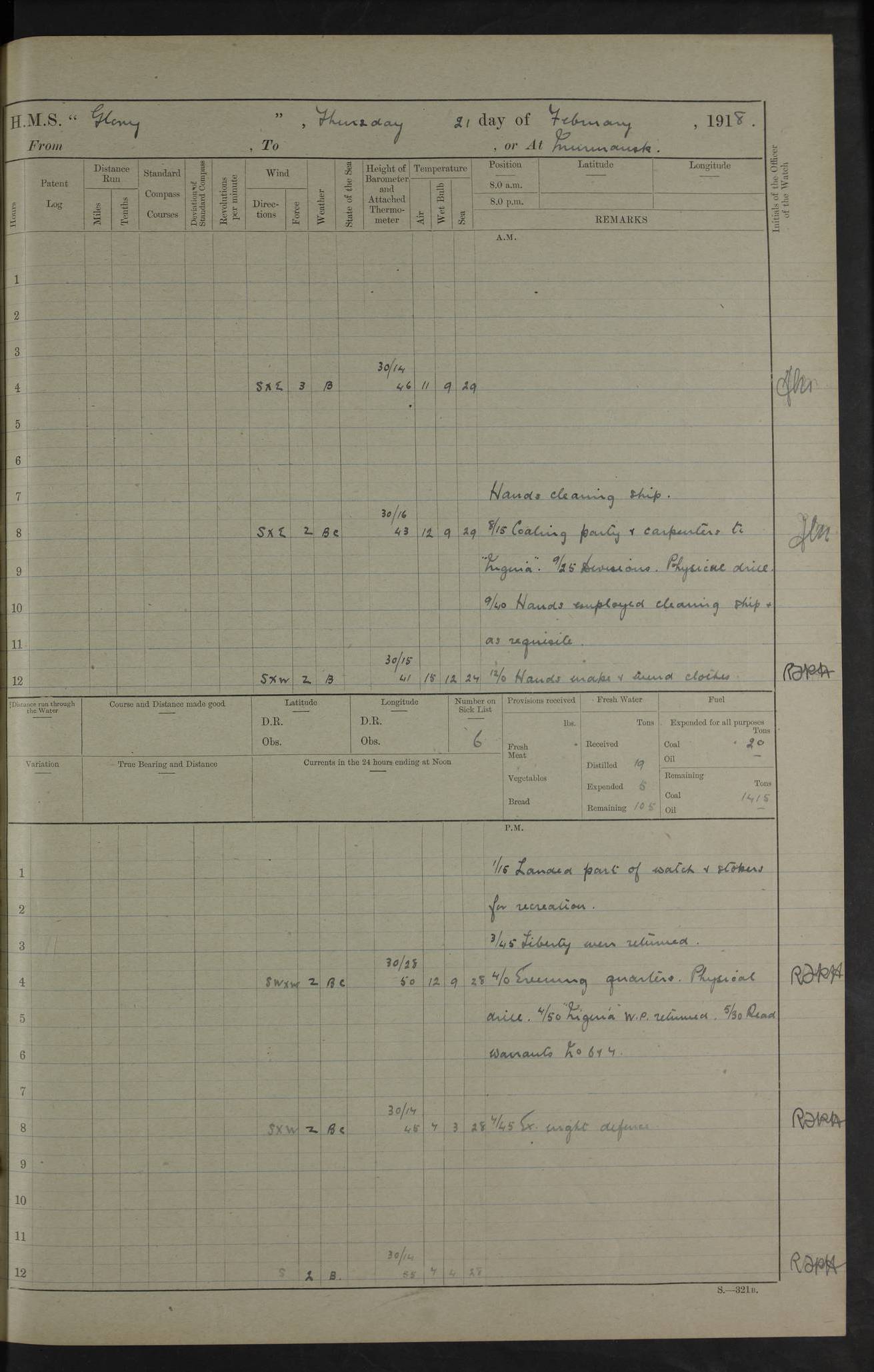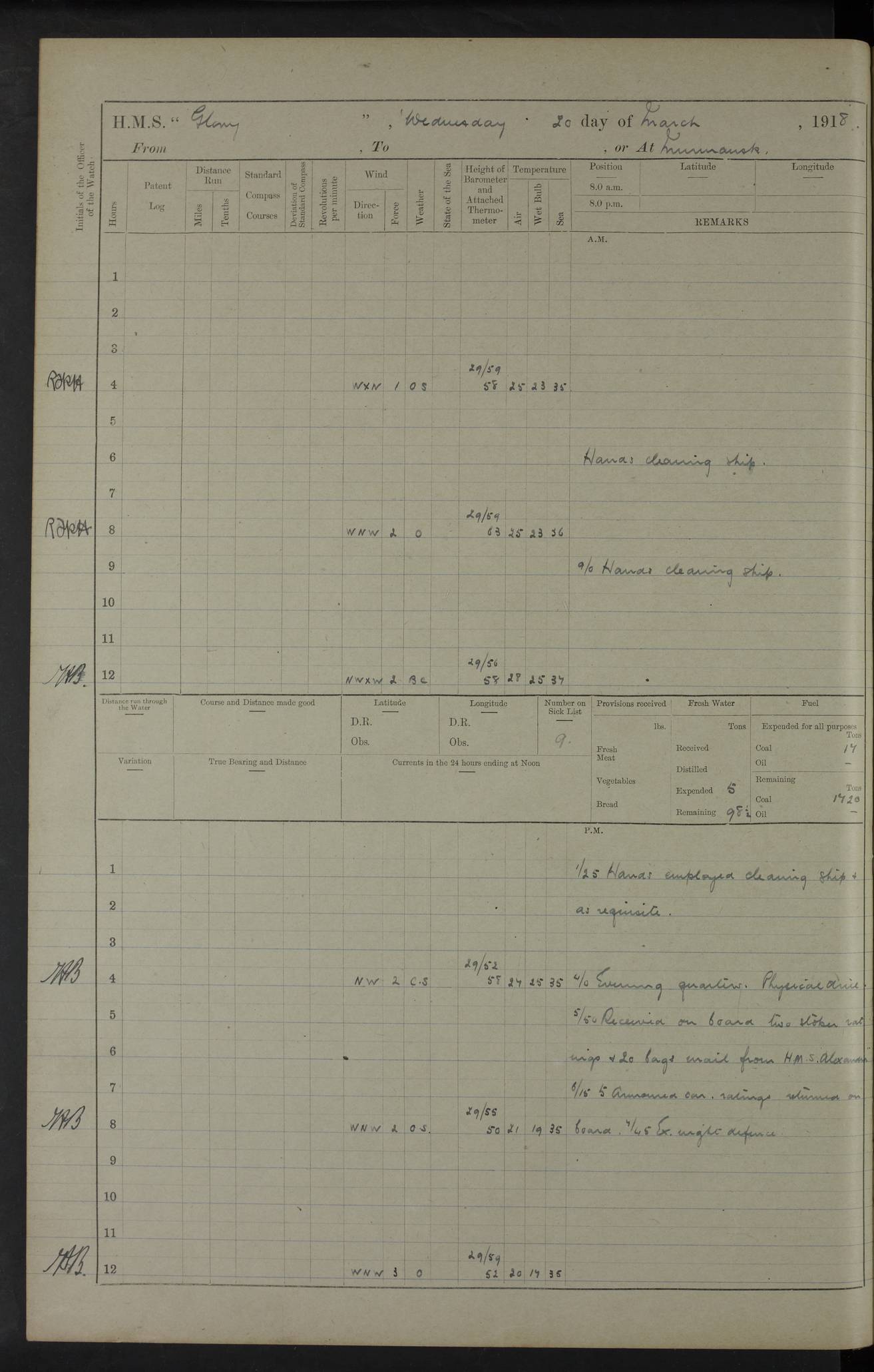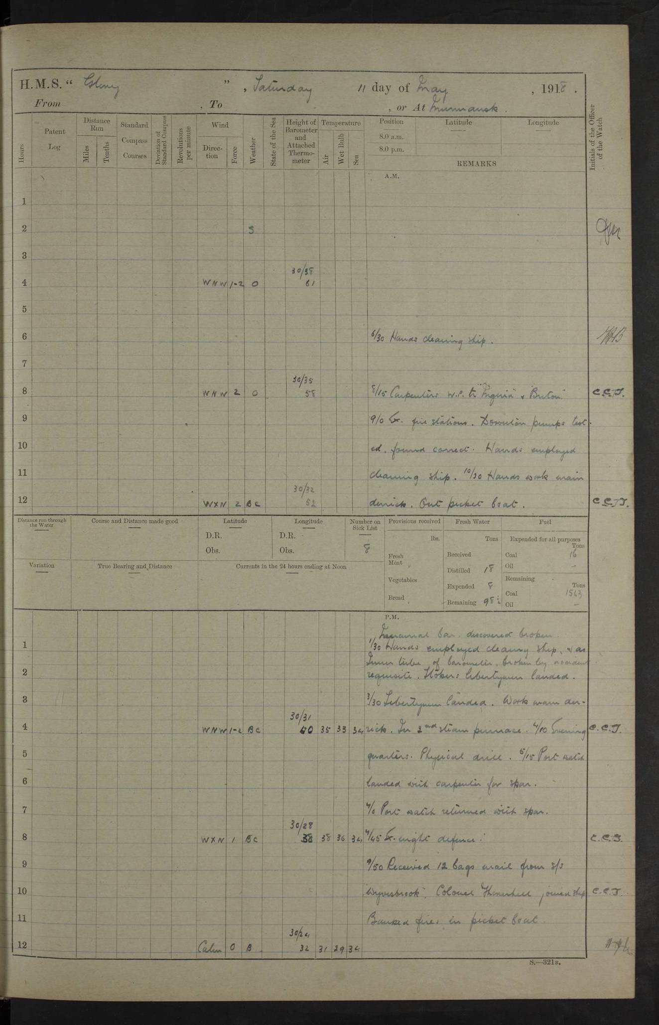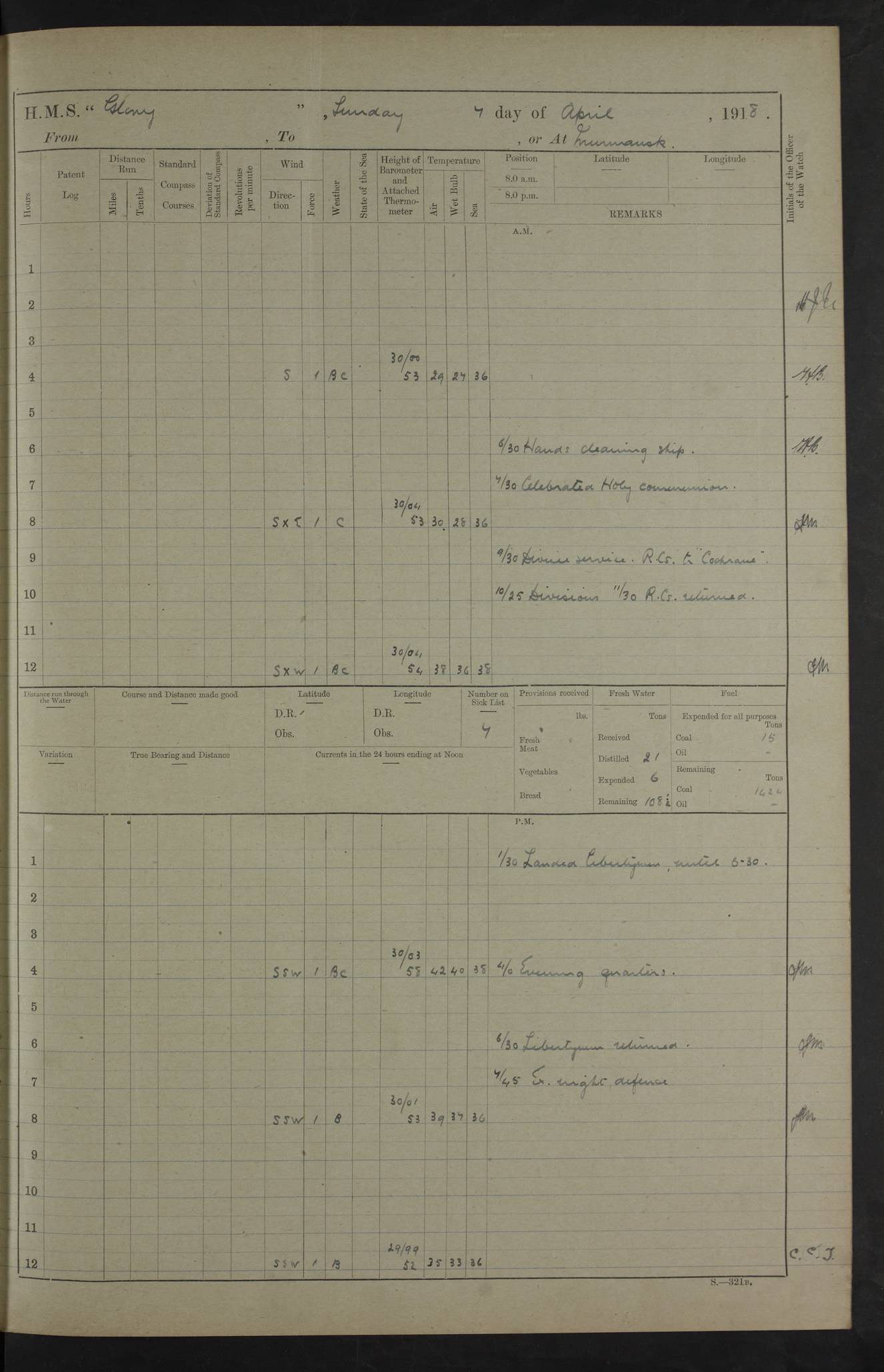 working party left. 4ef4f792e53e0a0c91002c77: (https://s3.amazonaws.com:443/oldweather/ADM53-43039/ADM 53-43039-152_1.jpg) 15 July 1918 Murmansk Lat 69.03, Long 33.05 Number on sick list: 5 6.30am: Hands cleaning ship and hoisting in Askold gear from drifter. 8.15am: Working parties to Nigeria. 11.45am: 1 cot case from SS Westgate. 4.00pm: Carpenters working party from Nigeria. 5.45pm: 1 PO telegraphist joined ship from Alexander. 6.45pm: Libertymen, yacht and Nigeria working parties returned. 4ef4f792e53e0a0c91002c78: (https://s3.amazonaws.com:443/oldweather/ADM53-43039/ADM 53-43039-153_0.jpg) 16 July 1918 Murmansk Lat 69.03, Long 33.05 Number on sick list: 5 1.00am: TBD cast off. 6.00am: Diving party rigging gear. 7.30pm: Engineers working party to yacht. 8.15am: Working parties to Nigeria and diving party. 11.30am: Engineers working party returned from yacht. 2.10pm: Diving party returned. 4.00pm: Read warrant No. 22. 4ef4f792e53e0a0c91002c79: (https://s3.amazonaws.com:443/oldweather/ADM53-43039/ADM 53-43039-153_1.jpg) 17 July 1918 Murmansk Lat 69.03, Long 33.05 Number on sick list: 6 7.30am: Engineers working party left ship. 8.15am: Working parties left ship. One chief armourer joined. 9.40am: Telamous working party left ship. 11.10am: Nigeria working party returned. 1.00pm: Diving party left ship. 1.30pm: Hands employed variously and hoisting in ammunition. 2.50pm: Received 24 bags mail from Chiswick. SS Chiswick was a cargo vessel of 3246 grt, built in 1904 at Henderson & Co., Meadowside, Glasgow. On 2 January, 1919, she ran aground and was wrecked on the northwest point of Kildin Island, a Russian island in the Barents Sea. Details at http://www.wrecksite.eu/wreck.aspx?136644 . 3.10pm: Admiral Kemp and staff rejoined ship. 6.30pm: Yacht working party and libertymen returned. 8.35pm: Diving party returned. 4ef4f792e53e0a0c91002c7a: (https://s3.amazonaws.com:443/oldweather/ADM53-43039/ADM 53-43039-154_0.jpg) 18 July 1918 Murmansk Lat 69.03, Long 33.05 Number on sick list: 7 7.30am: Engineers working party to Alvinia. SS Chiswick alongside. 9.15am: Hands employed getting in stores from Chiswick and as requisite. 10.00am: Ten marines and one yeoman signals from Salvator. 11.00am: Landed Lewis gun section. 1.30pm: hands employed variously and getting in stores and ammunition. 3.40pm: SS Chiswick left. 4.35pm: One cell offender discharged to Ralco. Ralco was a hired trawler of 228 grt, built in 1912 (Admiralty No. 672; Port No. GY.663). Sourced from F.J. Dittmar & J.J. Colledge (1972) – British warships 1914–1919, Ian Allan. 5.30pm: All working parties returned. 6.00pm: Armed guard (18 privates, 2 sergeants) and engineers working party to Askold under Lieutenant Morris RMLI and Engineer Lieutenant Johnson RN. 7.30pm: Port watch landed transporting shell. 7.45pm: 68 marines and Lieutenant Leftwich RMLI rejoined ship. 10.00pm: Port watch returned. 4ef4f792e53e0a0c91002c7b: (https://s3.amazonaws.com:443/oldweather/ADM53-43039/ADM 53-43039-154_1.jpg) 19 July 1918 Murmansk Lat 69.03, Long 33.05 Number on sick list: 8 7.30am: Engineers working party to Alvinia. 8.15am: Nigeria working party left ship. 1.30pm: Shell party left ship. 4.00pm: Read warrants 23 & 24. 5.50pm: Nigeria working party returned. 4.45pm: Staff Paymaster Jenkinson left ship. 4ef4f792e53e0a0c91002c7c: (https://s3.amazonaws.com:443/oldweather/ADM53-43039/ADM 53-43039-155_0.jpg) 20 July 1918 Murmansk Lat 69.03, Long 33.05 Number on sick list: 9 7.30am: Engineers working party to Alvinia. 8.20am: Nigeria’s working party left ship. 11.00am: Working party to Tchesma. 12.20pm: Tchesma working party returned. 1.30pm: Working party to Tchesma. 5.40pm: Tchesma working party returned. 7.00pm: Water boat alongside. 4ef4f792e53e0a0c91002c7d: (https://s3.amazonaws.com:443/oldweather/ADM53-43039/ADM 53-43039-155_1.jpg) 21 July 1918 Murmansk Lat 69.03, Long 33.05 Number on sick list: 9 7.30am: Carpenters working party to Nigeria. 9.30am: Captain’s inspection. 10.15am: Divine Service. 11.45am: Carpenters working party returned. 1.30pm: Working party to Kassala. Water boat left. Kassala was a store carrier of 3825 grt, built in 1897. Sourced from F.J. Dittmar & J.J. Colledge (1972) – British warships 1914–1919, Ian Allan. 3.00pm: Landed ship’s tug of war team. 5.20pm: Working party returned. 8.00pm: 2 marines and stokers to Askold. 9.00pm: 1 marine to Salvator. 4ef4f792e53e0a0c91002c7e: (https://s3.amazonaws.com:443/oldweather/ADM53-43039/ADM 53-43039-156_0.jpg) 22 July 1918 Murmansk Lat 69.03, Long 33.05 Number on sick list: 11 7.30am: Engineers working party to yacht. 8.15am: Nigeria’s working party left. 11.50am: Admiral and staff left for Salvator. 1.30pm: Working party to shore. 5.15pm: Store party returned. 6.30pm: Working parties returned. Landed boxing party. 4ef4f792e53e0a0c91002c7f: (https://s3.amazonaws.com:443/oldweather/ADM53-43039/ADM 53-43039-156_1.jpg) 23 July 1918 Murmansk Lat 69.03, Long 33.05 Number on sick list: 10 7.30am: Engineers working party to Alvinia. 8.15am: Working parties to Nigeria and Kassala. 11.50am: Kassala working party returned. 1.30pm: Landed store party. 5.30pm: Working parties returned. 4ef4f792e53e0a0c91002c80: (https://s3.amazonaws.com:443/oldweather/ADM53-43039/ADM 53-43039-157_0.jpg) 24 July 1918 Murmansk Lat 69.03, Long 33.05 Number on sick list: 11 7.30am: Engineers working party to yacht. 8.15am: Kassala and Nigeria working parties left. 11.55am: Working parties returned. 1.30pm: Hands work main derrick. Out picket boat. 4.00pm: Read warrants 25 and 26. Admiral and staff rejoined ship. 4ef4f792e53e0a0c91002c81: (https://s3.amazonaws.com:443/oldweather/ADM53-43039/ADM 53-43039-157_1.jpg) 25 July 1918 Murmansk Lat 69.03, Long 33.05 Number on sick list: 3 4.00am: TBD left. 6.15am: Askold coaling party left ship. 8.20am: Nigeria and Kassala working parties left. 12 noon: Nigeria and Kassala working parties returned. 1.30pm: Working parties to Askold. 5.00pm: Discharged 2 seamen, 1