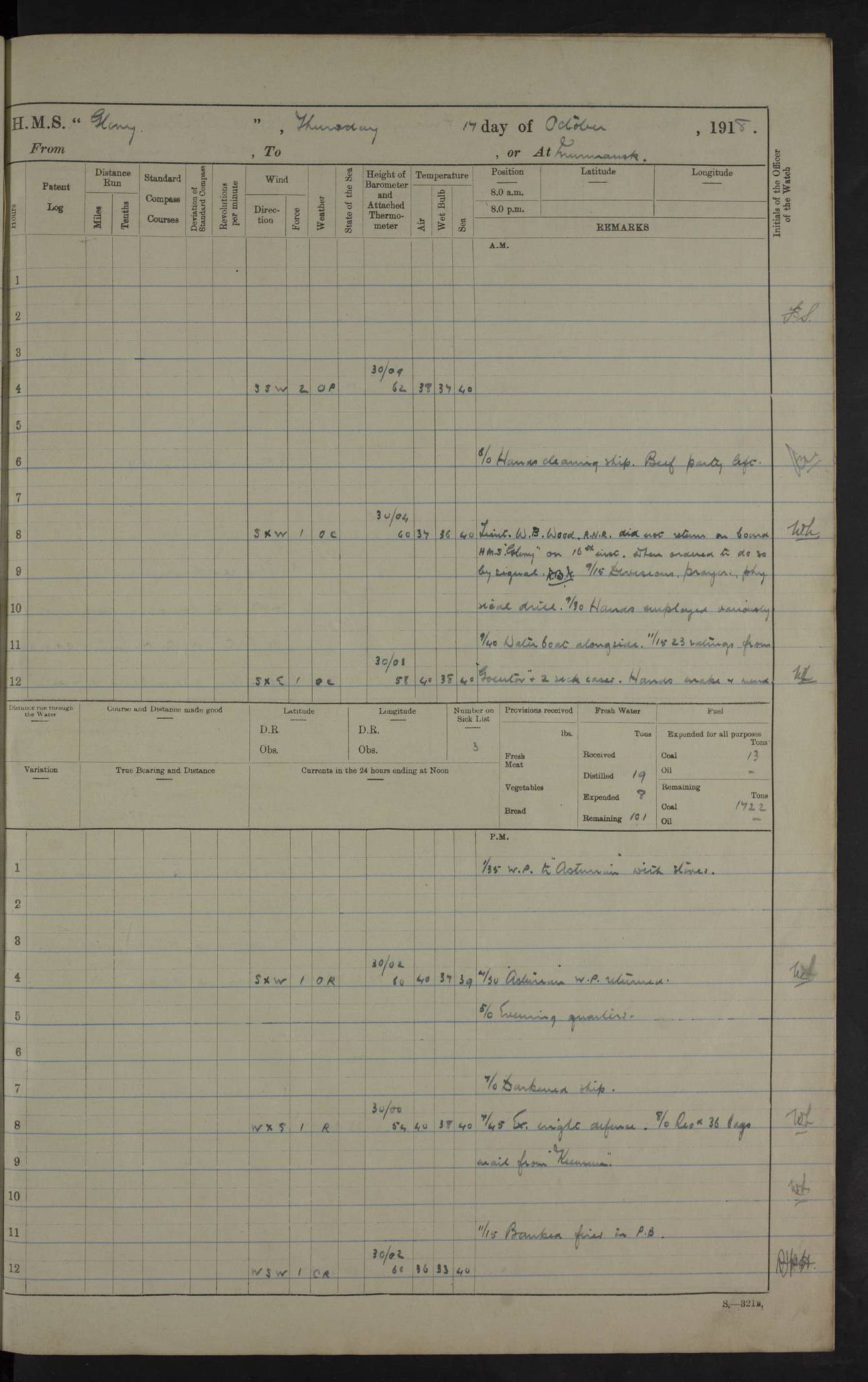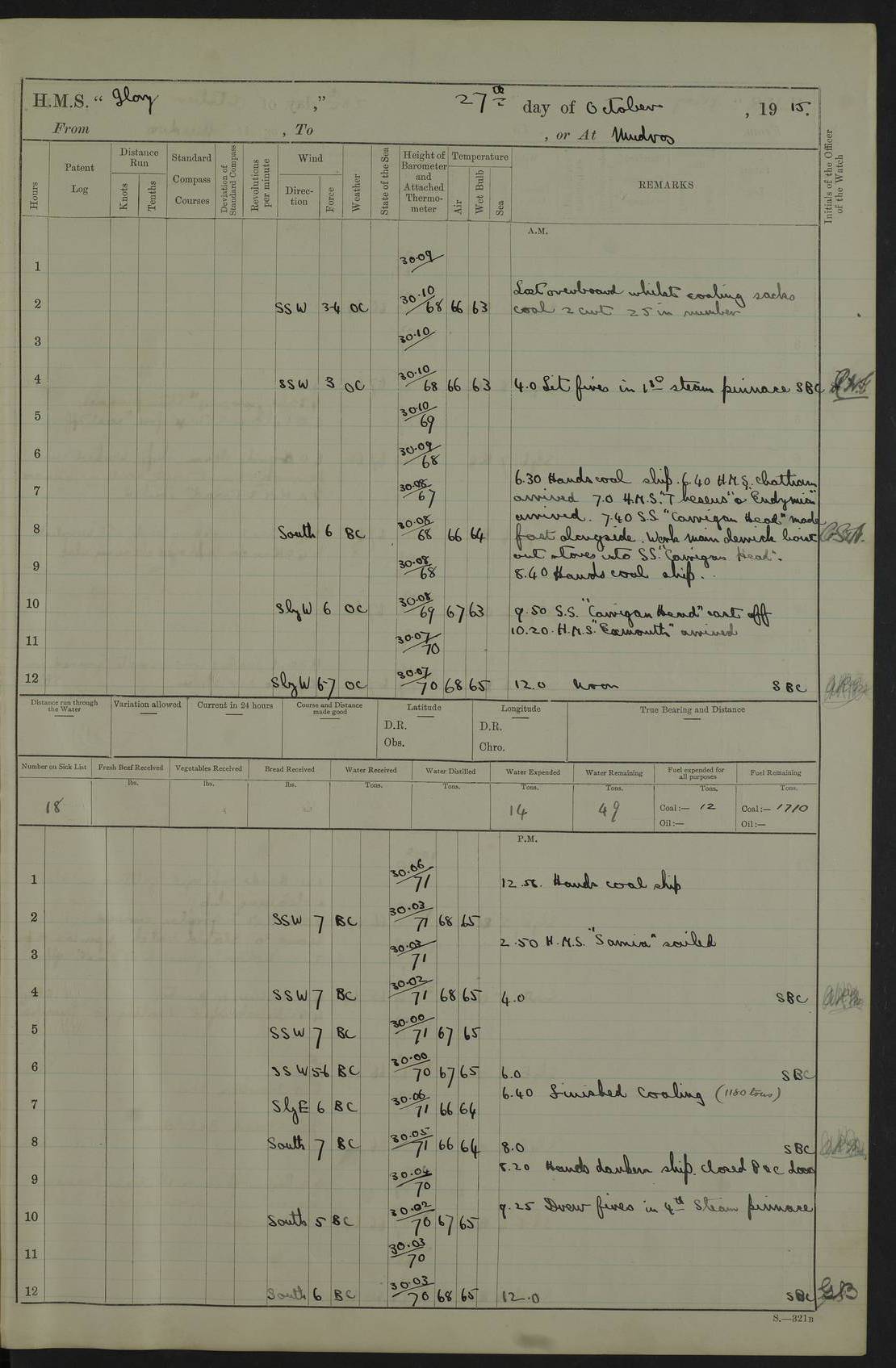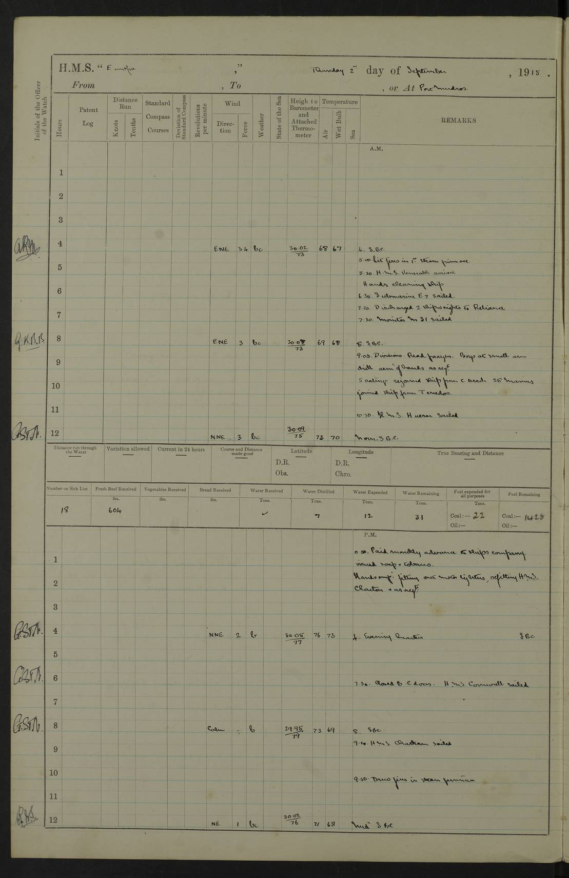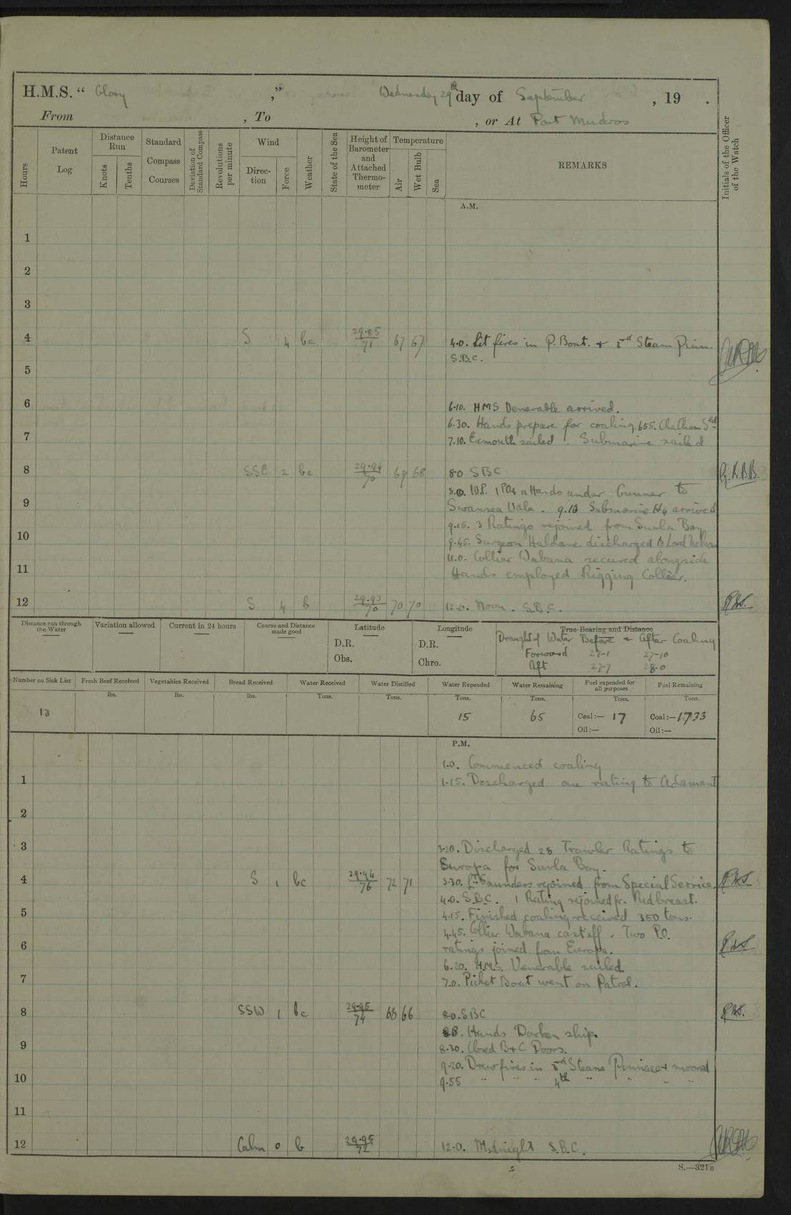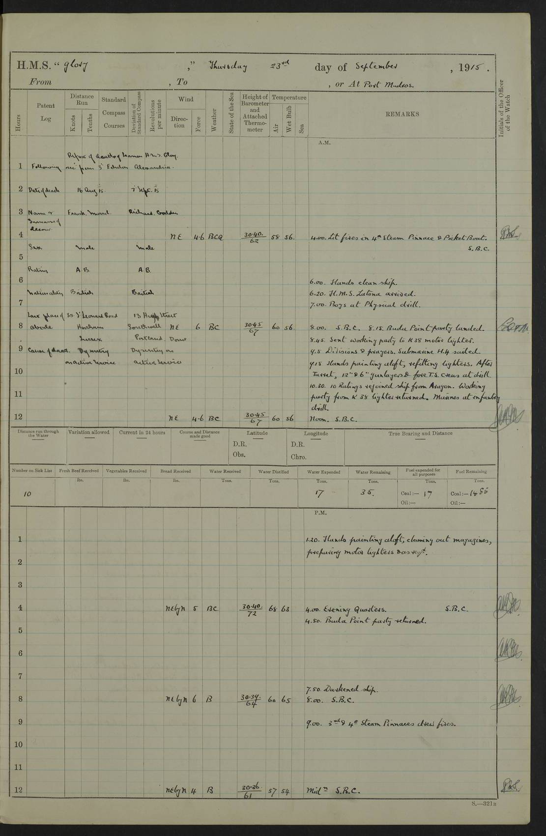 Report of deaths of Seamen HMS Glory Following received from 3rd Echelon(?) Alexandria: Date of death 16 Aug 15 Name Frank Murrell Sex Male Rating AB Nationality British Last place of abode 35 St Leonard Road Horsham Sussex Cause of death Dysentery on active service. The log shows the name as ‘Murrel’. The spelling given here is as at xDKCas1915-08Aug.htm . AB Murrell’s service number was 203155. Date of death 7 Sept 15 Name Richard Godden Sex Male Rating AB Nationality British Last place of abode 13 High Street Southwell Portland Dorset Cause of death Dysentery on active service AB Godden’s service number was 144561. 6.20am: HMS Latona arrived. 8.15am: Buda Point party landed. 8.45am: Sent working party to K38 motor lighter. 9.05am: Submarine H 4 sailed. 10.30am: 10 Ratings rejoined ship from I. Working party from K38 lighter returned. Marines at infantry drill. 4.50pm: Buda Point party returned. 4f73cd7da2fc8ea903001669: (https://s3.amazonaws.com:443/oldweather/ADM53-43018/0013_0.jpg) 24 September 1915 Port Mudros Lat 39.89, Long 25.24 6.45am: Hoisted out Aragon's steam pinnace. 8.30am: Recreation ground party landed. 1.30pm: Tug Kerarnos left ship. Sent steam pinnace and crew to Aragon. 3.45pm: H Submarine arrived. 3.40pm: Submarine E20 arrived. 4.05pm: French submarine arrived. 4.30pm: Discharged 1 Marine to Hospital Ship Gloucester Castle. 6.30pm: 9 ratings discharged to Europa. 6.50pm: French Battleship sailed. 4f73cd7da2fc8ea90300166a: (https://s3.amazonaws.com:443/oldweather/ADM53-43018/0013_1.jpg) 25 September 1915 Port Mudros Lat 39.89, Long 25.24 Number on sick list: 10 6.50am: HMS Endymion arrived. 10.40am: HMS Sentinel and TB29 arrived. Tug Kerarnos left ship for good. 1.20pm: HMS Skirmisher and TB 18 arrived. HMS Sentinel and Skirmisher were sister ships and the only members of their class of Scout cruisers. Both vessels were launched at Vickers, Barrow, in 1905. Sentinel was sold in 1922 and Skirmisher was sold in 1920. Details at http://en.wikipedia.org/wiki/HMS_Sentinel_(1904) and http://en.wikipedia.org/wiki/HMS_Skirmisher_(1905) . 1.30pm: Sent 4 gun wheels to Lancashire landing. 5.00pm: H Submarine came alongside for her gun. 5.10pm: HMS Chatham sailed. 5.15pm: HMS Honeysuckle arrived. 6.20pm: HMS Cornwall sailed. 6.30pm: HMS Raglan sailed. 6.50pm: Picket boat left for patrol. 4f73cd7da2fc8ea90300166b: (https://s3.amazonaws.com:443/oldweather/ADM53-43018/0014_0.jpg) 26 September 1915 Port Mudros Lat 39.89, Long 25.24 Number on sick list: 13 6.30am: French cruiser arrived. Picket boat returned from patrol. 7.15am: HMS Cornwallis sailed. 9.30am: Hands mustered by the Ledger. Sent Roman Catholics to Albion for Divine Service. 11.30am: Submarine sailed. 3.20pm: HMS Bacchante arrived. 5.30pm: Motor lighters K40 and K42 left ship. 7.15pm: Submarine H1 arrived. 8.25pm: HMS Euryalus sailed. 9.00pm: 1 Rating rejoined ship from C beach. 4f73cd7ea2fc8ea90300166c: (https://s3.amazonaws.com:443/oldweather/ADM53-43018/0014_1.jpg) 27 September 1915 Port Mudros Lat 39.89, Long 25.24 6.20am: HMS Chatham arrived. 7.20am: 1 Rating rejoined ship from Hospital. 1.40pm: HMS Exmouth arrived. HMS Exmouth was a pre-dreadnought of the Duncan class, launched in 1901 at Cammell Laird, Birkenhead, and sold in 1920. Details at http://en.wikipedia.org/wiki/HMS_Exmouth_(1901) . 5.55pm: HMS Endymion sailed. Monitor 15 arrived. 6.10pm: HMS Sentinel sailed. 6.35pm: HMS Foresight arrived. HMS Foresight was a scout cruiser of the Forward class, launched in 1904 at Fairfield, Govan, and sold in 1920. Details at http://en.wikipedia.org/wiki/HMS_Foresight_(1904) . 7.10pm: HMS Prince George sailed. 4f73cd7ea2fc8ea90300166d: (https://s3.amazonaws.com:443/oldweather/ADM53-43018/0015_0.jpg) 28 September 1915 Port Mudros Lat 39.89, Long 25.24 6.15am: Ben-My-Chree arrived. 9.00am: One Signal Rating rejoined ship from W Beach. 9.53am: Vice-Admiral de Robeck came on board to inspect ship. 12.30pm: Vice Admiral left ship. pm: Port Watch prepared for coaling and getting in sheet anchor for trawler. 2.30pm: 1 PO Rating rejoined from Exmouth. 3.30 Surgeon Ryan rejoined from Soudan. 6.50pm: One Rating rejoined from Anzac. 6.20pm: HMS Jonquil arrived. 8.50pm: One rating rejoined from W Beach and one Boy joined from Europa. 4f73cd7ea2fc8ea90300166e: (https://s3.amazonaws.com:443/oldweather/ADM53-43018/0015_1.jpg) 29 September 1915 Port Mudros Lat 39.89, Long 25.24 6.10am: HMS Venerable arrived. 6.55am: Chatham sailed. 7.10am: Exmouth sailed. Submarine sailed. 8.00am: Working party 1 PO, 11 Hands under Gunner to Swansea Vale. 9.10am: Submarined H4 arrived. 9.15am: 3 Ratings rejoined from Suvla Bay. 9.45am: Surgeon Haldane discharged to Lord Nelson. 11.00am: Collier Wabama secured alongside. 1.00pm: Commenced coaling. 1.15pm: Discharged one rating to Adamant. 3.20pm: Discharged 28 Trawler Ratings to Europa for Suvla Bay. 3.30pm: Lieutenant Saunders rejoined from Special Service. 4.00pm: 1 Rating rejoined from Redbreast. Redbreast was a fleet messenger of 1313 grt, built in 1908. She was sunk on 15 July, 1917, by UC.38 in the Mediterranean. Sourced from F.J. Dittmar & J.J. Colledge (1972) – British warships 1914–1919, Ian Allan. 4.15pm: Finished coaling received 350 tons. 4.45pm: Collier Wabama cast off. Two PO Ratings joined from Europa. 6.20pm: HMS Venerable sailed. 7.00pm: Picket Boat went on Patrol. 4f73cd7ea2fc8ea90300166f: (https://s3.amazonaws.com:443/oldweather/ADM53-43018/0016_0.jpg) 30 September 1915 Port Mudros Lat 39.89, Long 25.24 6.00am: Hands cleaning ship, embarking stores and ammunition. 6.15am: Picket boat returned from patrol. 6.30am: Swanley made fast alongside. 7.00am: Swansea Vale made fast. 7.30am: TDB Pincher sailed. 8.10am: HMS Rattlesnake sailed. 8.30am: Sent divers and diving party to Aragon. 8.40am: Landed Working Party at Buda Point, hands embarking provisions. 9.55am: Swansea Vale cast off. am: 3rd steam pinnace turned over to HMS Prince Edward. Mr Skuse, Gunner RN discharged to HMS J