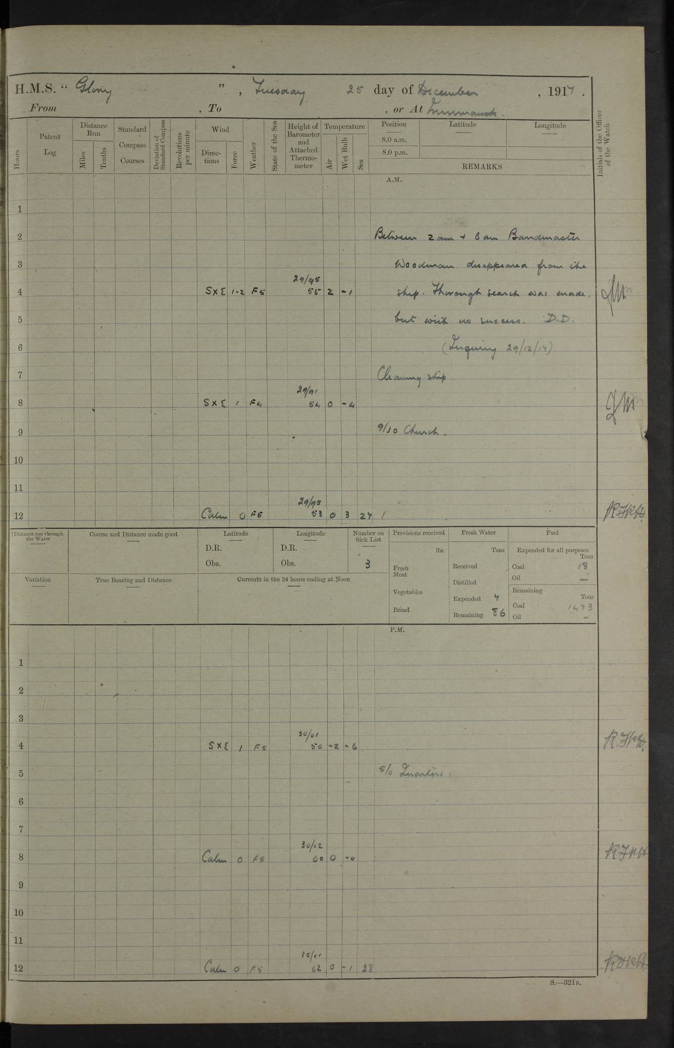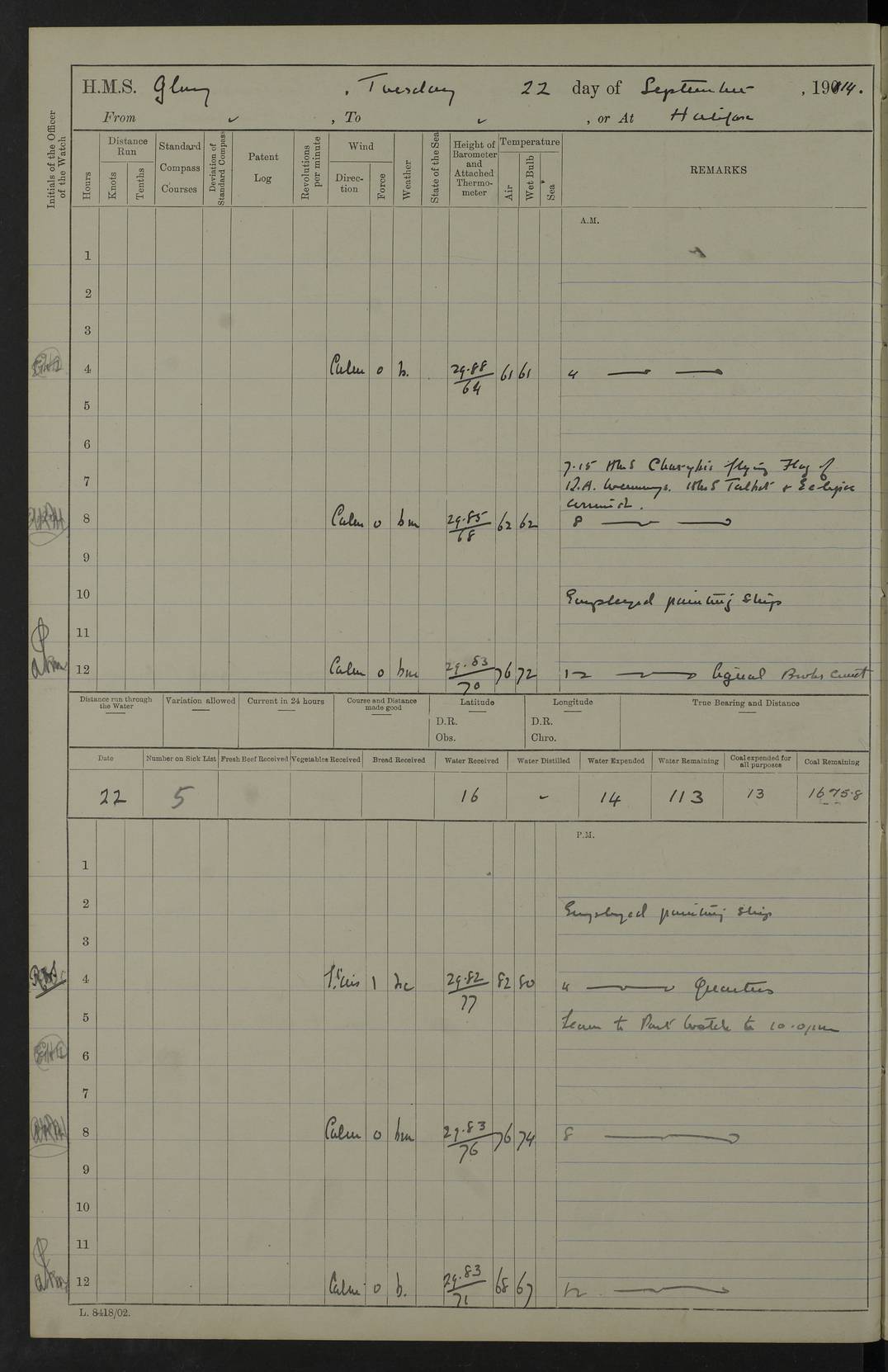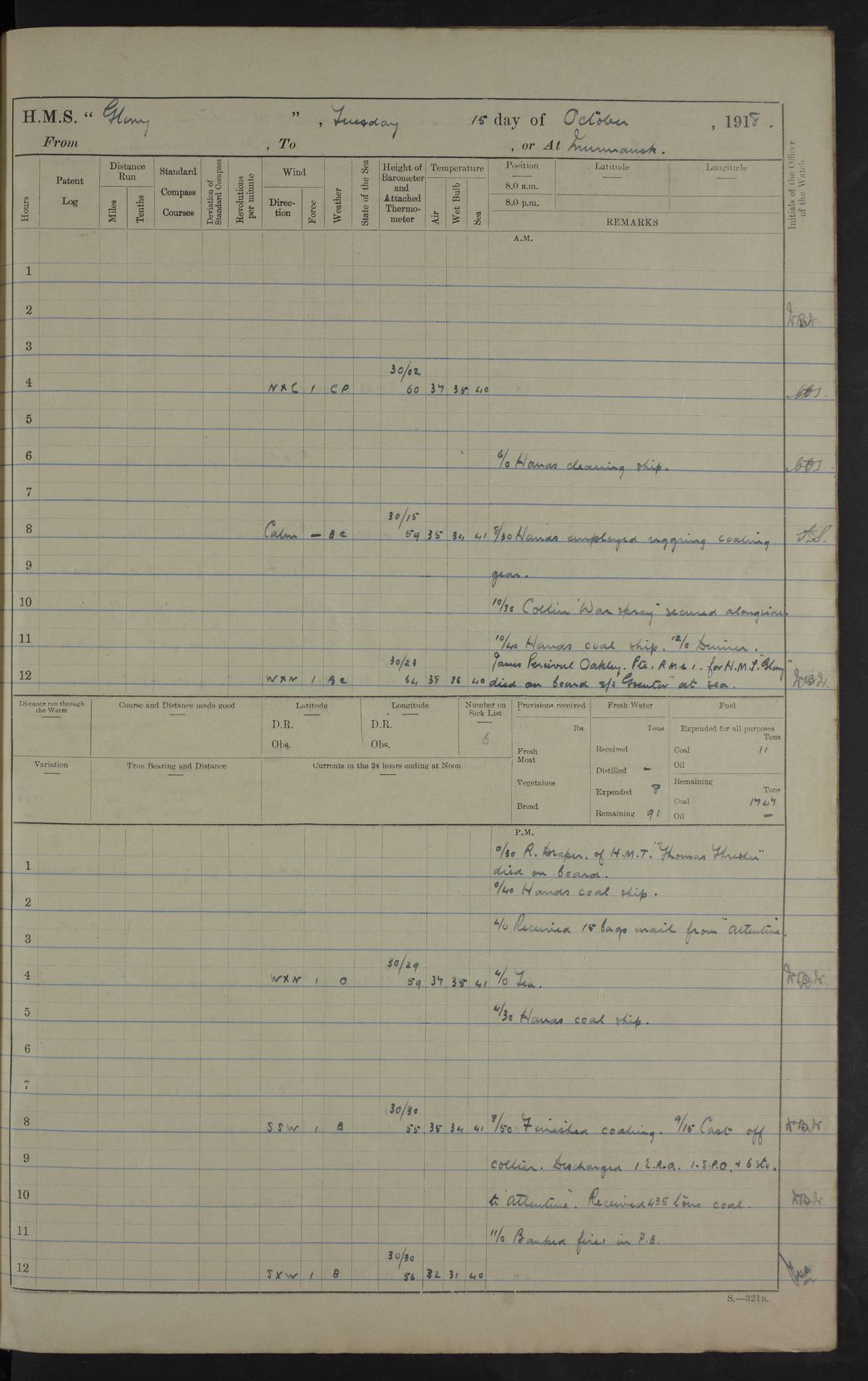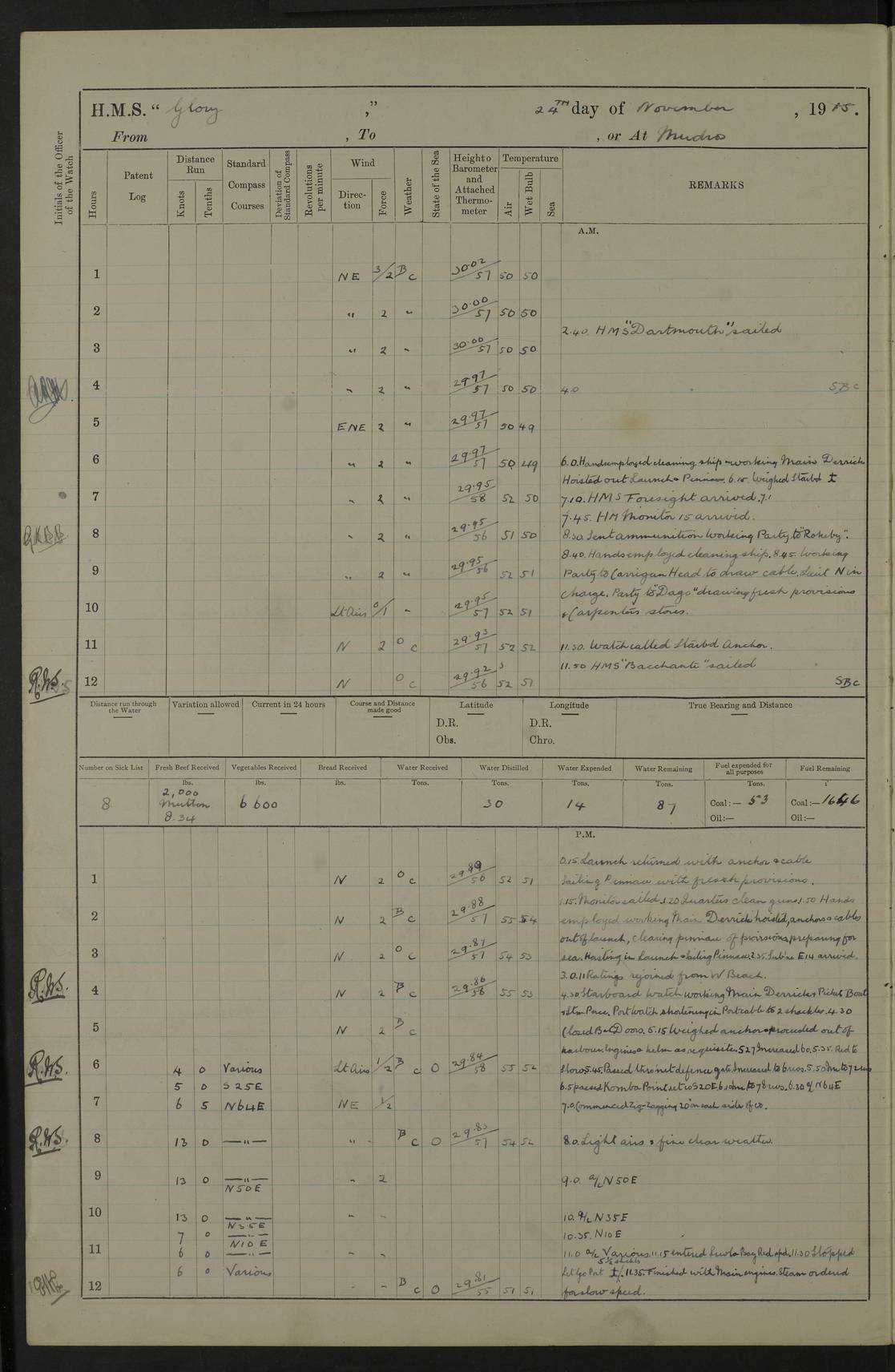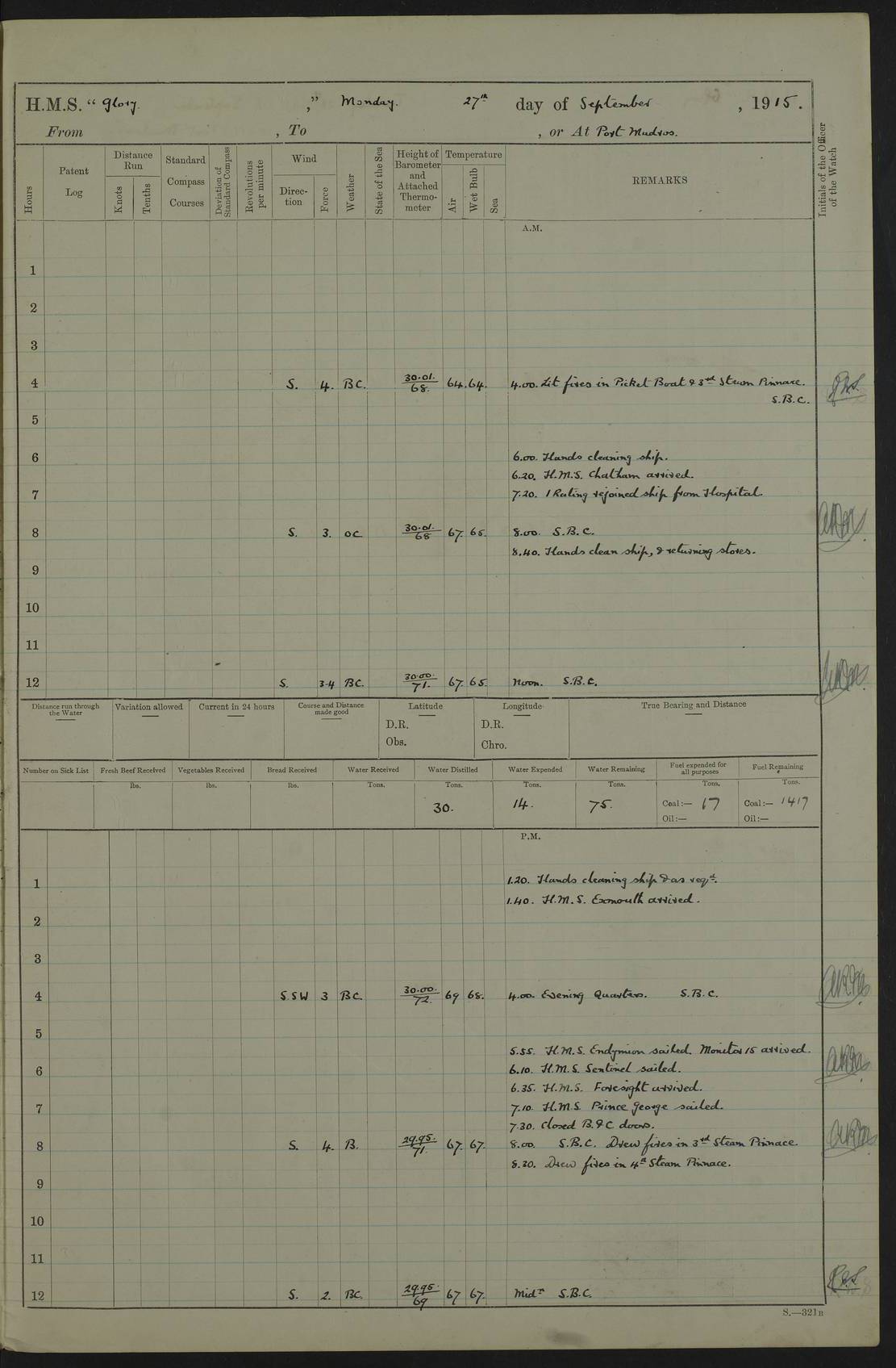 Report of deaths of Seamen HMS Glory Following received from 3rd Echelon(?) Alexandria: Date of death 16 Aug 15 Name Frank Murrell Sex Male Rating AB Nationality British Last place of abode 35 St Leonard Road Horsham Sussex Cause of death Dysentery on active service. The log shows the name as ‘Murrel’. The spelling given here is as at xDKCas1915-08Aug.htm . AB Murrell’s service number was 203155. Date of death 7 Sept 15 Name Richard Godden Sex Male Rating AB Nationality British Last place of abode 13 High Street Southwell Portland Dorset Cause of death Dysentery on active service AB Godden’s service number was 144561. 6.20am: HMS Latona arrived. 8.15am: Buda Point party landed. 8.45am: Sent working party to K38 motor lighter. 9.05am: Submarine H 4 sailed. 10.30am: 10 Ratings rejoined ship from I. Working party from K38 lighter returned. Marines at infantry drill. 4.50pm: Buda Point party returned. 4f73cd7da2fc8ea903001669: (https://s3.amazonaws.com:443/oldweather/ADM53-43018/0013_0.jpg) 24 September 1915 Port Mudros Lat 39.89, Long 25.24 6.45am: Hoisted out Aragon's steam pinnace. 8.30am: Recreation ground party landed. 1.30pm: Tug Kerarnos left ship. Sent steam pinnace and crew to Aragon. 3.45pm: H Submarine arrived. 3.40pm: Submarine E20 arrived. 4.05pm: French submarine arrived. 4.30pm: Discharged 1 Marine to Hospital Ship Gloucester Castle. 6.30pm: 9 ratings discharged to Europa. 6.50pm: French Battleship sailed. 4f73cd7da2fc8ea90300166a: (https://s3.amazonaws.com:443/oldweather/ADM53-43018/0013_1.jpg) 25 September 1915 Port Mudros Lat 39.89, Long 25.24 Number on sick list: 10 6.50am: HMS Endymion arrived. 10.40am: HMS Sentinel and TB29 arrived. Tug Kerarnos left ship for good. 1.20pm: HMS Skirmisher and TB 18 arrived. HMS Sentinel and Skirmisher were sister ships and the only members of their class of Scout cruisers. Both vessels were launched at Vickers, Barrow, in 1905. Sentinel was sold in 1922 and Skirmisher was sold in 1920. Details at http://en.wikipedia.org/wiki/HMS_Sentinel_(1904) and http://en.wikipedia.org/wiki/HMS_Skirmisher_(1905) . 1.30pm: Sent 4 gun wheels to Lancashire landing. 5.00pm: H Submarine came alongside for her gun. 5.10pm: HMS Chatham sailed. 5.15pm: HMS Honeysuckle arrived. 6.20pm: HMS Cornwall sailed. 6.30pm: HMS Raglan sailed. 6.50pm: Picket boat left for patrol. 4f73cd7da2fc8ea90300166b: (https://s3.amazonaws.com:443/oldweather/ADM53-43018/0014_0.jpg) 26 September 1915 Port Mudros Lat 39.89, Long 25.24 Number on sick list: 13 6.30am: French cruiser arrived. Picket boat returned from patrol. 7.15am: HMS Cornwallis sailed. 9.30am: Hands mustered by the Ledger. Sent Roman Catholics to Albion for Divine Service. 11.30am: Submarine sailed. 3.20pm: HMS Bacchante arrived. 5.30pm: Motor lighters K40 and K42 left ship. 7.15pm: Submarine H1 arrived. 8.25pm: HMS Euryalus sailed. 9.00pm: 1 Rating rejoined ship from C beach. 4f73cd7ea2fc8ea90300166c: (https://s3.amazonaws.com:443/oldweather/ADM53-43018/0014_1.jpg) 27 September 1915 Port Mudros Lat 39.89, Long 25.24 6.20am: HMS Chatham arrived. 7.20am: 1 Rating rejoined ship from Hospital. 1.40pm: HMS Exmouth arrived. HMS Exmouth was a pre-dreadnought of the Duncan class, launched in 1901 at Cammell Laird, Birkenhead, and sold in 1920. Details at http://en.wikipedia.org/wiki/HMS_Exmouth_(1901) . 5.55pm: HMS Endymion sailed. Monitor 15 arrived. 6.10pm: HMS Sentinel sailed. 6.35pm: HMS Foresight arrived. HMS Foresight was a scout cruiser of the Forward class, launched in 1904 at Fairfield, Govan, and sold in 1920. Details at http://en.wikipedia.org/wiki/HMS_Foresight_(1904) . 7.10pm: HMS Prince George sailed. 4f73cd7ea2fc8ea90300166d: (https://s3.amazonaws.com:443/oldweather/ADM53-43018/0015_0.jpg) 28 September 1915 Port Mudros Lat 39.89, Long 25.24 6.15am: Ben-My-Chree arrived. 9.00am: One Signal Rating rejoined ship from W Beach. 9.53am: Vice-Admiral de Robeck came on board to inspect ship. 12.30pm: Vice Admiral left ship. pm: Port Watch prepared for coaling and getting in sheet anchor for trawler. 2.30pm: 1 PO Rating rejoined from Exmouth. 3.30 Surgeon Ryan rejoined from Soudan. 6.50pm: One Rating rejoined from Anzac. 6.20pm: HMS Jonquil arrived. 8.50pm: One rating rejoined from W Beach and one Boy joined from Europa. 4f73cd7ea2fc8ea90300166e: (https://s3.amazonaws.com:443/oldweather/ADM53-43018/0015_1.jpg) 29 September 1915 Port Mudros Lat 39.89, Long 25.24 6.10am: HMS Venerable arrived. 6.55am: Chatham sailed. 7.10am: Exmouth sailed. Submarine sailed. 8.00am: Working party 1 PO, 11 Hands under Gunner to Swansea Vale. 9.10am: Submarined H4 arrived. 9.15am: 3 Ratings rejoined from Suvla Bay. 9.45am: Surgeon Haldane discharged to Lord Nelson. 11.00am: Collier Wabama secured alongside. 1.00pm: Commenced coaling. 1.15pm: Discharged one rating to Adamant. 3.20pm: Discharged 28 Trawler Ratings to Europa for Suvla Bay. 3.30pm: Lieutenant Saunders rejoined from Special Service. 4.00pm: 1 Rating rejoined from Redbreast. Redbreast was a fleet messenger of 1313 grt, built in 1908. She was sunk on 15 July, 1917, by UC.38 in the Mediterranean. Sourced from F.J. Dittmar & J.J. Colledge (1972) – British warships 1914–1919, Ian Allan. 4.15pm: Finished coaling received 350 tons. 4.45pm: Collier Wabama cast off. Two PO Ratings joined from Europa. 6.20pm: HMS Venerable sailed. 7.00pm: Picket Boat went on Patrol. 4f73cd7ea2fc8ea90300166f: (https://s3.amazonaws.com:443/oldweather/ADM53-43018/0016_0.jpg) 30 September 1915 Port Mudros Lat 39.89, Long 25.24 6.00am: Hands cleaning ship, embarking stores and ammunition. 6.15am: Picket boat returned from patrol. 6.30am: Swanley made fast alongside. 7.00am: Swansea Vale made fast. 7.30am: TDB Pincher sailed. 8.10am: HMS Rattlesnake sailed. 8.30am: Sent divers and diving party to Aragon. 8.40am: Landed Working Party at Buda Point, hands embarking provisions. 9.55am: Swansea Vale cast off. am: 3rd steam pinnace turned over to HMS Prince Edward. Mr Skuse, Gunner RN discharged to HMS J