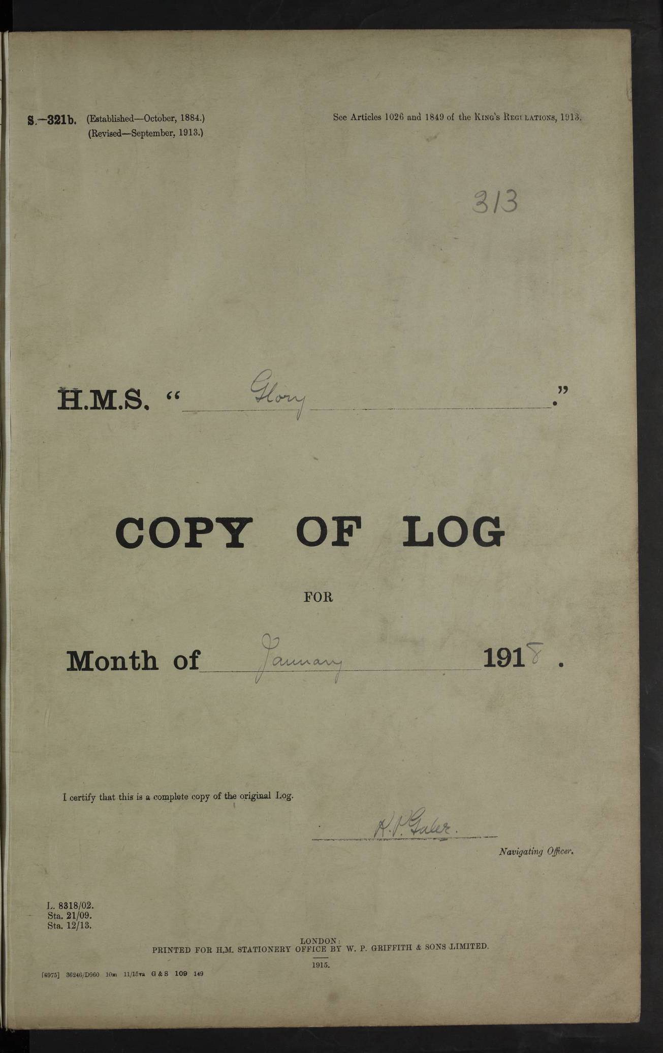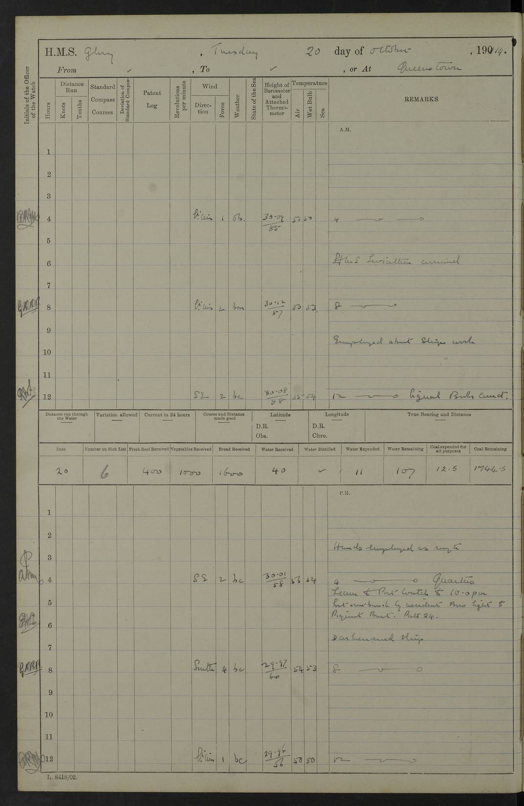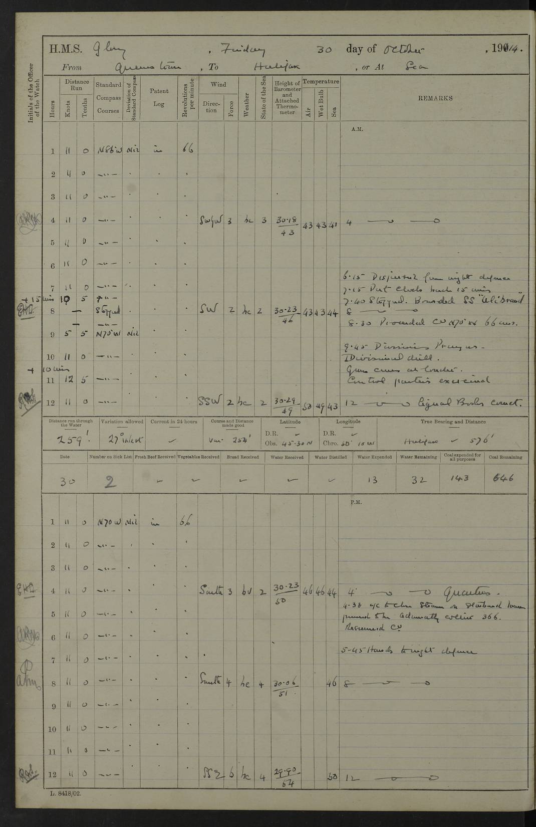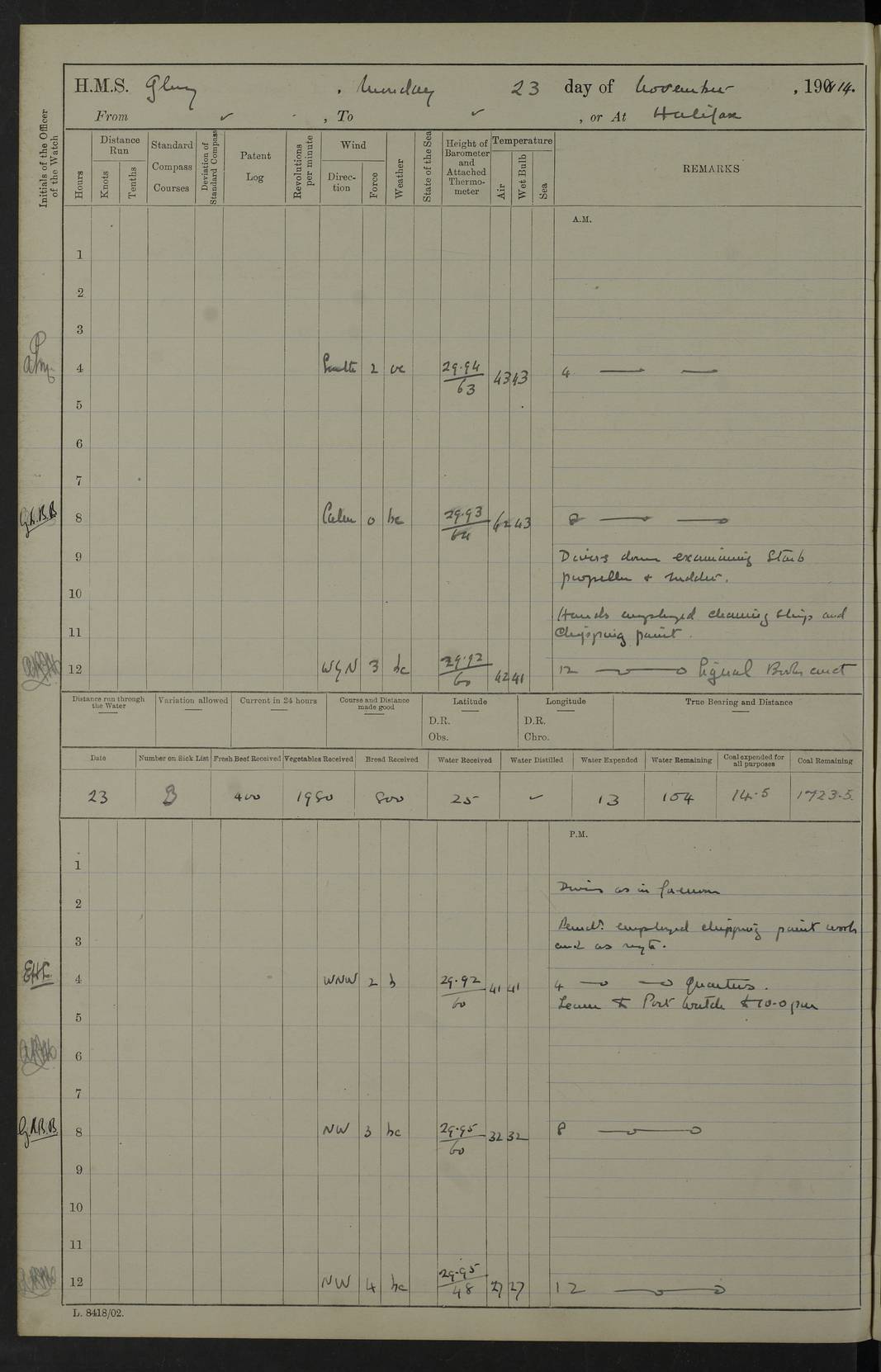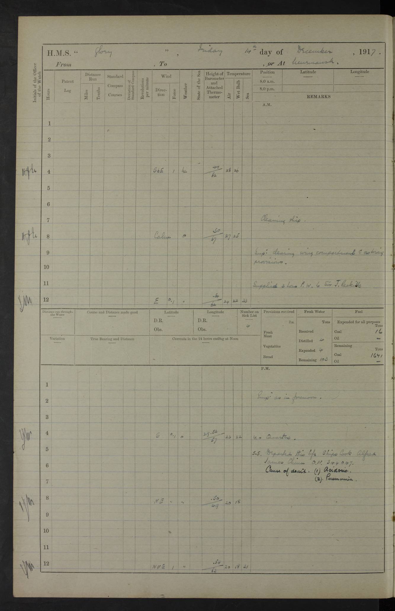 Report of deaths of Seamen HMS Glory Following received from 3rd Echelon(?) Alexandria: Date of death 16 Aug 15 Name Frank Murrell Sex Male Rating AB Nationality British Last place of abode 35 St Leonard Road Horsham Sussex Cause of death Dysentery on active service. The log shows the name as ‘Murrel’. The spelling given here is as at xDKCas1915-08Aug.htm . AB Murrell’s service number was 203155. Date of death 7 Sept 15 Name Richard Godden Sex Male Rating AB Nationality British Last place of abode 13 High Street Southwell Portland Dorset Cause of death Dysentery on active service AB Godden’s service number was 144561. 6.20am: HMS Latona arrived. 8.15am: Buda Point party landed. 8.45am: Sent working party to K38 motor lighter. 9.05am: Submarine H 4 sailed. 10.30am: 10 Ratings rejoined ship from I. Working party from K38 lighter returned. Marines at infantry drill. 4.50pm: Buda Point party returned. 4f73cd7da2fc8ea903001669: (https://s3.amazonaws.com:443/oldweather/ADM53-43018/0013_0.jpg) 24 September 1915 Port Mudros Lat 39.89, Long 25.24 6.45am: Hoisted out Aragon's steam pinnace. 8.30am: Recreation ground party landed. 1.30pm: Tug Kerarnos left ship. Sent steam pinnace and crew to Aragon. 3.45pm: H Submarine arrived. 3.40pm: Submarine E20 arrived. 4.05pm: French submarine arrived. 4.30pm: Discharged 1 Marine to Hospital Ship Gloucester Castle. 6.30pm: 9 ratings discharged to Europa. 6.50pm: French Battleship sailed. 4f73cd7da2fc8ea90300166a: (https://s3.amazonaws.com:443/oldweather/ADM53-43018/0013_1.jpg) 25 September 1915 Port Mudros Lat 39.89, Long 25.24 Number on sick list: 10 6.50am: HMS Endymion arrived. 10.40am: HMS Sentinel and TB29 arrived. Tug Kerarnos left ship for good. 1.20pm: HMS Skirmisher and TB 18 arrived. HMS Sentinel and Skirmisher were sister ships and the only members of their class of Scout cruisers. Both vessels were launched at Vickers, Barrow, in 1905. Sentinel was sold in 1922 and Skirmisher was sold in 1920. Details at http://en.wikipedia.org/wiki/HMS_Sentinel_(1904) and http://en.wikipedia.org/wiki/HMS_Skirmisher_(1905) . 1.30pm: Sent 4 gun wheels to Lancashire landing. 5.00pm: H Submarine came alongside for her gun. 5.10pm: HMS Chatham sailed. 5.15pm: HMS Honeysuckle arrived. 6.20pm: HMS Cornwall sailed. 6.30pm: HMS Raglan sailed. 6.50pm: Picket boat left for patrol. 4f73cd7da2fc8ea90300166b: (https://s3.amazonaws.com:443/oldweather/ADM53-43018/0014_0.jpg) 26 September 1915 Port Mudros Lat 39.89, Long 25.24 Number on sick list: 13 6.30am: French cruiser arrived. Picket boat returned from patrol. 7.15am: HMS Cornwallis sailed. 9.30am: Hands mustered by the Ledger. Sent Roman Catholics to Albion for Divine Service. 11.30am: Submarine sailed. 3.20pm: HMS Bacchante arrived. 5.30pm: Motor lighters K40 and K42 left ship. 7.15pm: Submarine H1 arrived. 8.25pm: HMS Euryalus sailed. 9.00pm: 1 Rating rejoined ship from C beach. 4f73cd7ea2fc8ea90300166c: (https://s3.amazonaws.com:443/oldweather/ADM53-43018/0014_1.jpg) 27 September 1915 Port Mudros Lat 39.89, Long 25.24 6.20am: HMS Chatham arrived. 7.20am: 1 Rating rejoined ship from Hospital. 1.40pm: HMS Exmouth arrived. HMS Exmouth was a pre-dreadnought of the Duncan class, launched in 1901 at Cammell Laird, Birkenhead, and sold in 1920. Details at http://en.wikipedia.org/wiki/HMS_Exmouth_(1901) . 5.55pm: HMS Endymion sailed. Monitor 15 arrived. 6.10pm: HMS Sentinel sailed. 6.35pm: HMS Foresight arrived. HMS Foresight was a scout cruiser of the Forward class, launched in 1904 at Fairfield, Govan, and sold in 1920. Details at http://en.wikipedia.org/wiki/HMS_Foresight_(1904) . 7.10pm: HMS Prince George sailed. 4f73cd7ea2fc8ea90300166d: (https://s3.amazonaws.com:443/oldweather/ADM53-43018/0015_0.jpg) 28 September 1915 Port Mudros Lat 39.89, Long 25.24 6.15am: Ben-My-Chree arrived. 9.00am: One Signal Rating rejoined ship from W Beach. 9.53am: Vice-Admiral de Robeck came on board to inspect ship. 12.30pm: Vice Admiral left ship. pm: Port Watch prepared for coaling and getting in sheet anchor for trawler. 2.30pm: 1 PO Rating rejoined from Exmouth. 3.30 Surgeon Ryan rejoined from Soudan. 6.50pm: One Rating rejoined from Anzac. 6.20pm: HMS Jonquil arrived. 8.50pm: One rating rejoined from W Beach and one Boy joined from Europa. 4f73cd7ea2fc8ea90300166e: (https://s3.amazonaws.com:443/oldweather/ADM53-43018/0015_1.jpg) 29 September 1915 Port Mudros Lat 39.89, Long 25.24 6.10am: HMS Venerable arrived. 6.55am: Chatham sailed. 7.10am: Exmouth sailed. Submarine sailed. 8.00am: Working party 1 PO, 11 Hands under Gunner to Swansea Vale. 9.10am: Submarined H4 arrived. 9.15am: 3 Ratings rejoined from Suvla Bay. 9.45am: Surgeon Haldane discharged to Lord Nelson. 11.00am: Collier Wabama secured alongside. 1.00pm: Commenced coaling. 1.15pm: Discharged one rating to Adamant. 3.20pm: Discharged 28 Trawler Ratings to Europa for Suvla Bay. 3.30pm: Lieutenant Saunders rejoined from Special Service. 4.00pm: 1 Rating rejoined from Redbreast. Redbreast was a fleet messenger of 1313 grt, built in 1908. She was sunk on 15 July, 1917, by UC.38 in the Mediterranean. Sourced from F.J. Dittmar & J.J. Colledge (1972) – British warships 1914–1919, Ian Allan. 4.15pm: Finished coaling received 350 tons. 4.45pm: Collier Wabama cast off. Two PO Ratings joined from Europa. 6.20pm: HMS Venerable sailed. 7.00pm: Picket Boat went on Patrol. 4f73cd7ea2fc8ea90300166f: (https://s3.amazonaws.com:443/oldweather/ADM53-43018/0016_0.jpg) 30 September 1915 Port Mudros Lat 39.89, Long 25.24 6.00am: Hands cleaning ship, embarking stores and ammunition. 6.15am: Picket boat returned from patrol. 6.30am: Swanley made fast alongside. 7.00am: Swansea Vale made fast. 7.30am: TDB Pincher sailed. 8.10am: HMS Rattlesnake sailed. 8.30am: Sent divers and diving party to Aragon. 8.40am: Landed Working Party at Buda Point, hands embarking provisions. 9.55am: Swansea Vale cast off. am: 3rd steam pinnace turned over to HMS Prince Edward. Mr Skuse, Gunner RN discharged to HMS J