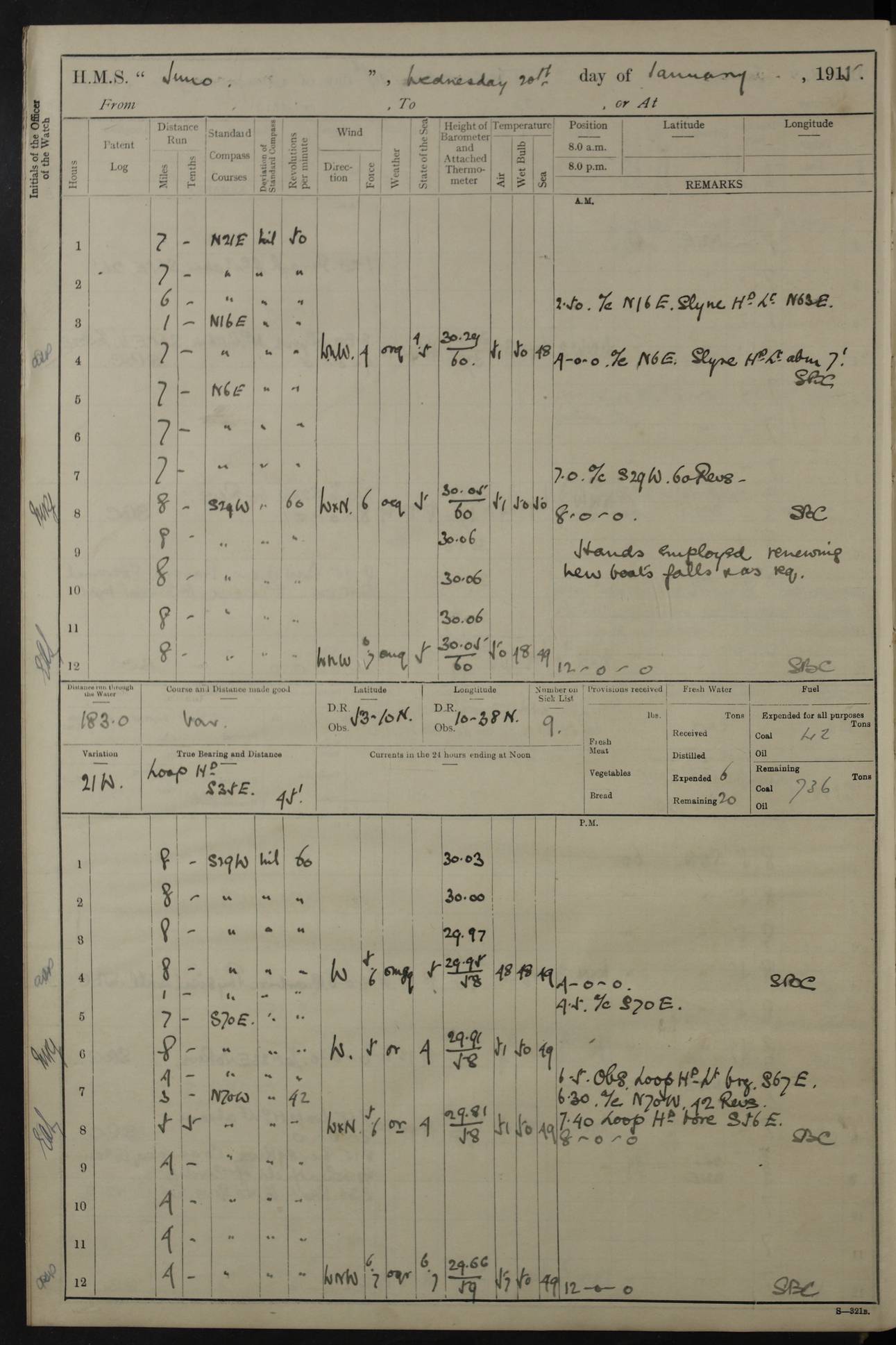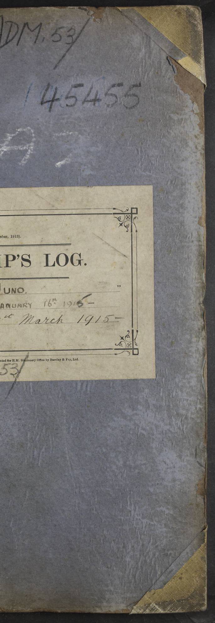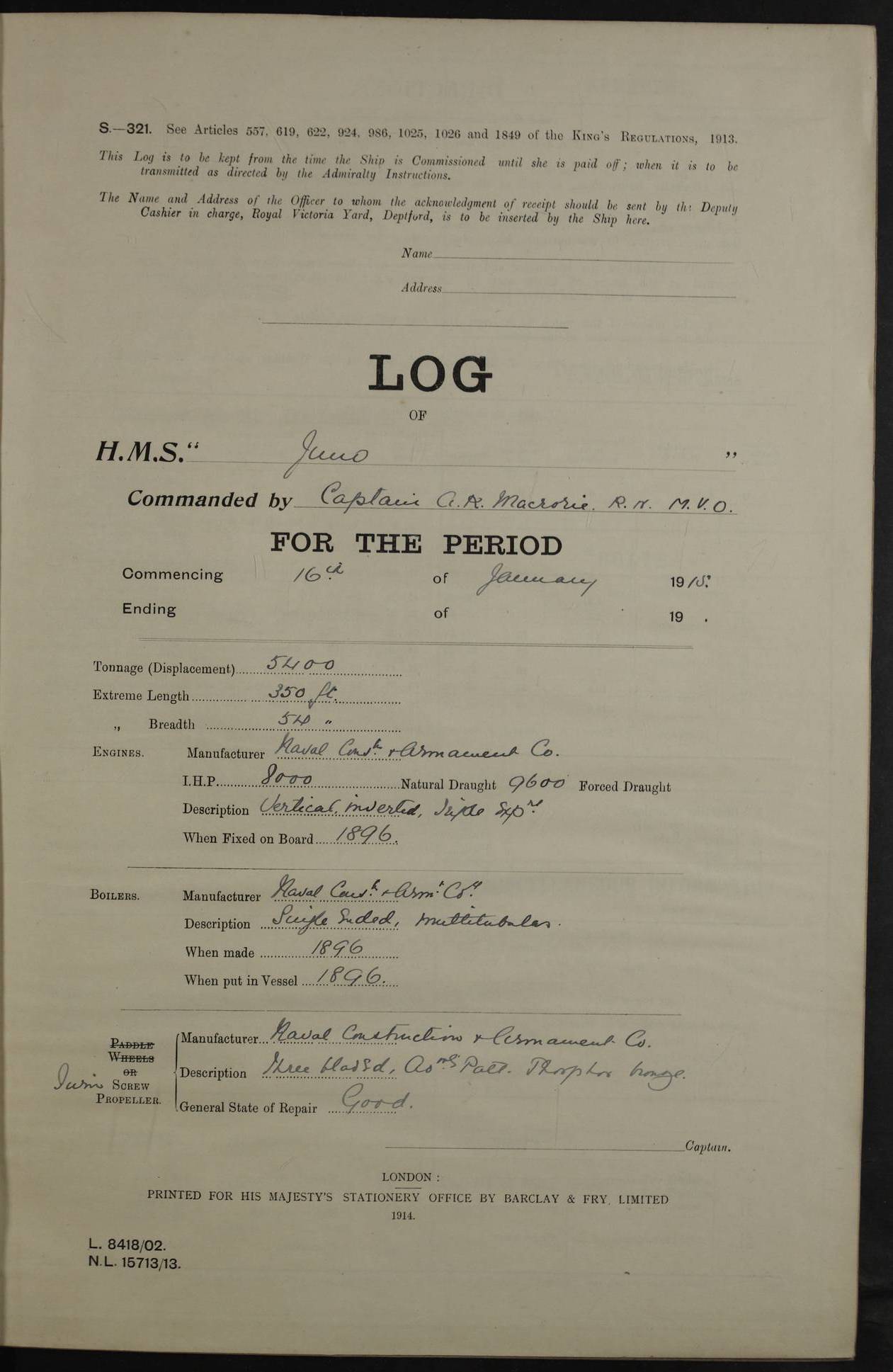 (Maps prepared using Journey Plotter, developed by Maikel. The Plots can only be approximate. They are made by joining-up positions on successive days, and sometimes positions are not given. There will therefore be occasions when the ship appears to have travelled overland) 4ef4f6c9e53e0a0c910022b3: (https://s3.amazonaws.com:443/oldweather/ADM53-45455/0001_0.jpg) 4ef4f6c9e53e0a0c910022b4: (https://s3.amazonaws.com:443/oldweather/ADM53-45455/0001_1.jpg) 4ef4f6c9e53e0a0c910022b5: (https://s3.amazonaws.com:443/oldweather/ADM53-45455/0002_0.jpg) 4ef4f6c9e53e0a0c910022b6: (https://s3.amazonaws.com:443/oldweather/ADM53-45455/0002_1.jpg) 4ef4f6cae53e0a0c910022b7: (https://s3.amazonaws.com:443/oldweather/ADM53-45455/0003_0.jpg) 4ef4f6cae53e0a0c910022b8: (https://s3.amazonaws.com:443/oldweather/ADM53-45455/0003_1.jpg) 4ef4f6cae53e0a0c910022b9: (https://s3.amazonaws.com:443/oldweather/ADM53-45455/0004_0.jpg) 4ef4f6cae53e0a0c910022ba: (https://s3.amazonaws.com:443/oldweather/ADM53-45455/0004_1.jpg) Front page of log book LOG of HMS JUNO Commanded by Captain G. R. Macrorie, RN MVO Commencing 16th January 1915