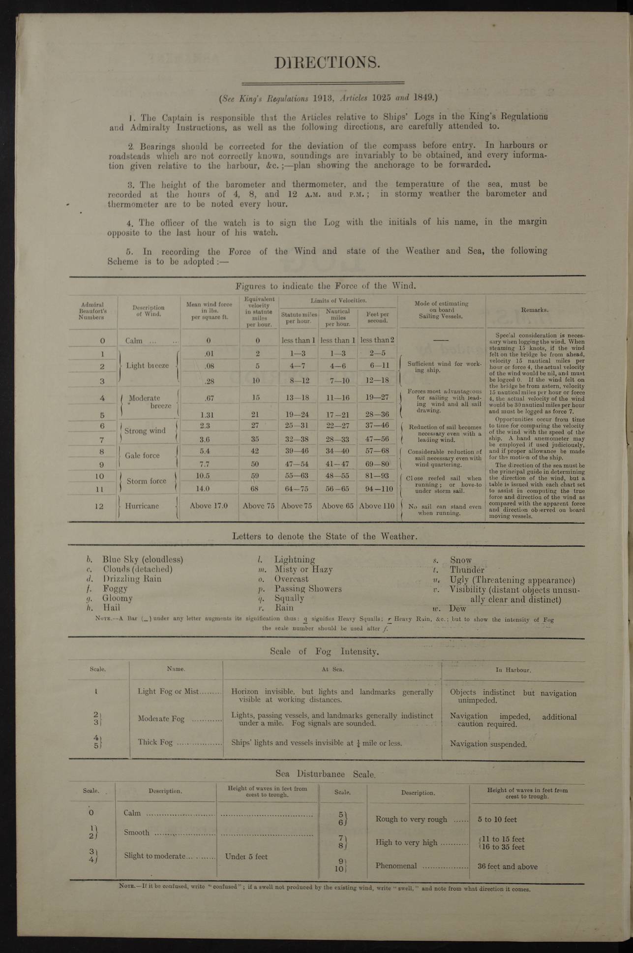Notes: 1. Latitude/longitude, including for days in port, show representative decimal positions for each day, as calculated by the Old Weather project's analysis program. As such, they differ by varying amounts from the positions recorded, usually at noon, in the log pages. In addition, some latitudes/longitudes have been amended in edited logs for errors in the logs, for errors in identifying locations by the analysis program, or simply for greater accuracy. In all cases, refer to the log-page scans for the positions as originally recorded. Not all log pages contain this information and the ships' positions have therefore often been estimated. 2. Full account of any day is available by clicking on the link above that day. Groups of links refer to log book covers and introductory information; some may be blank. Editor’s notes: Items identified in [] and italics are added by the editor. Re Latitude and Longitude. Actual latitude and longitude values where given have been converted to decimal degrees at one significant figure. In a few cases I have added estimated positions as described in the log, using modern digital maps of the area, where it is possible to identify the position. Many locations can be identified with current locations, because they have similar names listed on modern digital maps. Where this is the case I have identified the modern spelling at the first entry of that place name, but kept the spellings as used in the log. I have added the Latitude and Longitude of the location. A few locations mentioned in the logs cannot be found on modern maps or identified with certainty using the maps I have available. Where this is the case I have not attempted to give Latitude and Longitude by estimation from locations on days before and after. |