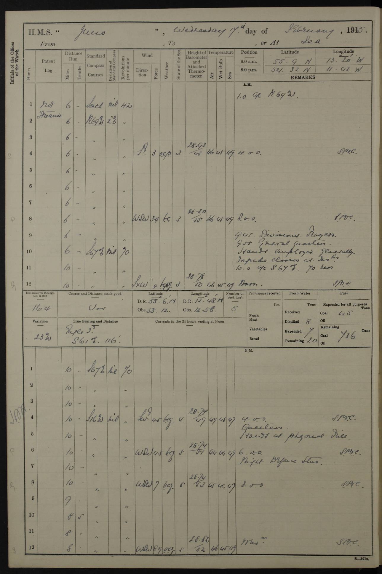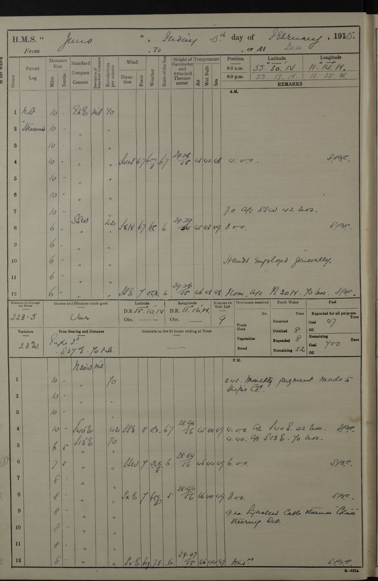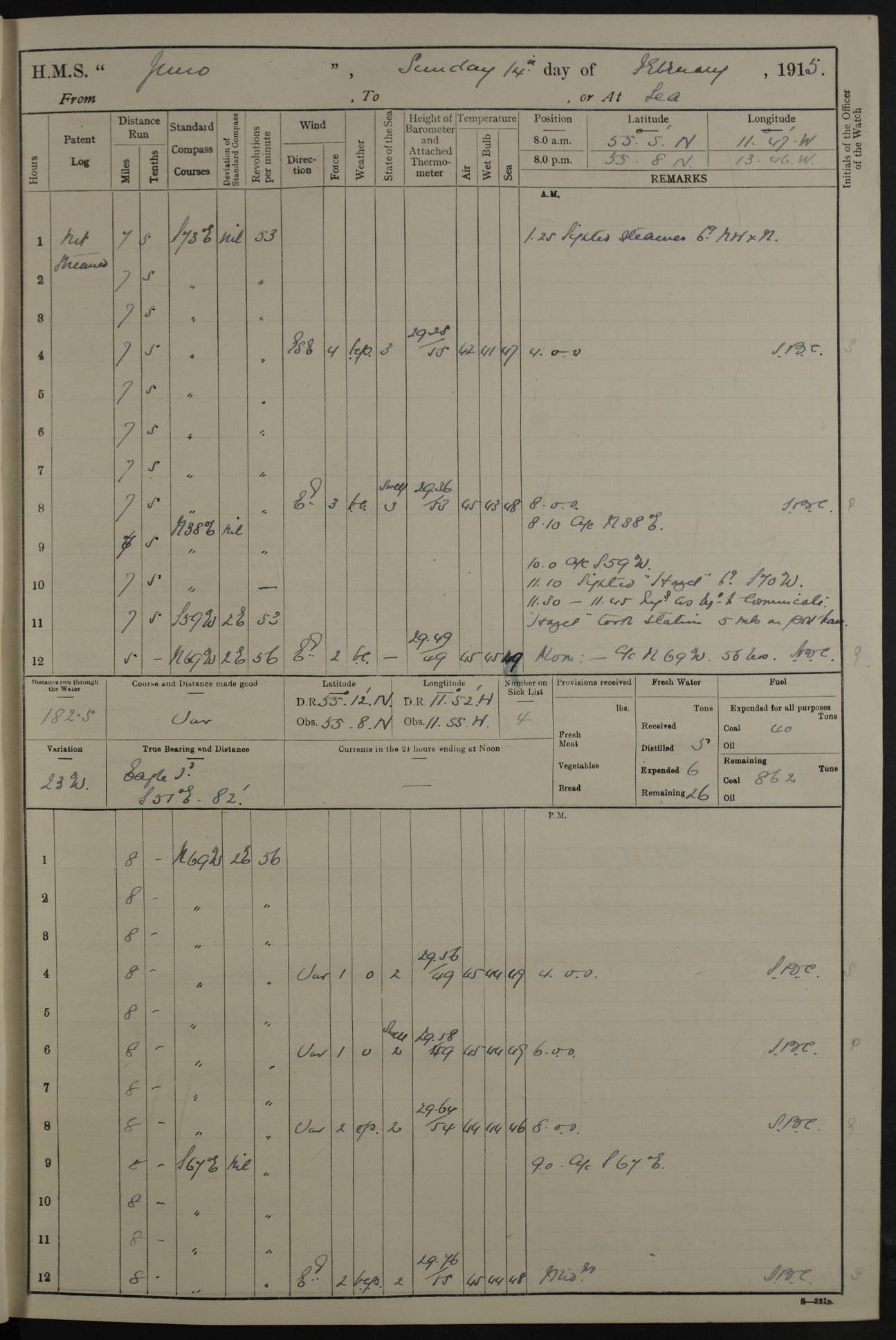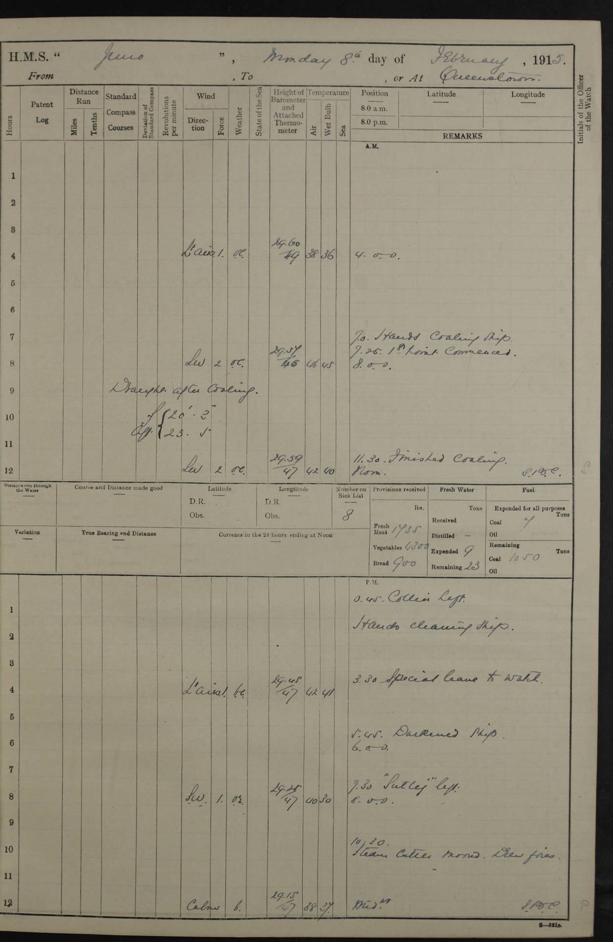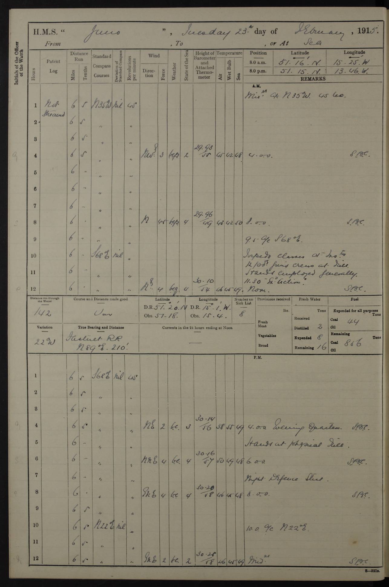 LOG BOOK – JANUARY 16TH 1915 TO FEBRUARY 28TH 1915 LOGS FOR JANUARY 1915 4ef4f6cbe53e0a0c910022bd: (https://s3.amazonaws.com:443/oldweather/ADM53-45455/0006_0.jpg) 16 January 1915 At sea Lat 52.7, Long -11.0 1.20pm: Sighted four funnelled cruiser bearing west Number on sick list = 10 4ef4f6cbe53e0a0c910022be: (https://s3.amazonaws.com:443/oldweather/ADM53-45455/0006_1.jpg) 17 January 1915 At sea Lat 52.9, Long -10.7 2.15pm: Sighted HMS SUTLEJ Starboard beam [HMS SUTLEJ was a Cressy Class armoured cruiser. 2 x 9” guns, launched November 1899] 6.55pm: Observed Glare of Clyne House N31½E Number on sick list = 10 4ef4f6cce53e0a0c910022bf: (https://s3.amazonaws.com:443/oldweather/ADM53-45455/0007_0.jpg) 18 January 1915 At sea Lat 53.2, Long -10.7 5.37am: Black Rock Light N 28E 5.0pm: Passed HMS MONARCH steering North [HMS MONARCH was an Orion Class Battleship launched in March 1911, 10 x 13.5” guns.] Number on sick list = 10 4ef4f6cce53e0a0c910022c0: (https://s3.amazonaws.com:443/oldweather/ADM53-45455/0007_1.jpg) 19 January 1915 At sea Lat 53.1, Long -10.6 1.20am: Sighted Seragh Island Light S65E, 26 miles 7.10pm: Loop Head Light Abeam 8.15am: Course as required to examine SS WHEATFIELD of Cardiff Number in sick list = 10 4ef4f6cce53e0a0c910022c1: (https://s3.amazonaws.com:443/oldweather/ADM53-45455/0008_0.jpg) 20 January 1915 At sea Lat 53.2, Long -10.6 4.0am: Slyne Head Light abeam, 7 miles 7.40pm: Loop Head S56E Number on sick list = 9 4ef4f6cce53e0a0c910022c2: (https://s3.amazonaws.com:443/oldweather/ADM53-45455/0008_1.jpg) 21 January 1915 At sea Lat 52.5, Long -11.4 5.20pm: Tearaght abeam, 17 miles 12.0M: Fastnet Light abeam Number on sick list = 10 4ef4f6cde53e0a0c910022c3: (https://s3.amazonaws.com:443/oldweather/ADM53-45455/0009_0.jpg) 22 January 1915 At sea to Queenstown [Queenstown was the English name for Cobh which is the harbour and port for Cork, Eire] Lat 51.9, Long -8.3 3.55am: Galley Head Light abeam, 10 miles 11.55am: Course as requisite for rounding Bull Rock 12.10pm: Course as requisite for entering Ballingskellig Bay 1.30pm: Stopped engines 1.48pm: Proceeded 8.52pm: Old Head Kinsale Light abeam, 4½ miles 11.10pm: Secured to No 2 buoy Queenstown Number on sick list = 10 4ef4f6cde53e0a0c910022c4: (https://s3.amazonaws.com:443/oldweather/ADM53-45455/0009_1.jpg) 23 January 1915 Queenstown Lat 51.9, Long -8.3 8.40am: Collier POMERAN came alongside, coal ship 9.40am: Discharged two ratings to Haulbowline Hospital Number on sick list = 11 4ef4f6cee53e0a0c910022c5: (https://s3.amazonaws.com:443/oldweather/ADM53-45455/0010_0.jpg) 24 January 1915 Queenstown Lat 51.9, Long -8.3 Number on sick list = 11 4ef4f6cee53e0a0c910022c6: (https://s3.amazonaws.com:443/oldweather/ADM53-45455/0010_1.jpg) 25 January 1915 Queenstown Lat 51.84, Long -8.27 8.15am: HMS ISIS entered harbour & secured to No 8 buoy [HMS ISIS was an Eclipse Class protected cruiser, a sister ship of HMS JUNO] 4.0pm: Read warrants Nos 18, 19 & 20 Number on sick list = 11 4ef4f6cee53e0a0c910022c7: (https://s3.amazonaws.com:443/oldweather/ADM53-45455/0011_0.jpg) 26 January 1915 Queenstown Lat 51.9, Long -8.3 10.0am: ABS HAZEL came up harbour [Auxiliary Boarding Steamer HAZEL (also identified in the logs as HMS HAZEL) was a merchant ship requisitioned by the navy in November 1914 as a fleet auxiliary] Number on sick list = 11 4ef4f6cee53e0a0c910022c8: (https://s3.amazonaws.com:443/oldweather/ADM53-45455/0011_1.jpg) 27 January 1915 Queenstown Lat 51.9, Long -8.3 Number on sick list = 11 4ef4f6cfe53e0a0c910022c9: (https://s3.amazonaws.com:443/oldweather/ADM53-45455/0012_0.jpg) 28 January 1915 Queenstown Lat 51.9, Long -8.3 6.30am: HMS SUTLEJ arrived in port 7.30am: Coal ship Number on sick list = 9 4ef4f6cfe53e0a0c910022ca: (https://s3.amazonaws.com:443/oldweather/ADM53-45455/0012_1.jpg) 29 January 1915 Queenstown and at sea Lat 52.0, Long -10.8 0.20am: Slipped from buoy and proceeded 1.0pm: Passed Roche Point Light 4.10am: Galley Head Light abeam, 8 miles 5.30am: Signalled SS NORWEGIAN steering east 9.0am: Signalled SS HEADLANDS, for Liverpool 12.20pm: Fastnet Light abeam, 5½ miles 2.10pm: Sighted HMS VENUS & communicated [HMS VENUS was an Eclipse Class protected cruiser, a sister ship of HMS JUNO] Number on sick list = 9 4ef4f6cfe53e0a0c910022cb: (https://s3.amazonaws.com:443/oldweather/ADM53-45455/0013_0.jpg) 30 January 1915 At sea Lat 54.6, Long -11.5 Number on sick list = 8 4ef4f6cfe53e0a0c910022cc: (https://s3.amazonaws.com:443/oldweather/ADM53-45455/0013_1.jpg) 31 January 1915 At sea Lat 55.0, Long -12.5 Number on sick list = 8 LOGS FOR FEBRUARY 1915 4ef4f6d0e53e0a0c910022cd: (https://s3.amazonaws.com:443/oldweather/ADM53-45455/0014_0.jpg) 1 February 1915 At sea Lat 55.5, Long -13.0 9.45am: Commenced target practice with 12 pdr battery & DR guns 11.40am: Stopped & hoisted target Number on sick list = 9 4ef4f6d0e53e0a0c910022ce: (https://s3.amazonaws.com:443/oldweather/ADM53-45455/0014_1.jpg) 2 February 1915 At sea Lat 55.3, Long -12.1 Number on sick list = 10 4ef4f6d0e53e0a0c910022cf: (https://s3.amazonaws.com:443/oldweather/ADM53-45455/0015_0.jpg) 3 February 1915 At sea Lat 54.8, Long -12.8 11.0am: Sheet anchor securing chains adrift. Hands employed lashing sheet anchors Washed overboard during gale, Canvas hose No 3 40ft, patt no III. Copper branch pipes No 3 size Number on sick list = 10 4ef4f6d0e53e0a0c910022d0: (https://s3.amazonaws.com:443/oldweather/ADM53-45455/0015_1.jpg) 4 February 1915 At sea Lat 53.6, Long -14.8 10.0am: Hands repairing windsails 5.0pm: Hands employed securing sheet anchors Number on sick list = 9 4ef4f6d1e53e0a0c910022d1: (https://s3.amazonaws.com:443/oldweather/ADM53-45455/0016_0.jpg) 5 February 1915 At sea Lat 55.2, Long -11.2 12.45pm: Monthly payment made to ship's company 9.20pm: Signalled Cable steamer COLONIA, steering SW Number on sick list = 9 4ef4f6d1e53e0a0c910022d2: (https://s3.amazonaws.com:443/oldweather/ADM53-45455/0016_1.jpg) 6 February 1915 At sea Lat 53.4, Long -10.6