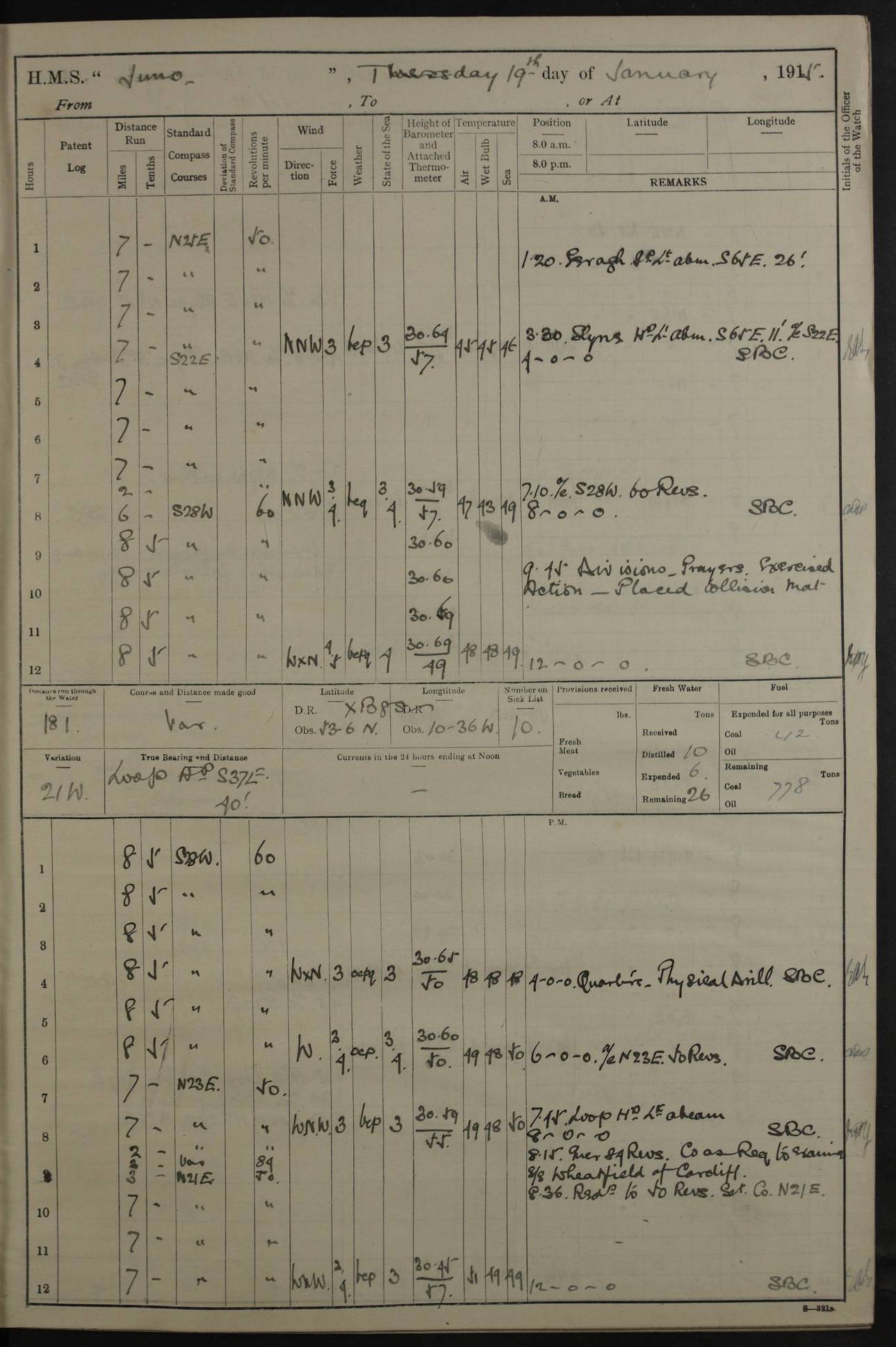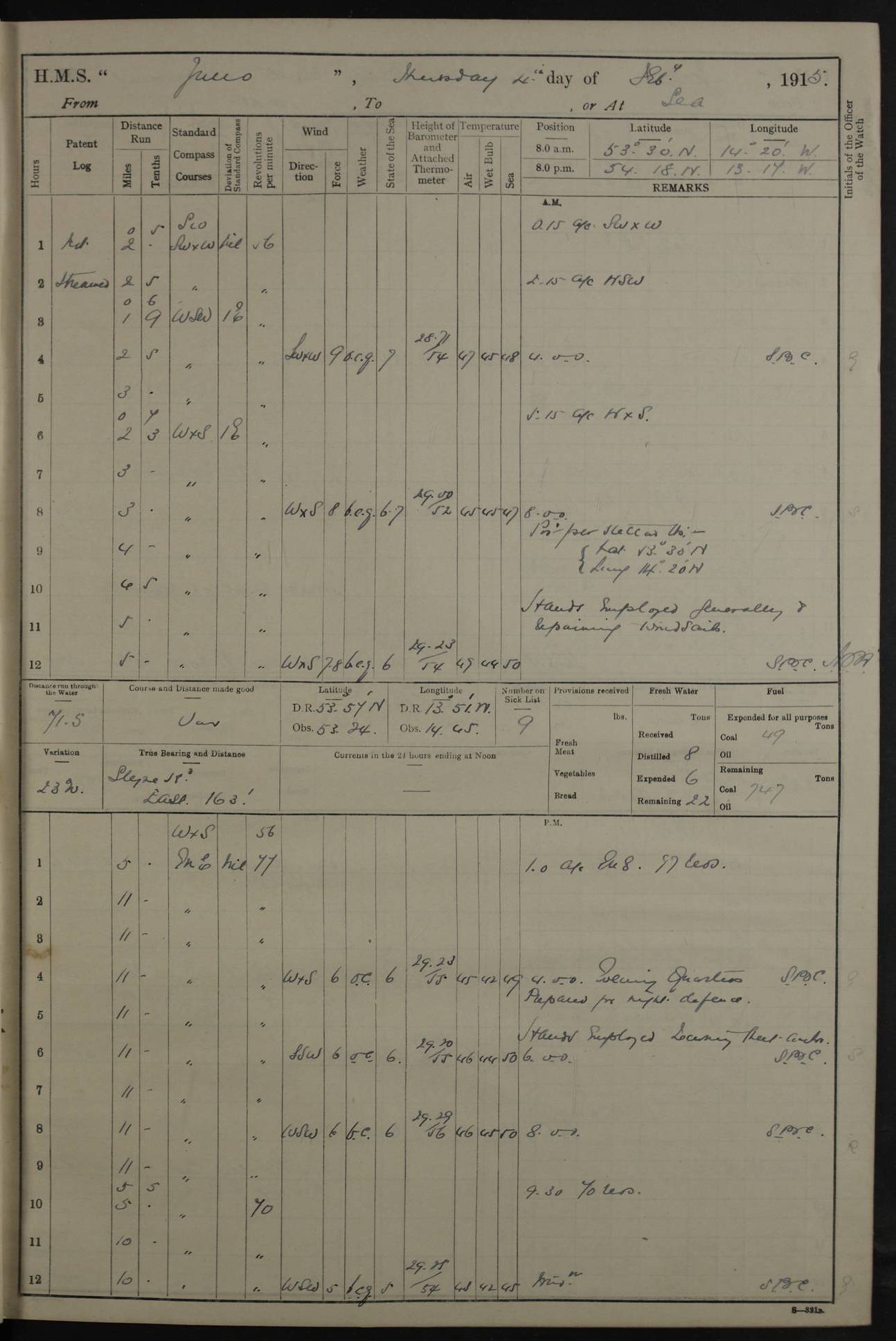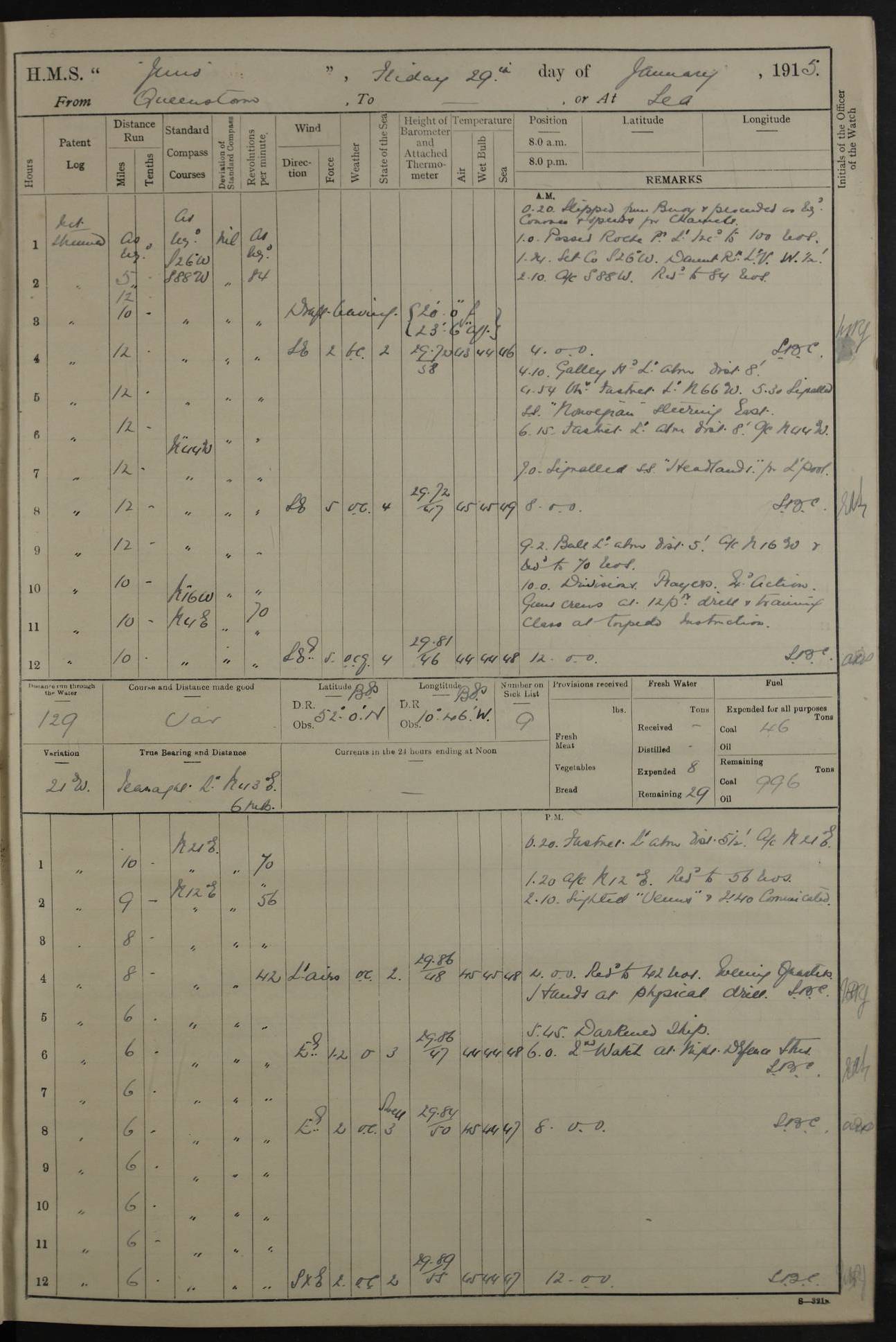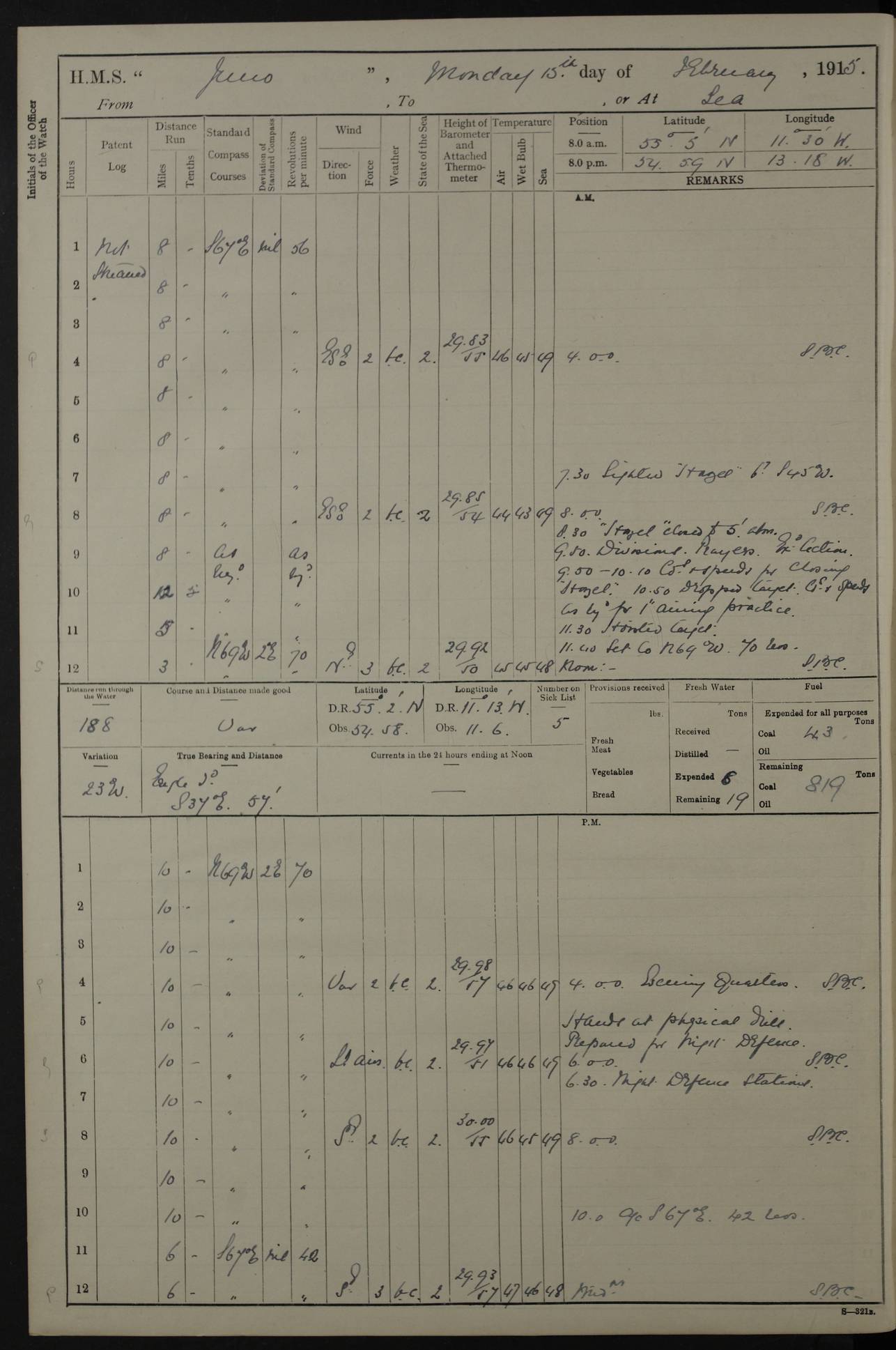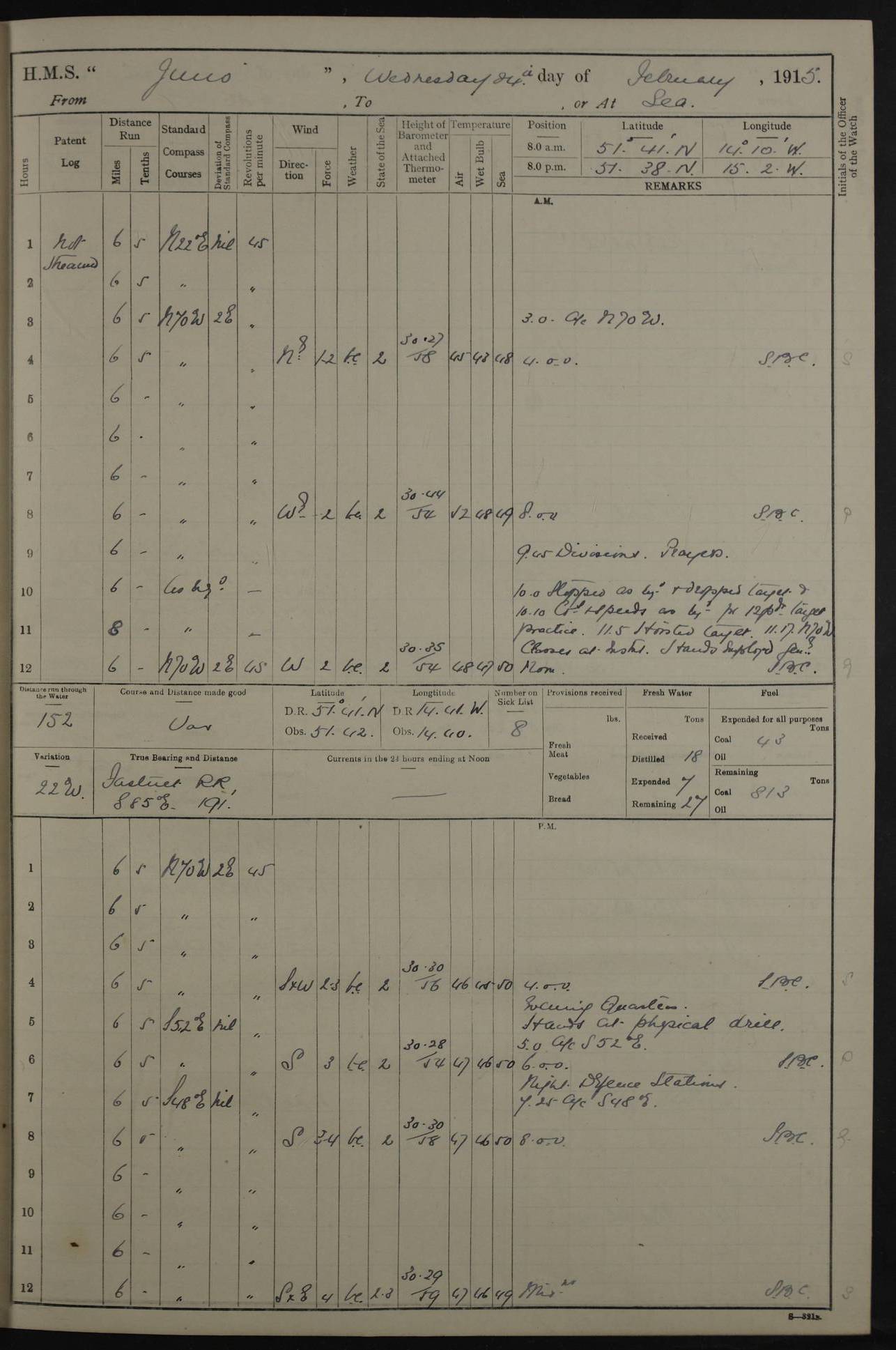 LOG BOOK – JANUARY 16TH 1915 TO FEBRUARY 28TH 1915 LOGS FOR JANUARY 1915 4ef4f6cbe53e0a0c910022bd: (https://s3.amazonaws.com:443/oldweather/ADM53-45455/0006_0.jpg) 16 January 1915 At sea Lat 52.7, Long -11.0 1.20pm: Sighted four funnelled cruiser bearing west Number on sick list = 10 4ef4f6cbe53e0a0c910022be: (https://s3.amazonaws.com:443/oldweather/ADM53-45455/0006_1.jpg) 17 January 1915 At sea Lat 52.9, Long -10.7 2.15pm: Sighted HMS SUTLEJ Starboard beam [HMS SUTLEJ was a Cressy Class armoured cruiser. 2 x 9” guns, launched November 1899] 6.55pm: Observed Glare of Clyne House N31½E Number on sick list = 10 4ef4f6cce53e0a0c910022bf: (https://s3.amazonaws.com:443/oldweather/ADM53-45455/0007_0.jpg) 18 January 1915 At sea Lat 53.2, Long -10.7 5.37am: Black Rock Light N 28E 5.0pm: Passed HMS MONARCH steering North [HMS MONARCH was an Orion Class Battleship launched in March 1911, 10 x 13.5” guns.] Number on sick list = 10 4ef4f6cce53e0a0c910022c0: (https://s3.amazonaws.com:443/oldweather/ADM53-45455/0007_1.jpg) 19 January 1915 At sea Lat 53.1, Long -10.6 1.20am: Sighted Seragh Island Light S65E, 26 miles 7.10pm: Loop Head Light Abeam 8.15am: Course as required to examine SS WHEATFIELD of Cardiff Number in sick list = 10 4ef4f6cce53e0a0c910022c1: (https://s3.amazonaws.com:443/oldweather/ADM53-45455/0008_0.jpg) 20 January 1915 At sea Lat 53.2, Long -10.6 4.0am: Slyne Head Light abeam, 7 miles 7.40pm: Loop Head S56E Number on sick list = 9 4ef4f6cce53e0a0c910022c2: (https://s3.amazonaws.com:443/oldweather/ADM53-45455/0008_1.jpg) 21 January 1915 At sea Lat 52.5, Long -11.4 5.20pm: Tearaght abeam, 17 miles 12.0M: Fastnet Light abeam Number on sick list = 10 4ef4f6cde53e0a0c910022c3: (https://s3.amazonaws.com:443/oldweather/ADM53-45455/0009_0.jpg) 22 January 1915 At sea to Queenstown [Queenstown was the English name for Cobh which is the harbour and port for Cork, Eire] Lat 51.9, Long -8.3 3.55am: Galley Head Light abeam, 10 miles 11.55am: Course as requisite for rounding Bull Rock 12.10pm: Course as requisite for entering Ballingskellig Bay 1.30pm: Stopped engines 1.48pm: Proceeded 8.52pm: Old Head Kinsale Light abeam, 4½ miles 11.10pm: Secured to No 2 buoy Queenstown Number on sick list = 10 4ef4f6cde53e0a0c910022c4: (https://s3.amazonaws.com:443/oldweather/ADM53-45455/0009_1.jpg) 23 January 1915 Queenstown Lat 51.9, Long -8.3 8.40am: Collier POMERAN came alongside, coal ship 9.40am: Discharged two ratings to Haulbowline Hospital Number on sick list = 11 4ef4f6cee53e0a0c910022c5: (https://s3.amazonaws.com:443/oldweather/ADM53-45455/0010_0.jpg) 24 January 1915 Queenstown Lat 51.9, Long -8.3 Number on sick list = 11 4ef4f6cee53e0a0c910022c6: (https://s3.amazonaws.com:443/oldweather/ADM53-45455/0010_1.jpg) 25 January 1915 Queenstown Lat 51.84, Long -8.27 8.15am: HMS ISIS entered harbour & secured to No 8 buoy [HMS ISIS was an Eclipse Class protected cruiser, a sister ship of HMS JUNO] 4.0pm: Read warrants Nos 18, 19 & 20 Number on sick list = 11 4ef4f6cee53e0a0c910022c7: (https://s3.amazonaws.com:443/oldweather/ADM53-45455/0011_0.jpg) 26 January 1915 Queenstown Lat 51.9, Long -8.3 10.0am: ABS HAZEL came up harbour [Auxiliary Boarding Steamer HAZEL (also identified in the logs as HMS HAZEL) was a merchant ship requisitioned by the navy in November 1914 as a fleet auxiliary] Number on sick list = 11 4ef4f6cee53e0a0c910022c8: (https://s3.amazonaws.com:443/oldweather/ADM53-45455/0011_1.jpg) 27 January 1915 Queenstown Lat 51.9, Long -8.3 Number on sick list = 11 4ef4f6cfe53e0a0c910022c9: (https://s3.amazonaws.com:443/oldweather/ADM53-45455/0012_0.jpg) 28 January 1915 Queenstown Lat 51.9, Long -8.3 6.30am: HMS SUTLEJ arrived in port 7.30am: Coal ship Number on sick list = 9 4ef4f6cfe53e0a0c910022ca: (https://s3.amazonaws.com:443/oldweather/ADM53-45455/0012_1.jpg) 29 January 1915 Queenstown and at sea Lat 52.0, Long -10.8 0.20am: Slipped from buoy and proceeded 1.0pm: Passed Roche Point Light 4.10am: Galley Head Light abeam, 8 miles 5.30am: Signalled SS NORWEGIAN steering east 9.0am: Signalled SS HEADLANDS, for Liverpool 12.20pm: Fastnet Light abeam, 5½ miles 2.10pm: Sighted HMS VENUS & communicated [HMS VENUS was an Eclipse Class protected cruiser, a sister ship of HMS JUNO] Number on sick list = 9 4ef4f6cfe53e0a0c910022cb: (https://s3.amazonaws.com:443/oldweather/ADM53-45455/0013_0.jpg) 30 January 1915 At sea Lat 54.6, Long -11.5 Number on sick list = 8 4ef4f6cfe53e0a0c910022cc: (https://s3.amazonaws.com:443/oldweather/ADM53-45455/0013_1.jpg) 31 January 1915 At sea Lat 55.0, Long -12.5 Number on sick list = 8 LOGS FOR FEBRUARY 1915 4ef4f6d0e53e0a0c910022cd: (https://s3.amazonaws.com:443/oldweather/ADM53-45455/0014_0.jpg) 1 February 1915 At sea Lat 55.5, Long -13.0 9.45am: Commenced target practice with 12 pdr battery & DR guns 11.40am: Stopped & hoisted target Number on sick list = 9 4ef4f6d0e53e0a0c910022ce: (https://s3.amazonaws.com:443/oldweather/ADM53-45455/0014_1.jpg) 2 February 1915 At sea Lat 55.3, Long -12.1 Number on sick list = 10 4ef4f6d0e53e0a0c910022cf: (https://s3.amazonaws.com:443/oldweather/ADM53-45455/0015_0.jpg) 3 February 1915 At sea Lat 54.8, Long -12.8 11.0am: Sheet anchor securing chains adrift. Hands employed lashing sheet anchors Washed overboard during gale, Canvas hose No 3 40ft, patt no III. Copper branch pipes No 3 size Number on sick list = 10 4ef4f6d0e53e0a0c910022d0: (https://s3.amazonaws.com:443/oldweather/ADM53-45455/0015_1.jpg) 4 February 1915 At sea Lat 53.6, Long -14.8 10.0am: Hands repairing windsails 5.0pm: Hands employed securing sheet anchors Number on sick list = 9 4ef4f6d1e53e0a0c910022d1: (https://s3.amazonaws.com:443/oldweather/ADM53-45455/0016_0.jpg) 5 February 1915 At sea Lat 55.2, Long -11.2 12.45pm: Monthly payment made to ship's company 9.20pm: Signalled Cable steamer COLONIA, steering SW Number on sick list = 9 4ef4f6d1e53e0a0c910022d2: (https://s3.amazonaws.com:443/oldweather/ADM53-45455/0016_1.jpg) 6 February 1915 At sea Lat 53.4, Long -10.6