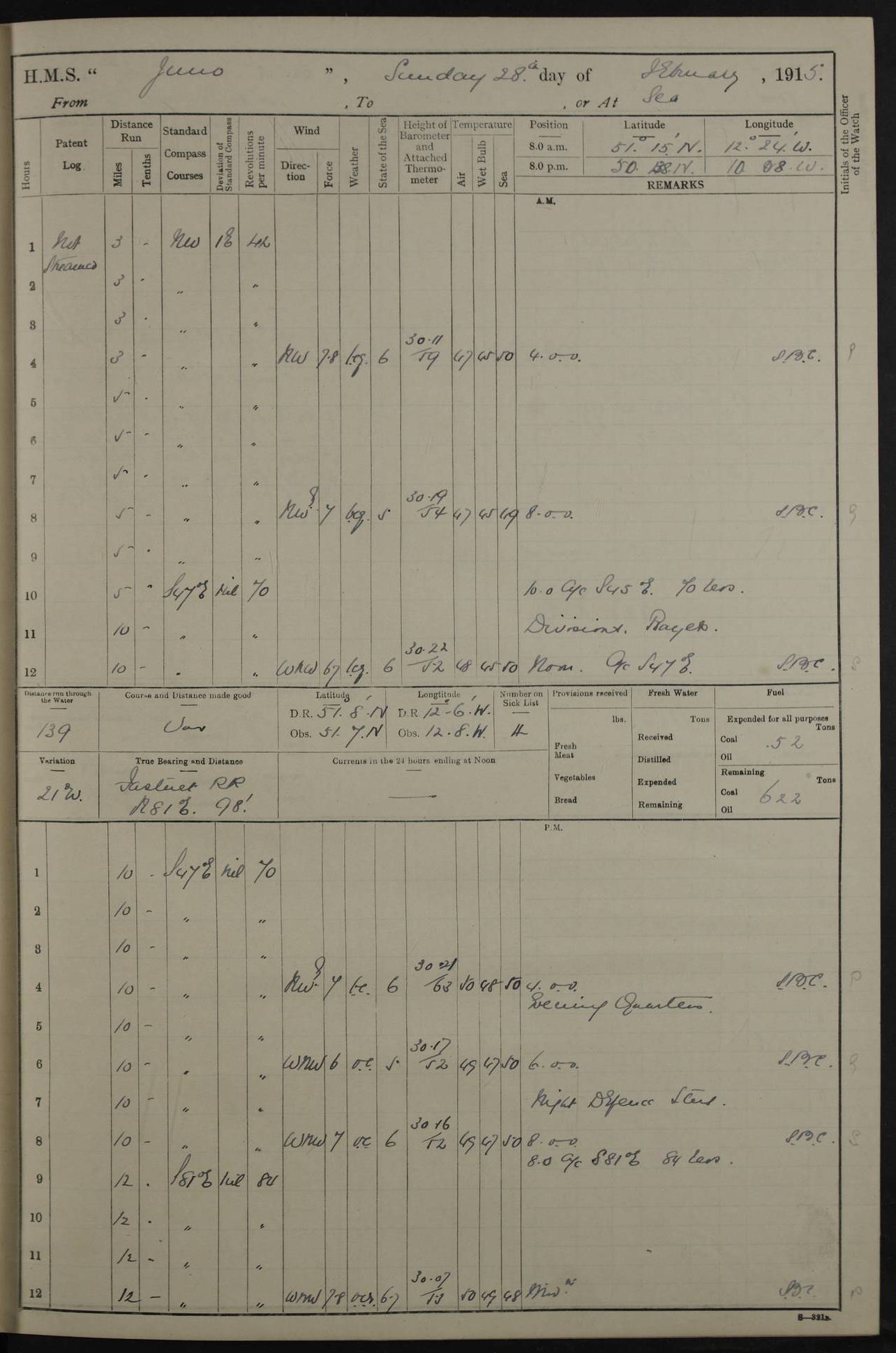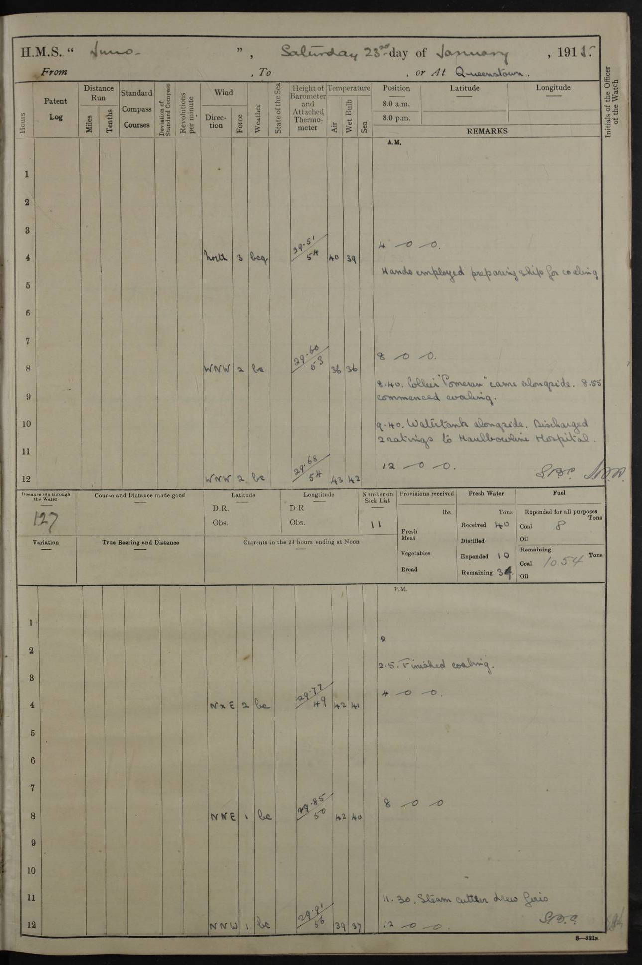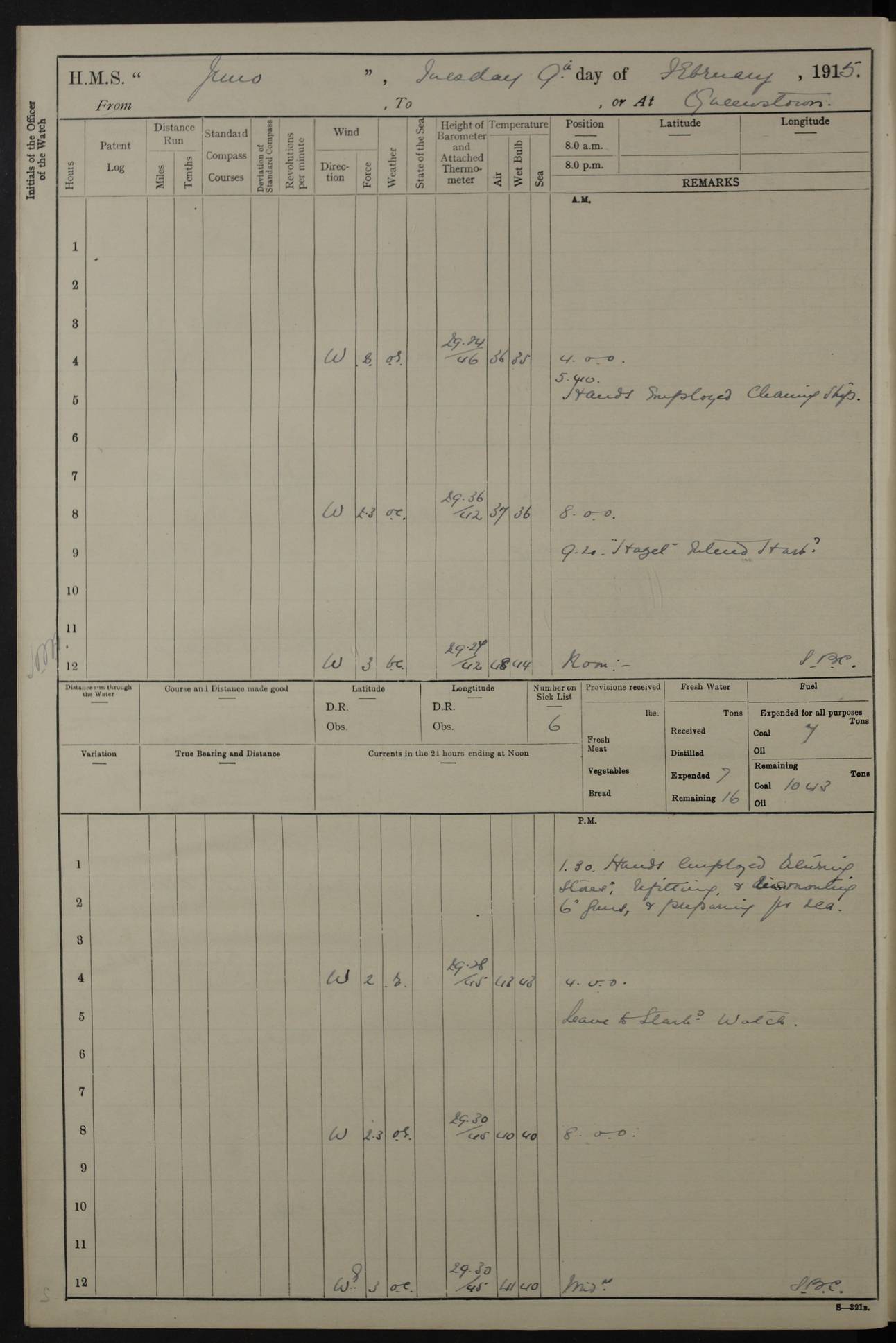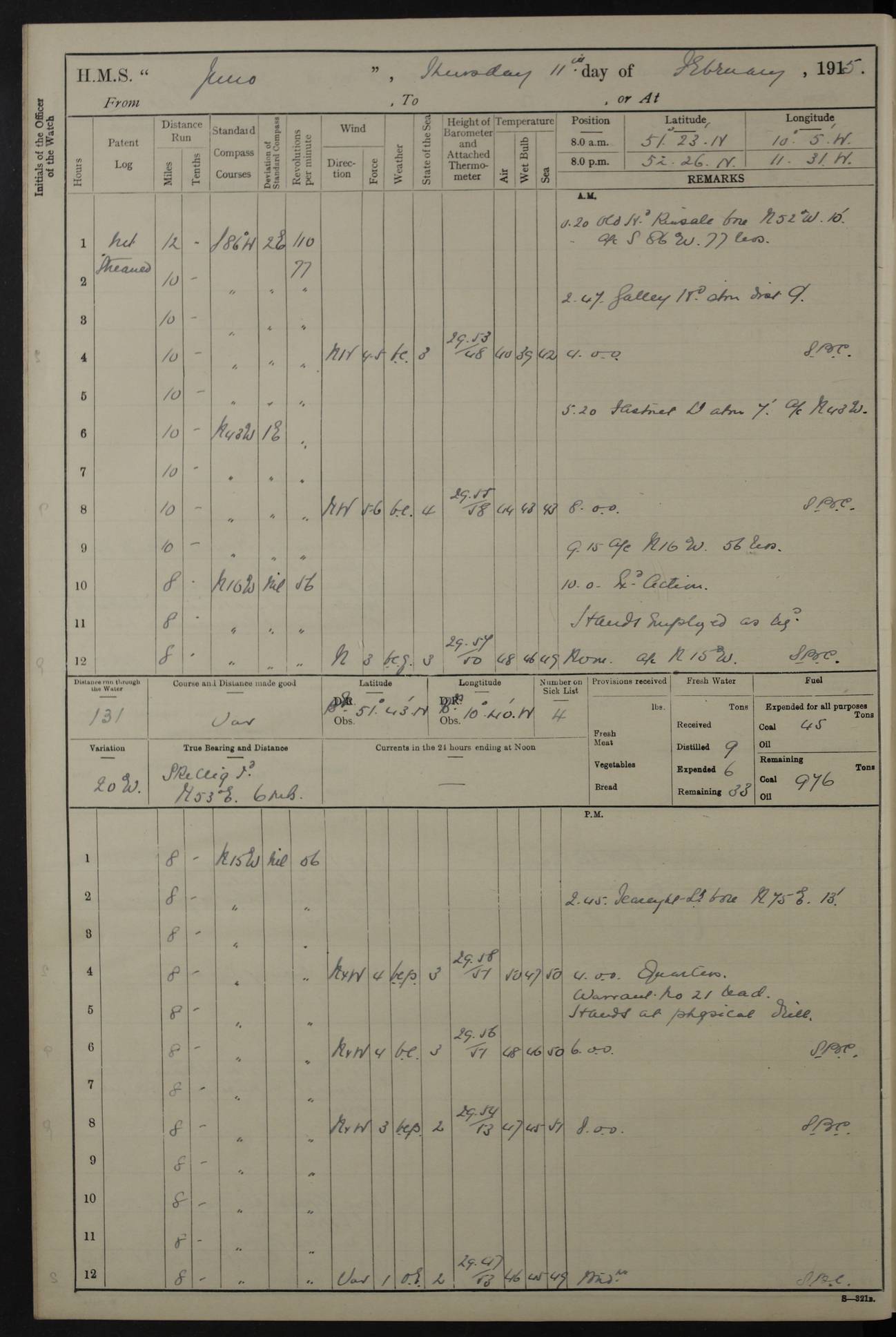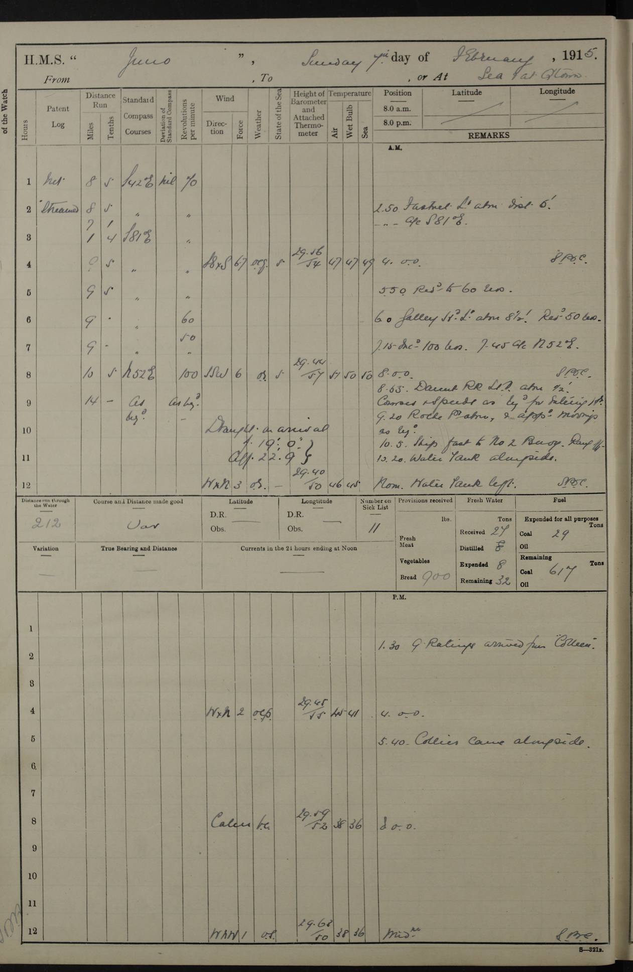 LOG BOOK – JANUARY 16TH 1915 TO FEBRUARY 28TH 1915 LOGS FOR JANUARY 1915 4ef4f6cbe53e0a0c910022bd: (https://s3.amazonaws.com:443/oldweather/ADM53-45455/0006_0.jpg) 16 January 1915 At sea Lat 52.7, Long -11.0 1.20pm: Sighted four funnelled cruiser bearing west Number on sick list = 10 4ef4f6cbe53e0a0c910022be: (https://s3.amazonaws.com:443/oldweather/ADM53-45455/0006_1.jpg) 17 January 1915 At sea Lat 52.9, Long -10.7 2.15pm: Sighted HMS SUTLEJ Starboard beam [HMS SUTLEJ was a Cressy Class armoured cruiser. 2 x 9” guns, launched November 1899] 6.55pm: Observed Glare of Clyne House N31½E Number on sick list = 10 4ef4f6cce53e0a0c910022bf: (https://s3.amazonaws.com:443/oldweather/ADM53-45455/0007_0.jpg) 18 January 1915 At sea Lat 53.2, Long -10.7 5.37am: Black Rock Light N 28E 5.0pm: Passed HMS MONARCH steering North [HMS MONARCH was an Orion Class Battleship launched in March 1911, 10 x 13.5” guns.] Number on sick list = 10 4ef4f6cce53e0a0c910022c0: (https://s3.amazonaws.com:443/oldweather/ADM53-45455/0007_1.jpg) 19 January 1915 At sea Lat 53.1, Long -10.6 1.20am: Sighted Seragh Island Light S65E, 26 miles 7.10pm: Loop Head Light Abeam 8.15am: Course as required to examine SS WHEATFIELD of Cardiff Number in sick list = 10 4ef4f6cce53e0a0c910022c1: (https://s3.amazonaws.com:443/oldweather/ADM53-45455/0008_0.jpg) 20 January 1915 At sea Lat 53.2, Long -10.6 4.0am: Slyne Head Light abeam, 7 miles 7.40pm: Loop Head S56E Number on sick list = 9 4ef4f6cce53e0a0c910022c2: (https://s3.amazonaws.com:443/oldweather/ADM53-45455/0008_1.jpg) 21 January 1915 At sea Lat 52.5, Long -11.4 5.20pm: Tearaght abeam, 17 miles 12.0M: Fastnet Light abeam Number on sick list = 10 4ef4f6cde53e0a0c910022c3: (https://s3.amazonaws.com:443/oldweather/ADM53-45455/0009_0.jpg) 22 January 1915 At sea to Queenstown [Queenstown was the English name for Cobh which is the harbour and port for Cork, Eire] Lat 51.9, Long -8.3 3.55am: Galley Head Light abeam, 10 miles 11.55am: Course as requisite for rounding Bull Rock 12.10pm: Course as requisite for entering Ballingskellig Bay 1.30pm: Stopped engines 1.48pm: Proceeded 8.52pm: Old Head Kinsale Light abeam, 4½ miles 11.10pm: Secured to No 2 buoy Queenstown Number on sick list = 10 4ef4f6cde53e0a0c910022c4: (https://s3.amazonaws.com:443/oldweather/ADM53-45455/0009_1.jpg) 23 January 1915 Queenstown Lat 51.9, Long -8.3 8.40am: Collier POMERAN came alongside, coal ship 9.40am: Discharged two ratings to Haulbowline Hospital Number on sick list = 11 4ef4f6cee53e0a0c910022c5: (https://s3.amazonaws.com:443/oldweather/ADM53-45455/0010_0.jpg) 24 January 1915 Queenstown Lat 51.9, Long -8.3 Number on sick list = 11 4ef4f6cee53e0a0c910022c6: (https://s3.amazonaws.com:443/oldweather/ADM53-45455/0010_1.jpg) 25 January 1915 Queenstown Lat 51.84, Long -8.27 8.15am: HMS ISIS entered harbour & secured to No 8 buoy [HMS ISIS was an Eclipse Class protected cruiser, a sister ship of HMS JUNO] 4.0pm: Read warrants Nos 18, 19 & 20 Number on sick list = 11 4ef4f6cee53e0a0c910022c7: (https://s3.amazonaws.com:443/oldweather/ADM53-45455/0011_0.jpg) 26 January 1915 Queenstown Lat 51.9, Long -8.3 10.0am: ABS HAZEL came up harbour [Auxiliary Boarding Steamer HAZEL (also identified in the logs as HMS HAZEL) was a merchant ship requisitioned by the navy in November 1914 as a fleet auxiliary] Number on sick list = 11 4ef4f6cee53e0a0c910022c8: (https://s3.amazonaws.com:443/oldweather/ADM53-45455/0011_1.jpg) 27 January 1915 Queenstown Lat 51.9, Long -8.3 Number on sick list = 11 4ef4f6cfe53e0a0c910022c9: (https://s3.amazonaws.com:443/oldweather/ADM53-45455/0012_0.jpg) 28 January 1915 Queenstown Lat 51.9, Long -8.3 6.30am: HMS SUTLEJ arrived in port 7.30am: Coal ship Number on sick list = 9 4ef4f6cfe53e0a0c910022ca: (https://s3.amazonaws.com:443/oldweather/ADM53-45455/0012_1.jpg) 29 January 1915 Queenstown and at sea Lat 52.0, Long -10.8 0.20am: Slipped from buoy and proceeded 1.0pm: Passed Roche Point Light 4.10am: Galley Head Light abeam, 8 miles 5.30am: Signalled SS NORWEGIAN steering east 9.0am: Signalled SS HEADLANDS, for Liverpool 12.20pm: Fastnet Light abeam, 5½ miles 2.10pm: Sighted HMS VENUS & communicated [HMS VENUS was an Eclipse Class protected cruiser, a sister ship of HMS JUNO] Number on sick list = 9 4ef4f6cfe53e0a0c910022cb: (https://s3.amazonaws.com:443/oldweather/ADM53-45455/0013_0.jpg) 30 January 1915 At sea Lat 54.6, Long -11.5 Number on sick list = 8 4ef4f6cfe53e0a0c910022cc: (https://s3.amazonaws.com:443/oldweather/ADM53-45455/0013_1.jpg) 31 January 1915 At sea Lat 55.0, Long -12.5 Number on sick list = 8 LOGS FOR FEBRUARY 1915 4ef4f6d0e53e0a0c910022cd: (https://s3.amazonaws.com:443/oldweather/ADM53-45455/0014_0.jpg) 1 February 1915 At sea Lat 55.5, Long -13.0 9.45am: Commenced target practice with 12 pdr battery & DR guns 11.40am: Stopped & hoisted target Number on sick list = 9 4ef4f6d0e53e0a0c910022ce: (https://s3.amazonaws.com:443/oldweather/ADM53-45455/0014_1.jpg) 2 February 1915 At sea Lat 55.3, Long -12.1 Number on sick list = 10 4ef4f6d0e53e0a0c910022cf: (https://s3.amazonaws.com:443/oldweather/ADM53-45455/0015_0.jpg) 3 February 1915 At sea Lat 54.8, Long -12.8 11.0am: Sheet anchor securing chains adrift. Hands employed lashing sheet anchors Washed overboard during gale, Canvas hose No 3 40ft, patt no III. Copper branch pipes No 3 size Number on sick list = 10 4ef4f6d0e53e0a0c910022d0: (https://s3.amazonaws.com:443/oldweather/ADM53-45455/0015_1.jpg) 4 February 1915 At sea Lat 53.6, Long -14.8 10.0am: Hands repairing windsails 5.0pm: Hands employed securing sheet anchors Number on sick list = 9 4ef4f6d1e53e0a0c910022d1: (https://s3.amazonaws.com:443/oldweather/ADM53-45455/0016_0.jpg) 5 February 1915 At sea Lat 55.2, Long -11.2 12.45pm: Monthly payment made to ship's company 9.20pm: Signalled Cable steamer COLONIA, steering SW Number on sick list = 9 4ef4f6d1e53e0a0c910022d2: (https://s3.amazonaws.com:443/oldweather/ADM53-45455/0016_1.jpg) 6 February 1915 At sea Lat 53.4, Long -10.6