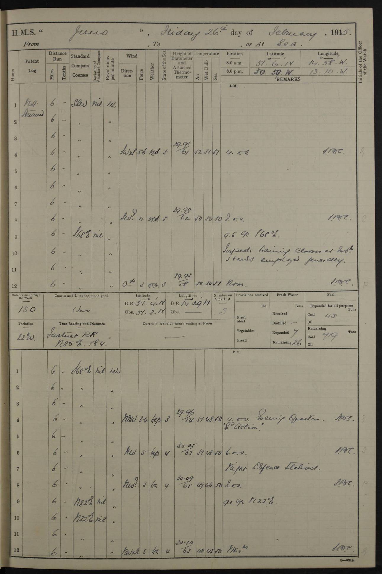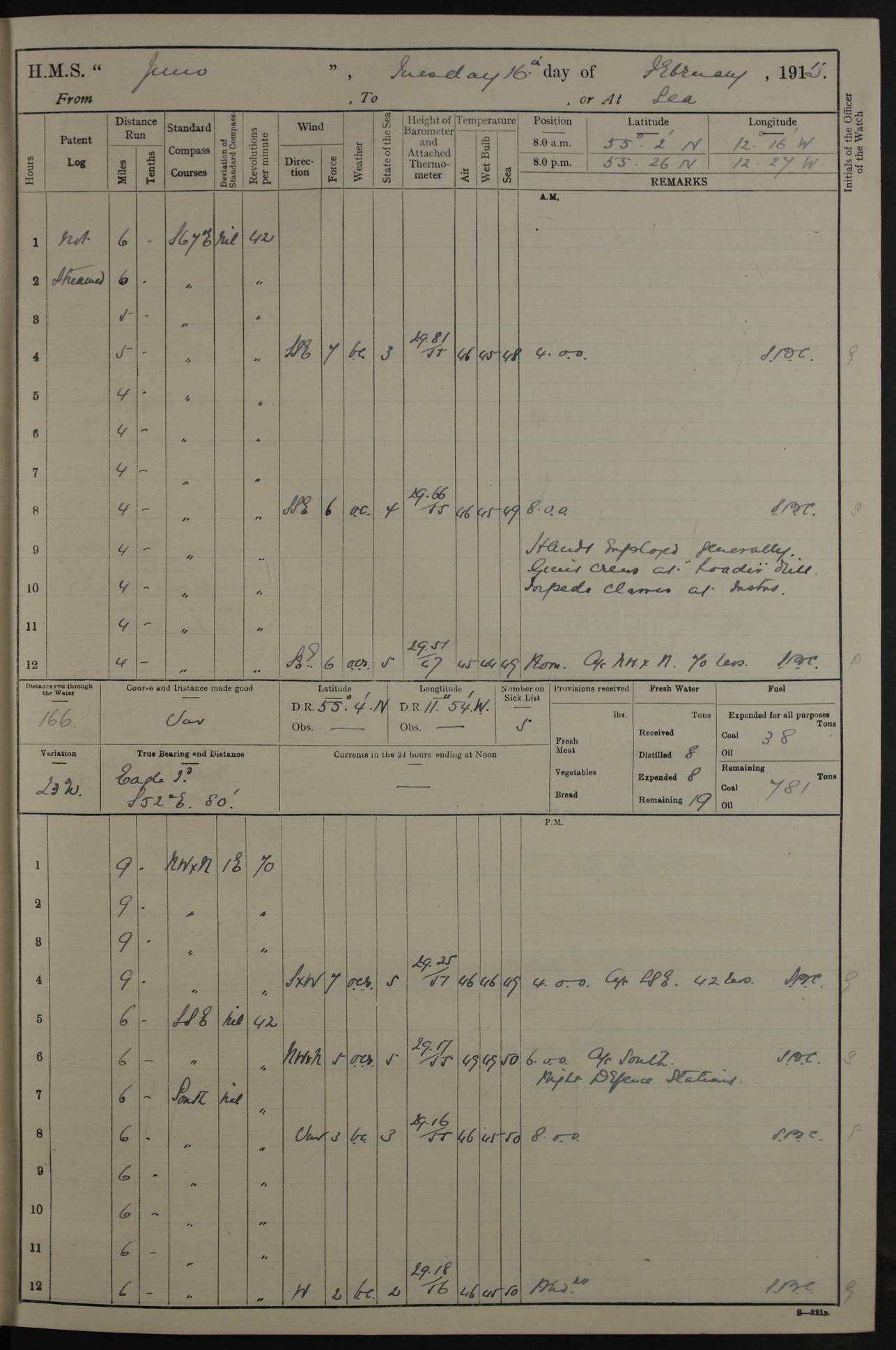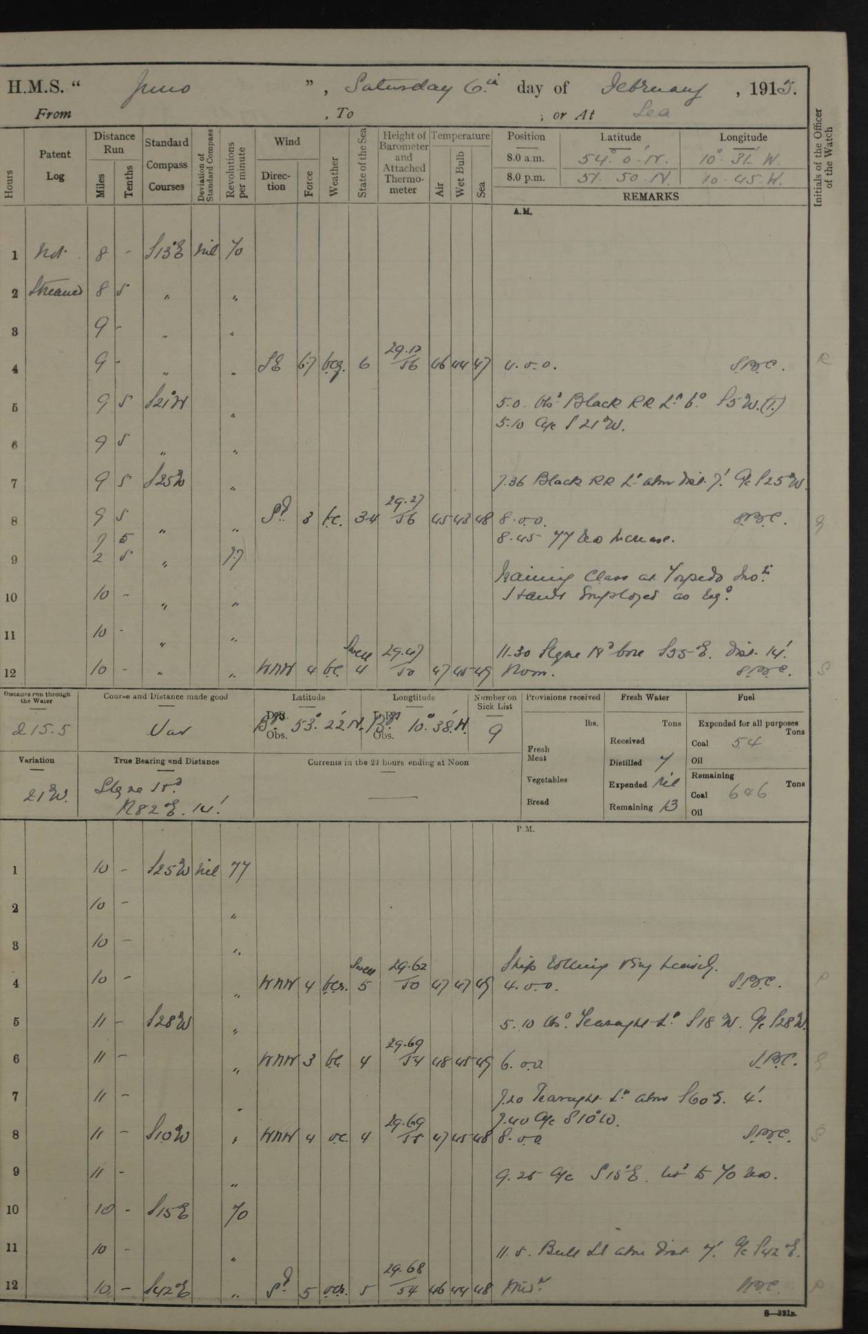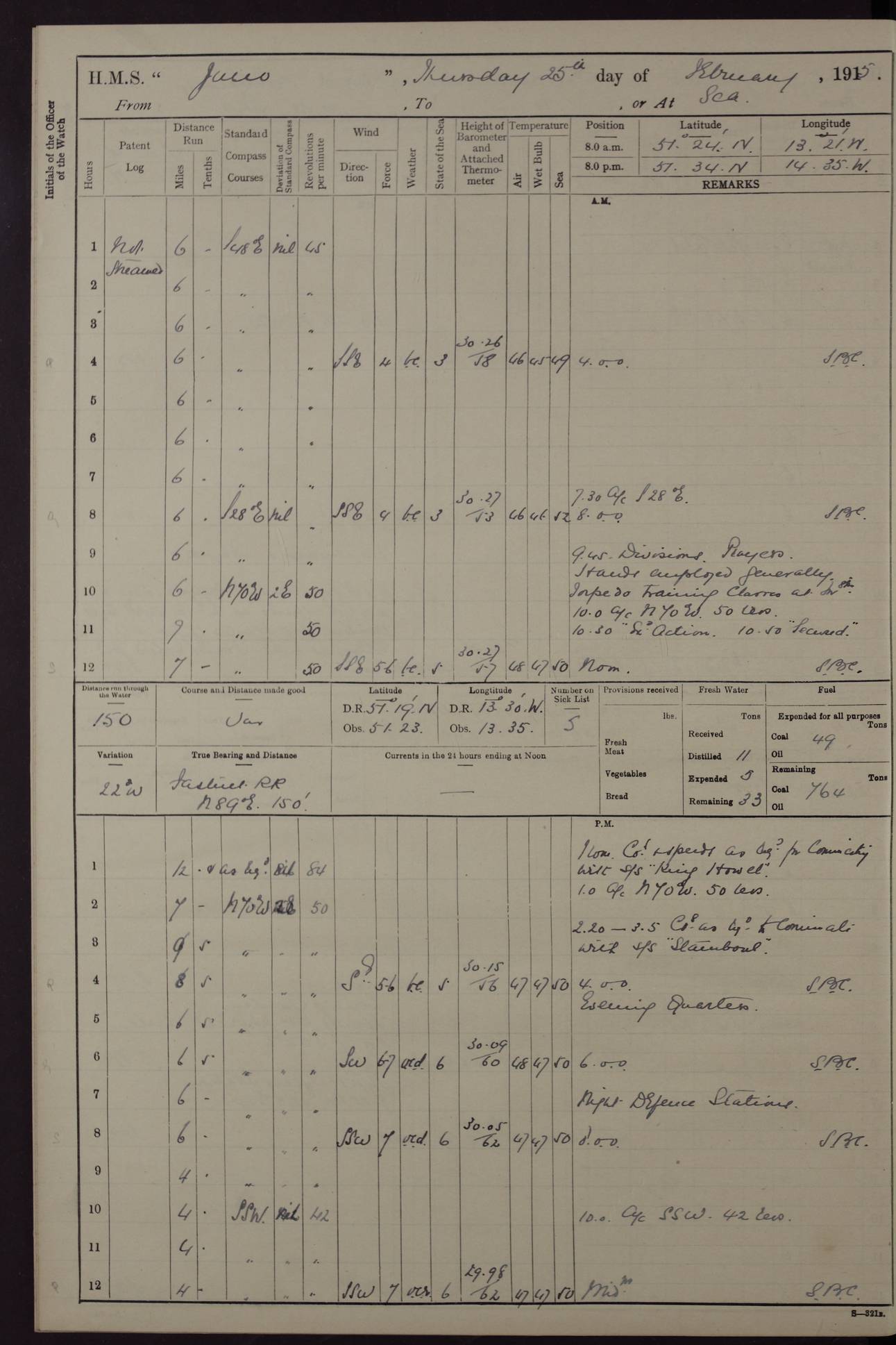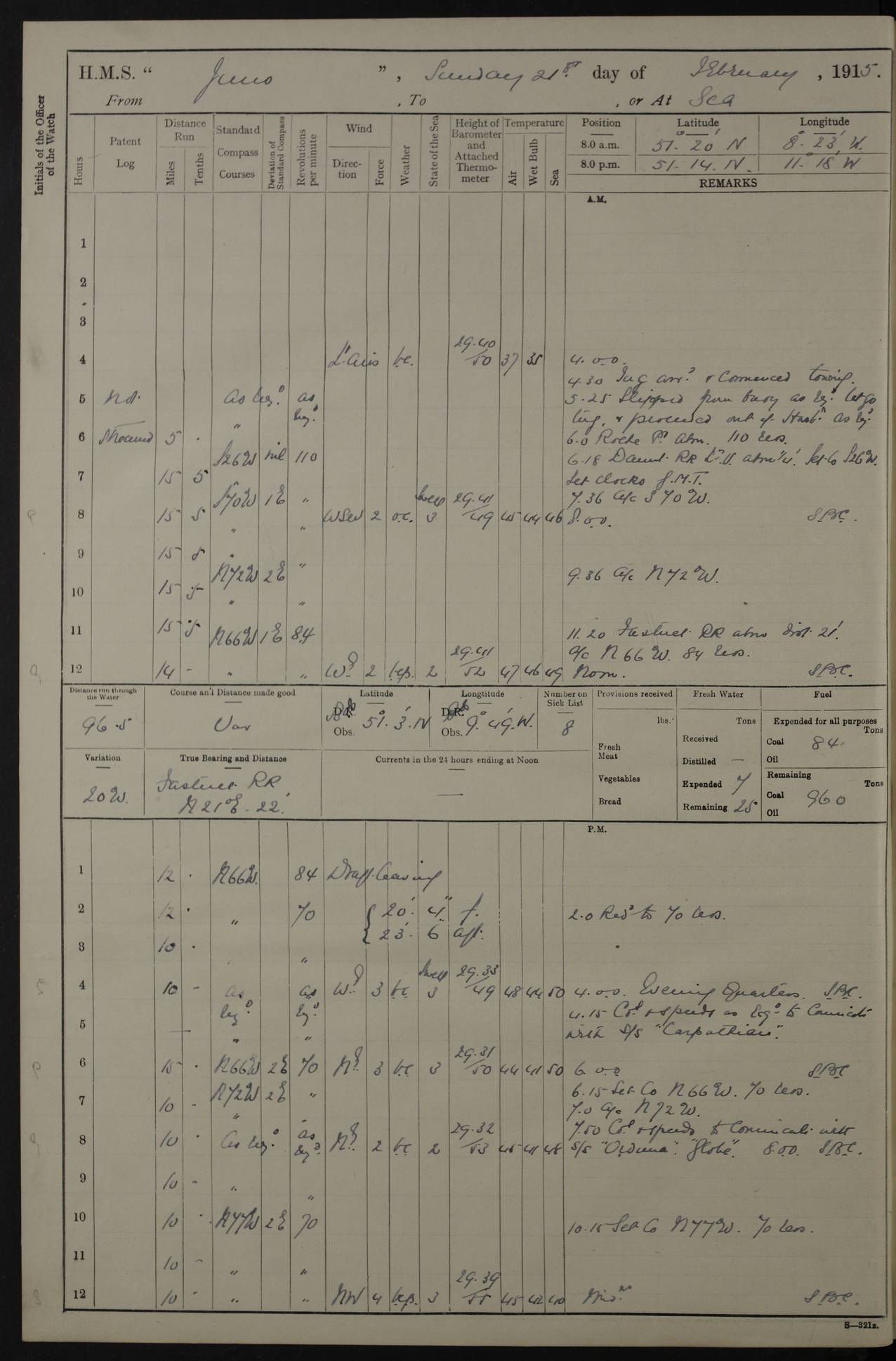 LOG BOOK – JANUARY 16TH 1915 TO FEBRUARY 28TH 1915 LOGS FOR JANUARY 1915 4ef4f6cbe53e0a0c910022bd: (https://s3.amazonaws.com:443/oldweather/ADM53-45455/0006_0.jpg) 16 January 1915 At sea Lat 52.7, Long -11.0 1.20pm: Sighted four funnelled cruiser bearing west Number on sick list = 10 4ef4f6cbe53e0a0c910022be: (https://s3.amazonaws.com:443/oldweather/ADM53-45455/0006_1.jpg) 17 January 1915 At sea Lat 52.9, Long -10.7 2.15pm: Sighted HMS SUTLEJ Starboard beam [HMS SUTLEJ was a Cressy Class armoured cruiser. 2 x 9” guns, launched November 1899] 6.55pm: Observed Glare of Clyne House N31½E Number on sick list = 10 4ef4f6cce53e0a0c910022bf: (https://s3.amazonaws.com:443/oldweather/ADM53-45455/0007_0.jpg) 18 January 1915 At sea Lat 53.2, Long -10.7 5.37am: Black Rock Light N 28E 5.0pm: Passed HMS MONARCH steering North [HMS MONARCH was an Orion Class Battleship launched in March 1911, 10 x 13.5” guns.] Number on sick list = 10 4ef4f6cce53e0a0c910022c0: (https://s3.amazonaws.com:443/oldweather/ADM53-45455/0007_1.jpg) 19 January 1915 At sea Lat 53.1, Long -10.6 1.20am: Sighted Seragh Island Light S65E, 26 miles 7.10pm: Loop Head Light Abeam 8.15am: Course as required to examine SS WHEATFIELD of Cardiff Number in sick list = 10 4ef4f6cce53e0a0c910022c1: (https://s3.amazonaws.com:443/oldweather/ADM53-45455/0008_0.jpg) 20 January 1915 At sea Lat 53.2, Long -10.6 4.0am: Slyne Head Light abeam, 7 miles 7.40pm: Loop Head S56E Number on sick list = 9 4ef4f6cce53e0a0c910022c2: (https://s3.amazonaws.com:443/oldweather/ADM53-45455/0008_1.jpg) 21 January 1915 At sea Lat 52.5, Long -11.4 5.20pm: Tearaght abeam, 17 miles 12.0M: Fastnet Light abeam Number on sick list = 10 4ef4f6cde53e0a0c910022c3: (https://s3.amazonaws.com:443/oldweather/ADM53-45455/0009_0.jpg) 22 January 1915 At sea to Queenstown [Queenstown was the English name for Cobh which is the harbour and port for Cork, Eire] Lat 51.9, Long -8.3 3.55am: Galley Head Light abeam, 10 miles 11.55am: Course as requisite for rounding Bull Rock 12.10pm: Course as requisite for entering Ballingskellig Bay 1.30pm: Stopped engines 1.48pm: Proceeded 8.52pm: Old Head Kinsale Light abeam, 4½ miles 11.10pm: Secured to No 2 buoy Queenstown Number on sick list = 10 4ef4f6cde53e0a0c910022c4: (https://s3.amazonaws.com:443/oldweather/ADM53-45455/0009_1.jpg) 23 January 1915 Queenstown Lat 51.9, Long -8.3 8.40am: Collier POMERAN came alongside, coal ship 9.40am: Discharged two ratings to Haulbowline Hospital Number on sick list = 11 4ef4f6cee53e0a0c910022c5: (https://s3.amazonaws.com:443/oldweather/ADM53-45455/0010_0.jpg) 24 January 1915 Queenstown Lat 51.9, Long -8.3 Number on sick list = 11 4ef4f6cee53e0a0c910022c6: (https://s3.amazonaws.com:443/oldweather/ADM53-45455/0010_1.jpg) 25 January 1915 Queenstown Lat 51.84, Long -8.27 8.15am: HMS ISIS entered harbour & secured to No 8 buoy [HMS ISIS was an Eclipse Class protected cruiser, a sister ship of HMS JUNO] 4.0pm: Read warrants Nos 18, 19 & 20 Number on sick list = 11 4ef4f6cee53e0a0c910022c7: (https://s3.amazonaws.com:443/oldweather/ADM53-45455/0011_0.jpg) 26 January 1915 Queenstown Lat 51.9, Long -8.3 10.0am: ABS HAZEL came up harbour [Auxiliary Boarding Steamer HAZEL (also identified in the logs as HMS HAZEL) was a merchant ship requisitioned by the navy in November 1914 as a fleet auxiliary] Number on sick list = 11 4ef4f6cee53e0a0c910022c8: (https://s3.amazonaws.com:443/oldweather/ADM53-45455/0011_1.jpg) 27 January 1915 Queenstown Lat 51.9, Long -8.3 Number on sick list = 11 4ef4f6cfe53e0a0c910022c9: (https://s3.amazonaws.com:443/oldweather/ADM53-45455/0012_0.jpg) 28 January 1915 Queenstown Lat 51.9, Long -8.3 6.30am: HMS SUTLEJ arrived in port 7.30am: Coal ship Number on sick list = 9 4ef4f6cfe53e0a0c910022ca: (https://s3.amazonaws.com:443/oldweather/ADM53-45455/0012_1.jpg) 29 January 1915 Queenstown and at sea Lat 52.0, Long -10.8 0.20am: Slipped from buoy and proceeded 1.0pm: Passed Roche Point Light 4.10am: Galley Head Light abeam, 8 miles 5.30am: Signalled SS NORWEGIAN steering east 9.0am: Signalled SS HEADLANDS, for Liverpool 12.20pm: Fastnet Light abeam, 5½ miles 2.10pm: Sighted HMS VENUS & communicated [HMS VENUS was an Eclipse Class protected cruiser, a sister ship of HMS JUNO] Number on sick list = 9 4ef4f6cfe53e0a0c910022cb: (https://s3.amazonaws.com:443/oldweather/ADM53-45455/0013_0.jpg) 30 January 1915 At sea Lat 54.6, Long -11.5 Number on sick list = 8 4ef4f6cfe53e0a0c910022cc: (https://s3.amazonaws.com:443/oldweather/ADM53-45455/0013_1.jpg) 31 January 1915 At sea Lat 55.0, Long -12.5 Number on sick list = 8 LOGS FOR FEBRUARY 1915 4ef4f6d0e53e0a0c910022cd: (https://s3.amazonaws.com:443/oldweather/ADM53-45455/0014_0.jpg) 1 February 1915 At sea Lat 55.5, Long -13.0 9.45am: Commenced target practice with 12 pdr battery & DR guns 11.40am: Stopped & hoisted target Number on sick list = 9 4ef4f6d0e53e0a0c910022ce: (https://s3.amazonaws.com:443/oldweather/ADM53-45455/0014_1.jpg) 2 February 1915 At sea Lat 55.3, Long -12.1 Number on sick list = 10 4ef4f6d0e53e0a0c910022cf: (https://s3.amazonaws.com:443/oldweather/ADM53-45455/0015_0.jpg) 3 February 1915 At sea Lat 54.8, Long -12.8 11.0am: Sheet anchor securing chains adrift. Hands employed lashing sheet anchors Washed overboard during gale, Canvas hose No 3 40ft, patt no III. Copper branch pipes No 3 size Number on sick list = 10 4ef4f6d0e53e0a0c910022d0: (https://s3.amazonaws.com:443/oldweather/ADM53-45455/0015_1.jpg) 4 February 1915 At sea Lat 53.6, Long -14.8 10.0am: Hands repairing windsails 5.0pm: Hands employed securing sheet anchors Number on sick list = 9 4ef4f6d1e53e0a0c910022d1: (https://s3.amazonaws.com:443/oldweather/ADM53-45455/0016_0.jpg) 5 February 1915 At sea Lat 55.2, Long -11.2 12.45pm: Monthly payment made to ship's company 9.20pm: Signalled Cable steamer COLONIA, steering SW Number on sick list = 9 4ef4f6d1e53e0a0c910022d2: (https://s3.amazonaws.com:443/oldweather/ADM53-45455/0016_1.jpg) 6 February 1915 At sea Lat 53.4, Long -10.6