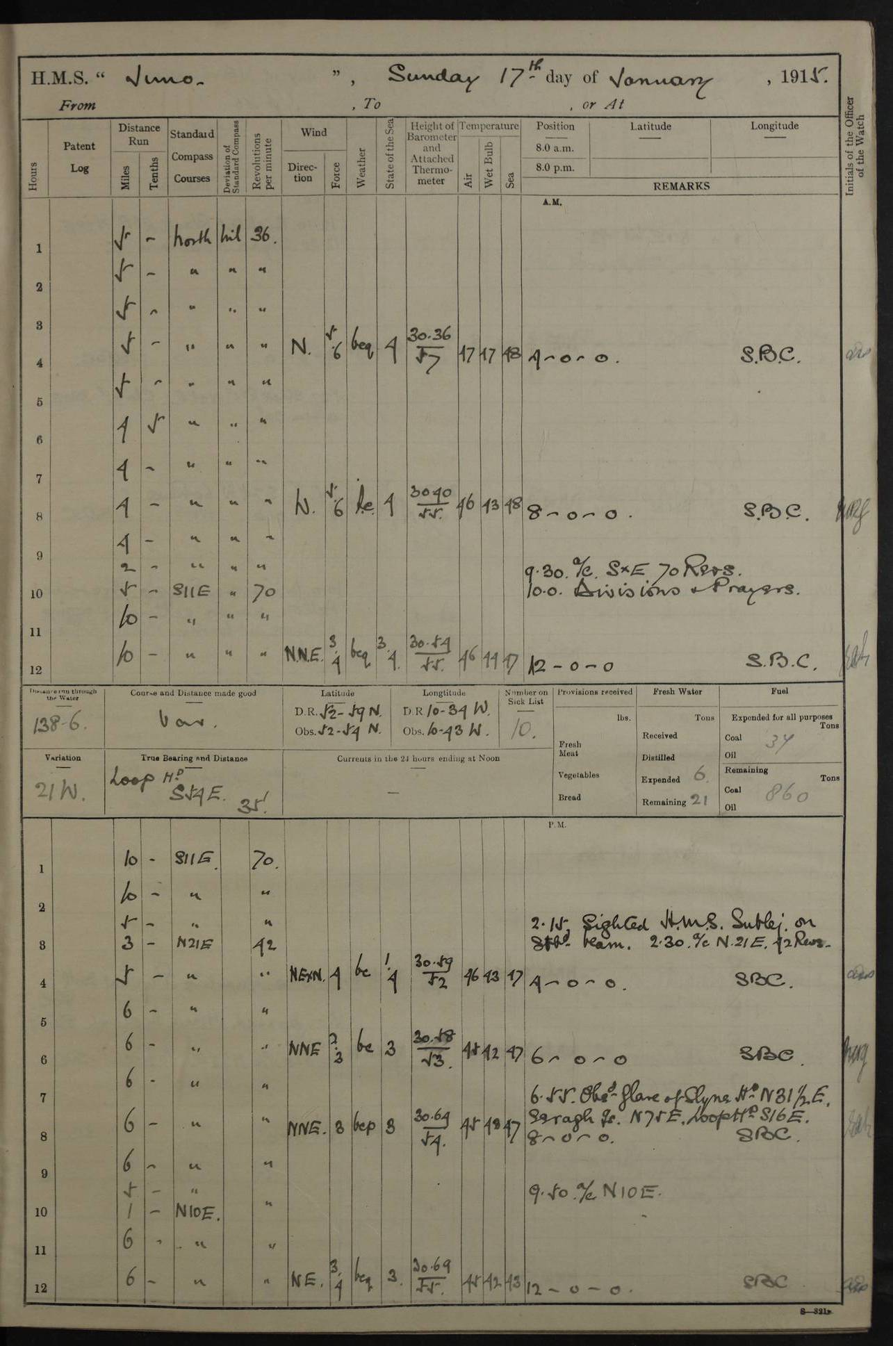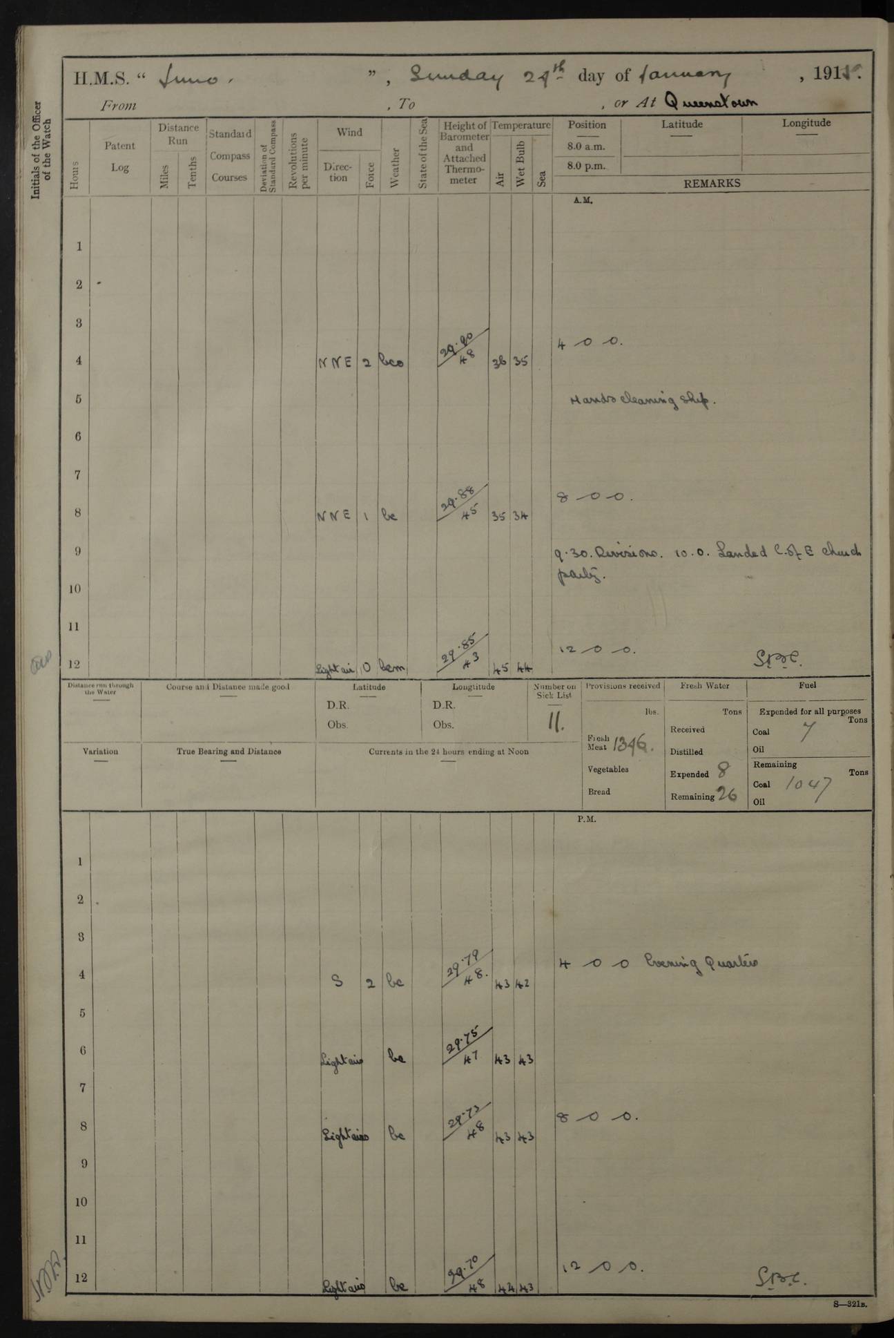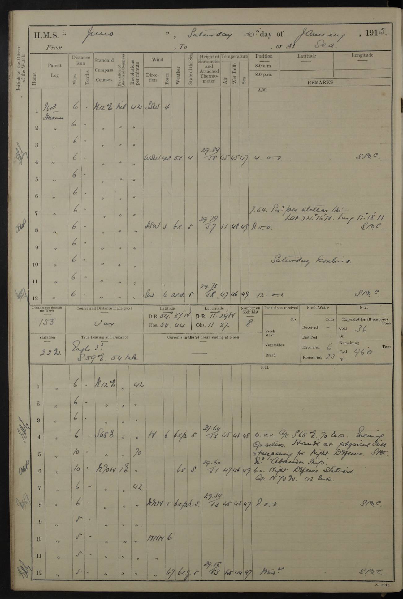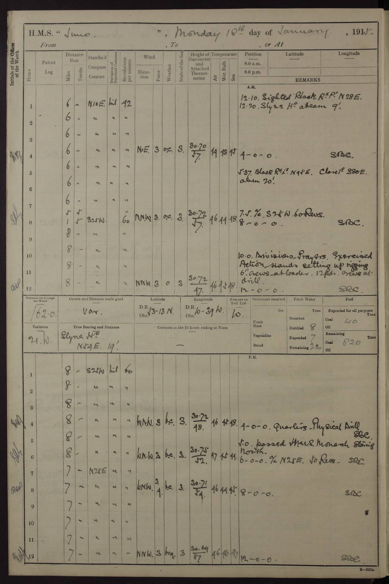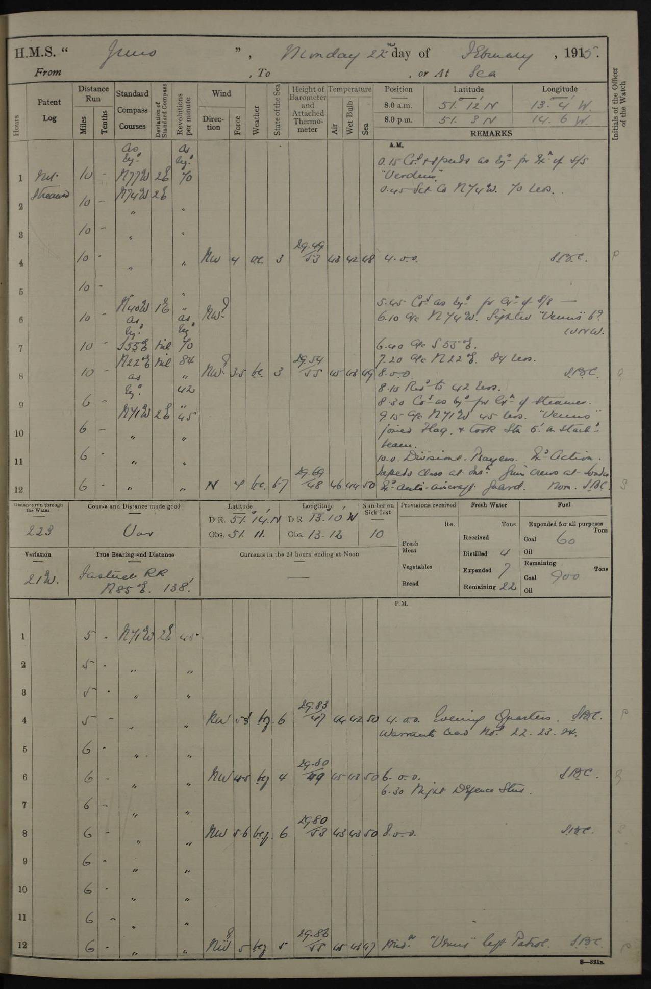 LOG BOOK – JANUARY 16TH 1915 TO FEBRUARY 28TH 1915 LOGS FOR JANUARY 1915 4ef4f6cbe53e0a0c910022bd: (https://s3.amazonaws.com:443/oldweather/ADM53-45455/0006_0.jpg) 16 January 1915 At sea Lat 52.7, Long -11.0 1.20pm: Sighted four funnelled cruiser bearing west Number on sick list = 10 4ef4f6cbe53e0a0c910022be: (https://s3.amazonaws.com:443/oldweather/ADM53-45455/0006_1.jpg) 17 January 1915 At sea Lat 52.9, Long -10.7 2.15pm: Sighted HMS SUTLEJ Starboard beam [HMS SUTLEJ was a Cressy Class armoured cruiser. 2 x 9” guns, launched November 1899] 6.55pm: Observed Glare of Clyne House N31½E Number on sick list = 10 4ef4f6cce53e0a0c910022bf: (https://s3.amazonaws.com:443/oldweather/ADM53-45455/0007_0.jpg) 18 January 1915 At sea Lat 53.2, Long -10.7 5.37am: Black Rock Light N 28E 5.0pm: Passed HMS MONARCH steering North [HMS MONARCH was an Orion Class Battleship launched in March 1911, 10 x 13.5” guns.] Number on sick list = 10 4ef4f6cce53e0a0c910022c0: (https://s3.amazonaws.com:443/oldweather/ADM53-45455/0007_1.jpg) 19 January 1915 At sea Lat 53.1, Long -10.6 1.20am: Sighted Seragh Island Light S65E, 26 miles 7.10pm: Loop Head Light Abeam 8.15am: Course as required to examine SS WHEATFIELD of Cardiff Number in sick list = 10 4ef4f6cce53e0a0c910022c1: (https://s3.amazonaws.com:443/oldweather/ADM53-45455/0008_0.jpg) 20 January 1915 At sea Lat 53.2, Long -10.6 4.0am: Slyne Head Light abeam, 7 miles 7.40pm: Loop Head S56E Number on sick list = 9 4ef4f6cce53e0a0c910022c2: (https://s3.amazonaws.com:443/oldweather/ADM53-45455/0008_1.jpg) 21 January 1915 At sea Lat 52.5, Long -11.4 5.20pm: Tearaght abeam, 17 miles 12.0M: Fastnet Light abeam Number on sick list = 10 4ef4f6cde53e0a0c910022c3: (https://s3.amazonaws.com:443/oldweather/ADM53-45455/0009_0.jpg) 22 January 1915 At sea to Queenstown [Queenstown was the English name for Cobh which is the harbour and port for Cork, Eire] Lat 51.9, Long -8.3 3.55am: Galley Head Light abeam, 10 miles 11.55am: Course as requisite for rounding Bull Rock 12.10pm: Course as requisite for entering Ballingskellig Bay 1.30pm: Stopped engines 1.48pm: Proceeded 8.52pm: Old Head Kinsale Light abeam, 4½ miles 11.10pm: Secured to No 2 buoy Queenstown Number on sick list = 10 4ef4f6cde53e0a0c910022c4: (https://s3.amazonaws.com:443/oldweather/ADM53-45455/0009_1.jpg) 23 January 1915 Queenstown Lat 51.9, Long -8.3 8.40am: Collier POMERAN came alongside, coal ship 9.40am: Discharged two ratings to Haulbowline Hospital Number on sick list = 11 4ef4f6cee53e0a0c910022c5: (https://s3.amazonaws.com:443/oldweather/ADM53-45455/0010_0.jpg) 24 January 1915 Queenstown Lat 51.9, Long -8.3 Number on sick list = 11 4ef4f6cee53e0a0c910022c6: (https://s3.amazonaws.com:443/oldweather/ADM53-45455/0010_1.jpg) 25 January 1915 Queenstown Lat 51.84, Long -8.27 8.15am: HMS ISIS entered harbour & secured to No 8 buoy [HMS ISIS was an Eclipse Class protected cruiser, a sister ship of HMS JUNO] 4.0pm: Read warrants Nos 18, 19 & 20 Number on sick list = 11 4ef4f6cee53e0a0c910022c7: (https://s3.amazonaws.com:443/oldweather/ADM53-45455/0011_0.jpg) 26 January 1915 Queenstown Lat 51.9, Long -8.3 10.0am: ABS HAZEL came up harbour [Auxiliary Boarding Steamer HAZEL (also identified in the logs as HMS HAZEL) was a merchant ship requisitioned by the navy in November 1914 as a fleet auxiliary] Number on sick list = 11 4ef4f6cee53e0a0c910022c8: (https://s3.amazonaws.com:443/oldweather/ADM53-45455/0011_1.jpg) 27 January 1915 Queenstown Lat 51.9, Long -8.3 Number on sick list = 11 4ef4f6cfe53e0a0c910022c9: (https://s3.amazonaws.com:443/oldweather/ADM53-45455/0012_0.jpg) 28 January 1915 Queenstown Lat 51.9, Long -8.3 6.30am: HMS SUTLEJ arrived in port 7.30am: Coal ship Number on sick list = 9 4ef4f6cfe53e0a0c910022ca: (https://s3.amazonaws.com:443/oldweather/ADM53-45455/0012_1.jpg) 29 January 1915 Queenstown and at sea Lat 52.0, Long -10.8 0.20am: Slipped from buoy and proceeded 1.0pm: Passed Roche Point Light 4.10am: Galley Head Light abeam, 8 miles 5.30am: Signalled SS NORWEGIAN steering east 9.0am: Signalled SS HEADLANDS, for Liverpool 12.20pm: Fastnet Light abeam, 5½ miles 2.10pm: Sighted HMS VENUS & communicated [HMS VENUS was an Eclipse Class protected cruiser, a sister ship of HMS JUNO] Number on sick list = 9 4ef4f6cfe53e0a0c910022cb: (https://s3.amazonaws.com:443/oldweather/ADM53-45455/0013_0.jpg) 30 January 1915 At sea Lat 54.6, Long -11.5 Number on sick list = 8 4ef4f6cfe53e0a0c910022cc: (https://s3.amazonaws.com:443/oldweather/ADM53-45455/0013_1.jpg) 31 January 1915 At sea Lat 55.0, Long -12.5 Number on sick list = 8 LOGS FOR FEBRUARY 1915 4ef4f6d0e53e0a0c910022cd: (https://s3.amazonaws.com:443/oldweather/ADM53-45455/0014_0.jpg) 1 February 1915 At sea Lat 55.5, Long -13.0 9.45am: Commenced target practice with 12 pdr battery & DR guns 11.40am: Stopped & hoisted target Number on sick list = 9 4ef4f6d0e53e0a0c910022ce: (https://s3.amazonaws.com:443/oldweather/ADM53-45455/0014_1.jpg) 2 February 1915 At sea Lat 55.3, Long -12.1 Number on sick list = 10 4ef4f6d0e53e0a0c910022cf: (https://s3.amazonaws.com:443/oldweather/ADM53-45455/0015_0.jpg) 3 February 1915 At sea Lat 54.8, Long -12.8 11.0am: Sheet anchor securing chains adrift. Hands employed lashing sheet anchors Washed overboard during gale, Canvas hose No 3 40ft, patt no III. Copper branch pipes No 3 size Number on sick list = 10 4ef4f6d0e53e0a0c910022d0: (https://s3.amazonaws.com:443/oldweather/ADM53-45455/0015_1.jpg) 4 February 1915 At sea Lat 53.6, Long -14.8 10.0am: Hands repairing windsails 5.0pm: Hands employed securing sheet anchors Number on sick list = 9 4ef4f6d1e53e0a0c910022d1: (https://s3.amazonaws.com:443/oldweather/ADM53-45455/0016_0.jpg) 5 February 1915 At sea Lat 55.2, Long -11.2 12.45pm: Monthly payment made to ship's company 9.20pm: Signalled Cable steamer COLONIA, steering SW Number on sick list = 9 4ef4f6d1e53e0a0c910022d2: (https://s3.amazonaws.com:443/oldweather/ADM53-45455/0016_1.jpg) 6 February 1915 At sea Lat 53.4, Long -10.6
