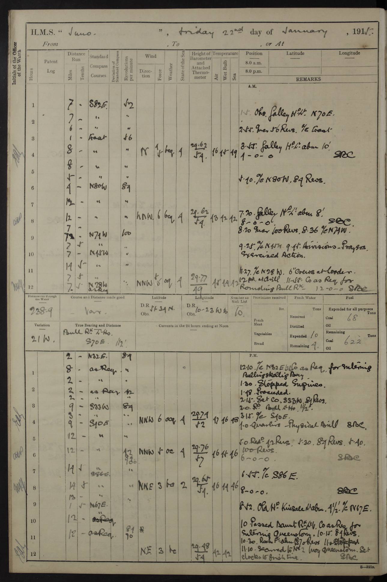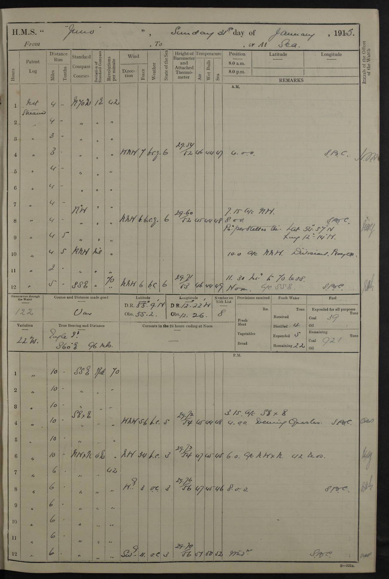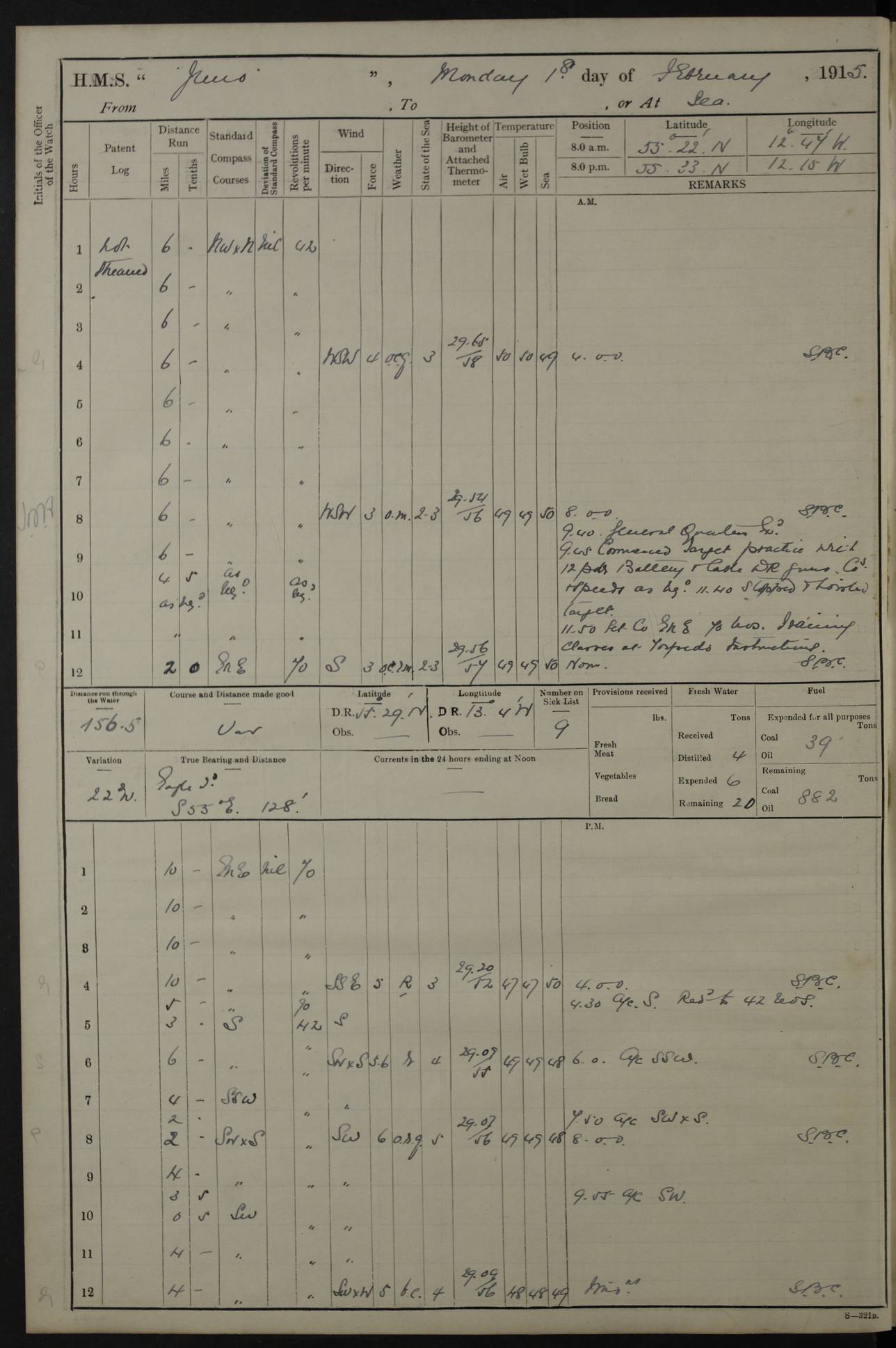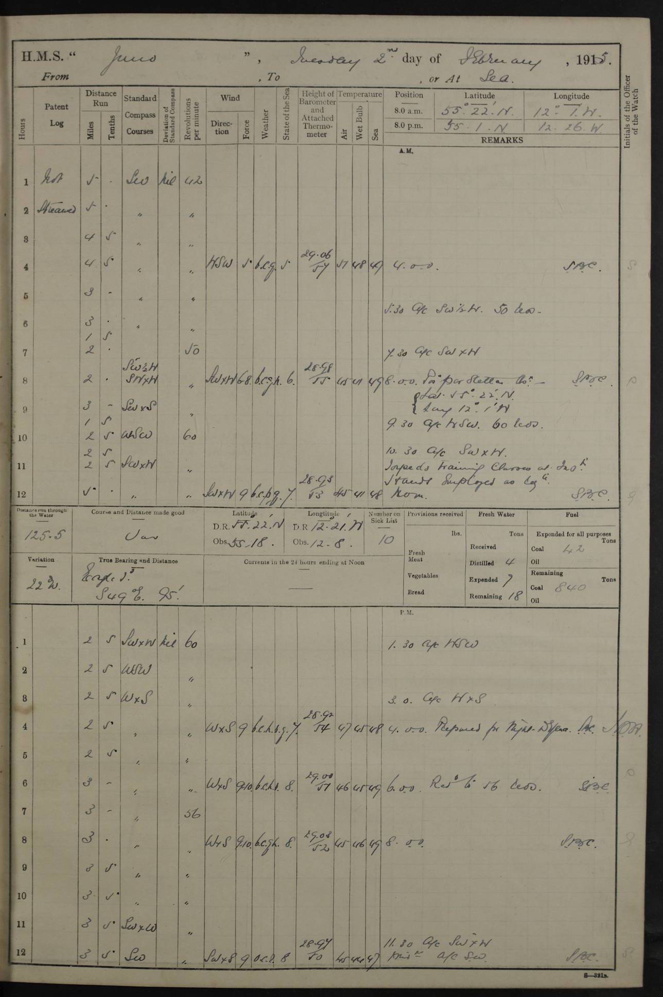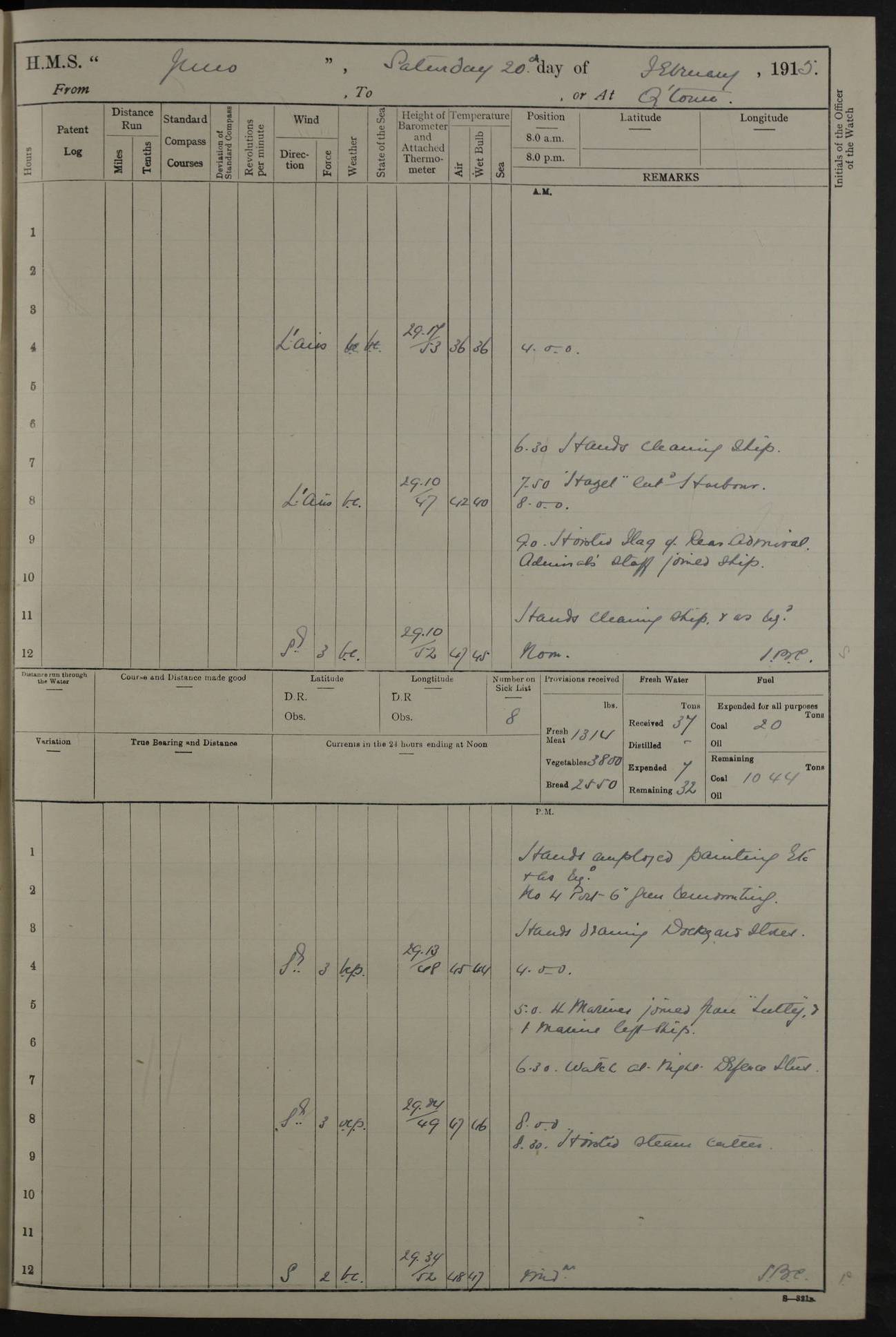 LOG BOOK – JANUARY 16TH 1915 TO FEBRUARY 28TH 1915 LOGS FOR JANUARY 1915 4ef4f6cbe53e0a0c910022bd: (https://s3.amazonaws.com:443/oldweather/ADM53-45455/0006_0.jpg) 16 January 1915 At sea Lat 52.7, Long -11.0 1.20pm: Sighted four funnelled cruiser bearing west Number on sick list = 10 4ef4f6cbe53e0a0c910022be: (https://s3.amazonaws.com:443/oldweather/ADM53-45455/0006_1.jpg) 17 January 1915 At sea Lat 52.9, Long -10.7 2.15pm: Sighted HMS SUTLEJ Starboard beam [HMS SUTLEJ was a Cressy Class armoured cruiser. 2 x 9” guns, launched November 1899] 6.55pm: Observed Glare of Clyne House N31½E Number on sick list = 10 4ef4f6cce53e0a0c910022bf: (https://s3.amazonaws.com:443/oldweather/ADM53-45455/0007_0.jpg) 18 January 1915 At sea Lat 53.2, Long -10.7 5.37am: Black Rock Light N 28E 5.0pm: Passed HMS MONARCH steering North [HMS MONARCH was an Orion Class Battleship launched in March 1911, 10 x 13.5” guns.] Number on sick list = 10 4ef4f6cce53e0a0c910022c0: (https://s3.amazonaws.com:443/oldweather/ADM53-45455/0007_1.jpg) 19 January 1915 At sea Lat 53.1, Long -10.6 1.20am: Sighted Seragh Island Light S65E, 26 miles 7.10pm: Loop Head Light Abeam 8.15am: Course as required to examine SS WHEATFIELD of Cardiff Number in sick list = 10 4ef4f6cce53e0a0c910022c1: (https://s3.amazonaws.com:443/oldweather/ADM53-45455/0008_0.jpg) 20 January 1915 At sea Lat 53.2, Long -10.6 4.0am: Slyne Head Light abeam, 7 miles 7.40pm: Loop Head S56E Number on sick list = 9 4ef4f6cce53e0a0c910022c2: (https://s3.amazonaws.com:443/oldweather/ADM53-45455/0008_1.jpg) 21 January 1915 At sea Lat 52.5, Long -11.4 5.20pm: Tearaght abeam, 17 miles 12.0M: Fastnet Light abeam Number on sick list = 10 4ef4f6cde53e0a0c910022c3: (https://s3.amazonaws.com:443/oldweather/ADM53-45455/0009_0.jpg) 22 January 1915 At sea to Queenstown [Queenstown was the English name for Cobh which is the harbour and port for Cork, Eire] Lat 51.9, Long -8.3 3.55am: Galley Head Light abeam, 10 miles 11.55am: Course as requisite for rounding Bull Rock 12.10pm: Course as requisite for entering Ballingskellig Bay 1.30pm: Stopped engines 1.48pm: Proceeded 8.52pm: Old Head Kinsale Light abeam, 4½ miles 11.10pm: Secured to No 2 buoy Queenstown Number on sick list = 10 4ef4f6cde53e0a0c910022c4: (https://s3.amazonaws.com:443/oldweather/ADM53-45455/0009_1.jpg) 23 January 1915 Queenstown Lat 51.9, Long -8.3 8.40am: Collier POMERAN came alongside, coal ship 9.40am: Discharged two ratings to Haulbowline Hospital Number on sick list = 11 4ef4f6cee53e0a0c910022c5: (https://s3.amazonaws.com:443/oldweather/ADM53-45455/0010_0.jpg) 24 January 1915 Queenstown Lat 51.9, Long -8.3 Number on sick list = 11 4ef4f6cee53e0a0c910022c6: (https://s3.amazonaws.com:443/oldweather/ADM53-45455/0010_1.jpg) 25 January 1915 Queenstown Lat 51.84, Long -8.27 8.15am: HMS ISIS entered harbour & secured to No 8 buoy [HMS ISIS was an Eclipse Class protected cruiser, a sister ship of HMS JUNO] 4.0pm: Read warrants Nos 18, 19 & 20 Number on sick list = 11 4ef4f6cee53e0a0c910022c7: (https://s3.amazonaws.com:443/oldweather/ADM53-45455/0011_0.jpg) 26 January 1915 Queenstown Lat 51.9, Long -8.3 10.0am: ABS HAZEL came up harbour [Auxiliary Boarding Steamer HAZEL (also identified in the logs as HMS HAZEL) was a merchant ship requisitioned by the navy in November 1914 as a fleet auxiliary] Number on sick list = 11 4ef4f6cee53e0a0c910022c8: (https://s3.amazonaws.com:443/oldweather/ADM53-45455/0011_1.jpg) 27 January 1915 Queenstown Lat 51.9, Long -8.3 Number on sick list = 11 4ef4f6cfe53e0a0c910022c9: (https://s3.amazonaws.com:443/oldweather/ADM53-45455/0012_0.jpg) 28 January 1915 Queenstown Lat 51.9, Long -8.3 6.30am: HMS SUTLEJ arrived in port 7.30am: Coal ship Number on sick list = 9 4ef4f6cfe53e0a0c910022ca: (https://s3.amazonaws.com:443/oldweather/ADM53-45455/0012_1.jpg) 29 January 1915 Queenstown and at sea Lat 52.0, Long -10.8 0.20am: Slipped from buoy and proceeded 1.0pm: Passed Roche Point Light 4.10am: Galley Head Light abeam, 8 miles 5.30am: Signalled SS NORWEGIAN steering east 9.0am: Signalled SS HEADLANDS, for Liverpool 12.20pm: Fastnet Light abeam, 5½ miles 2.10pm: Sighted HMS VENUS & communicated [HMS VENUS was an Eclipse Class protected cruiser, a sister ship of HMS JUNO] Number on sick list = 9 4ef4f6cfe53e0a0c910022cb: (https://s3.amazonaws.com:443/oldweather/ADM53-45455/0013_0.jpg) 30 January 1915 At sea Lat 54.6, Long -11.5 Number on sick list = 8 4ef4f6cfe53e0a0c910022cc: (https://s3.amazonaws.com:443/oldweather/ADM53-45455/0013_1.jpg) 31 January 1915 At sea Lat 55.0, Long -12.5 Number on sick list = 8 LOGS FOR FEBRUARY 1915 4ef4f6d0e53e0a0c910022cd: (https://s3.amazonaws.com:443/oldweather/ADM53-45455/0014_0.jpg) 1 February 1915 At sea Lat 55.5, Long -13.0 9.45am: Commenced target practice with 12 pdr battery & DR guns 11.40am: Stopped & hoisted target Number on sick list = 9 4ef4f6d0e53e0a0c910022ce: (https://s3.amazonaws.com:443/oldweather/ADM53-45455/0014_1.jpg) 2 February 1915 At sea Lat 55.3, Long -12.1 Number on sick list = 10 4ef4f6d0e53e0a0c910022cf: (https://s3.amazonaws.com:443/oldweather/ADM53-45455/0015_0.jpg) 3 February 1915 At sea Lat 54.8, Long -12.8 11.0am: Sheet anchor securing chains adrift. Hands employed lashing sheet anchors Washed overboard during gale, Canvas hose No 3 40ft, patt no III. Copper branch pipes No 3 size Number on sick list = 10 4ef4f6d0e53e0a0c910022d0: (https://s3.amazonaws.com:443/oldweather/ADM53-45455/0015_1.jpg) 4 February 1915 At sea Lat 53.6, Long -14.8 10.0am: Hands repairing windsails 5.0pm: Hands employed securing sheet anchors Number on sick list = 9 4ef4f6d1e53e0a0c910022d1: (https://s3.amazonaws.com:443/oldweather/ADM53-45455/0016_0.jpg) 5 February 1915 At sea Lat 55.2, Long -11.2 12.45pm: Monthly payment made to ship's company 9.20pm: Signalled Cable steamer COLONIA, steering SW Number on sick list = 9 4ef4f6d1e53e0a0c910022d2: (https://s3.amazonaws.com:443/oldweather/ADM53-45455/0016_1.jpg) 6 February 1915 At sea Lat 53.4, Long -10.6