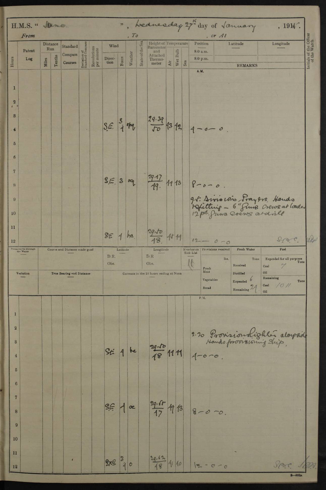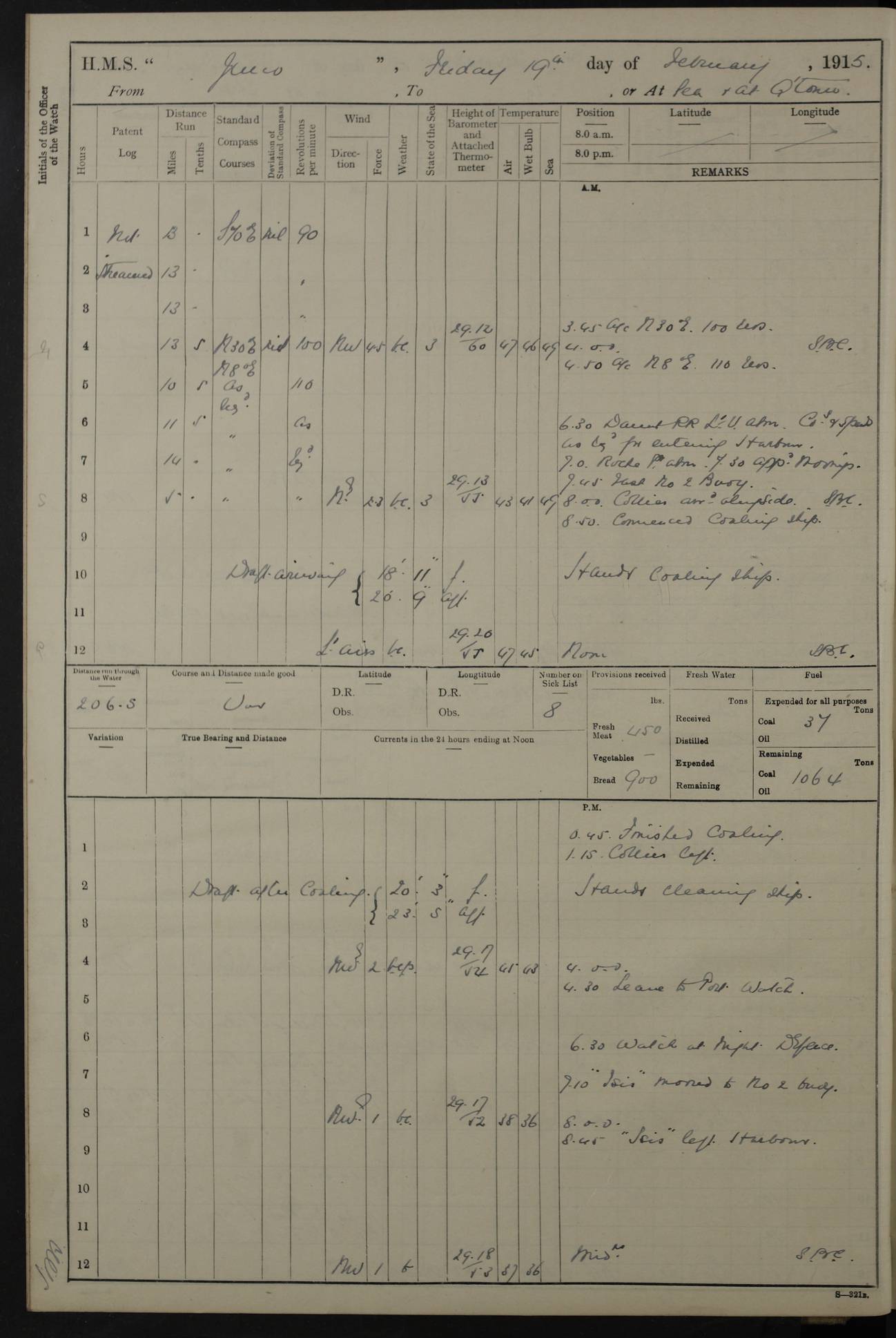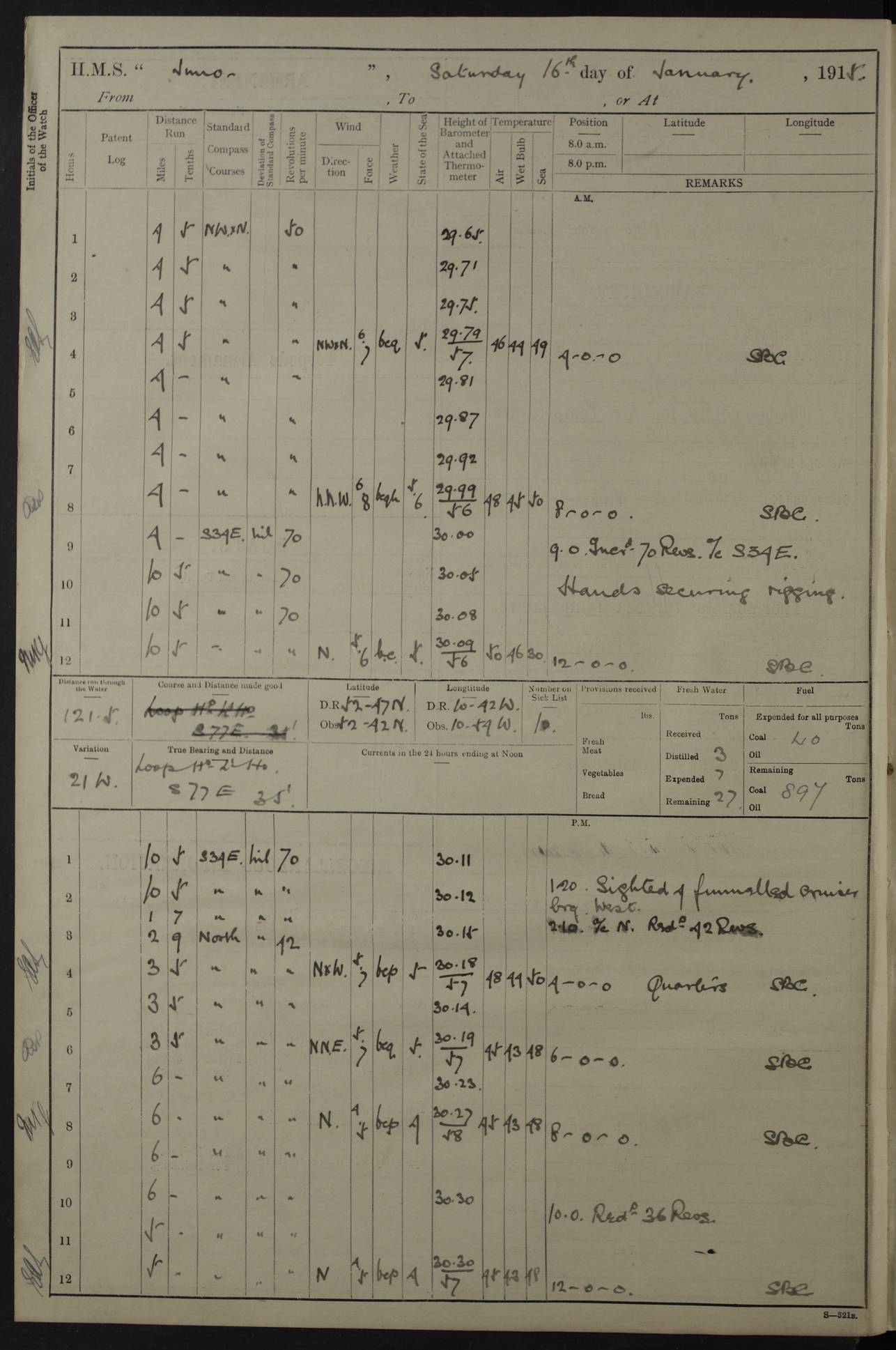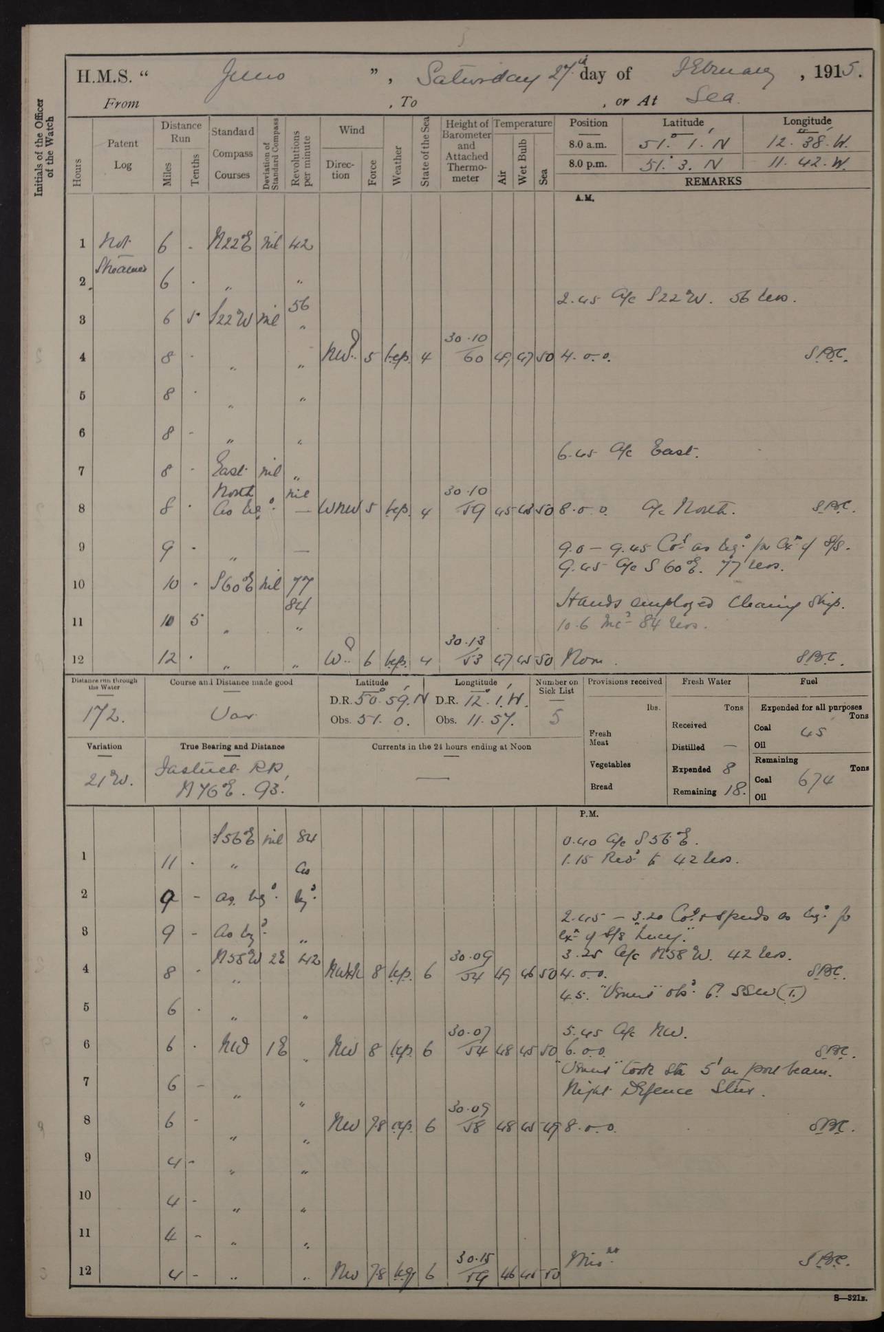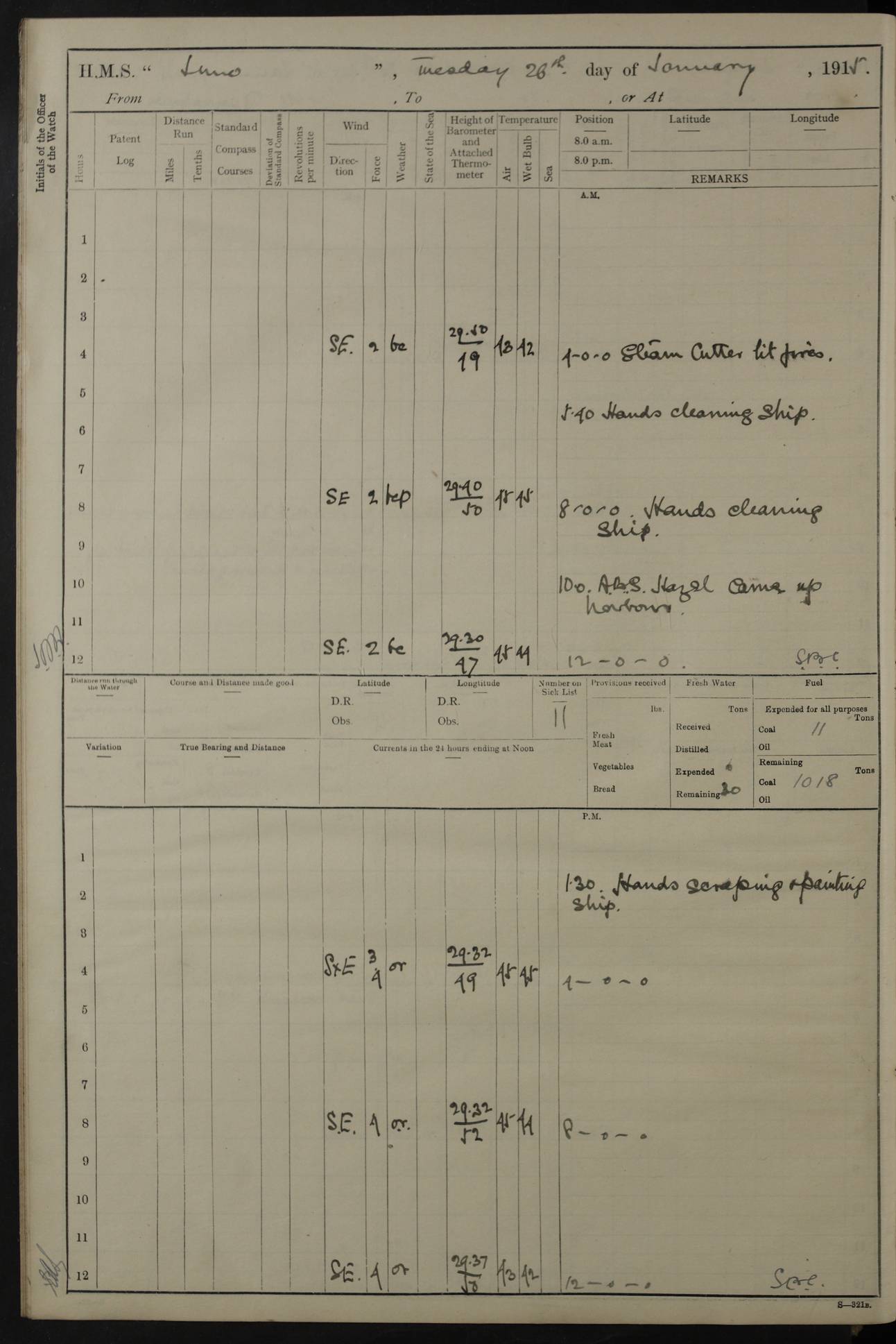 LOG BOOK – JANUARY 16TH 1915 TO FEBRUARY 28TH 1915 LOGS FOR JANUARY 1915 4ef4f6cbe53e0a0c910022bd: (https://s3.amazonaws.com:443/oldweather/ADM53-45455/0006_0.jpg) 16 January 1915 At sea Lat 52.7, Long -11.0 1.20pm: Sighted four funnelled cruiser bearing west Number on sick list = 10 4ef4f6cbe53e0a0c910022be: (https://s3.amazonaws.com:443/oldweather/ADM53-45455/0006_1.jpg) 17 January 1915 At sea Lat 52.9, Long -10.7 2.15pm: Sighted HMS SUTLEJ Starboard beam [HMS SUTLEJ was a Cressy Class armoured cruiser. 2 x 9” guns, launched November 1899] 6.55pm: Observed Glare of Clyne House N31½E Number on sick list = 10 4ef4f6cce53e0a0c910022bf: (https://s3.amazonaws.com:443/oldweather/ADM53-45455/0007_0.jpg) 18 January 1915 At sea Lat 53.2, Long -10.7 5.37am: Black Rock Light N 28E 5.0pm: Passed HMS MONARCH steering North [HMS MONARCH was an Orion Class Battleship launched in March 1911, 10 x 13.5” guns.] Number on sick list = 10 4ef4f6cce53e0a0c910022c0: (https://s3.amazonaws.com:443/oldweather/ADM53-45455/0007_1.jpg) 19 January 1915 At sea Lat 53.1, Long -10.6 1.20am: Sighted Seragh Island Light S65E, 26 miles 7.10pm: Loop Head Light Abeam 8.15am: Course as required to examine SS WHEATFIELD of Cardiff Number in sick list = 10 4ef4f6cce53e0a0c910022c1: (https://s3.amazonaws.com:443/oldweather/ADM53-45455/0008_0.jpg) 20 January 1915 At sea Lat 53.2, Long -10.6 4.0am: Slyne Head Light abeam, 7 miles 7.40pm: Loop Head S56E Number on sick list = 9 4ef4f6cce53e0a0c910022c2: (https://s3.amazonaws.com:443/oldweather/ADM53-45455/0008_1.jpg) 21 January 1915 At sea Lat 52.5, Long -11.4 5.20pm: Tearaght abeam, 17 miles 12.0M: Fastnet Light abeam Number on sick list = 10 4ef4f6cde53e0a0c910022c3: (https://s3.amazonaws.com:443/oldweather/ADM53-45455/0009_0.jpg) 22 January 1915 At sea to Queenstown [Queenstown was the English name for Cobh which is the harbour and port for Cork, Eire] Lat 51.9, Long -8.3 3.55am: Galley Head Light abeam, 10 miles 11.55am: Course as requisite for rounding Bull Rock 12.10pm: Course as requisite for entering Ballingskellig Bay 1.30pm: Stopped engines 1.48pm: Proceeded 8.52pm: Old Head Kinsale Light abeam, 4½ miles 11.10pm: Secured to No 2 buoy Queenstown Number on sick list = 10 4ef4f6cde53e0a0c910022c4: (https://s3.amazonaws.com:443/oldweather/ADM53-45455/0009_1.jpg) 23 January 1915 Queenstown Lat 51.9, Long -8.3 8.40am: Collier POMERAN came alongside, coal ship 9.40am: Discharged two ratings to Haulbowline Hospital Number on sick list = 11 4ef4f6cee53e0a0c910022c5: (https://s3.amazonaws.com:443/oldweather/ADM53-45455/0010_0.jpg) 24 January 1915 Queenstown Lat 51.9, Long -8.3 Number on sick list = 11 4ef4f6cee53e0a0c910022c6: (https://s3.amazonaws.com:443/oldweather/ADM53-45455/0010_1.jpg) 25 January 1915 Queenstown Lat 51.84, Long -8.27 8.15am: HMS ISIS entered harbour & secured to No 8 buoy [HMS ISIS was an Eclipse Class protected cruiser, a sister ship of HMS JUNO] 4.0pm: Read warrants Nos 18, 19 & 20 Number on sick list = 11 4ef4f6cee53e0a0c910022c7: (https://s3.amazonaws.com:443/oldweather/ADM53-45455/0011_0.jpg) 26 January 1915 Queenstown Lat 51.9, Long -8.3 10.0am: ABS HAZEL came up harbour [Auxiliary Boarding Steamer HAZEL (also identified in the logs as HMS HAZEL) was a merchant ship requisitioned by the navy in November 1914 as a fleet auxiliary] Number on sick list = 11 4ef4f6cee53e0a0c910022c8: (https://s3.amazonaws.com:443/oldweather/ADM53-45455/0011_1.jpg) 27 January 1915 Queenstown Lat 51.9, Long -8.3 Number on sick list = 11 4ef4f6cfe53e0a0c910022c9: (https://s3.amazonaws.com:443/oldweather/ADM53-45455/0012_0.jpg) 28 January 1915 Queenstown Lat 51.9, Long -8.3 6.30am: HMS SUTLEJ arrived in port 7.30am: Coal ship Number on sick list = 9 4ef4f6cfe53e0a0c910022ca: (https://s3.amazonaws.com:443/oldweather/ADM53-45455/0012_1.jpg) 29 January 1915 Queenstown and at sea Lat 52.0, Long -10.8 0.20am: Slipped from buoy and proceeded 1.0pm: Passed Roche Point Light 4.10am: Galley Head Light abeam, 8 miles 5.30am: Signalled SS NORWEGIAN steering east 9.0am: Signalled SS HEADLANDS, for Liverpool 12.20pm: Fastnet Light abeam, 5½ miles 2.10pm: Sighted HMS VENUS & communicated [HMS VENUS was an Eclipse Class protected cruiser, a sister ship of HMS JUNO] Number on sick list = 9 4ef4f6cfe53e0a0c910022cb: (https://s3.amazonaws.com:443/oldweather/ADM53-45455/0013_0.jpg) 30 January 1915 At sea Lat 54.6, Long -11.5 Number on sick list = 8 4ef4f6cfe53e0a0c910022cc: (https://s3.amazonaws.com:443/oldweather/ADM53-45455/0013_1.jpg) 31 January 1915 At sea Lat 55.0, Long -12.5 Number on sick list = 8 LOGS FOR FEBRUARY 1915 4ef4f6d0e53e0a0c910022cd: (https://s3.amazonaws.com:443/oldweather/ADM53-45455/0014_0.jpg) 1 February 1915 At sea Lat 55.5, Long -13.0 9.45am: Commenced target practice with 12 pdr battery & DR guns 11.40am: Stopped & hoisted target Number on sick list = 9 4ef4f6d0e53e0a0c910022ce: (https://s3.amazonaws.com:443/oldweather/ADM53-45455/0014_1.jpg) 2 February 1915 At sea Lat 55.3, Long -12.1 Number on sick list = 10 4ef4f6d0e53e0a0c910022cf: (https://s3.amazonaws.com:443/oldweather/ADM53-45455/0015_0.jpg) 3 February 1915 At sea Lat 54.8, Long -12.8 11.0am: Sheet anchor securing chains adrift. Hands employed lashing sheet anchors Washed overboard during gale, Canvas hose No 3 40ft, patt no III. Copper branch pipes No 3 size Number on sick list = 10 4ef4f6d0e53e0a0c910022d0: (https://s3.amazonaws.com:443/oldweather/ADM53-45455/0015_1.jpg) 4 February 1915 At sea Lat 53.6, Long -14.8 10.0am: Hands repairing windsails 5.0pm: Hands employed securing sheet anchors Number on sick list = 9 4ef4f6d1e53e0a0c910022d1: (https://s3.amazonaws.com:443/oldweather/ADM53-45455/0016_0.jpg) 5 February 1915 At sea Lat 55.2, Long -11.2 12.45pm: Monthly payment made to ship's company 9.20pm: Signalled Cable steamer COLONIA, steering SW Number on sick list = 9 4ef4f6d1e53e0a0c910022d2: (https://s3.amazonaws.com:443/oldweather/ADM53-45455/0016_1.jpg) 6 February 1915 At sea Lat 53.4, Long -10.6