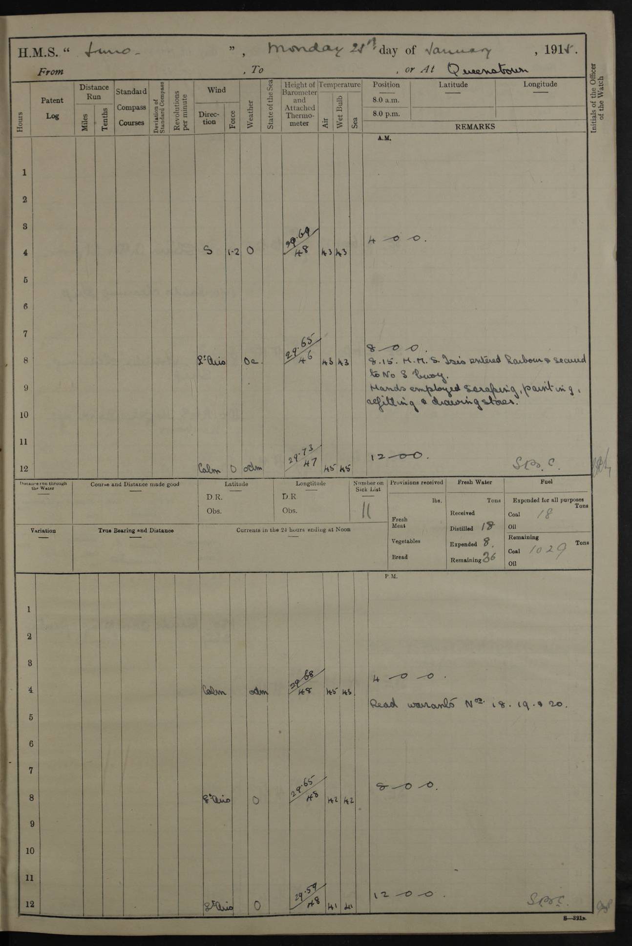 4caf870ecadfd341970190e1: (http://oldweather.s3.amazonaws.com/ADM_53-45460/ADM 53-45460-011_1.jpg) 17 July 1915 Port Said to Aden In Suez Canal Lat 31.3, Long 32.3 1.15am: Finished coaling, 715 tons 4.17pm: Weighed, left berth & proceeded into Canal 11.18pm: Entered Lake Imisah Number on sick list = 14 4caf870ecadfd341970190e2: (http://oldweather.s3.amazonaws.com/ADM_53-45460/ADM 53-45460-012_0.jpg) 18 July 1915 Port Said to Aden Lat 29.2, Long 32.7 2.0am: Entered Bitter Lake 8.18am: Exchanged courtesies with French Cruiser MONTCALM 8.20am: Left Canal & discharged pilot 4.37pm: Ras Gharib Light abeam 2 miles Number on sick list = 13 4caf870ecadfd341970190e3: (http://oldweather.s3.amazonaws.com/ADM_53-45460/ADM 53-45460-012_1.jpg) 19 July 1915 Port Said to Aden Lat 24.8, Long 35.8 4.44am: Brothers Light abeam, 4 miles 12.06pm: Deadalus Light House abeam 2½ miles 6.8pm: St Johns Island abeam, 21 miles Number on sick list = 14 4caf870ecadfd341970190e4: (http://oldweather.s3.amazonaws.com/ADM_53-45460/ADM 53-45460-013_0.jpg) 20 July 1915 Port Said to Aden Lat 20.4, Long 38.6 Number on sick list = 15 4caf870ecadfd341970190e5: (http://oldweather.s3.amazonaws.com/ADM_53-45460/ADM 53-45460-013_1.jpg) 21 July 1915 Port Said to Aden Lat 16.3, Long 40.6 9.30am: All bedding aired Number on sick list = 19 4caf870ecadfd341970190e6: (http://oldweather.s3.amazonaws.com/ADM_53-45460/ADM 53-45460-014_0.jpg) 22 July 1915 Perim Lat 13.3, Long 43.0 6.35am: Abu Ail Light abeam 1¼ miles 3.5pm: Signalled HMS EMPRESS OF RUSSIA 4.38pm: Anchored in Perim Harbour, coal ship 9.0pm: HMS ENTERPRISE arrived Number on sick list = 15 4caf870ecadfd341970190e7: (http://oldweather.s3.amazonaws.com/ADM_53-45460/ADM 53-45460-014_1.jpg) 23 July 1915 Perim to Aden Lat 12.5, Long 44.2 0.10am: Finished coaling, recd 380 tons 6.20am Received fresh provisions 6.33am Anchor aweigh & left harbour 10.48am: Courses & speed as requisite to send mails to HMS VENUS 6.18pm: Stopped & pilot embarked 7.0pm: Anchored in Aden Harbour. Made fast to No 8 buoy Number on sick list = 13 4caf870ecadfd341970190e8: (http://oldweather.s3.amazonaws.com/ADM_53-45460/ADM 53-45460-015_0.jpg) 24 July 1915 Aden Lat 12.8, Long 45.0 10.30am: Diver employed clearing starboard propeller 6.30pm: Russian gunboat sailed Number on sick list = 24 4caf870ecadfd341970190e9: (http://oldweather.s3.amazonaws.com/ADM_53-45460/ADM 53-45460-015_1.jpg) 25 July 1915 Aden Lat 12.8, Long 45.0 Number on sick list = 30 4caf870fcadfd341970190ea: (http://oldweather.s3.amazonaws.com/ADM_53-45460/ADM 53-45460-016_0.jpg) 26 July 1915 Aden Lat 12.8, Long 45.0 Number on sick list = 27 4caf870fcadfd341970190eb: (http://oldweather.s3.amazonaws.com/ADM_53-45460/ADM 53-45460-016_1.jpg) 27 July 1915 Aden Lat 12.8, Long 45.0 4.0pm: Received 4 bags of mail Number on sick list = 19 4caf870fcadfd341970190ec: (http://oldweather.s3.amazonaws.com/ADM_53-45460/ADM 53-45460-017_0.jpg) 28 July 1915 Aden to Maskat [also written Muskat in the logs, transcribed as written] Lat 12.9, Long 45.8 5.55am: Slipped from buoy. 6.2am: Anchor aweigh & proceeded 7.30am: Ras Marshaq North, 2 miles Number on sick list = 19 4caf870fcadfd341970190ed: (http://oldweather.s3.amazonaws.com/ADM_53-45460/ADM 53-45460-017_1.jpg) 29 July 1915 Aden to Maskat Lat 13.8, Long 50.3 11.0am: Landing parties at musketry Number on sick list = 22 4caf870fcadfd341970190ee: (http://oldweather.s3.amazonaws.com/ADM_53-45460/ADM 53-45460-018_0.jpg) 30 July 1915 Aden to Maskat Lat 15.7, Long 54.9 10.30am: Torpedo training classes at instruction, 6" guns crews at loader Number on sick list = 20 4caf870fcadfd341970190ef: (http://oldweather.s3.amazonaws.com/ADM_53-45460/ADM 53-45460-018_1.jpg) 31 July 1915 Aden to Maskat Lat 19.2, Long 58.8 Number on sick list = 21 4caf870fcadfd341970190f0: (http://oldweather.s3.amazonaws.com/ADM_53-45460/ADM 53-45460-019_0.jpg) 4caf870fcadfd341970190f1: (http://oldweather.s3.amazonaws.com/ADM_53-45460/ADM 53-45460-019_1.jpg) 4caf870fcadfd341970190f2: (http://oldweather.s3.amazonaws.com/ADM_53-45460/ADM 53-45460-020_0.jpg) 4caf870fcadfd341970190f3: (http://oldweather.s3.amazonaws.com/ADM_53-45460/ADM 53-45460-020_1.jpg) LOGS FOR AUGUST 1915 4caf870fcadfd341970190f4: (http://oldweather.s3.amazonaws.com/ADM_53-45461/ADM 53-45461-001_0.jpg) 4caf870fcadfd341970190f5: (http://oldweather.s3.amazonaws.com/ADM_53-45461/ADM 53-45461-001_1.jpg) 4caf870fcadfd341970190f6: (http://oldweather.s3.amazonaws.com/ADM_53-45461/ADM 53-45461-002_0.jpg) 4caf870fcadfd341970190f7: (http://oldweather.s3.amazonaws.com/ADM_53-45461/ADM 53-45461-002_1.jpg) 4caf870fcadfd341970190f8: (http://oldweather.s3.amazonaws.com/ADM_53-45461/ADM 53-45461-003_0.jpg) Barometer: Mercurial Maker & Number: Negretti & Zambra No 158 Height of cistern above sea: 15 ft. 4caf870fcadfd341970190f9: (http://oldweather.s3.amazonaws.com/ADM_53-45461/ADM 53-45461-003_1.jpg) 1 August 1915 Aden to Muskat Lat 23.4, Long 58.9 11.55am: Ras Daub abeam 12.47pm: Bander Rharsan abeam, 3 miles 2.0pm: Anchored in Maskat harbour 3.0pm: Coal lighter alongside, coal ship 5.40pm: Hove up & shifted berth 7.40pm: Finished with engines & recommenced coaling Number on sick list = 23 4caf870fcadfd341970190fa: (http://oldweather.s3.amazonaws.com/ADM_53-45461/ADM 53-45461-004_0.jpg) 2 August 1915 Muskat to Bushire Lat 23.7, Long 57.6 11.0am: Finished coaling, 360 tons 11.37am: Anchor aweigh & proceeded Number on sick list = 52 4caf870fcadfd341970190fb: (http://oldweather.s3.amazonaws.com/ADM_53-45461/ADM 53-45461-004_1.jpg) 3 August 1915 Maskat to Bushire Lat 26.4, Long 56.1 8.47am: Little Quoris Island Light abeam, 3 miles 4.40pm: Jez Taub Light abeam, 2 miles Number on sick list = 70 4caf870fcadfd341970190fc: (http://oldweather.s3.amazonaws.com/ADM_53-45461/ADM 53-45461-005_0.jpg) 4 August 1915 Muskat to Bushire Lat 27.1, Long 52.0 9.0pm: Commenced sounding at intervals of 1 hr Number on sick list = 67 4caf870fcadfd341970190fd: (http://oldweather.s3.amazonaws.com/ADM_53-45461/ADM 53-45