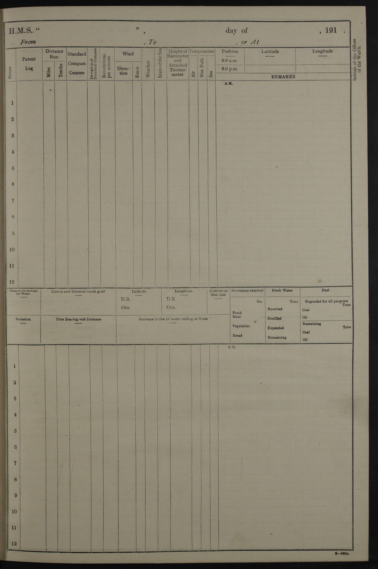4caf8722cadfd341970196ee: (http://oldweather.s3.amazonaws.com/ADM 53-45469/ADM 53-45469-009_0.jpg) 12 April 1916 Bushire to Bombay Lat 28.9, Long 50.8 10.0am: Struck Commodore’s pennant. AZERBAIDJAN’s & EDWARD ROSS’s crews returned on board 11.55am: Anchor aweigh, slow ahead 2.45pm: Asses Ears abeam 4caf8722cadfd341970196ef: (http://oldweather.s3.amazonaws.com/ADM 53-45469/ADM 53-45469-009_1.jpg) 13 April 1916 Bushire to Bombay Lat 26.3, Long 54.3 3.30pm: Feeler for sounding machine lost overboard 7.00am: Wind increasing. 1.12pm: Farur Island abeam, 2 miles 5.54 Stopped transacted business with HMS [No name of HMS given] 6.45pm: Proceeded 4caf8722cadfd341970196f0: (http://oldweather.s3.amazonaws.com/ADM 53-45469/ADM 53-45469-010_0.jpg) 14 April 1916 Bushire to Bombay Lat 25.2, Long 58.4 3.16pm: Quoin Light dipped N50.5W 8.30am: Jashk abeam 4caf8722cadfd341970196f1: (http://oldweather.s3.amazonaws.com/ADM 53-45469/ADM 53-45469-010_1.jpg) 15 April 1916 Bushire to Bombay Lat 23.1, Long 63.2 4caf8722cadfd341970196f2: (http://oldweather.s3.amazonaws.com/ADM 53-45469/ADM 53-45469-011_0.jpg) 16 April 1916 Bushire to Bombay Lat 21.1, Long 67.7 4caf8722cadfd341970196f3: (http://oldweather.s3.amazonaws.com/ADM 53-45469/ADM 53-45469-011_1.jpg) 17 April 1916 Bushire to Bombay Lat 19.1, Long 72.3 1.0pm: Sighted land 3.32pm: Light vessel abeam, course as required for entering Bombay harbour 4.30pm: Shackled to centre troopship buoy 5.30pm: Received nine bags mail 4caf8722cadfd341970196f4: (http://oldweather.s3.amazonaws.com/ADM 53-45469/ADM 53-45469-012_0.jpg) 18 April 1916 Bombay Lat 19.0, Long 72.9 5.40am: Discharging cordite to lighters 11.0am: Lighter left with ammunition 9.30pm: Starboard watch left for leave in Hill station 4caf8722cadfd341970196f5: (http://oldweather.s3.amazonaws.com/ADM 53-45469/ADM 53-45469-012_1.jpg) 19 April 1916 Bombay Lat 19.0, Long 72.9 8.40am: Prepared ship for docking 9.20am: Slipped and proceeded towards Princes Dock 9.50am: Pilot directing 10.55am: Ship entered basin assisted by tugs 11.40am: In dry dock & in position for shoring up 5.30pm: Gave leave to first part of port watch till 7am Monday 4caf8722cadfd341970196f6: (http://oldweather.s3.amazonaws.com/ADM 53-45469/ADM 53-45469-013_0.jpg) 20 April 1916 Bombay Lat 19.0, Long 72.9 4caf8722cadfd341970196f7: (http://oldweather.s3.amazonaws.com/ADM 53-45469/ADM 53-45469-013_1.jpg) 21 April 1916 Bombay Lat 19.0, Long 72.9 9.10am: Hands employed working cable, getting it ashore to be tested 4caf8722cadfd341970196f8: (http://oldweather.s3.amazonaws.com/ADM 53-45469/ADM 53-45469-014_0.jpg) 22 April 1916 Bombay Lat 19.0, Long 72.9 4caf8722cadfd341970196f9: (http://oldweather.s3.amazonaws.com/ADM 53-45469/ADM 53-45469-014_1.jpg) 23 April 1916 Bombay Lat 19.0, Long 72.9 4caf8722cadfd341970196fa: (http://oldweather.s3.amazonaws.com/ADM 53-45469/ADM 53-45469-015_0.jpg) 24 April 1916 Bombay Lat 19.0, Long 72.9 10.0am: Two POs, one ERA and one Private RMLI rejoined ship 12.05pm: One seedee boy sent to hospital 4caf8722cadfd341970196fb: (http://oldweather.s3.amazonaws.com/ADM 53-45469/ADM 53-45469-015_1.jpg) 25 April 1916 Bombay Lat 19.0, Long 72.9 4caf8722cadfd341970196fc: (http://oldweather.s3.amazonaws.com/ADM 53-45469/ADM 53-45469-016_0.jpg) 26 April 1916 Bombay Lat 19.0, Long 72.9 4caf8722cadfd341970196fd: (http://oldweather.s3.amazonaws.com/ADM 53-45469/ADM 53-45469-016_1.jpg) 27 April 1916 Bombay Lat 19.0, Long 72.9 6.45am: Commenced flooding dock 7.40am: Hands came on board from camp 8.30am: Ship proceeded out of dry dock to basin, assisted by two tugs 9.50am: Arrived in new berth 12.15pm: Shifted ship 4caf8722cadfd341970196fe: (http://oldweather.s3.amazonaws.com/ADM 53-45469/ADM 53-45469-017_0.jpg) 28 April 1916 Bombay Lat 19.0, Long 72.9 5.30pm: Pinnace, barge & cutter left ship for dockyard. 4caf8722cadfd341970196ff: (http://oldweather.s3.amazonaws.com/ADM 53-45469/ADM 53-45469-017_1.jpg) 29 April 1916 Bombay Lat 19.0, Long 72.9 9.0pm: Port watch left Bombay for Deolali. [Deolali was the Navy leave camp in the hills 100 miles north of Bombay. It is the source of the term “Doolali” meaning mad.] 4caf8722cadfd34197019700: (http://oldweather.s3.amazonaws.com/ADM 53-45469/ADM 53-45469-018_0.jpg) 30 April 1916 Bombay Lat 19.0, Long 72.9 4caf8722cadfd34197019701: (http://oldweather.s3.amazonaws.com/ADM 53-45469/ADM 53-45469-018_1.jpg) 4caf8723cadfd34197019702: (http://oldweather.s3.amazonaws.com/ADM 53-45469/ADM 53-45469-019_0.jpg) 4caf8723cadfd34197019703: (http://oldweather.s3.amazonaws.com/ADM 53-45469/ADM 53-45469-019_1.jpg) 4caf8723cadfd34197019704: (http://oldweather.s3.amazonaws.com/ADM 53-45469/ADM 53-45469-020_0.jpg) 4caf8723cadfd34197019705: (http://oldweather.s3.amazonaws.com/ADM 53-45469/ADM 53-45469-020_1.jpg) 4caf8723cadfd34197019706: (http://oldweather.s3.amazonaws.com/ADM 53-45469/ADM 53-45469-021_0.jpg) 4caf8723cadfd34197019707: (http://oldweather.s3.amazonaws.com/ADM 53-45469/ADM 53-45469-021_1.jpg) LOGS FOR MAY 1916 4caf8712cadfd3419701920a: (http://oldweather.s3.amazonaws.com/ADM_53-45470/ADM 53-45470-001_0.jpg) 4caf8712cadfd3419701920b: (http://oldweather.s3.amazonaws.com/ADM_53-45470/ADM 53-45470-001_1.jpg) 4caf8712cadfd3419701920c: (http://oldweather.s3.amazonaws.com/ADM_53-45470/ADM 53-45470-002_0.jpg) 4caf8712cadfd3419701920d: (http://oldweather.s3.amazonaws.com/ADM_53-45470/ADM 53-45470-002_1.jpg) 4caf8712cadfd3419701920e: (http://oldweather.s3.amazonaws.com/ADM_53-45470/ADM 53-45470-003_0.jpg) 4caf8712cadfd3419701920f: (http://oldweather.s3.amazonaws.com/ADM_53-45470/ADM 53-45470-003_1.jpg) 1 May 1916 Bombay Lat 19.0, Long 72.9 12.10pm: Two bags mails arrived from RN depot 7.0pm: Shifted floating crane 4caf8712cadfd34197019210: (http://oldweather.s3.amazonaws.com/ADM_53-45470/ADM 53-45470-004_0.jpg) 2 May 1916 Bombay Lat 19.0, Long 72.9 10.30am: Floating crane alongside Number on sick list = 4 4caf8712cadfd34197019211: (http://oldweather.s3.amazonaws.com/ADM_53-45470/ADM 53-45470-004_1.jpg