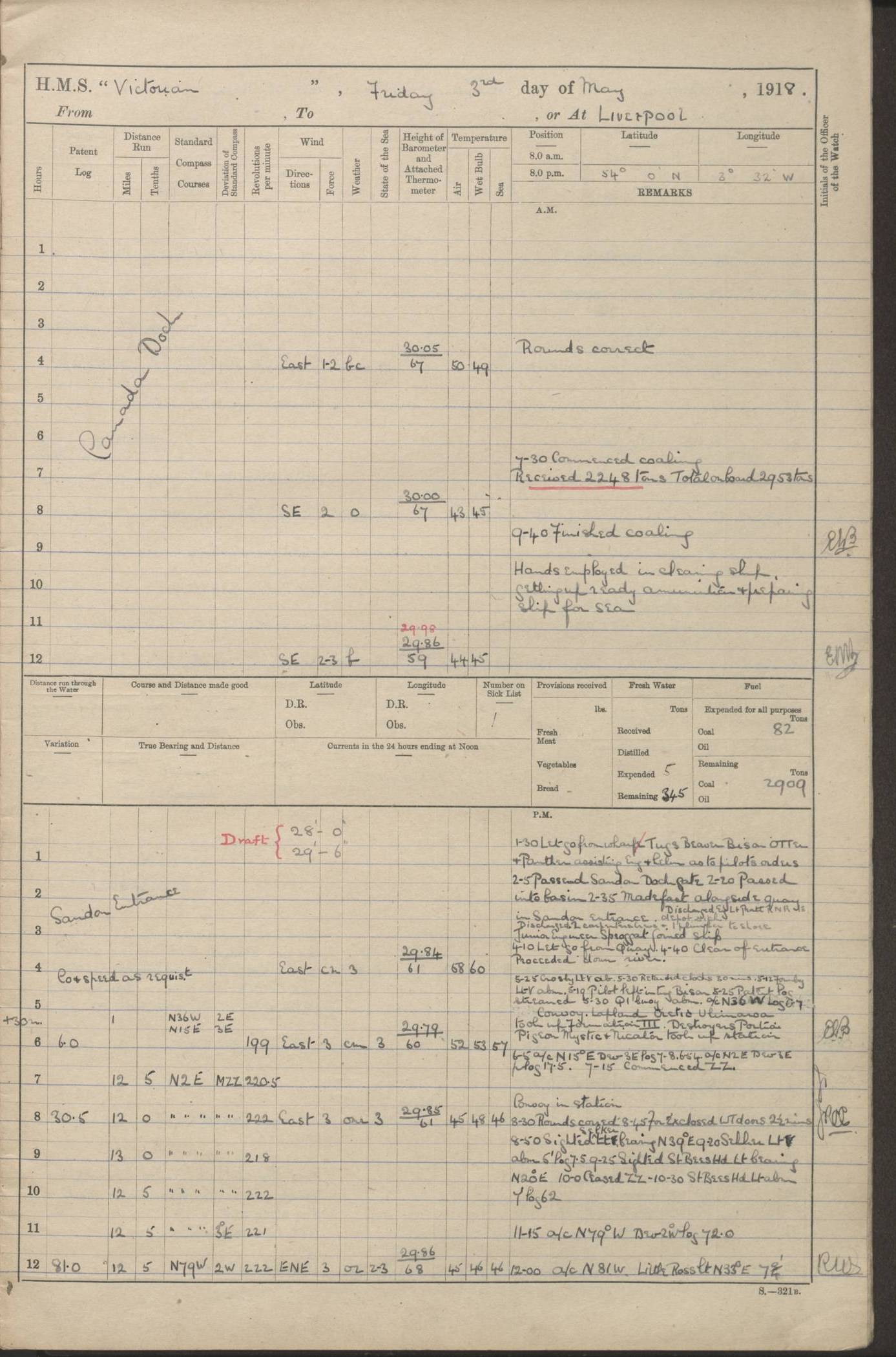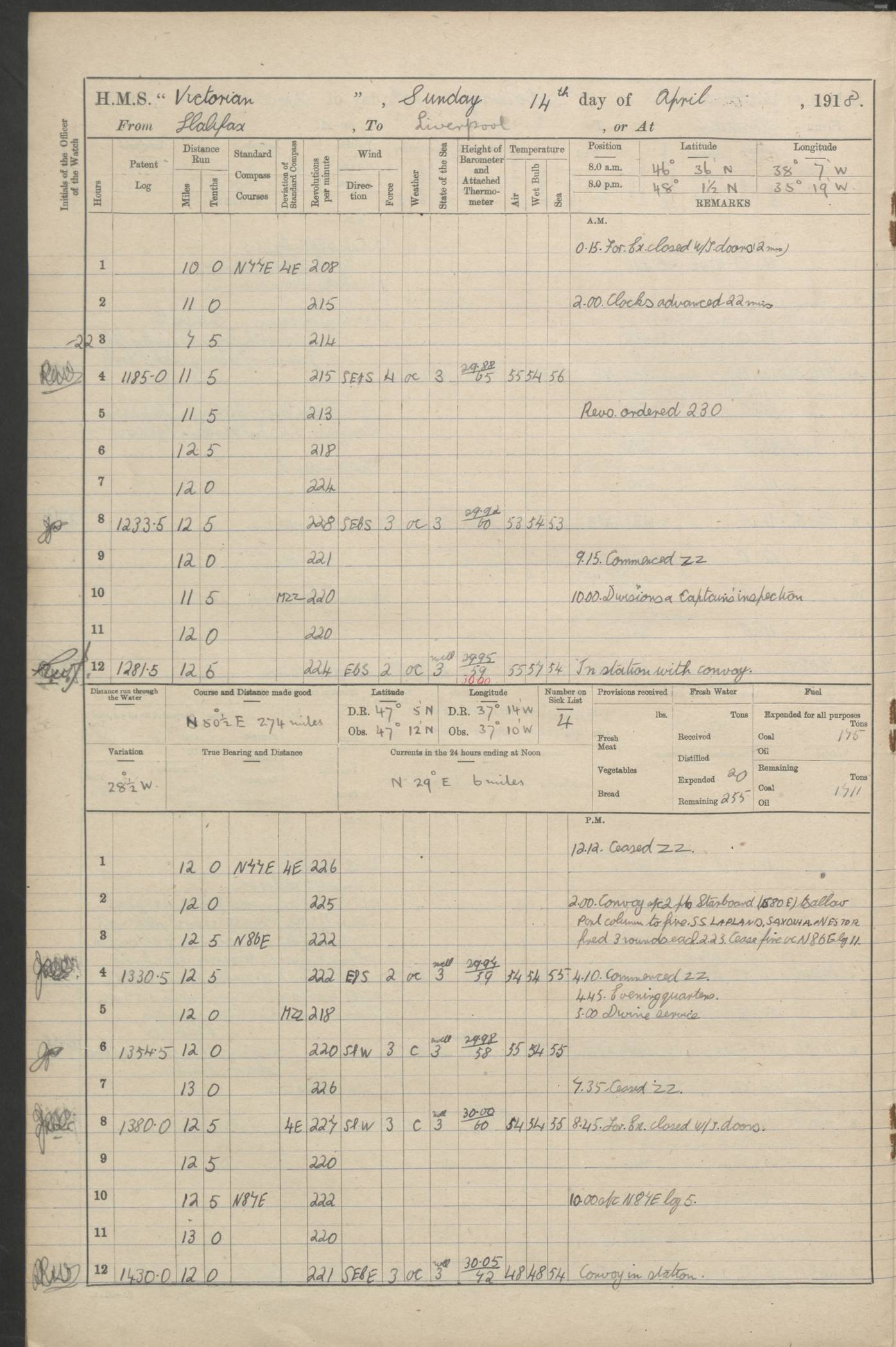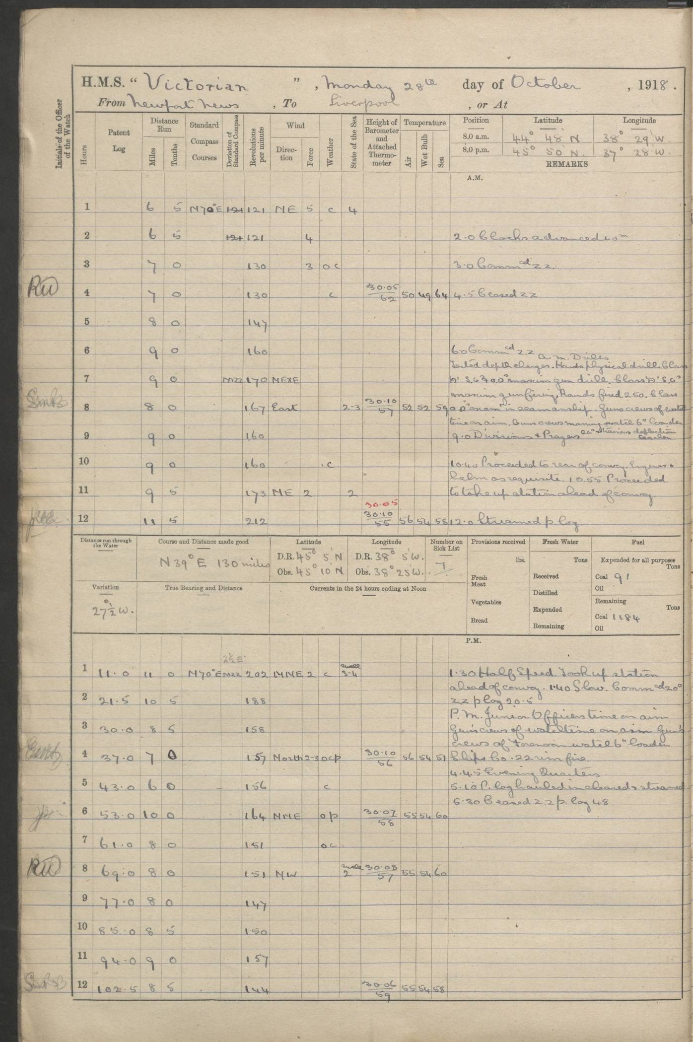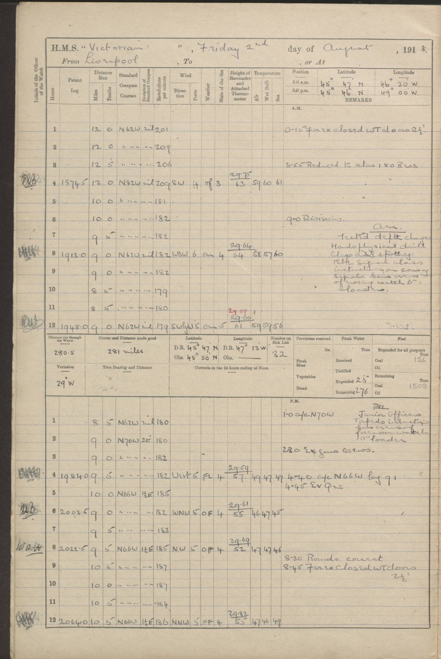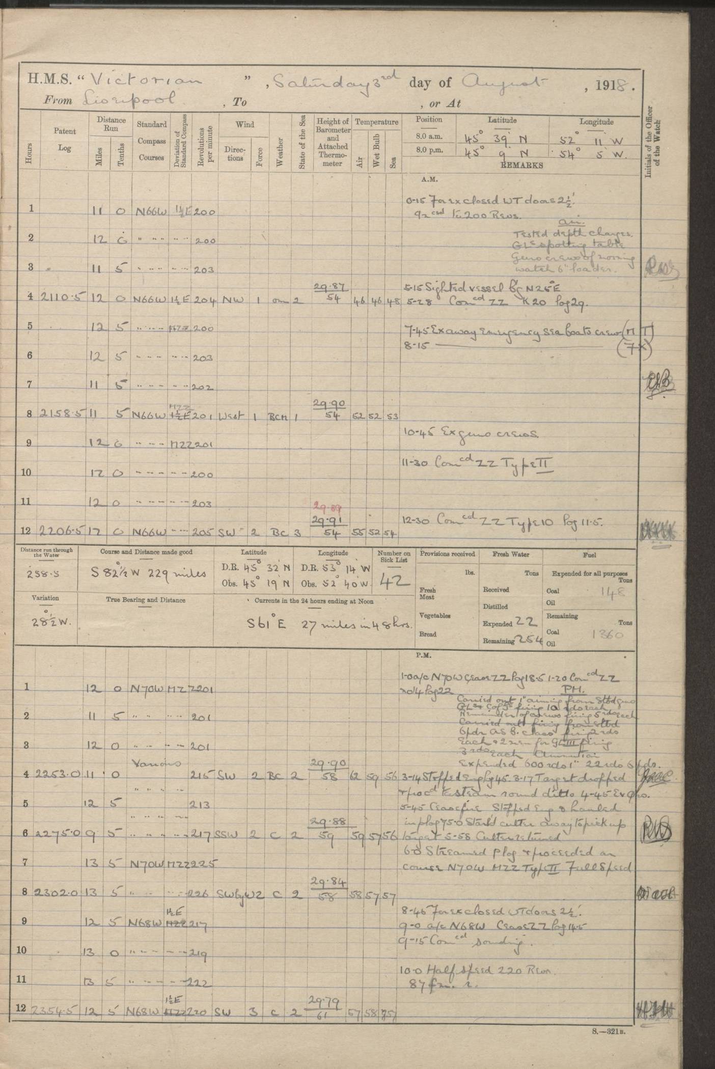 (Maps prepared using Journey Plotter, developed by Maikel. The Plots can only be approximate. They are made by joining-up positions on successive days, and sometimes positions are not given. There will therefore be occasions when the ship appears to have travelled overland) LOGS FOR AUGUST 1914 4caf8c39cadfd341970352c4: (http://oldweather.s3.amazonaws.com/ADM53-67374/ADM53-67374-001_0.jpg) 4caf8c39cadfd341970352c5: (http://oldweather.s3.amazonaws.com/ADM53-67374/ADM53-67374-001_1.jpg) 4caf8c39cadfd341970352c6: (http://oldweather.s3.amazonaws.com/ADM53-67374/ADM53-67374-002_0.jpg) 4caf8c39cadfd341970352c7: (http://oldweather.s3.amazonaws.com/ADM53-67374/ADM53-67374-002_1.jpg) 4caf8c39cadfd341970352c8: (http://oldweather.s3.amazonaws.com/ADM53-67374/ADM53-67374-003_0.jpg) 4caf8c39cadfd341970352c9: (http://oldweather.s3.amazonaws.com/ADM53-67374/ADM53-67374-003_1.jpg) 4caf8c39cadfd341970352ca: (http://oldweather.s3.amazonaws.com/ADM53-67374/ADM53-67374-004_0.jpg) 4caf8c39cadfd341970352cb: (http://oldweather.s3.amazonaws.com/ADM53-67374/ADM53-67374-004_1.jpg) 4caf8c39cadfd341970352cc: (http://oldweather.s3.amazonaws.com/ADM53-67374/ADM53-67374-005_0.jpg) 4caf8c39cadfd341970352cd: (http://oldweather.s3.amazonaws.com/ADM53-67374/ADM53-67374-005_1.jpg) Establishment of ship’s company Officers 44 Seamen 114 Boys ‒ Marines 38 Engine-room establishment 75 Other non-executive ratings 44 Total 315 BAROMETER Mercurial or aneroid: Mercurial Name of maker and number: Dobbie McInnes Height of cistern above sea: 55ft Error of mercurial barometer: .10 too low at 29.28 Thermometers for air temperature Position in ship: Fore bridge Whether in screen: Yes Maker and number: AC Cossor 3942C Date: From August 23 POSITION OF STANDARD COMPASS Top of wheel house on bridge DEVIATION OF STANDARD COMPASS Date obtained: August 23rd 1914 Position: River Mersey ARMAMENT Position: 2 guns forecastle head 2 guns forward house 2 guns after house 2 guns poop Number and nature of guns and mounting: 8 4.7” QF; P111 mountings TORPEDO ARMAMENT None BOATS Number of each carried: 8 Length and description: A lifeboats (wood) 26.2 ft Number of each carried: 4 Length and description: A lifeboats (steel) 26.0 ft MISCELLANEOUS INFORMATION Draught of water with bunkers full, and complete with provisions, stores and water: 26 ft 11 in forward; 29 ft 5 in aft Load draught: 26 ft 11 in forward; 29 ft 5 in aft Number of tons of coal carried (43 cubic feet per ton): 4541 Number of tons of oil fuel carried: None Quantity of water carried: For boilers 230; for drinking 700 THE VOYAGES OF HMS VICTORIAN 1914