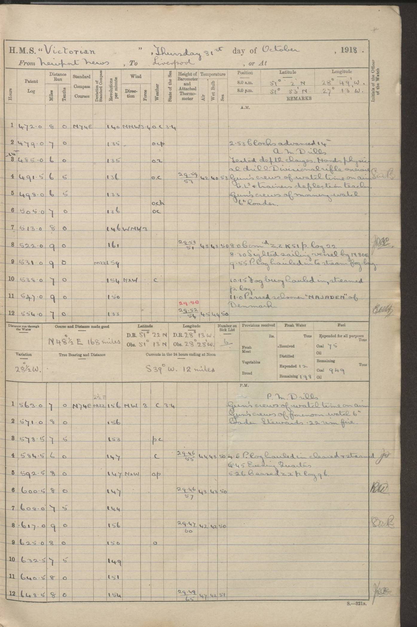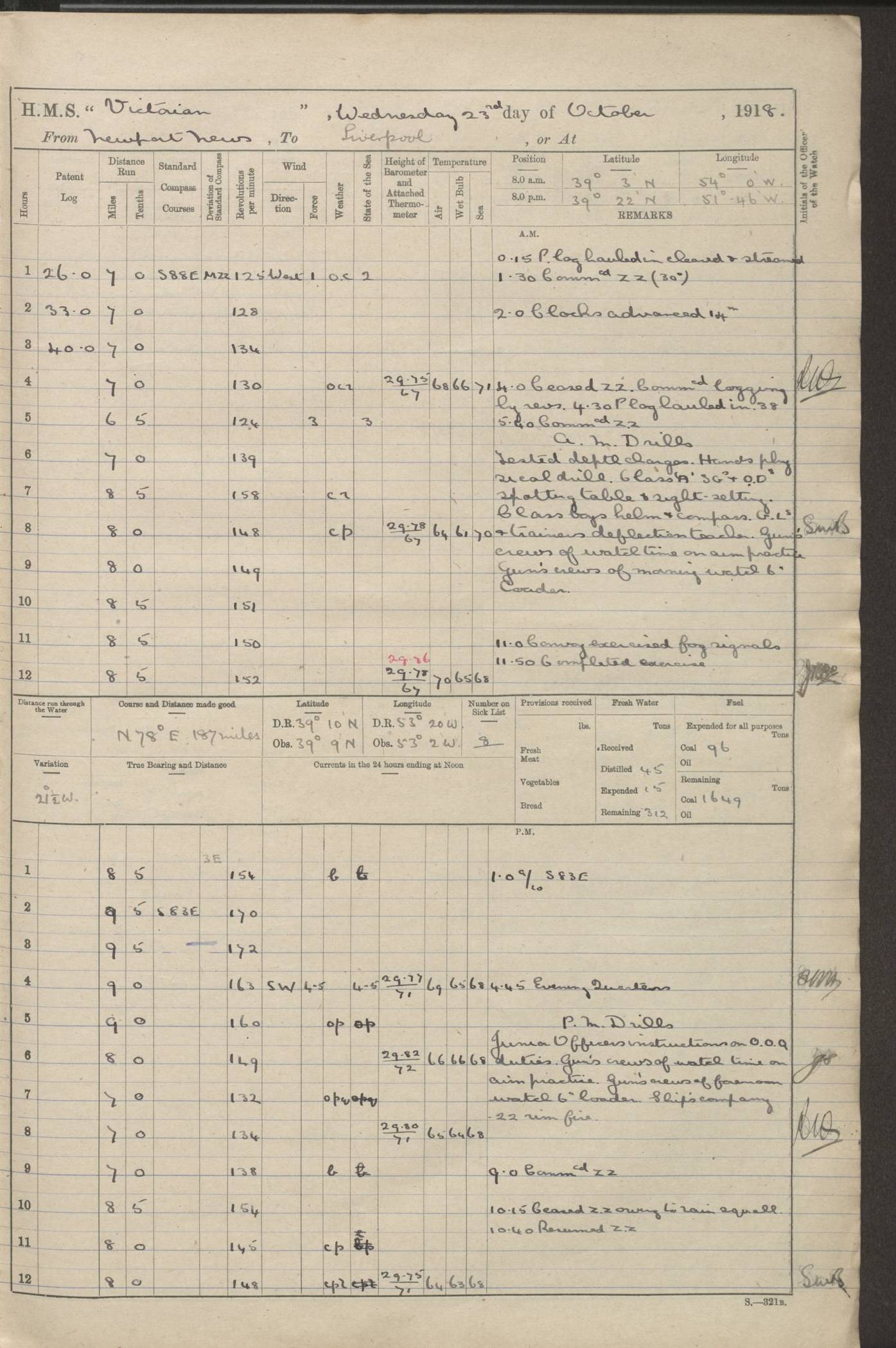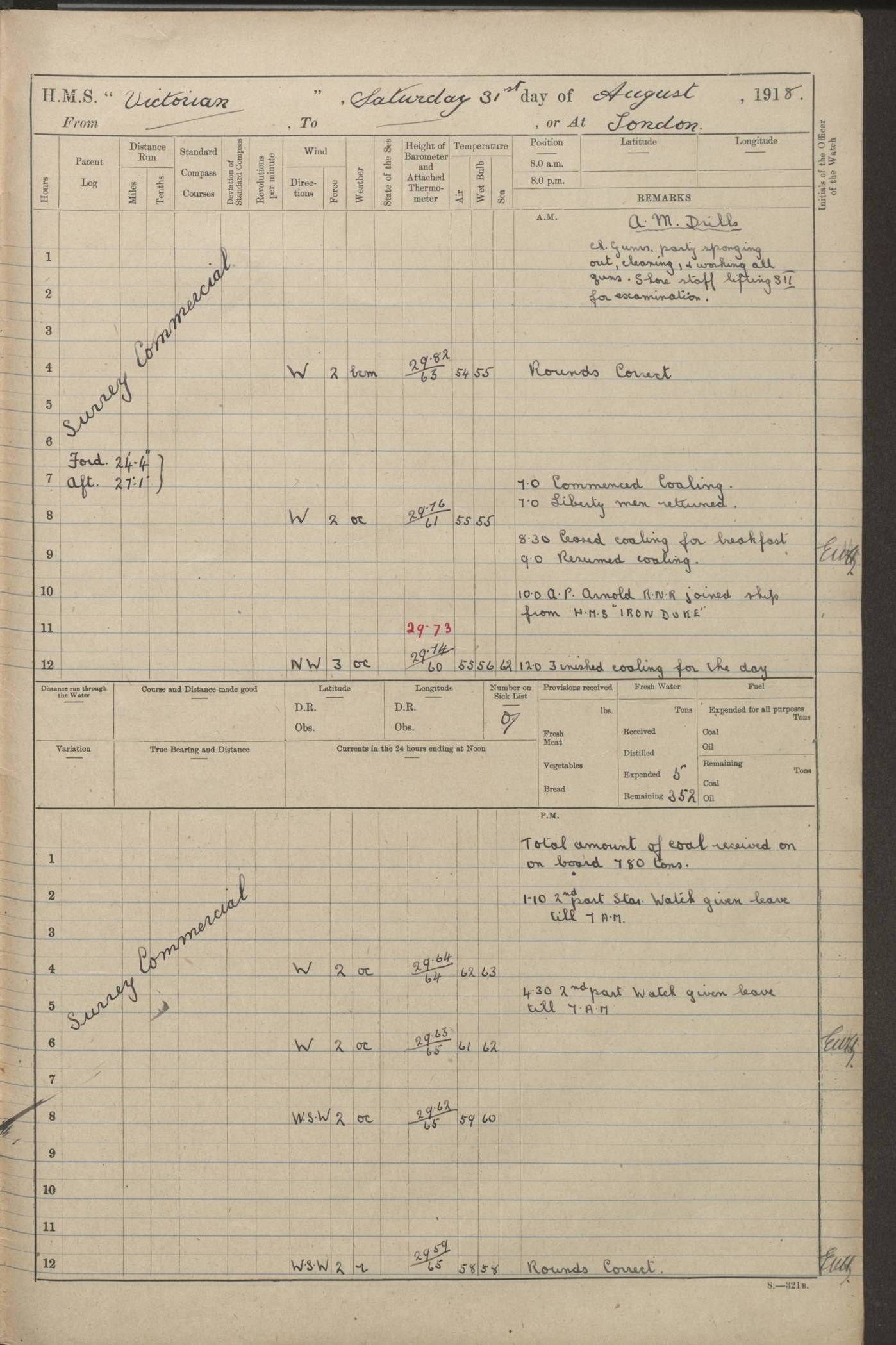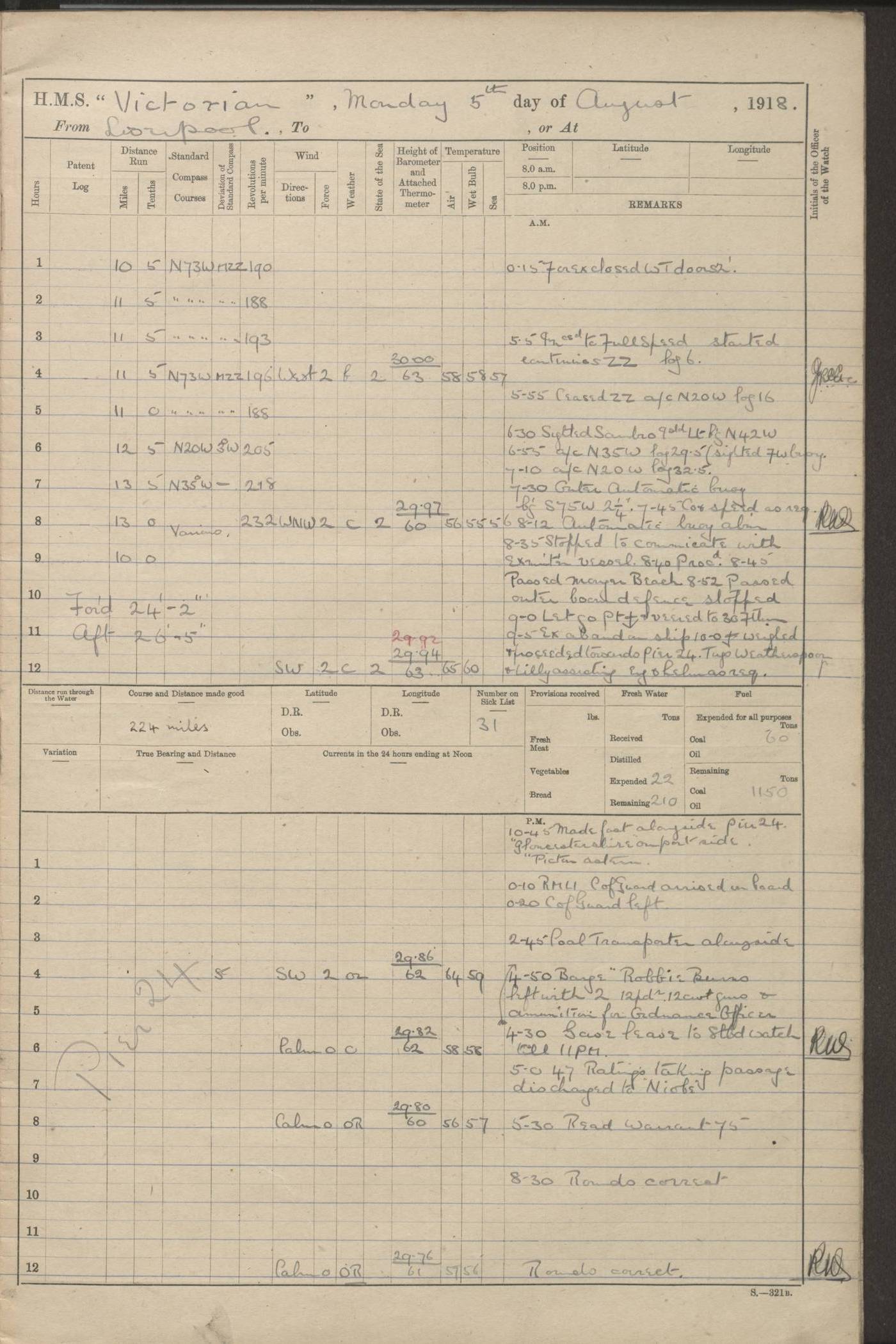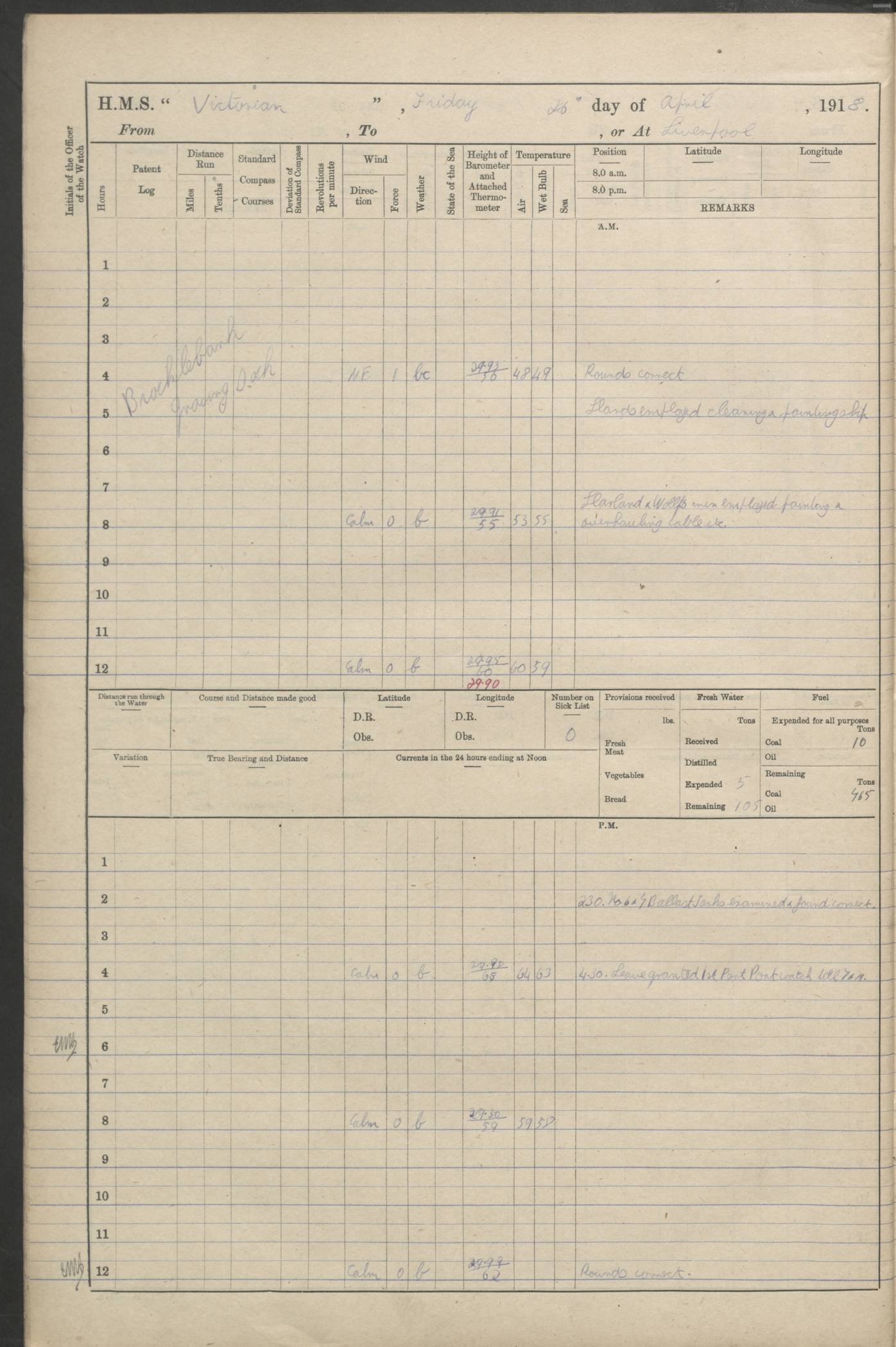 (Maps prepared using Journey Plotter, developed by Maikel. The Plots can only be approximate. They are made by joining-up positions on successive days, and sometimes positions are not given. There will therefore be occasions when the ship appears to have travelled overland) LOGS FOR AUGUST 1914 4caf8c39cadfd341970352c4: (http://oldweather.s3.amazonaws.com/ADM53-67374/ADM53-67374-001_0.jpg) 4caf8c39cadfd341970352c5: (http://oldweather.s3.amazonaws.com/ADM53-67374/ADM53-67374-001_1.jpg) 4caf8c39cadfd341970352c6: (http://oldweather.s3.amazonaws.com/ADM53-67374/ADM53-67374-002_0.jpg) 4caf8c39cadfd341970352c7: (http://oldweather.s3.amazonaws.com/ADM53-67374/ADM53-67374-002_1.jpg) 4caf8c39cadfd341970352c8: (http://oldweather.s3.amazonaws.com/ADM53-67374/ADM53-67374-003_0.jpg) 4caf8c39cadfd341970352c9: (http://oldweather.s3.amazonaws.com/ADM53-67374/ADM53-67374-003_1.jpg) 4caf8c39cadfd341970352ca: (http://oldweather.s3.amazonaws.com/ADM53-67374/ADM53-67374-004_0.jpg) 4caf8c39cadfd341970352cb: (http://oldweather.s3.amazonaws.com/ADM53-67374/ADM53-67374-004_1.jpg) 4caf8c39cadfd341970352cc: (http://oldweather.s3.amazonaws.com/ADM53-67374/ADM53-67374-005_0.jpg) 4caf8c39cadfd341970352cd: (http://oldweather.s3.amazonaws.com/ADM53-67374/ADM53-67374-005_1.jpg) Establishment of ship’s company Officers 44 Seamen 114 Boys ‒ Marines 38 Engine-room establishment 75 Other non-executive ratings 44 Total 315 BAROMETER Mercurial or aneroid: Mercurial Name of maker and number: Dobbie McInnes Height of cistern above sea: 55ft Error of mercurial barometer: .10 too low at 29.28 Thermometers for air temperature Position in ship: Fore bridge Whether in screen: Yes Maker and number: AC Cossor 3942C Date: From August 23 POSITION OF STANDARD COMPASS Top of wheel house on bridge DEVIATION OF STANDARD COMPASS Date obtained: August 23rd 1914 Position: River Mersey ARMAMENT Position: 2 guns forecastle head 2 guns forward house 2 guns after house 2 guns poop Number and nature of guns and mounting: 8 4.7” QF; P111 mountings TORPEDO ARMAMENT None BOATS Number of each carried: 8 Length and description: A lifeboats (wood) 26.2 ft Number of each carried: 4 Length and description: A lifeboats (steel) 26.0 ft MISCELLANEOUS INFORMATION Draught of water with bunkers full, and complete with provisions, stores and water: 26 ft 11 in forward; 29 ft 5 in aft Load draught: 26 ft 11 in forward; 29 ft 5 in aft Number of tons of coal carried (43 cubic feet per ton): 4541 Number of tons of oil fuel carried: None Quantity of water carried: For boilers 230; for drinking 700 THE VOYAGES OF HMS VICTORIAN 1914