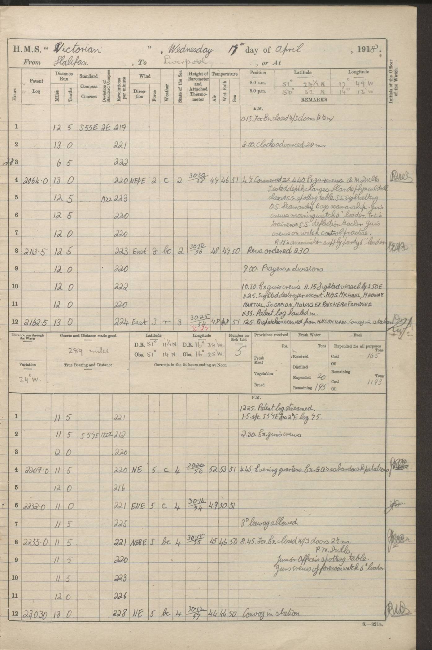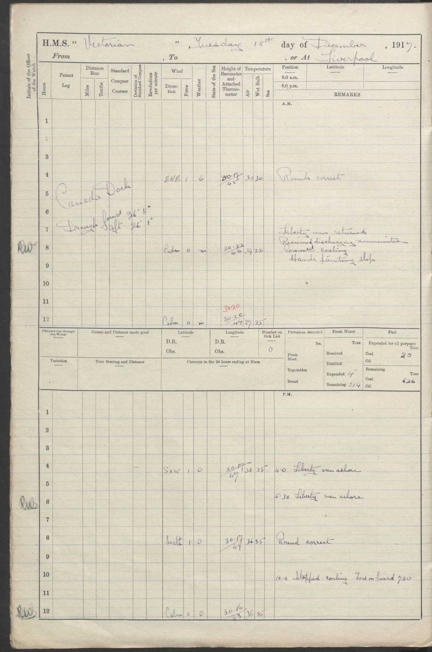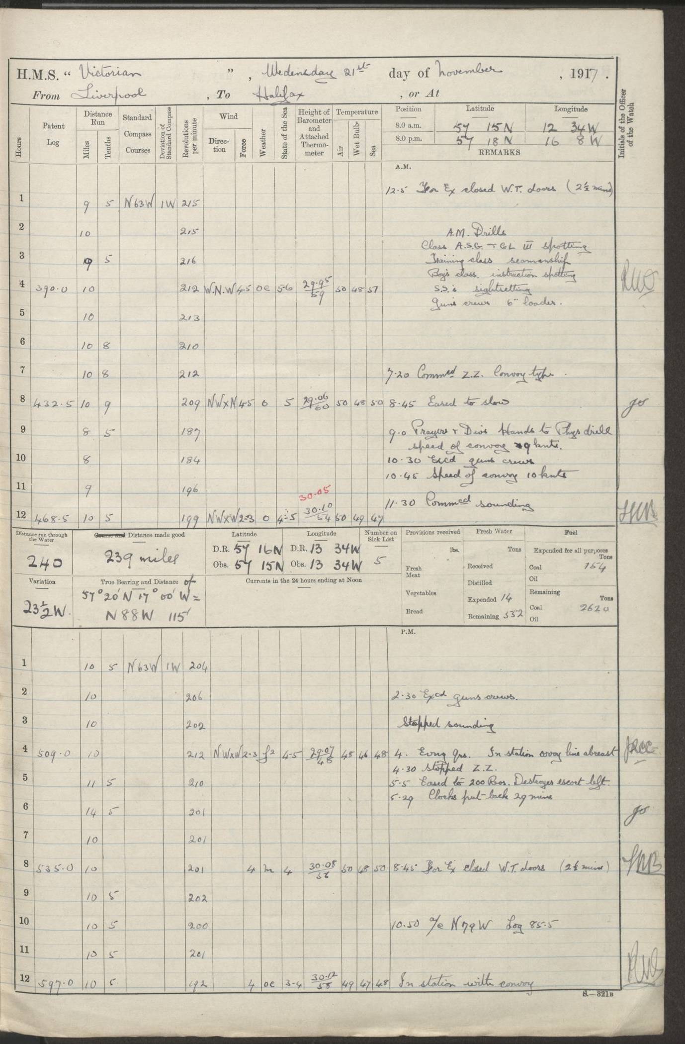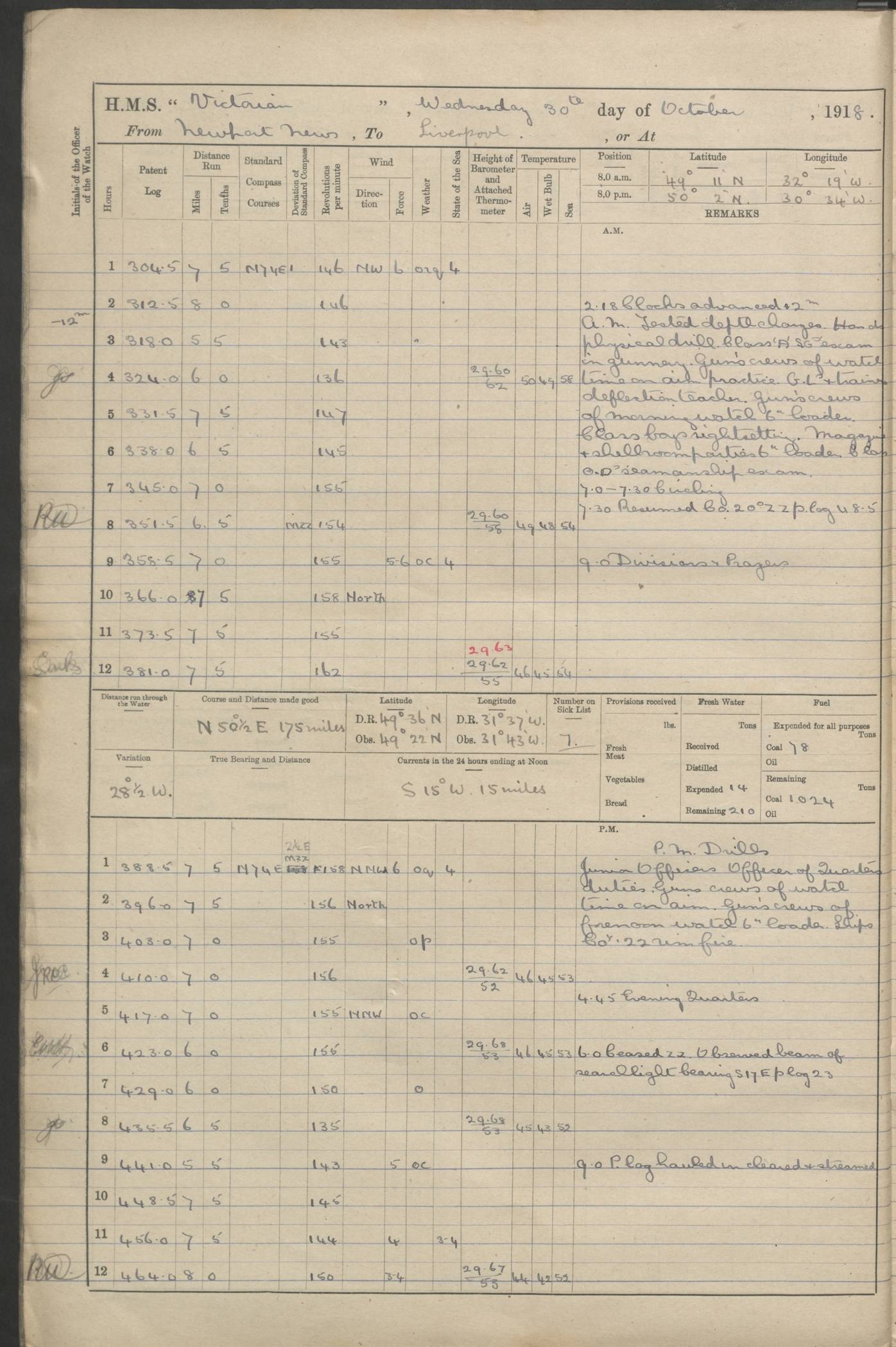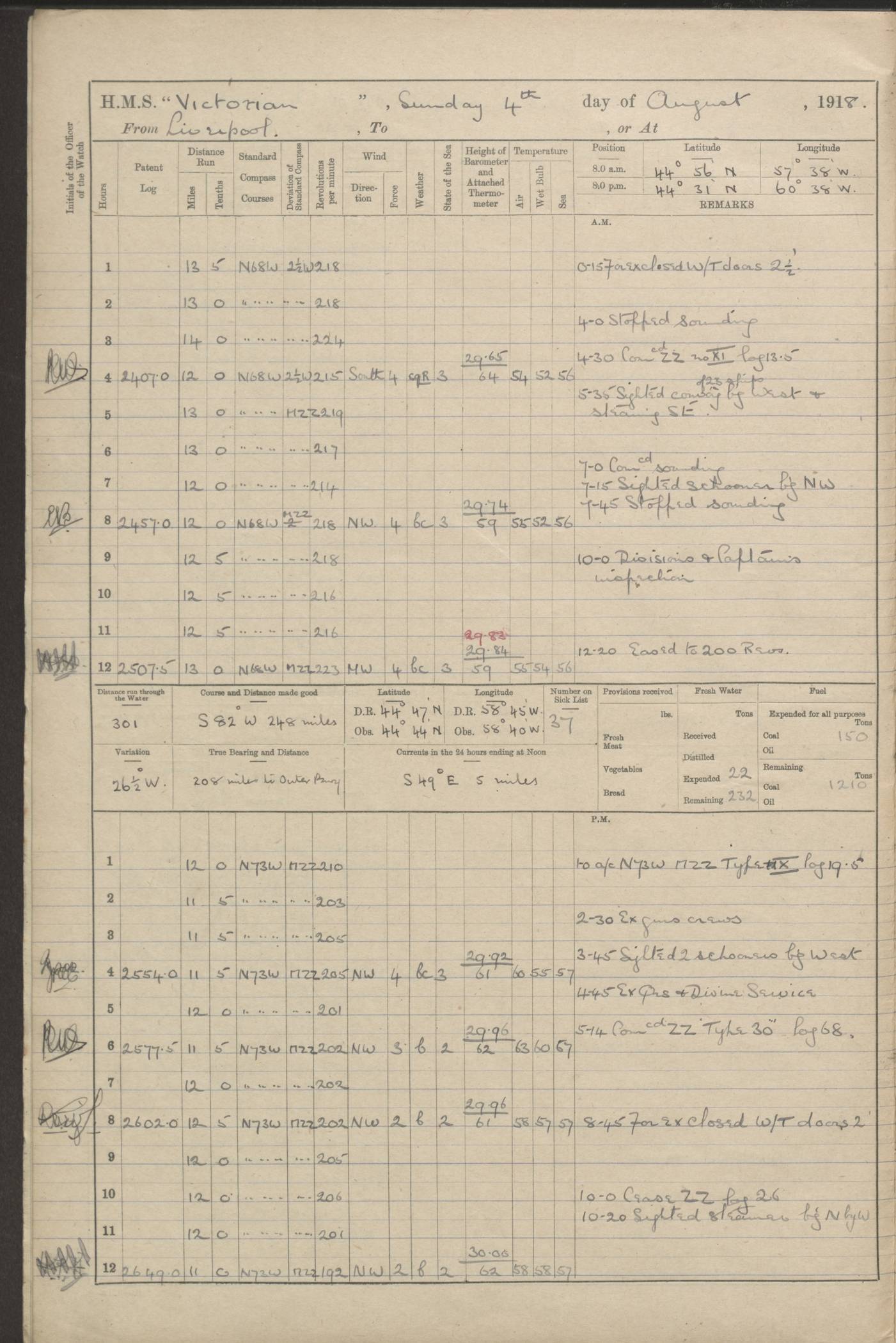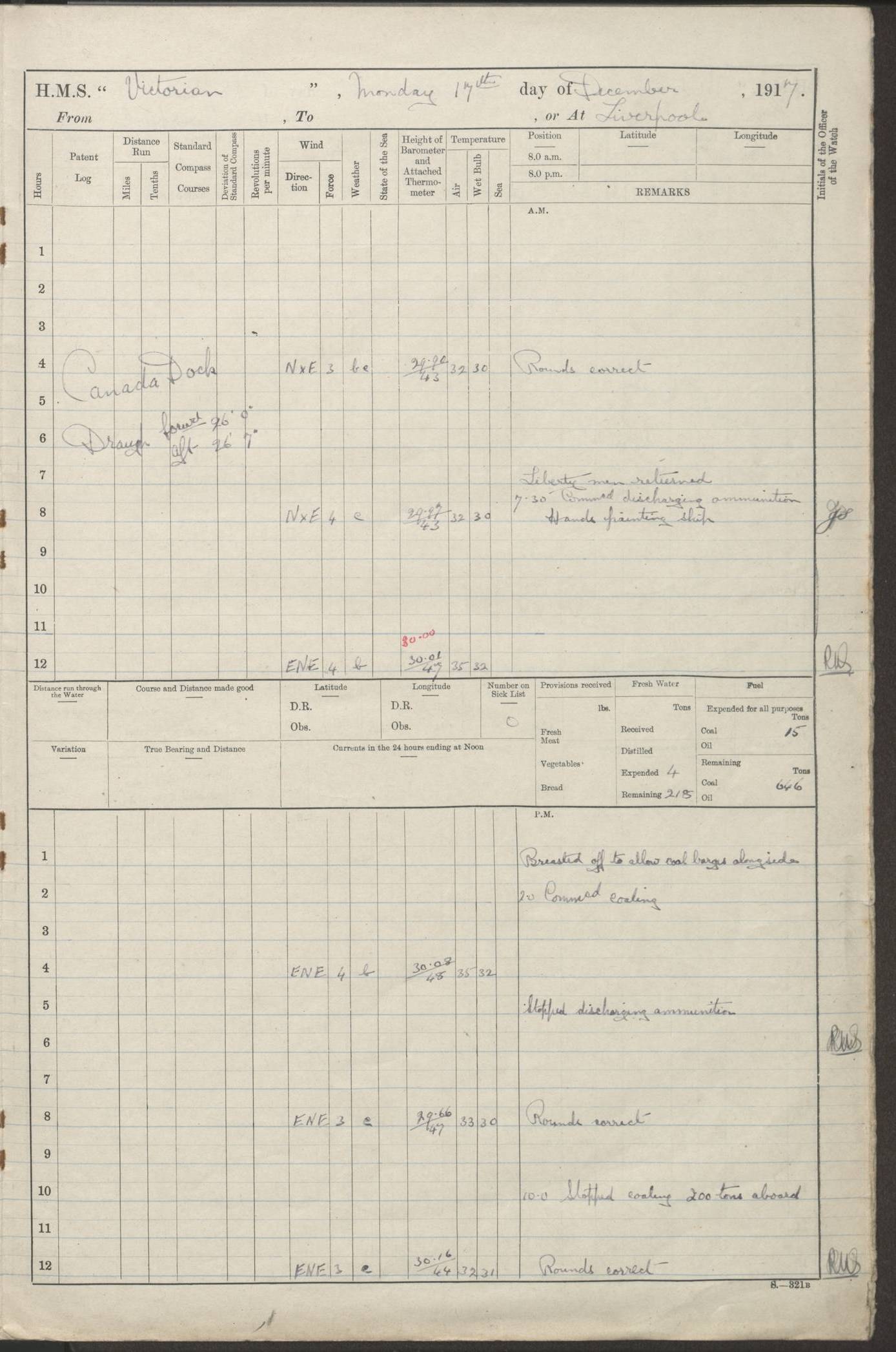 (Maps prepared using Journey Plotter, developed by Maikel. The Plots can only be approximate. They are made by joining-up positions on successive days, and sometimes positions are not given. There will therefore be occasions when the ship appears to have travelled overland) LOGS FOR AUGUST 1914 4caf8c39cadfd341970352c4: (http://oldweather.s3.amazonaws.com/ADM53-67374/ADM53-67374-001_0.jpg) 4caf8c39cadfd341970352c5: (http://oldweather.s3.amazonaws.com/ADM53-67374/ADM53-67374-001_1.jpg) 4caf8c39cadfd341970352c6: (http://oldweather.s3.amazonaws.com/ADM53-67374/ADM53-67374-002_0.jpg) 4caf8c39cadfd341970352c7: (http://oldweather.s3.amazonaws.com/ADM53-67374/ADM53-67374-002_1.jpg) 4caf8c39cadfd341970352c8: (http://oldweather.s3.amazonaws.com/ADM53-67374/ADM53-67374-003_0.jpg) 4caf8c39cadfd341970352c9: (http://oldweather.s3.amazonaws.com/ADM53-67374/ADM53-67374-003_1.jpg) 4caf8c39cadfd341970352ca: (http://oldweather.s3.amazonaws.com/ADM53-67374/ADM53-67374-004_0.jpg) 4caf8c39cadfd341970352cb: (http://oldweather.s3.amazonaws.com/ADM53-67374/ADM53-67374-004_1.jpg) 4caf8c39cadfd341970352cc: (http://oldweather.s3.amazonaws.com/ADM53-67374/ADM53-67374-005_0.jpg) 4caf8c39cadfd341970352cd: (http://oldweather.s3.amazonaws.com/ADM53-67374/ADM53-67374-005_1.jpg) Establishment of ship’s company Officers 44 Seamen 114 Boys ‒ Marines 38 Engine-room establishment 75 Other non-executive ratings 44 Total 315 BAROMETER Mercurial or aneroid: Mercurial Name of maker and number: Dobbie McInnes Height of cistern above sea: 55ft Error of mercurial barometer: .10 too low at 29.28 Thermometers for air temperature Position in ship: Fore bridge Whether in screen: Yes Maker and number: AC Cossor 3942C Date: From August 23 POSITION OF STANDARD COMPASS Top of wheel house on bridge DEVIATION OF STANDARD COMPASS Date obtained: August 23rd 1914 Position: River Mersey ARMAMENT Position: 2 guns forecastle head 2 guns forward house 2 guns after house 2 guns poop Number and nature of guns and mounting: 8 4.7” QF; P111 mountings TORPEDO ARMAMENT None BOATS Number of each carried: 8 Length and description: A lifeboats (wood) 26.2 ft Number of each carried: 4 Length and description: A lifeboats (steel) 26.0 ft MISCELLANEOUS INFORMATION Draught of water with bunkers full, and complete with provisions, stores and water: 26 ft 11 in forward; 29 ft 5 in aft Load draught: 26 ft 11 in forward; 29 ft 5 in aft Number of tons of coal carried (43 cubic feet per ton): 4541 Number of tons of oil fuel carried: None Quantity of water carried: For boilers 230; for drinking 700 THE VOYAGES OF HMS VICTORIAN 1914