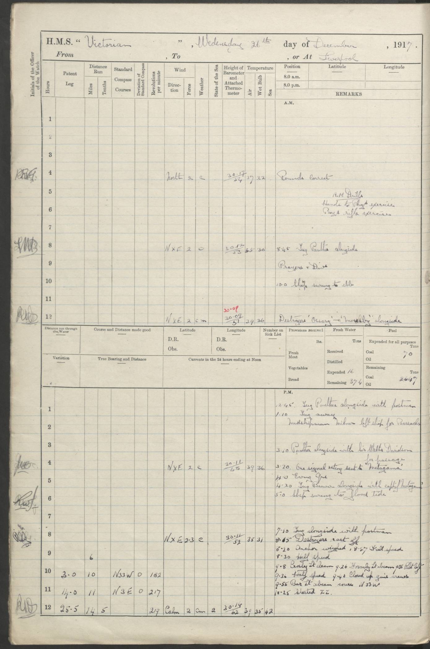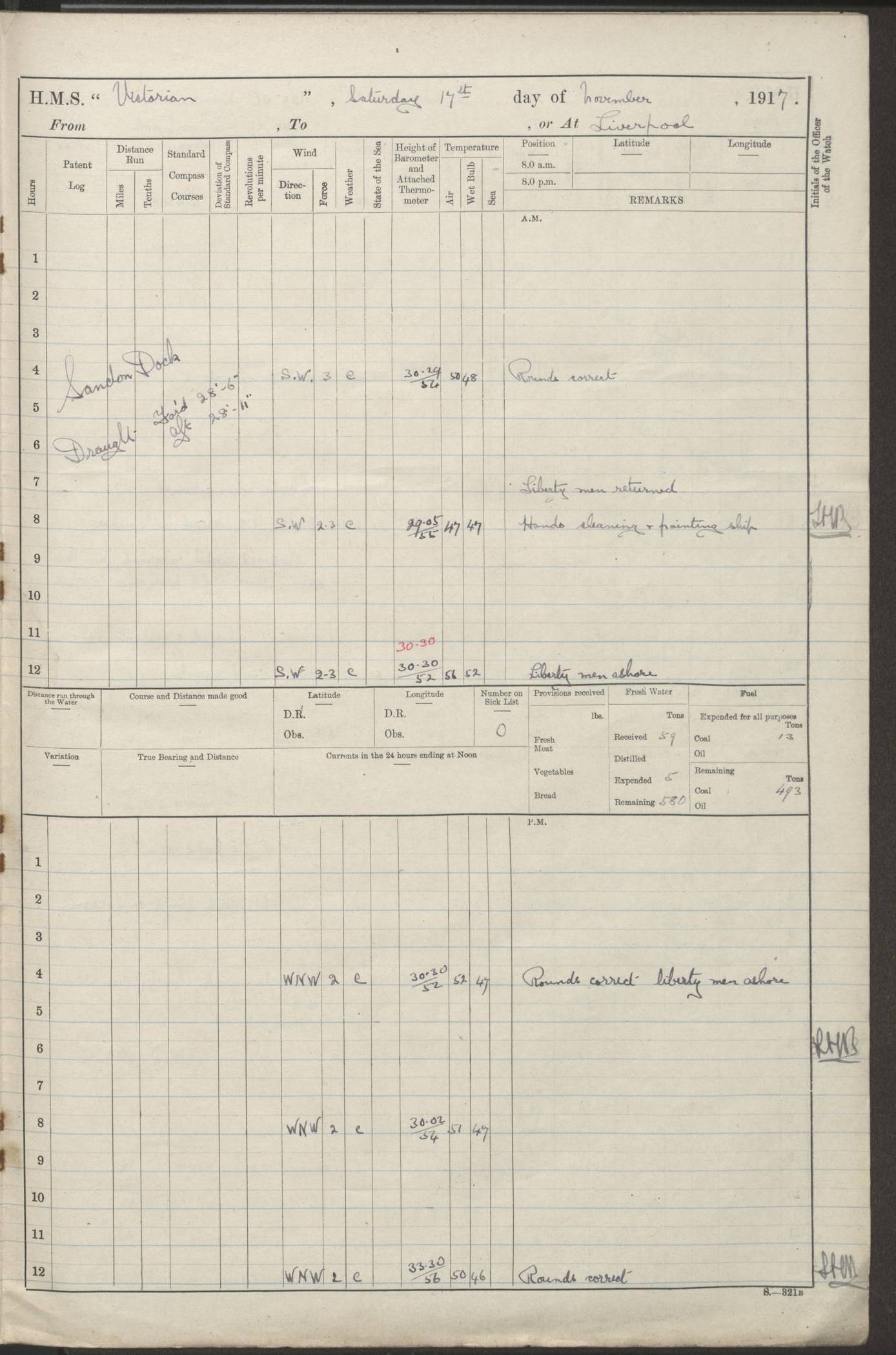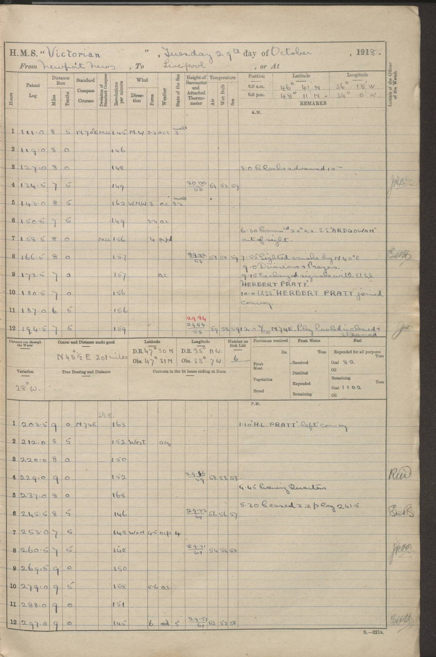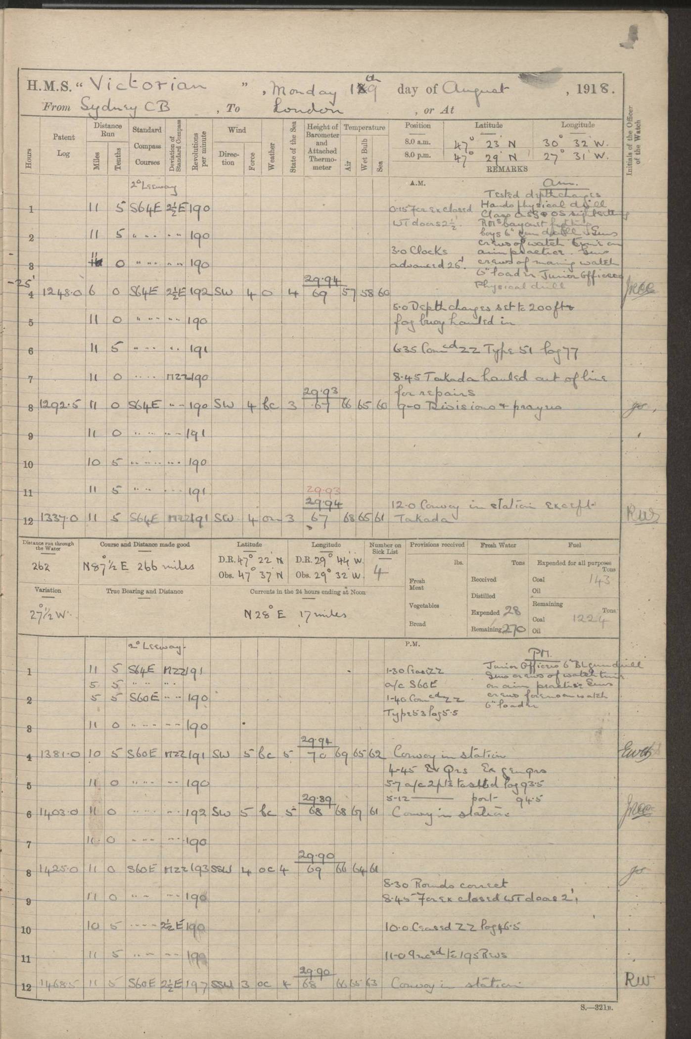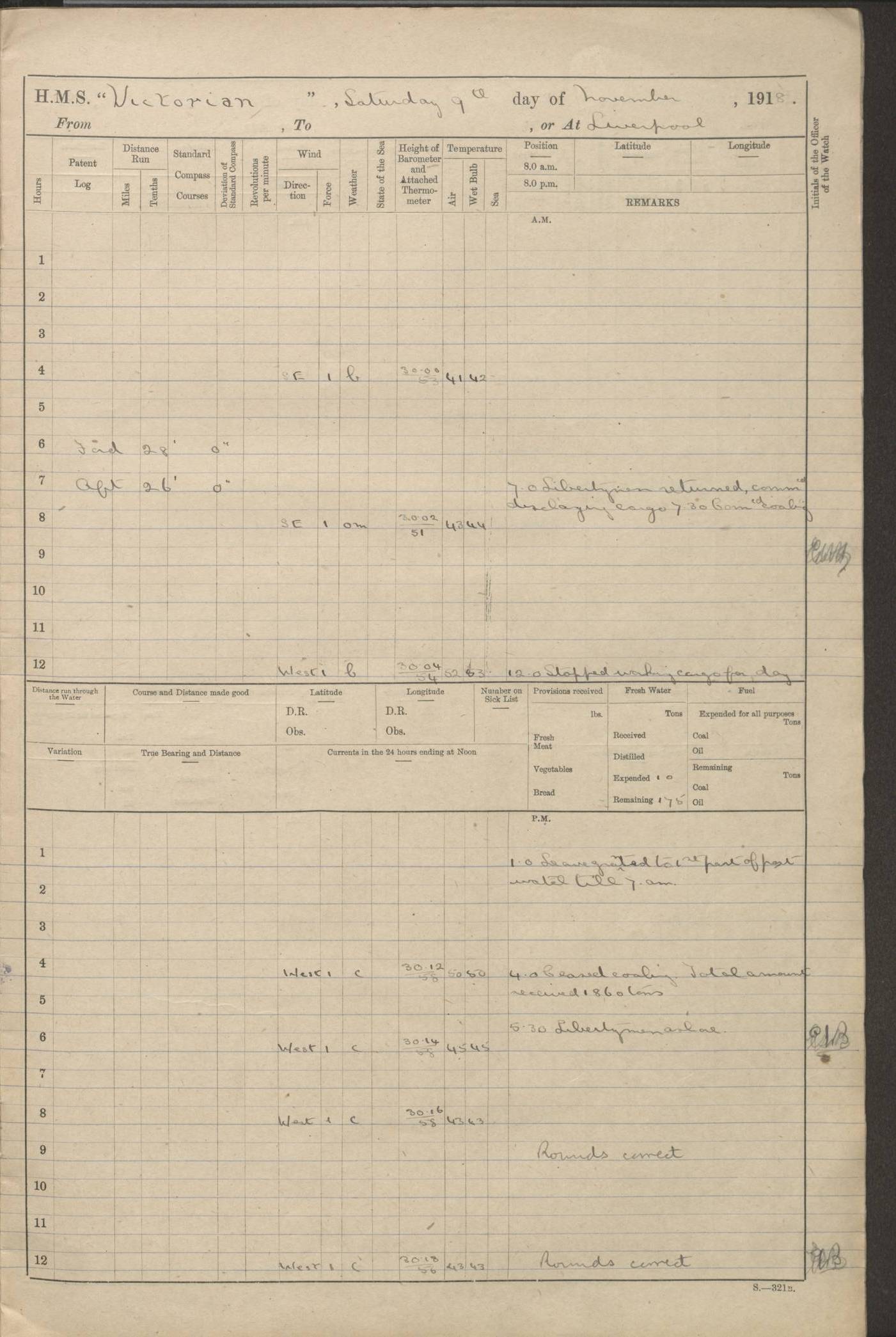 (Maps prepared using Journey Plotter, developed by Maikel. The Plots can only be approximate. They are made by joining-up positions on successive days, and sometimes positions are not given. There will therefore be occasions when the ship appears to have travelled overland) LOGS FOR AUGUST 1914 4caf8c39cadfd341970352c4: (http://oldweather.s3.amazonaws.com/ADM53-67374/ADM53-67374-001_0.jpg) 4caf8c39cadfd341970352c5: (http://oldweather.s3.amazonaws.com/ADM53-67374/ADM53-67374-001_1.jpg) 4caf8c39cadfd341970352c6: (http://oldweather.s3.amazonaws.com/ADM53-67374/ADM53-67374-002_0.jpg) 4caf8c39cadfd341970352c7: (http://oldweather.s3.amazonaws.com/ADM53-67374/ADM53-67374-002_1.jpg) 4caf8c39cadfd341970352c8: (http://oldweather.s3.amazonaws.com/ADM53-67374/ADM53-67374-003_0.jpg) 4caf8c39cadfd341970352c9: (http://oldweather.s3.amazonaws.com/ADM53-67374/ADM53-67374-003_1.jpg) 4caf8c39cadfd341970352ca: (http://oldweather.s3.amazonaws.com/ADM53-67374/ADM53-67374-004_0.jpg) 4caf8c39cadfd341970352cb: (http://oldweather.s3.amazonaws.com/ADM53-67374/ADM53-67374-004_1.jpg) 4caf8c39cadfd341970352cc: (http://oldweather.s3.amazonaws.com/ADM53-67374/ADM53-67374-005_0.jpg) 4caf8c39cadfd341970352cd: (http://oldweather.s3.amazonaws.com/ADM53-67374/ADM53-67374-005_1.jpg) Establishment of ship’s company Officers 44 Seamen 114 Boys ‒ Marines 38 Engine-room establishment 75 Other non-executive ratings 44 Total 315 BAROMETER Mercurial or aneroid: Mercurial Name of maker and number: Dobbie McInnes Height of cistern above sea: 55ft Error of mercurial barometer: .10 too low at 29.28 Thermometers for air temperature Position in ship: Fore bridge Whether in screen: Yes Maker and number: AC Cossor 3942C Date: From August 23 POSITION OF STANDARD COMPASS Top of wheel house on bridge DEVIATION OF STANDARD COMPASS Date obtained: August 23rd 1914 Position: River Mersey ARMAMENT Position: 2 guns forecastle head 2 guns forward house 2 guns after house 2 guns poop Number and nature of guns and mounting: 8 4.7” QF; P111 mountings TORPEDO ARMAMENT None BOATS Number of each carried: 8 Length and description: A lifeboats (wood) 26.2 ft Number of each carried: 4 Length and description: A lifeboats (steel) 26.0 ft MISCELLANEOUS INFORMATION Draught of water with bunkers full, and complete with provisions, stores and water: 26 ft 11 in forward; 29 ft 5 in aft Load draught: 26 ft 11 in forward; 29 ft 5 in aft Number of tons of coal carried (43 cubic feet per ton): 4541 Number of tons of oil fuel carried: None Quantity of water carried: For boilers 230; for drinking 700 THE VOYAGES OF HMS VICTORIAN 1914