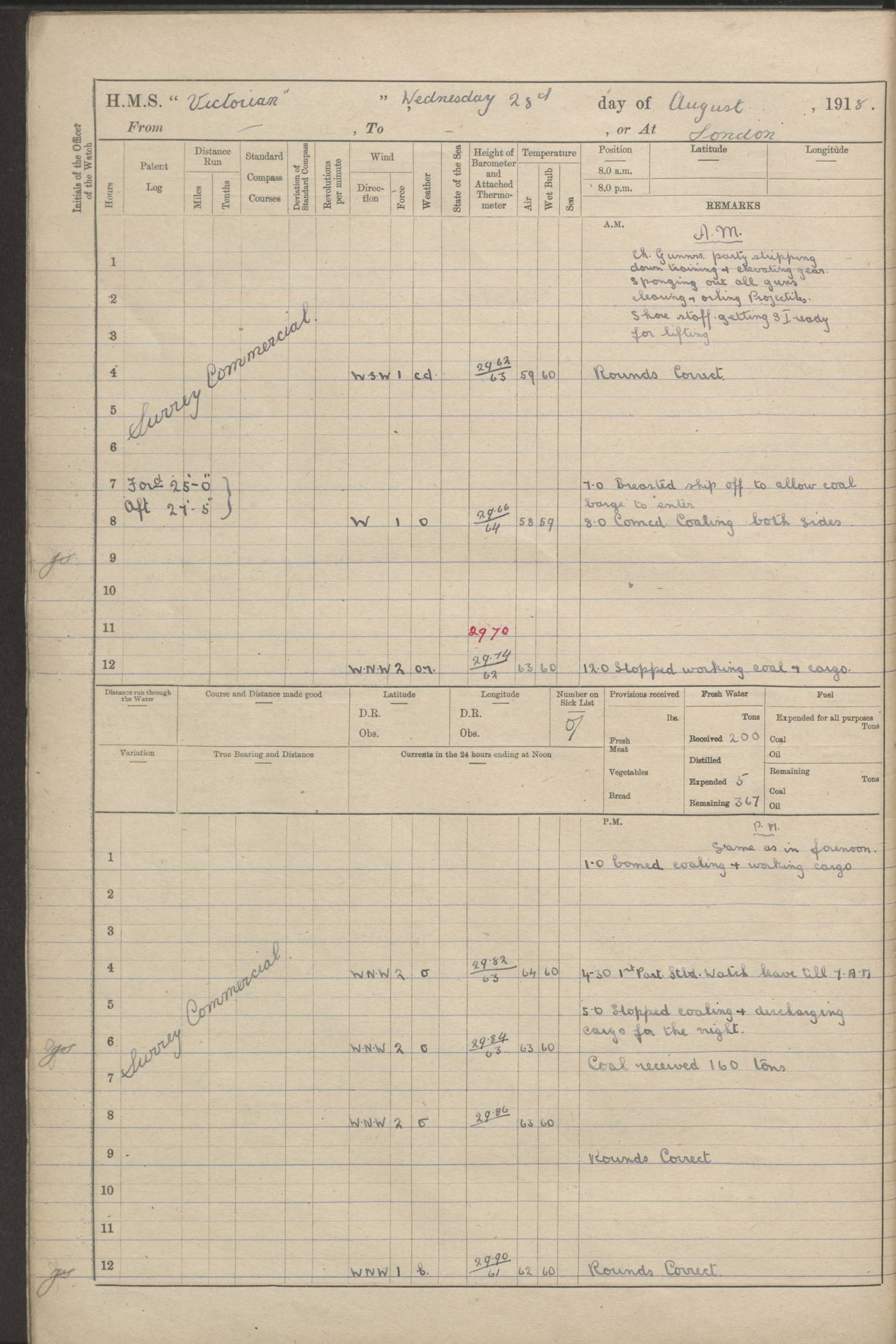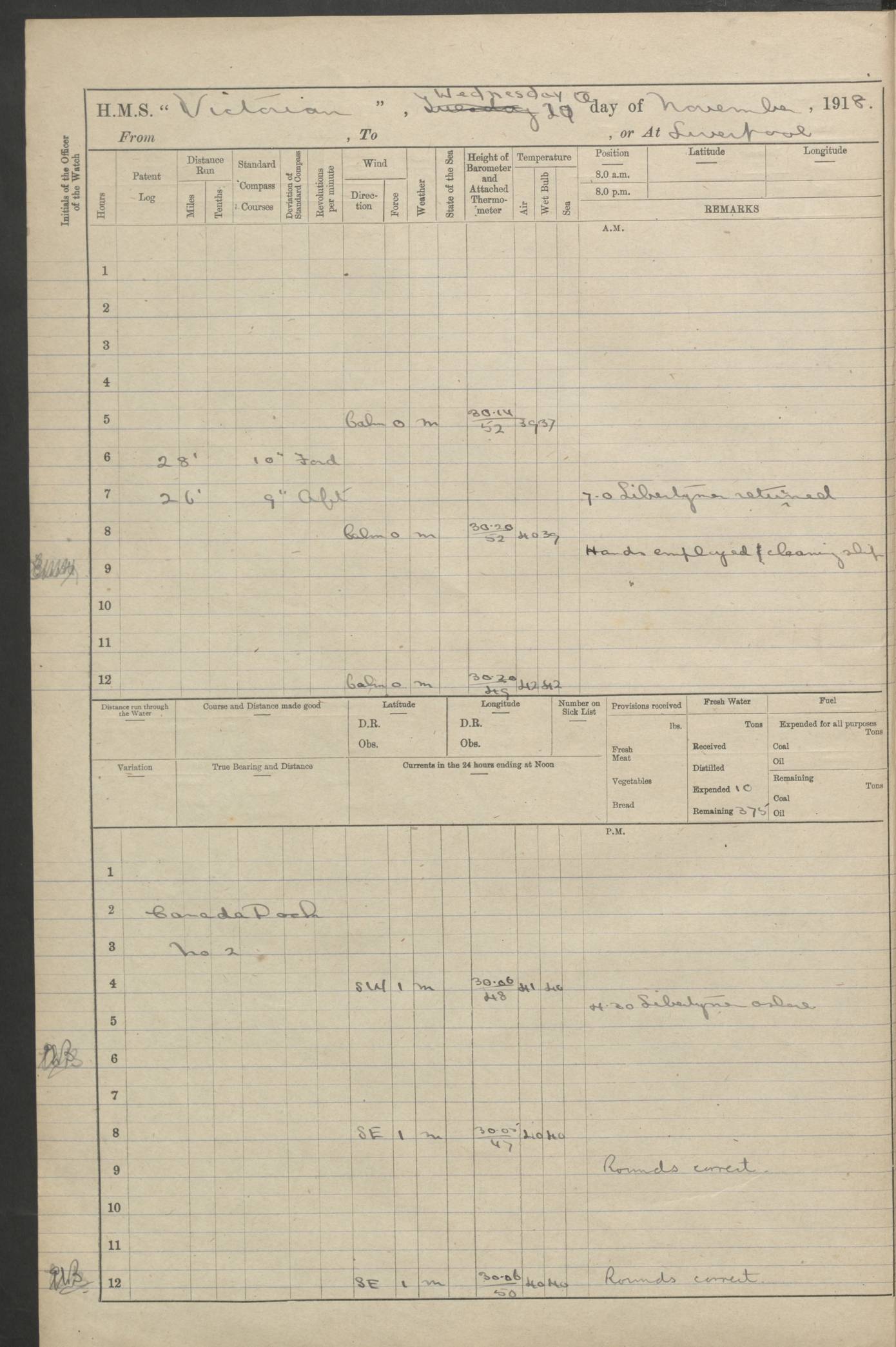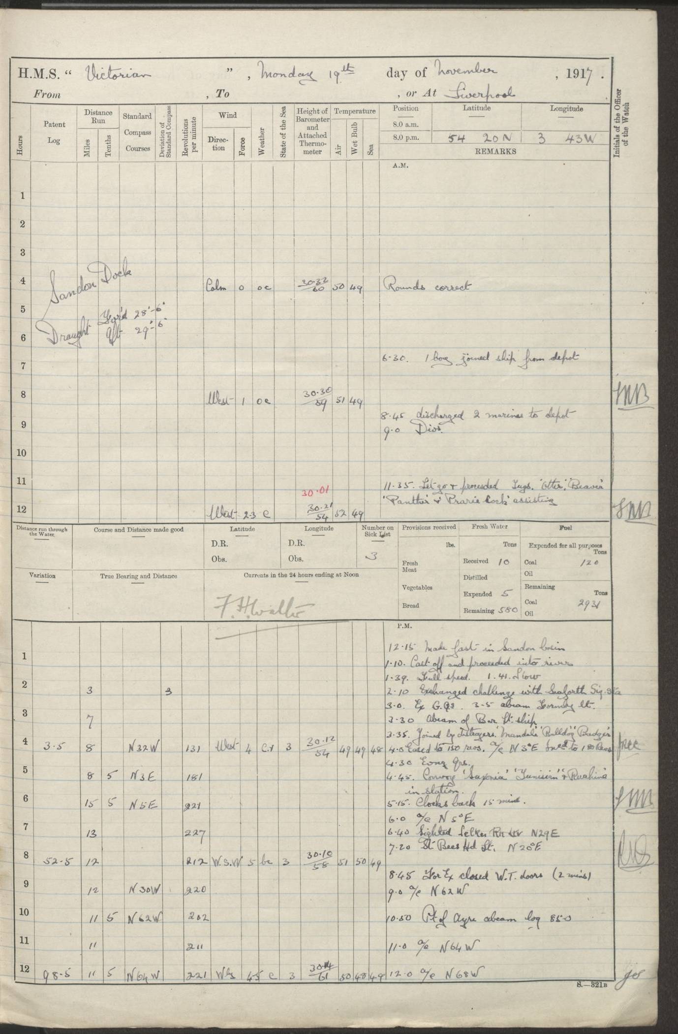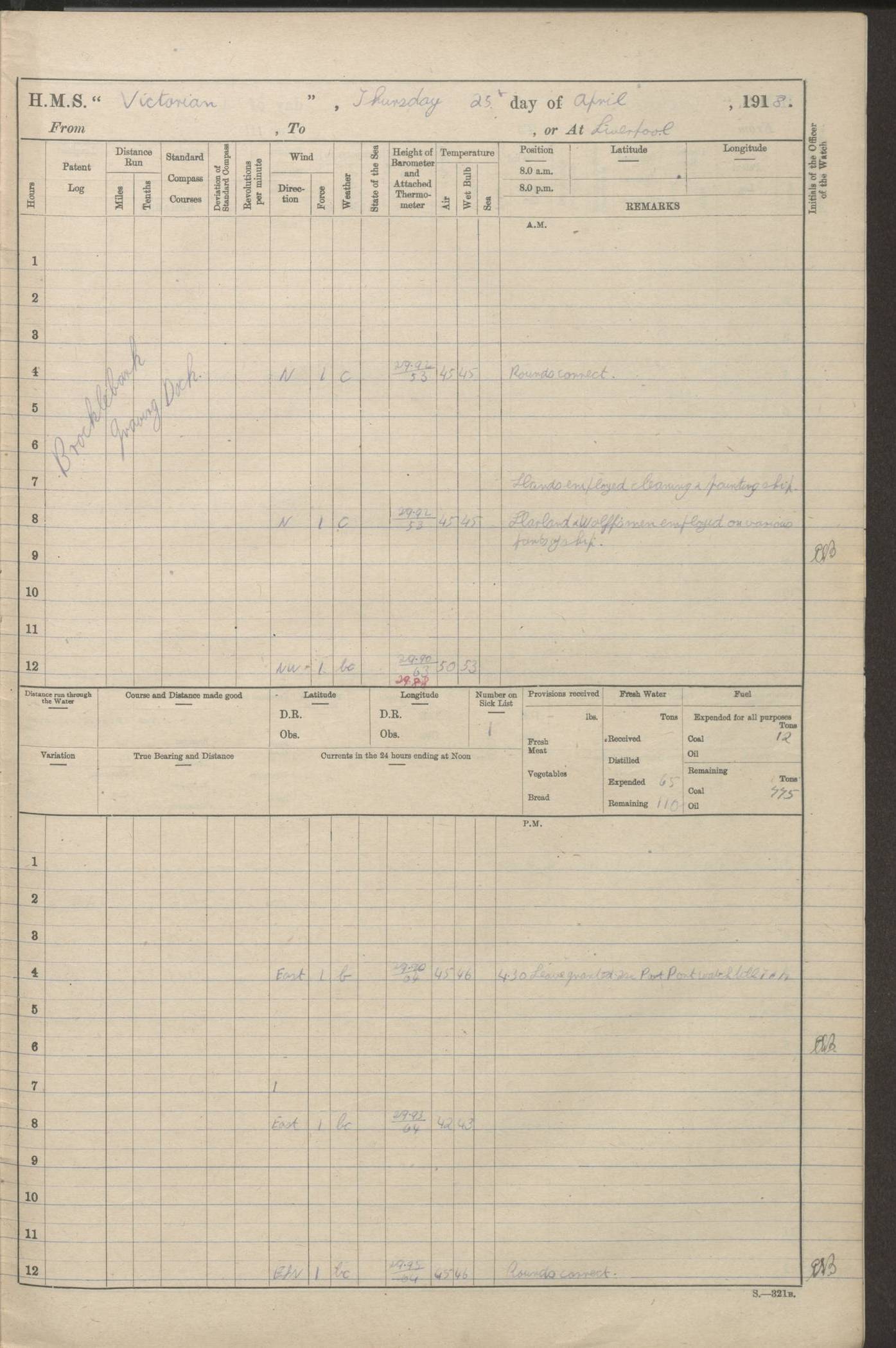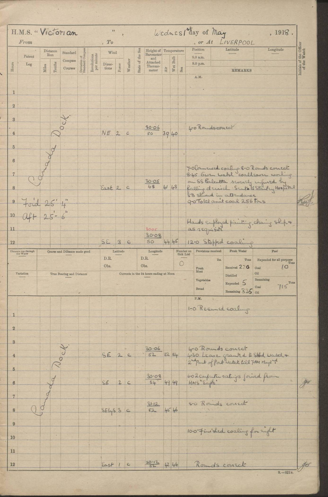 (Maps prepared using Journey Plotter, developed by Maikel. The Plots can only be approximate. They are made by joining-up positions on successive days, and sometimes positions are not given. There will therefore be occasions when the ship appears to have travelled overland) LOGS FOR AUGUST 1914 4caf8c39cadfd341970352c4: (http://oldweather.s3.amazonaws.com/ADM53-67374/ADM53-67374-001_0.jpg) 4caf8c39cadfd341970352c5: (http://oldweather.s3.amazonaws.com/ADM53-67374/ADM53-67374-001_1.jpg) 4caf8c39cadfd341970352c6: (http://oldweather.s3.amazonaws.com/ADM53-67374/ADM53-67374-002_0.jpg) 4caf8c39cadfd341970352c7: (http://oldweather.s3.amazonaws.com/ADM53-67374/ADM53-67374-002_1.jpg) 4caf8c39cadfd341970352c8: (http://oldweather.s3.amazonaws.com/ADM53-67374/ADM53-67374-003_0.jpg) 4caf8c39cadfd341970352c9: (http://oldweather.s3.amazonaws.com/ADM53-67374/ADM53-67374-003_1.jpg) 4caf8c39cadfd341970352ca: (http://oldweather.s3.amazonaws.com/ADM53-67374/ADM53-67374-004_0.jpg) 4caf8c39cadfd341970352cb: (http://oldweather.s3.amazonaws.com/ADM53-67374/ADM53-67374-004_1.jpg) 4caf8c39cadfd341970352cc: (http://oldweather.s3.amazonaws.com/ADM53-67374/ADM53-67374-005_0.jpg) 4caf8c39cadfd341970352cd: (http://oldweather.s3.amazonaws.com/ADM53-67374/ADM53-67374-005_1.jpg) Establishment of ship’s company Officers 44 Seamen 114 Boys ‒ Marines 38 Engine-room establishment 75 Other non-executive ratings 44 Total 315 BAROMETER Mercurial or aneroid: Mercurial Name of maker and number: Dobbie McInnes Height of cistern above sea: 55ft Error of mercurial barometer: .10 too low at 29.28 Thermometers for air temperature Position in ship: Fore bridge Whether in screen: Yes Maker and number: AC Cossor 3942C Date: From August 23 POSITION OF STANDARD COMPASS Top of wheel house on bridge DEVIATION OF STANDARD COMPASS Date obtained: August 23rd 1914 Position: River Mersey ARMAMENT Position: 2 guns forecastle head 2 guns forward house 2 guns after house 2 guns poop Number and nature of guns and mounting: 8 4.7” QF; P111 mountings TORPEDO ARMAMENT None BOATS Number of each carried: 8 Length and description: A lifeboats (wood) 26.2 ft Number of each carried: 4 Length and description: A lifeboats (steel) 26.0 ft MISCELLANEOUS INFORMATION Draught of water with bunkers full, and complete with provisions, stores and water: 26 ft 11 in forward; 29 ft 5 in aft Load draught: 26 ft 11 in forward; 29 ft 5 in aft Number of tons of coal carried (43 cubic feet per ton): 4541 Number of tons of oil fuel carried: None Quantity of water carried: For boilers 230; for drinking 700 THE VOYAGES OF HMS VICTORIAN 1914
