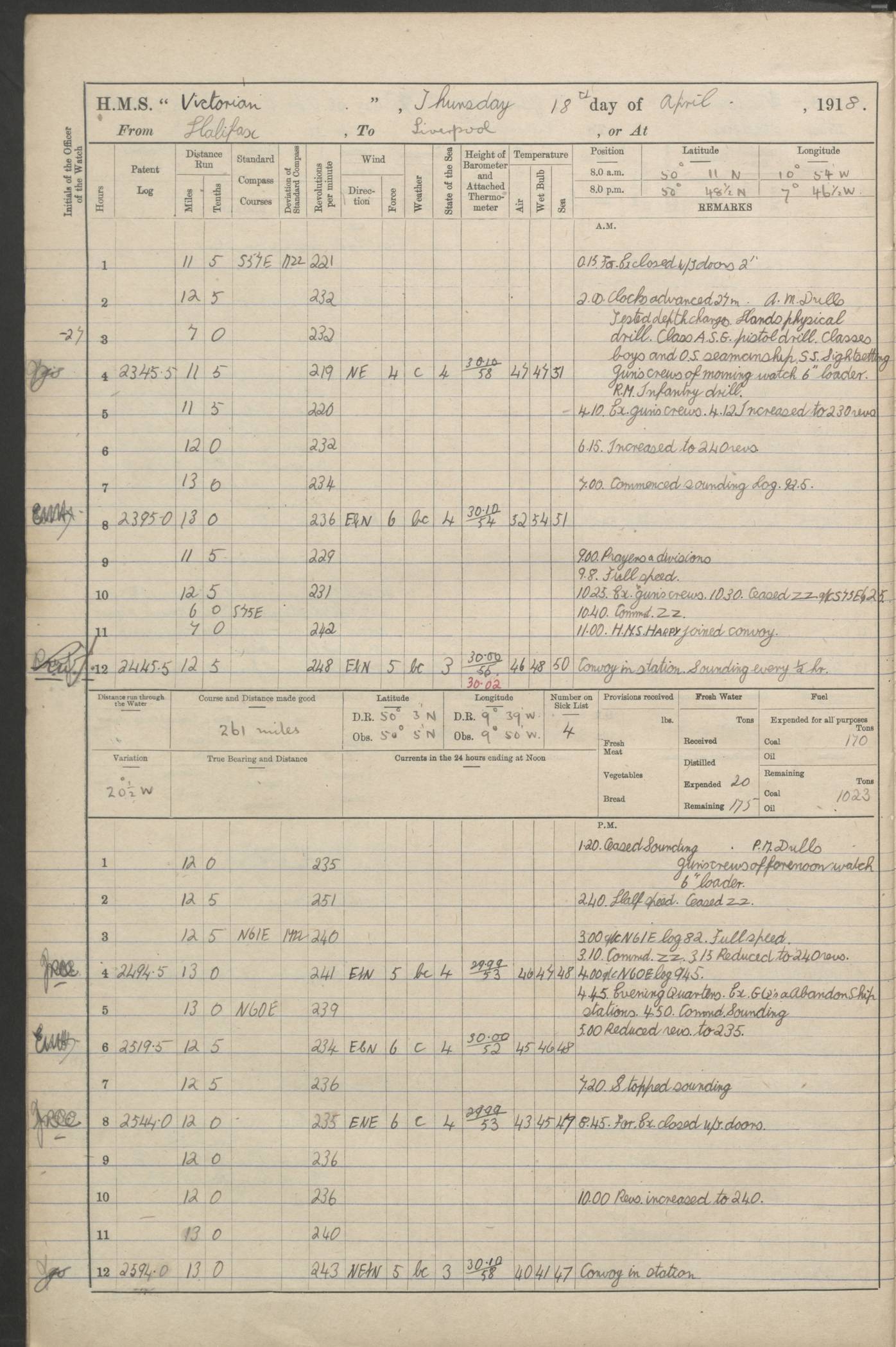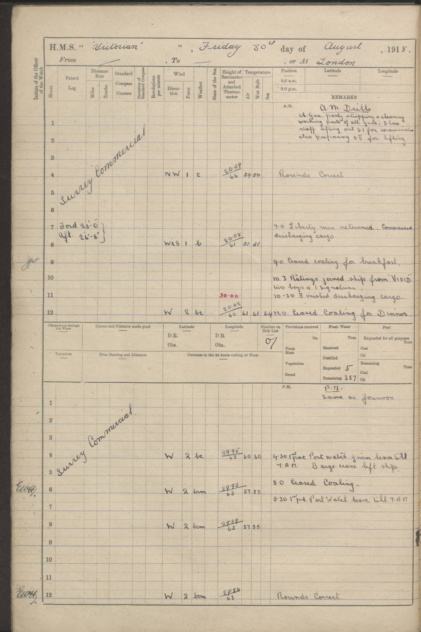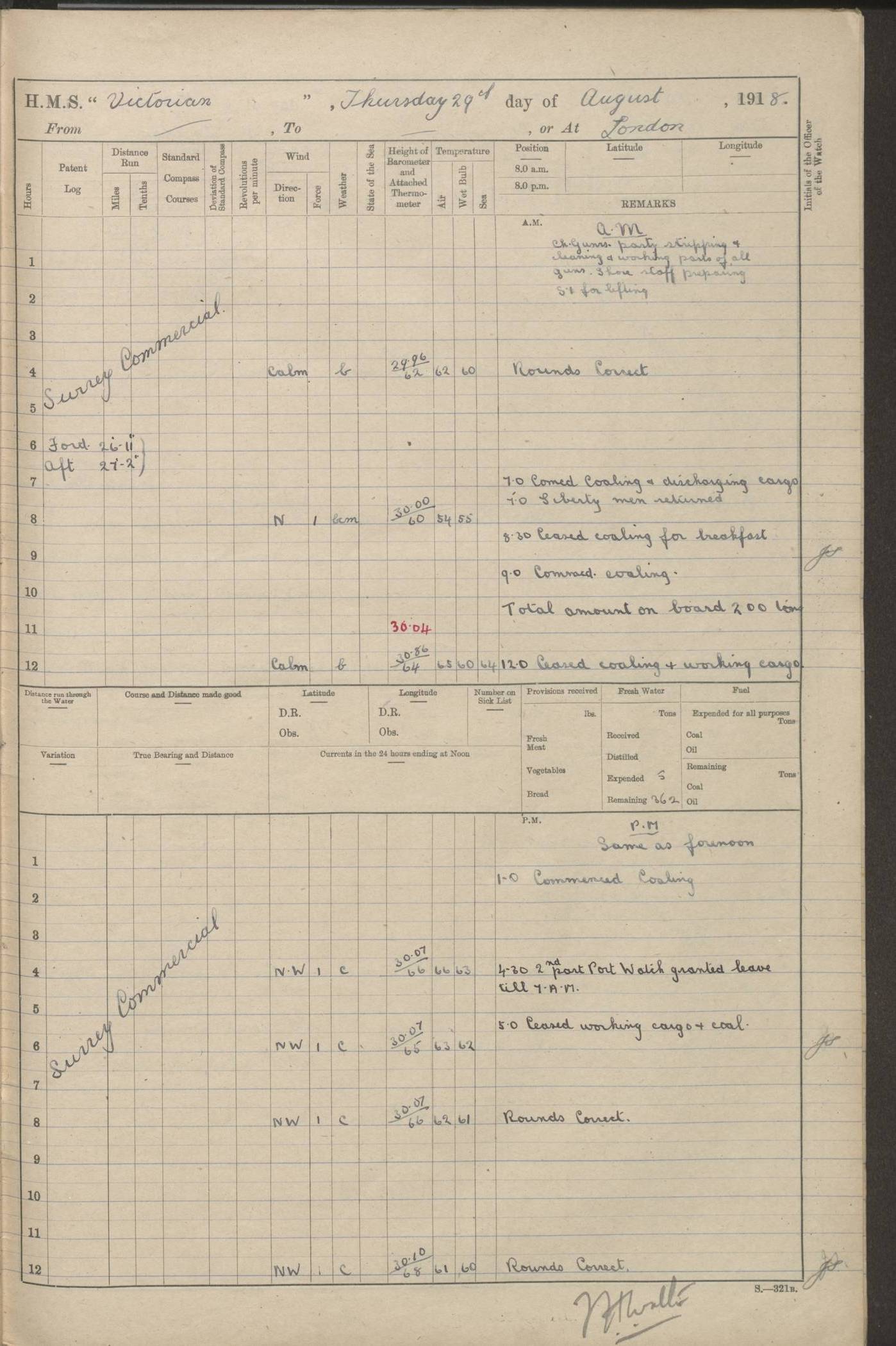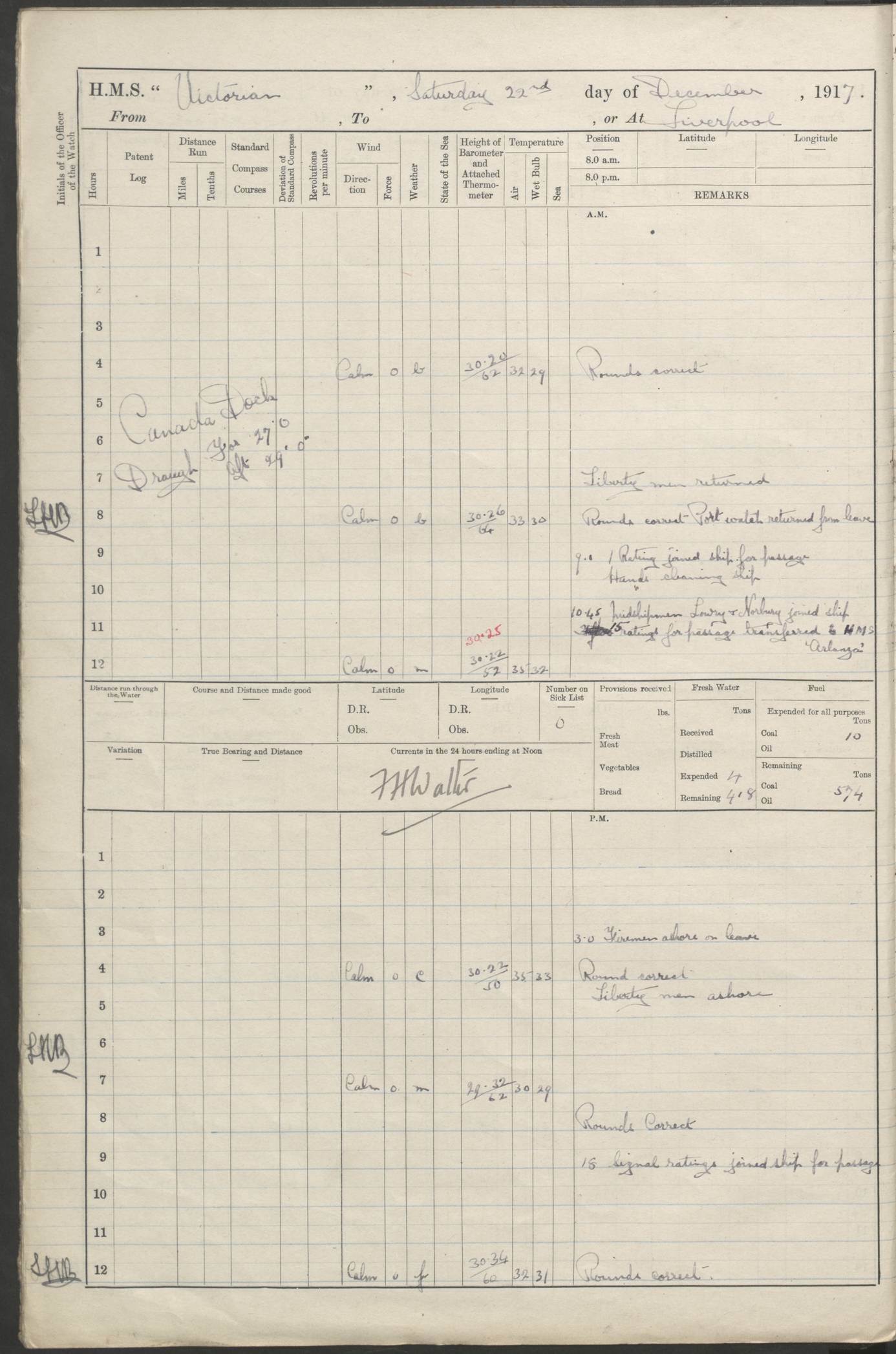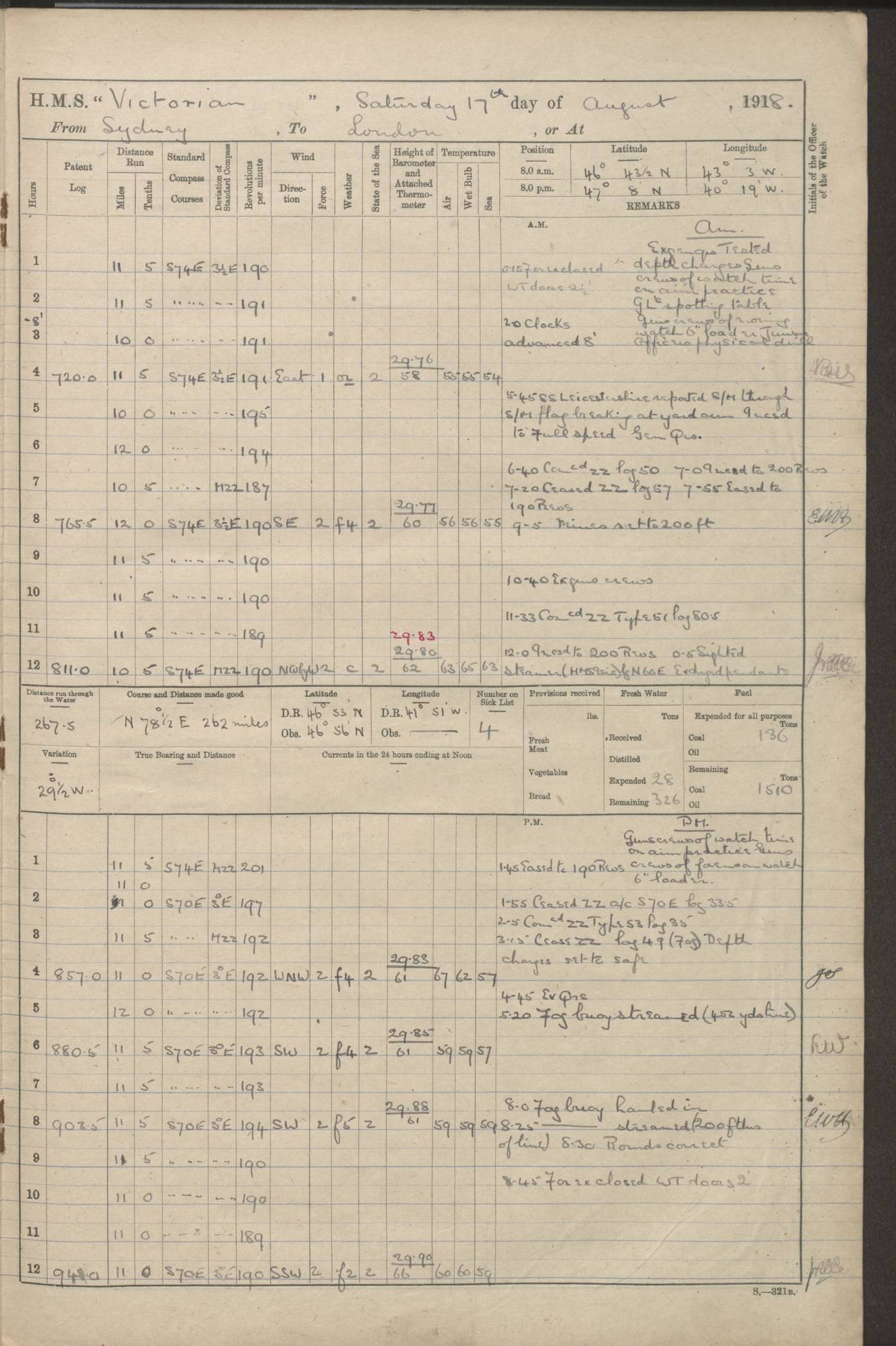 (Maps prepared using Journey Plotter, developed by Maikel. The Plots can only be approximate. They are made by joining-up positions on successive days, and sometimes positions are not given. There will therefore be occasions when the ship appears to have travelled overland) LOGS FOR AUGUST 1914 4caf8c39cadfd341970352c4: (http://oldweather.s3.amazonaws.com/ADM53-67374/ADM53-67374-001_0.jpg) 4caf8c39cadfd341970352c5: (http://oldweather.s3.amazonaws.com/ADM53-67374/ADM53-67374-001_1.jpg) 4caf8c39cadfd341970352c6: (http://oldweather.s3.amazonaws.com/ADM53-67374/ADM53-67374-002_0.jpg) 4caf8c39cadfd341970352c7: (http://oldweather.s3.amazonaws.com/ADM53-67374/ADM53-67374-002_1.jpg) 4caf8c39cadfd341970352c8: (http://oldweather.s3.amazonaws.com/ADM53-67374/ADM53-67374-003_0.jpg) 4caf8c39cadfd341970352c9: (http://oldweather.s3.amazonaws.com/ADM53-67374/ADM53-67374-003_1.jpg) 4caf8c39cadfd341970352ca: (http://oldweather.s3.amazonaws.com/ADM53-67374/ADM53-67374-004_0.jpg) 4caf8c39cadfd341970352cb: (http://oldweather.s3.amazonaws.com/ADM53-67374/ADM53-67374-004_1.jpg) 4caf8c39cadfd341970352cc: (http://oldweather.s3.amazonaws.com/ADM53-67374/ADM53-67374-005_0.jpg) 4caf8c39cadfd341970352cd: (http://oldweather.s3.amazonaws.com/ADM53-67374/ADM53-67374-005_1.jpg) Establishment of ship’s company Officers 44 Seamen 114 Boys ‒ Marines 38 Engine-room establishment 75 Other non-executive ratings 44 Total 315 BAROMETER Mercurial or aneroid: Mercurial Name of maker and number: Dobbie McInnes Height of cistern above sea: 55ft Error of mercurial barometer: .10 too low at 29.28 Thermometers for air temperature Position in ship: Fore bridge Whether in screen: Yes Maker and number: AC Cossor 3942C Date: From August 23 POSITION OF STANDARD COMPASS Top of wheel house on bridge DEVIATION OF STANDARD COMPASS Date obtained: August 23rd 1914 Position: River Mersey ARMAMENT Position: 2 guns forecastle head 2 guns forward house 2 guns after house 2 guns poop Number and nature of guns and mounting: 8 4.7” QF; P111 mountings TORPEDO ARMAMENT None BOATS Number of each carried: 8 Length and description: A lifeboats (wood) 26.2 ft Number of each carried: 4 Length and description: A lifeboats (steel) 26.0 ft MISCELLANEOUS INFORMATION Draught of water with bunkers full, and complete with provisions, stores and water: 26 ft 11 in forward; 29 ft 5 in aft Load draught: 26 ft 11 in forward; 29 ft 5 in aft Number of tons of coal carried (43 cubic feet per ton): 4541 Number of tons of oil fuel carried: None Quantity of water carried: For boilers 230; for drinking 700 THE VOYAGES OF HMS VICTORIAN 1914