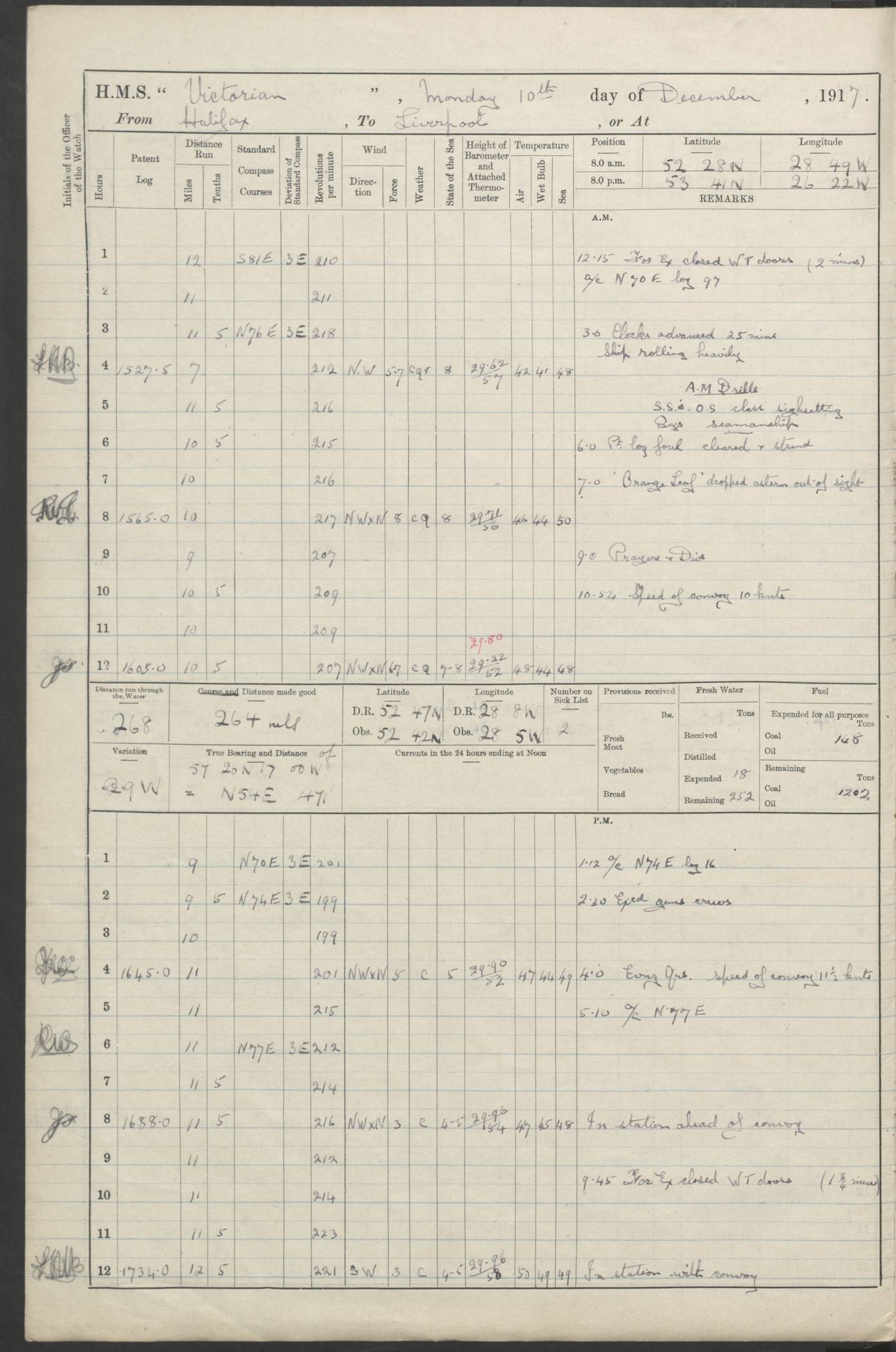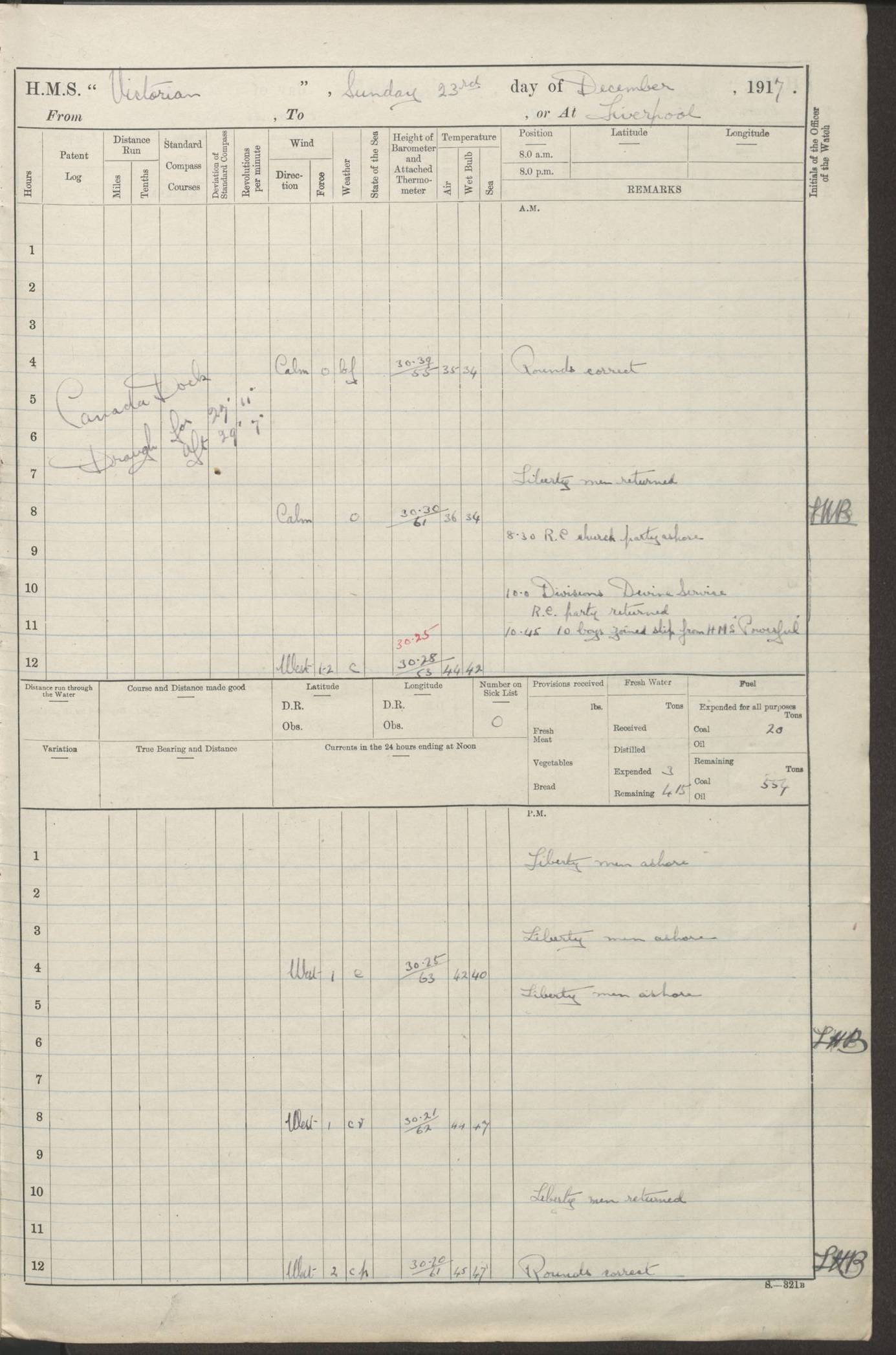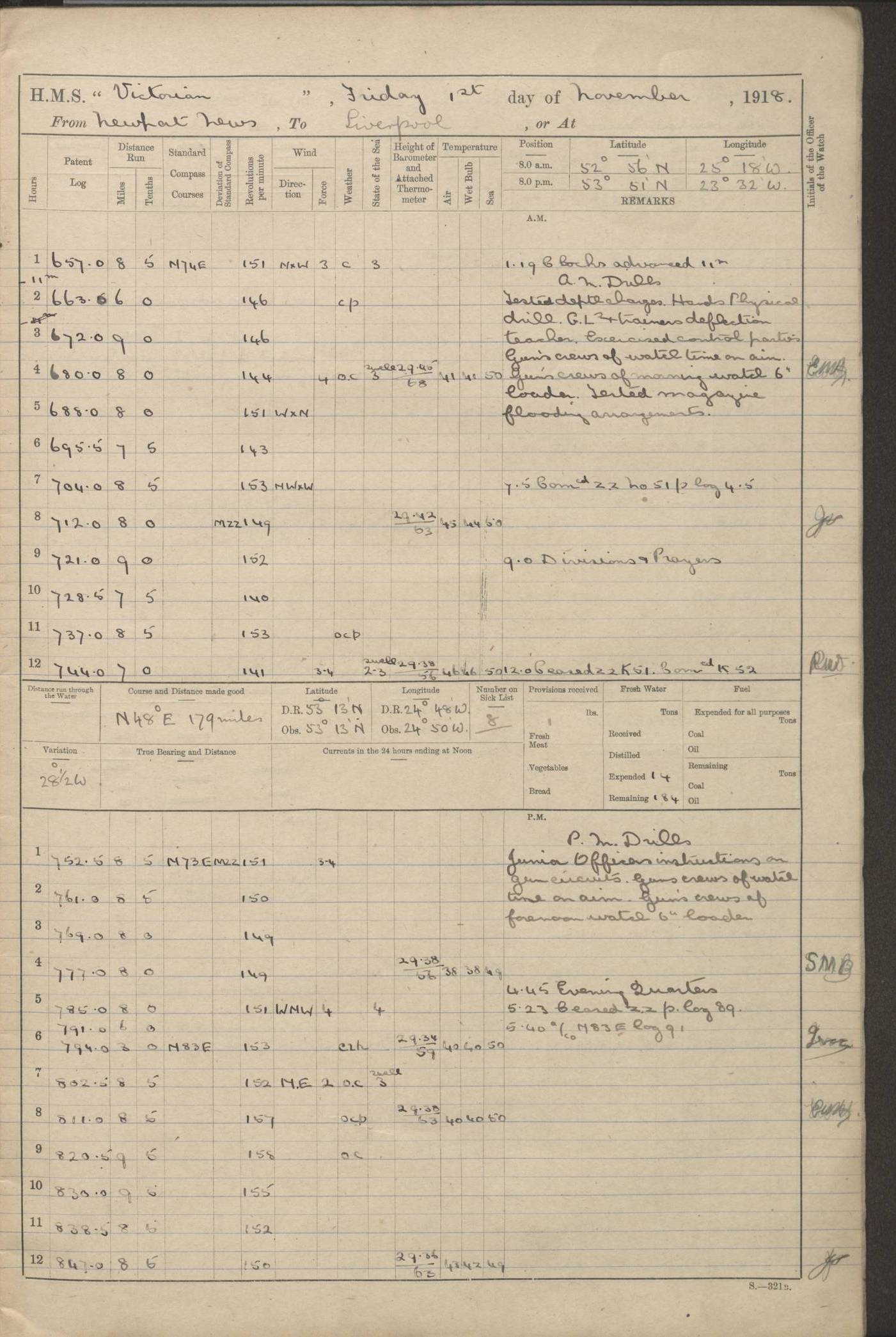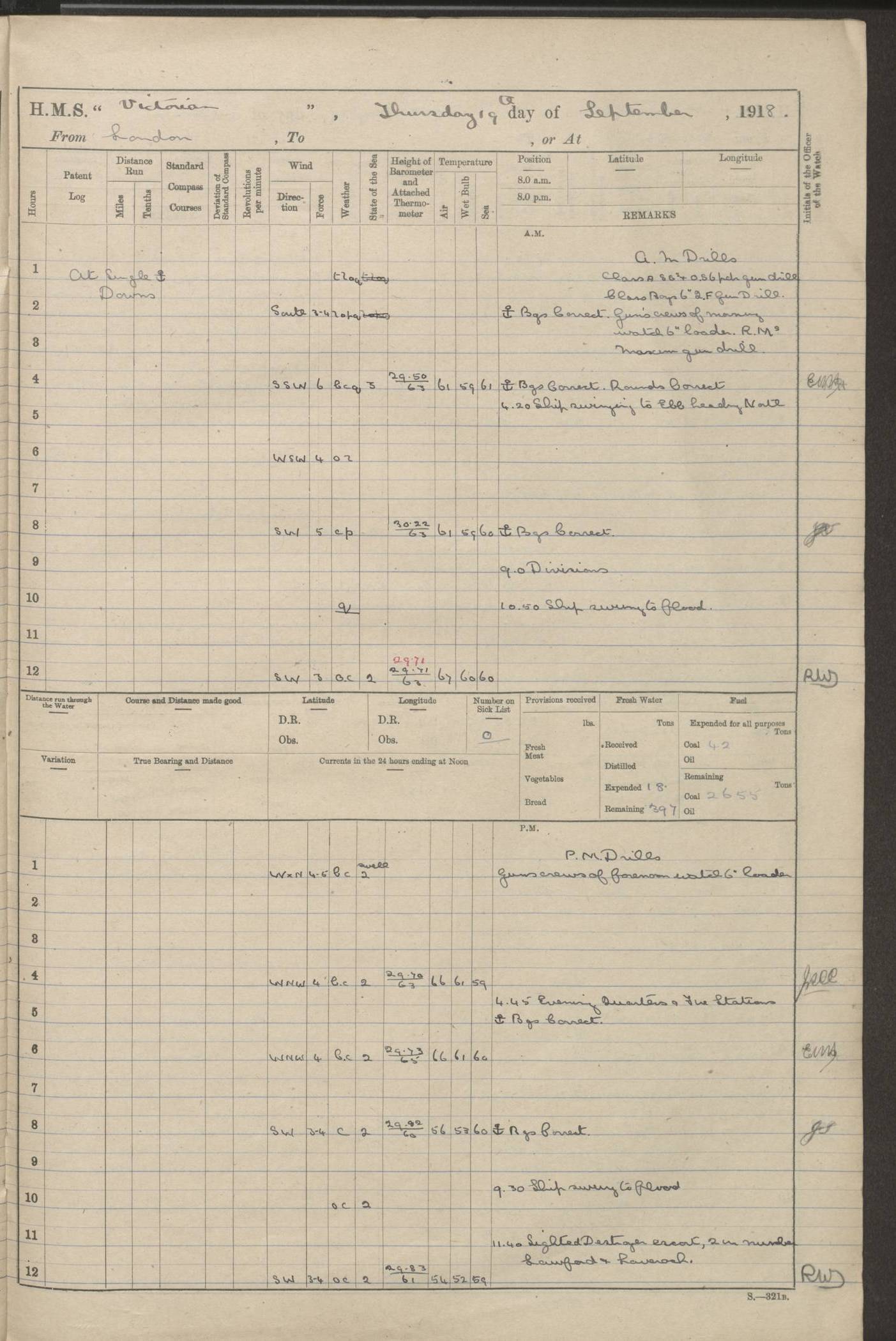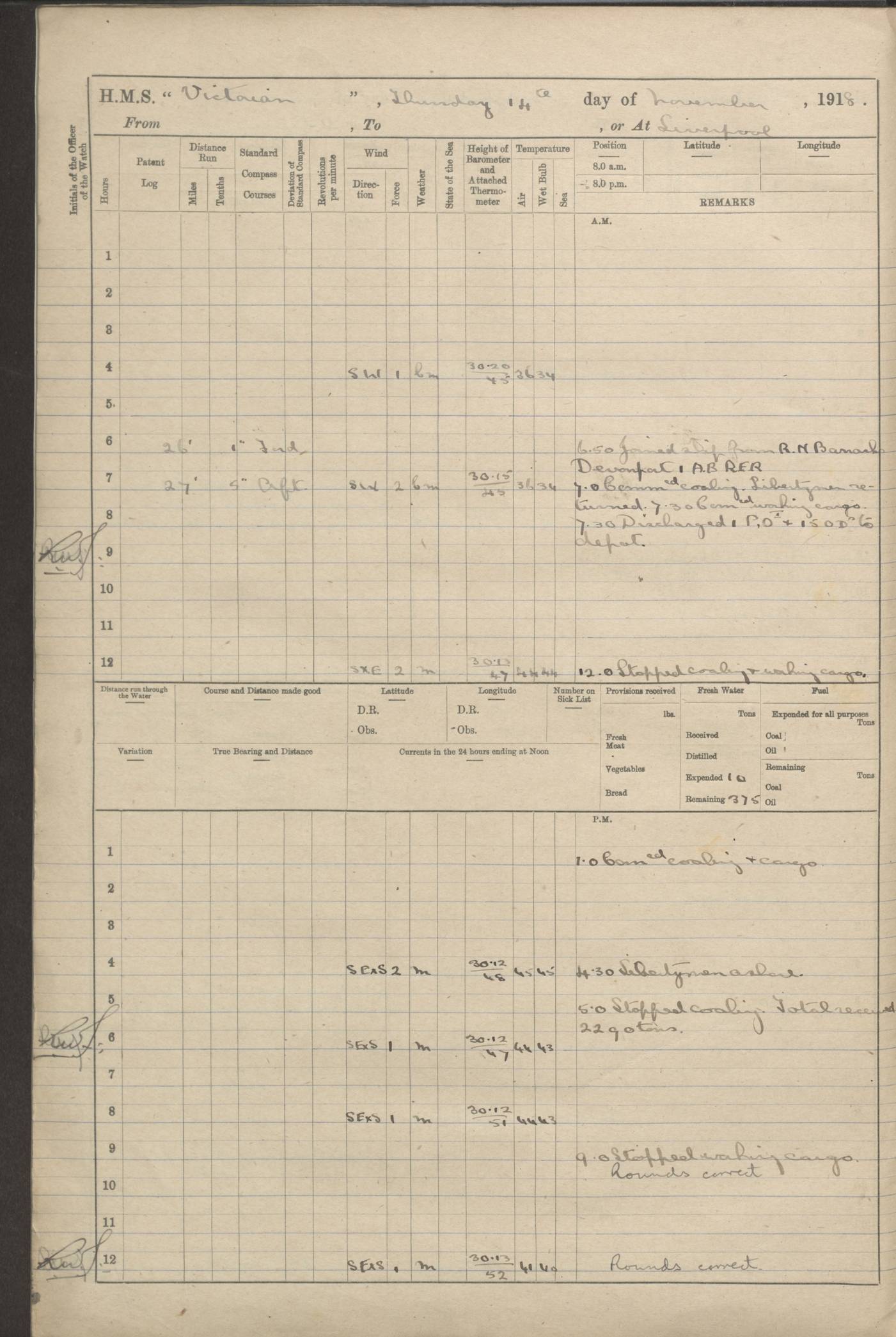 (Maps prepared using Journey Plotter, developed by Maikel. The Plots can only be approximate. They are made by joining-up positions on successive days, and sometimes positions are not given. There will therefore be occasions when the ship appears to have travelled overland) LOGS FOR AUGUST 1914 4caf8c39cadfd341970352c4: (http://oldweather.s3.amazonaws.com/ADM53-67374/ADM53-67374-001_0.jpg) 4caf8c39cadfd341970352c5: (http://oldweather.s3.amazonaws.com/ADM53-67374/ADM53-67374-001_1.jpg) 4caf8c39cadfd341970352c6: (http://oldweather.s3.amazonaws.com/ADM53-67374/ADM53-67374-002_0.jpg) 4caf8c39cadfd341970352c7: (http://oldweather.s3.amazonaws.com/ADM53-67374/ADM53-67374-002_1.jpg) 4caf8c39cadfd341970352c8: (http://oldweather.s3.amazonaws.com/ADM53-67374/ADM53-67374-003_0.jpg) 4caf8c39cadfd341970352c9: (http://oldweather.s3.amazonaws.com/ADM53-67374/ADM53-67374-003_1.jpg) 4caf8c39cadfd341970352ca: (http://oldweather.s3.amazonaws.com/ADM53-67374/ADM53-67374-004_0.jpg) 4caf8c39cadfd341970352cb: (http://oldweather.s3.amazonaws.com/ADM53-67374/ADM53-67374-004_1.jpg) 4caf8c39cadfd341970352cc: (http://oldweather.s3.amazonaws.com/ADM53-67374/ADM53-67374-005_0.jpg) 4caf8c39cadfd341970352cd: (http://oldweather.s3.amazonaws.com/ADM53-67374/ADM53-67374-005_1.jpg) Establishment of ship’s company Officers 44 Seamen 114 Boys ‒ Marines 38 Engine-room establishment 75 Other non-executive ratings 44 Total 315 BAROMETER Mercurial or aneroid: Mercurial Name of maker and number: Dobbie McInnes Height of cistern above sea: 55ft Error of mercurial barometer: .10 too low at 29.28 Thermometers for air temperature Position in ship: Fore bridge Whether in screen: Yes Maker and number: AC Cossor 3942C Date: From August 23 POSITION OF STANDARD COMPASS Top of wheel house on bridge DEVIATION OF STANDARD COMPASS Date obtained: August 23rd 1914 Position: River Mersey ARMAMENT Position: 2 guns forecastle head 2 guns forward house 2 guns after house 2 guns poop Number and nature of guns and mounting: 8 4.7” QF; P111 mountings TORPEDO ARMAMENT None BOATS Number of each carried: 8 Length and description: A lifeboats (wood) 26.2 ft Number of each carried: 4 Length and description: A lifeboats (steel) 26.0 ft MISCELLANEOUS INFORMATION Draught of water with bunkers full, and complete with provisions, stores and water: 26 ft 11 in forward; 29 ft 5 in aft Load draught: 26 ft 11 in forward; 29 ft 5 in aft Number of tons of coal carried (43 cubic feet per ton): 4541 Number of tons of oil fuel carried: None Quantity of water carried: For boilers 230; for drinking 700 THE VOYAGES OF HMS VICTORIAN 1914