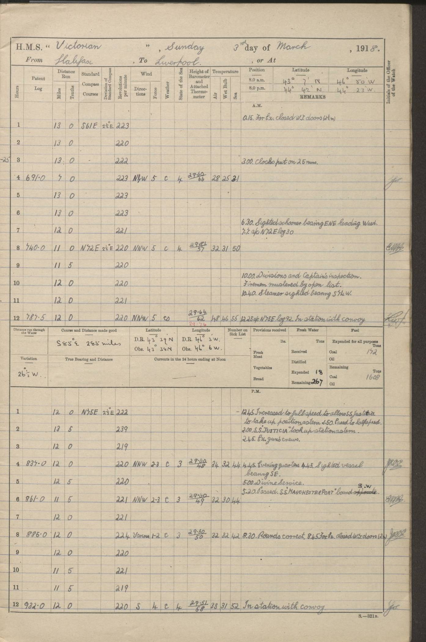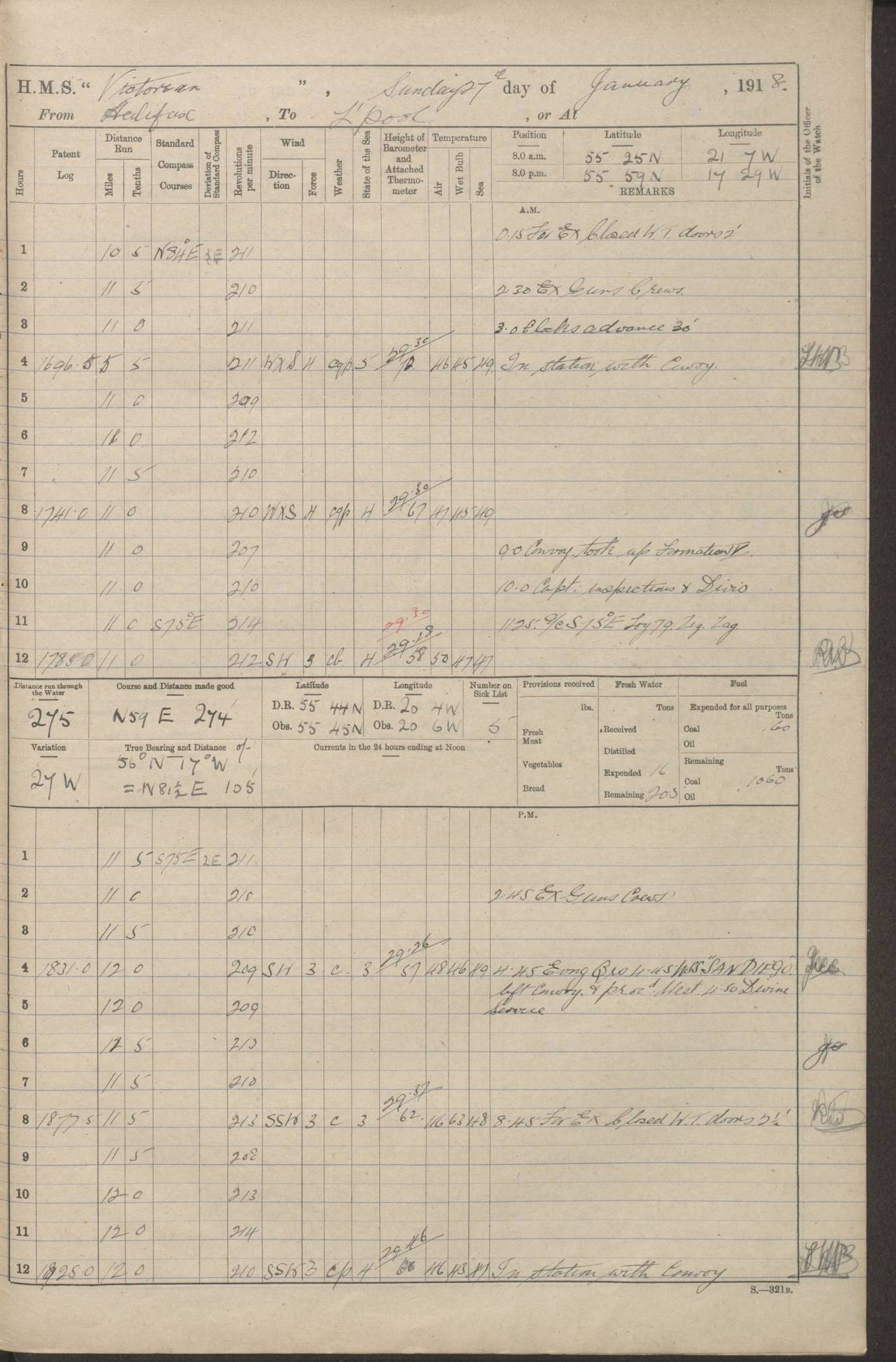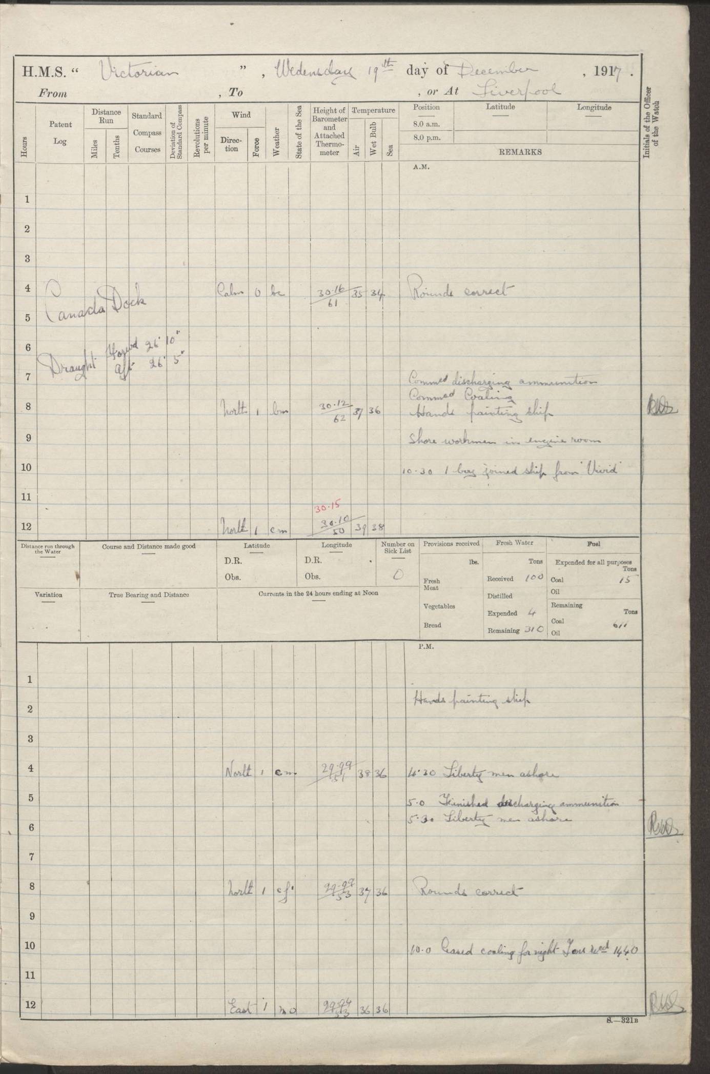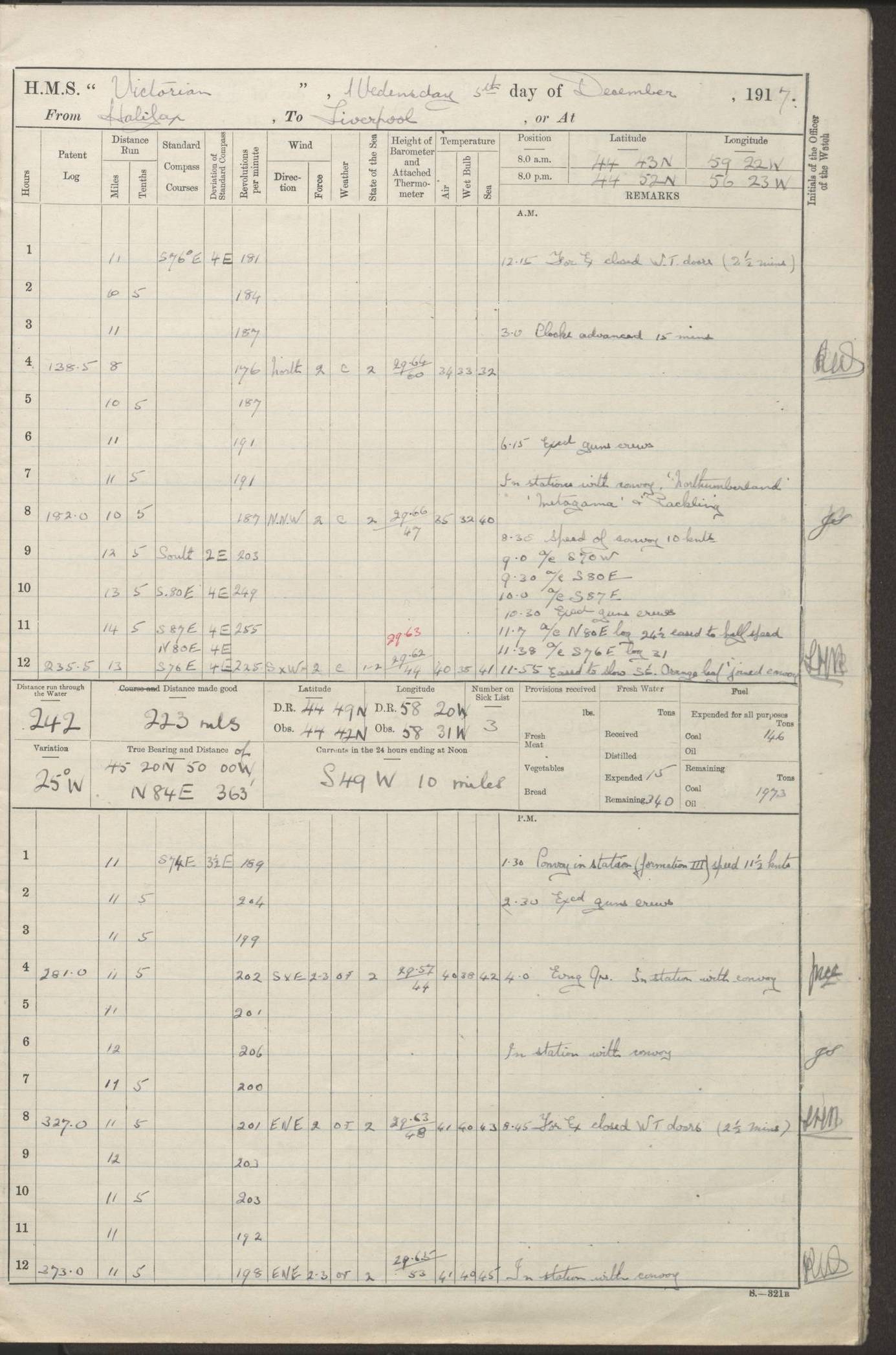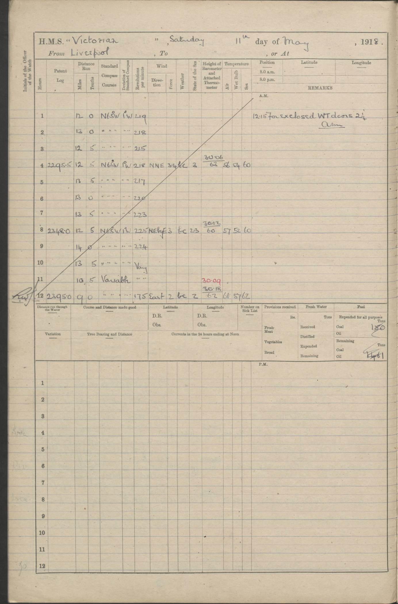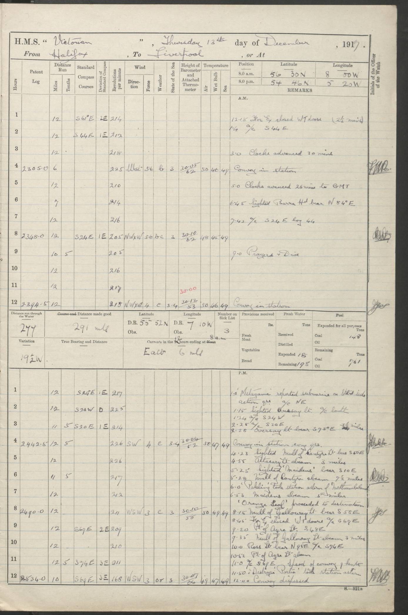 (Maps prepared using Journey Plotter, developed by Maikel. The Plots can only be approximate. They are made by joining-up positions on successive days, and sometimes positions are not given. There will therefore be occasions when the ship appears to have travelled overland) LOGS FOR AUGUST 1914 4caf8c39cadfd341970352c4: (http://oldweather.s3.amazonaws.com/ADM53-67374/ADM53-67374-001_0.jpg) 4caf8c39cadfd341970352c5: (http://oldweather.s3.amazonaws.com/ADM53-67374/ADM53-67374-001_1.jpg) 4caf8c39cadfd341970352c6: (http://oldweather.s3.amazonaws.com/ADM53-67374/ADM53-67374-002_0.jpg) 4caf8c39cadfd341970352c7: (http://oldweather.s3.amazonaws.com/ADM53-67374/ADM53-67374-002_1.jpg) 4caf8c39cadfd341970352c8: (http://oldweather.s3.amazonaws.com/ADM53-67374/ADM53-67374-003_0.jpg) 4caf8c39cadfd341970352c9: (http://oldweather.s3.amazonaws.com/ADM53-67374/ADM53-67374-003_1.jpg) 4caf8c39cadfd341970352ca: (http://oldweather.s3.amazonaws.com/ADM53-67374/ADM53-67374-004_0.jpg) 4caf8c39cadfd341970352cb: (http://oldweather.s3.amazonaws.com/ADM53-67374/ADM53-67374-004_1.jpg) 4caf8c39cadfd341970352cc: (http://oldweather.s3.amazonaws.com/ADM53-67374/ADM53-67374-005_0.jpg) 4caf8c39cadfd341970352cd: (http://oldweather.s3.amazonaws.com/ADM53-67374/ADM53-67374-005_1.jpg) Establishment of ship’s company Officers 44 Seamen 114 Boys ‒ Marines 38 Engine-room establishment 75 Other non-executive ratings 44 Total 315 BAROMETER Mercurial or aneroid: Mercurial Name of maker and number: Dobbie McInnes Height of cistern above sea: 55ft Error of mercurial barometer: .10 too low at 29.28 Thermometers for air temperature Position in ship: Fore bridge Whether in screen: Yes Maker and number: AC Cossor 3942C Date: From August 23 POSITION OF STANDARD COMPASS Top of wheel house on bridge DEVIATION OF STANDARD COMPASS Date obtained: August 23rd 1914 Position: River Mersey ARMAMENT Position: 2 guns forecastle head 2 guns forward house 2 guns after house 2 guns poop Number and nature of guns and mounting: 8 4.7” QF; P111 mountings TORPEDO ARMAMENT None BOATS Number of each carried: 8 Length and description: A lifeboats (wood) 26.2 ft Number of each carried: 4 Length and description: A lifeboats (steel) 26.0 ft MISCELLANEOUS INFORMATION Draught of water with bunkers full, and complete with provisions, stores and water: 26 ft 11 in forward; 29 ft 5 in aft Load draught: 26 ft 11 in forward; 29 ft 5 in aft Number of tons of coal carried (43 cubic feet per ton): 4541 Number of tons of oil fuel carried: None Quantity of water carried: For boilers 230; for drinking 700 THE VOYAGES OF HMS VICTORIAN 1914
