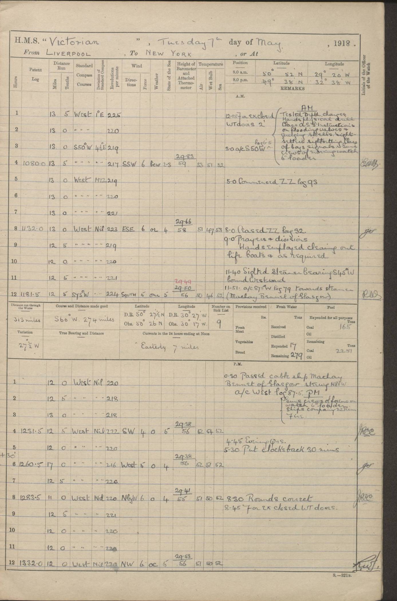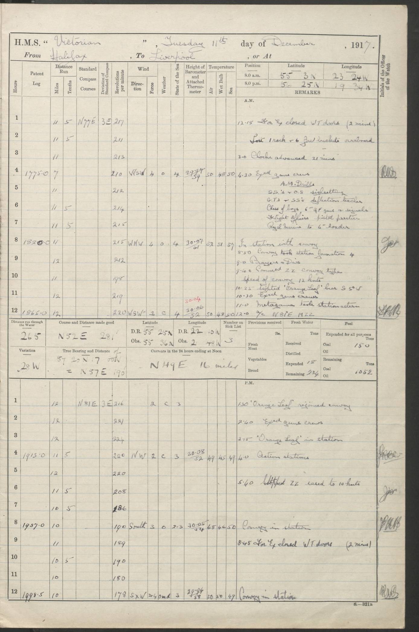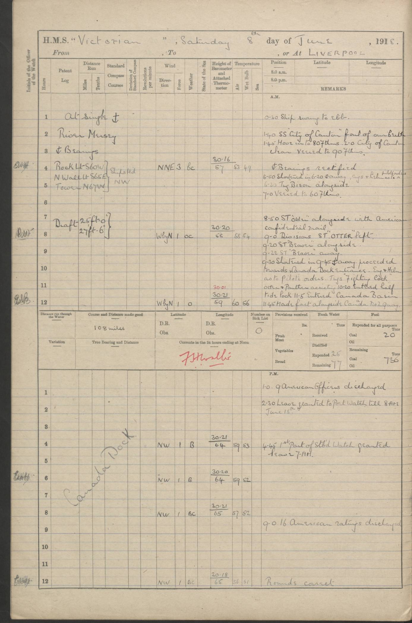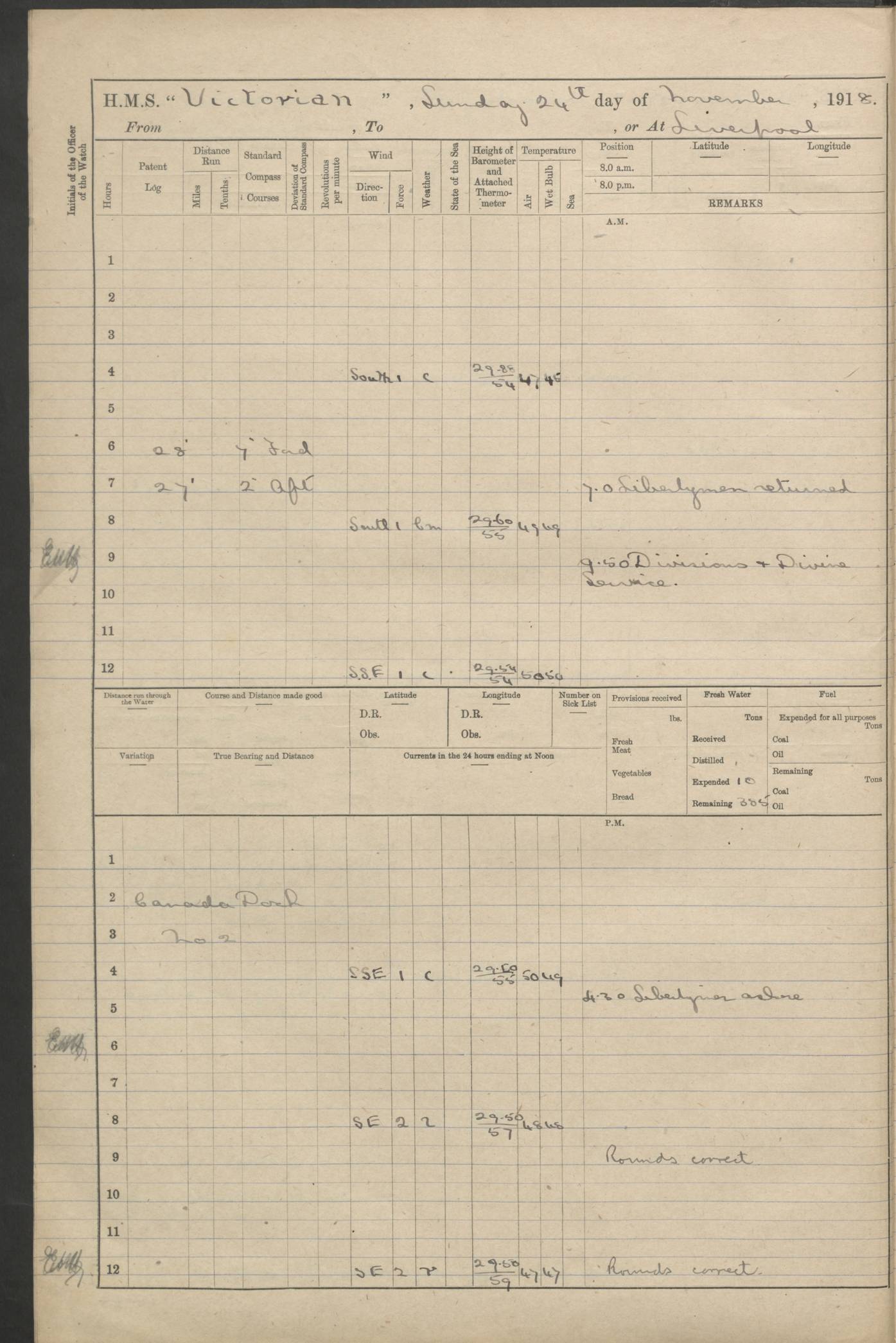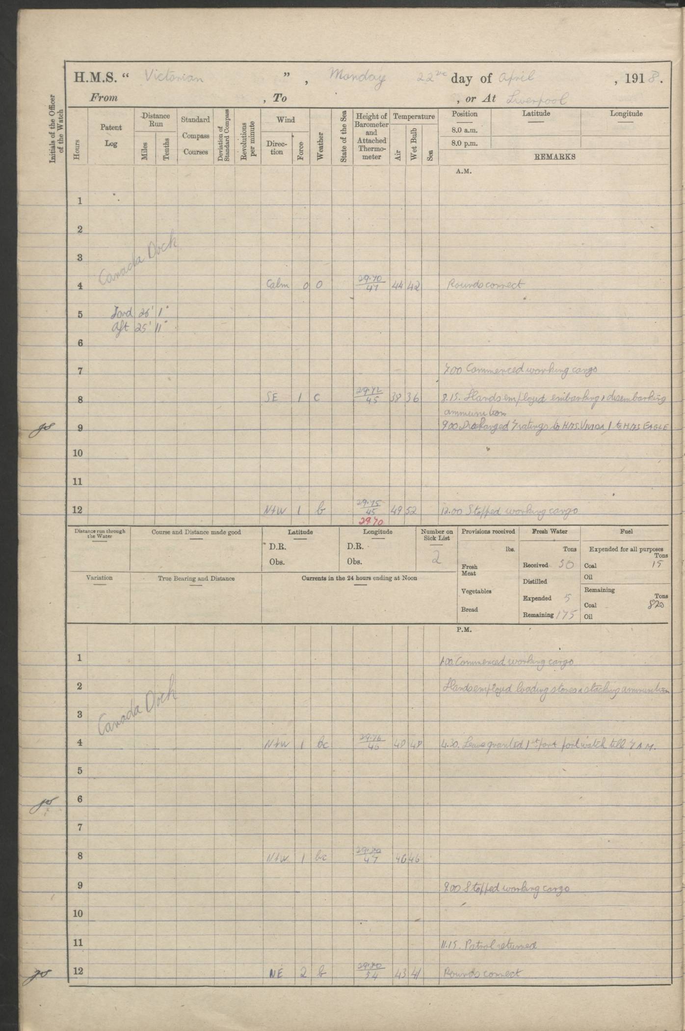 (Maps prepared using Journey Plotter, developed by Maikel. The Plots can only be approximate. They are made by joining-up positions on successive days, and sometimes positions are not given. There will therefore be occasions when the ship appears to have travelled overland) LOGS FOR AUGUST 1914 4caf8c39cadfd341970352c4: (http://oldweather.s3.amazonaws.com/ADM53-67374/ADM53-67374-001_0.jpg) 4caf8c39cadfd341970352c5: (http://oldweather.s3.amazonaws.com/ADM53-67374/ADM53-67374-001_1.jpg) 4caf8c39cadfd341970352c6: (http://oldweather.s3.amazonaws.com/ADM53-67374/ADM53-67374-002_0.jpg) 4caf8c39cadfd341970352c7: (http://oldweather.s3.amazonaws.com/ADM53-67374/ADM53-67374-002_1.jpg) 4caf8c39cadfd341970352c8: (http://oldweather.s3.amazonaws.com/ADM53-67374/ADM53-67374-003_0.jpg) 4caf8c39cadfd341970352c9: (http://oldweather.s3.amazonaws.com/ADM53-67374/ADM53-67374-003_1.jpg) 4caf8c39cadfd341970352ca: (http://oldweather.s3.amazonaws.com/ADM53-67374/ADM53-67374-004_0.jpg) 4caf8c39cadfd341970352cb: (http://oldweather.s3.amazonaws.com/ADM53-67374/ADM53-67374-004_1.jpg) 4caf8c39cadfd341970352cc: (http://oldweather.s3.amazonaws.com/ADM53-67374/ADM53-67374-005_0.jpg) 4caf8c39cadfd341970352cd: (http://oldweather.s3.amazonaws.com/ADM53-67374/ADM53-67374-005_1.jpg) Establishment of ship’s company Officers 44 Seamen 114 Boys ‒ Marines 38 Engine-room establishment 75 Other non-executive ratings 44 Total 315 BAROMETER Mercurial or aneroid: Mercurial Name of maker and number: Dobbie McInnes Height of cistern above sea: 55ft Error of mercurial barometer: .10 too low at 29.28 Thermometers for air temperature Position in ship: Fore bridge Whether in screen: Yes Maker and number: AC Cossor 3942C Date: From August 23 POSITION OF STANDARD COMPASS Top of wheel house on bridge DEVIATION OF STANDARD COMPASS Date obtained: August 23rd 1914 Position: River Mersey ARMAMENT Position: 2 guns forecastle head 2 guns forward house 2 guns after house 2 guns poop Number and nature of guns and mounting: 8 4.7” QF; P111 mountings TORPEDO ARMAMENT None BOATS Number of each carried: 8 Length and description: A lifeboats (wood) 26.2 ft Number of each carried: 4 Length and description: A lifeboats (steel) 26.0 ft MISCELLANEOUS INFORMATION Draught of water with bunkers full, and complete with provisions, stores and water: 26 ft 11 in forward; 29 ft 5 in aft Load draught: 26 ft 11 in forward; 29 ft 5 in aft Number of tons of coal carried (43 cubic feet per ton): 4541 Number of tons of oil fuel carried: None Quantity of water carried: For boilers 230; for drinking 700 THE VOYAGES OF HMS VICTORIAN 1914