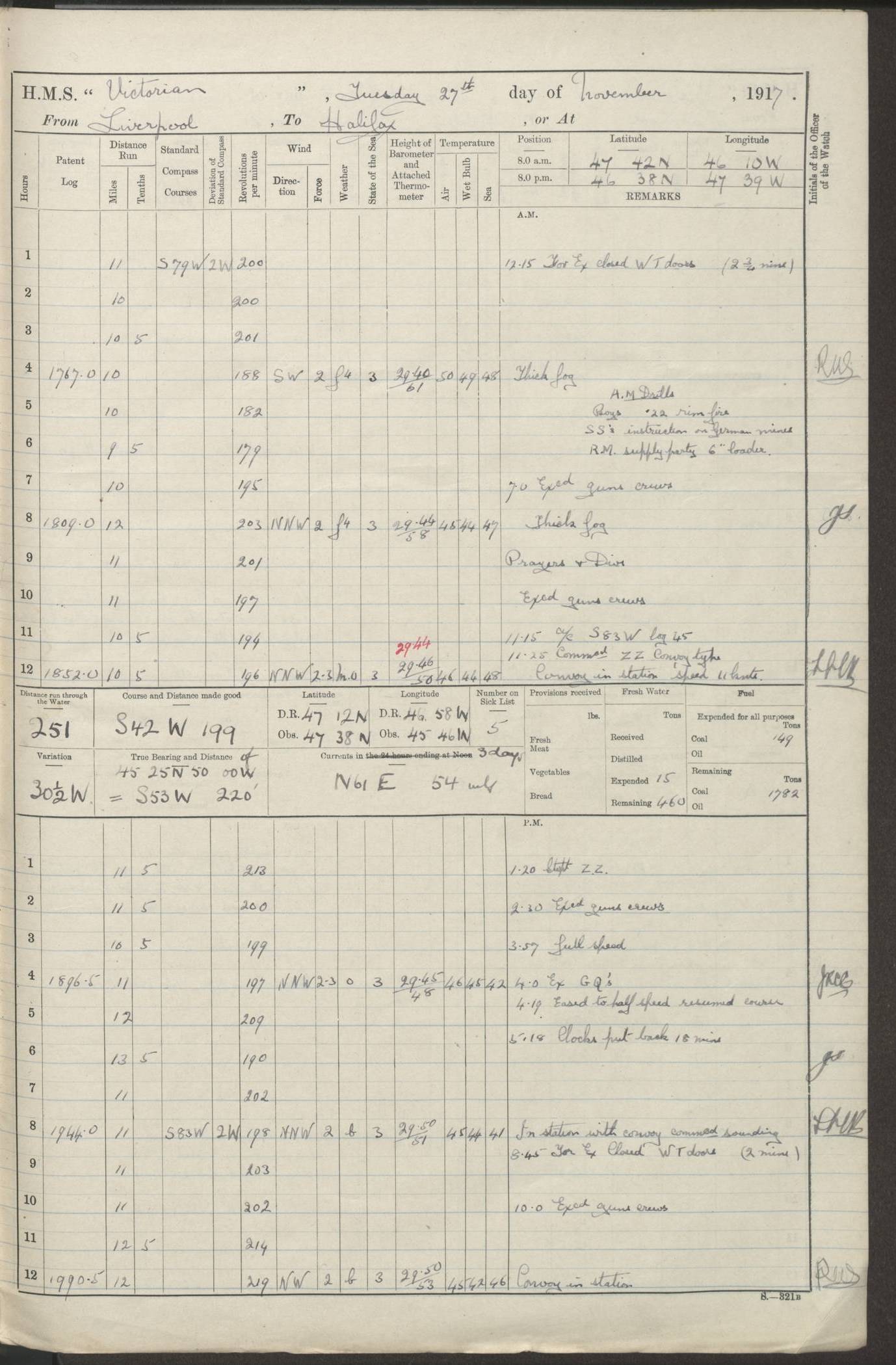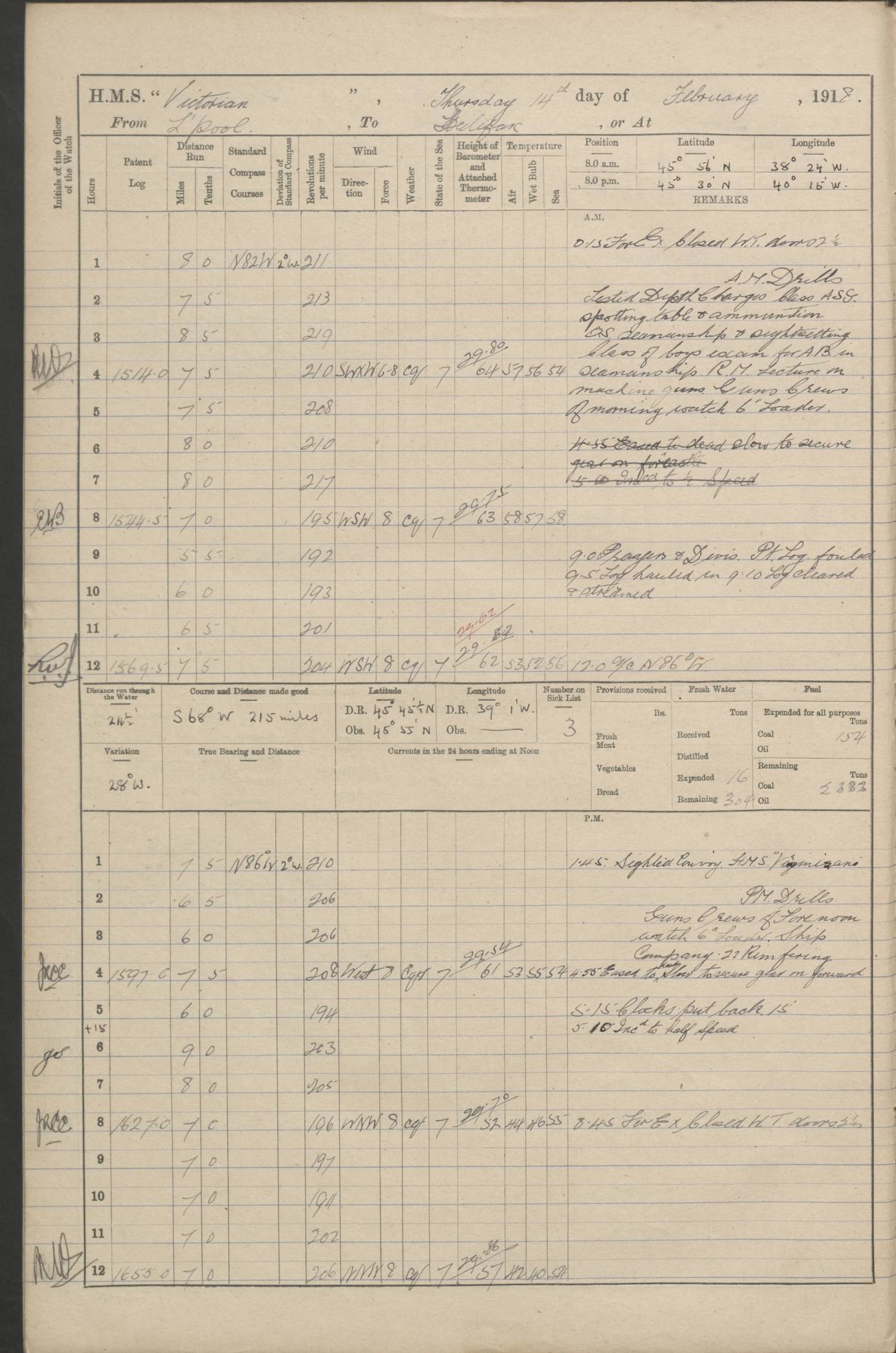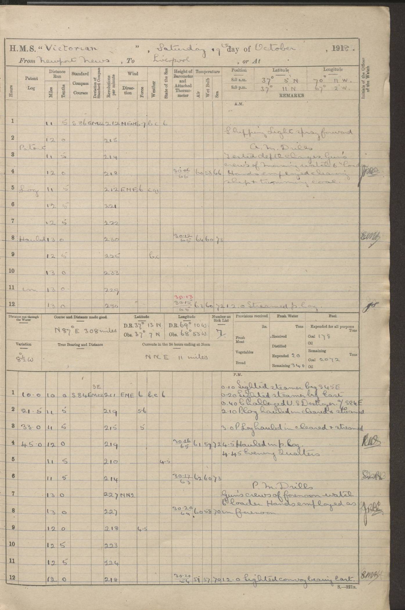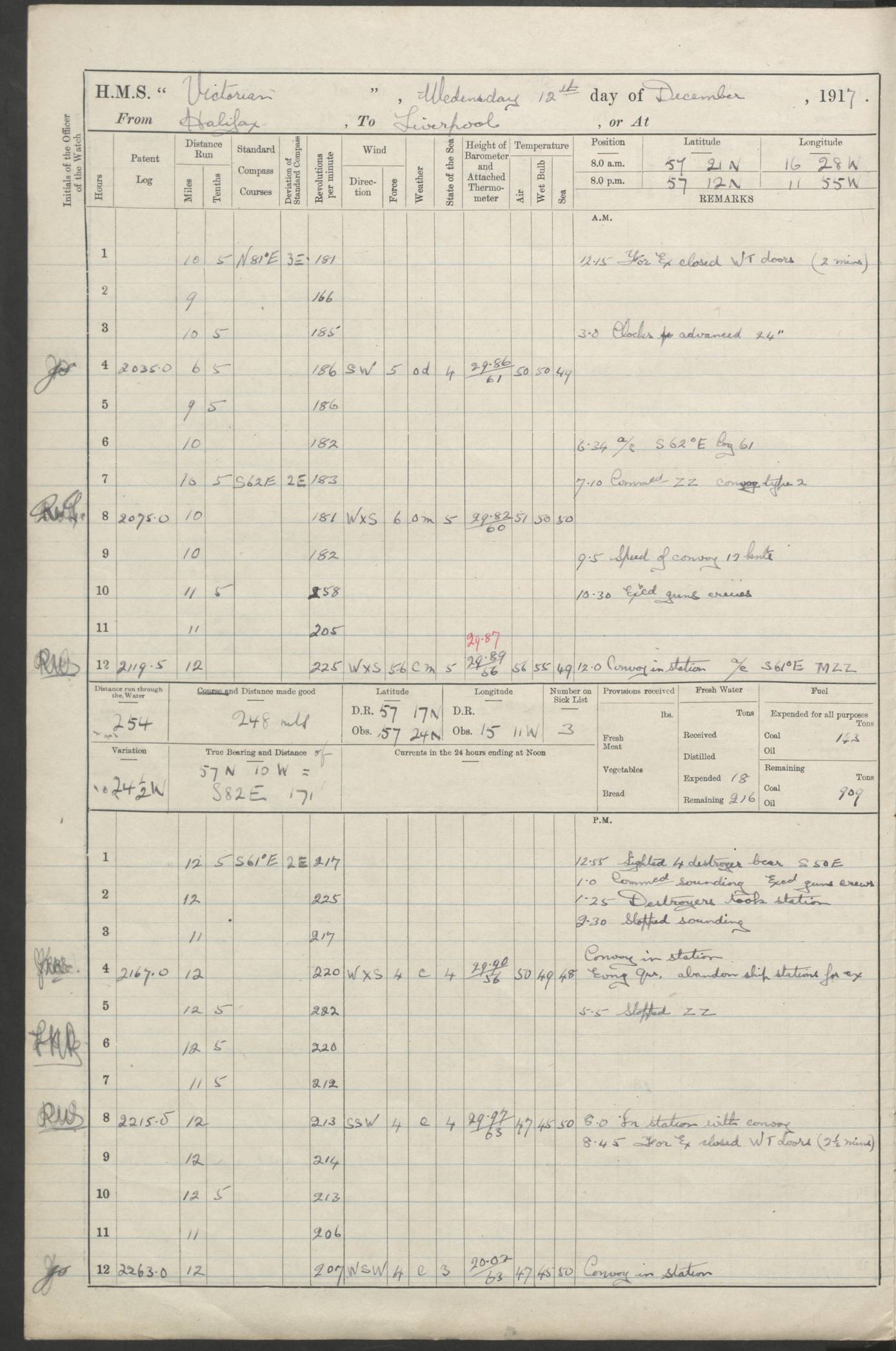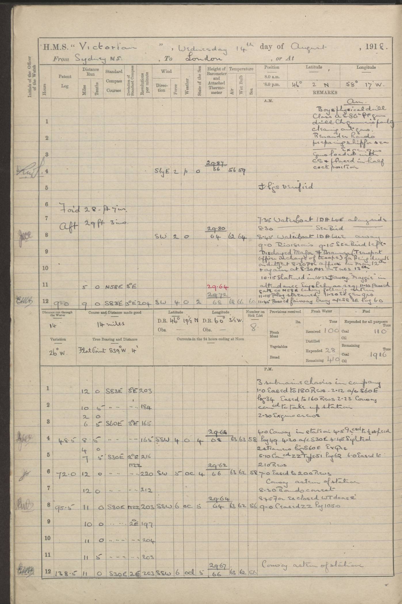 (Maps prepared using Journey Plotter, developed by Maikel. The Plots can only be approximate. They are made by joining-up positions on successive days, and sometimes positions are not given. There will therefore be occasions when the ship appears to have travelled overland) LOGS FOR AUGUST 1914 4caf8c39cadfd341970352c4: (http://oldweather.s3.amazonaws.com/ADM53-67374/ADM53-67374-001_0.jpg) 4caf8c39cadfd341970352c5: (http://oldweather.s3.amazonaws.com/ADM53-67374/ADM53-67374-001_1.jpg) 4caf8c39cadfd341970352c6: (http://oldweather.s3.amazonaws.com/ADM53-67374/ADM53-67374-002_0.jpg) 4caf8c39cadfd341970352c7: (http://oldweather.s3.amazonaws.com/ADM53-67374/ADM53-67374-002_1.jpg) 4caf8c39cadfd341970352c8: (http://oldweather.s3.amazonaws.com/ADM53-67374/ADM53-67374-003_0.jpg) 4caf8c39cadfd341970352c9: (http://oldweather.s3.amazonaws.com/ADM53-67374/ADM53-67374-003_1.jpg) 4caf8c39cadfd341970352ca: (http://oldweather.s3.amazonaws.com/ADM53-67374/ADM53-67374-004_0.jpg) 4caf8c39cadfd341970352cb: (http://oldweather.s3.amazonaws.com/ADM53-67374/ADM53-67374-004_1.jpg) 4caf8c39cadfd341970352cc: (http://oldweather.s3.amazonaws.com/ADM53-67374/ADM53-67374-005_0.jpg) 4caf8c39cadfd341970352cd: (http://oldweather.s3.amazonaws.com/ADM53-67374/ADM53-67374-005_1.jpg) Establishment of ship’s company Officers 44 Seamen 114 Boys ‒ Marines 38 Engine-room establishment 75 Other non-executive ratings 44 Total 315 BAROMETER Mercurial or aneroid: Mercurial Name of maker and number: Dobbie McInnes Height of cistern above sea: 55ft Error of mercurial barometer: .10 too low at 29.28 Thermometers for air temperature Position in ship: Fore bridge Whether in screen: Yes Maker and number: AC Cossor 3942C Date: From August 23 POSITION OF STANDARD COMPASS Top of wheel house on bridge DEVIATION OF STANDARD COMPASS Date obtained: August 23rd 1914 Position: River Mersey ARMAMENT Position: 2 guns forecastle head 2 guns forward house 2 guns after house 2 guns poop Number and nature of guns and mounting: 8 4.7” QF; P111 mountings TORPEDO ARMAMENT None BOATS Number of each carried: 8 Length and description: A lifeboats (wood) 26.2 ft Number of each carried: 4 Length and description: A lifeboats (steel) 26.0 ft MISCELLANEOUS INFORMATION Draught of water with bunkers full, and complete with provisions, stores and water: 26 ft 11 in forward; 29 ft 5 in aft Load draught: 26 ft 11 in forward; 29 ft 5 in aft Number of tons of coal carried (43 cubic feet per ton): 4541 Number of tons of oil fuel carried: None Quantity of water carried: For boilers 230; for drinking 700 THE VOYAGES OF HMS VICTORIAN 1914