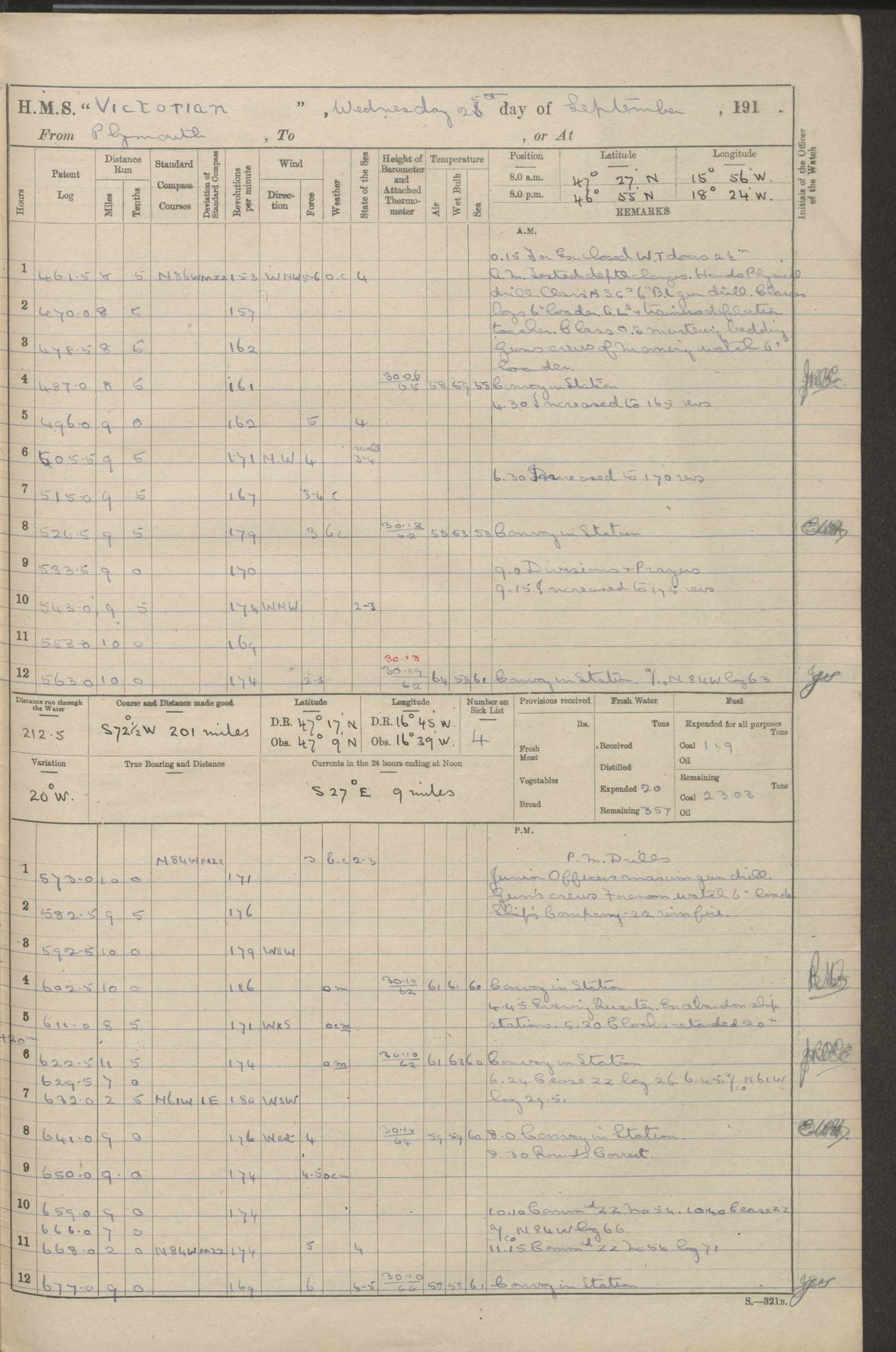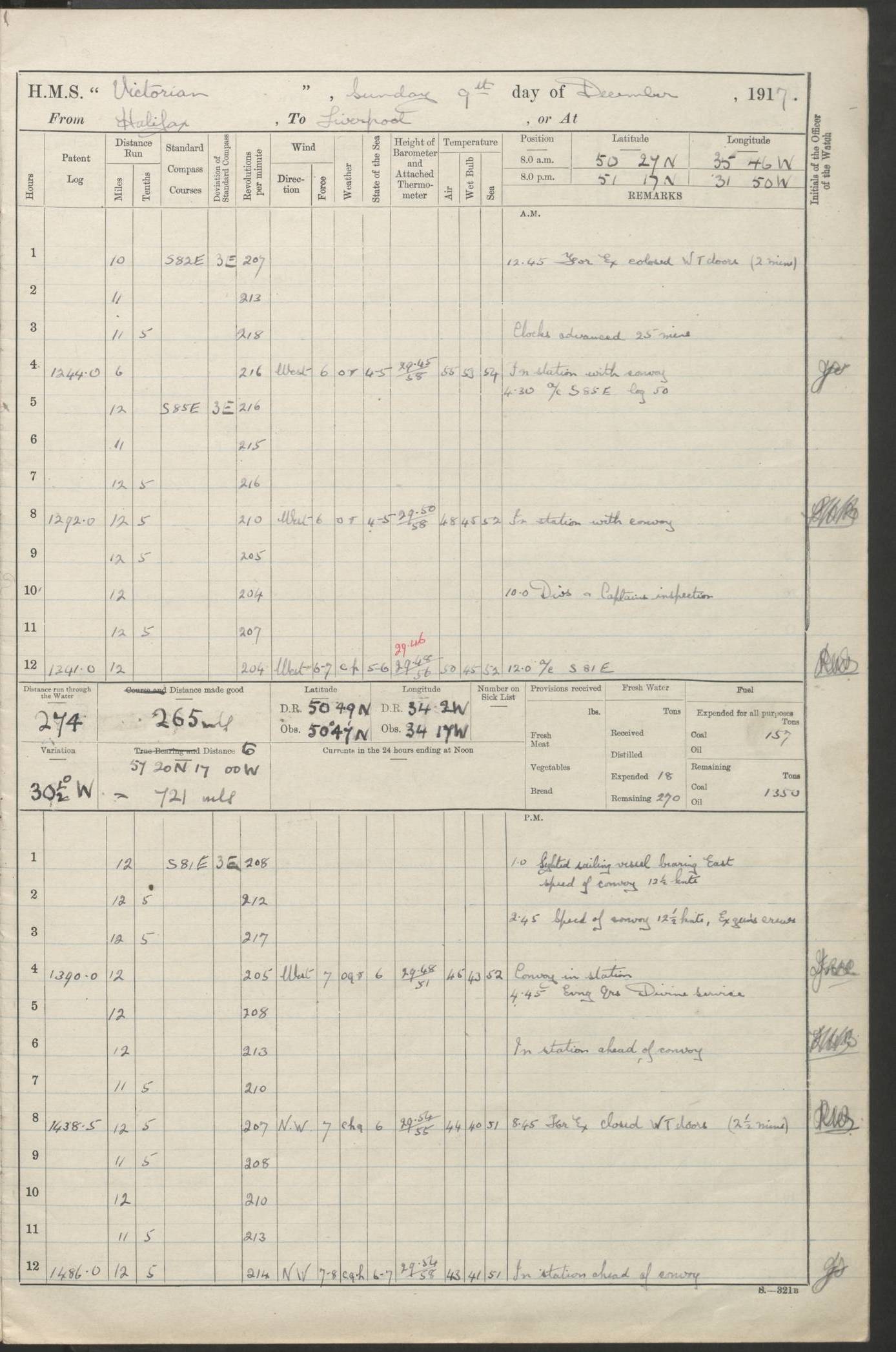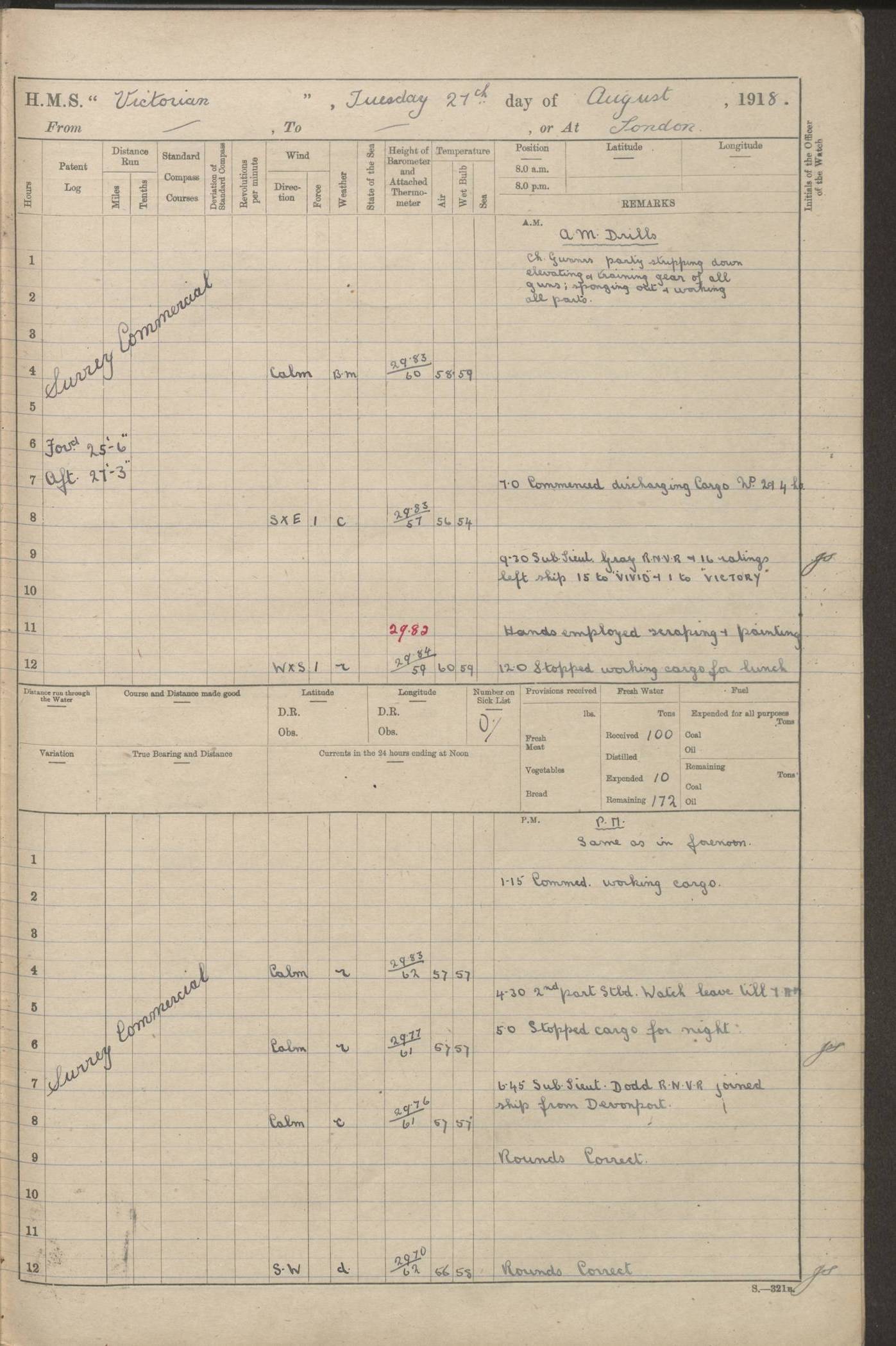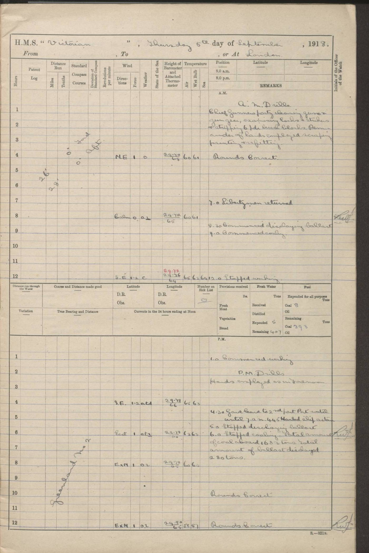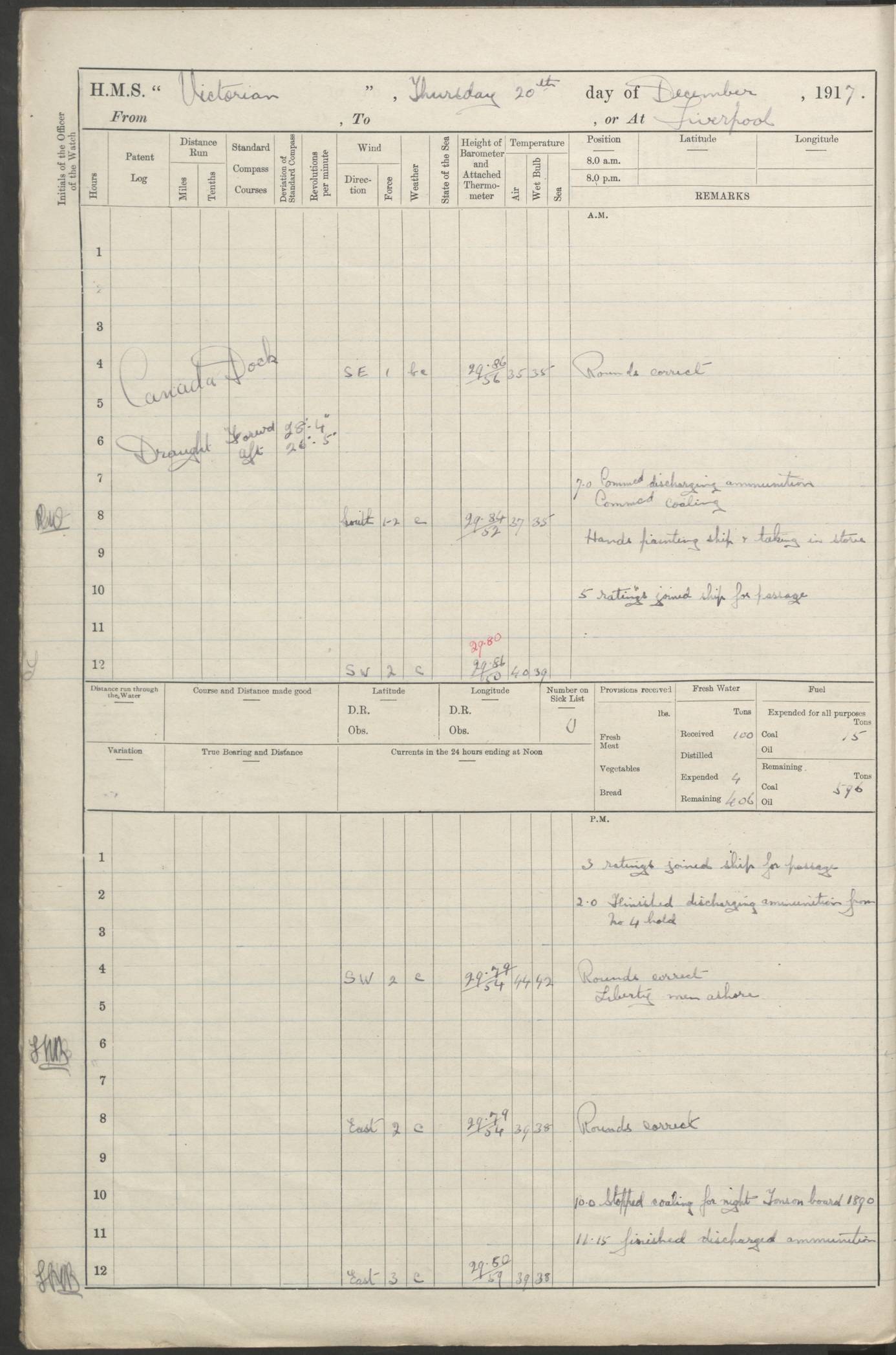 (Maps prepared using Journey Plotter, developed by Maikel. The Plots can only be approximate. They are made by joining-up positions on successive days, and sometimes positions are not given. There will therefore be occasions when the ship appears to have travelled overland) LOGS FOR AUGUST 1914 4caf8c39cadfd341970352c4: (http://oldweather.s3.amazonaws.com/ADM53-67374/ADM53-67374-001_0.jpg) 4caf8c39cadfd341970352c5: (http://oldweather.s3.amazonaws.com/ADM53-67374/ADM53-67374-001_1.jpg) 4caf8c39cadfd341970352c6: (http://oldweather.s3.amazonaws.com/ADM53-67374/ADM53-67374-002_0.jpg) 4caf8c39cadfd341970352c7: (http://oldweather.s3.amazonaws.com/ADM53-67374/ADM53-67374-002_1.jpg) 4caf8c39cadfd341970352c8: (http://oldweather.s3.amazonaws.com/ADM53-67374/ADM53-67374-003_0.jpg) 4caf8c39cadfd341970352c9: (http://oldweather.s3.amazonaws.com/ADM53-67374/ADM53-67374-003_1.jpg) 4caf8c39cadfd341970352ca: (http://oldweather.s3.amazonaws.com/ADM53-67374/ADM53-67374-004_0.jpg) 4caf8c39cadfd341970352cb: (http://oldweather.s3.amazonaws.com/ADM53-67374/ADM53-67374-004_1.jpg) 4caf8c39cadfd341970352cc: (http://oldweather.s3.amazonaws.com/ADM53-67374/ADM53-67374-005_0.jpg) 4caf8c39cadfd341970352cd: (http://oldweather.s3.amazonaws.com/ADM53-67374/ADM53-67374-005_1.jpg) Establishment of ship’s company Officers 44 Seamen 114 Boys ‒ Marines 38 Engine-room establishment 75 Other non-executive ratings 44 Total 315 BAROMETER Mercurial or aneroid: Mercurial Name of maker and number: Dobbie McInnes Height of cistern above sea: 55ft Error of mercurial barometer: .10 too low at 29.28 Thermometers for air temperature Position in ship: Fore bridge Whether in screen: Yes Maker and number: AC Cossor 3942C Date: From August 23 POSITION OF STANDARD COMPASS Top of wheel house on bridge DEVIATION OF STANDARD COMPASS Date obtained: August 23rd 1914 Position: River Mersey ARMAMENT Position: 2 guns forecastle head 2 guns forward house 2 guns after house 2 guns poop Number and nature of guns and mounting: 8 4.7” QF; P111 mountings TORPEDO ARMAMENT None BOATS Number of each carried: 8 Length and description: A lifeboats (wood) 26.2 ft Number of each carried: 4 Length and description: A lifeboats (steel) 26.0 ft MISCELLANEOUS INFORMATION Draught of water with bunkers full, and complete with provisions, stores and water: 26 ft 11 in forward; 29 ft 5 in aft Load draught: 26 ft 11 in forward; 29 ft 5 in aft Number of tons of coal carried (43 cubic feet per ton): 4541 Number of tons of oil fuel carried: None Quantity of water carried: For boilers 230; for drinking 700 THE VOYAGES OF HMS VICTORIAN 1914
