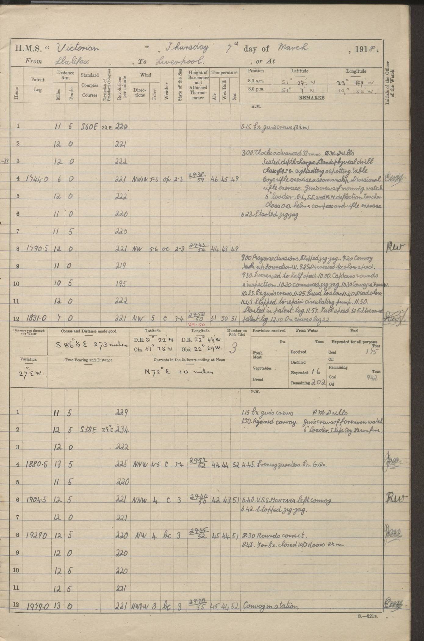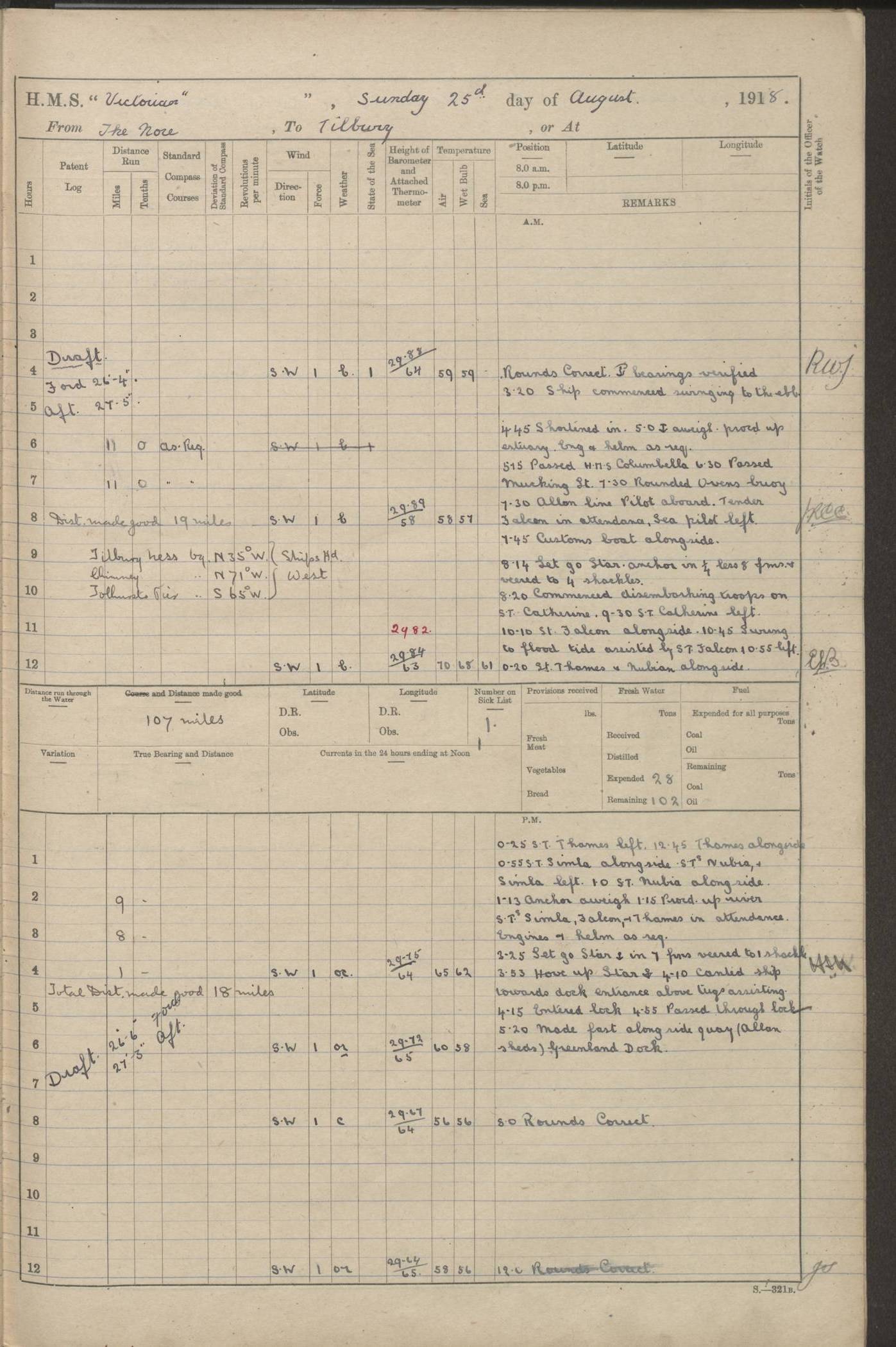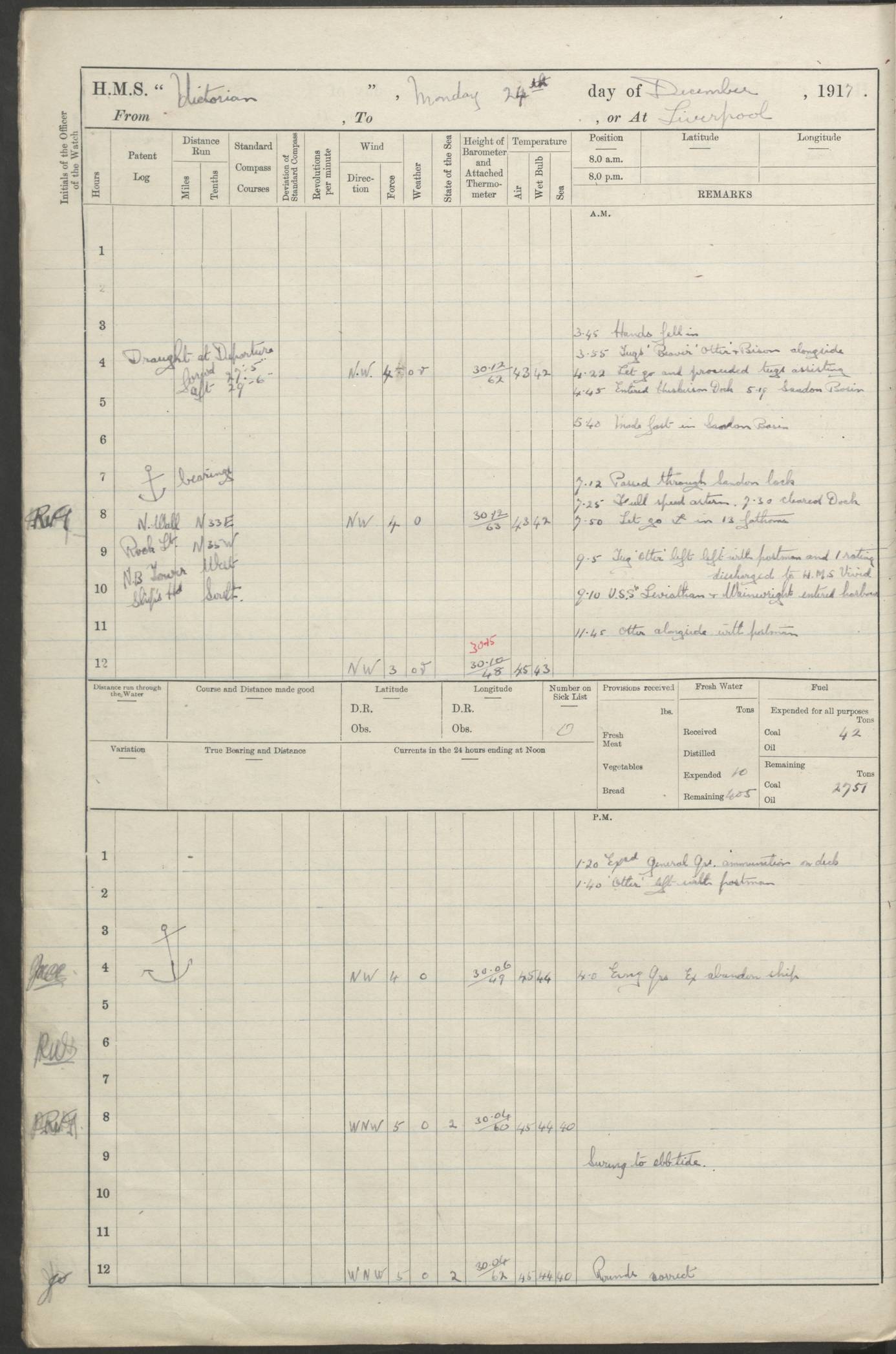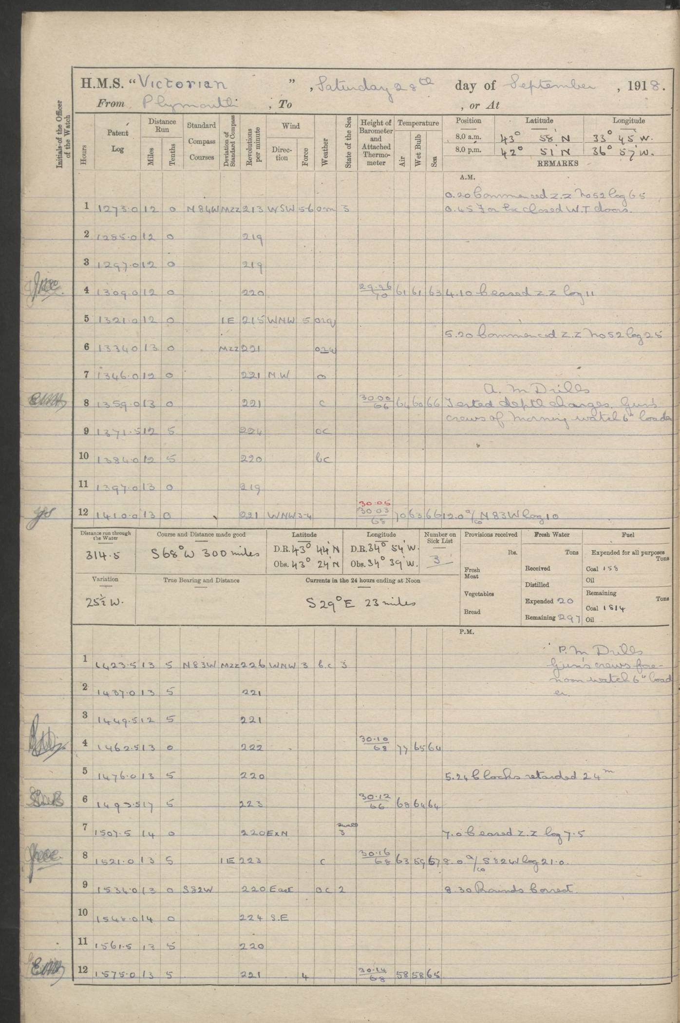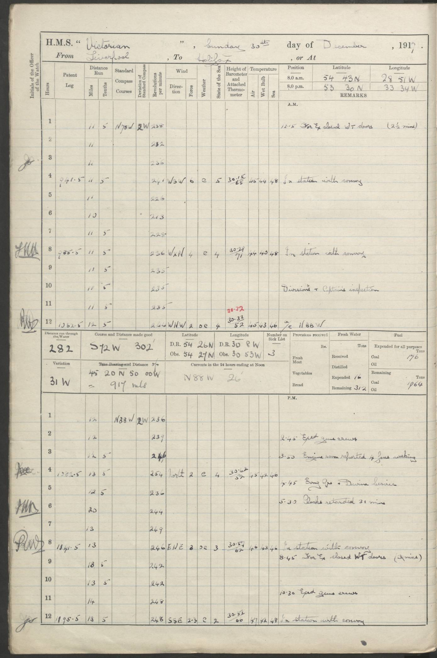 (Maps prepared using Journey Plotter, developed by Maikel. The Plots can only be approximate. They are made by joining-up positions on successive days, and sometimes positions are not given. There will therefore be occasions when the ship appears to have travelled overland) LOGS FOR AUGUST 1914 4caf8c39cadfd341970352c4: (http://oldweather.s3.amazonaws.com/ADM53-67374/ADM53-67374-001_0.jpg) 4caf8c39cadfd341970352c5: (http://oldweather.s3.amazonaws.com/ADM53-67374/ADM53-67374-001_1.jpg) 4caf8c39cadfd341970352c6: (http://oldweather.s3.amazonaws.com/ADM53-67374/ADM53-67374-002_0.jpg) 4caf8c39cadfd341970352c7: (http://oldweather.s3.amazonaws.com/ADM53-67374/ADM53-67374-002_1.jpg) 4caf8c39cadfd341970352c8: (http://oldweather.s3.amazonaws.com/ADM53-67374/ADM53-67374-003_0.jpg) 4caf8c39cadfd341970352c9: (http://oldweather.s3.amazonaws.com/ADM53-67374/ADM53-67374-003_1.jpg) 4caf8c39cadfd341970352ca: (http://oldweather.s3.amazonaws.com/ADM53-67374/ADM53-67374-004_0.jpg) 4caf8c39cadfd341970352cb: (http://oldweather.s3.amazonaws.com/ADM53-67374/ADM53-67374-004_1.jpg) 4caf8c39cadfd341970352cc: (http://oldweather.s3.amazonaws.com/ADM53-67374/ADM53-67374-005_0.jpg) 4caf8c39cadfd341970352cd: (http://oldweather.s3.amazonaws.com/ADM53-67374/ADM53-67374-005_1.jpg) Establishment of ship’s company Officers 44 Seamen 114 Boys ‒ Marines 38 Engine-room establishment 75 Other non-executive ratings 44 Total 315 BAROMETER Mercurial or aneroid: Mercurial Name of maker and number: Dobbie McInnes Height of cistern above sea: 55ft Error of mercurial barometer: .10 too low at 29.28 Thermometers for air temperature Position in ship: Fore bridge Whether in screen: Yes Maker and number: AC Cossor 3942C Date: From August 23 POSITION OF STANDARD COMPASS Top of wheel house on bridge DEVIATION OF STANDARD COMPASS Date obtained: August 23rd 1914 Position: River Mersey ARMAMENT Position: 2 guns forecastle head 2 guns forward house 2 guns after house 2 guns poop Number and nature of guns and mounting: 8 4.7” QF; P111 mountings TORPEDO ARMAMENT None BOATS Number of each carried: 8 Length and description: A lifeboats (wood) 26.2 ft Number of each carried: 4 Length and description: A lifeboats (steel) 26.0 ft MISCELLANEOUS INFORMATION Draught of water with bunkers full, and complete with provisions, stores and water: 26 ft 11 in forward; 29 ft 5 in aft Load draught: 26 ft 11 in forward; 29 ft 5 in aft Number of tons of coal carried (43 cubic feet per ton): 4541 Number of tons of oil fuel carried: None Quantity of water carried: For boilers 230; for drinking 700 THE VOYAGES OF HMS VICTORIAN 1914